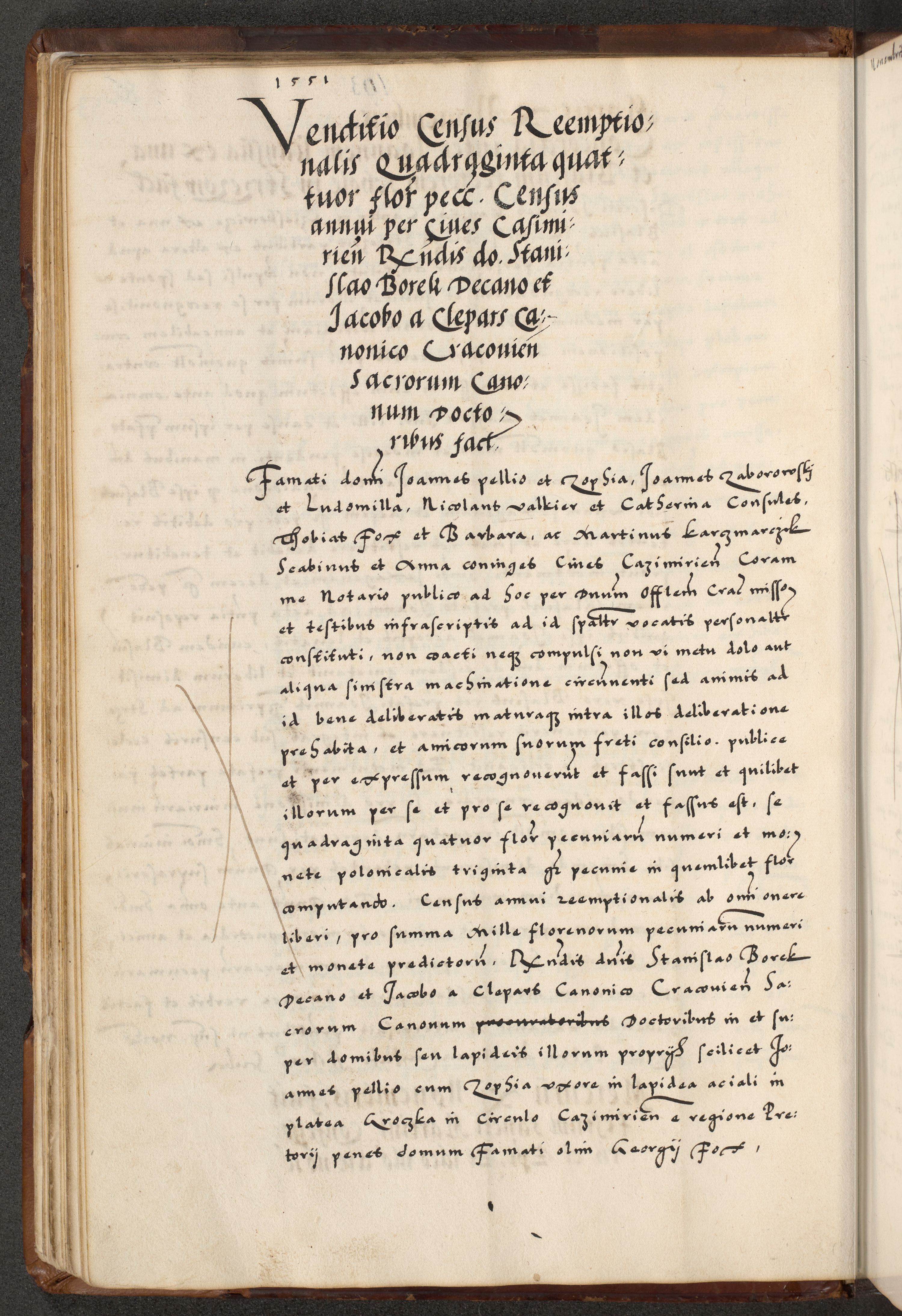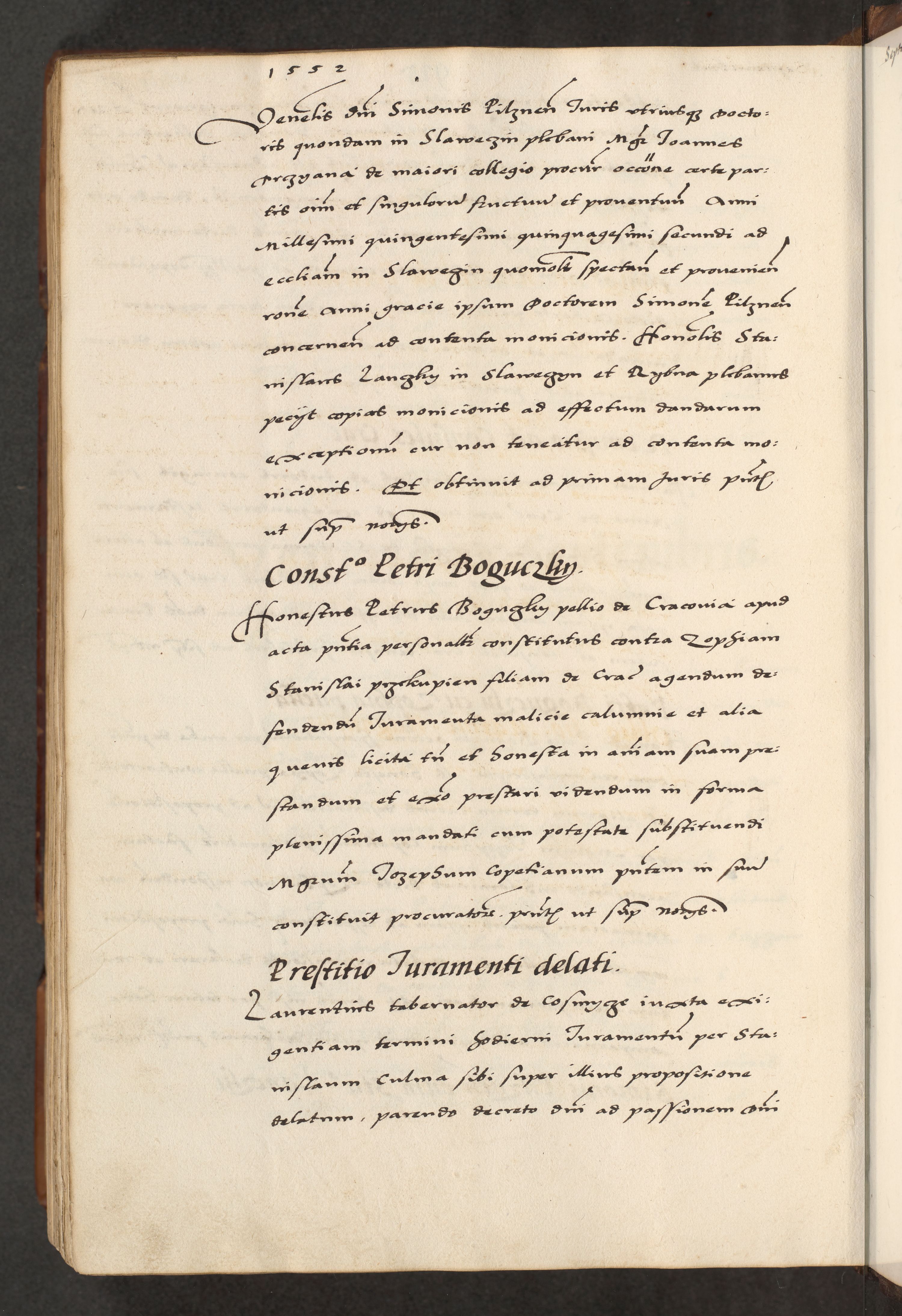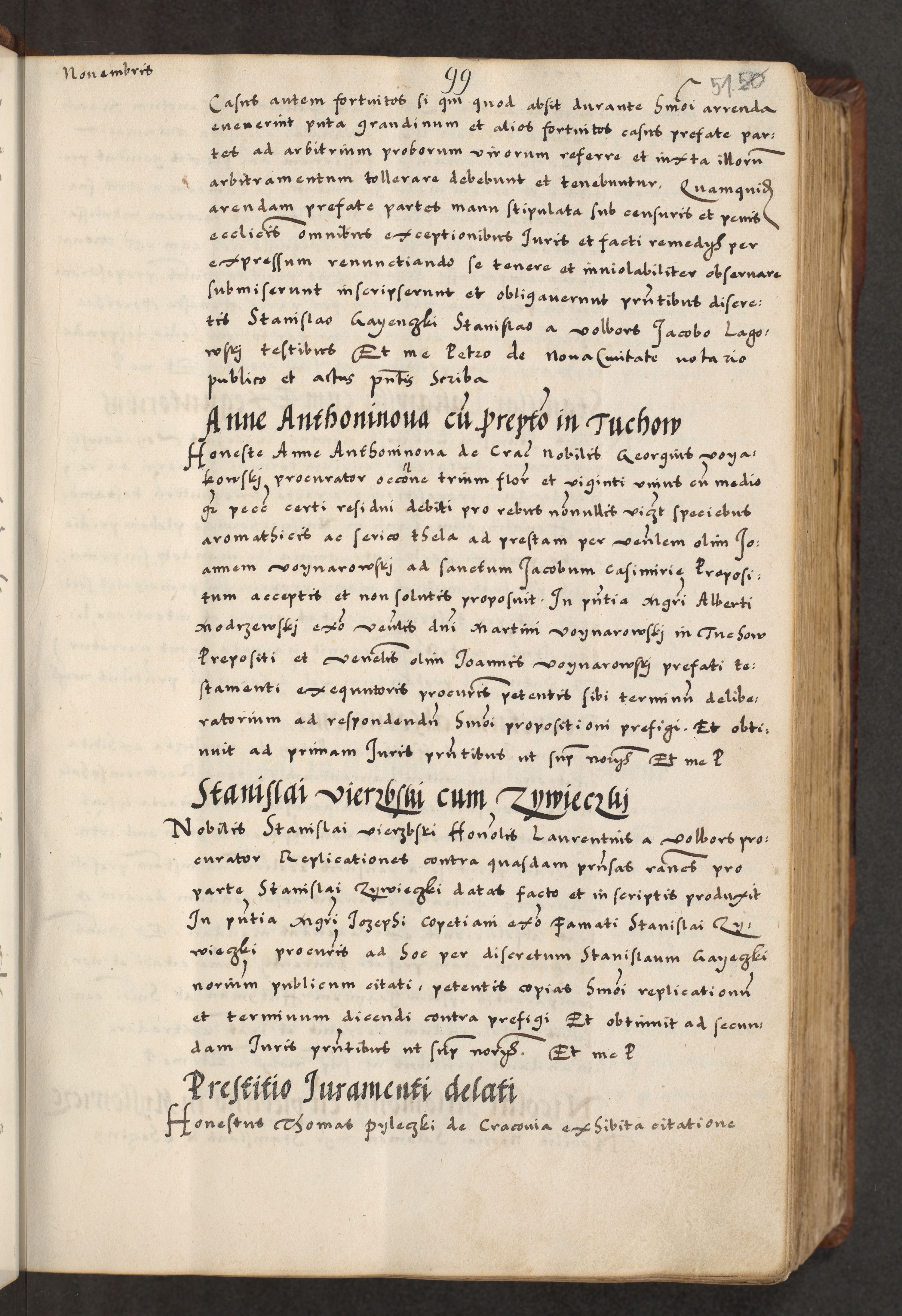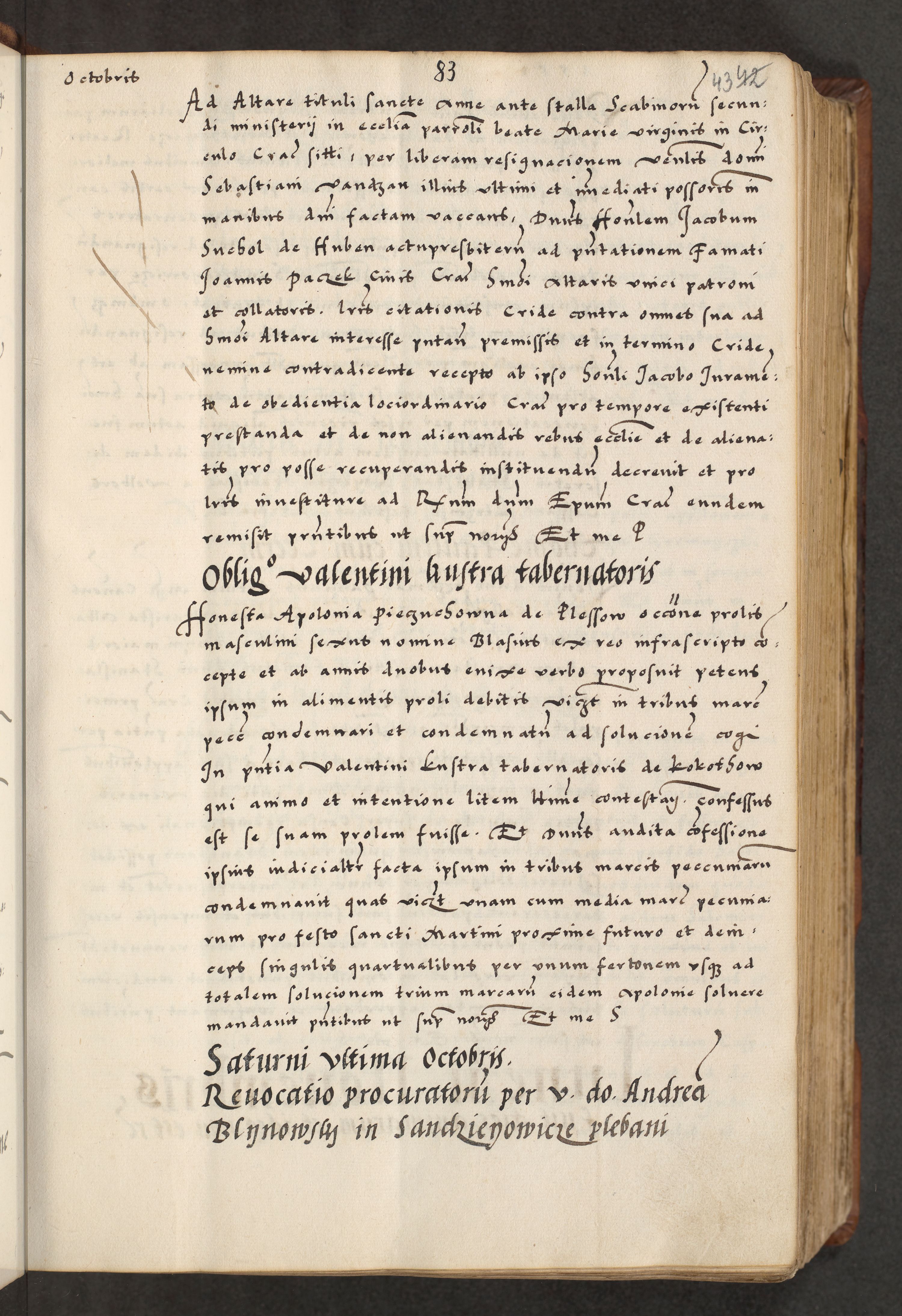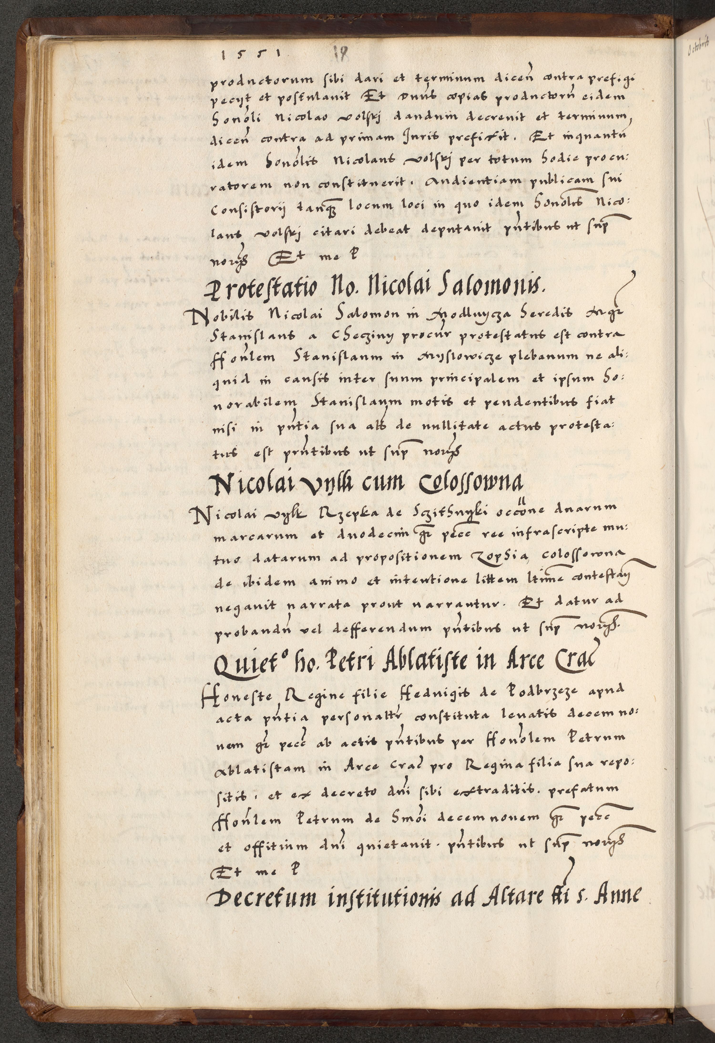 [A]cta actorum causarum, sententiarum tam diffinitivarum quam interloquutoriarum, obligationum, constitutionum et contractuum coram reverendo patre domino Petro Porembski preposito Osvieczimensi, canonico et officiali generali Cracoviensi de anno Domini millesimo quingentesimo quinguagesimo primo, cuius indictio est nona, pontificatus sanctissimi in Christo patris et domini nostri domini Juliii divina providencia pape tercii, anno secundo, a die et mense infrascriptis feliciter continiantur