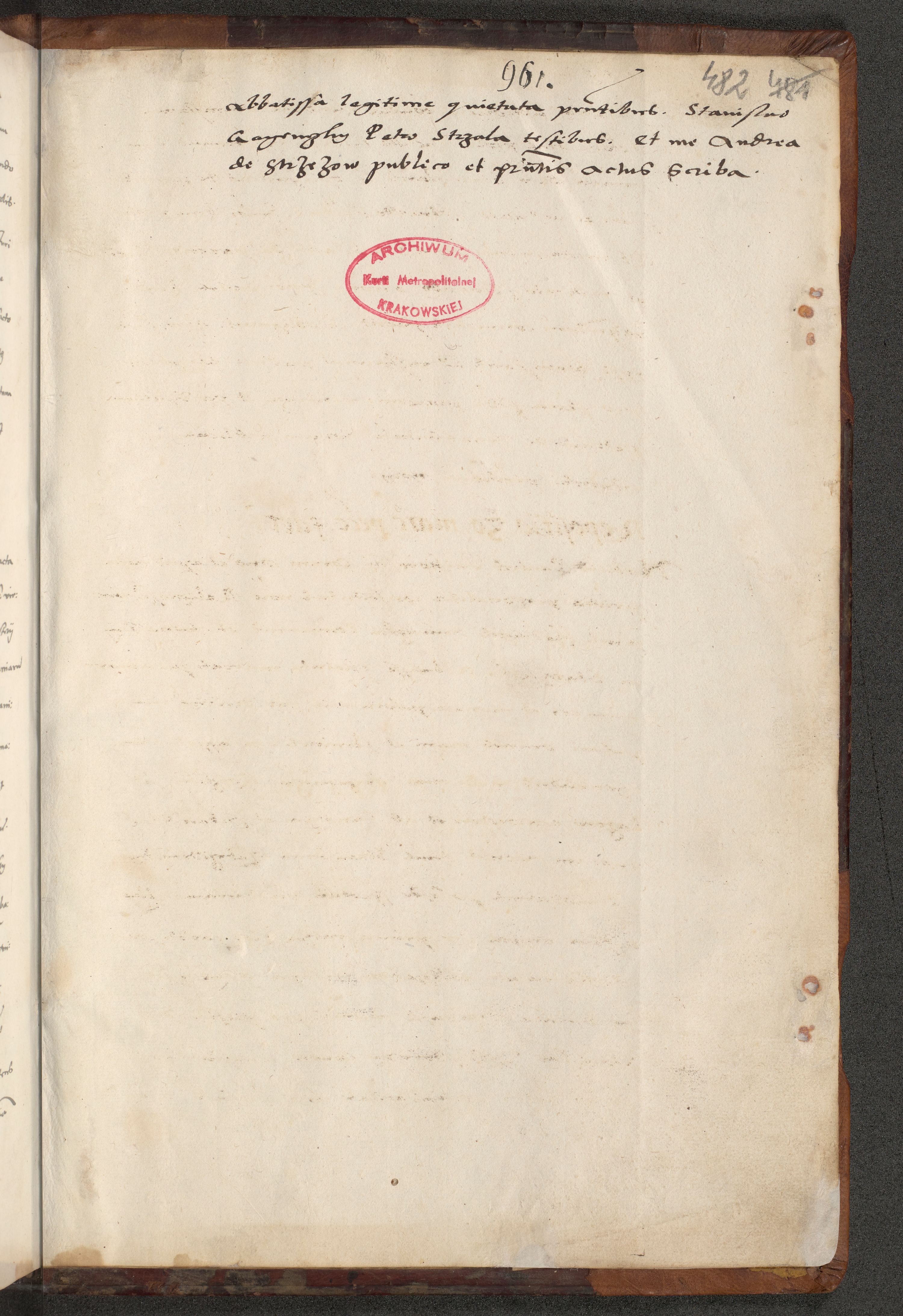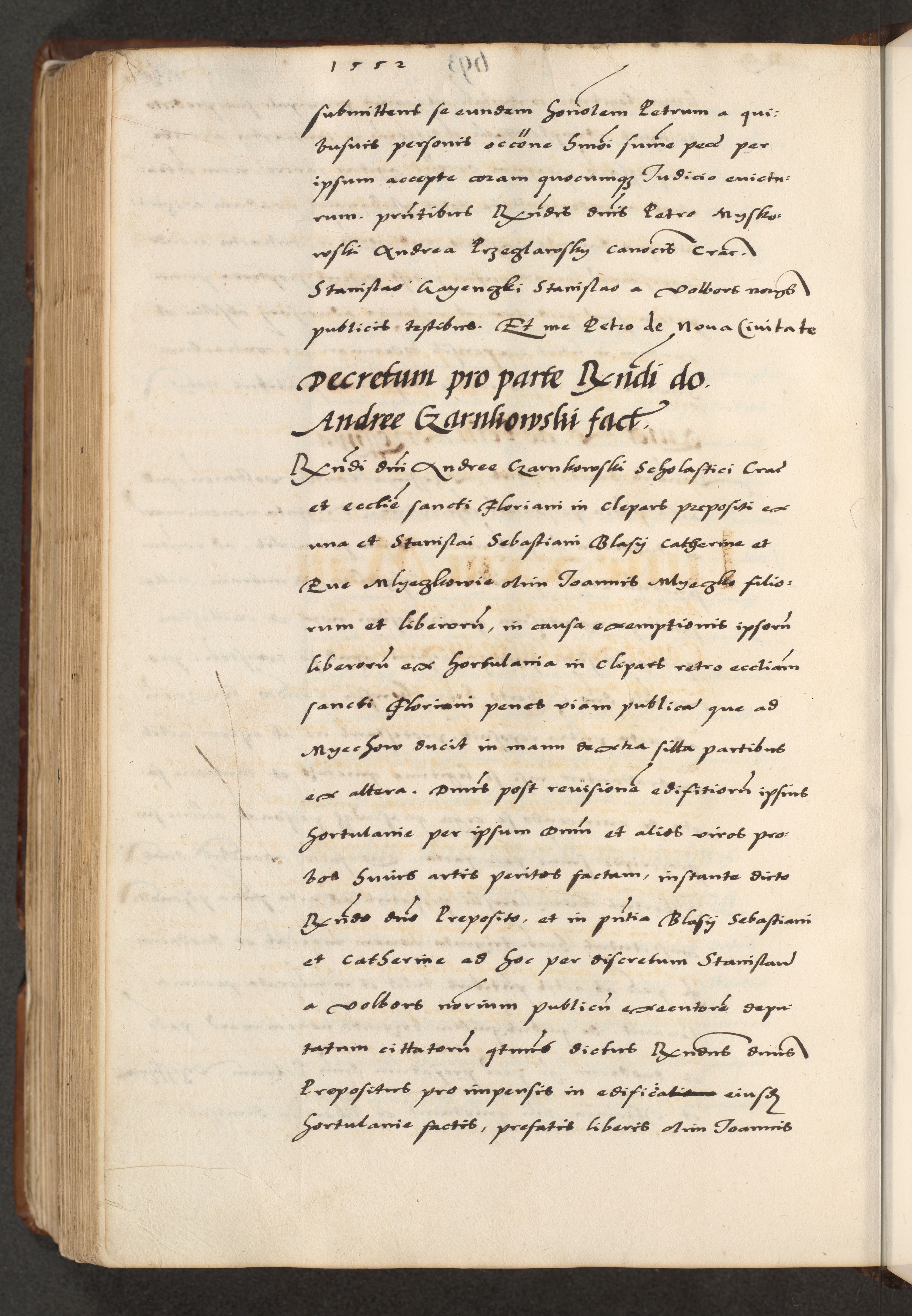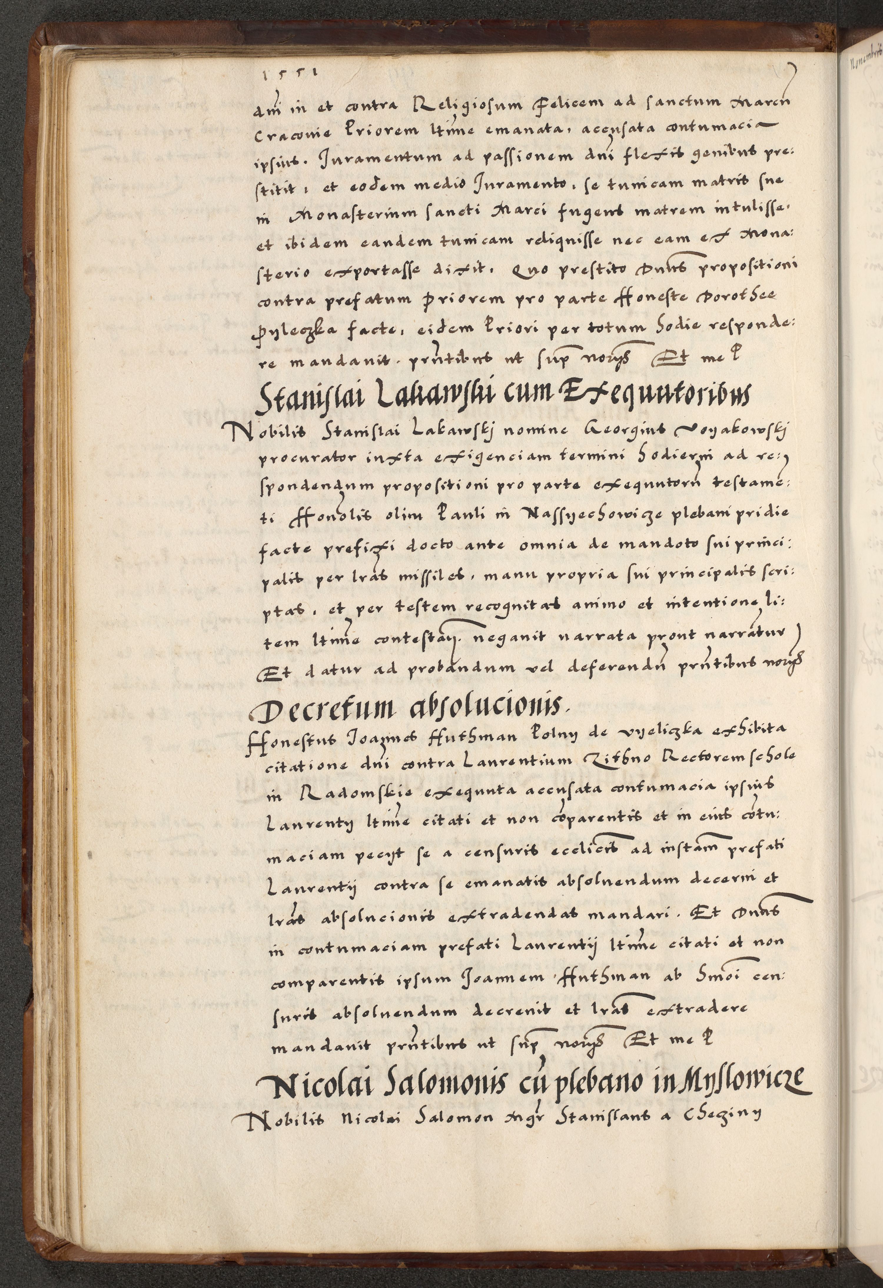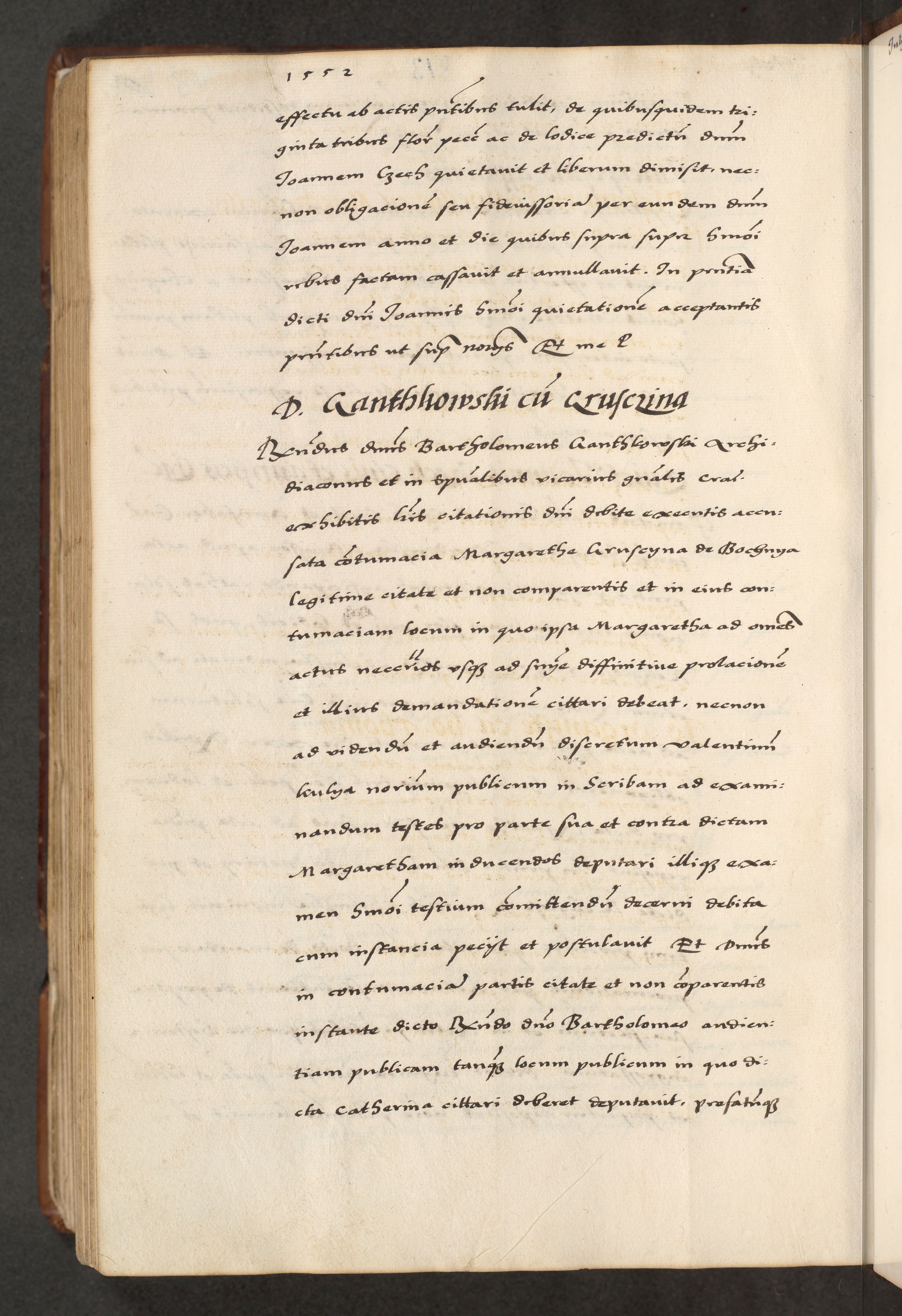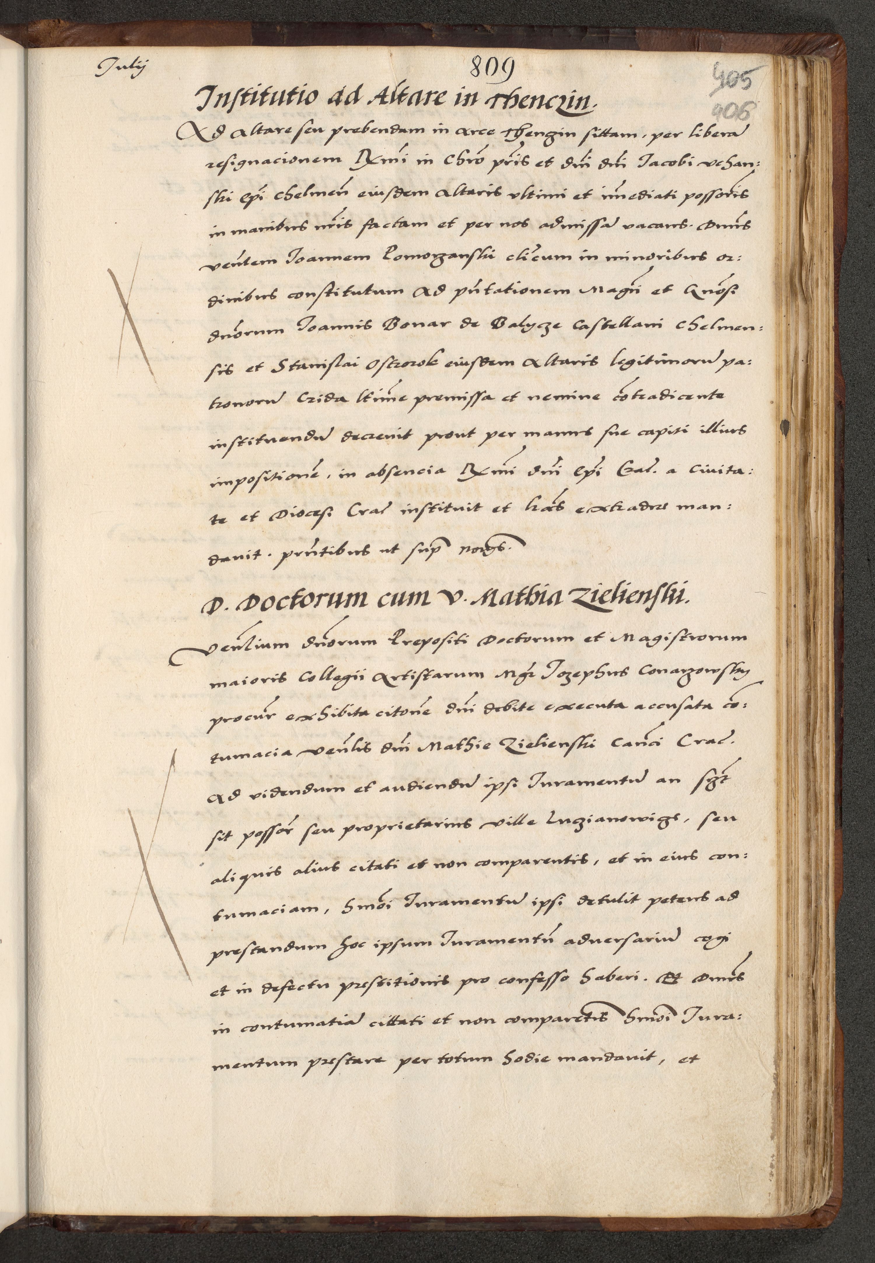 [A]cta actorum causarum, sententiarum tam diffinitivarum quam interloquutoriarum, obligationum, constitutionum et contractuum coram reverendo patre domino Petro Porembski preposito Osvieczimensi, canonico et officiali generali Cracoviensi de anno Domini millesimo quingentesimo quinguagesimo primo, cuius indictio est nona, pontificatus sanctissimi in Christo patris et domini nostri domini Juliii divina providencia pape tercii, anno secundo, a die et mense infrascriptis feliciter continiantur