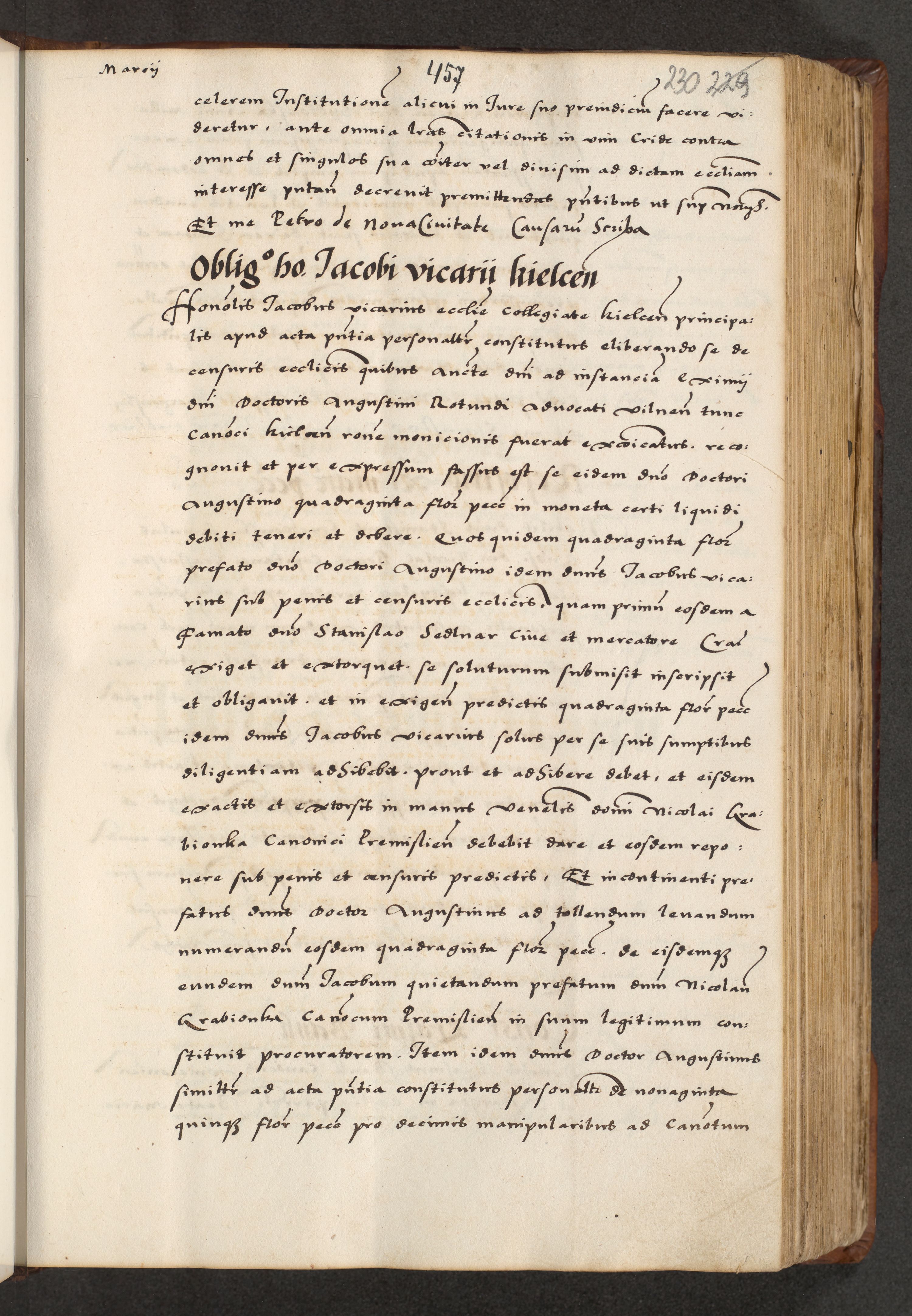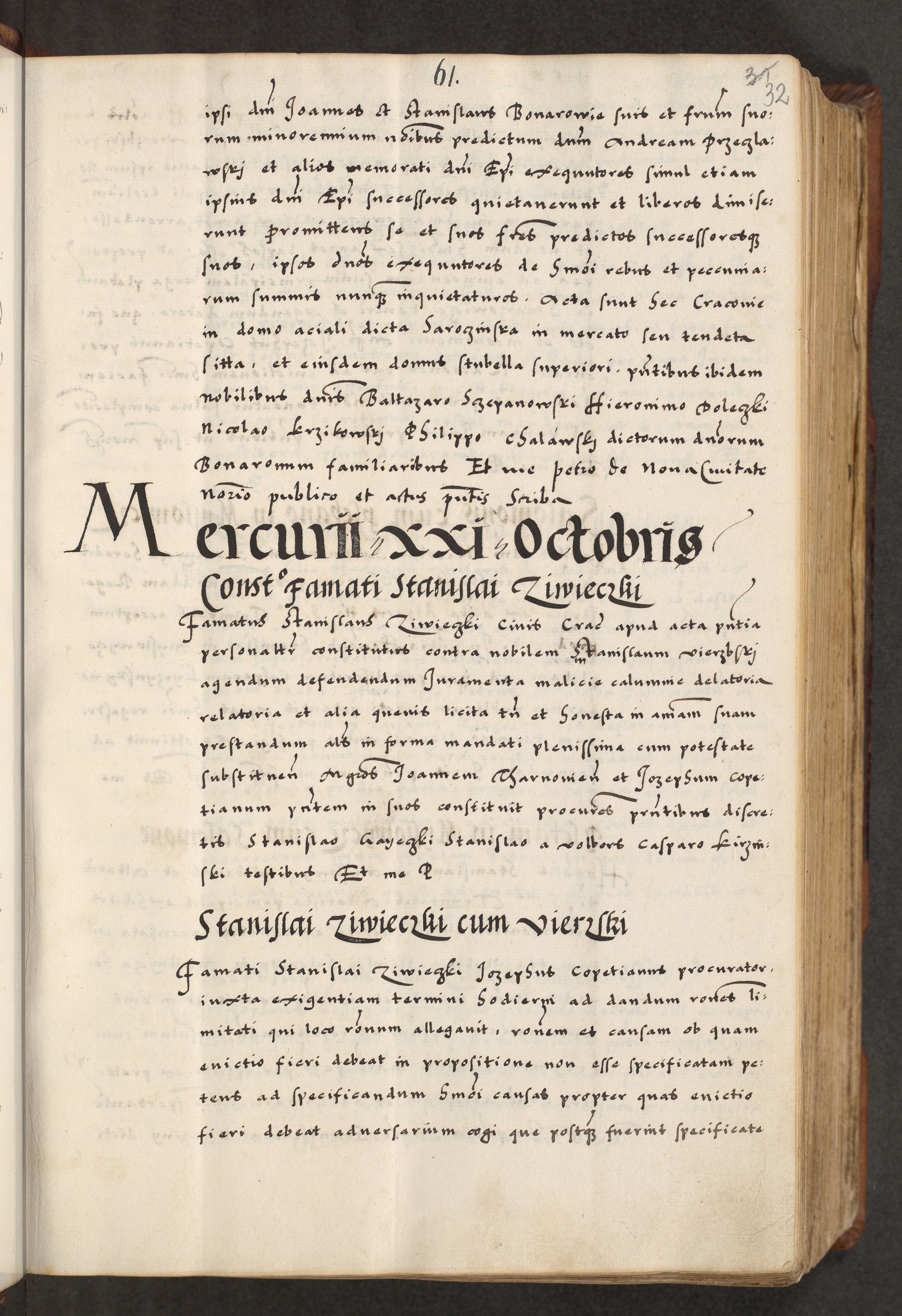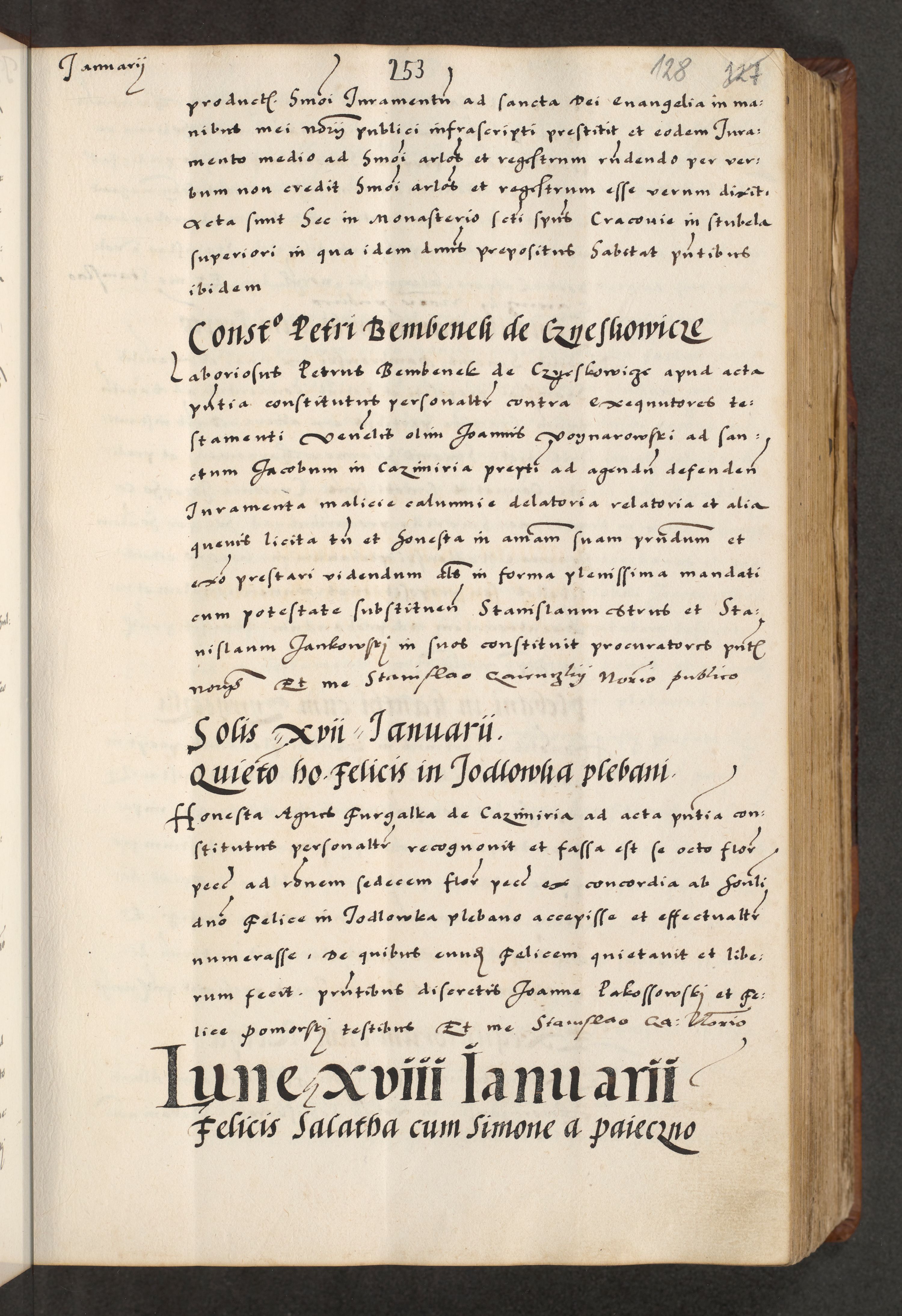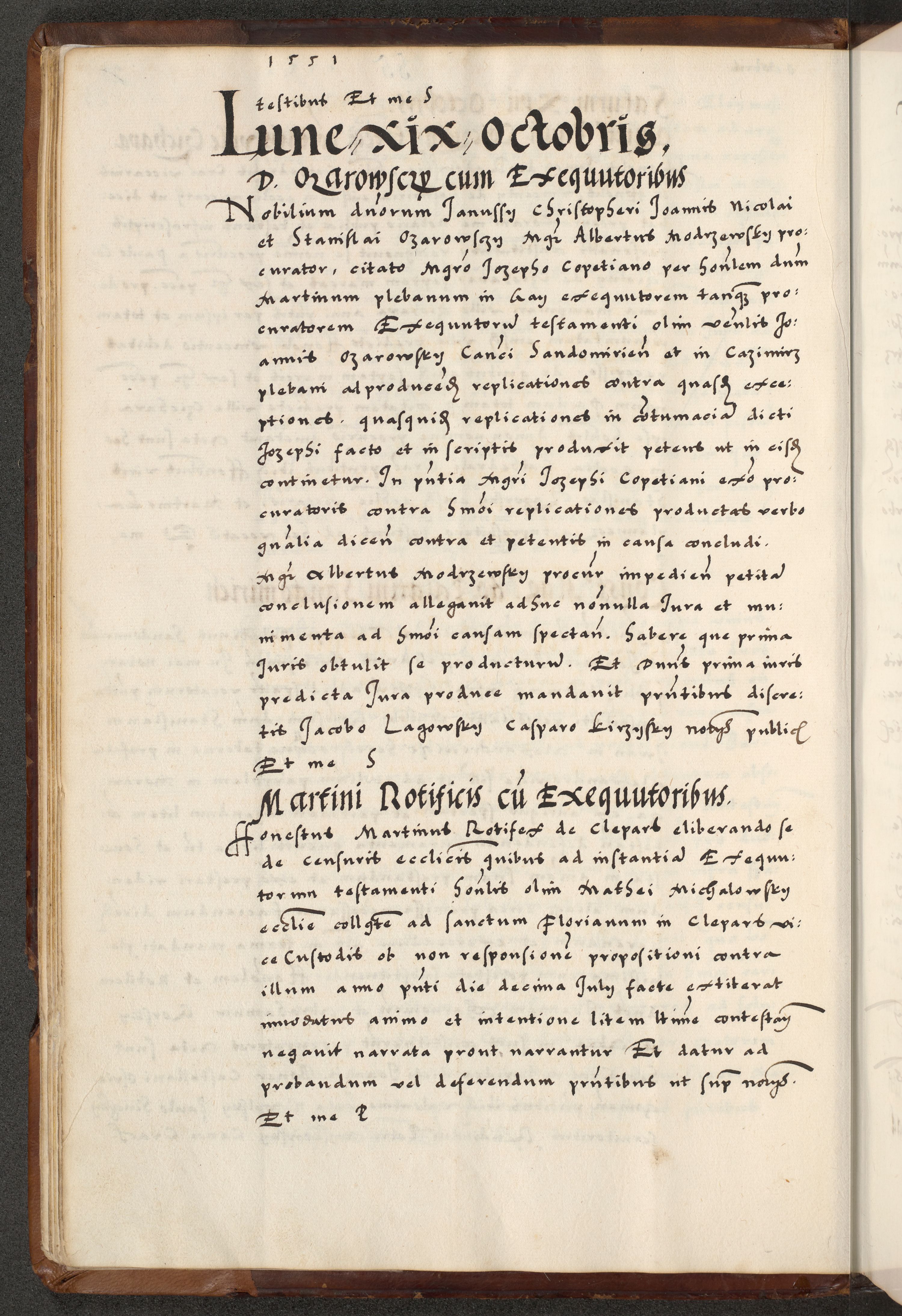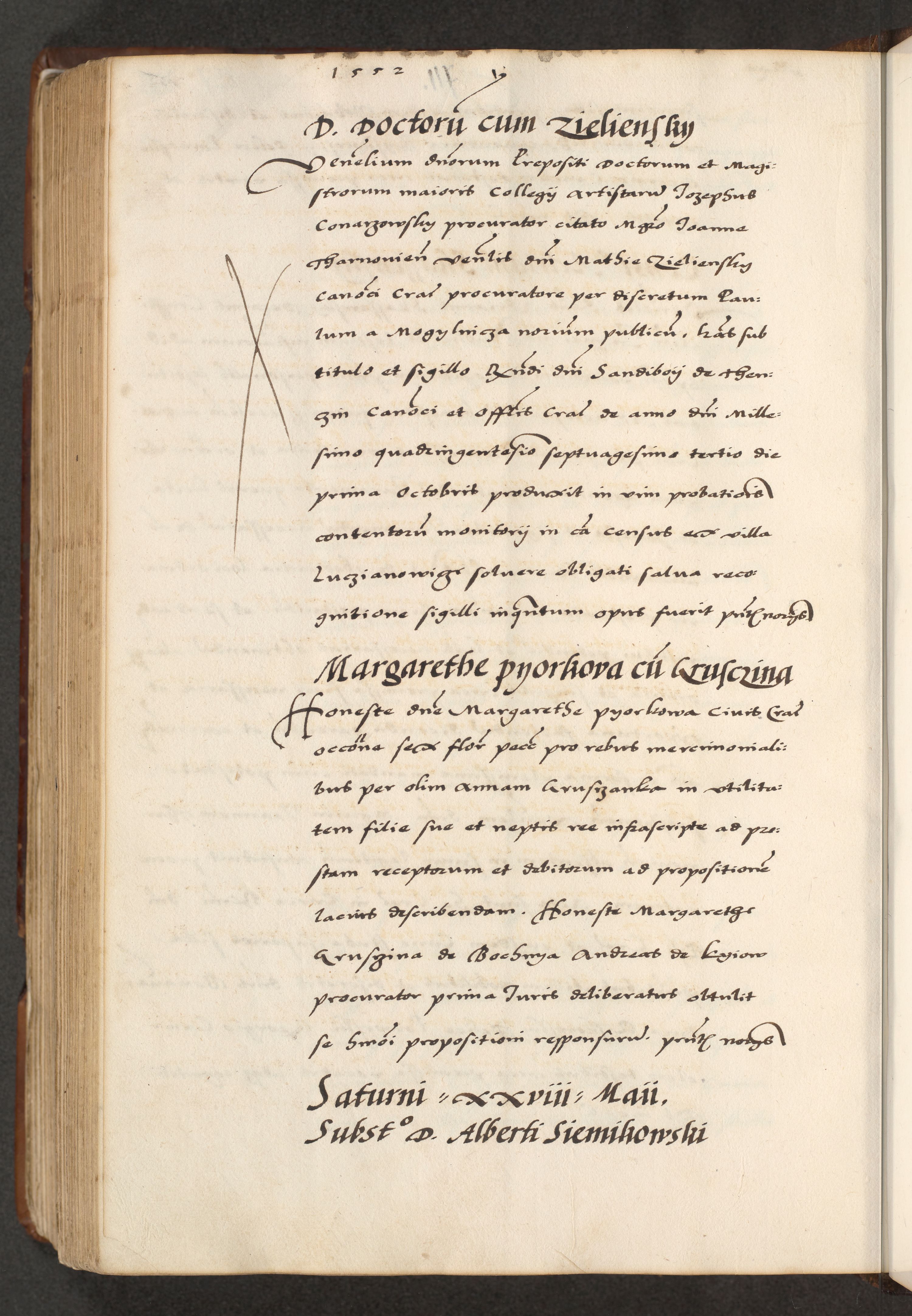 [A]cta actorum causarum, sententiarum tam diffinitivarum quam interloquutoriarum, obligationum, constitutionum et contractuum coram reverendo patre domino Petro Porembski preposito Osvieczimensi, canonico et officiali generali Cracoviensi de anno Domini millesimo quingentesimo quinguagesimo primo, cuius indictio est nona, pontificatus sanctissimi in Christo patris et domini nostri domini Juliii divina providencia pape tercii, anno secundo, a die et mense infrascriptis feliciter continiantur