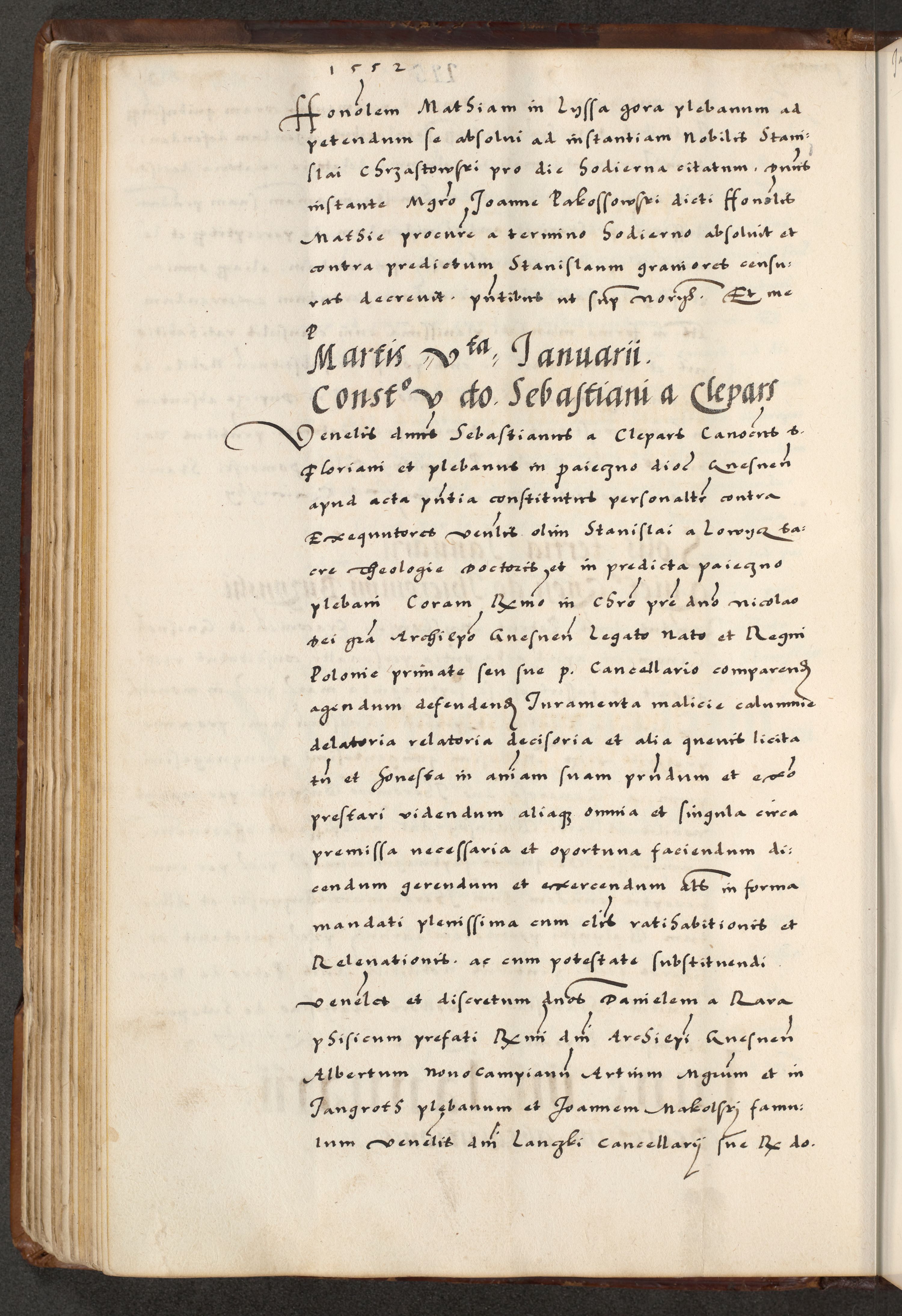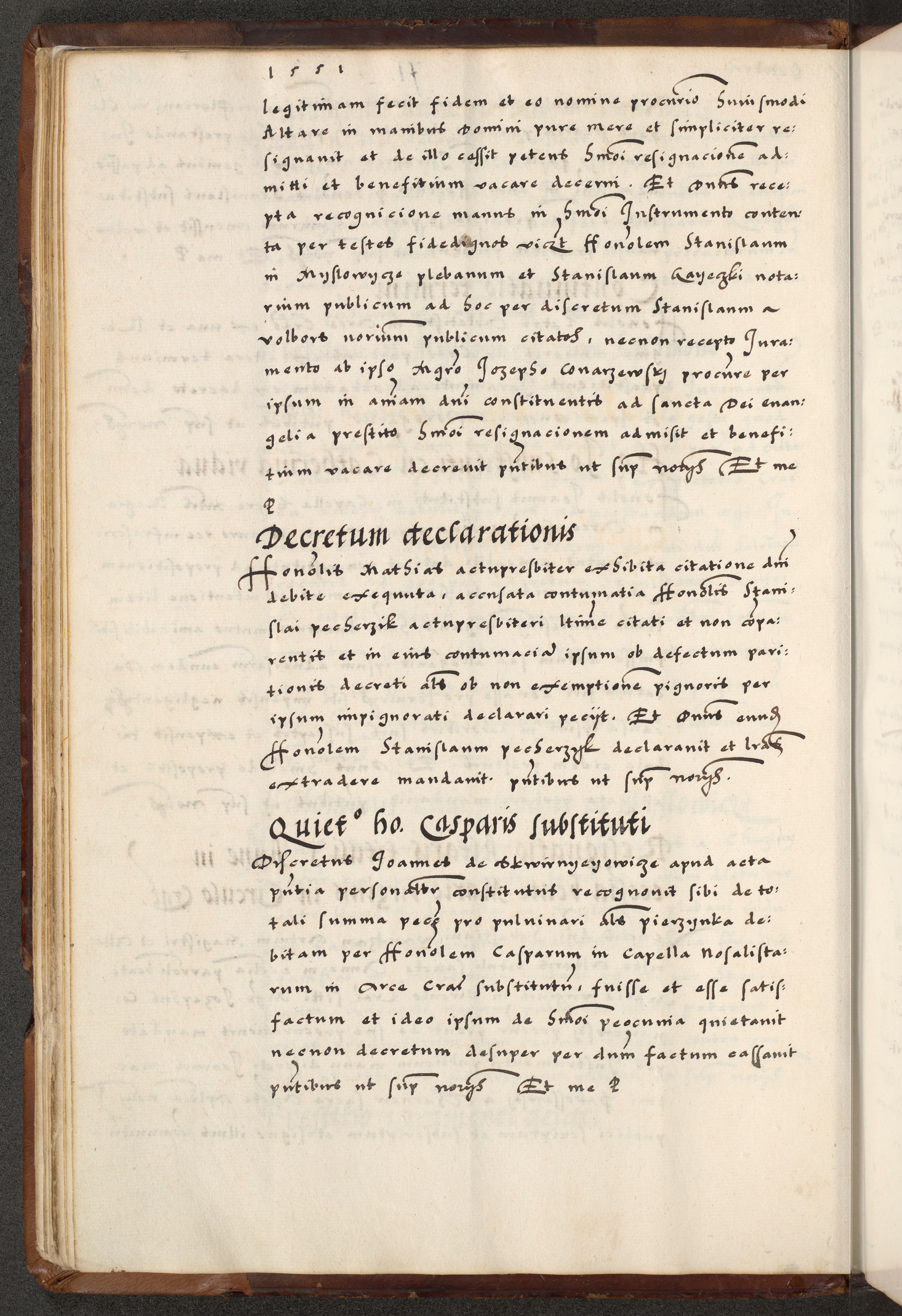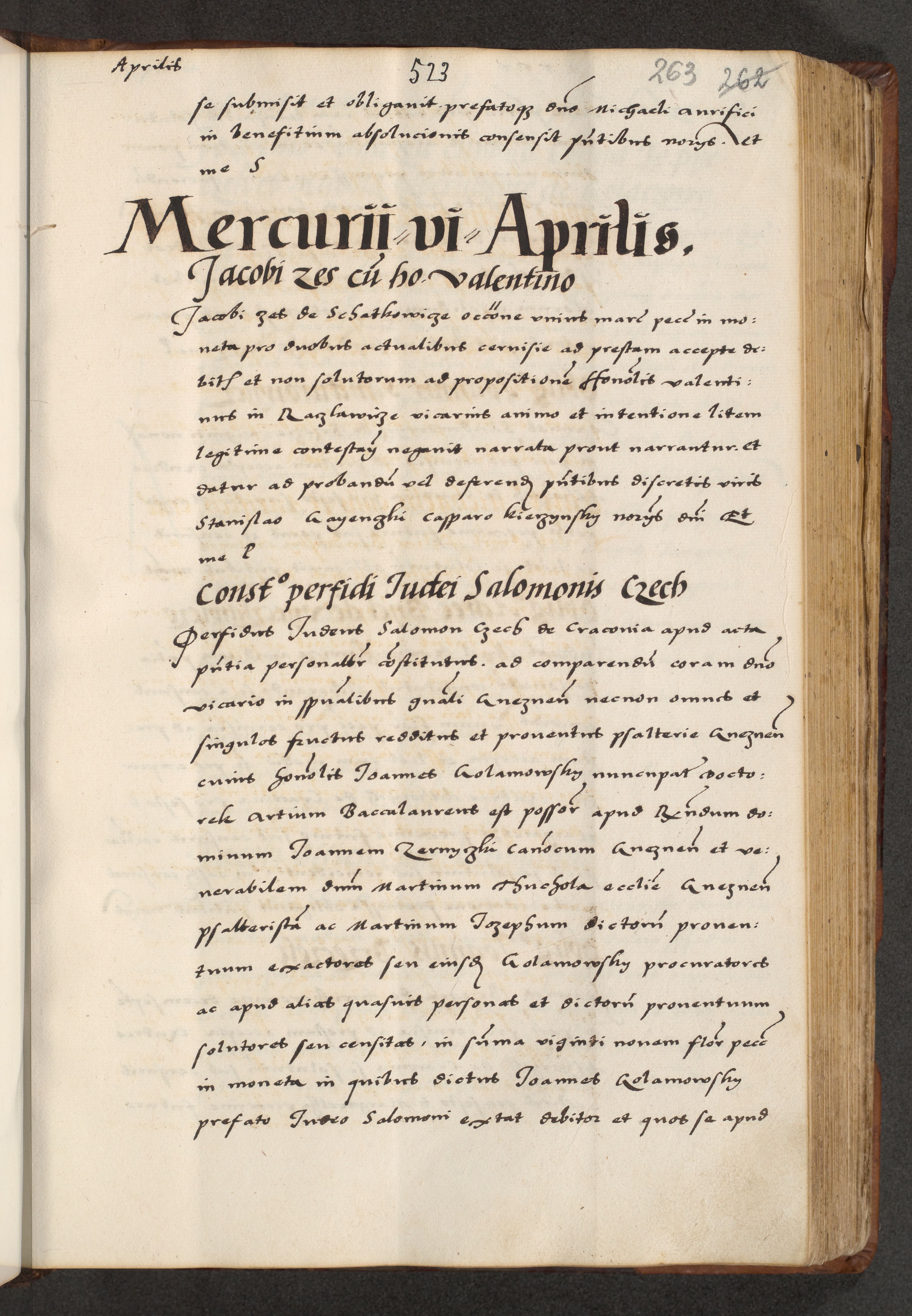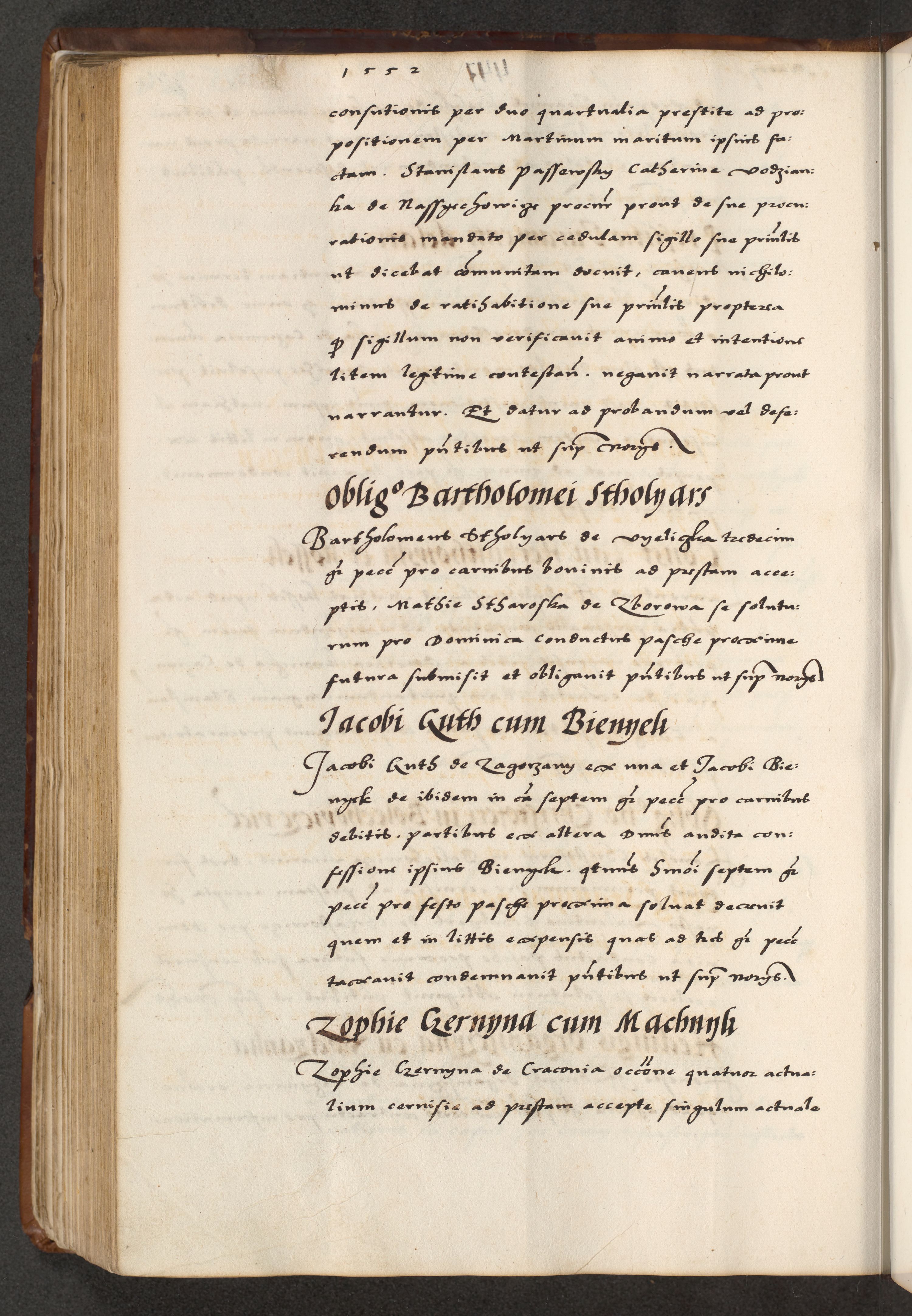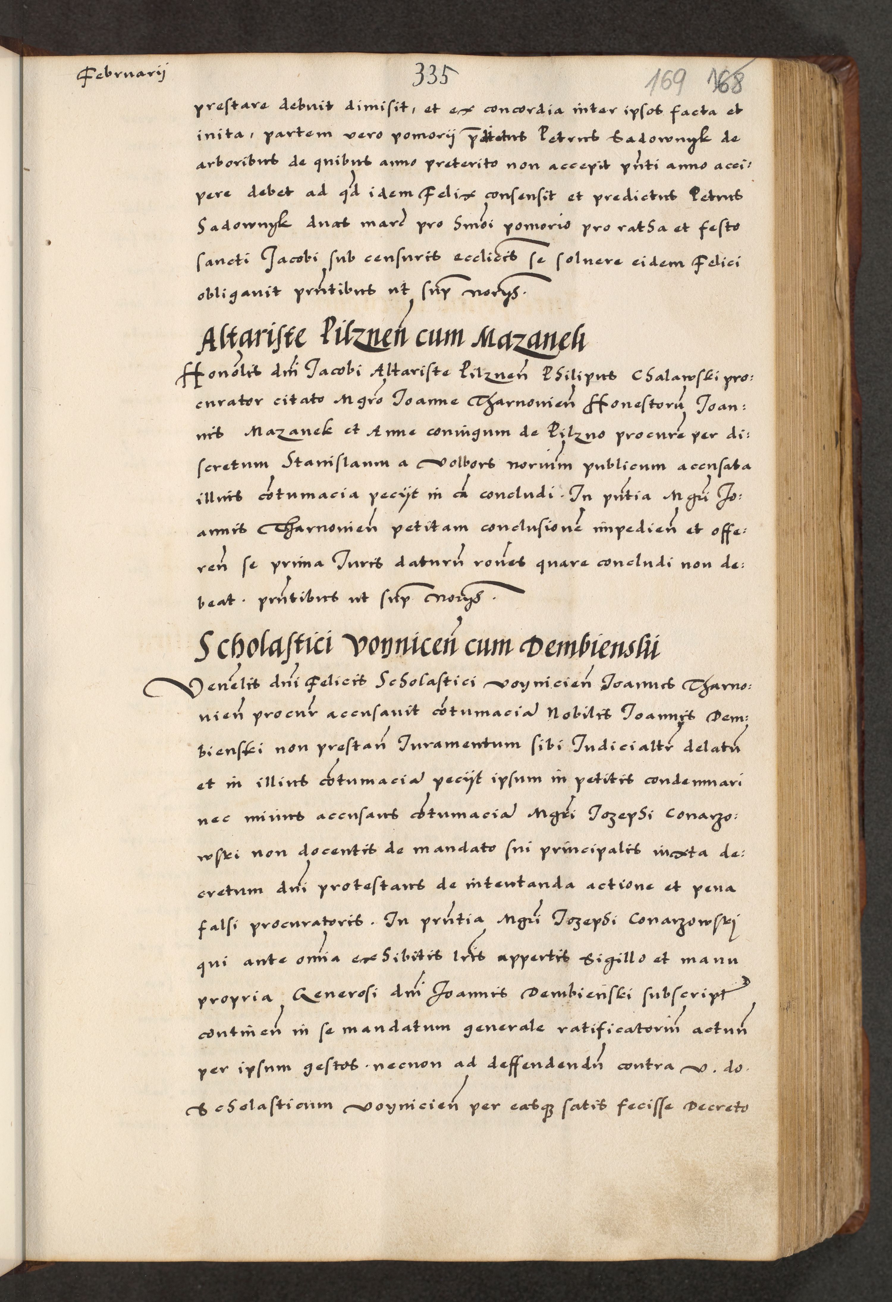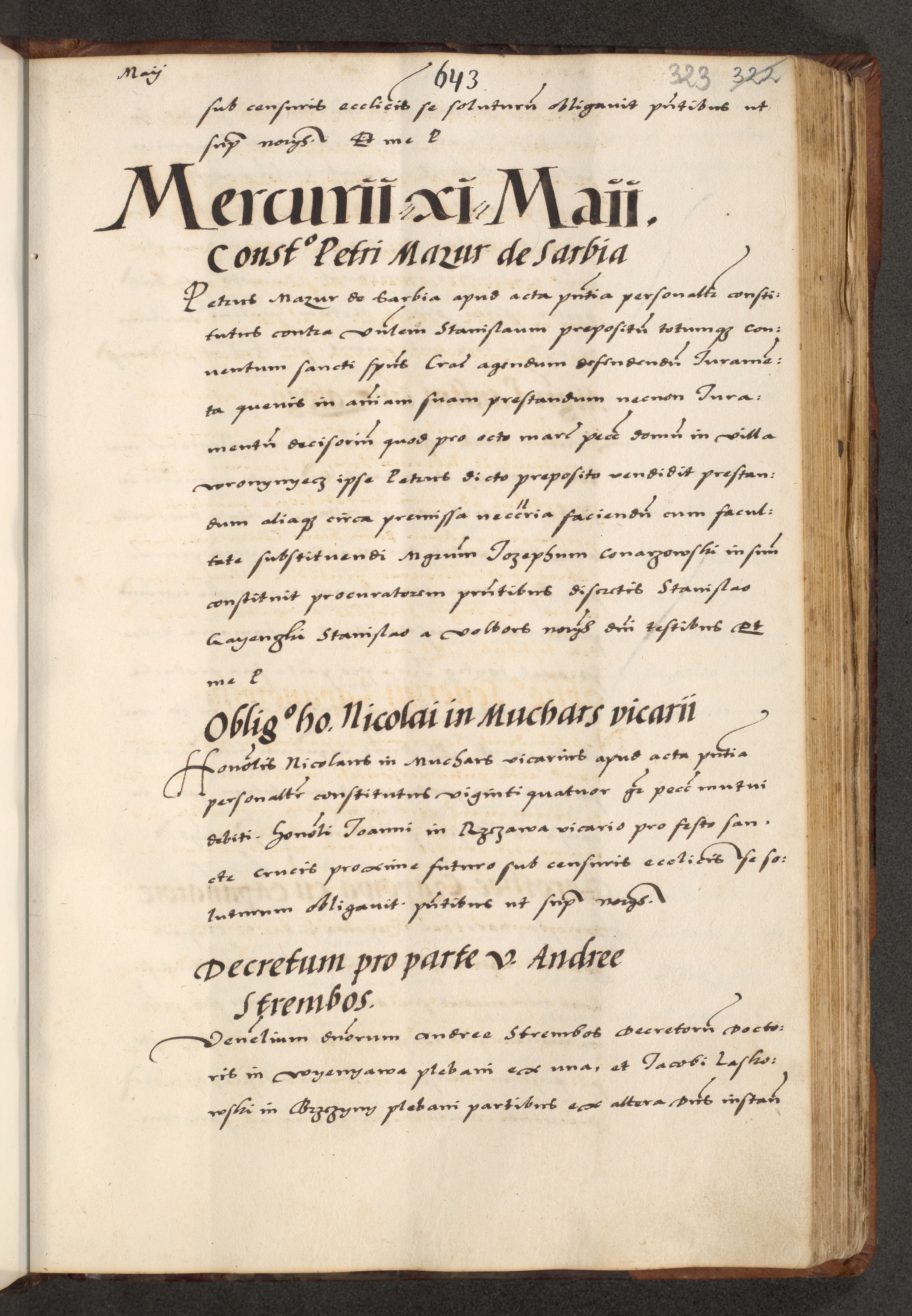 [A]cta actorum causarum, sententiarum tam diffinitivarum quam interloquutoriarum, obligationum, constitutionum et contractuum coram reverendo patre domino Petro Porembski preposito Osvieczimensi, canonico et officiali generali Cracoviensi de anno Domini millesimo quingentesimo quinguagesimo primo, cuius indictio est nona, pontificatus sanctissimi in Christo patris et domini nostri domini Juliii divina providencia pape tercii, anno secundo, a die et mense infrascriptis feliciter continiantur