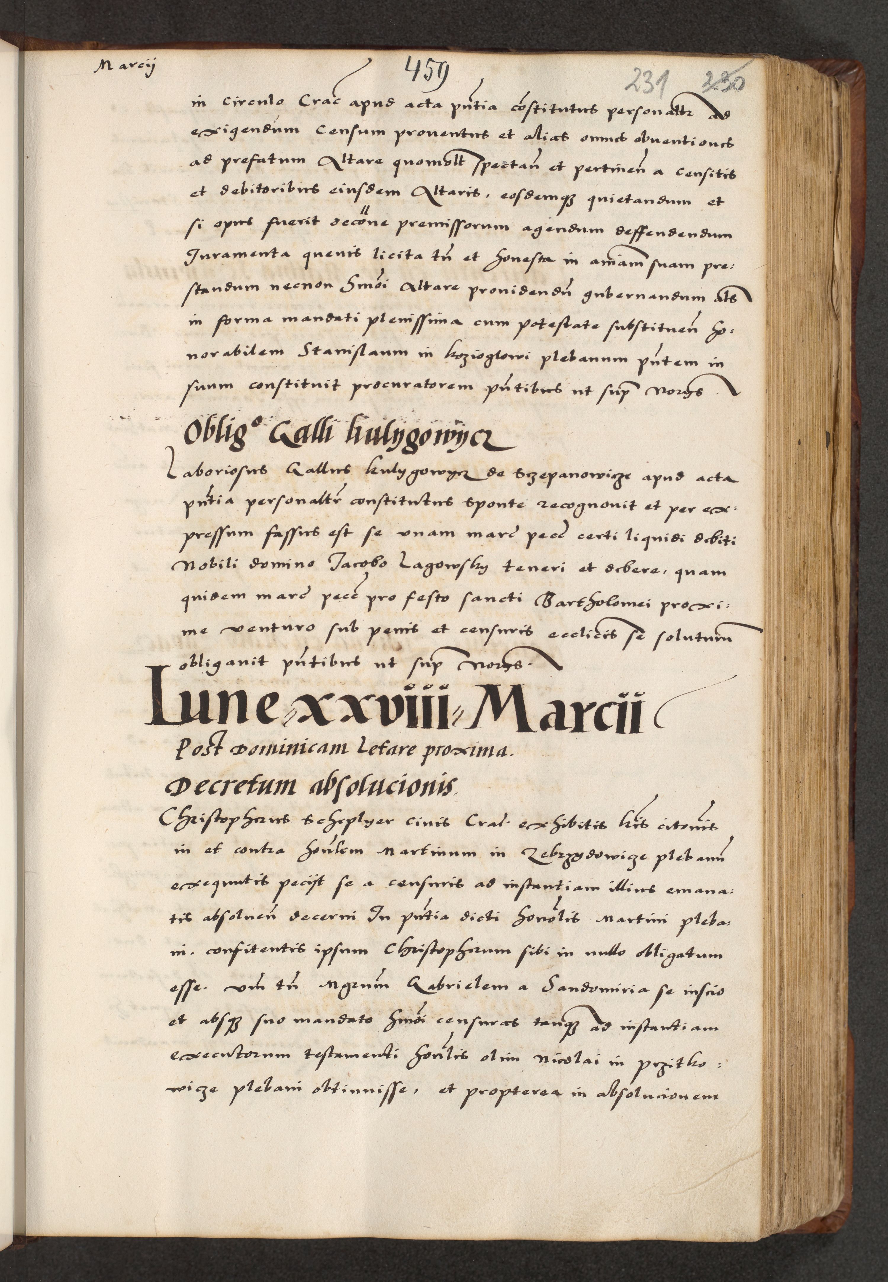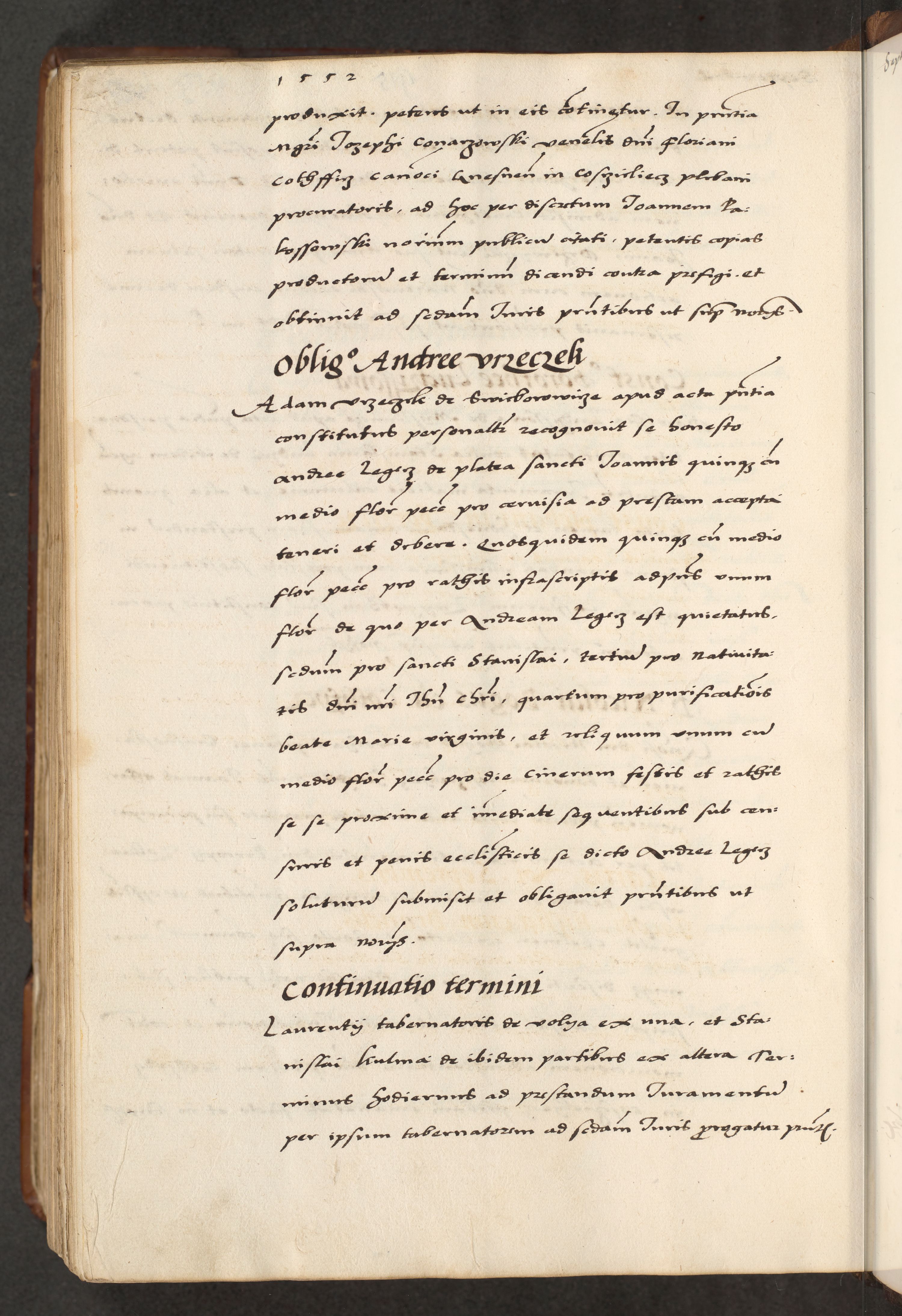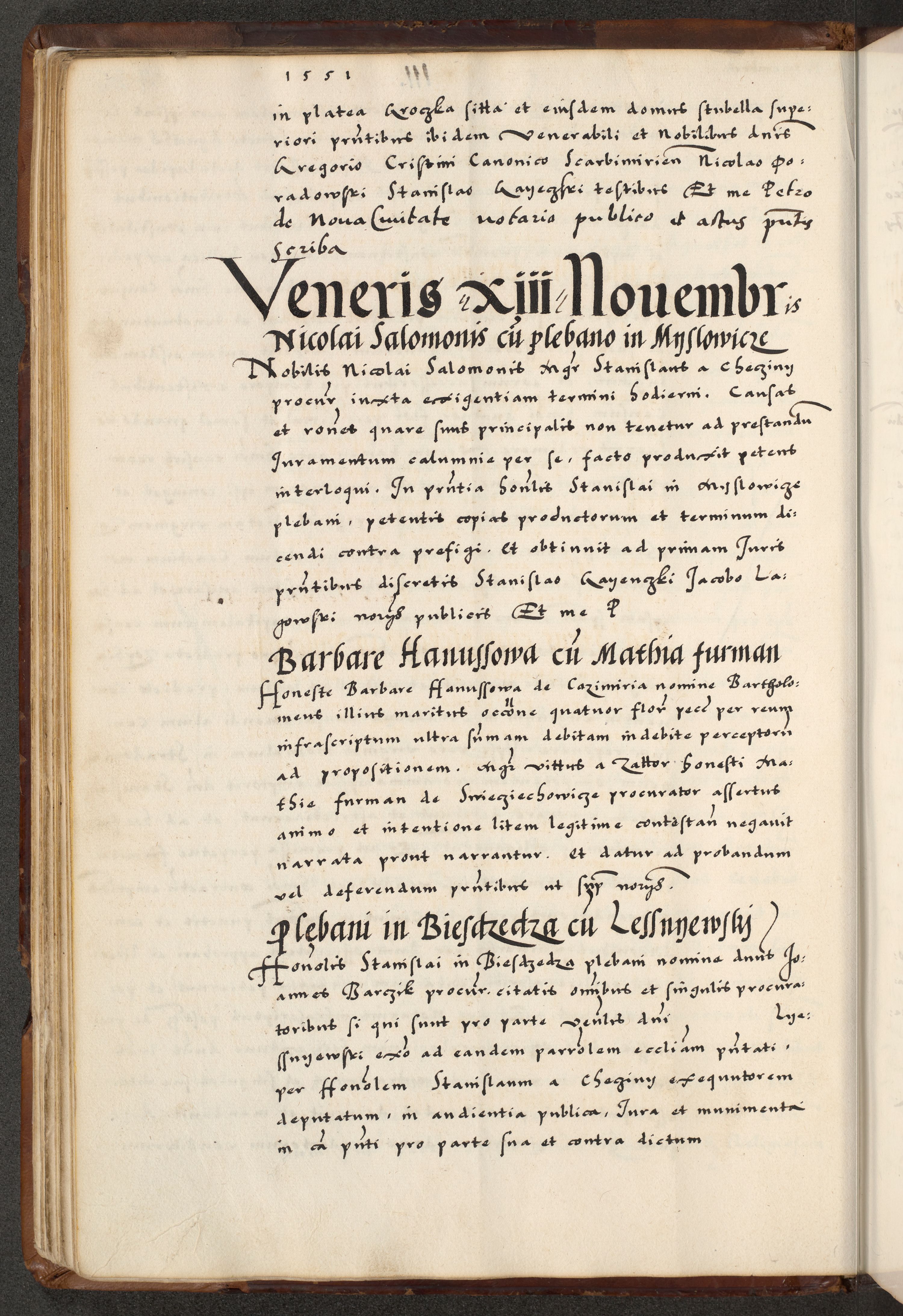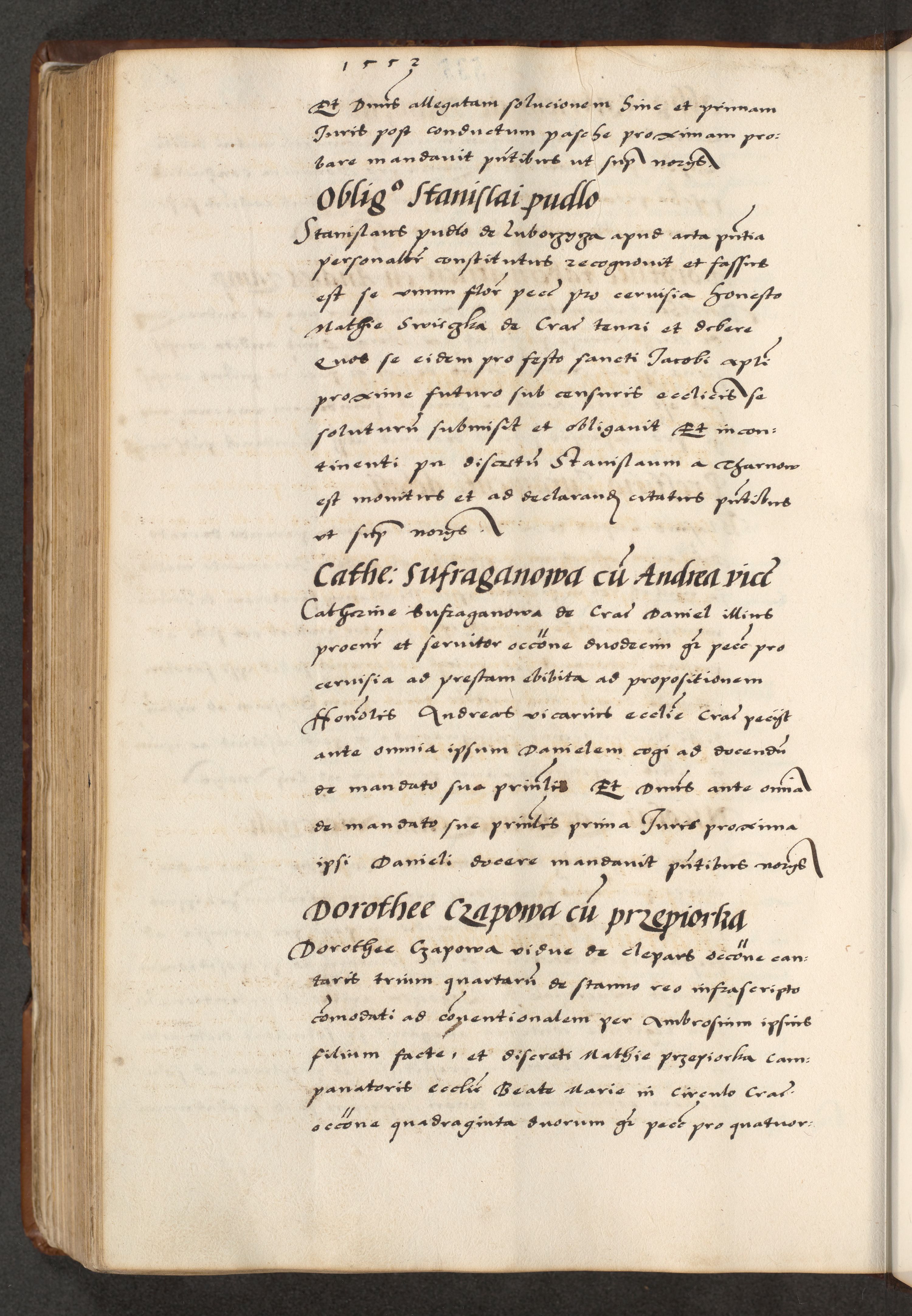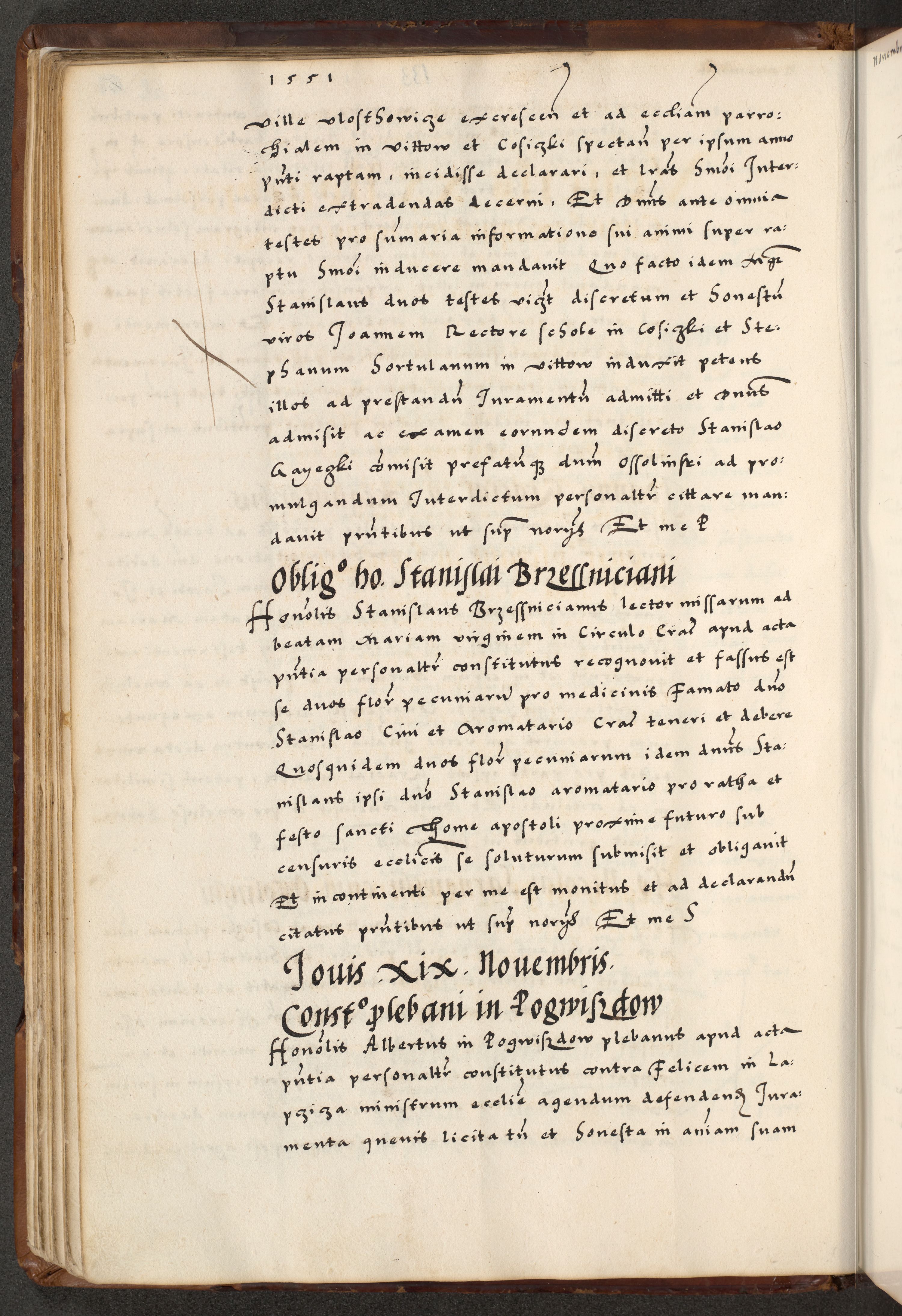 [A]cta actorum causarum, sententiarum tam diffinitivarum quam interloquutoriarum, obligationum, constitutionum et contractuum coram reverendo patre domino Petro Porembski preposito Osvieczimensi, canonico et officiali generali Cracoviensi de anno Domini millesimo quingentesimo quinguagesimo primo, cuius indictio est nona, pontificatus sanctissimi in Christo patris et domini nostri domini Juliii divina providencia pape tercii, anno secundo, a die et mense infrascriptis feliciter continiantur