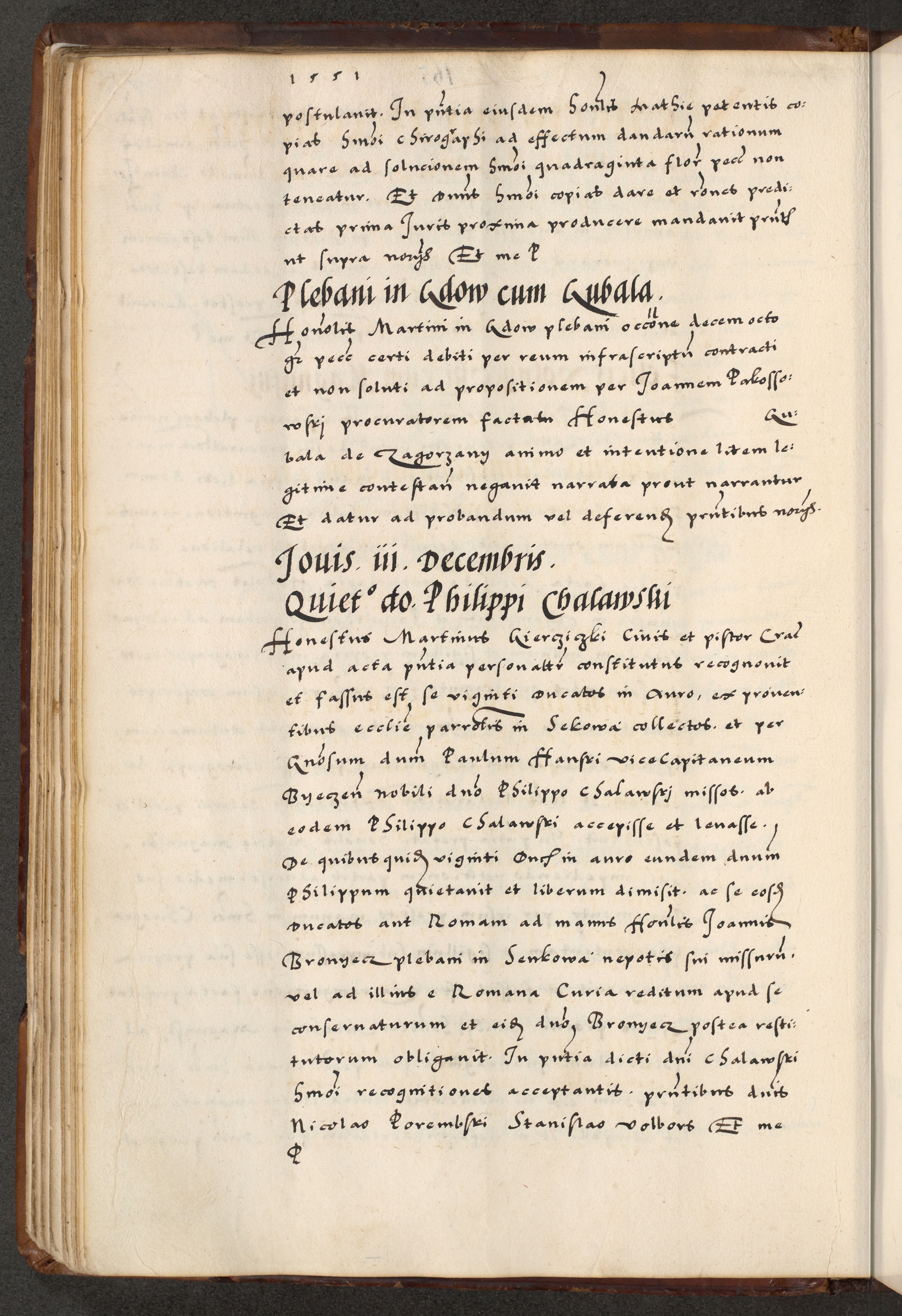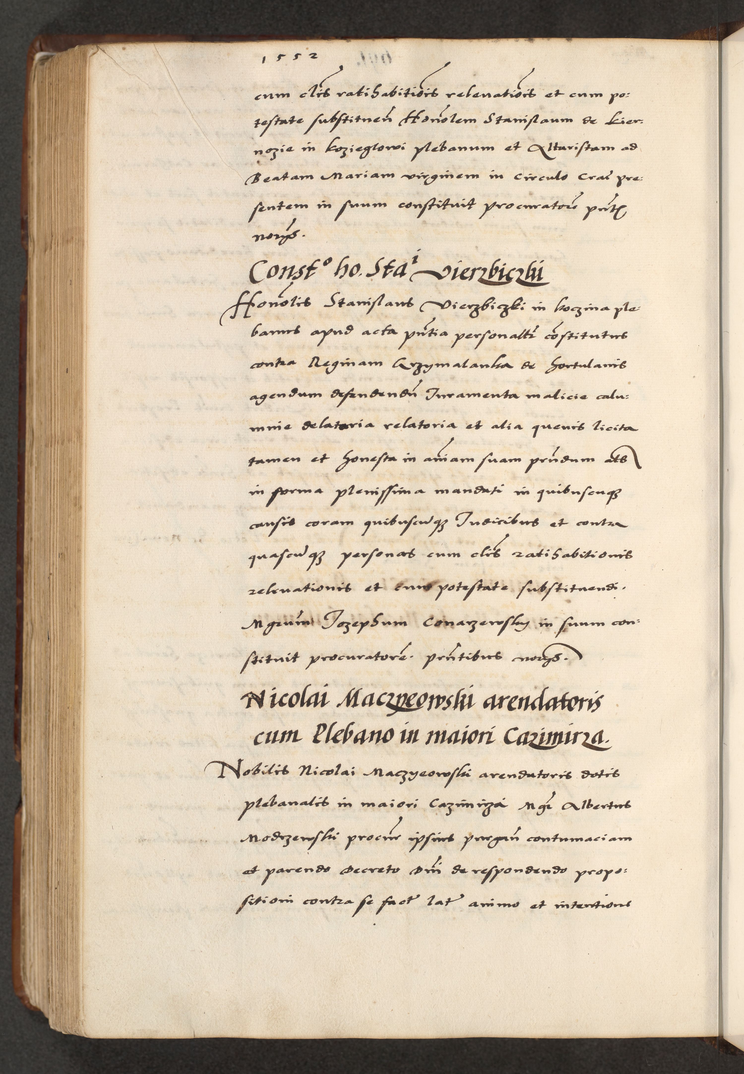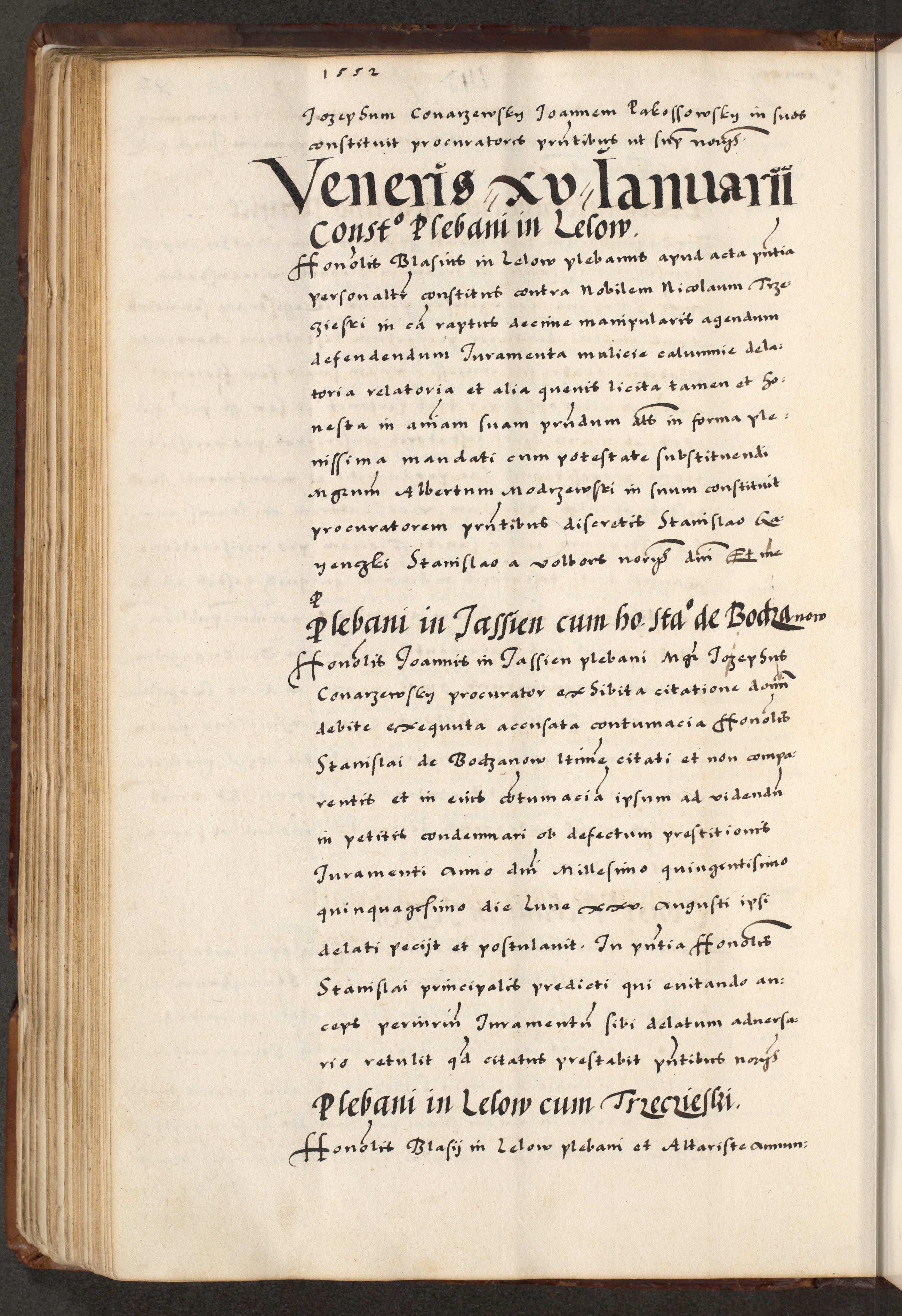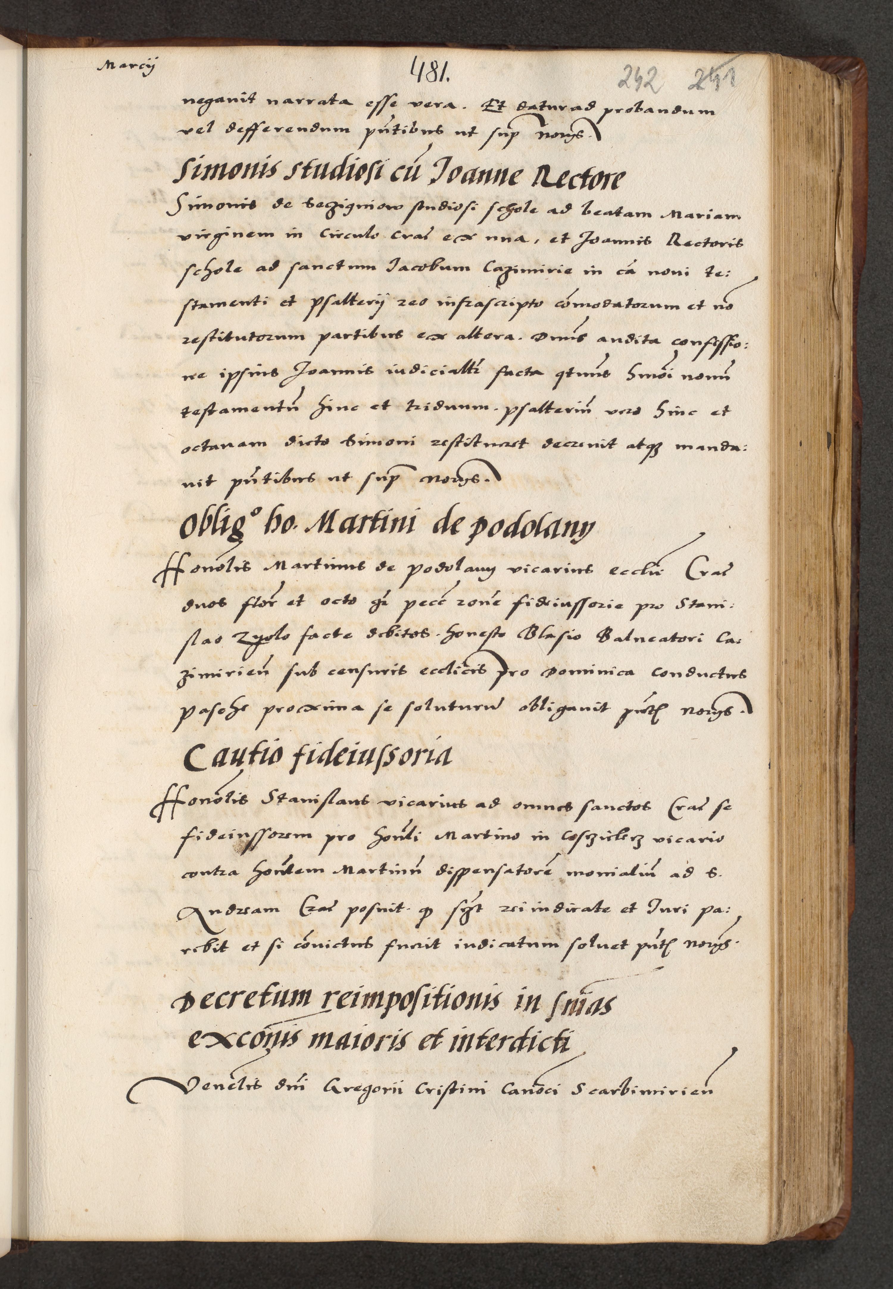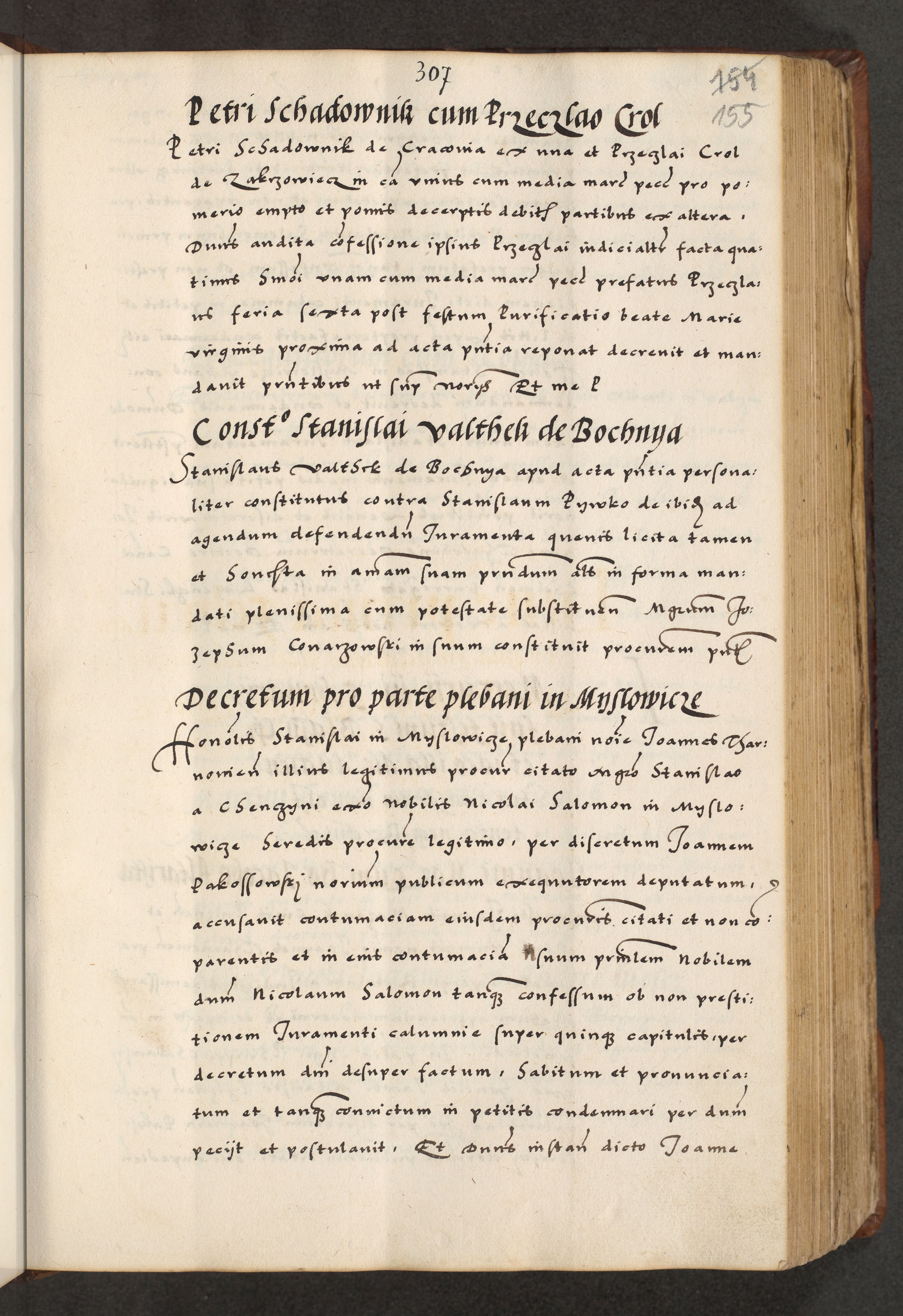 [A]cta actorum causarum, sententiarum tam diffinitivarum quam interloquutoriarum, obligationum, constitutionum et contractuum coram reverendo patre domino Petro Porembski preposito Osvieczimensi, canonico et officiali generali Cracoviensi de anno Domini millesimo quingentesimo quinguagesimo primo, cuius indictio est nona, pontificatus sanctissimi in Christo patris et domini nostri domini Juliii divina providencia pape tercii, anno secundo, a die et mense infrascriptis feliciter continiantur