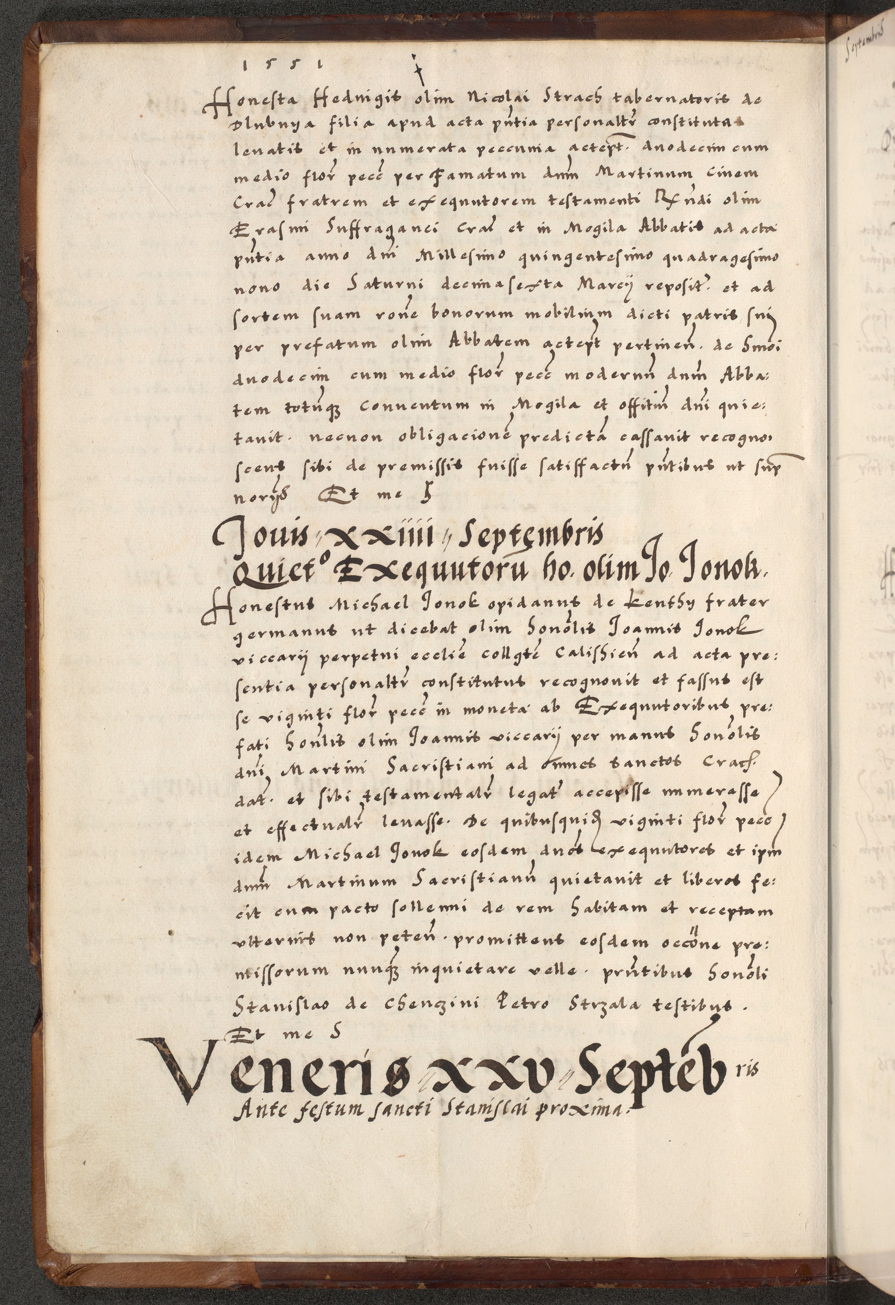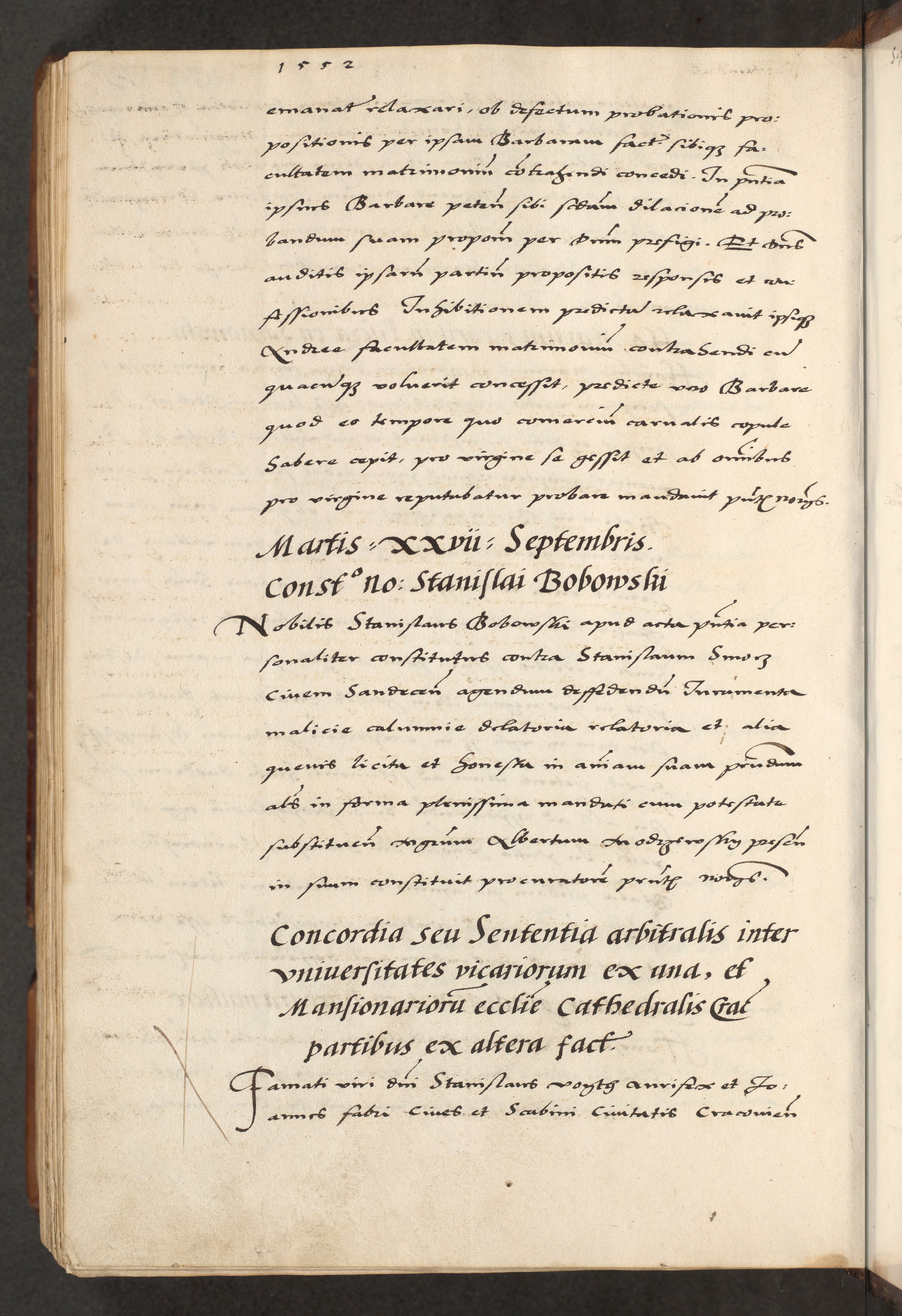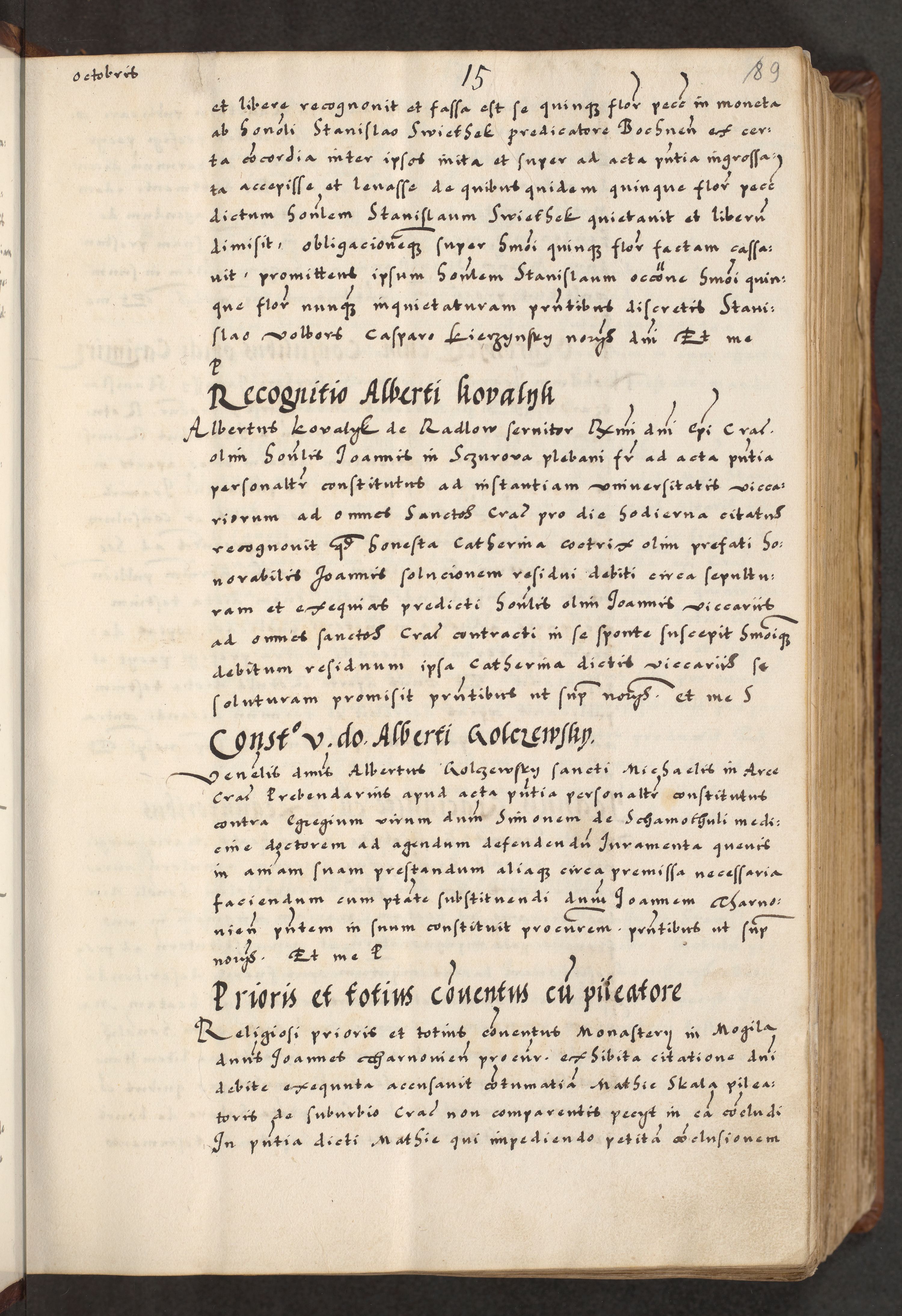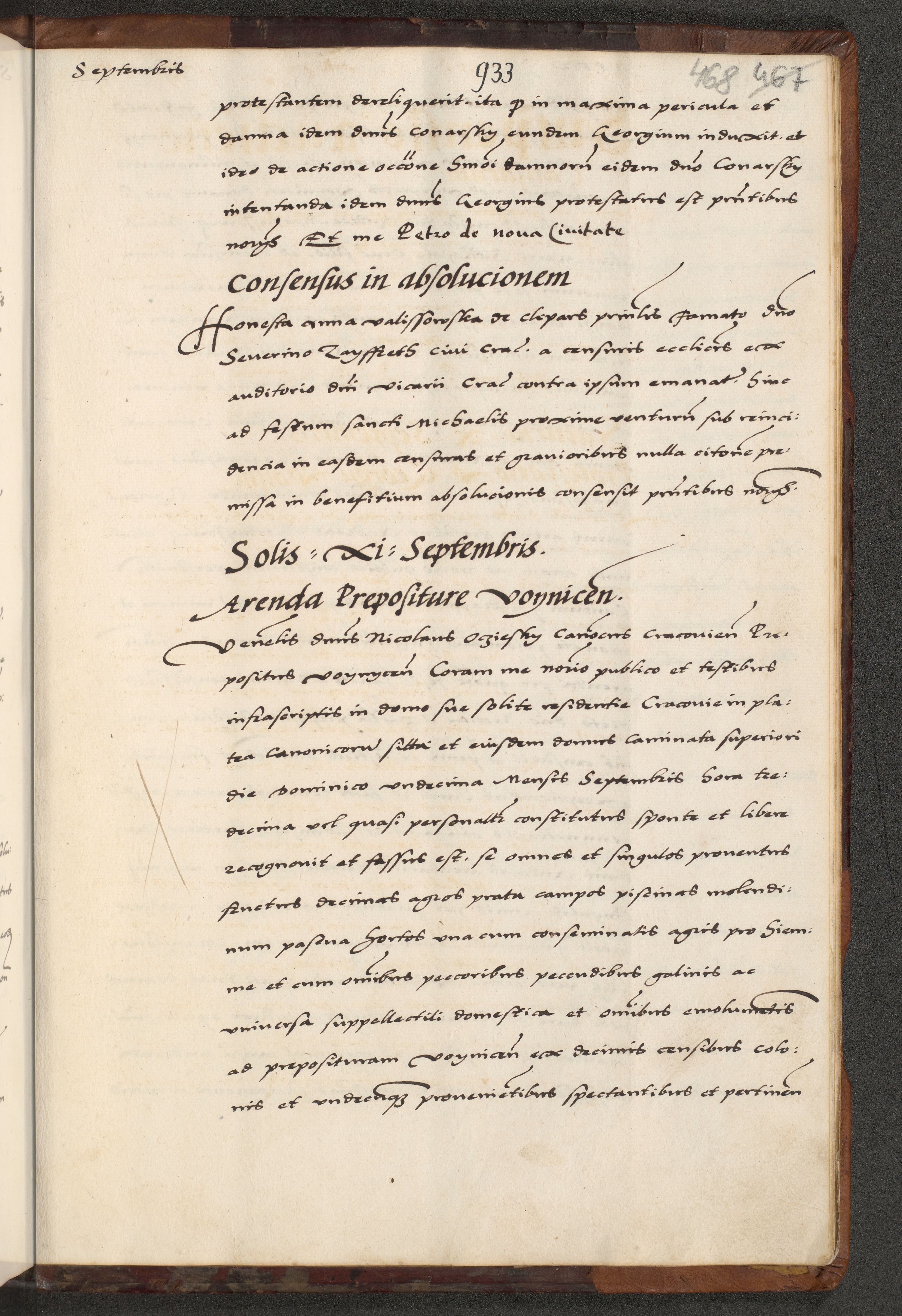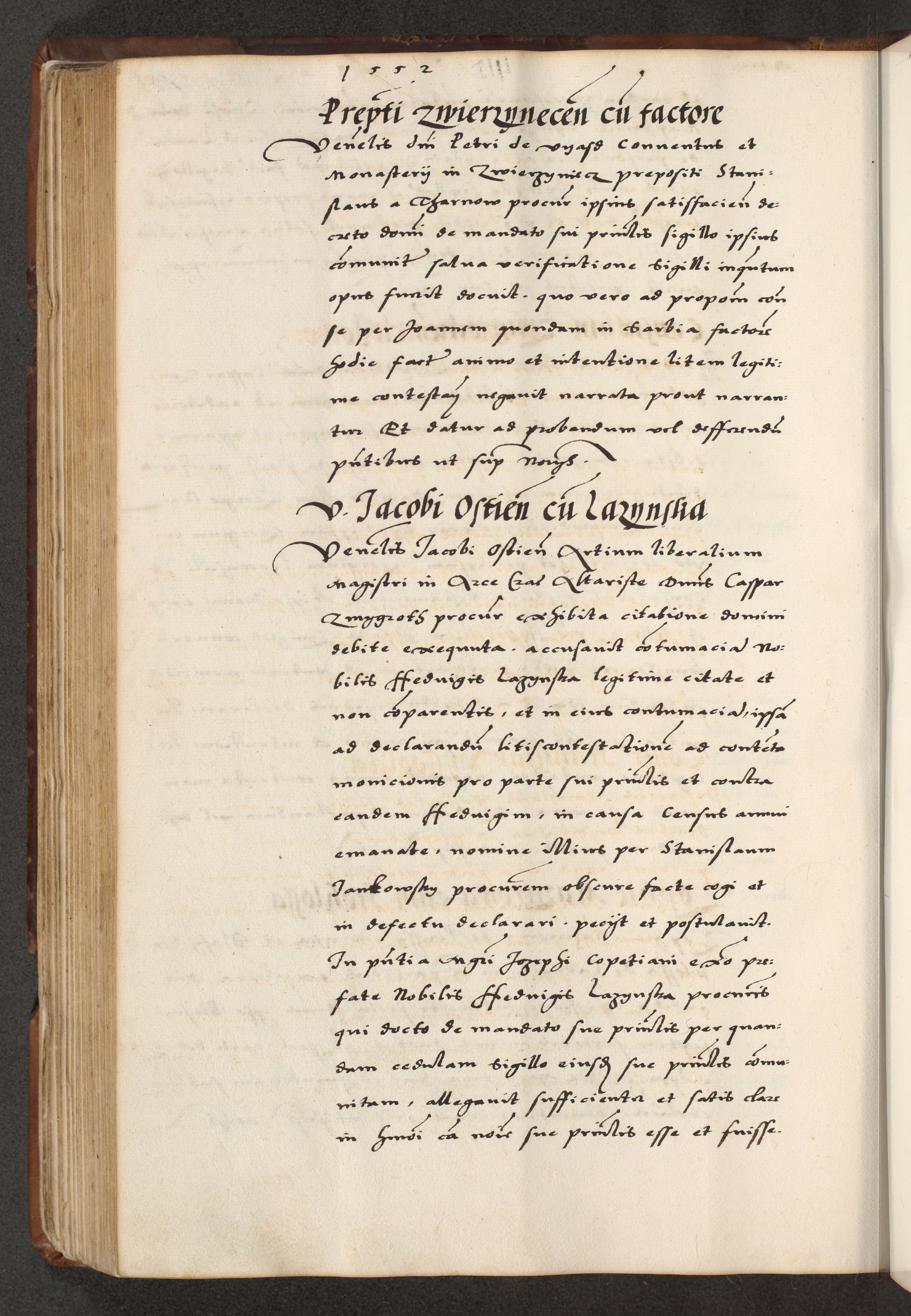 [A]cta actorum causarum, sententiarum tam diffinitivarum quam interloquutoriarum, obligationum, constitutionum et contractuum coram reverendo patre domino Petro Porembski preposito Osvieczimensi, canonico et officiali generali Cracoviensi de anno Domini millesimo quingentesimo quinguagesimo primo, cuius indictio est nona, pontificatus sanctissimi in Christo patris et domini nostri domini Juliii divina providencia pape tercii, anno secundo, a die et mense infrascriptis feliciter continiantur