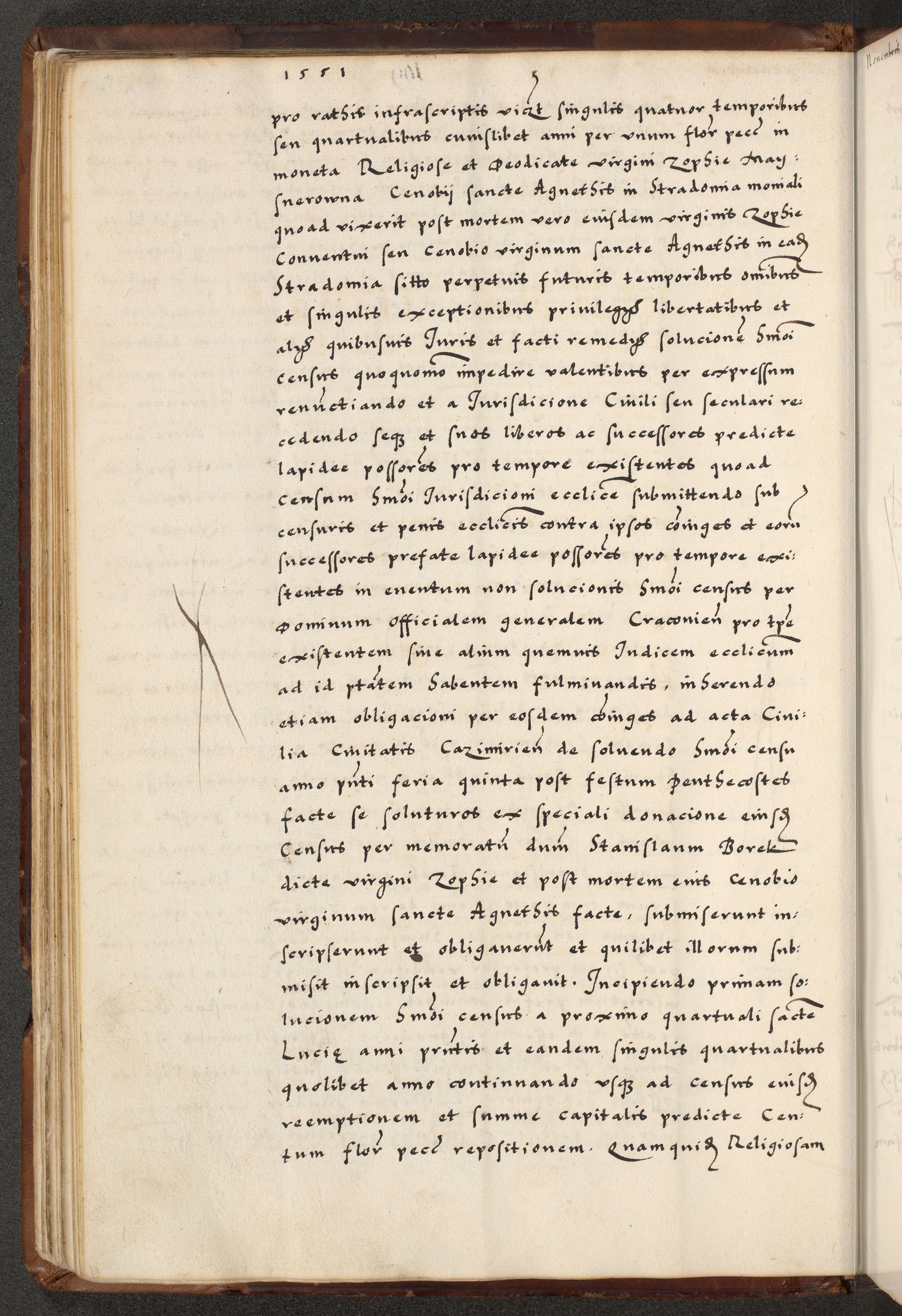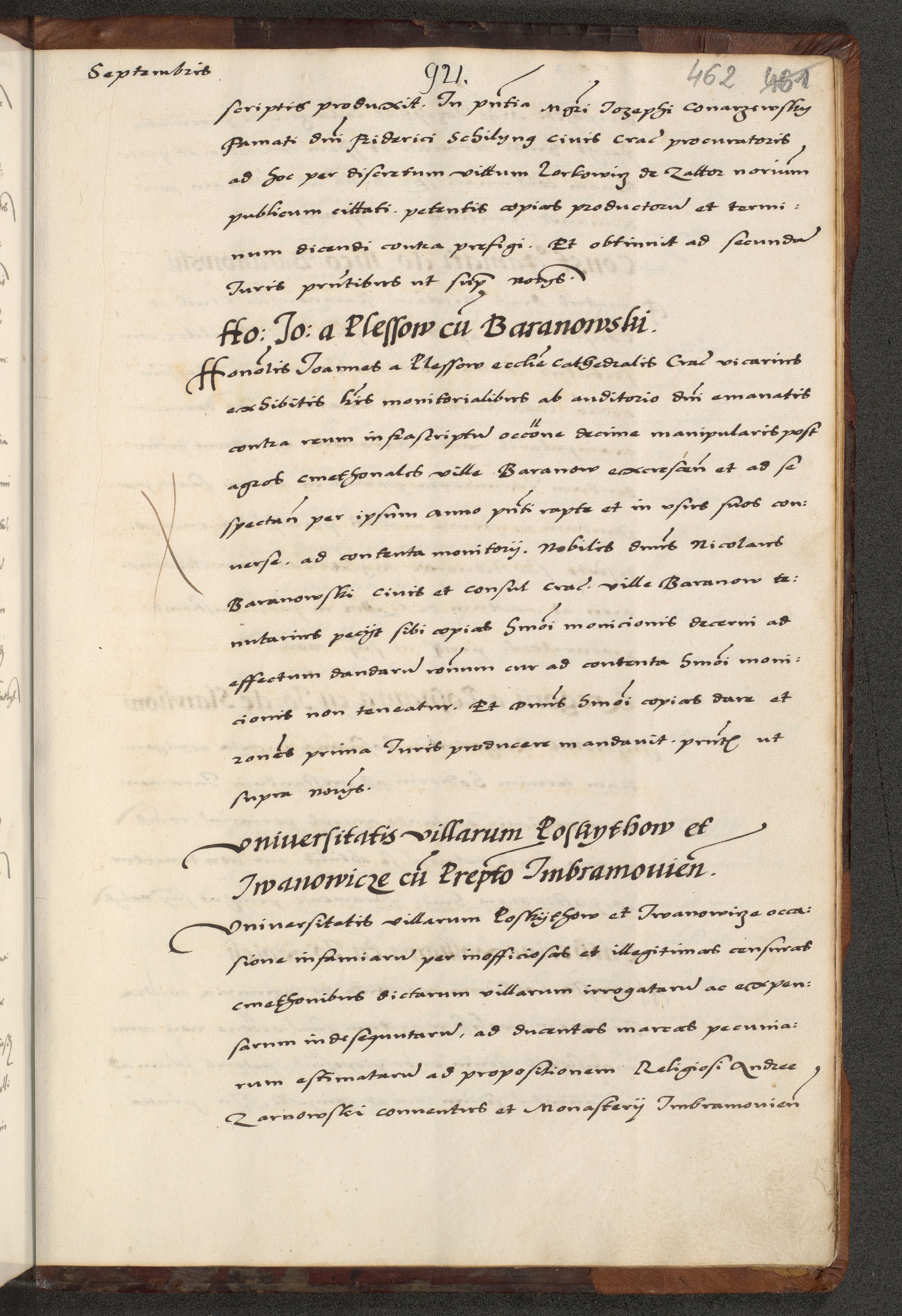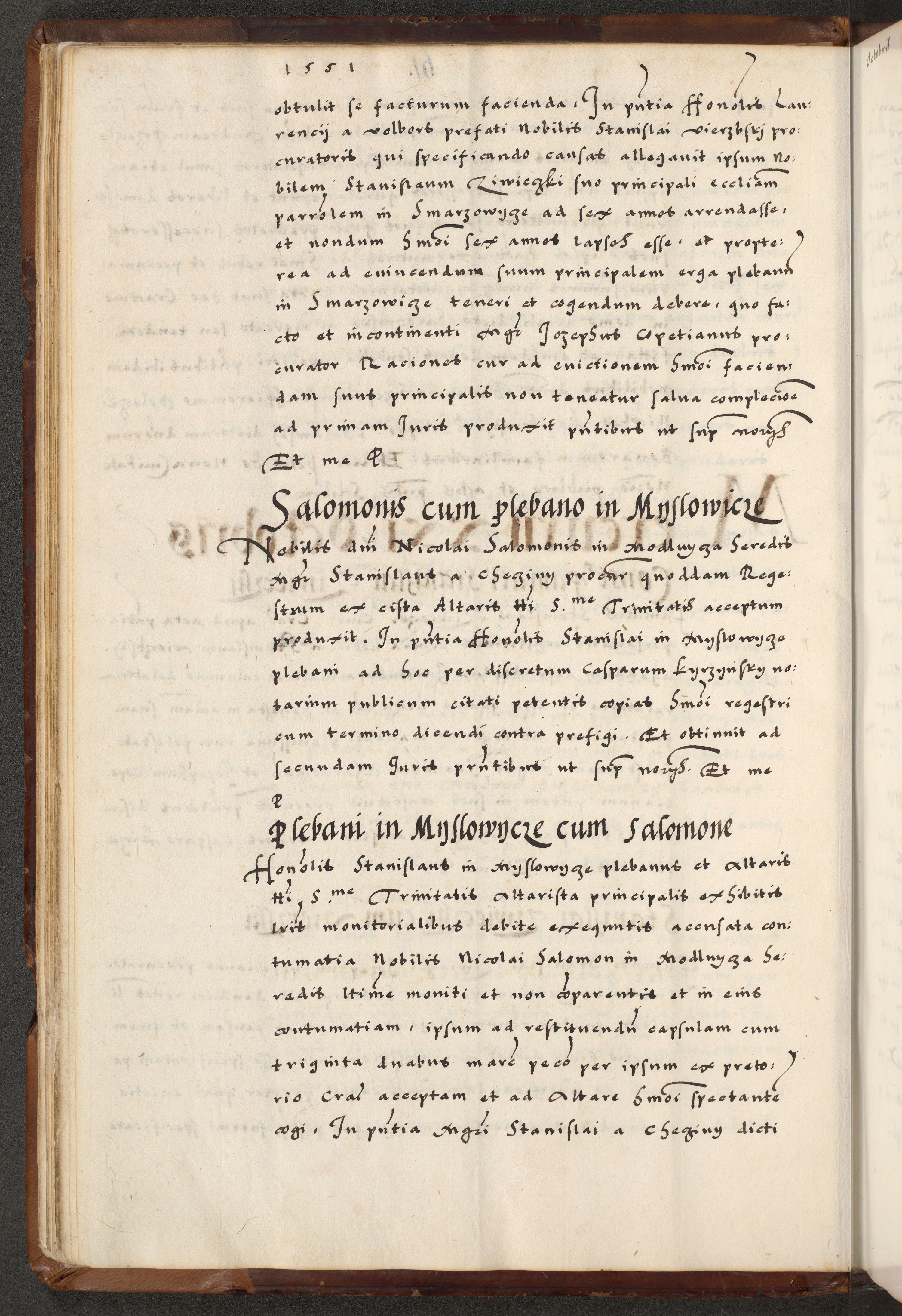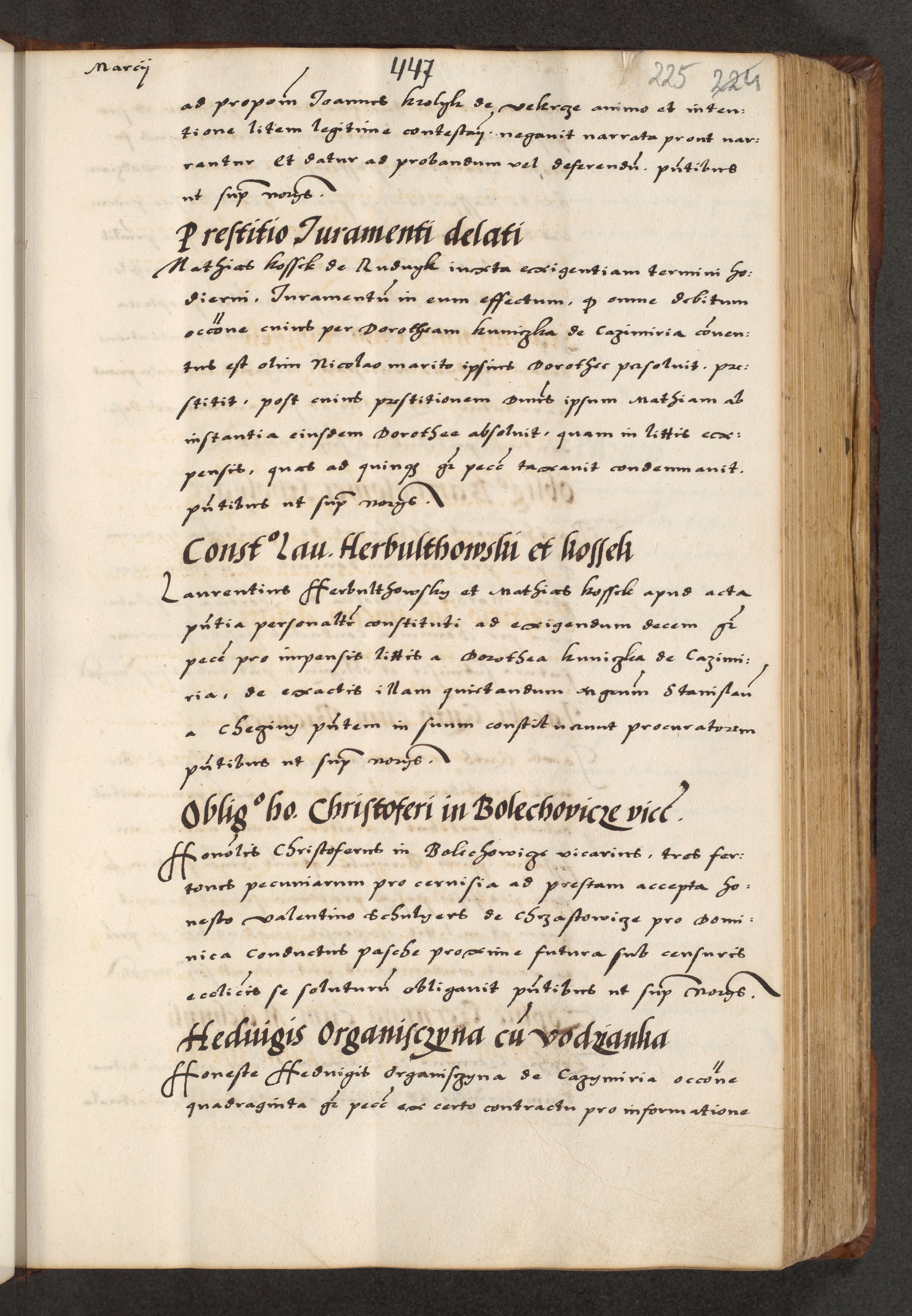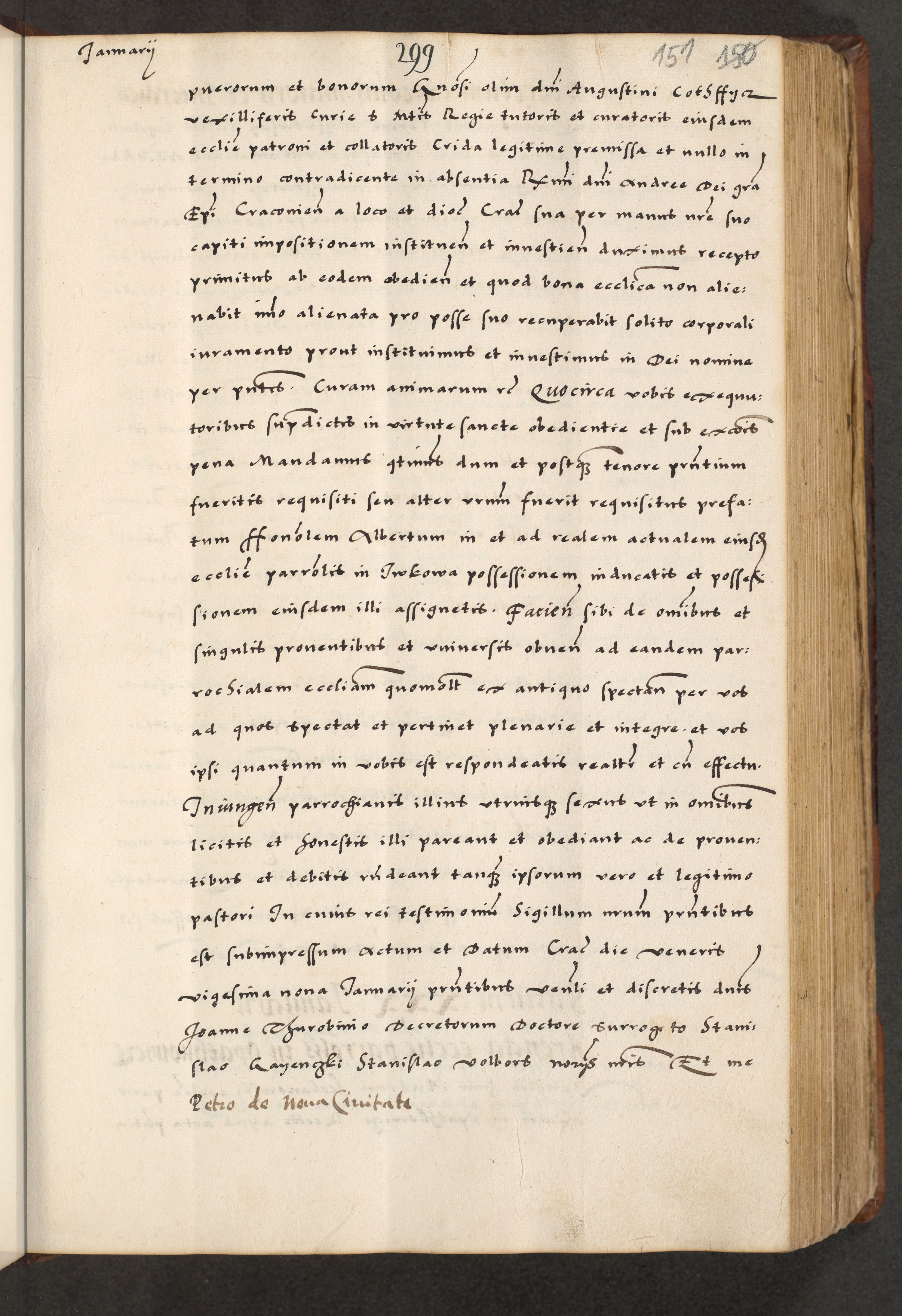 [A]cta actorum causarum, sententiarum tam diffinitivarum quam interloquutoriarum, obligationum, constitutionum et contractuum coram reverendo patre domino Petro Porembski preposito Osvieczimensi, canonico et officiali generali Cracoviensi de anno Domini millesimo quingentesimo quinguagesimo primo, cuius indictio est nona, pontificatus sanctissimi in Christo patris et domini nostri domini Juliii divina providencia pape tercii, anno secundo, a die et mense infrascriptis feliciter continiantur