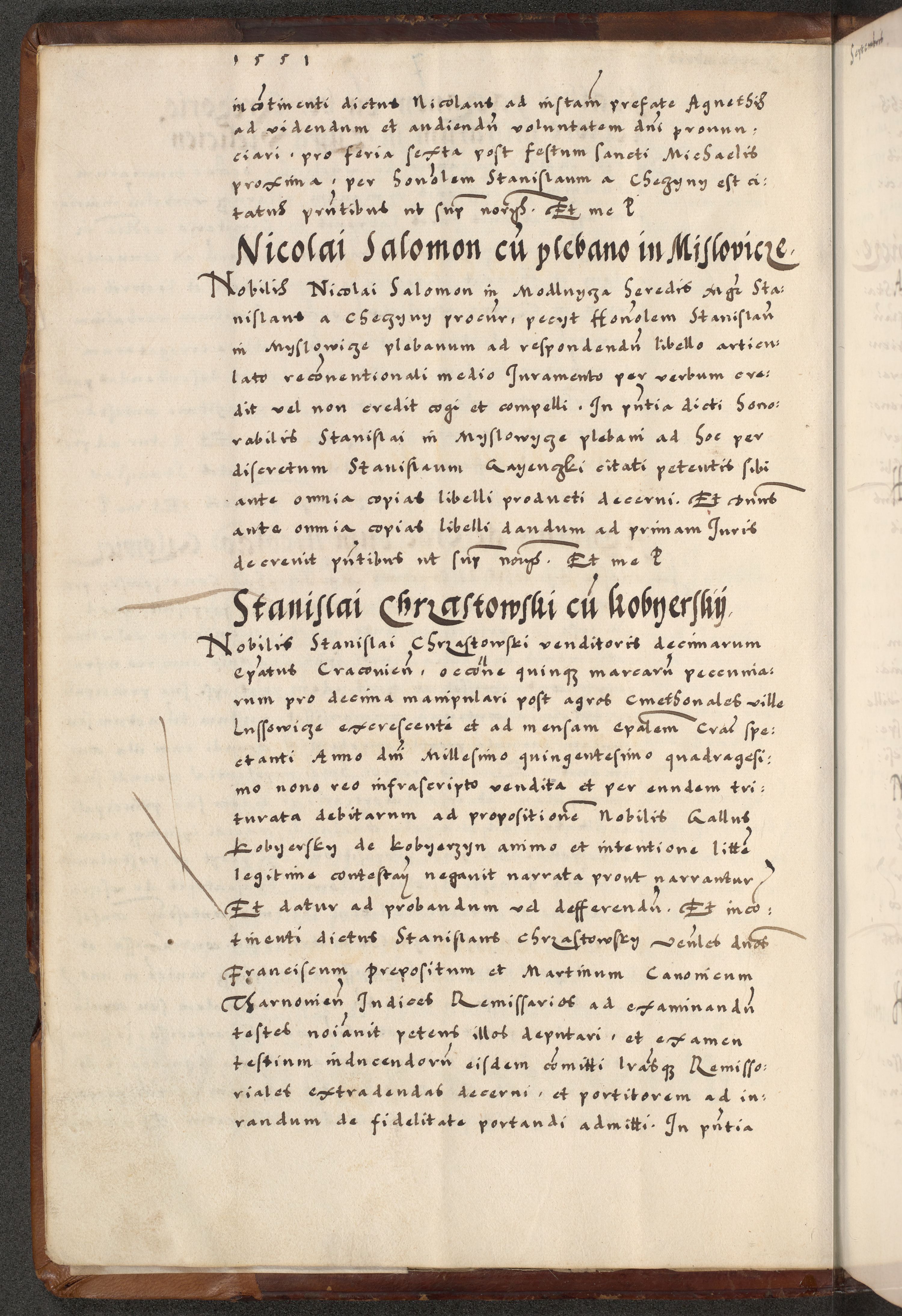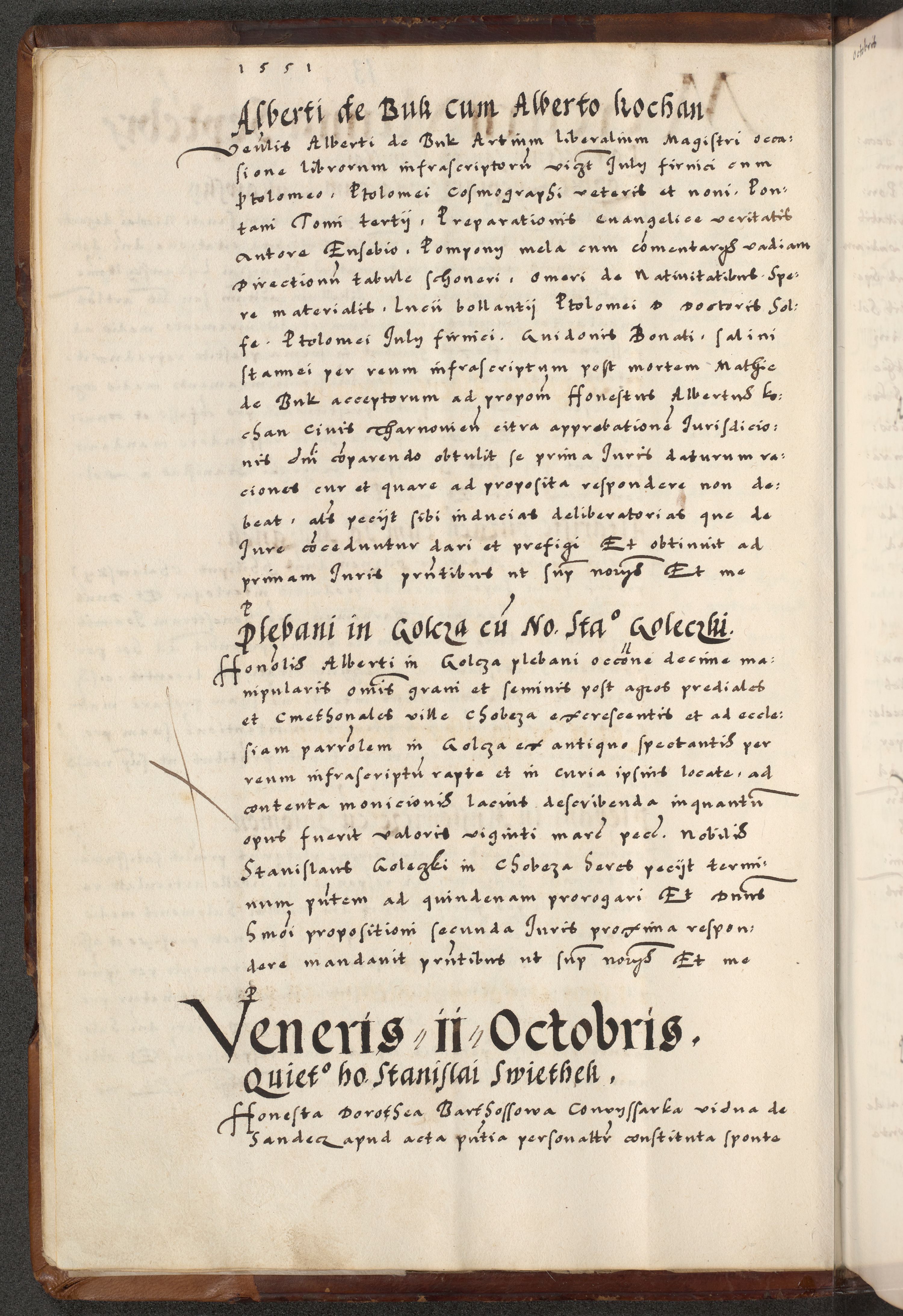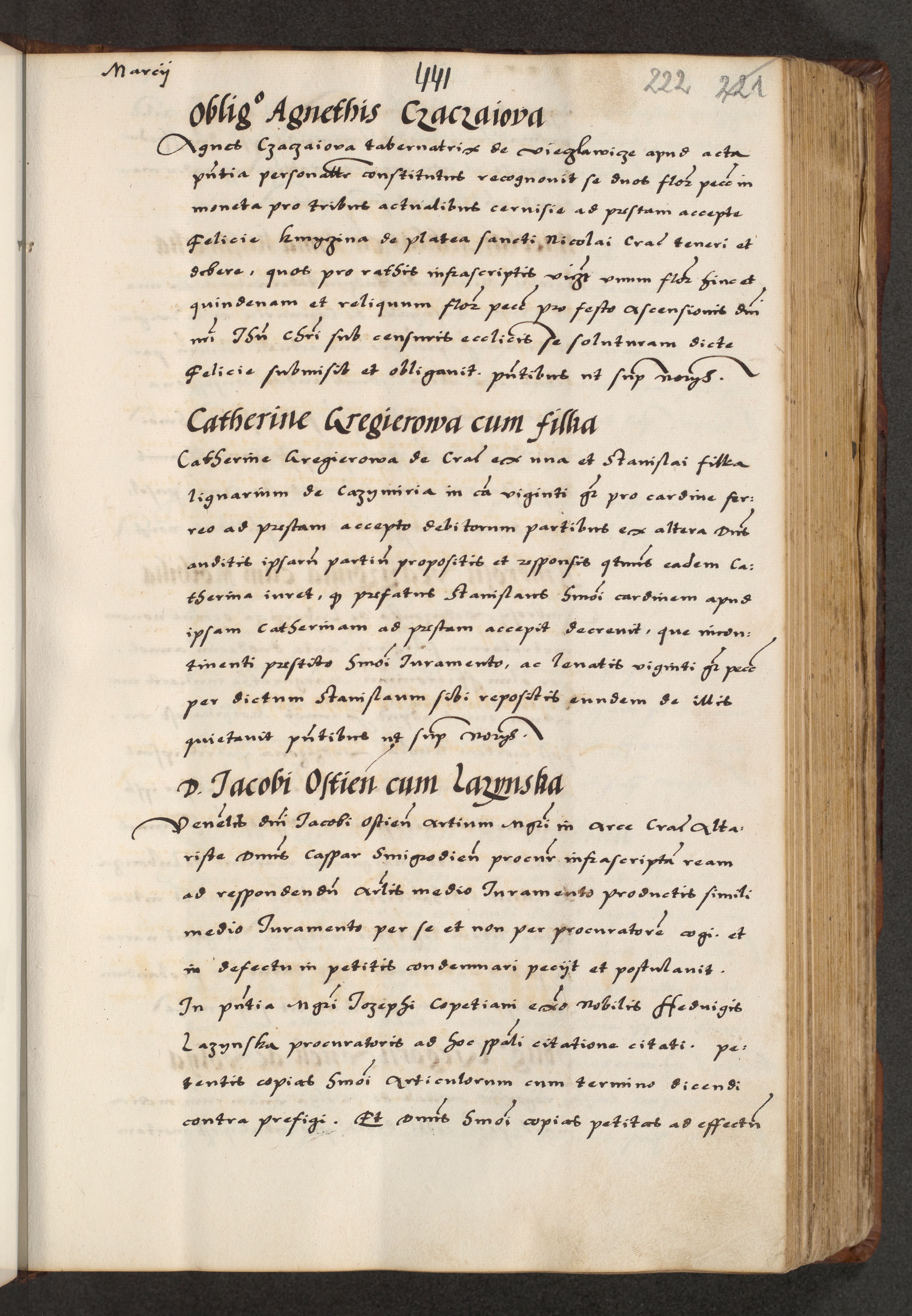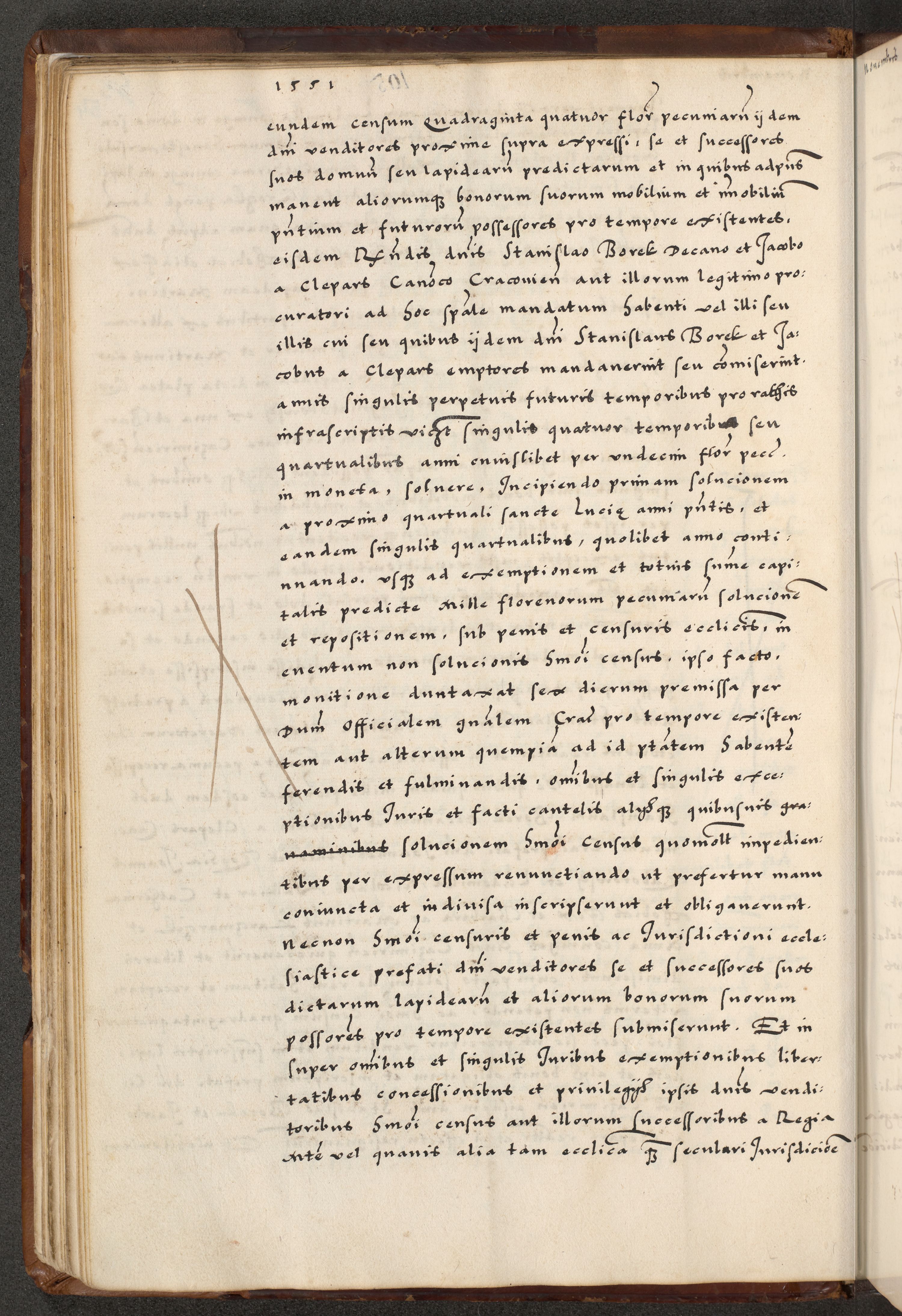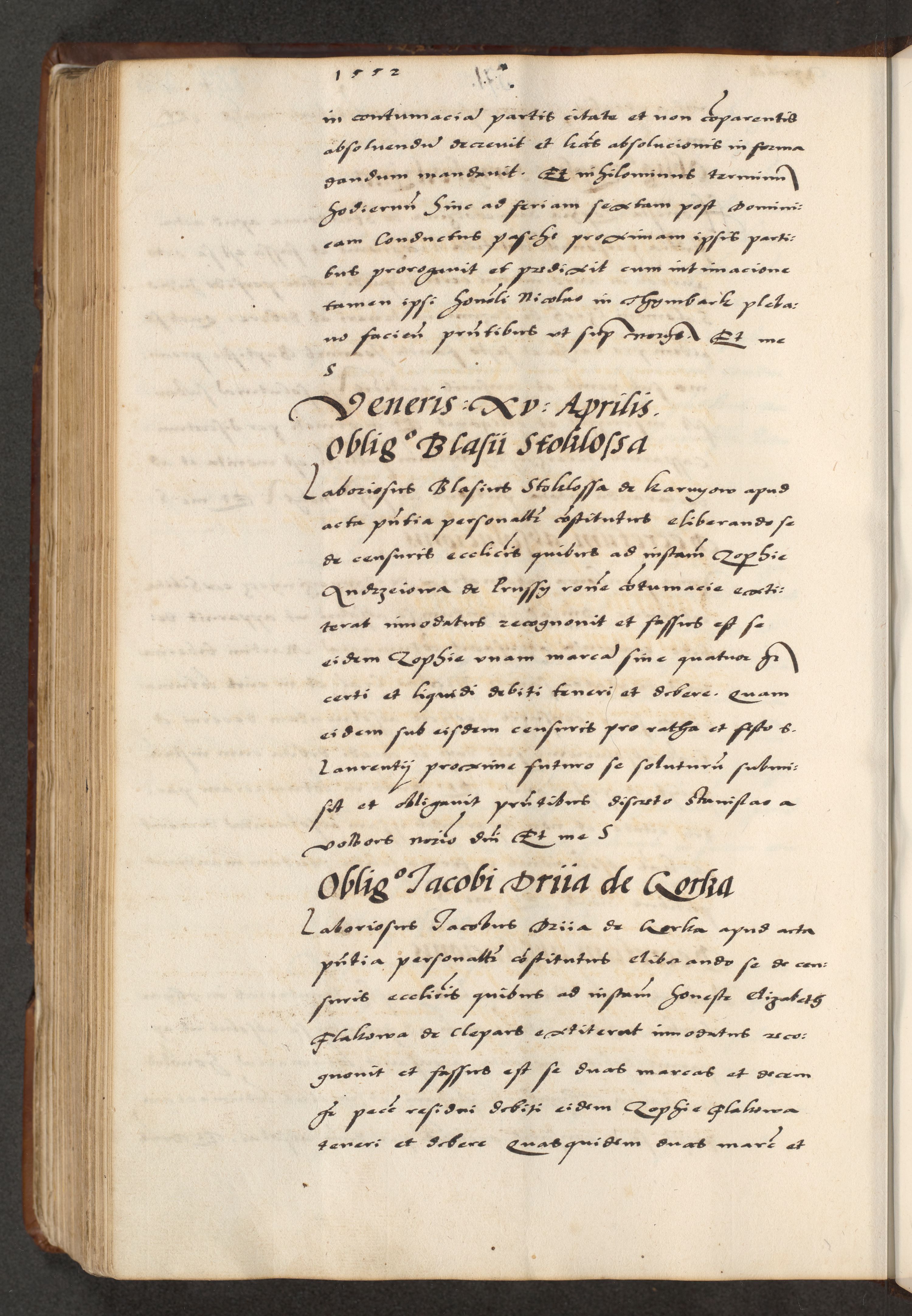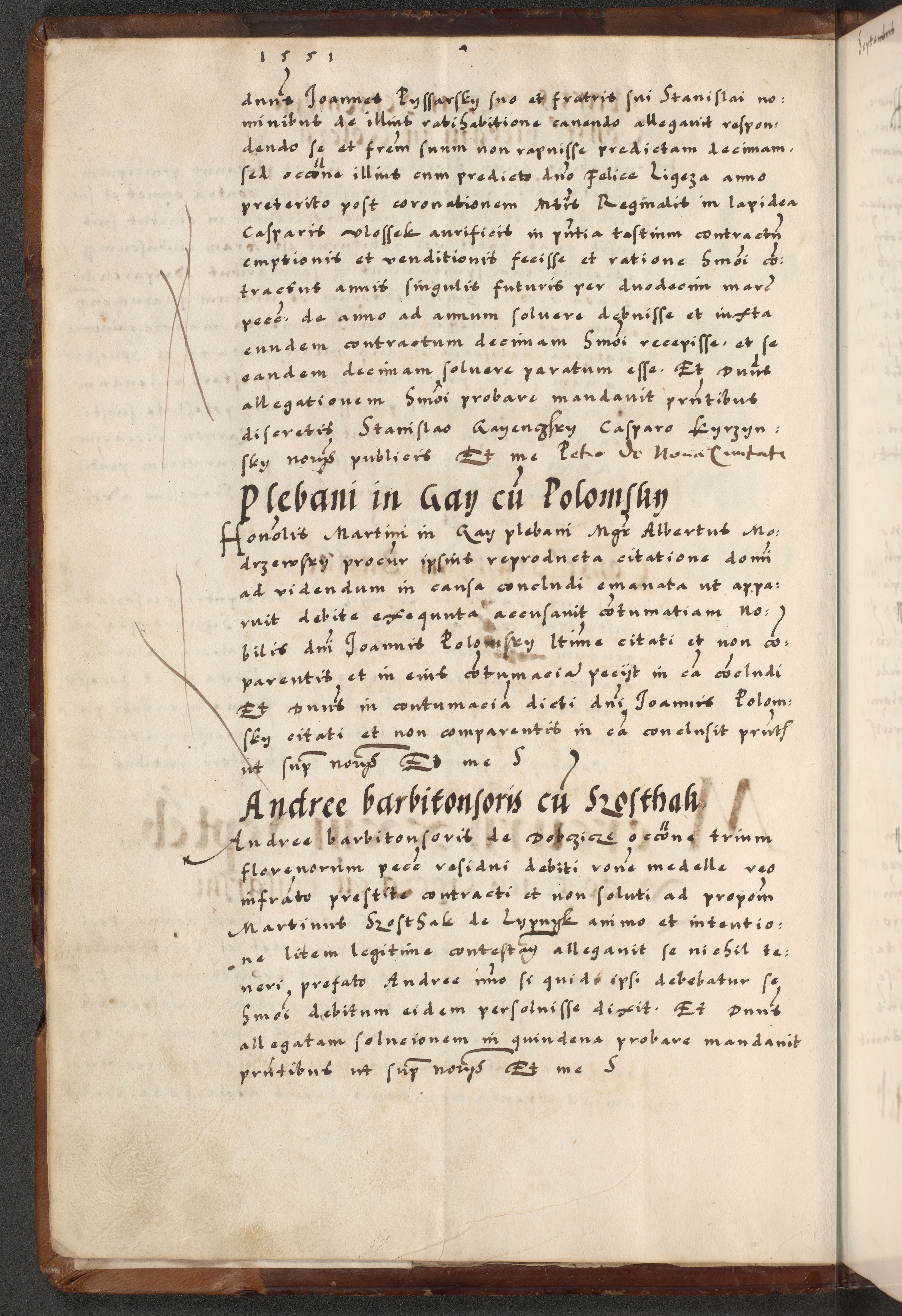 [A]cta actorum causarum, sententiarum tam diffinitivarum quam interloquutoriarum, obligationum, constitutionum et contractuum coram reverendo patre domino Petro Porembski preposito Osvieczimensi, canonico et officiali generali Cracoviensi de anno Domini millesimo quingentesimo quinguagesimo primo, cuius indictio est nona, pontificatus sanctissimi in Christo patris et domini nostri domini Juliii divina providencia pape tercii, anno secundo, a die et mense infrascriptis feliciter continiantur