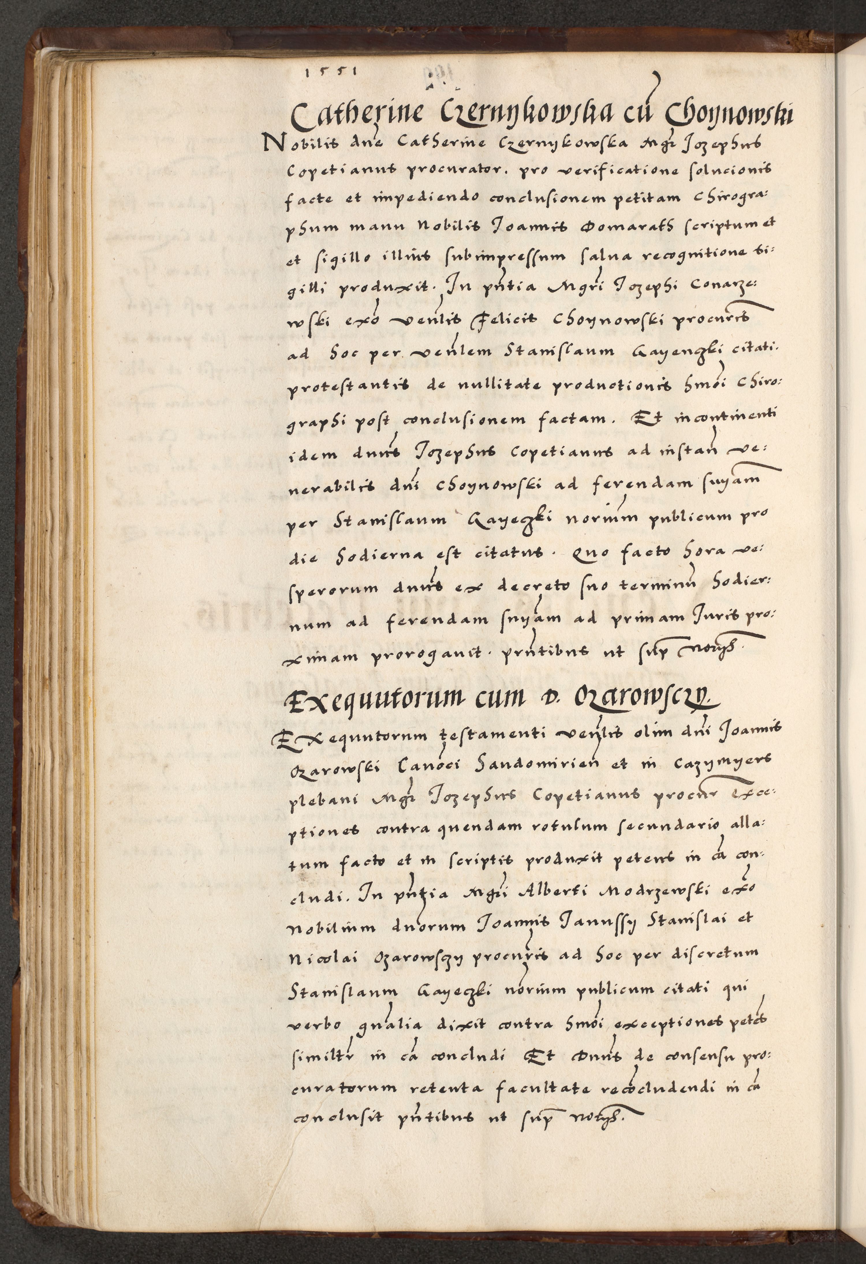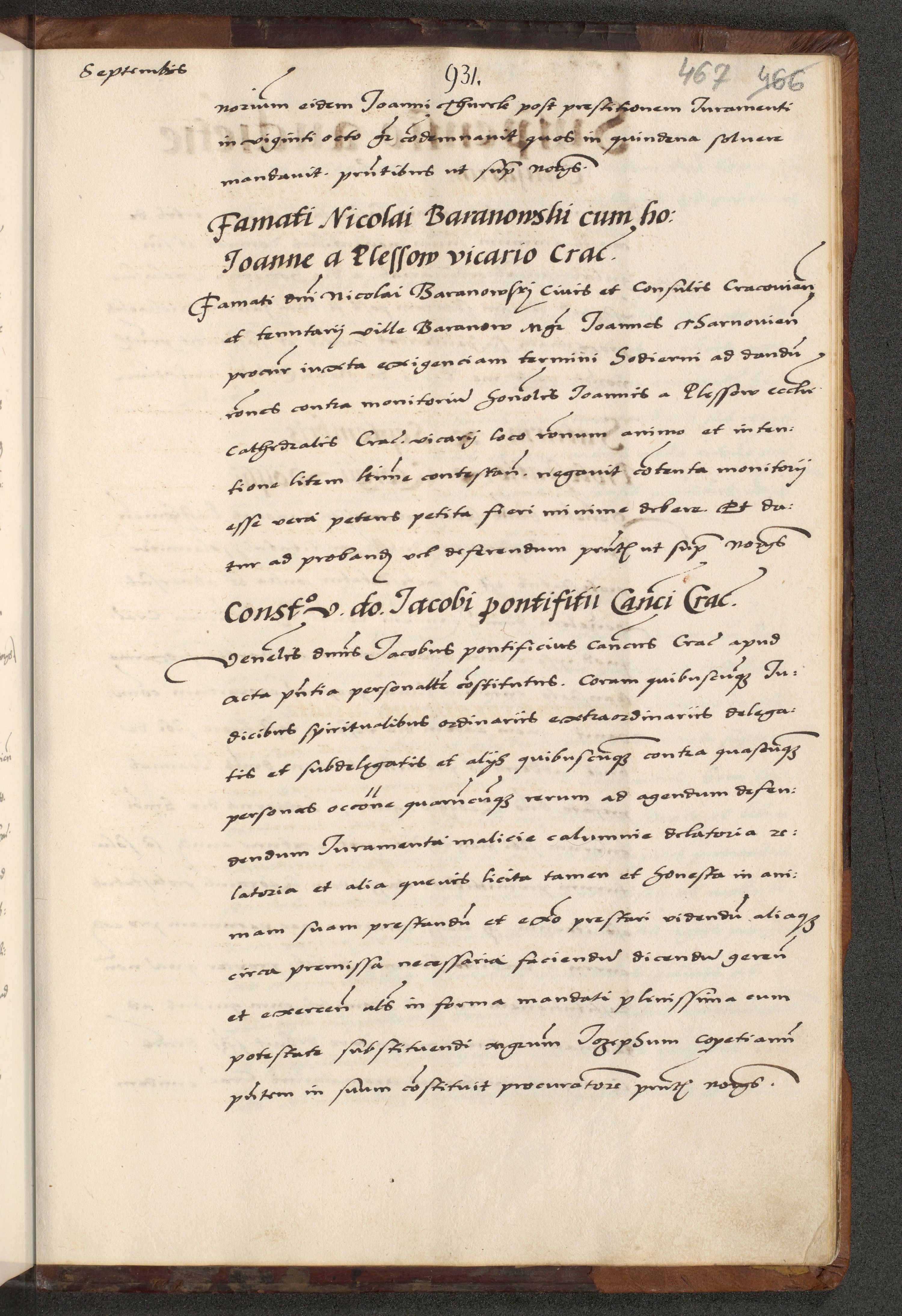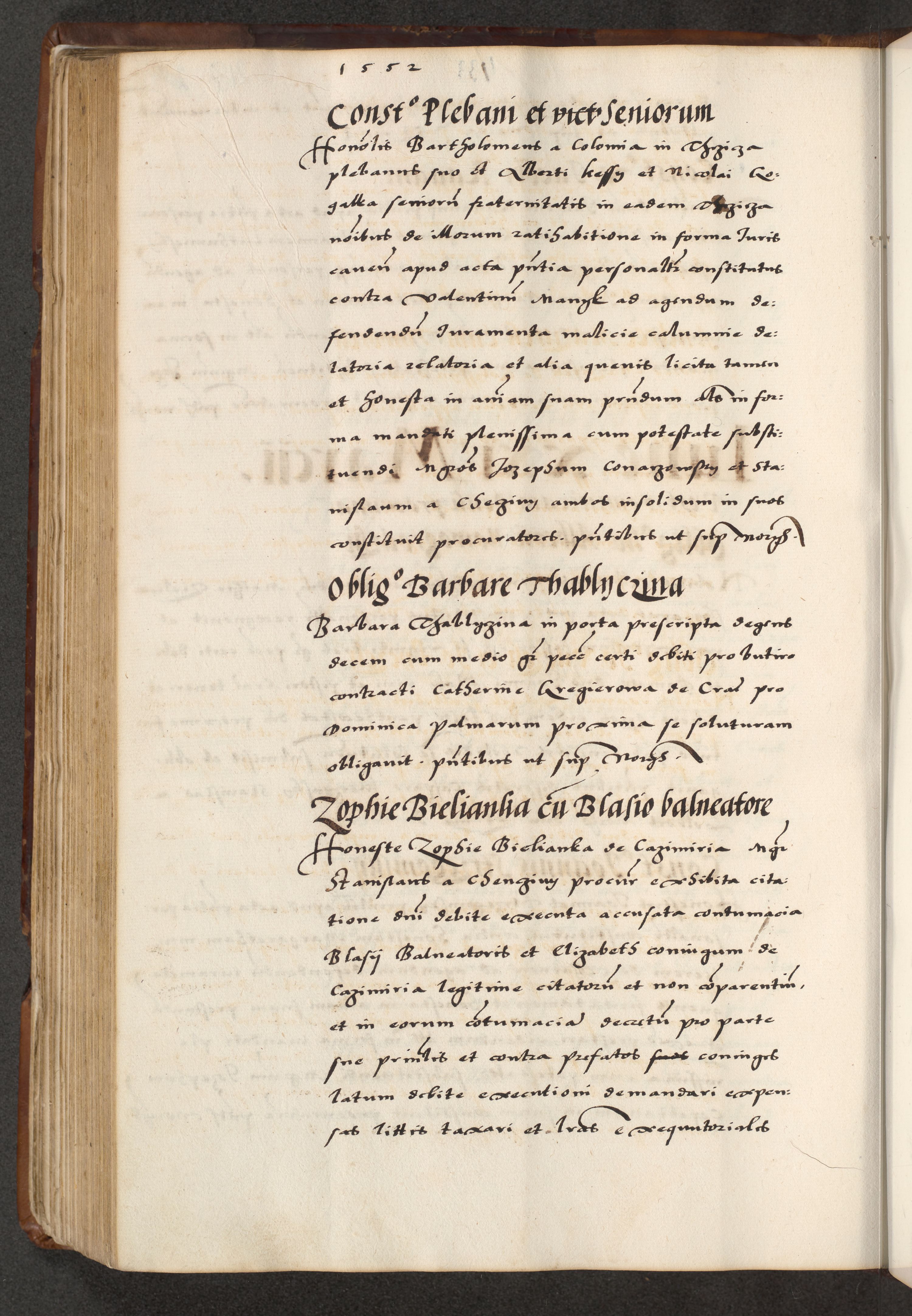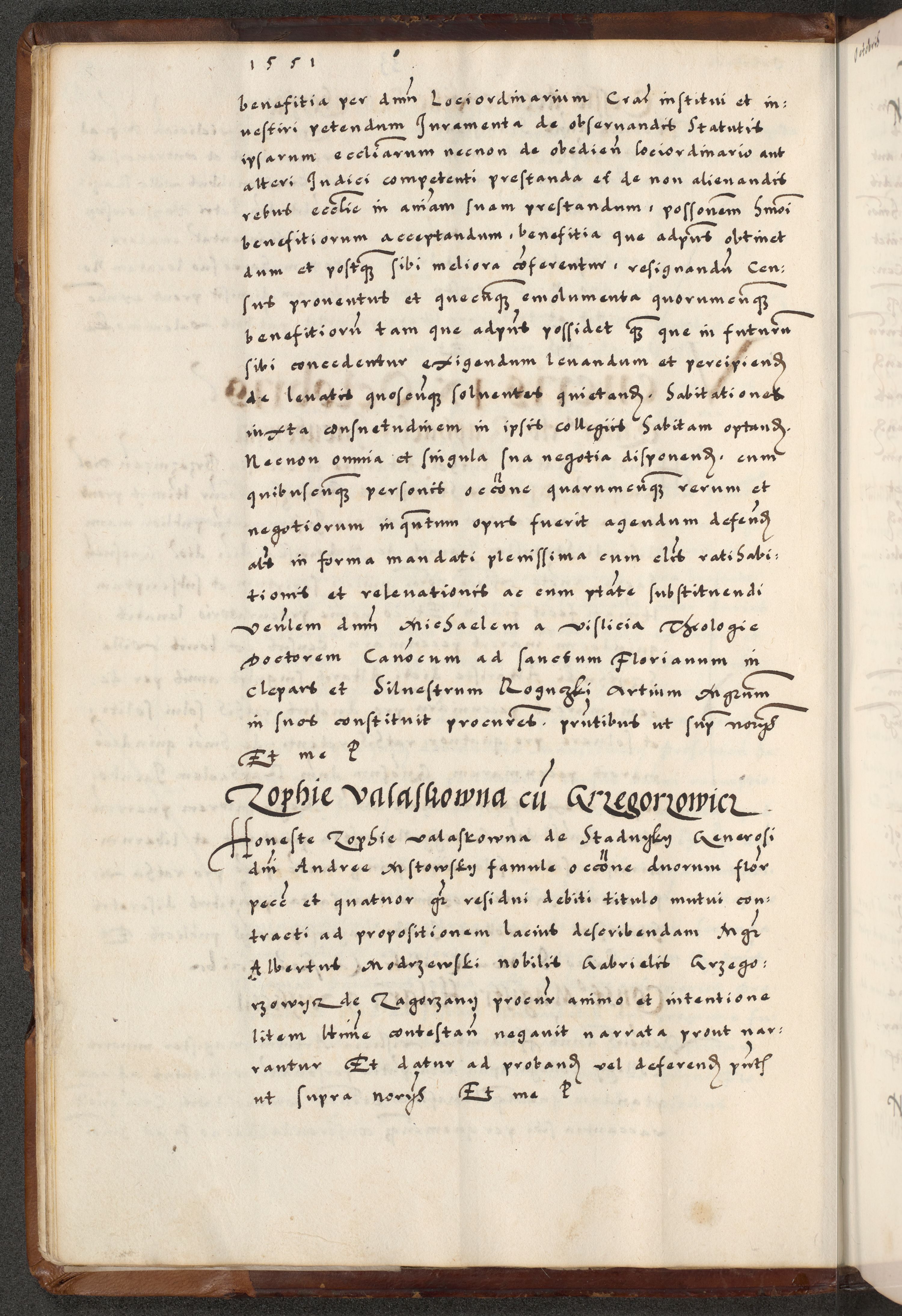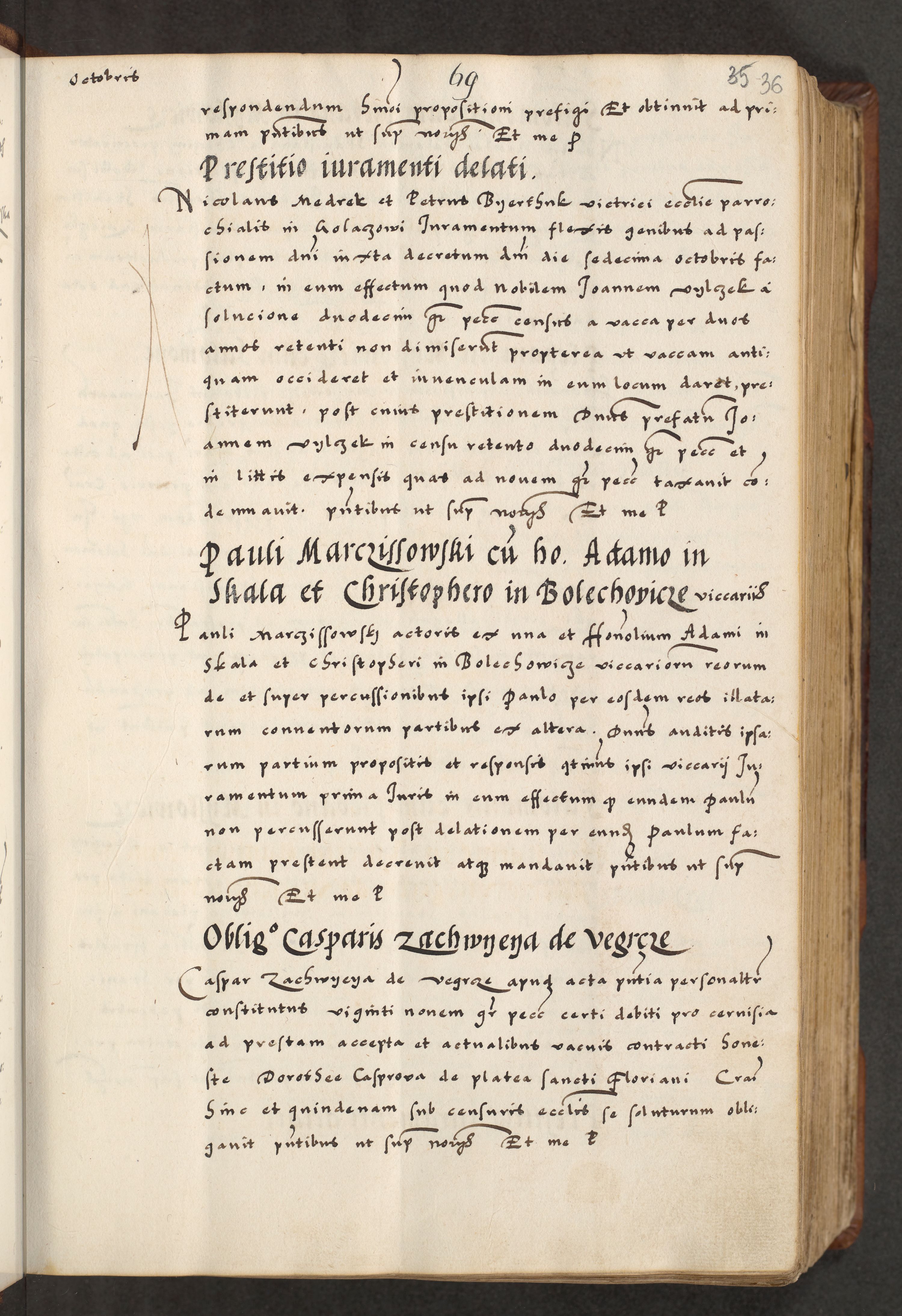 [A]cta actorum causarum, sententiarum tam diffinitivarum quam interloquutoriarum, obligationum, constitutionum et contractuum coram reverendo patre domino Petro Porembski preposito Osvieczimensi, canonico et officiali generali Cracoviensi de anno Domini millesimo quingentesimo quinguagesimo primo, cuius indictio est nona, pontificatus sanctissimi in Christo patris et domini nostri domini Juliii divina providencia pape tercii, anno secundo, a die et mense infrascriptis feliciter continiantur
