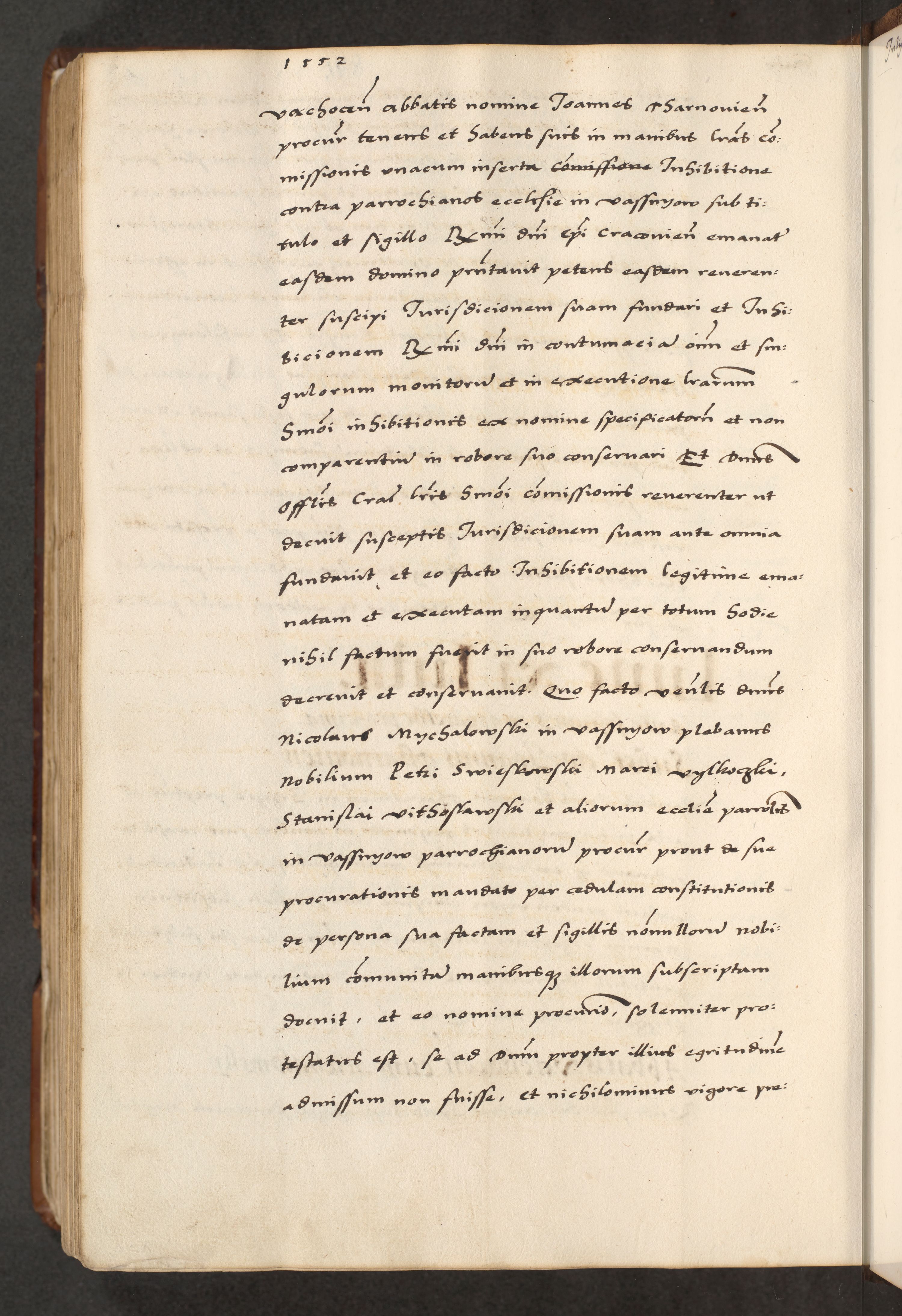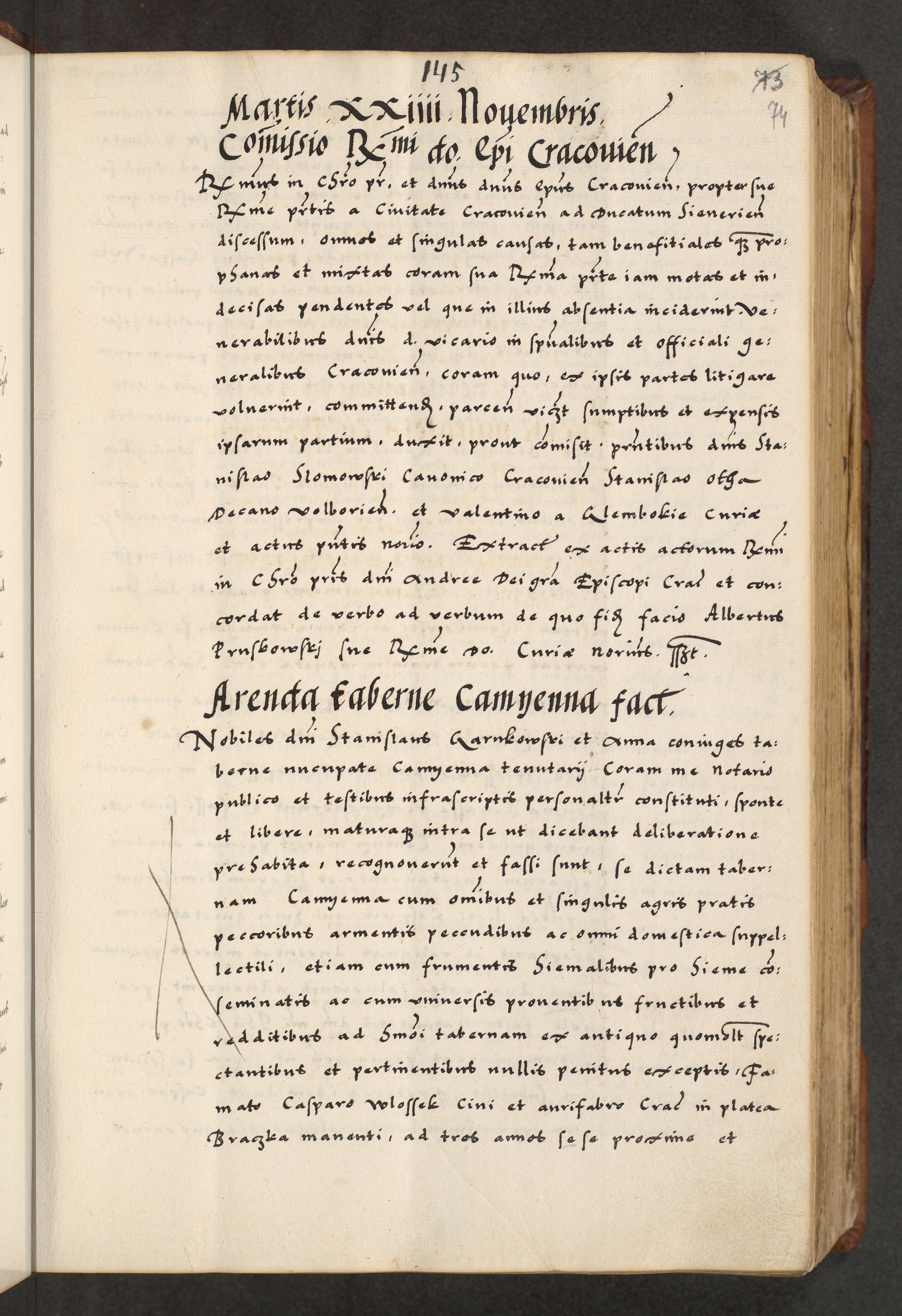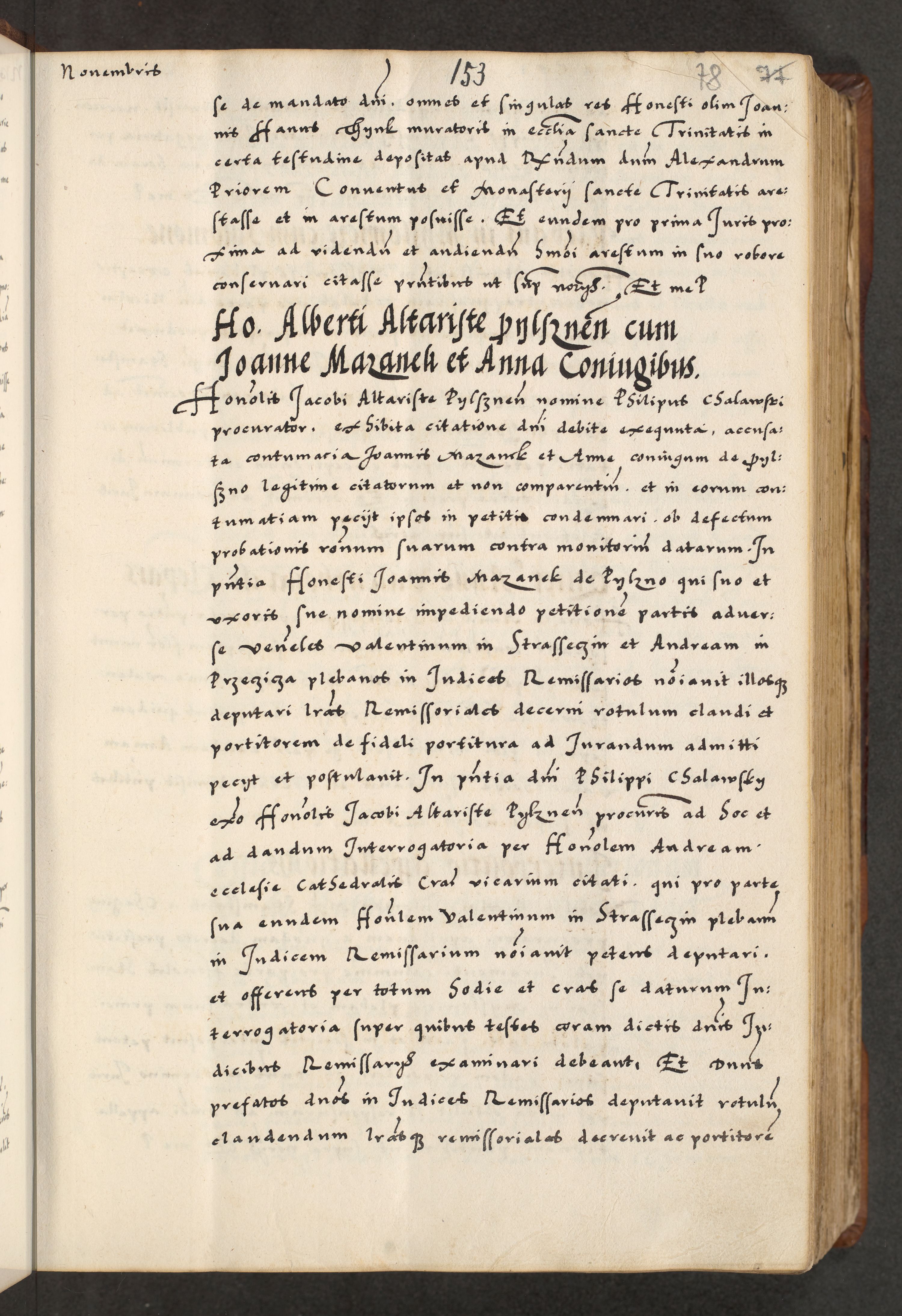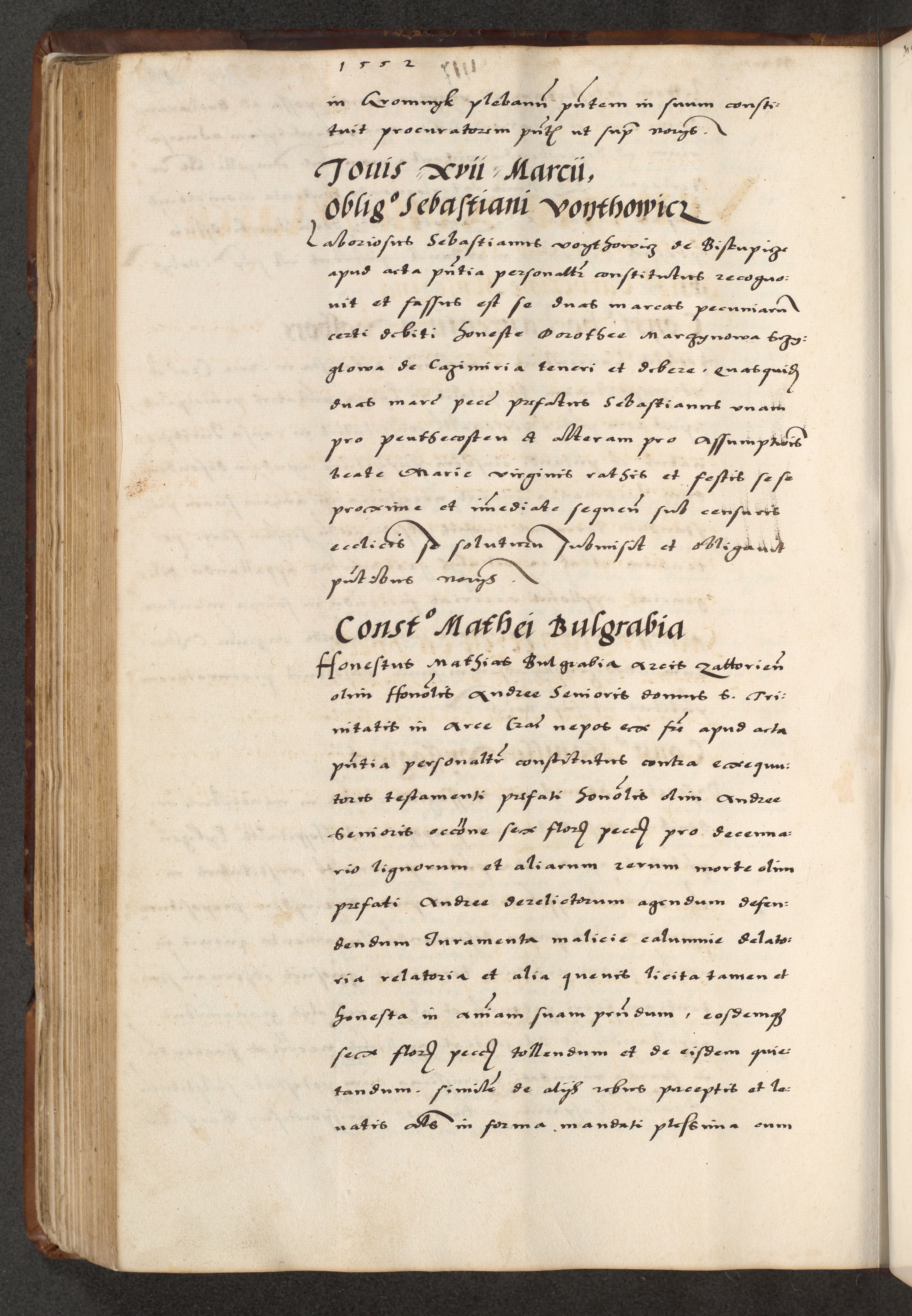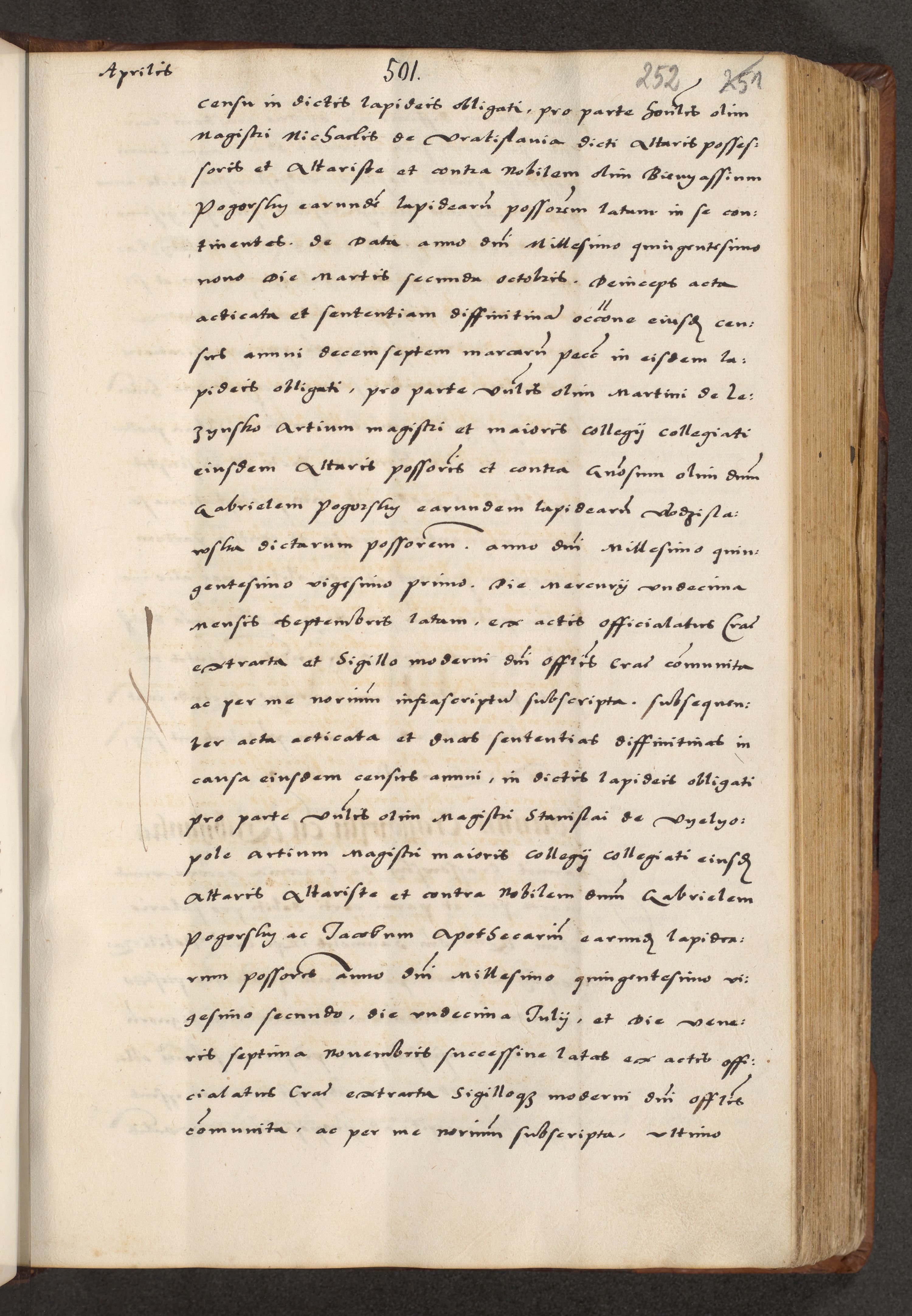 [A]cta actorum causarum, sententiarum tam diffinitivarum quam interloquutoriarum, obligationum, constitutionum et contractuum coram reverendo patre domino Petro Porembski preposito Osvieczimensi, canonico et officiali generali Cracoviensi de anno Domini millesimo quingentesimo quinguagesimo primo, cuius indictio est nona, pontificatus sanctissimi in Christo patris et domini nostri domini Juliii divina providencia pape tercii, anno secundo, a die et mense infrascriptis feliciter continiantur