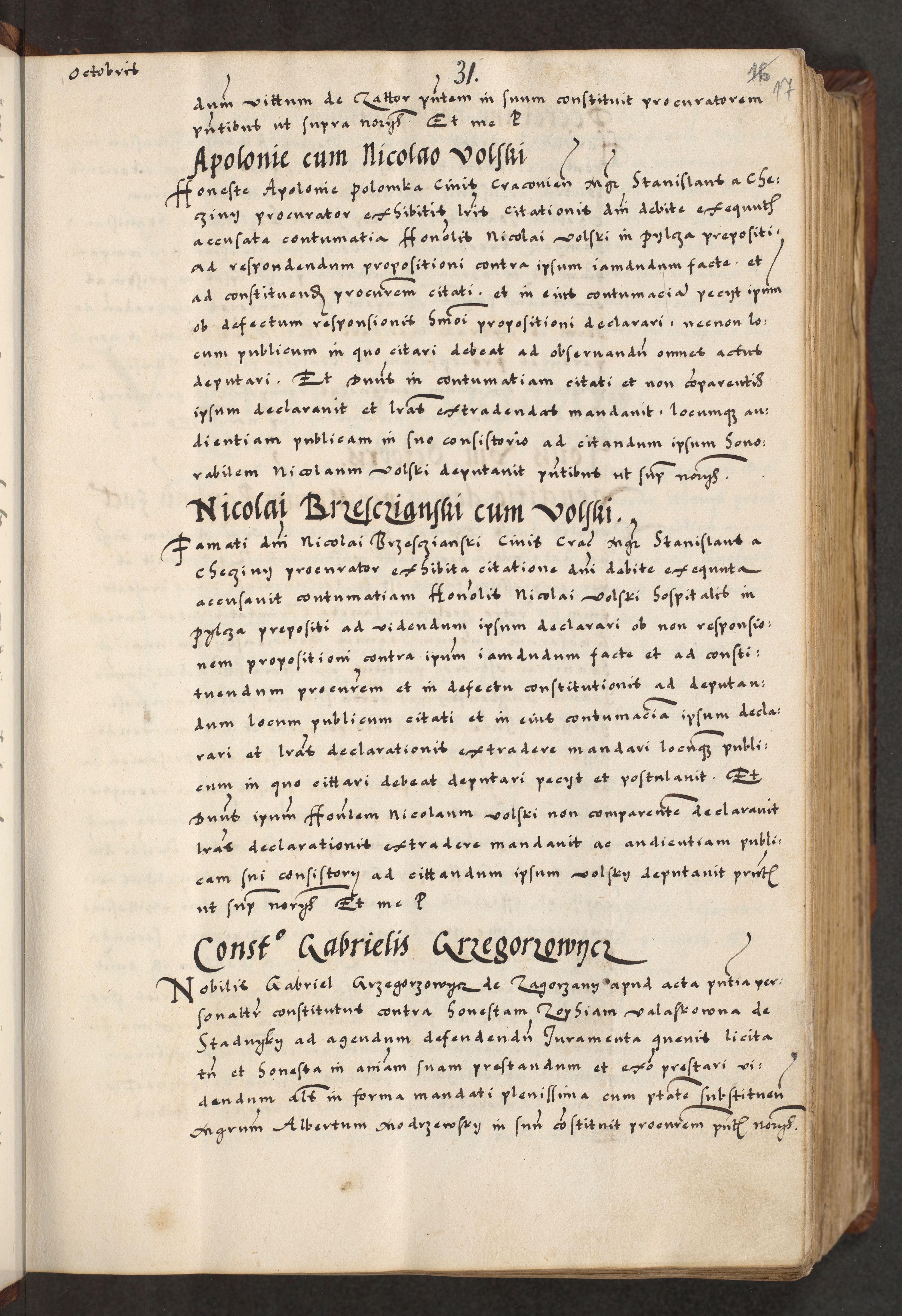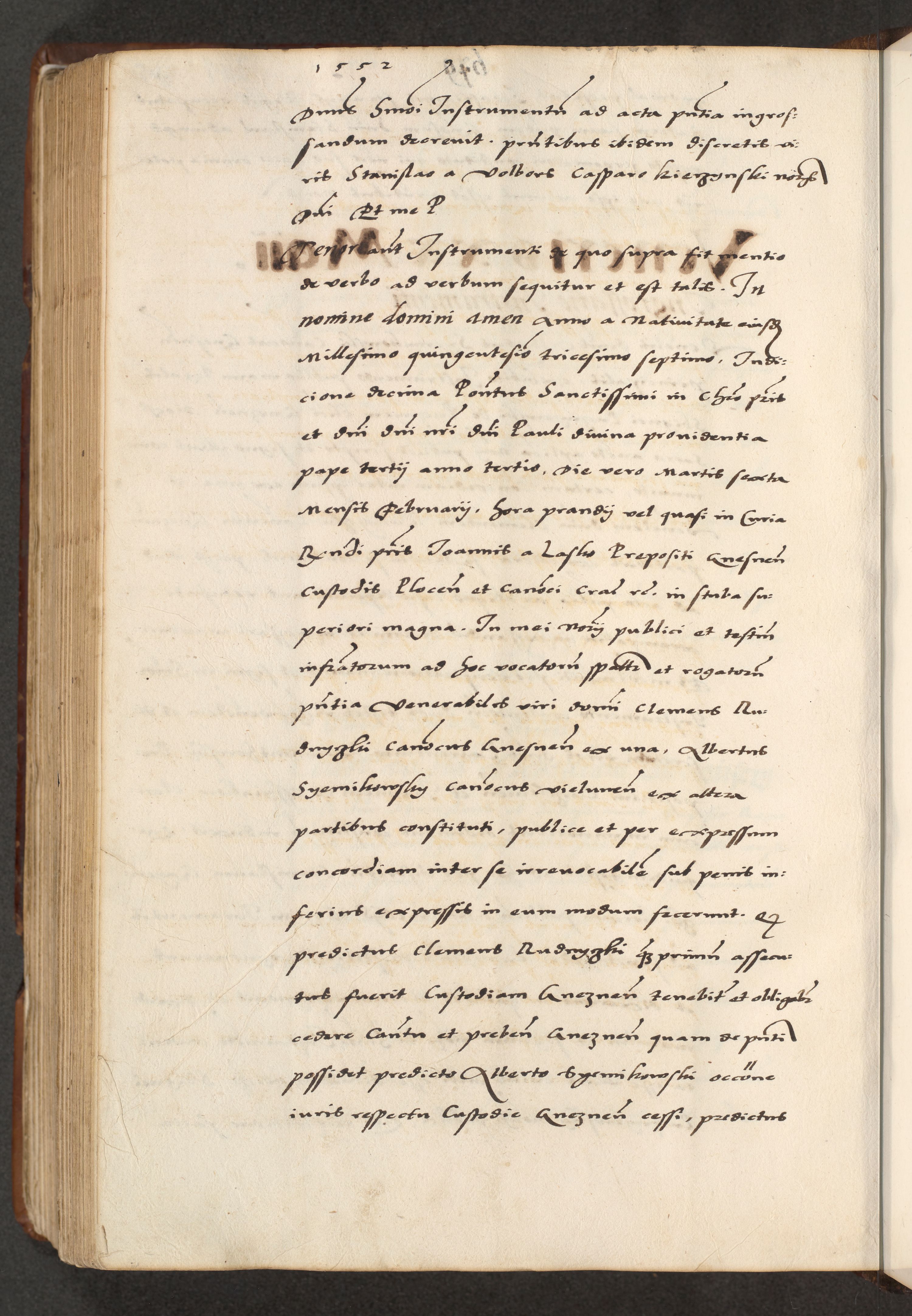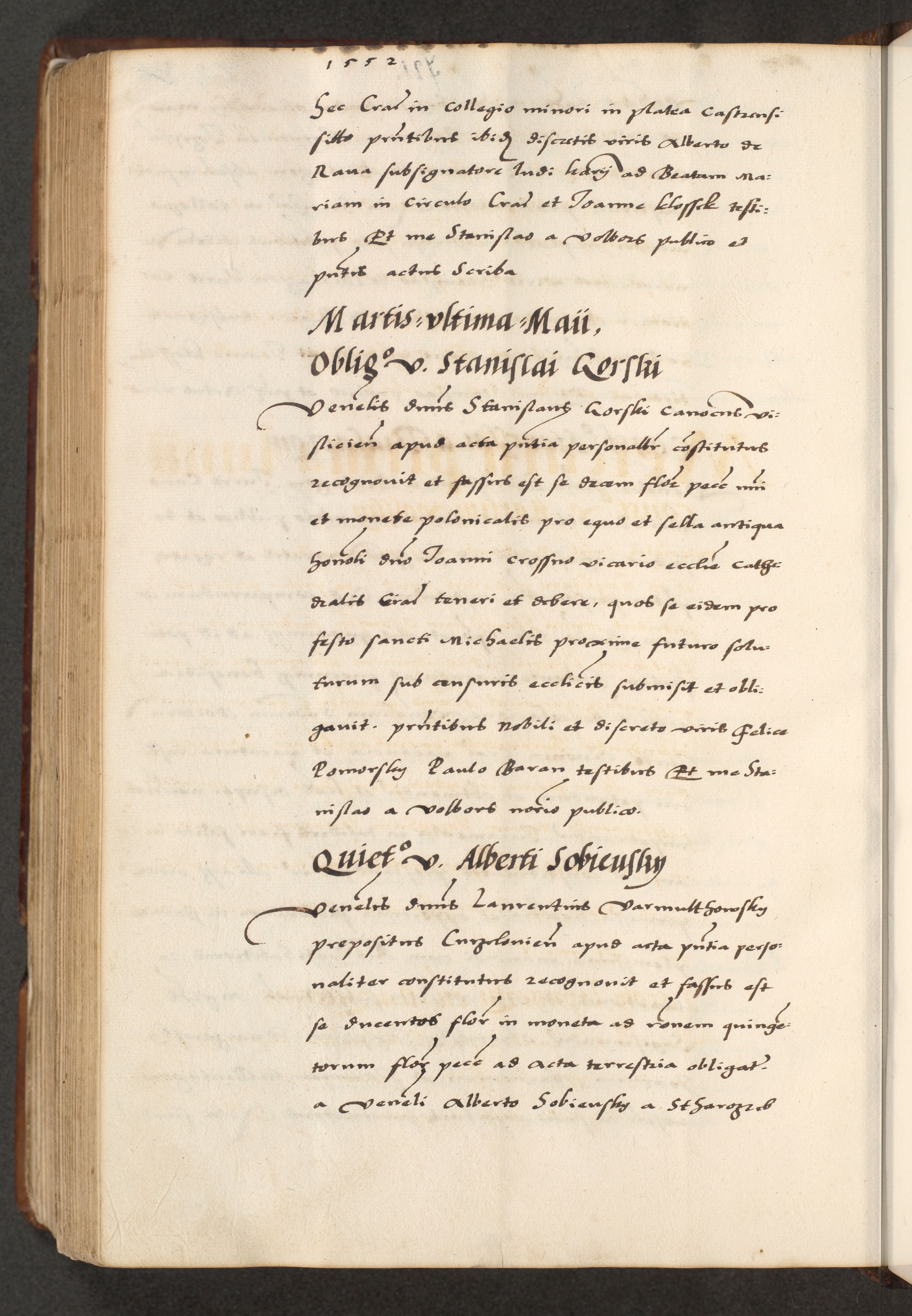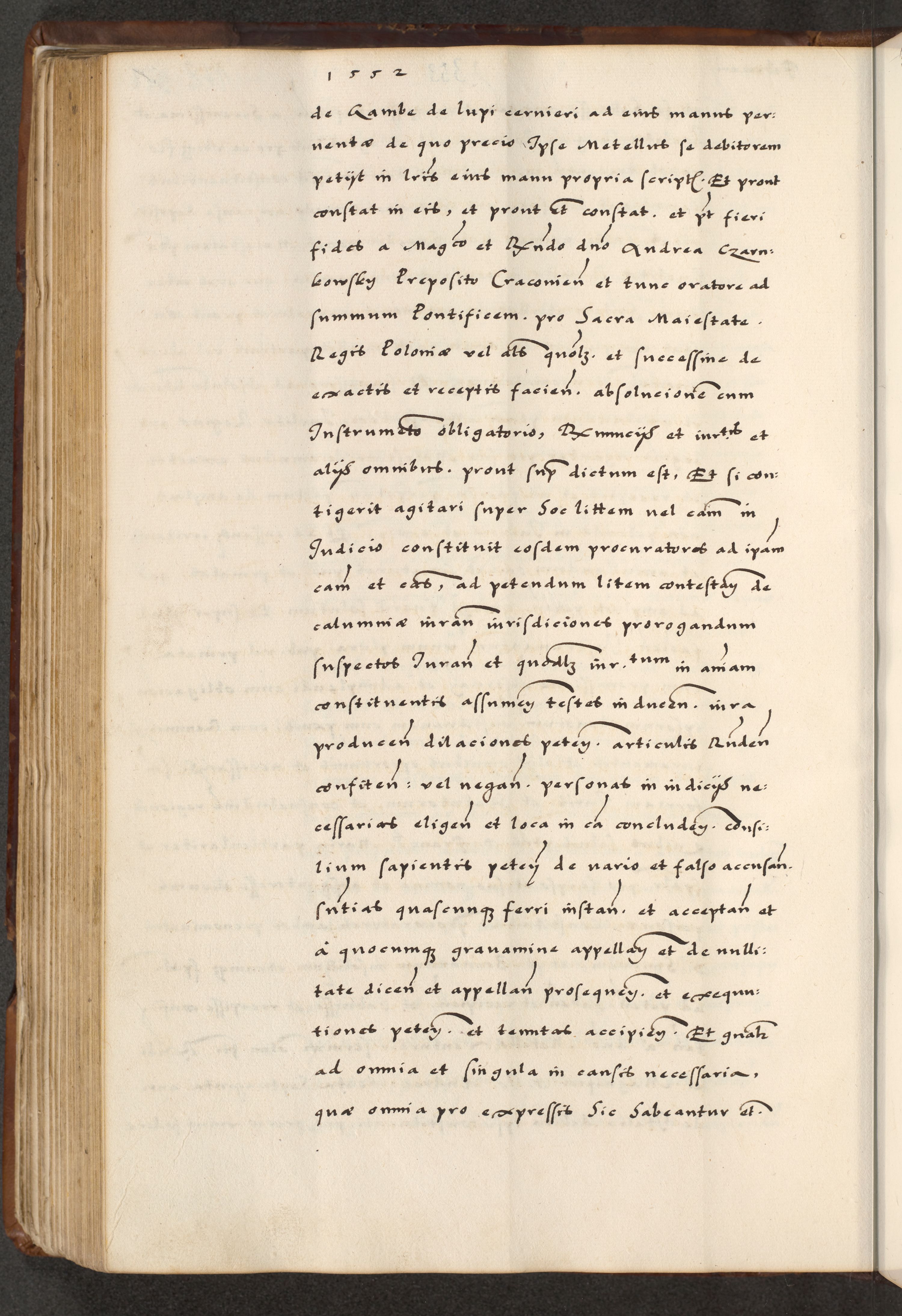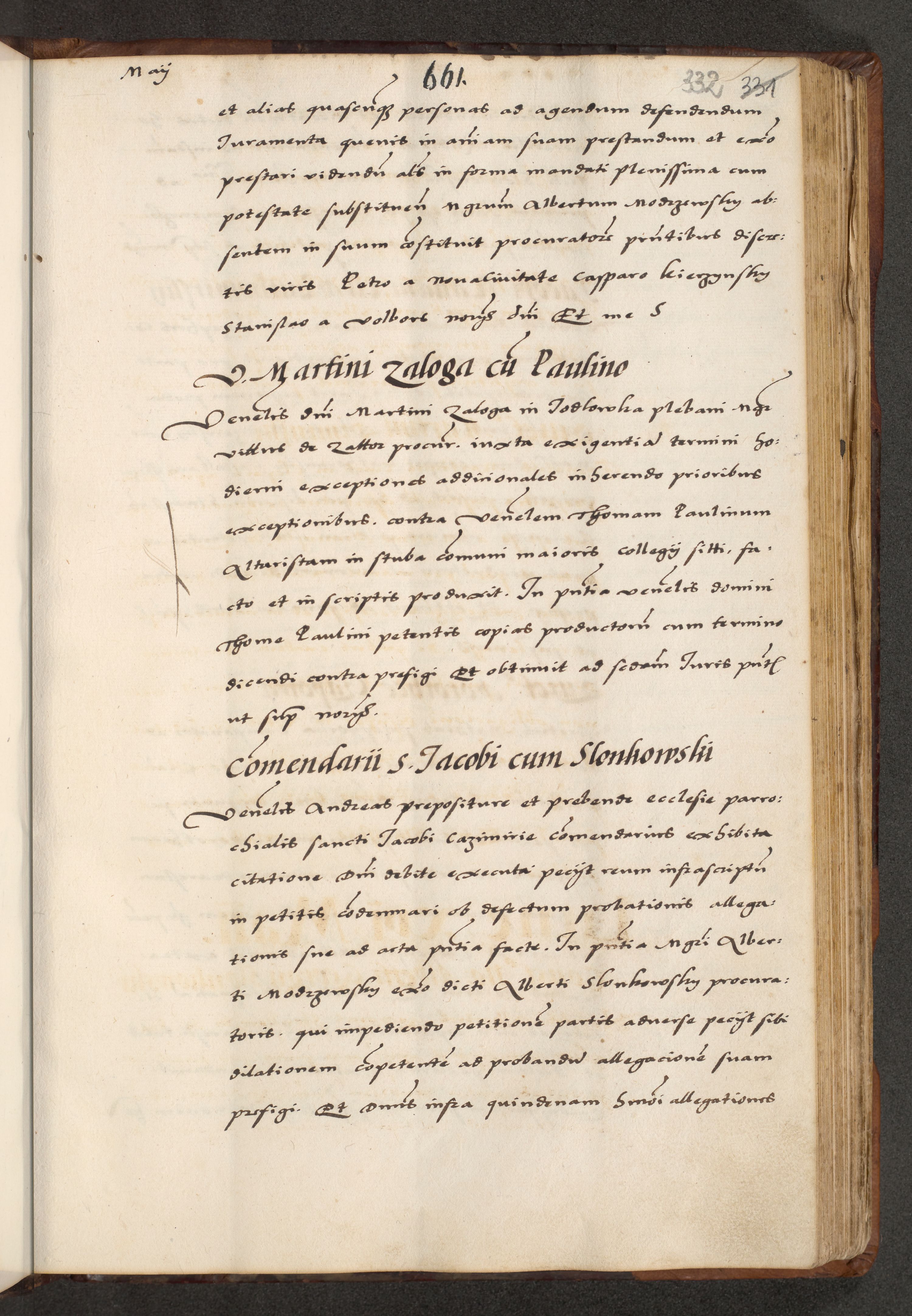 [A]cta actorum causarum, sententiarum tam diffinitivarum quam interloquutoriarum, obligationum, constitutionum et contractuum coram reverendo patre domino Petro Porembski preposito Osvieczimensi, canonico et officiali generali Cracoviensi de anno Domini millesimo quingentesimo quinguagesimo primo, cuius indictio est nona, pontificatus sanctissimi in Christo patris et domini nostri domini Juliii divina providencia pape tercii, anno secundo, a die et mense infrascriptis feliciter continiantur