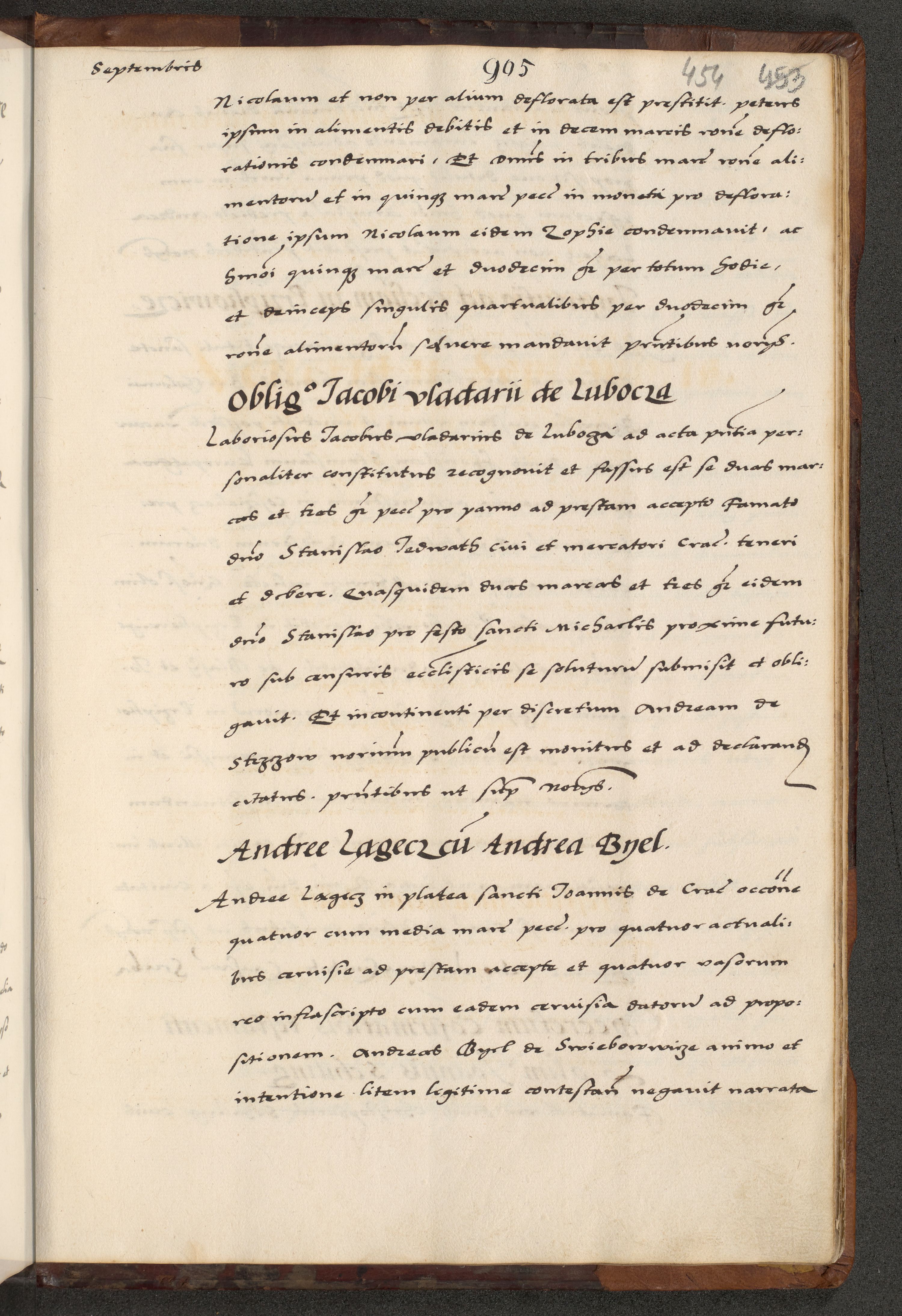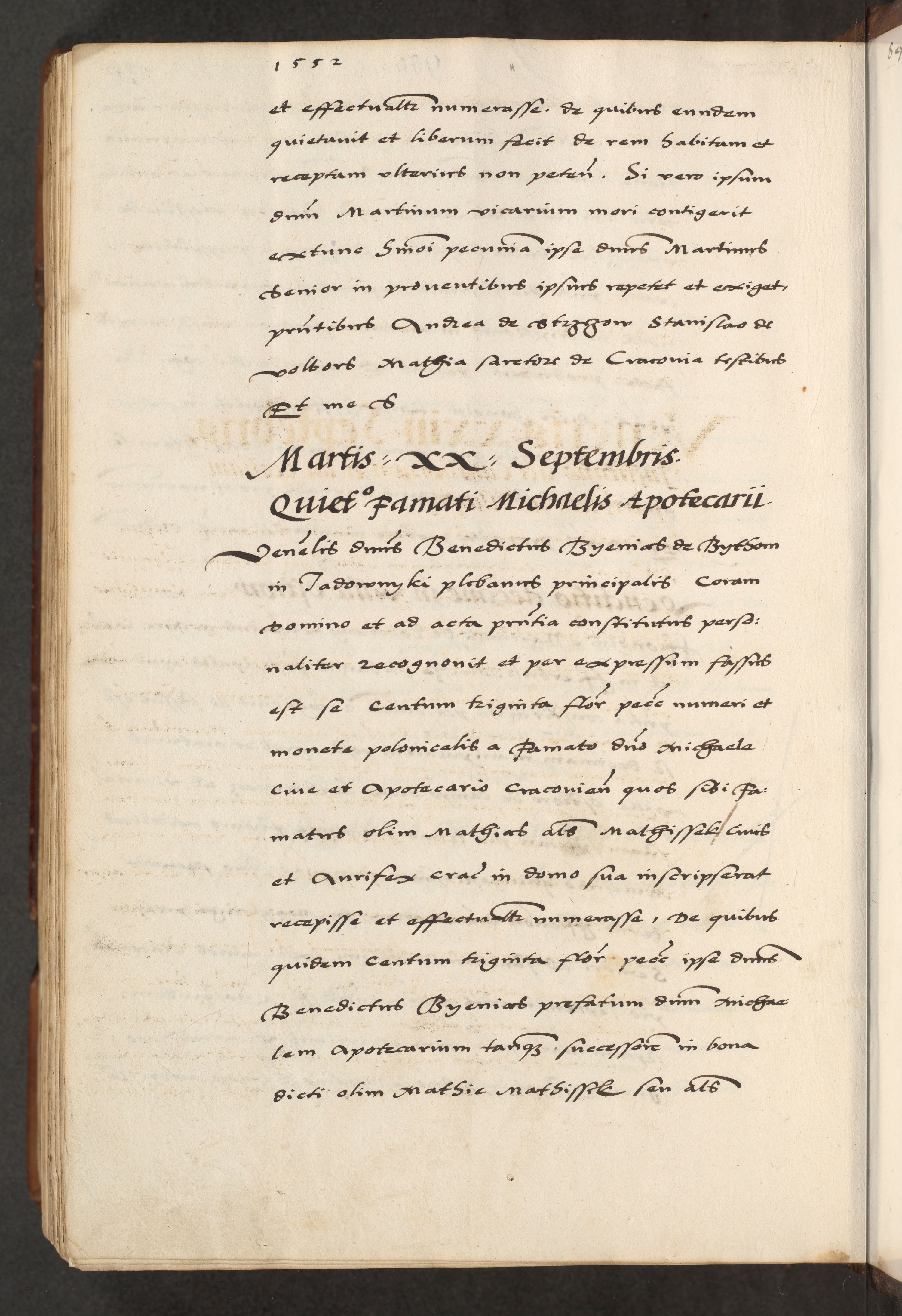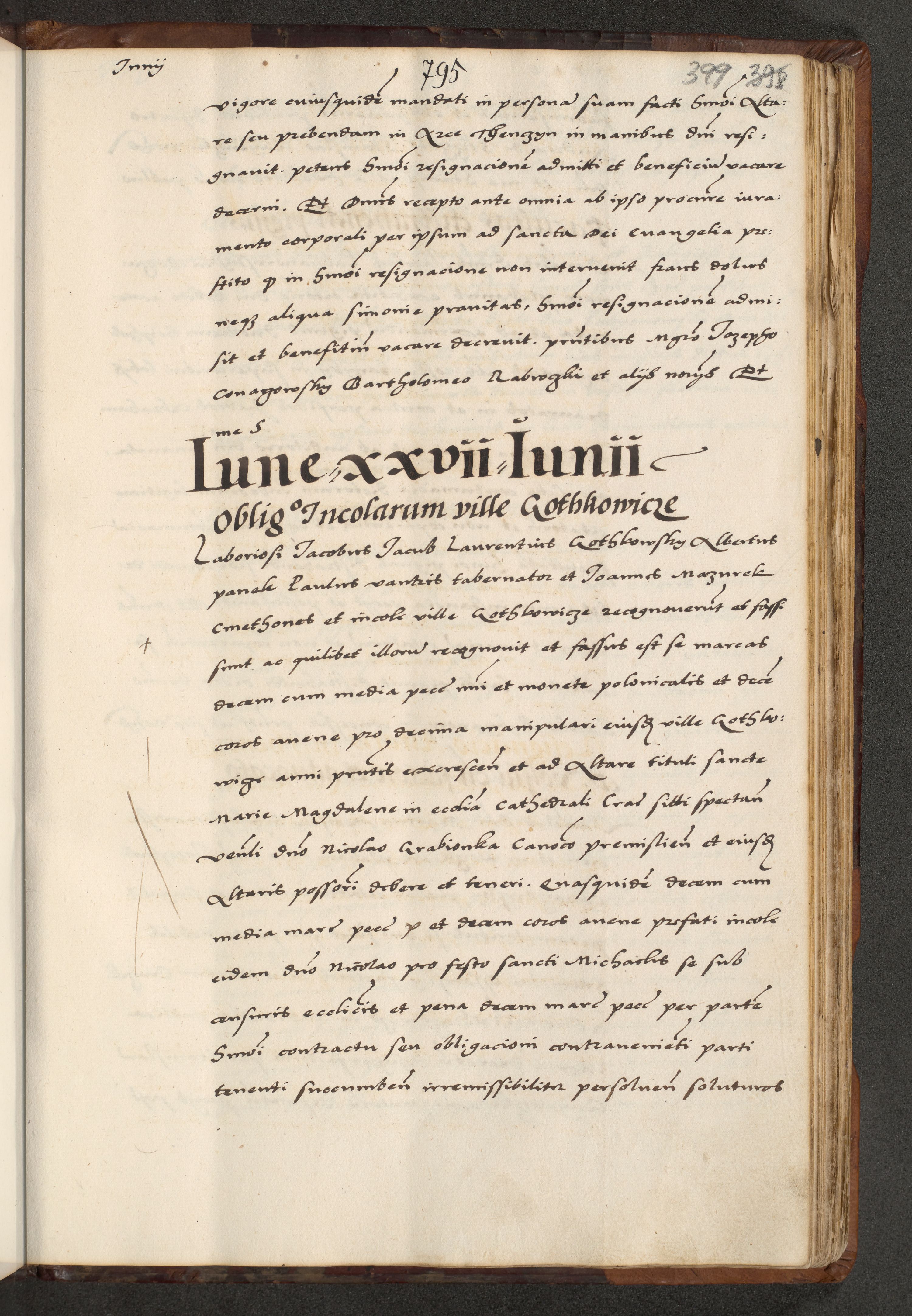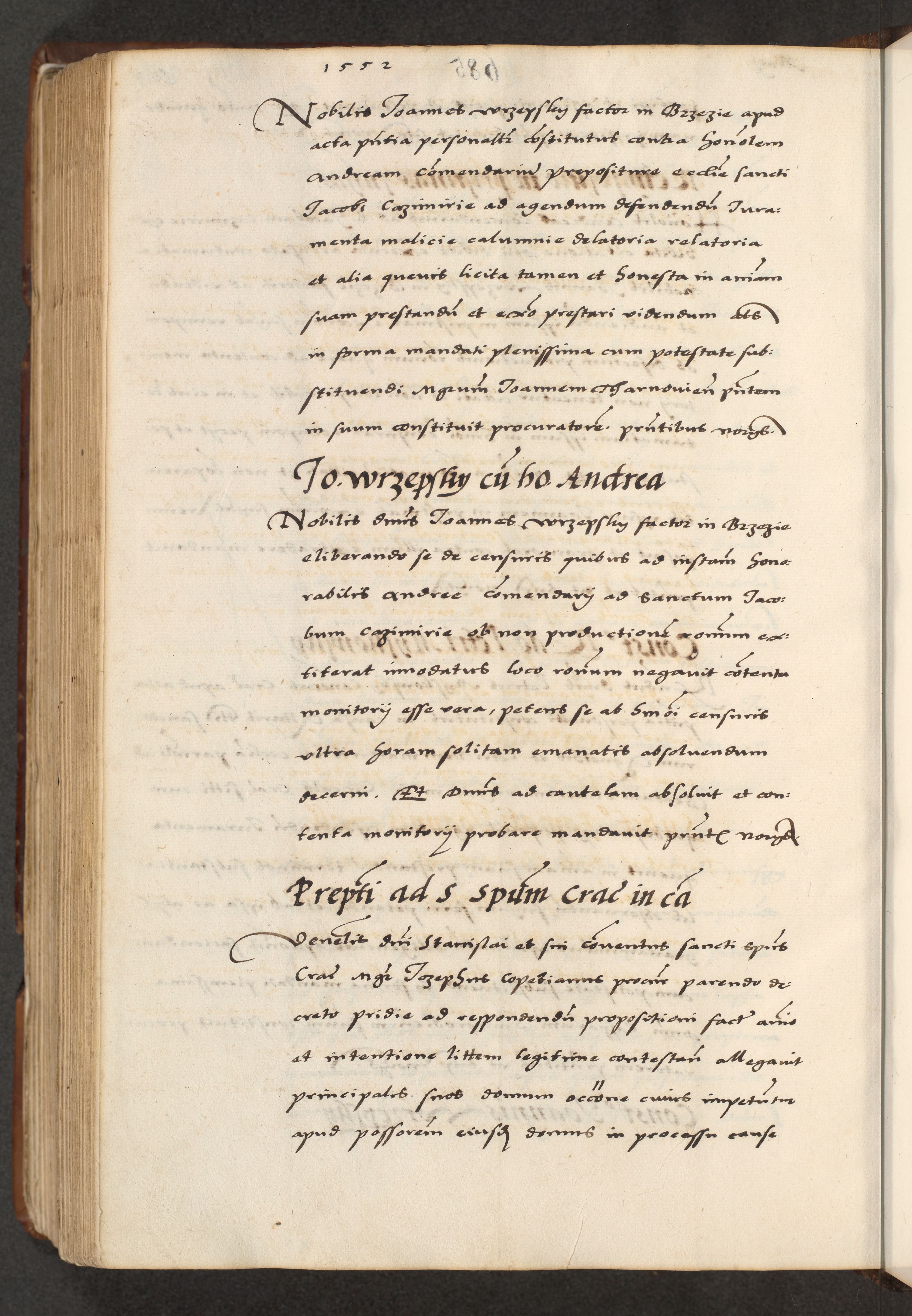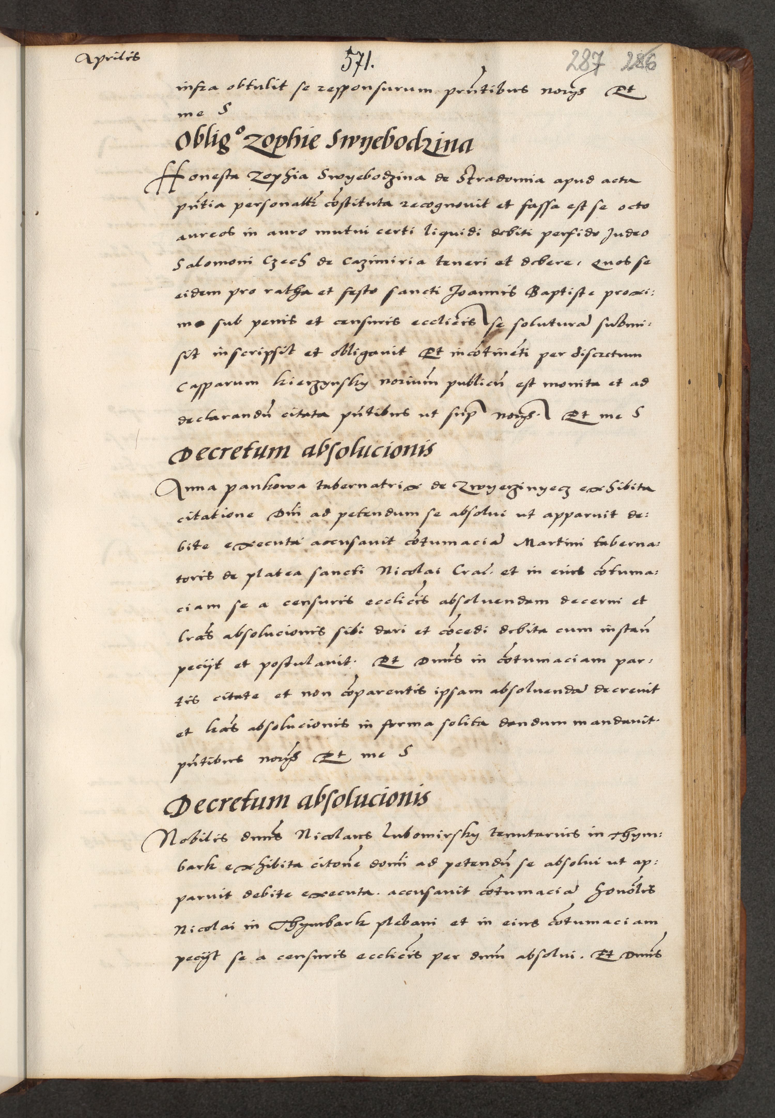 [A]cta actorum causarum, sententiarum tam diffinitivarum quam interloquutoriarum, obligationum, constitutionum et contractuum coram reverendo patre domino Petro Porembski preposito Osvieczimensi, canonico et officiali generali Cracoviensi de anno Domini millesimo quingentesimo quinguagesimo primo, cuius indictio est nona, pontificatus sanctissimi in Christo patris et domini nostri domini Juliii divina providencia pape tercii, anno secundo, a die et mense infrascriptis feliciter continiantur