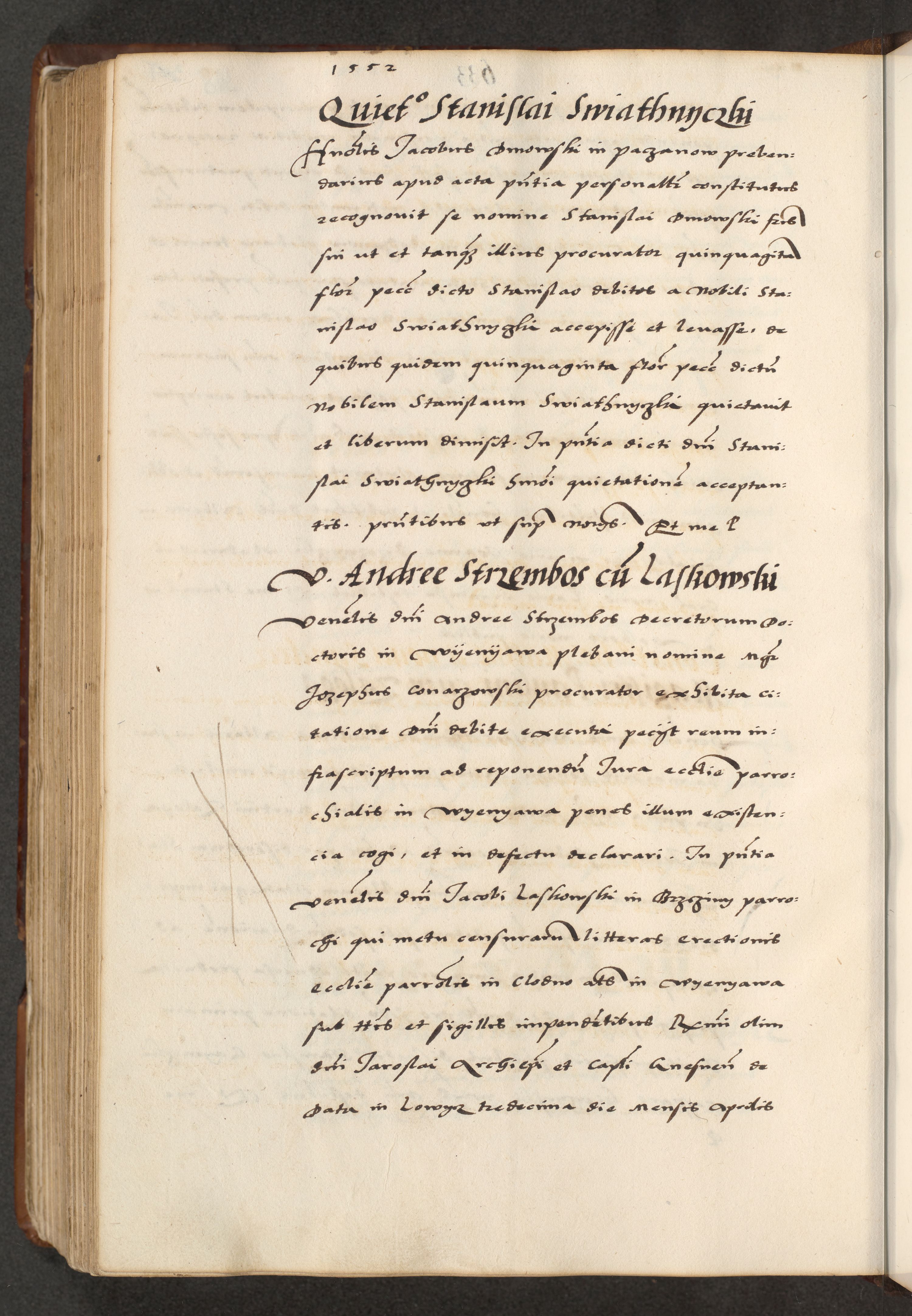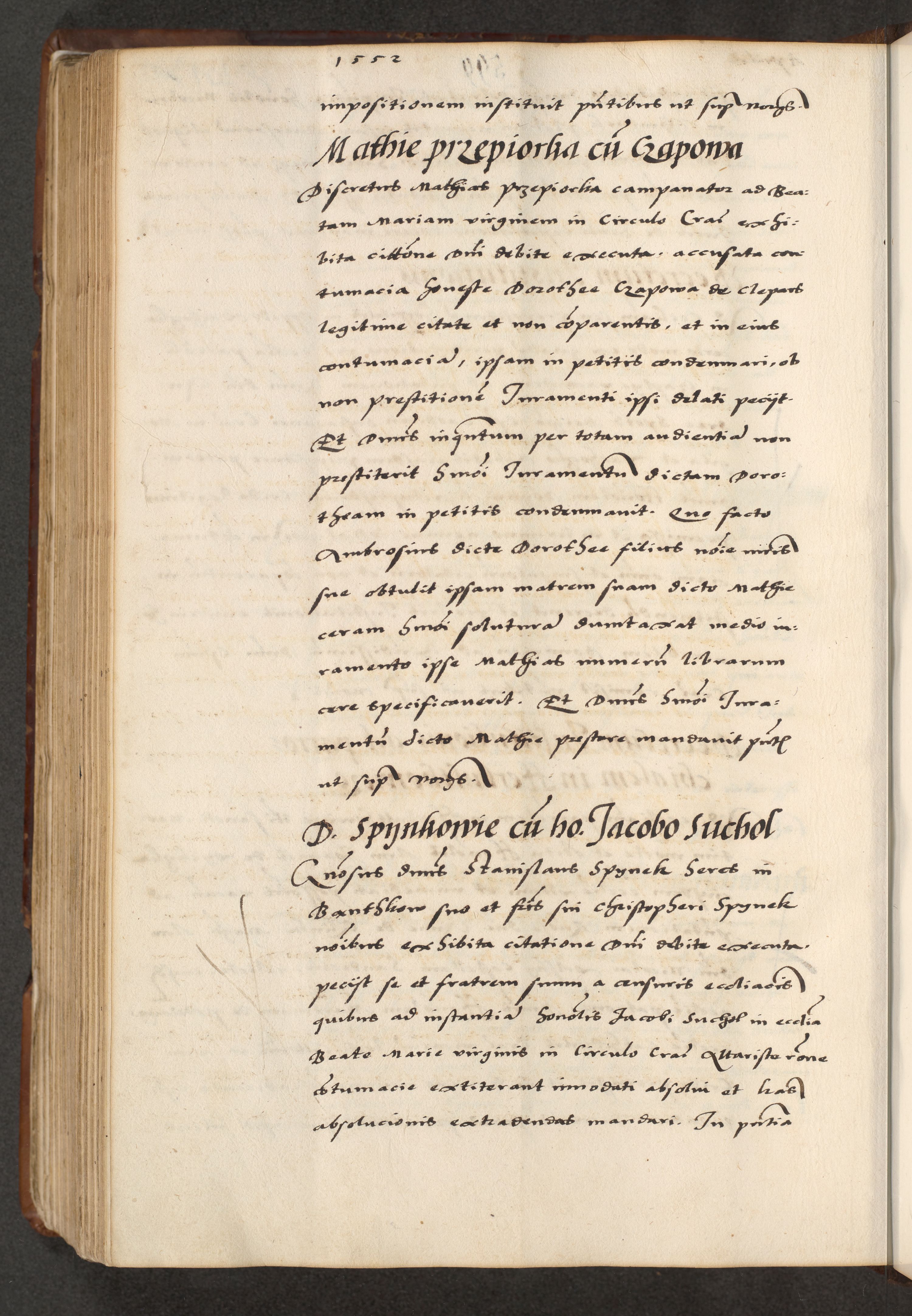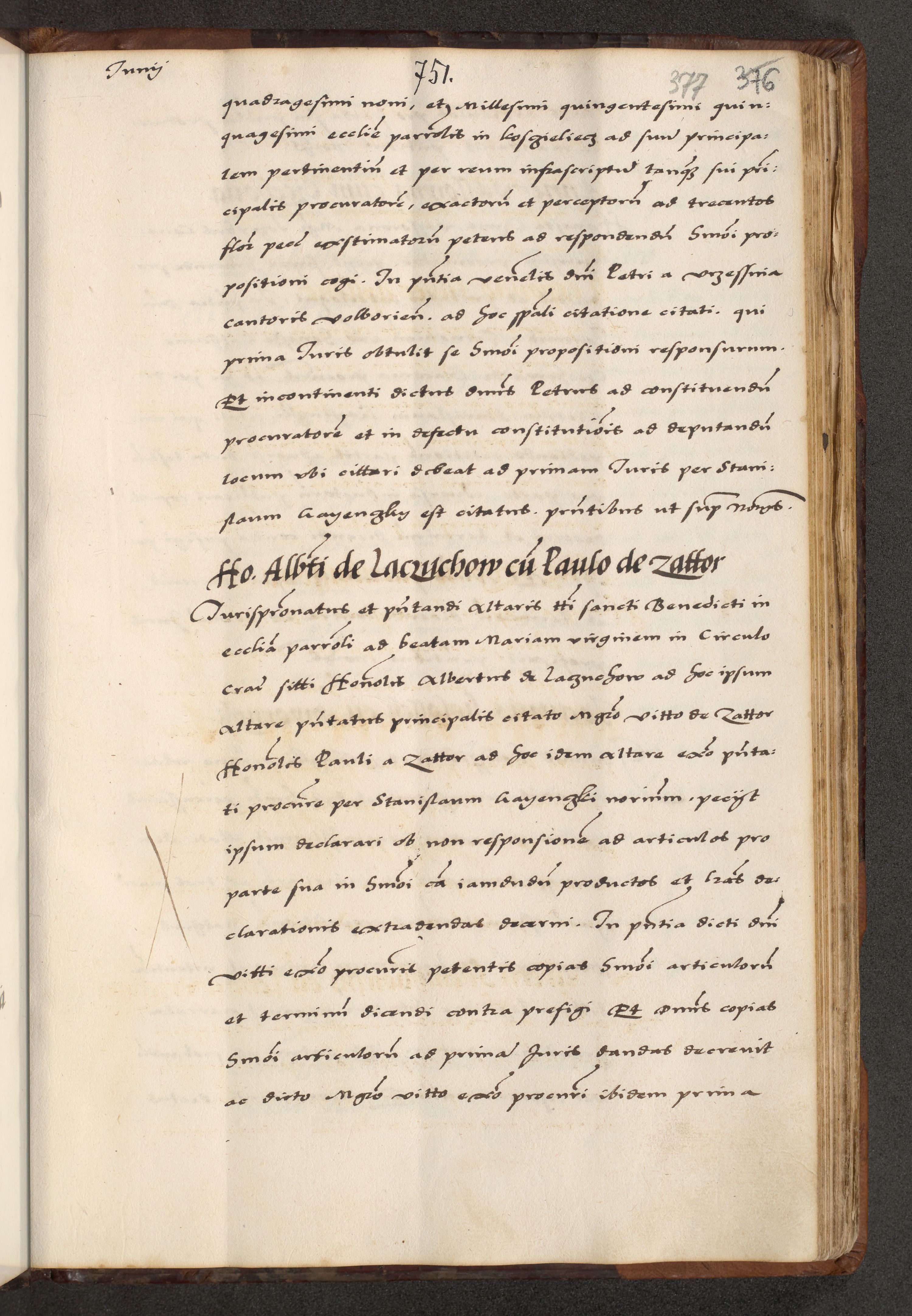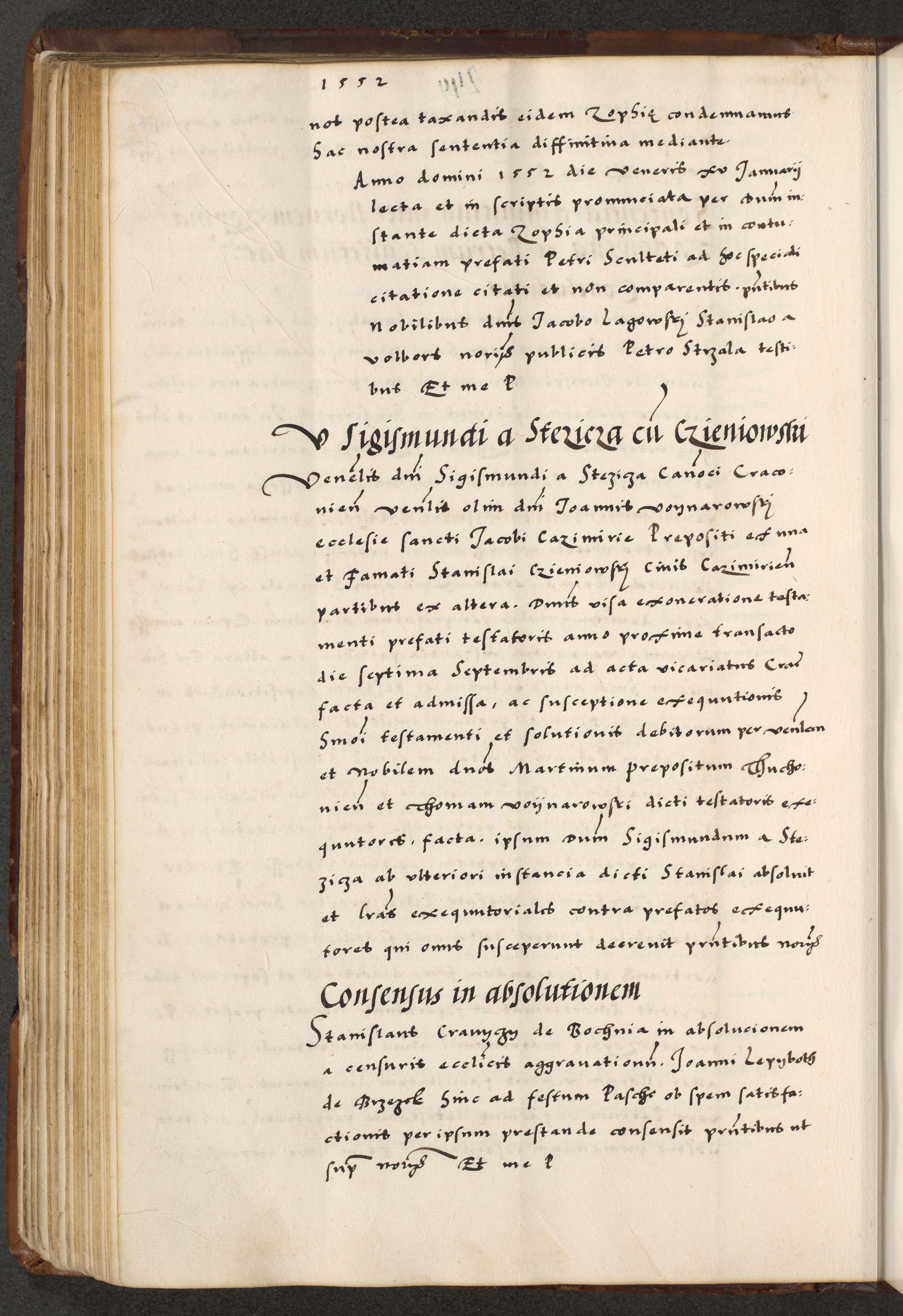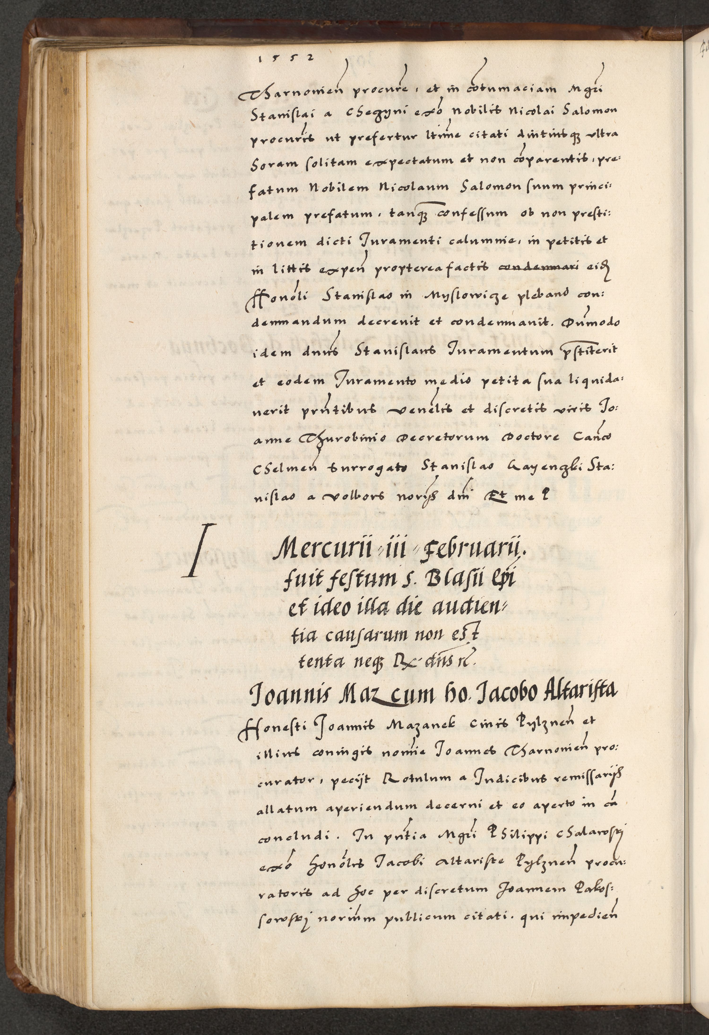 [A]cta actorum causarum, sententiarum tam diffinitivarum quam interloquutoriarum, obligationum, constitutionum et contractuum coram reverendo patre domino Petro Porembski preposito Osvieczimensi, canonico et officiali generali Cracoviensi de anno Domini millesimo quingentesimo quinguagesimo primo, cuius indictio est nona, pontificatus sanctissimi in Christo patris et domini nostri domini Juliii divina providencia pape tercii, anno secundo, a die et mense infrascriptis feliciter continiantur