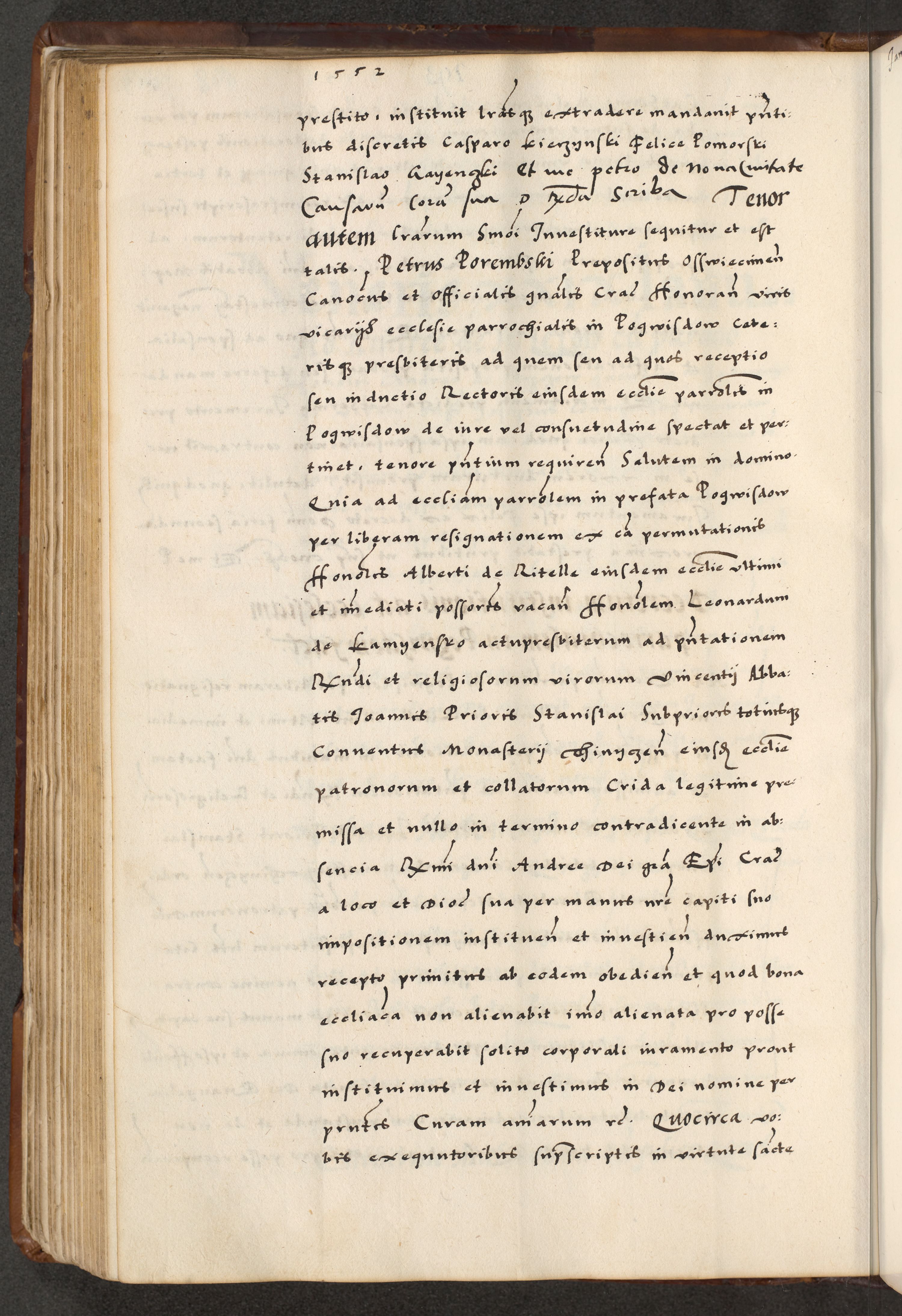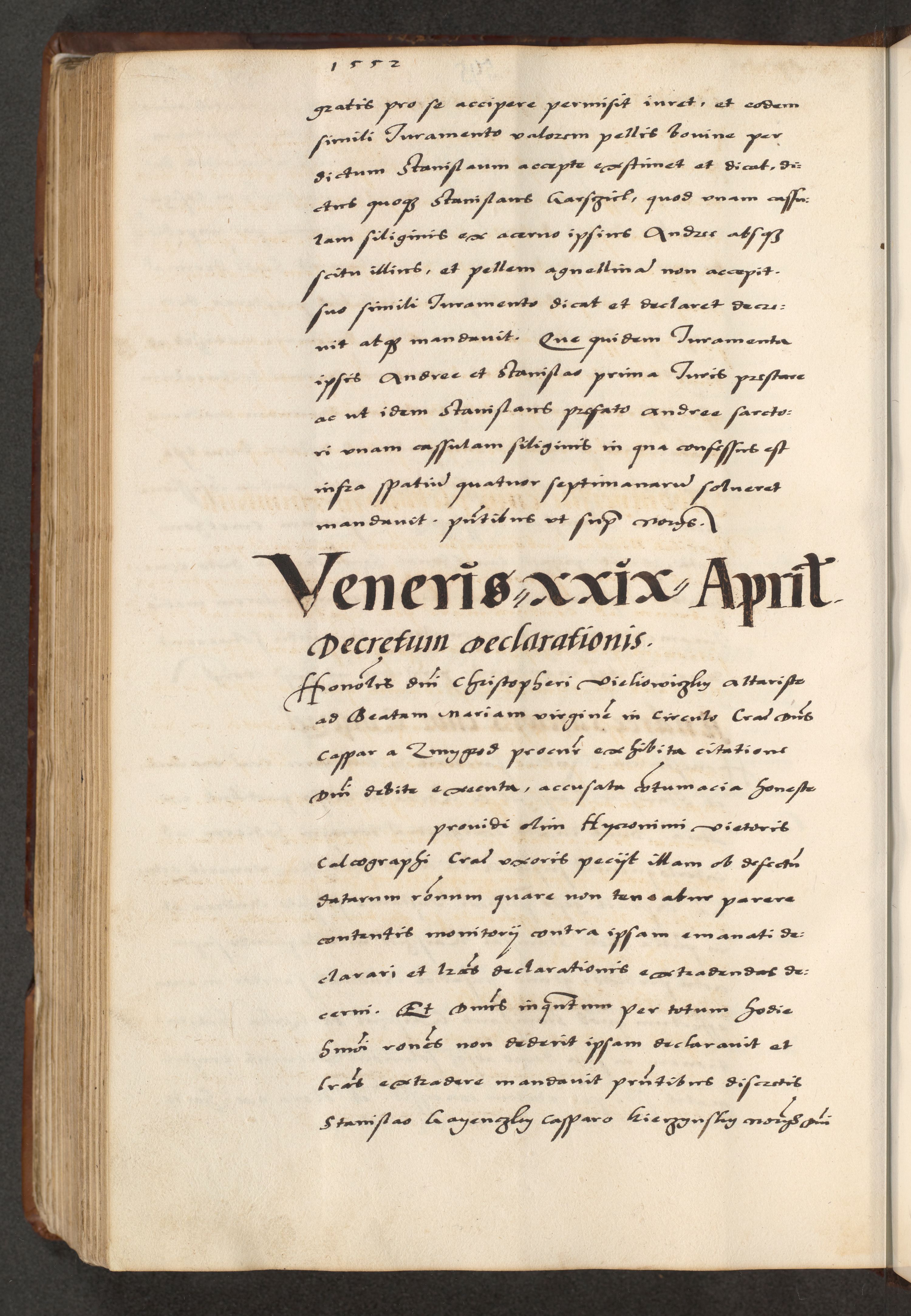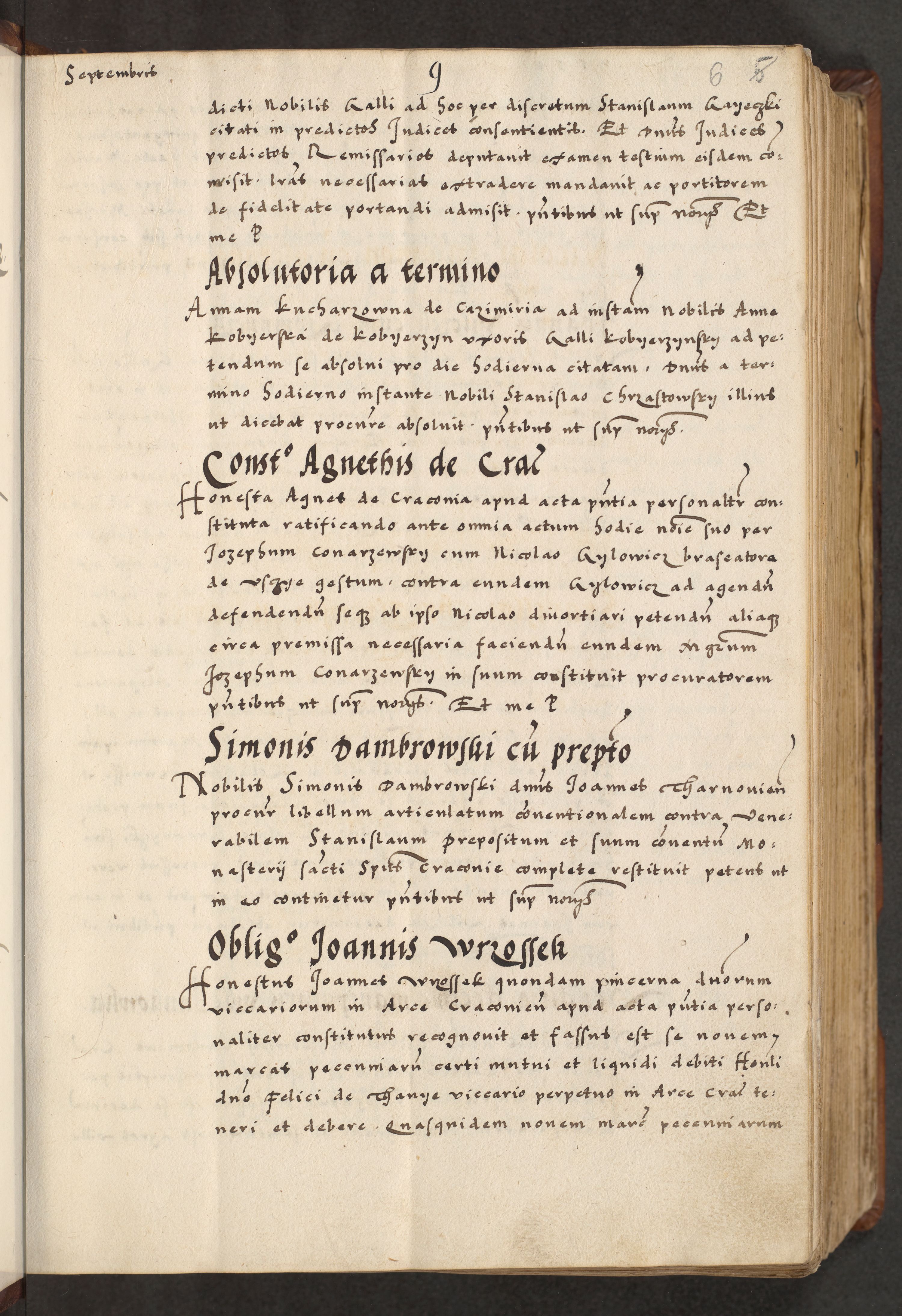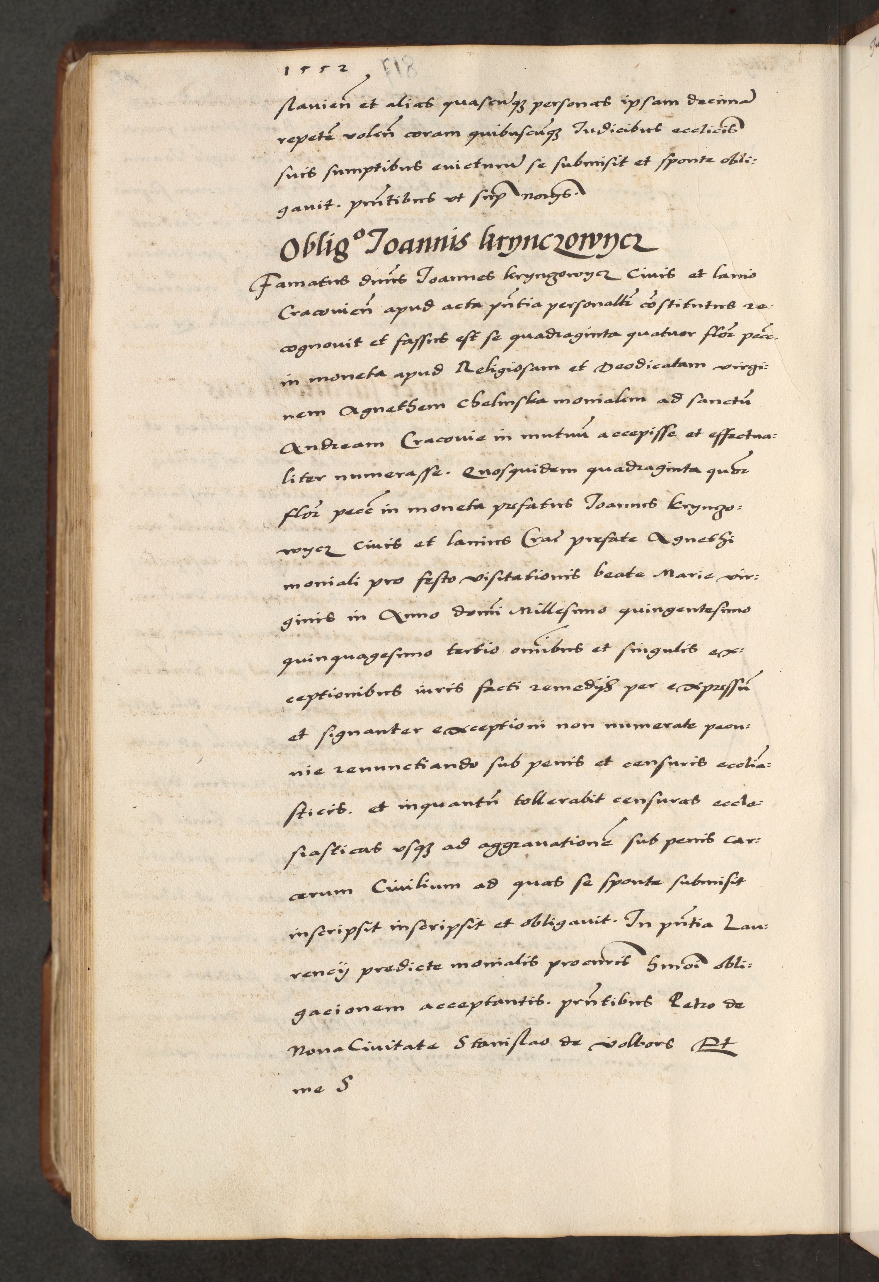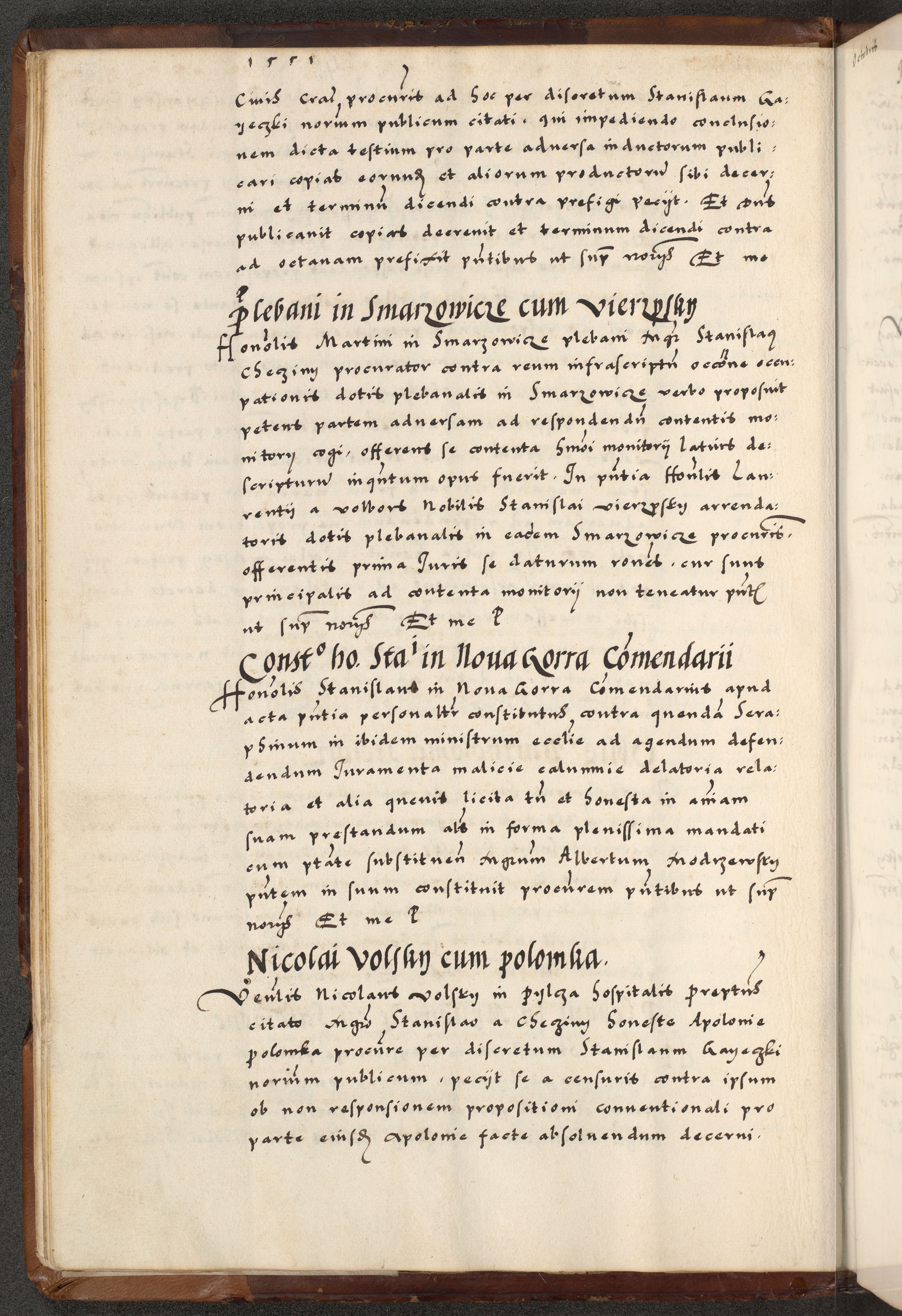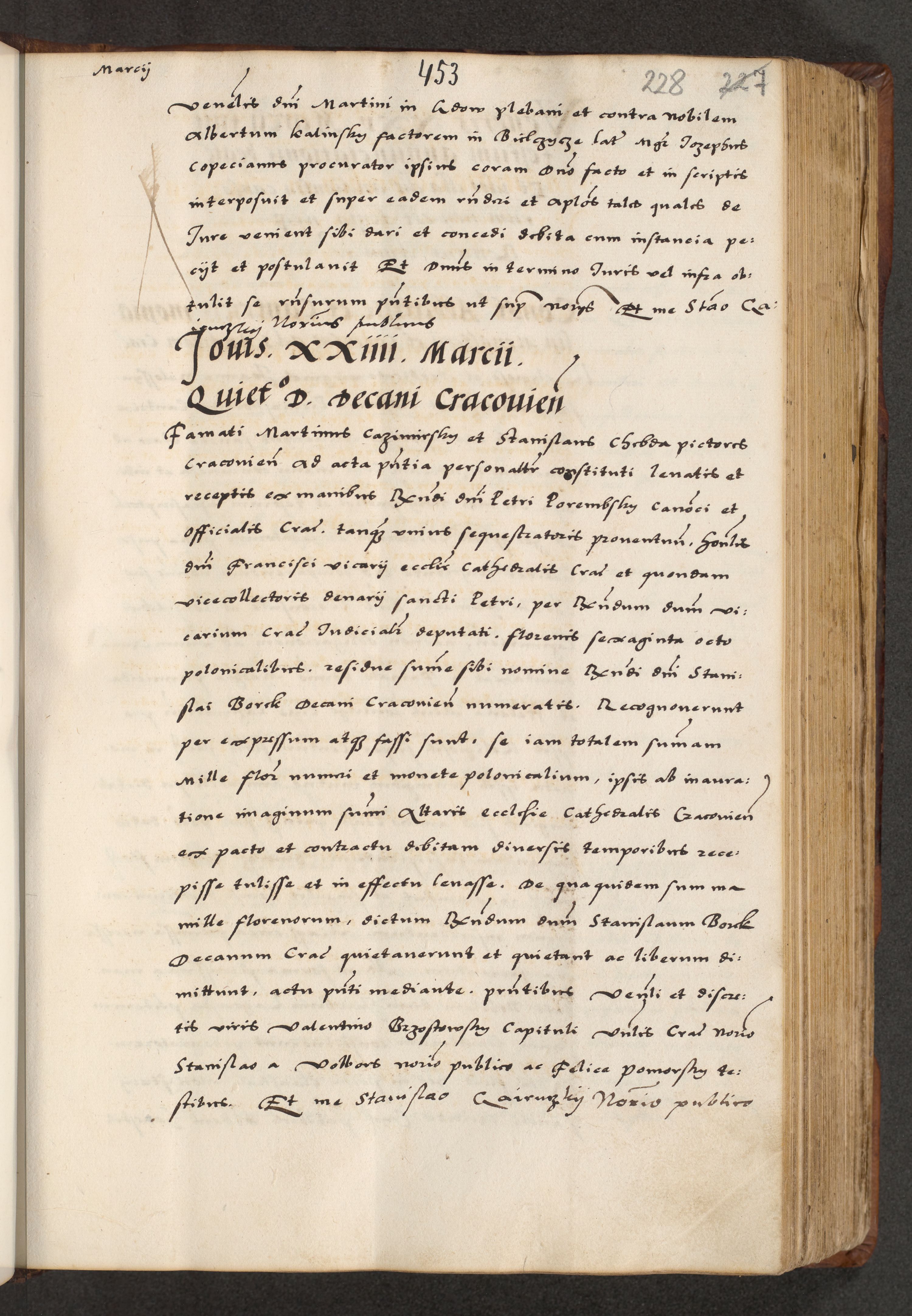 [A]cta actorum causarum, sententiarum tam diffinitivarum quam interloquutoriarum, obligationum, constitutionum et contractuum coram reverendo patre domino Petro Porembski preposito Osvieczimensi, canonico et officiali generali Cracoviensi de anno Domini millesimo quingentesimo quinguagesimo primo, cuius indictio est nona, pontificatus sanctissimi in Christo patris et domini nostri domini Juliii divina providencia pape tercii, anno secundo, a die et mense infrascriptis feliciter continiantur