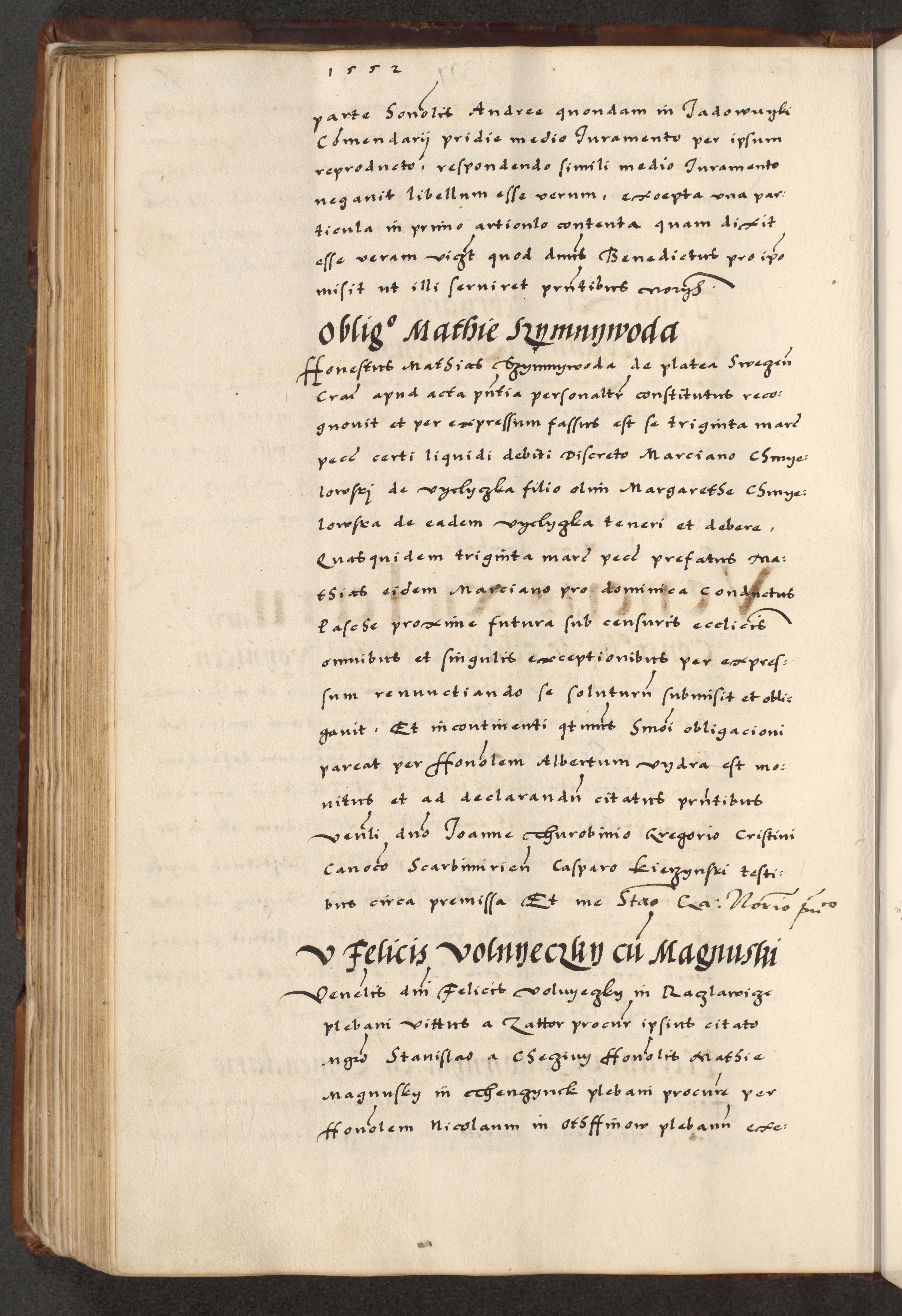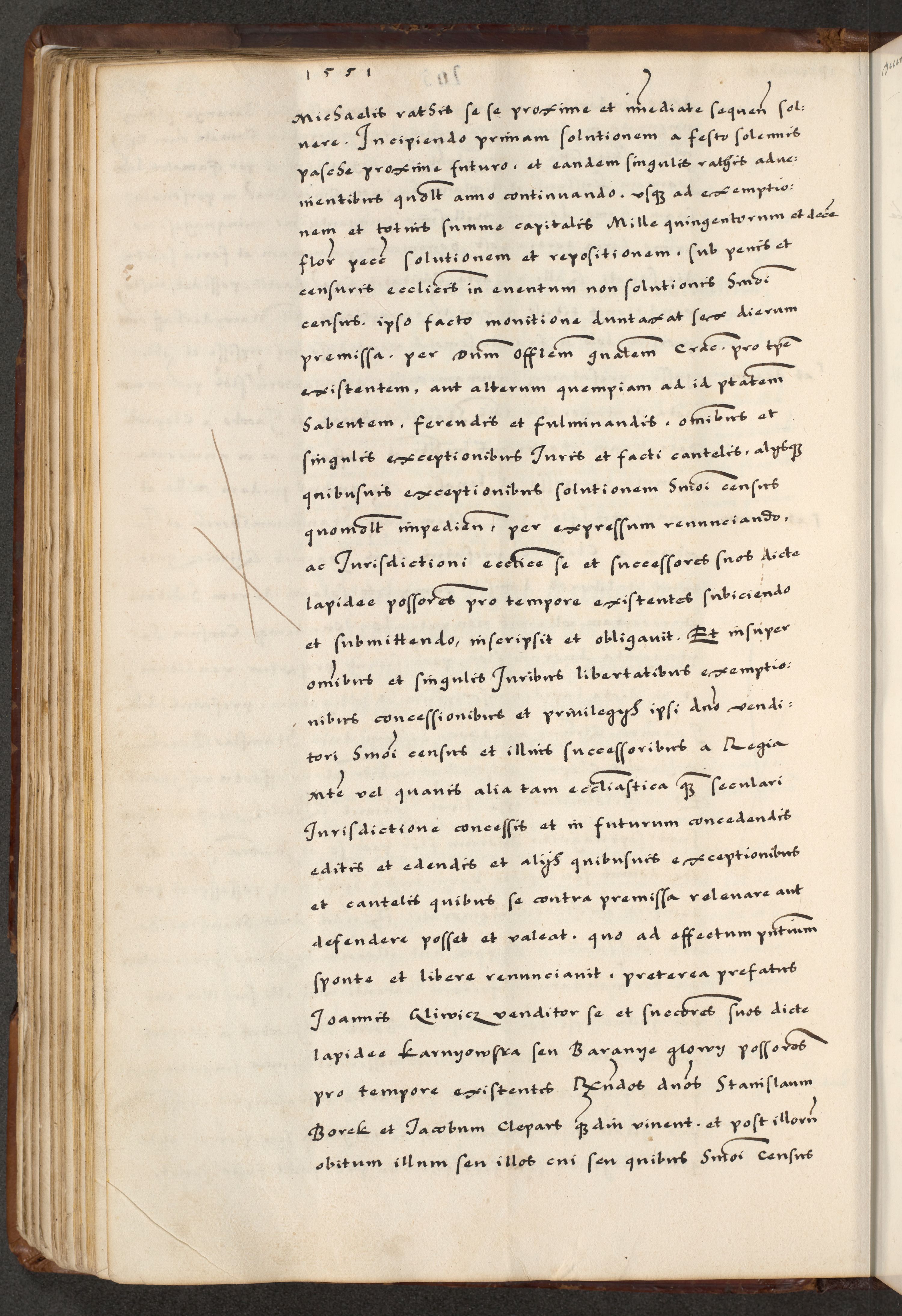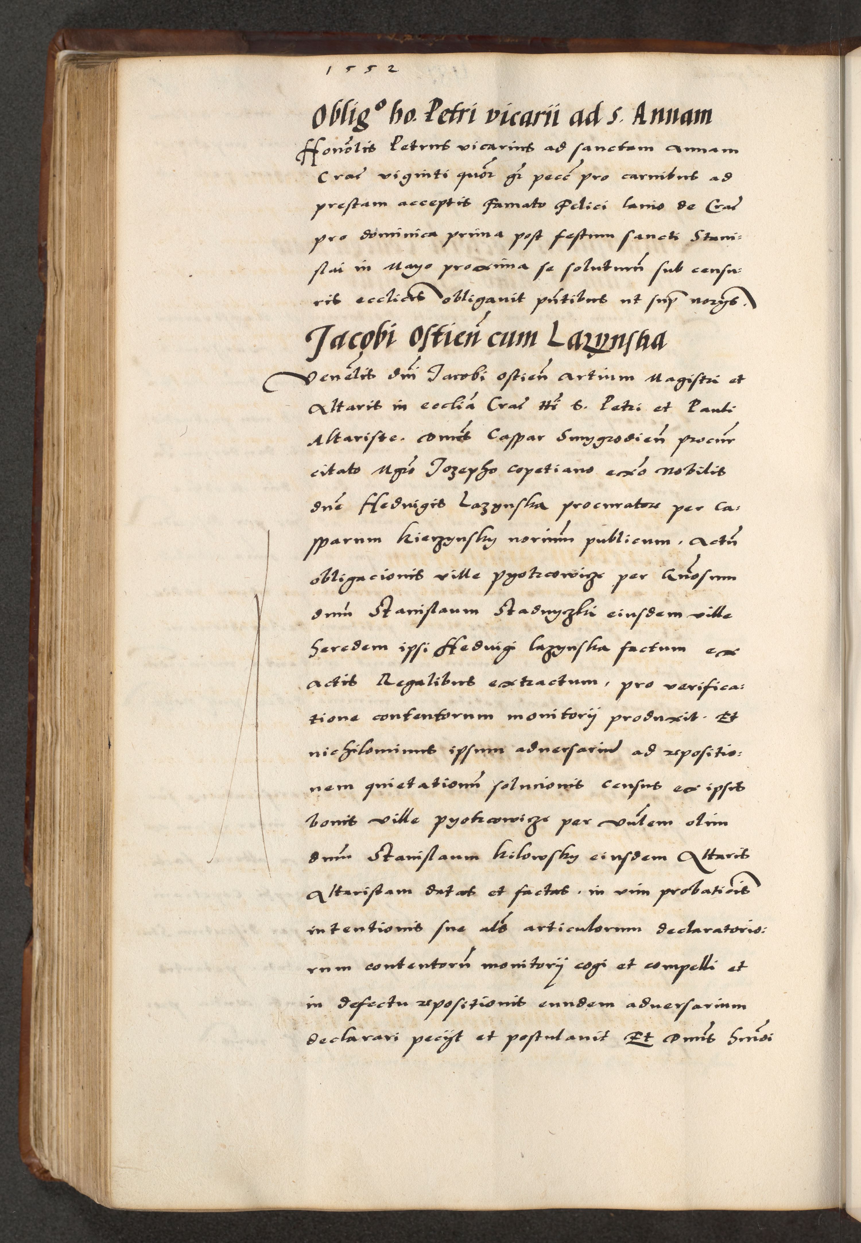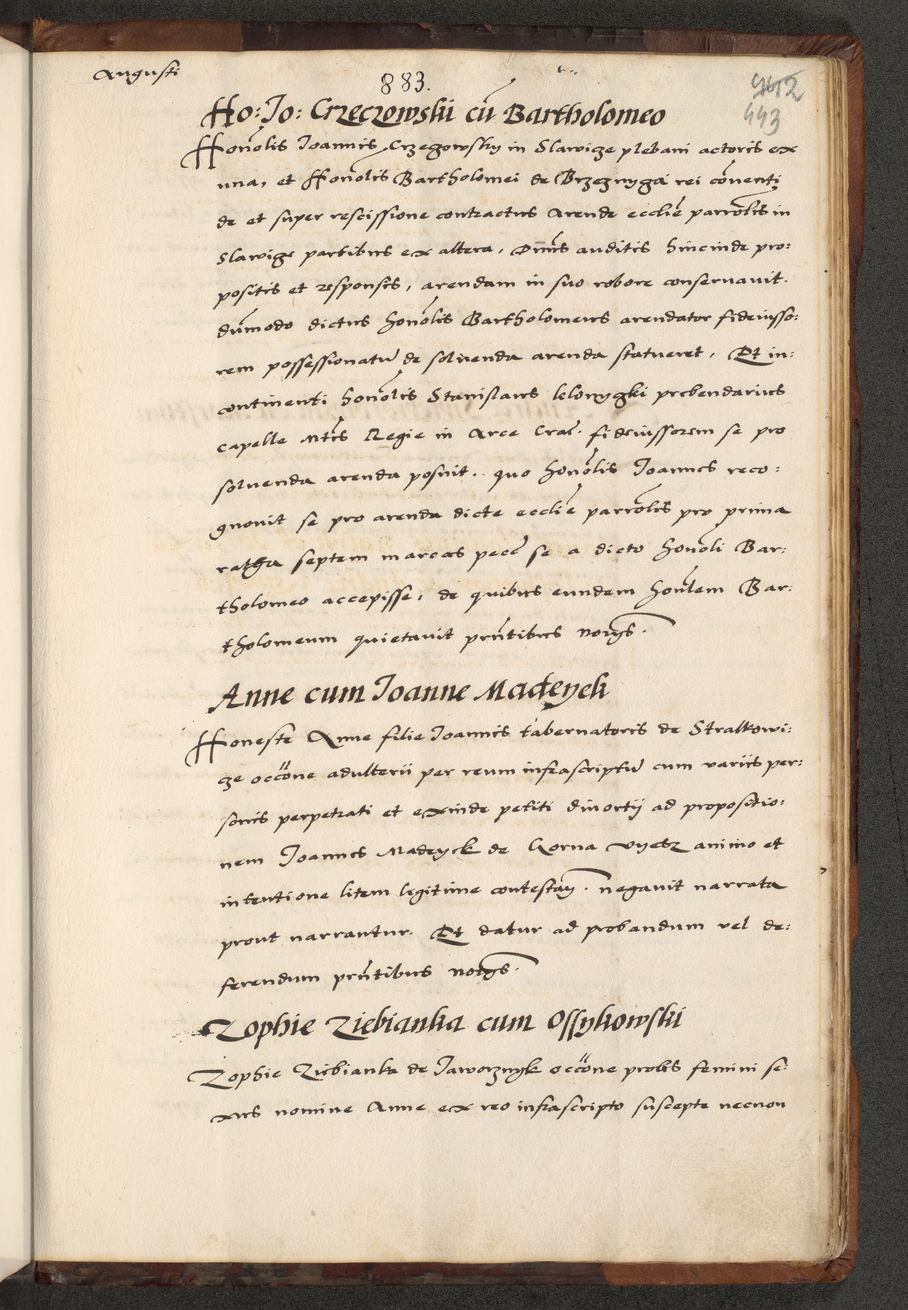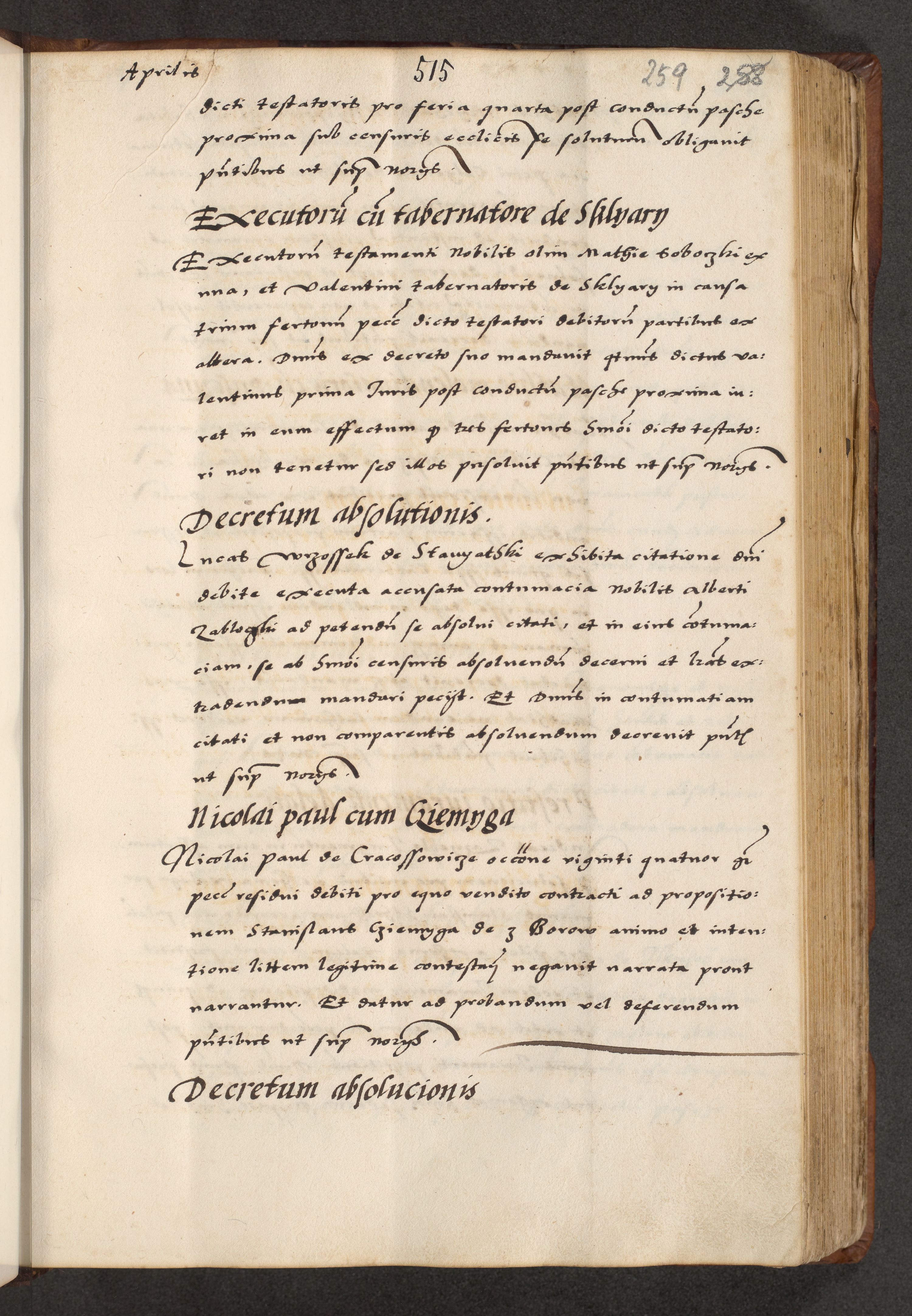 [A]cta actorum causarum, sententiarum tam diffinitivarum quam interloquutoriarum, obligationum, constitutionum et contractuum coram reverendo patre domino Petro Porembski preposito Osvieczimensi, canonico et officiali generali Cracoviensi de anno Domini millesimo quingentesimo quinguagesimo primo, cuius indictio est nona, pontificatus sanctissimi in Christo patris et domini nostri domini Juliii divina providencia pape tercii, anno secundo, a die et mense infrascriptis feliciter continiantur