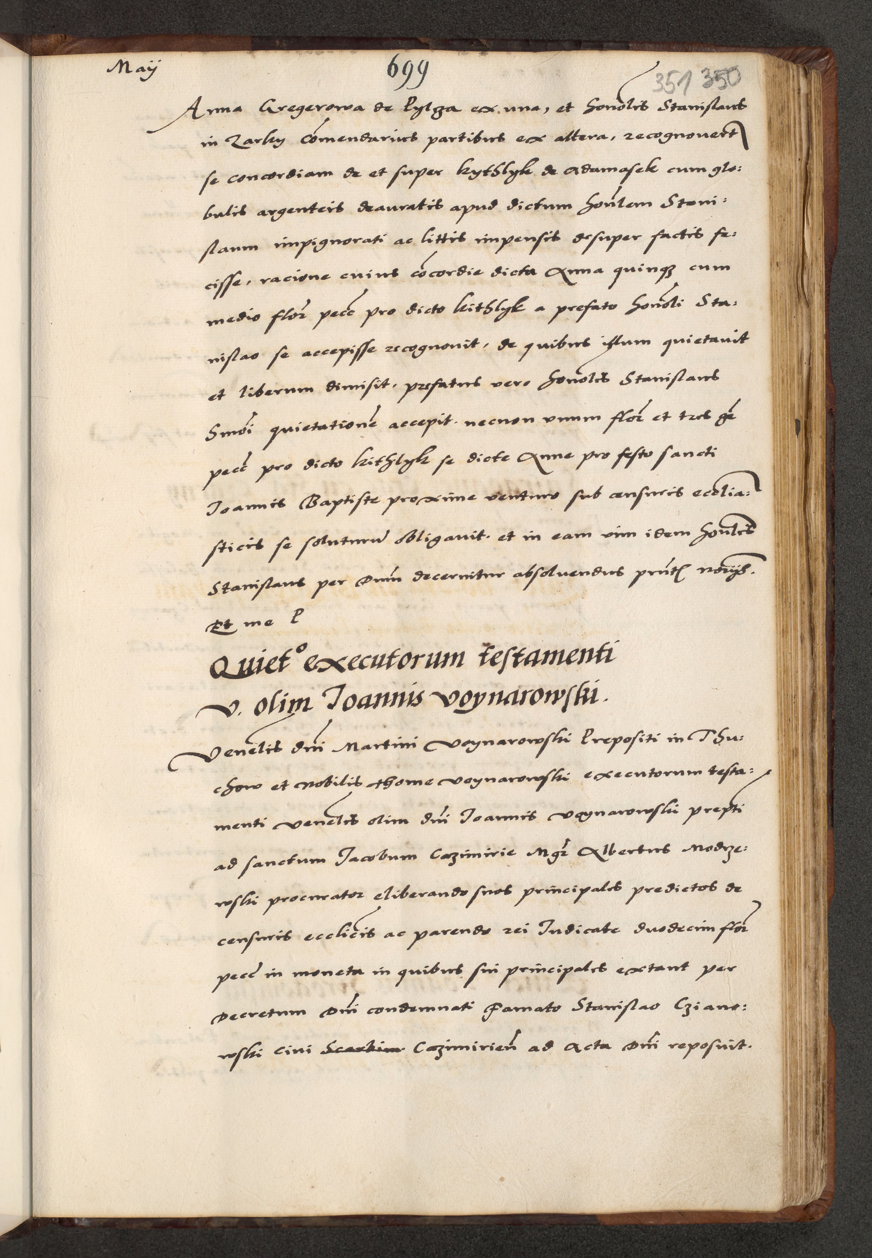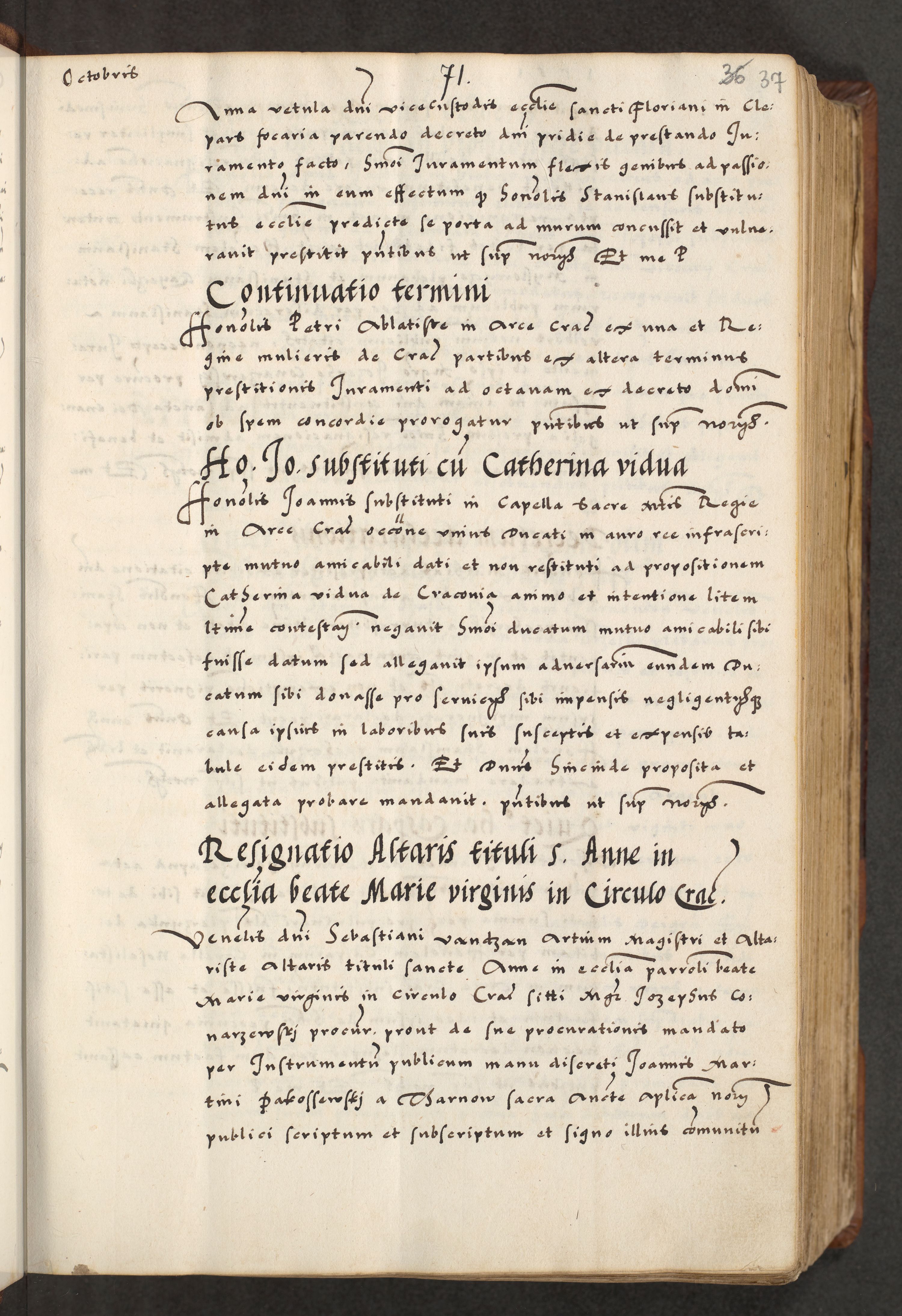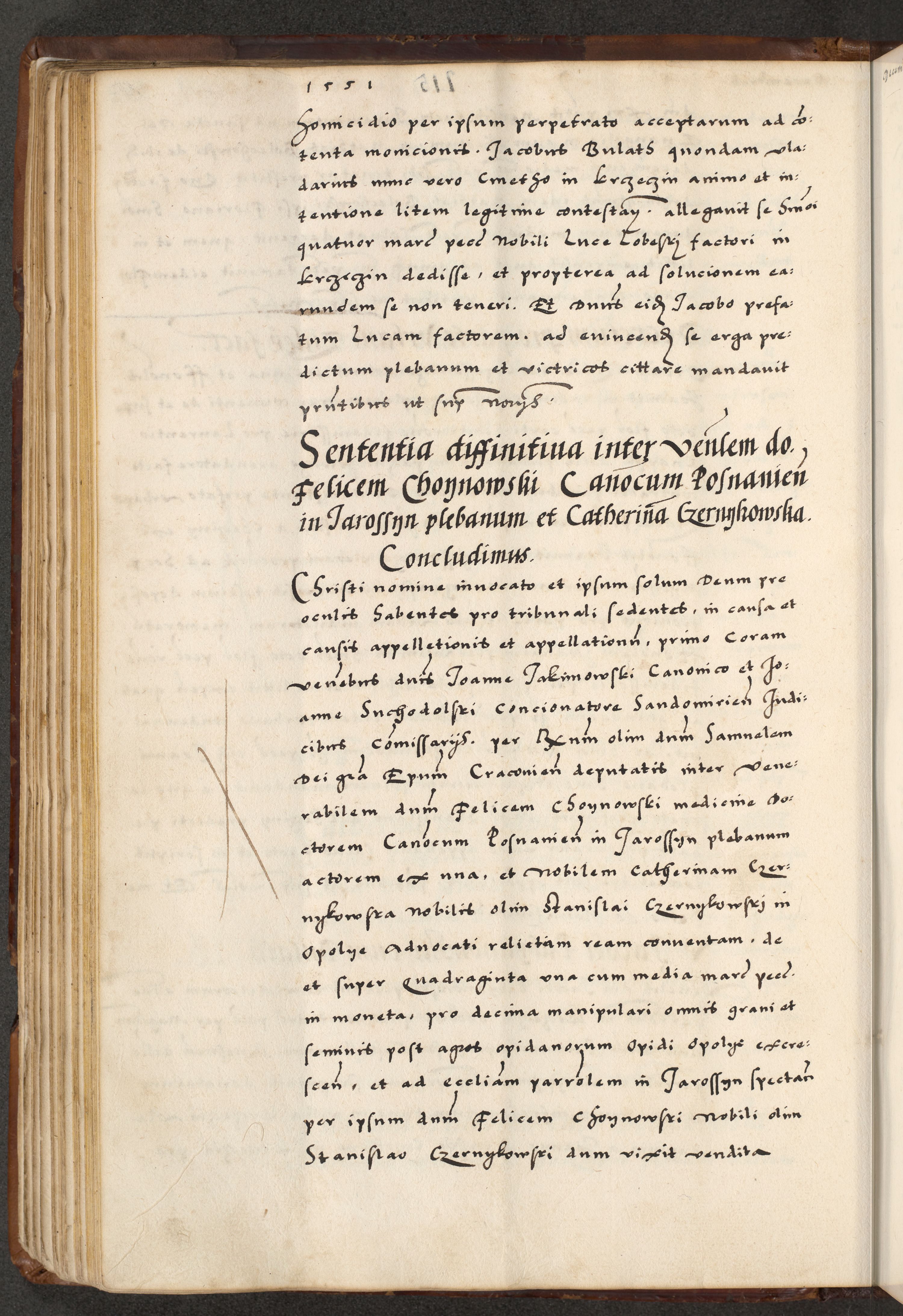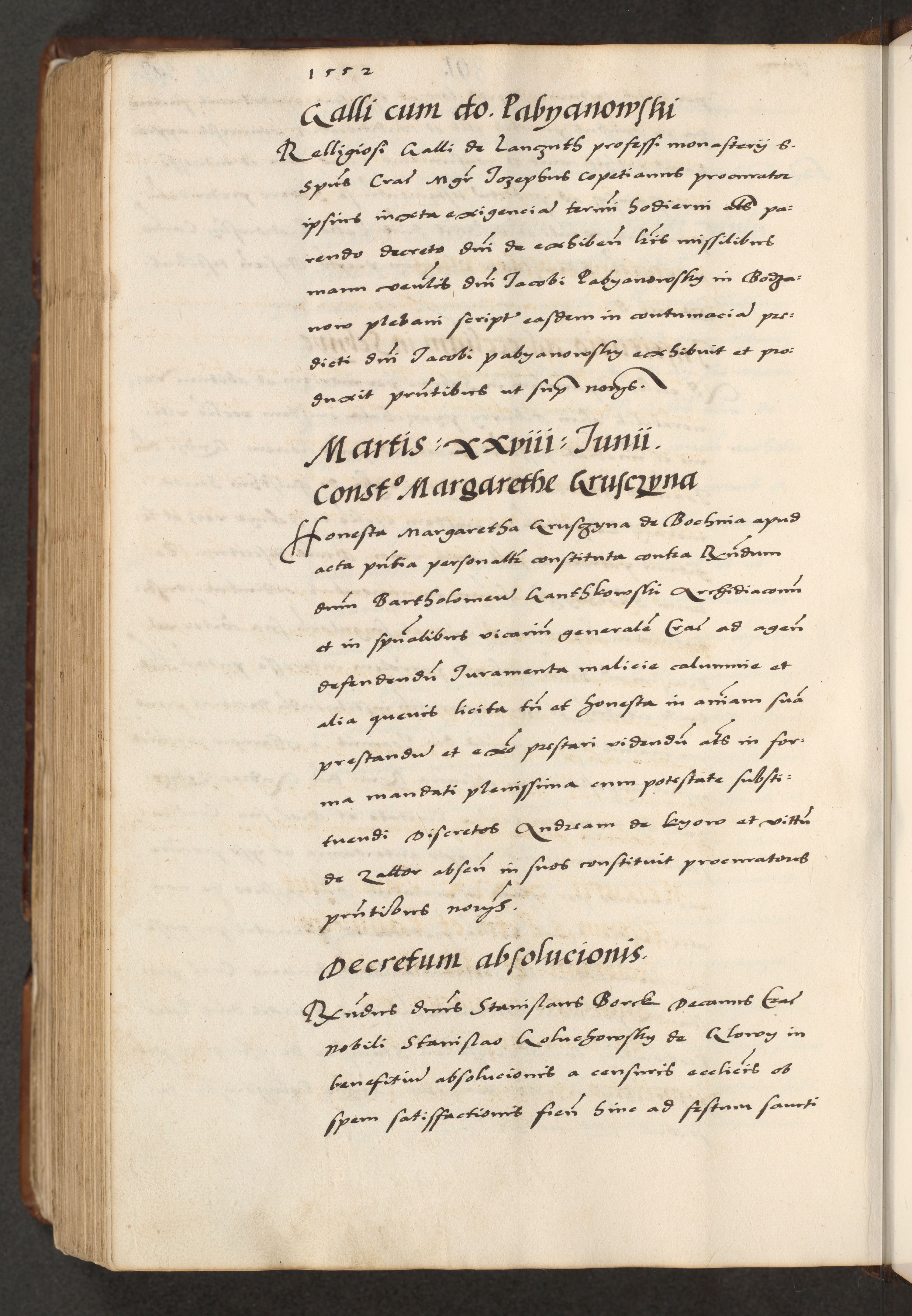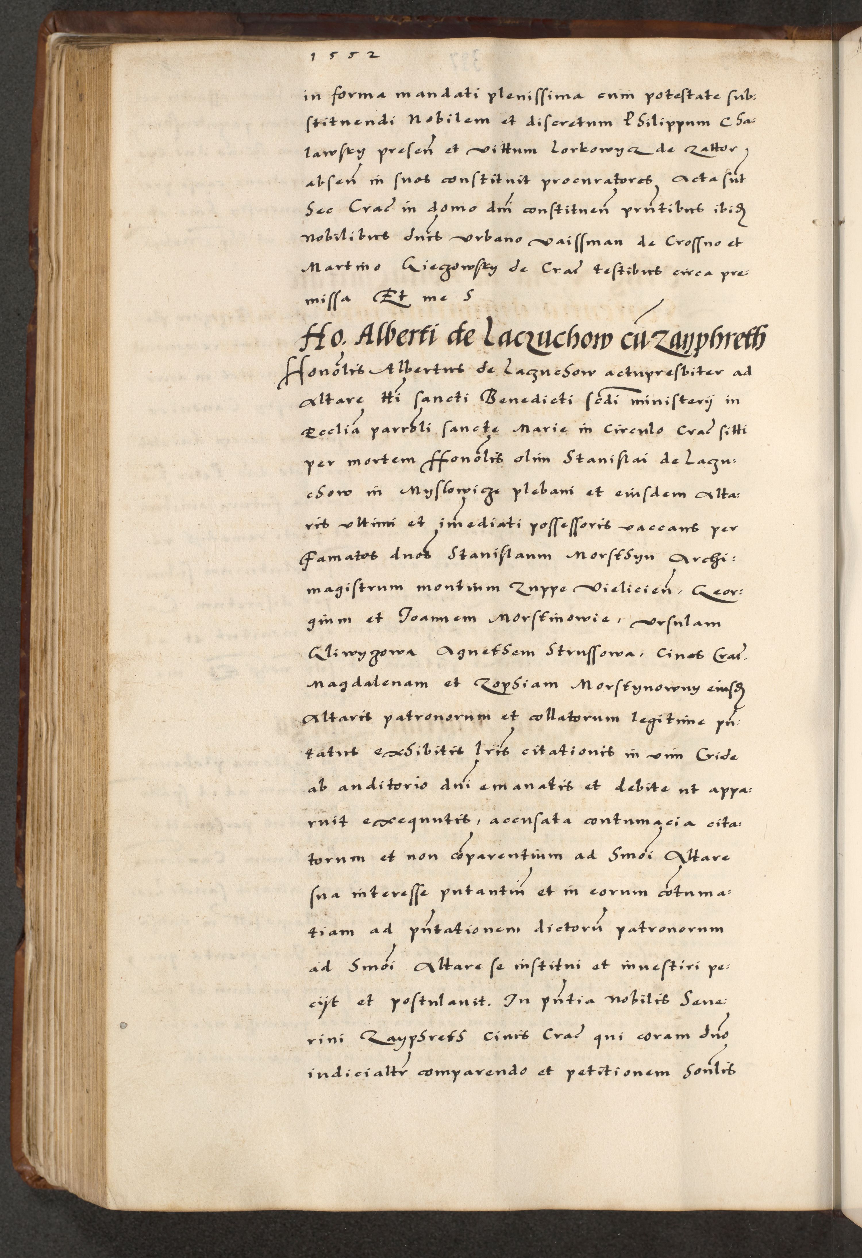 [A]cta actorum causarum, sententiarum tam diffinitivarum quam interloquutoriarum, obligationum, constitutionum et contractuum coram reverendo patre domino Petro Porembski preposito Osvieczimensi, canonico et officiali generali Cracoviensi de anno Domini millesimo quingentesimo quinguagesimo primo, cuius indictio est nona, pontificatus sanctissimi in Christo patris et domini nostri domini Juliii divina providencia pape tercii, anno secundo, a die et mense infrascriptis feliciter continiantur