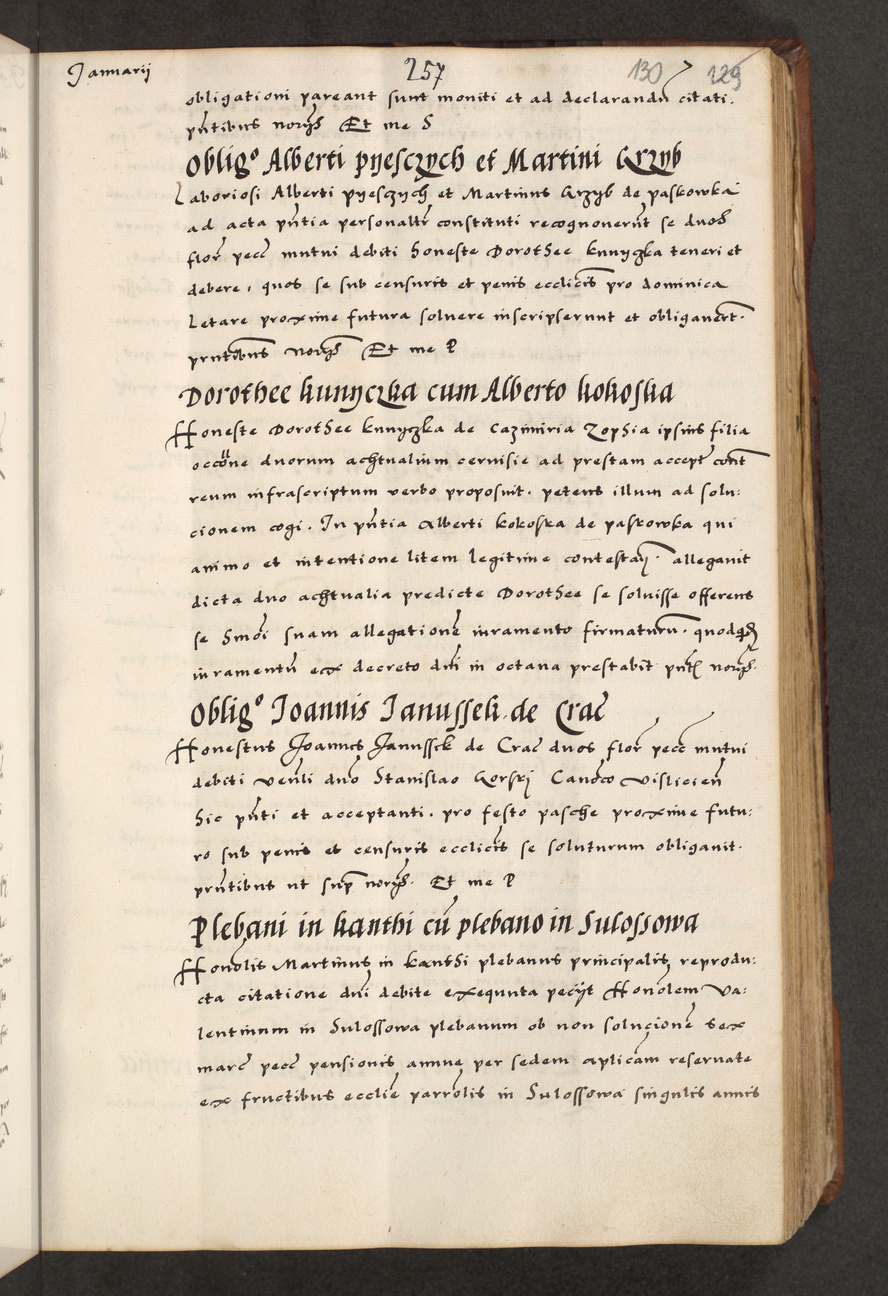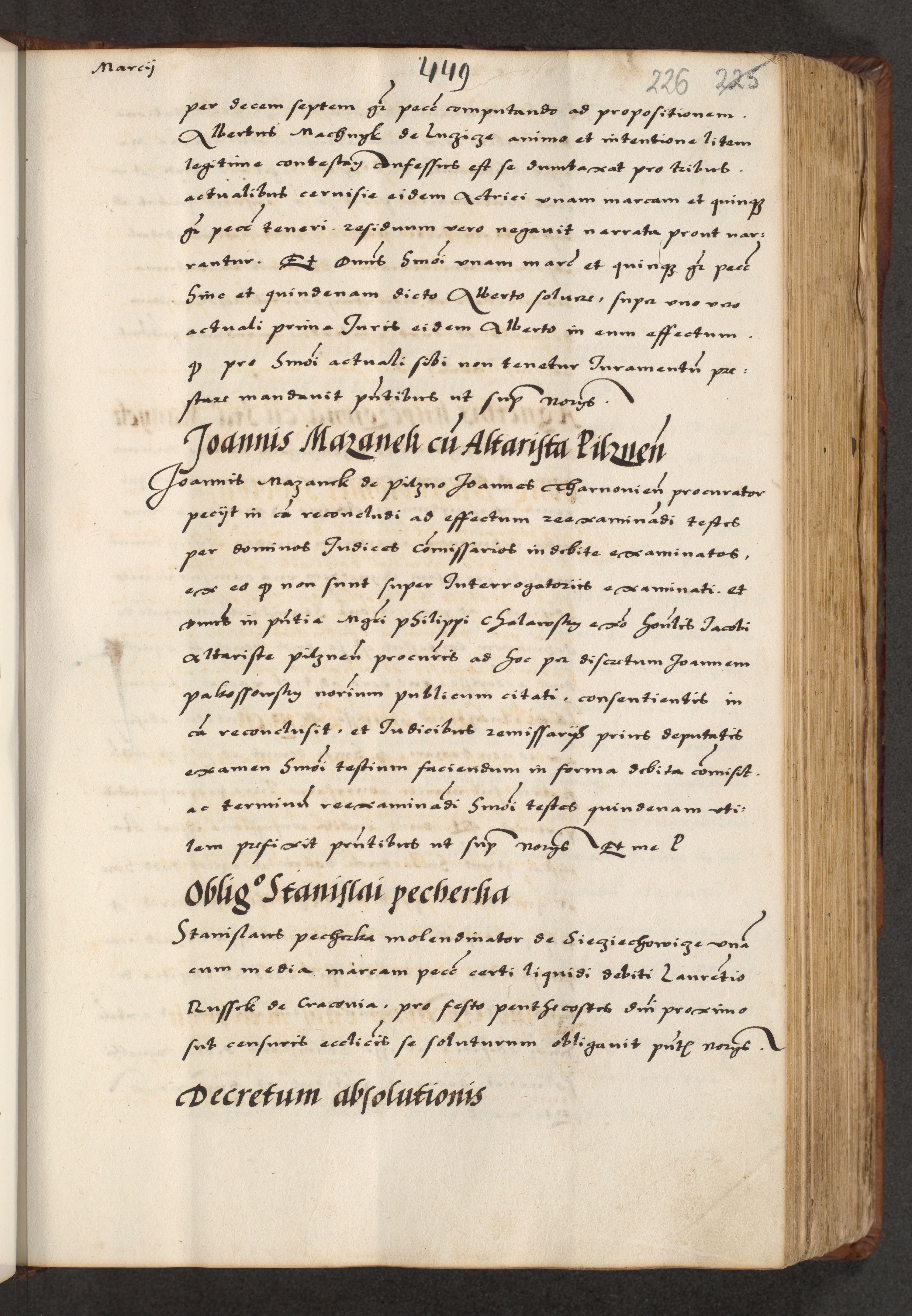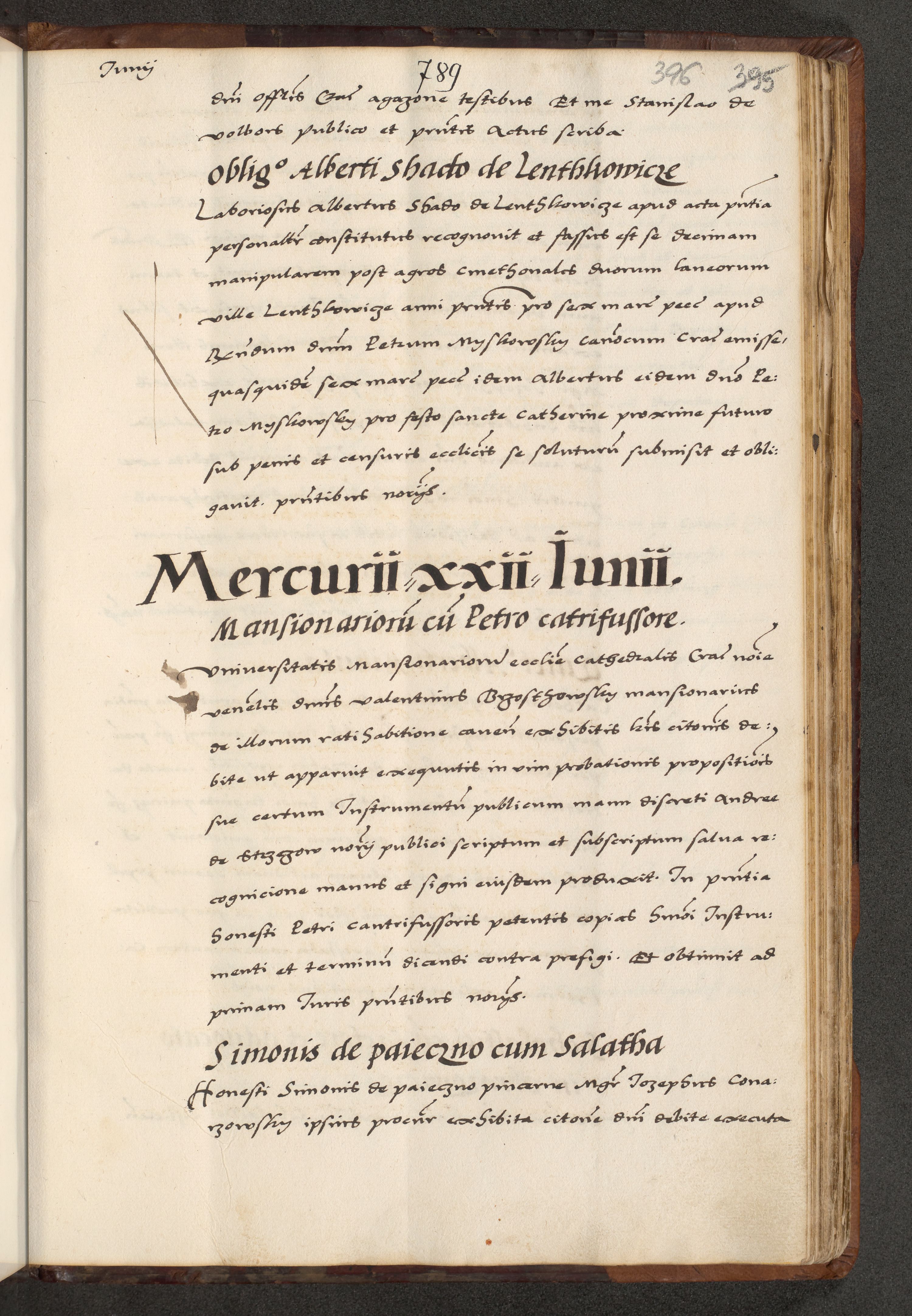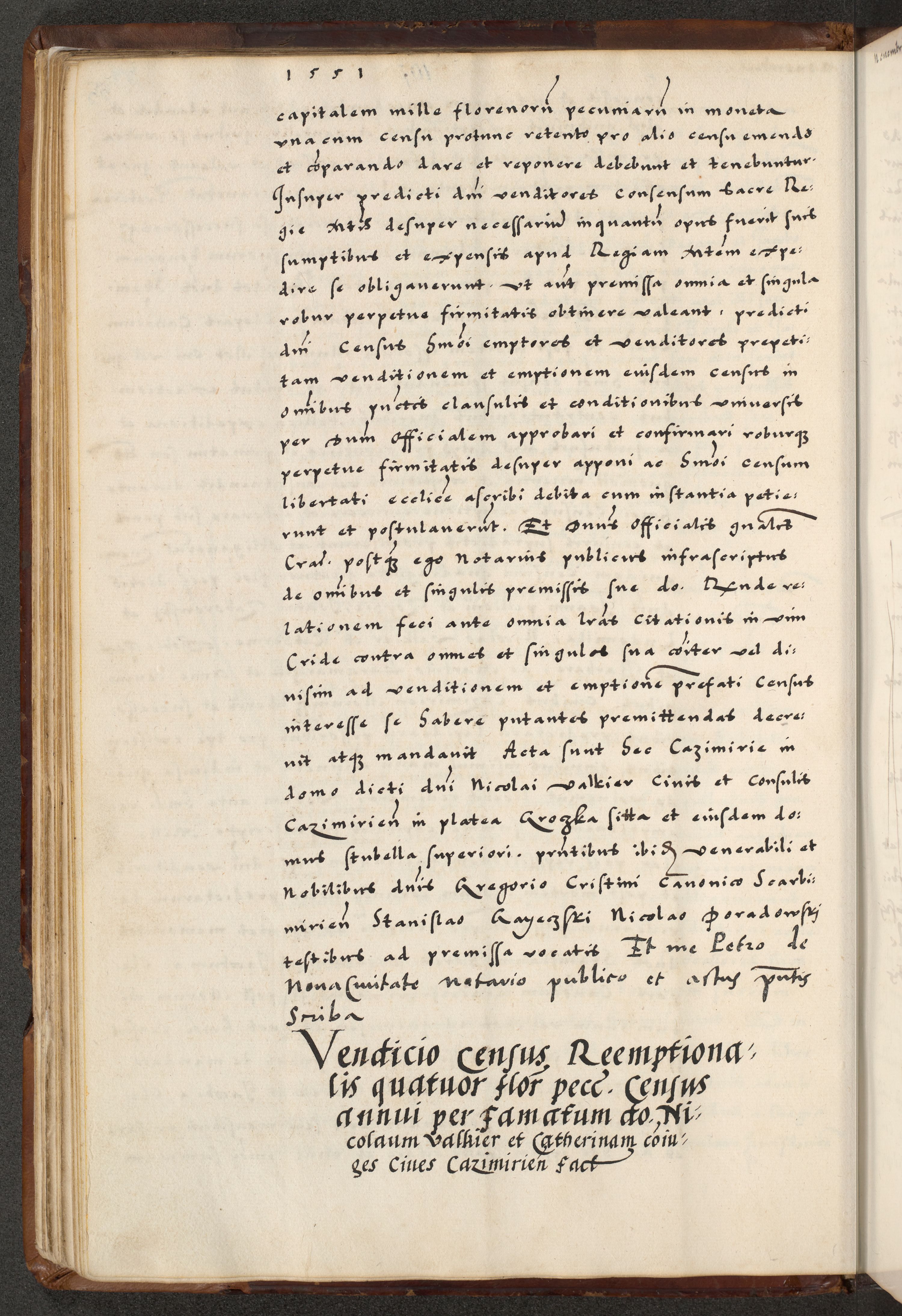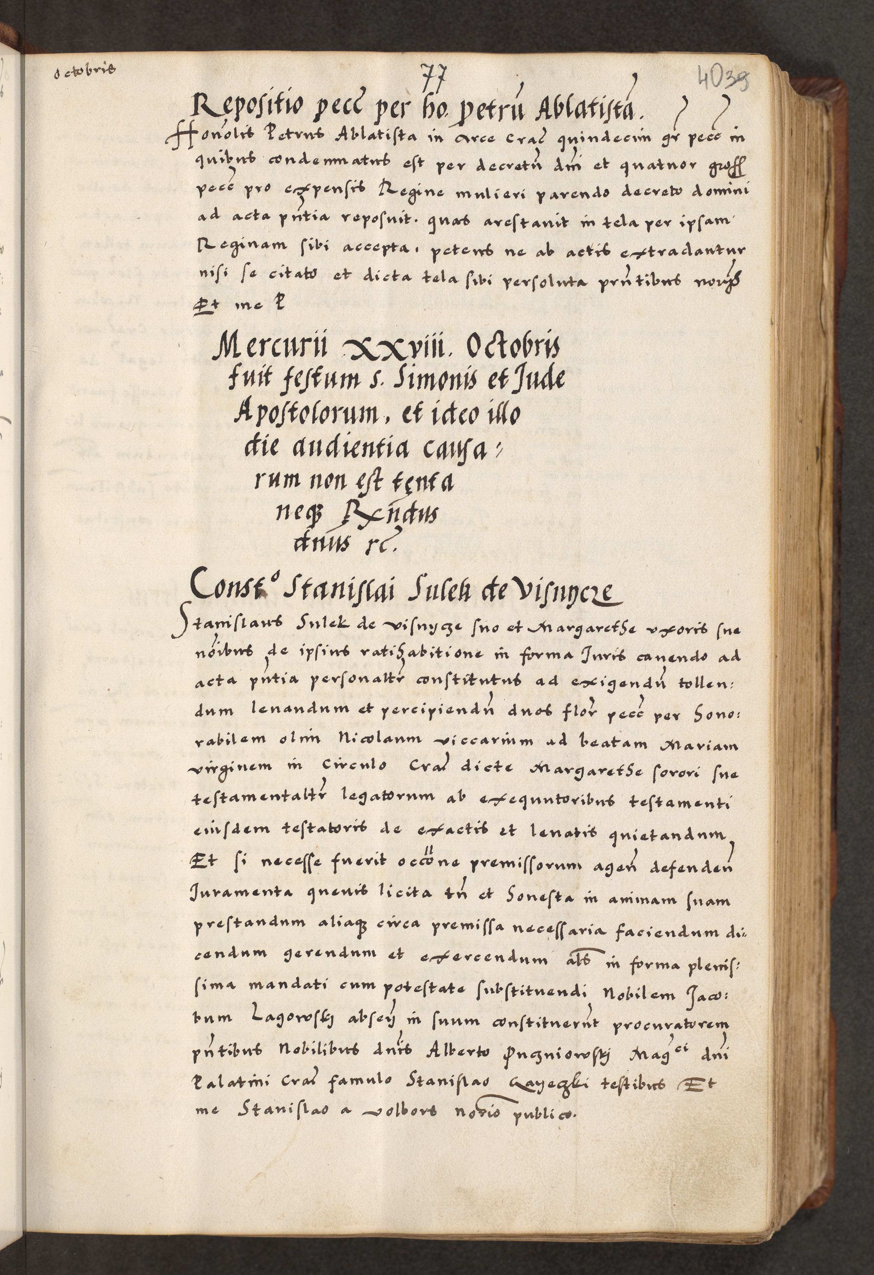 [A]cta actorum causarum, sententiarum tam diffinitivarum quam interloquutoriarum, obligationum, constitutionum et contractuum coram reverendo patre domino Petro Porembski preposito Osvieczimensi, canonico et officiali generali Cracoviensi de anno Domini millesimo quingentesimo quinguagesimo primo, cuius indictio est nona, pontificatus sanctissimi in Christo patris et domini nostri domini Juliii divina providencia pape tercii, anno secundo, a die et mense infrascriptis feliciter continiantur