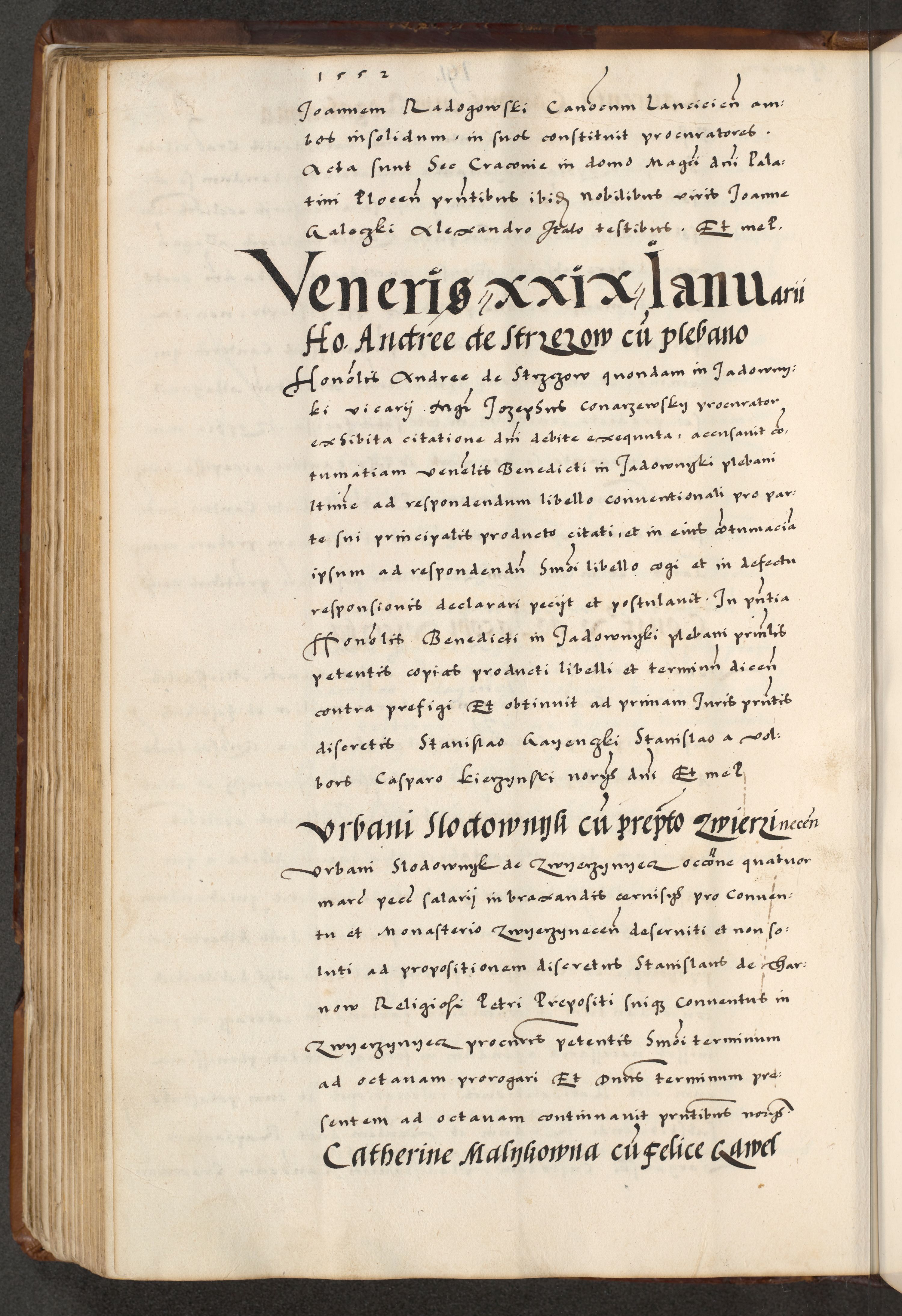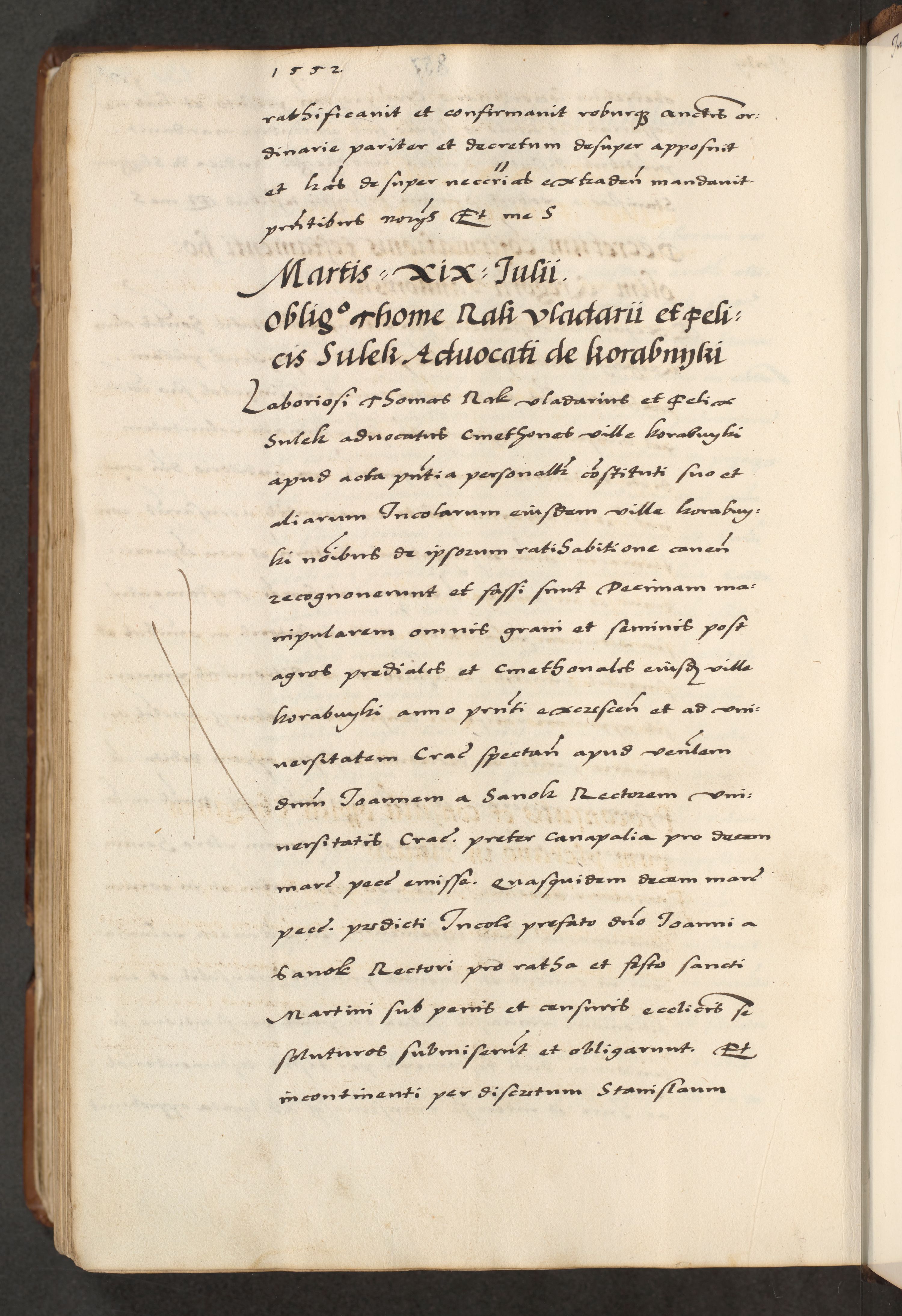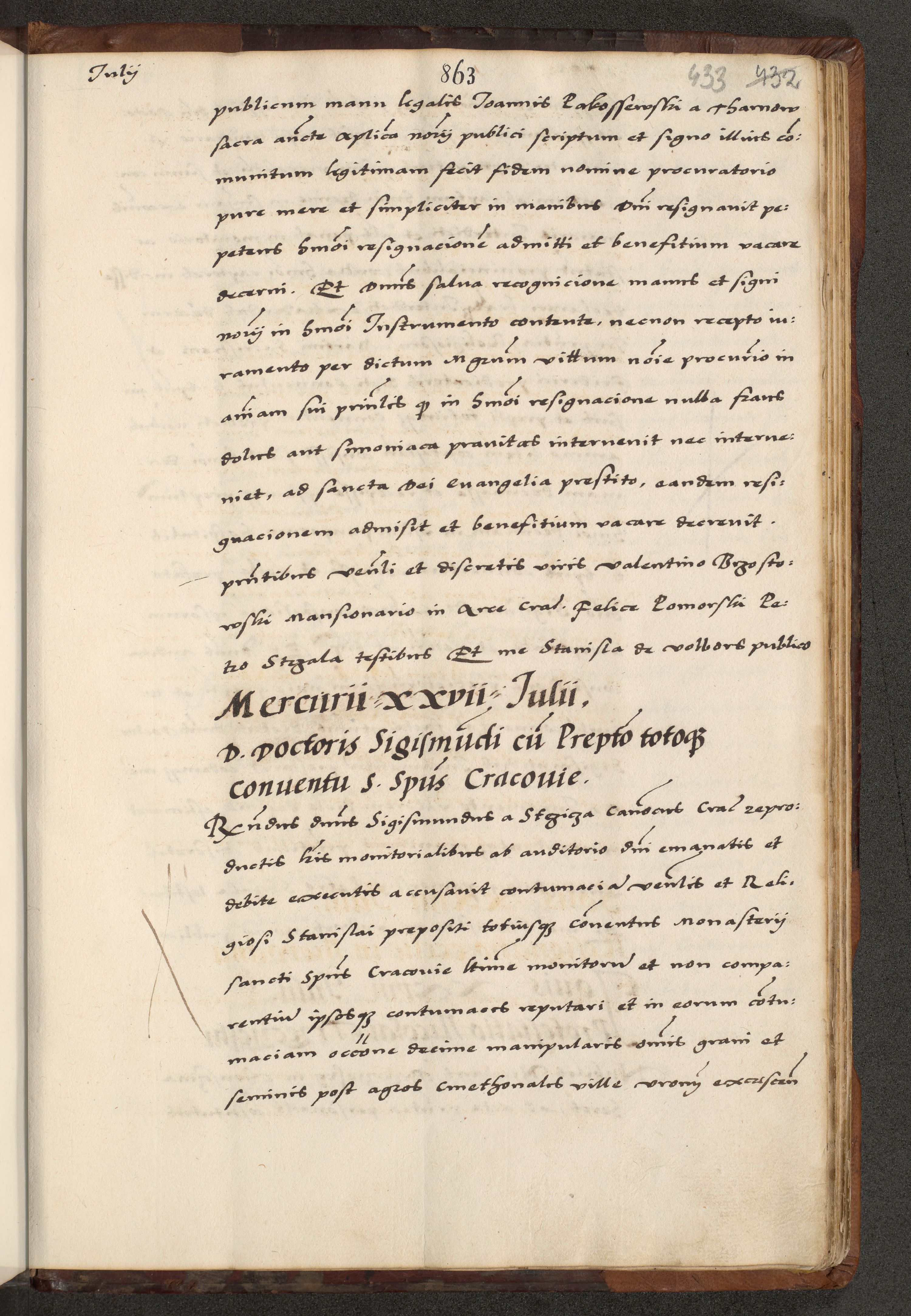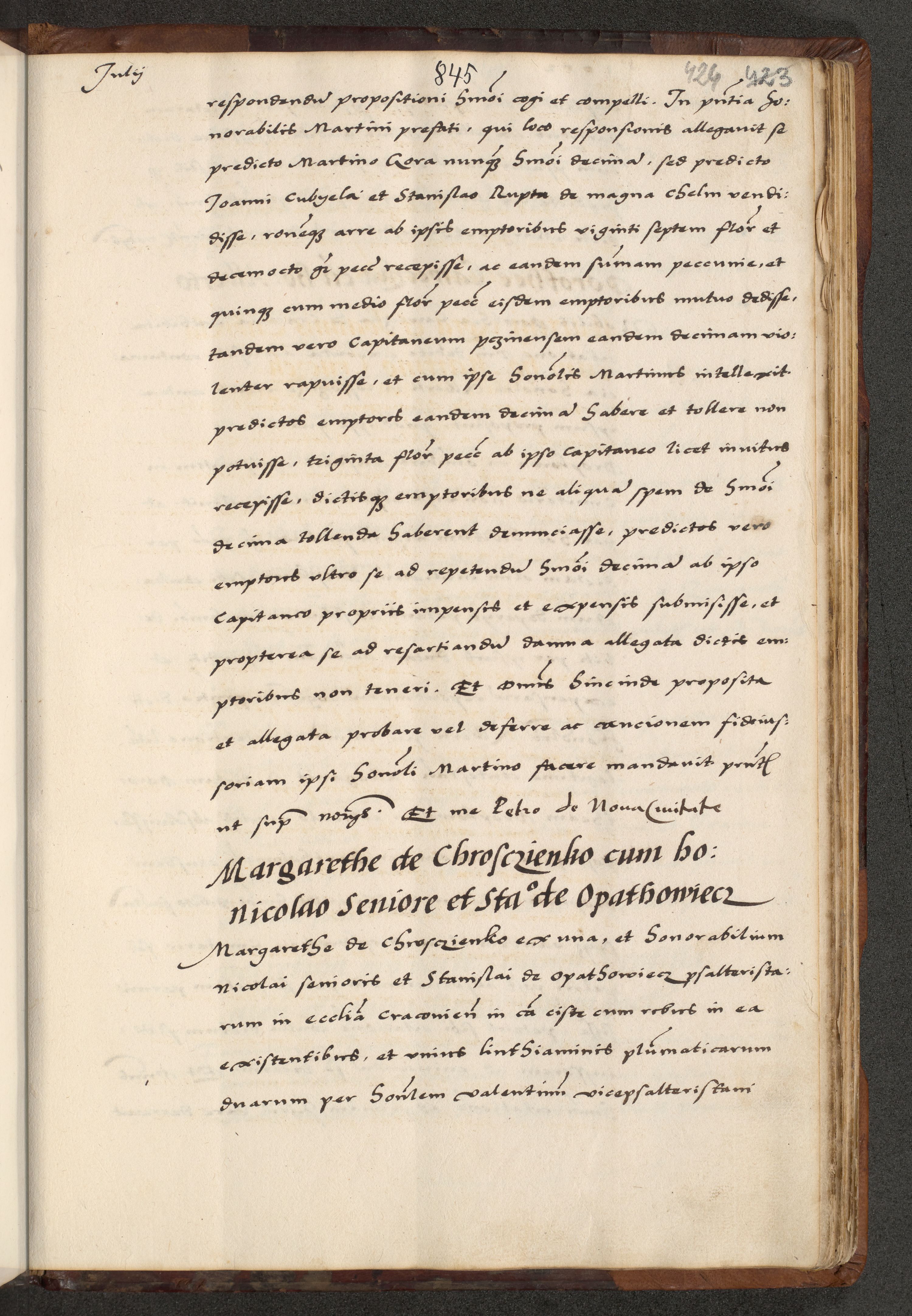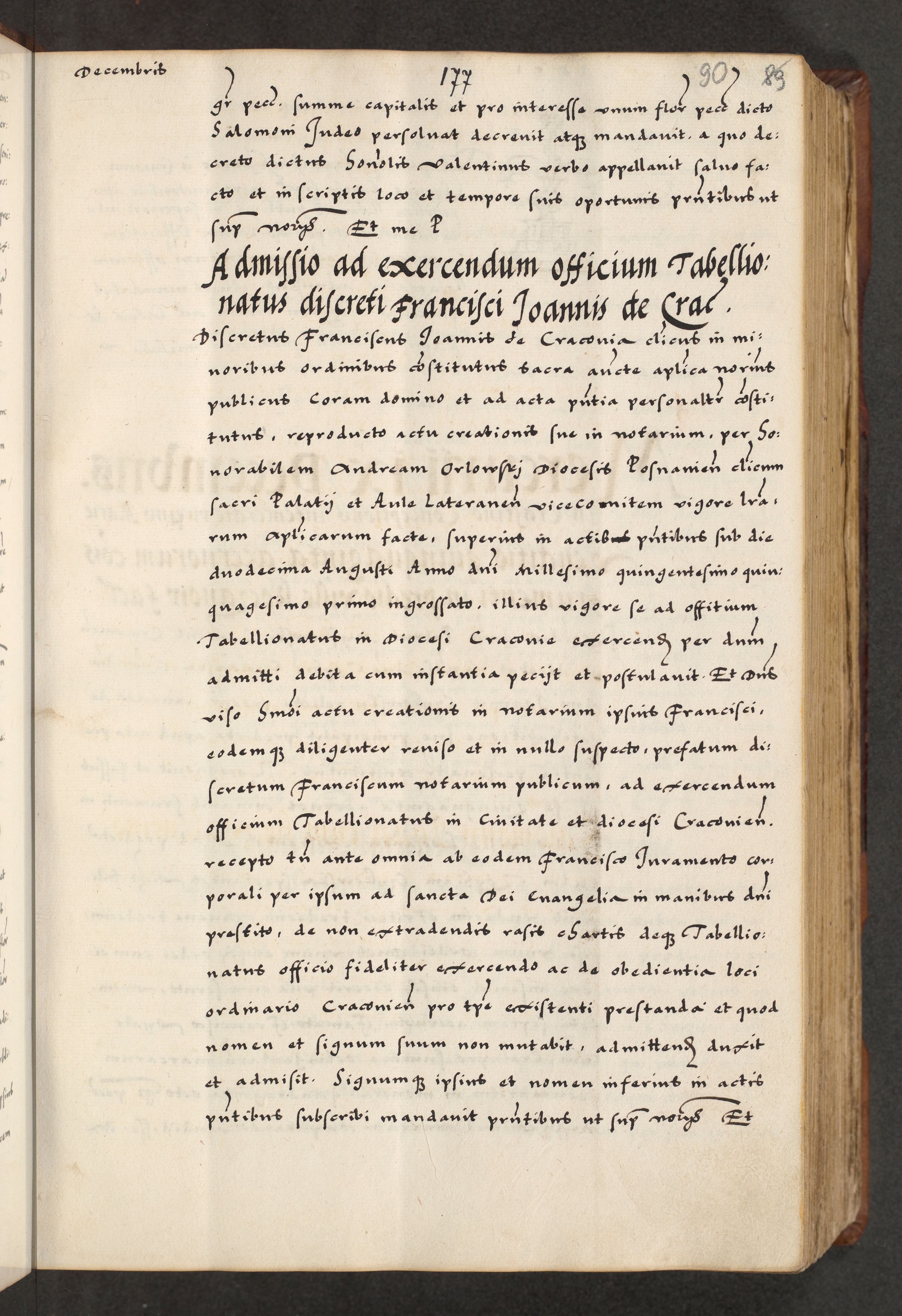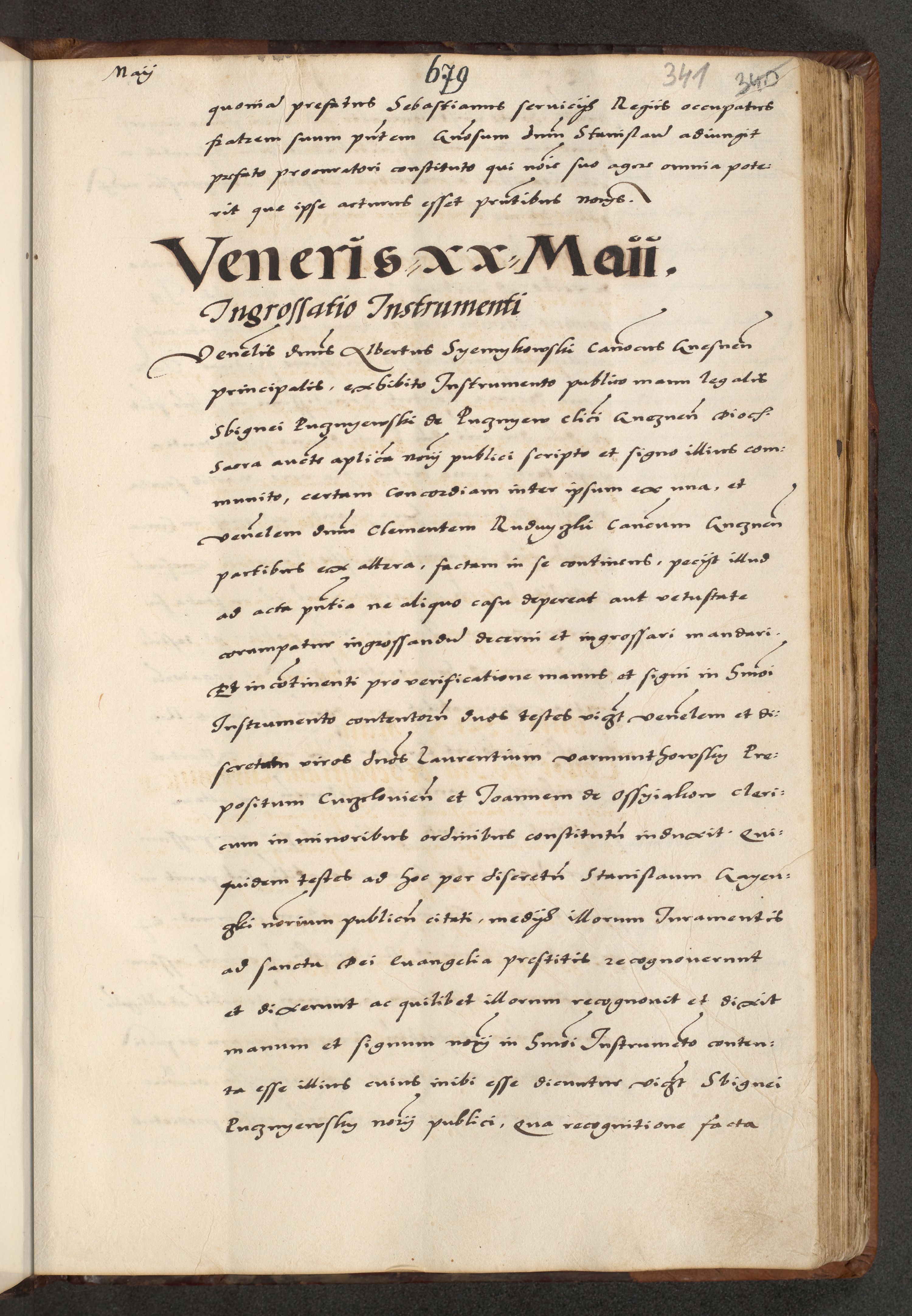 [A]cta actorum causarum, sententiarum tam diffinitivarum quam interloquutoriarum, obligationum, constitutionum et contractuum coram reverendo patre domino Petro Porembski preposito Osvieczimensi, canonico et officiali generali Cracoviensi de anno Domini millesimo quingentesimo quinguagesimo primo, cuius indictio est nona, pontificatus sanctissimi in Christo patris et domini nostri domini Juliii divina providencia pape tercii, anno secundo, a die et mense infrascriptis feliciter continiantur