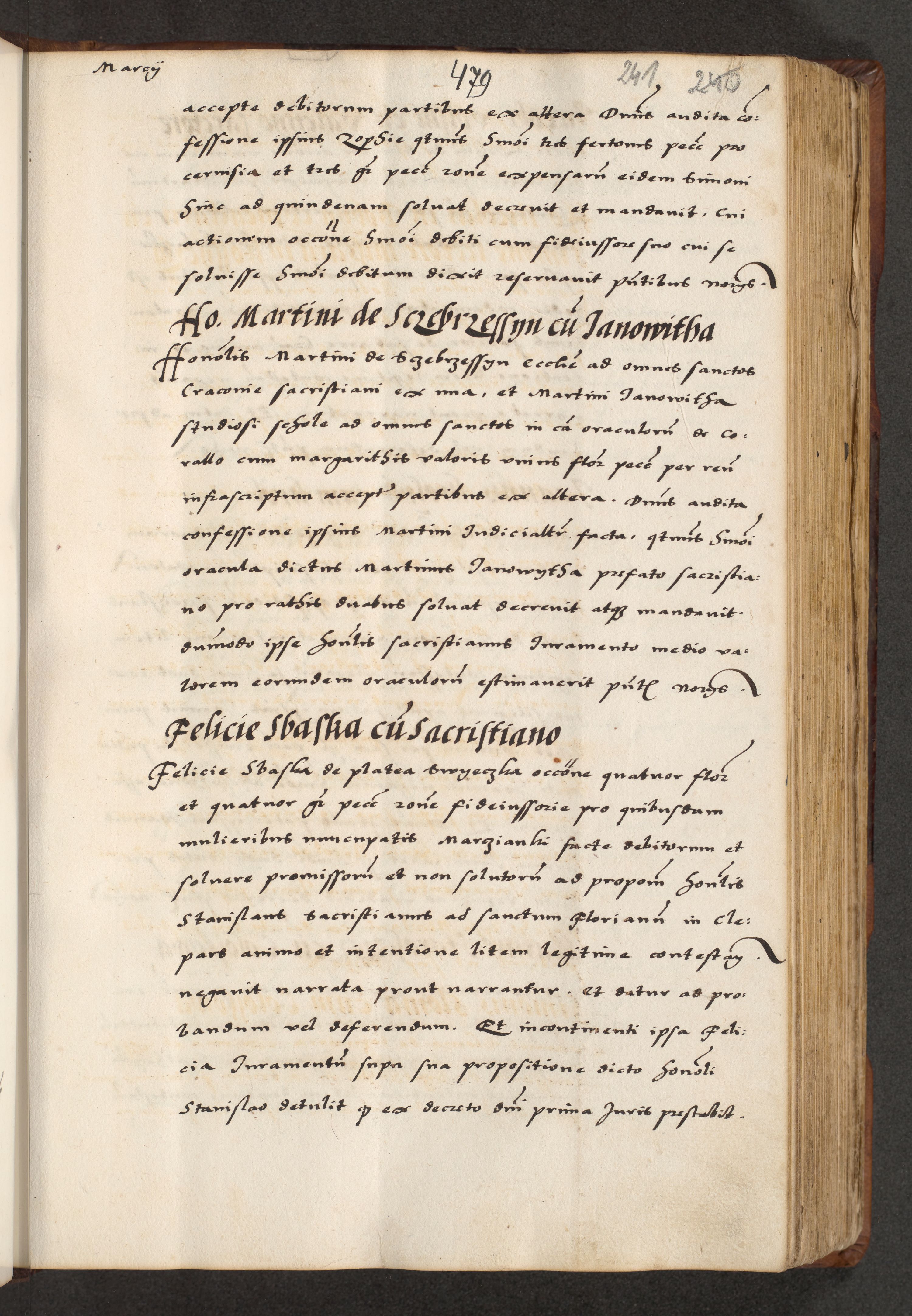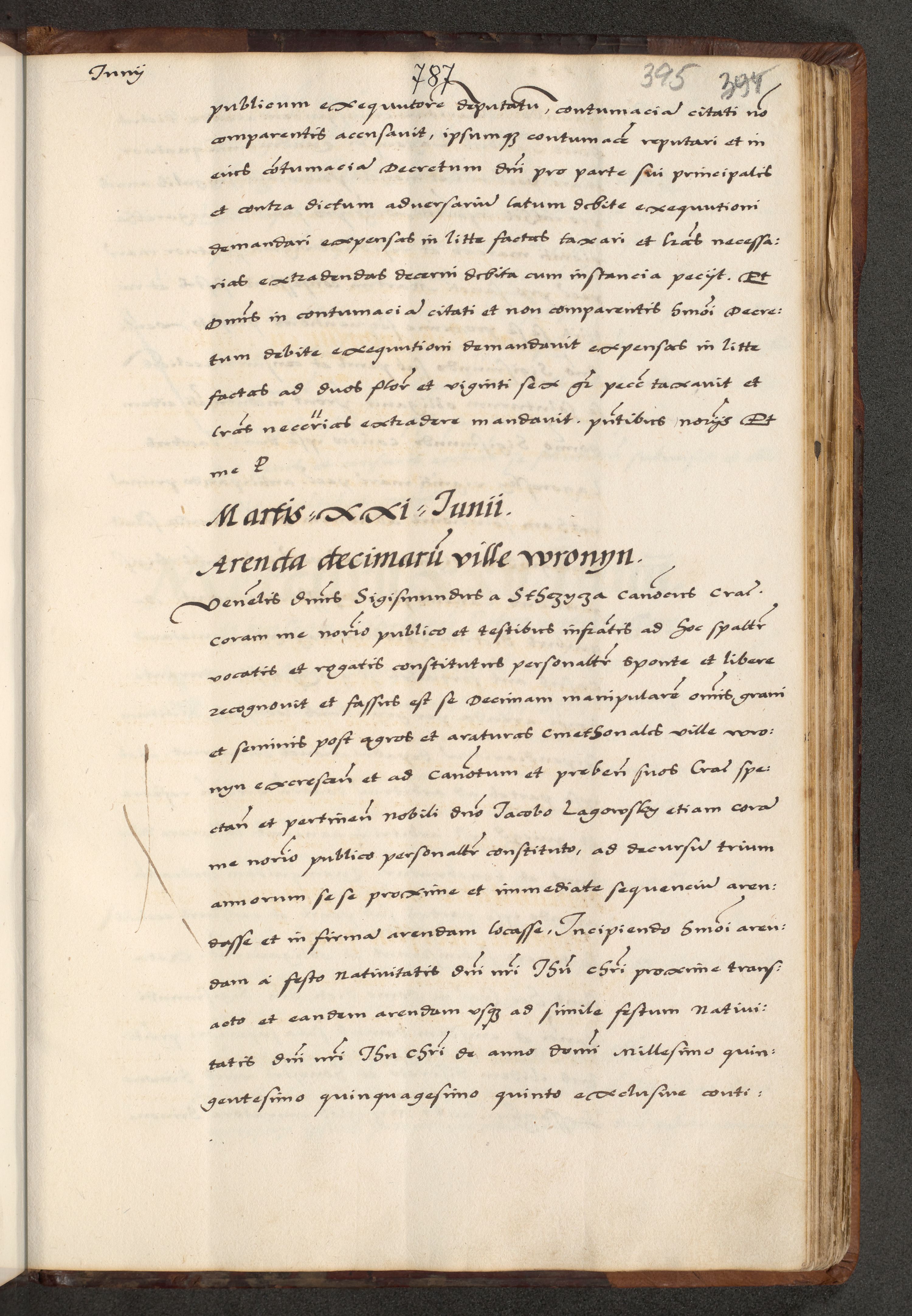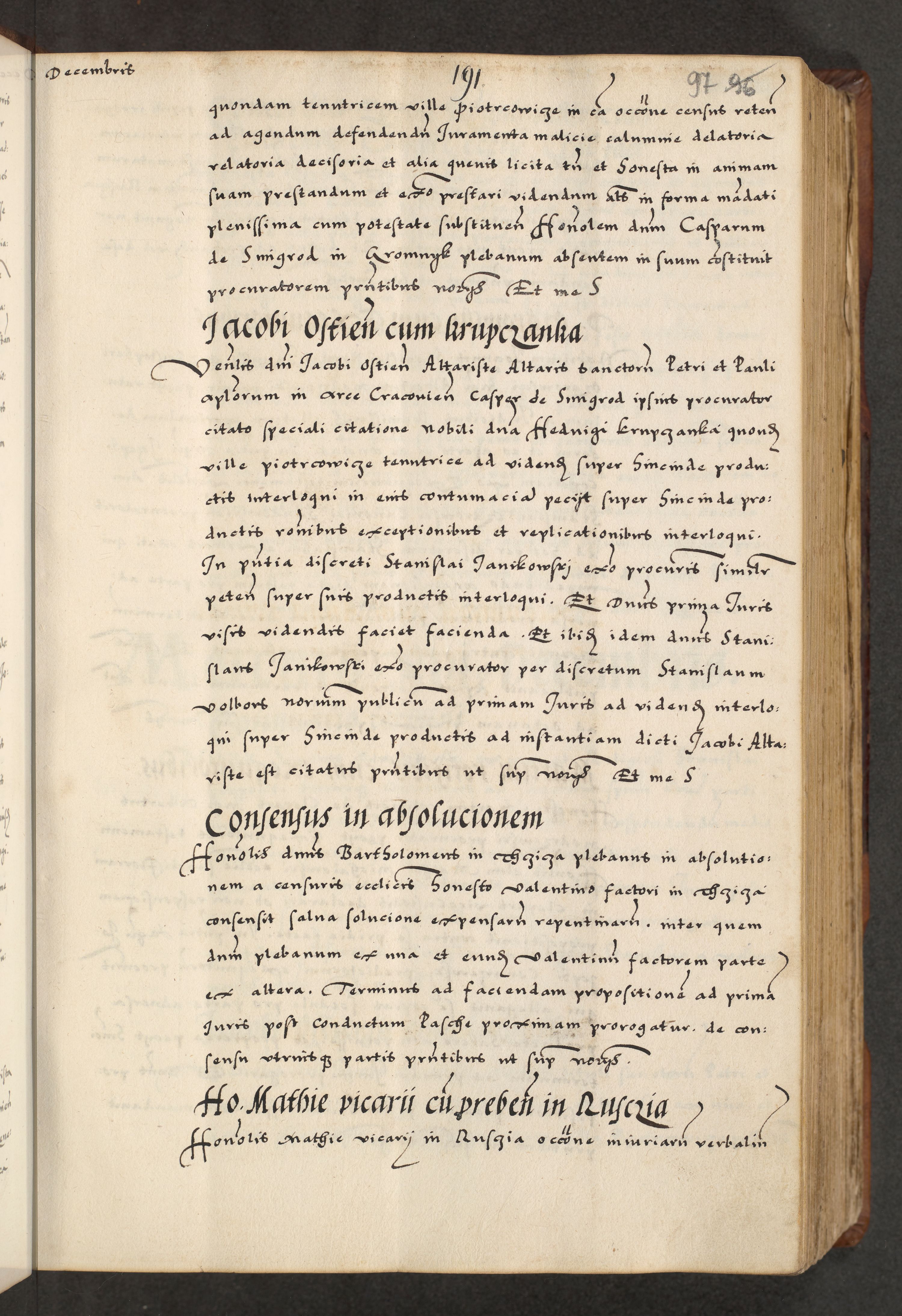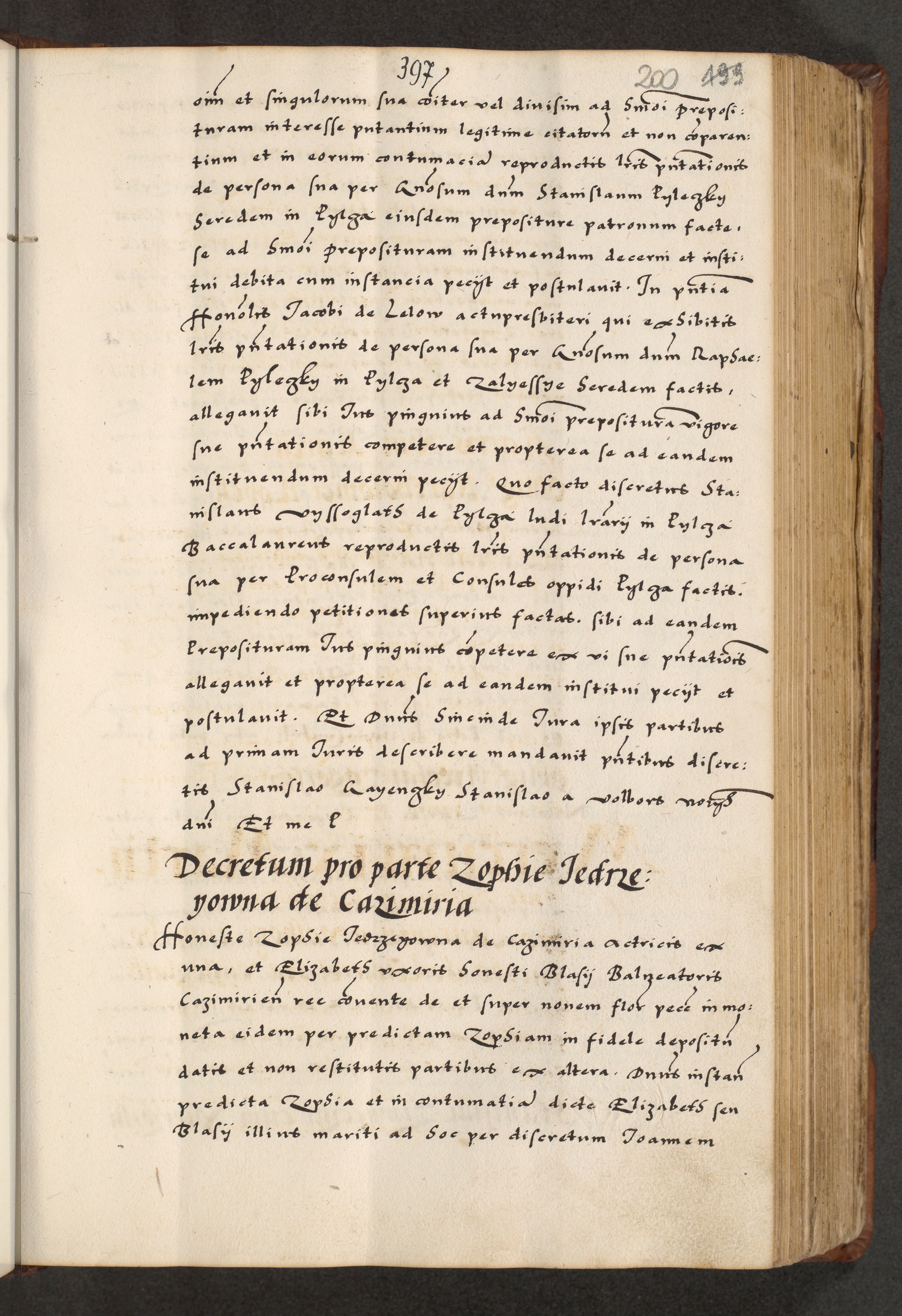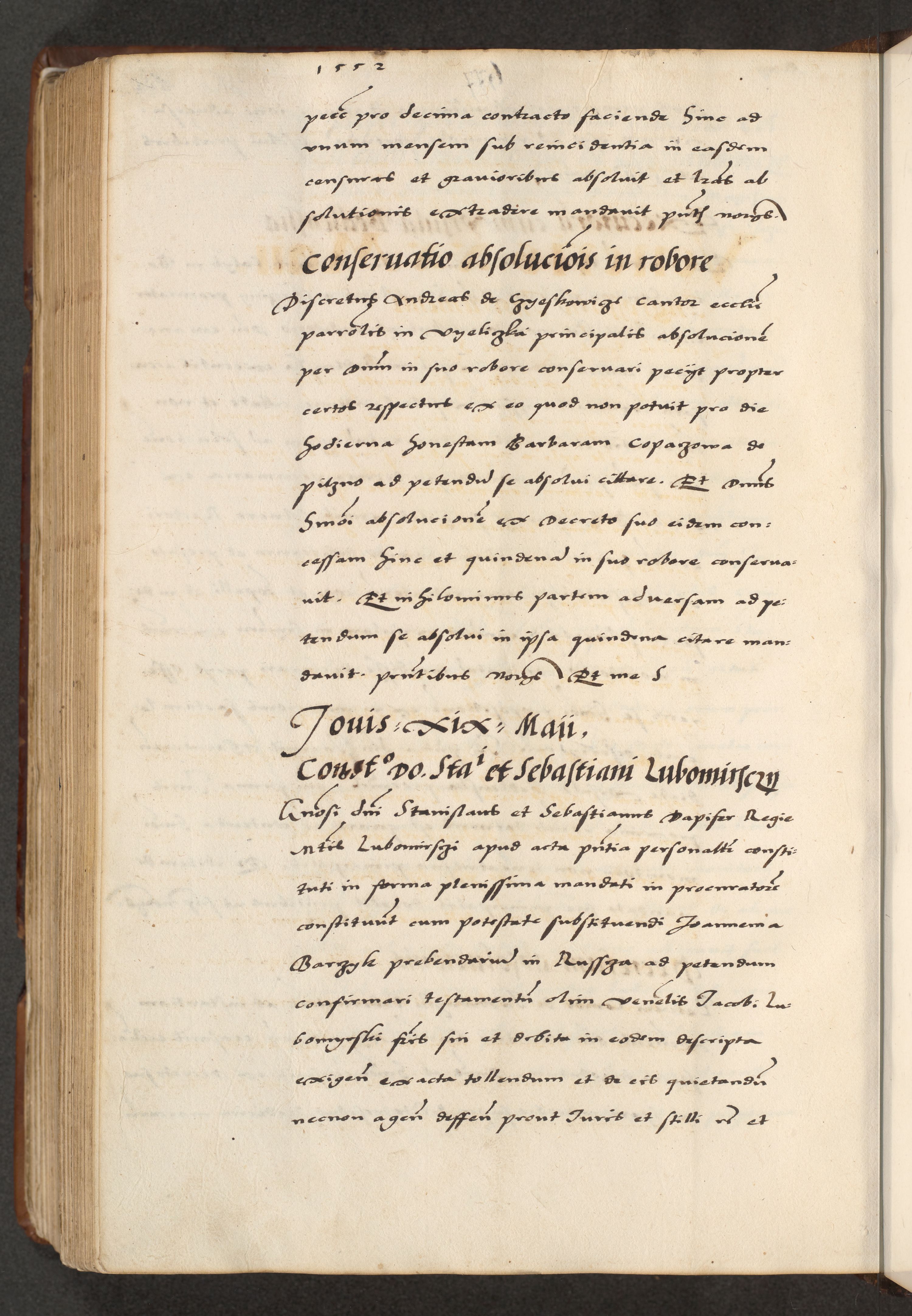[A]cta actorum causarum, sententiarum tam diffinitivarum quam interloquutoriarum, obligationum, constitutionum et contractuum coram reverendo patre domino Petro Porembski preposito Osvieczimensi, canonico et officiali generali Cracoviensi de anno Domini millesimo quingentesimo quinguagesimo primo, cuius indictio est nona, pontificatus sanctissimi in Christo patris et domini nostri domini Juliii divina providencia pape tercii, anno secundo, a die et mense infrascriptis feliciter continiantur