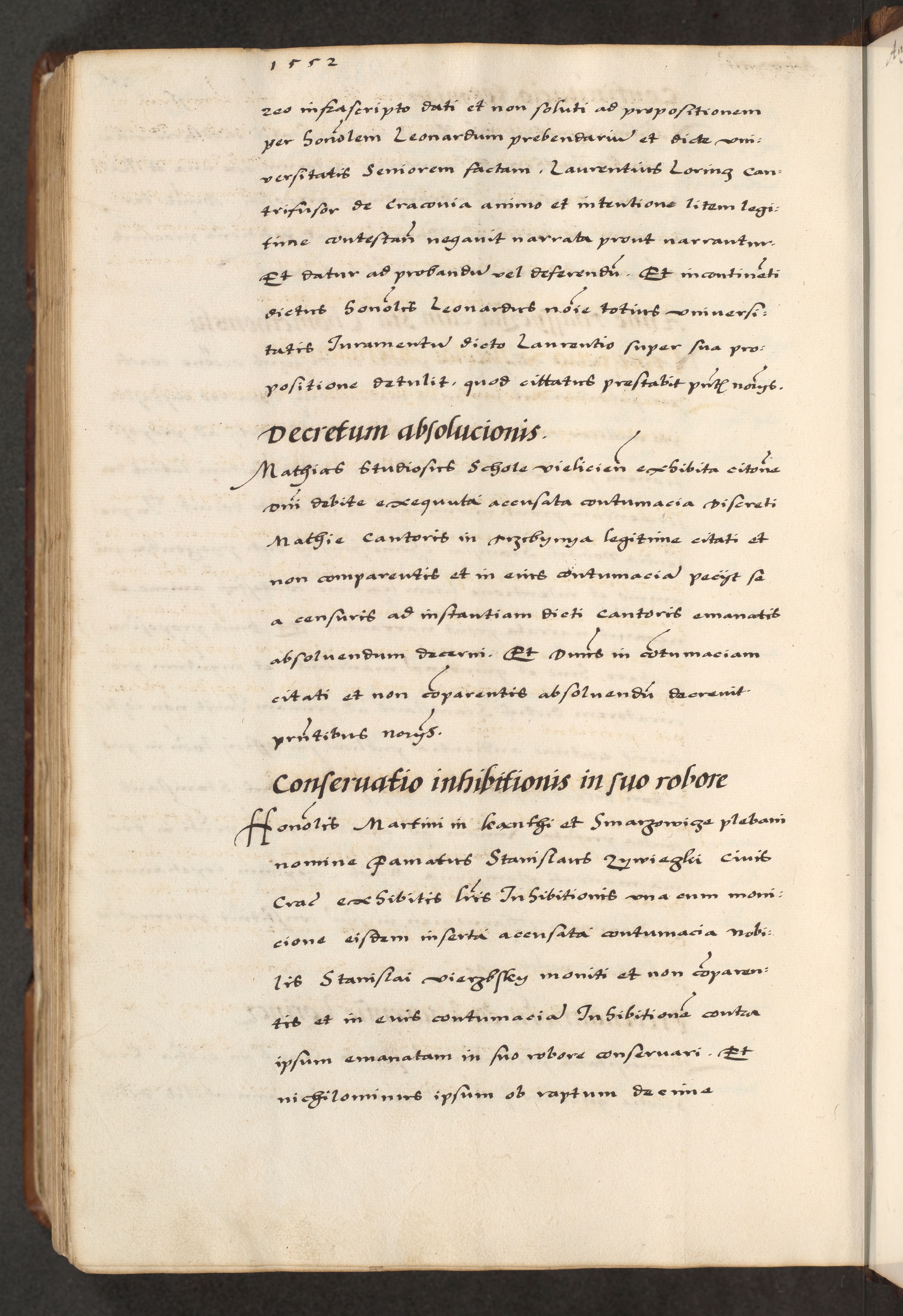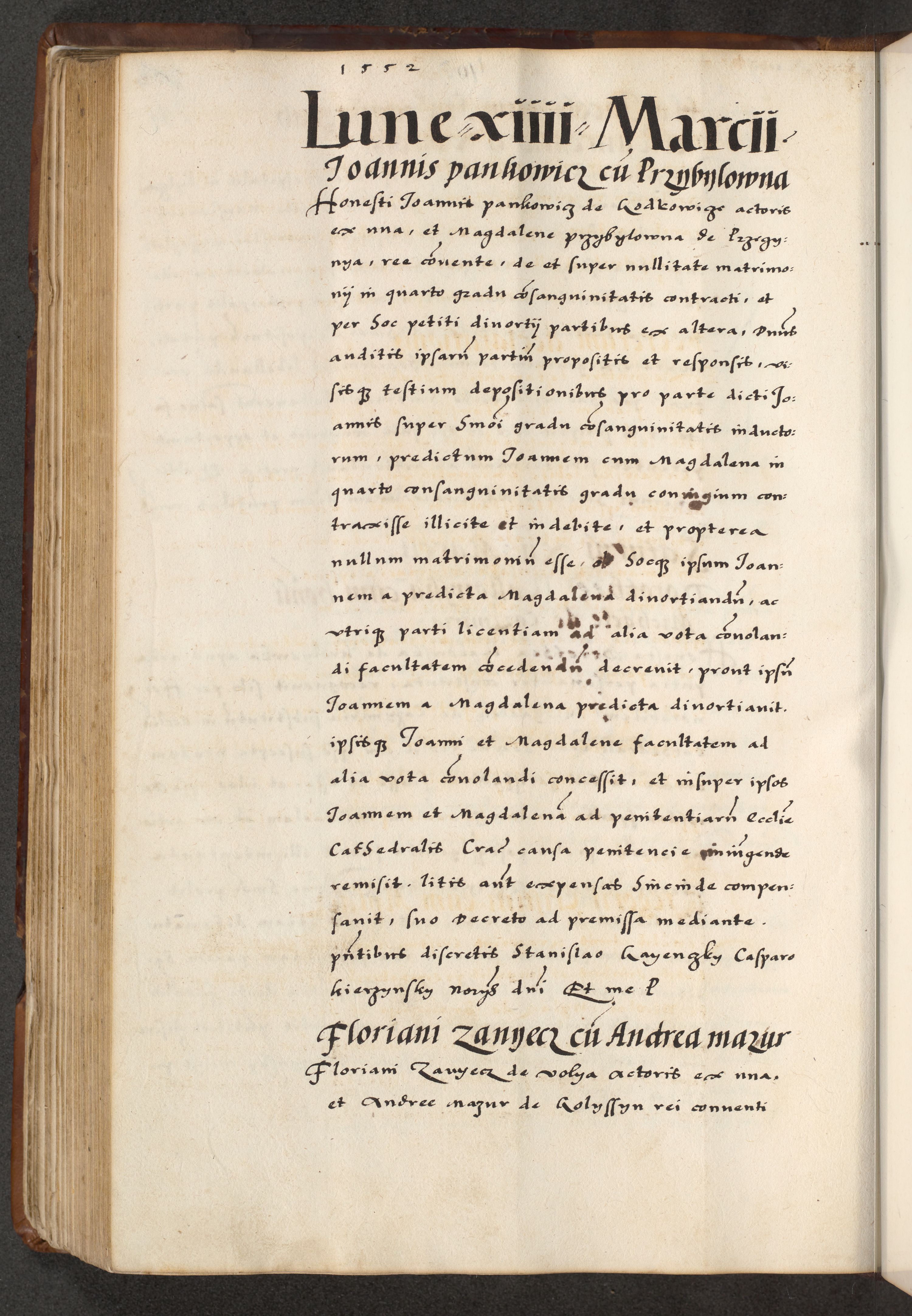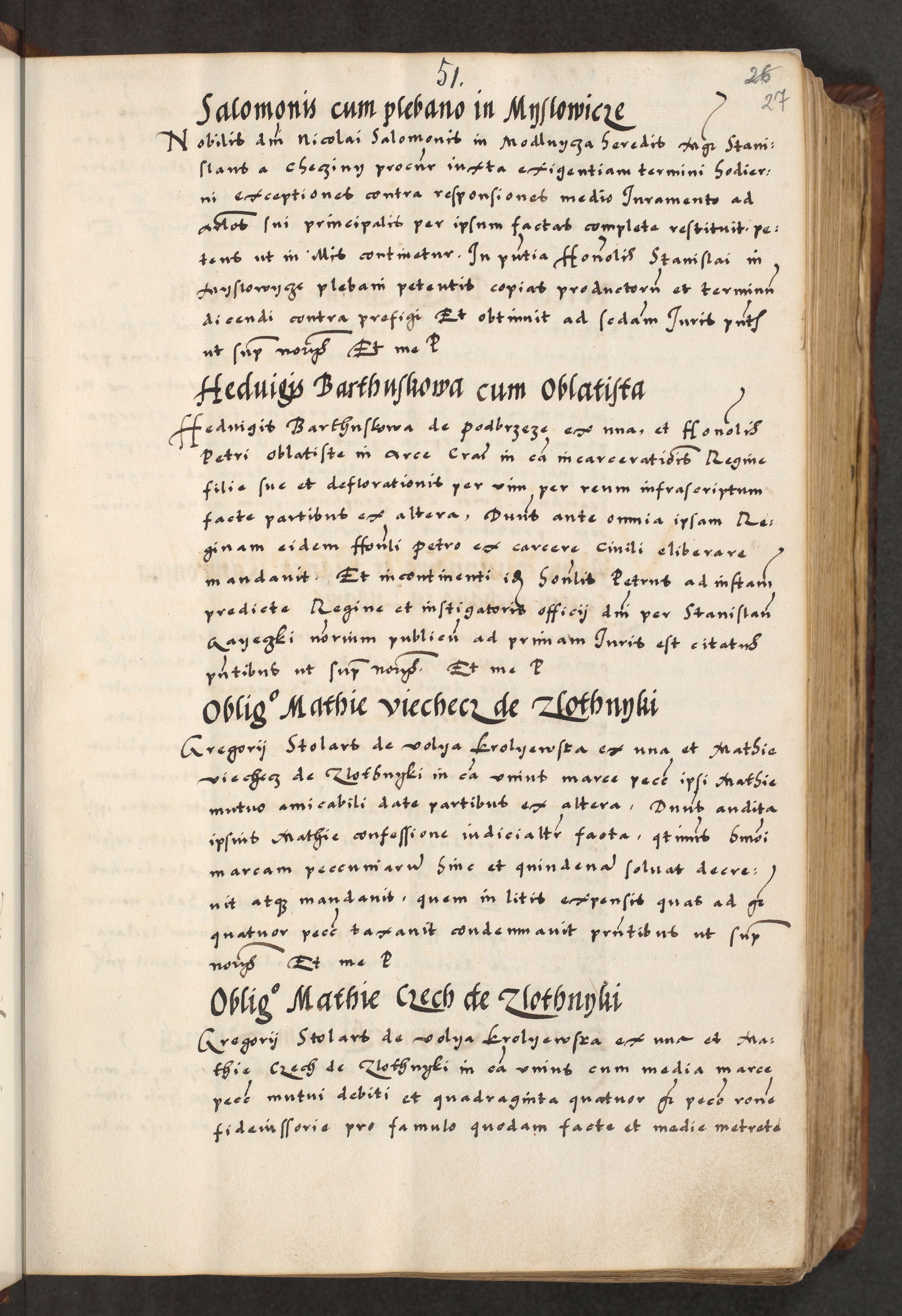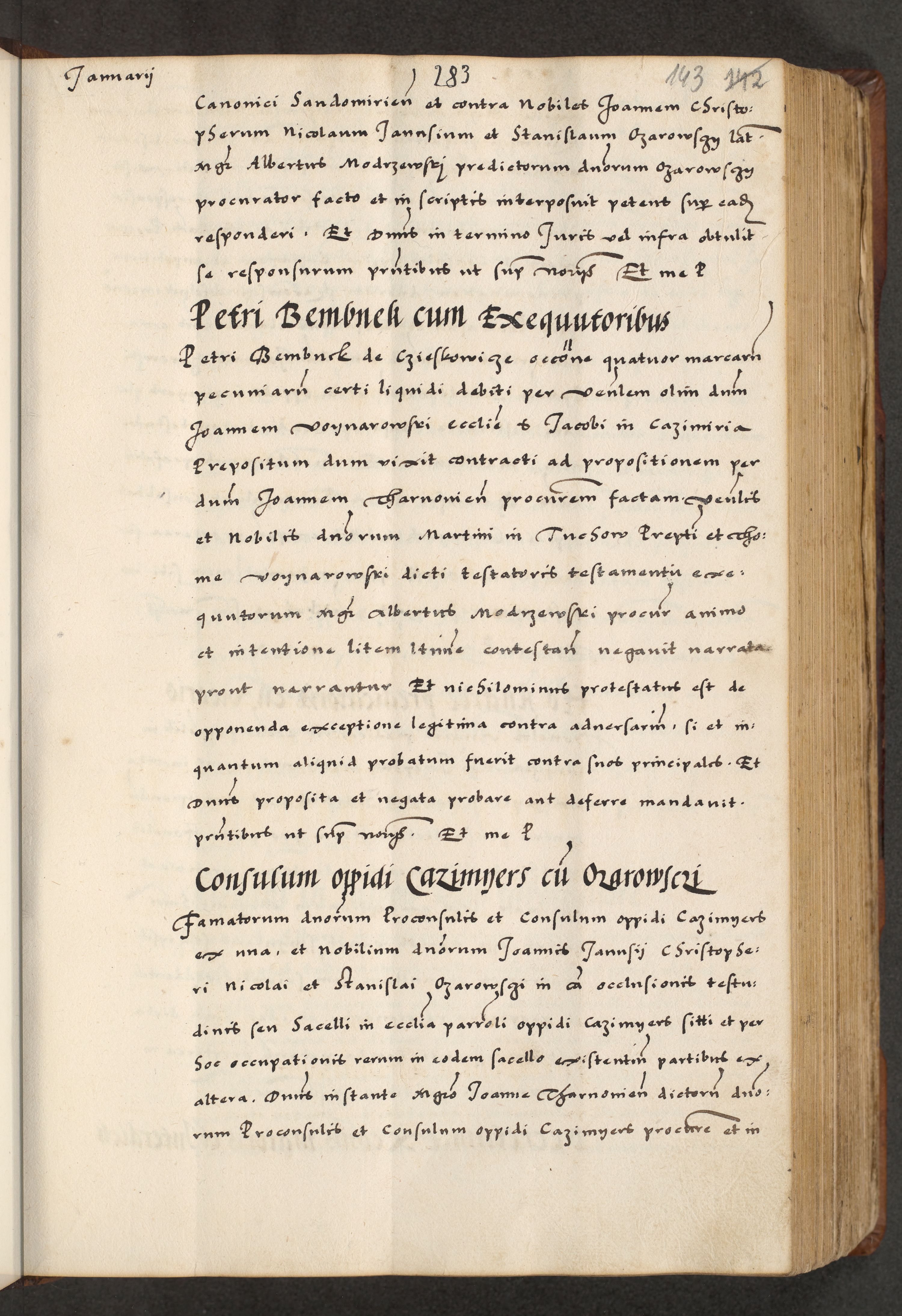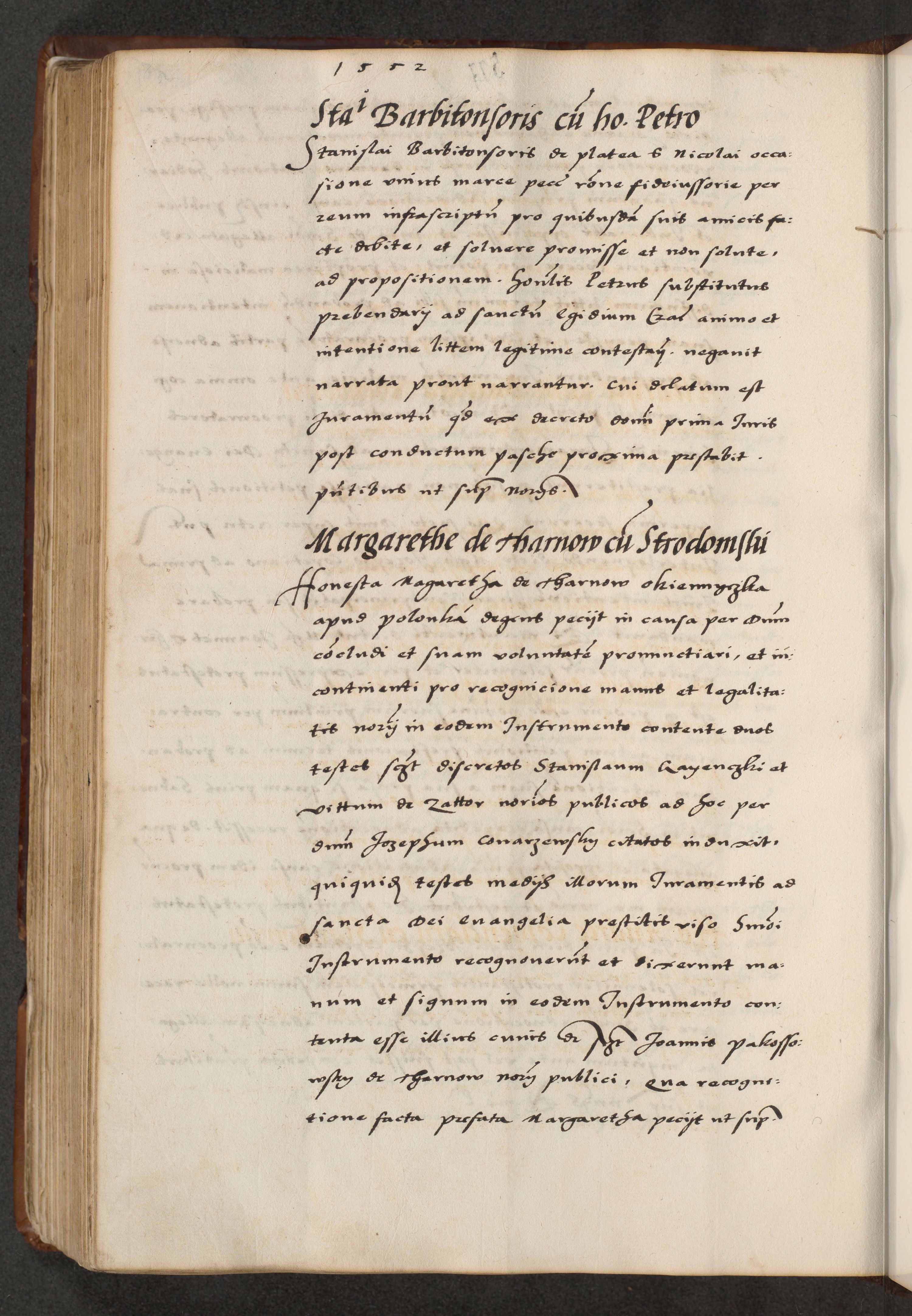 [A]cta actorum causarum, sententiarum tam diffinitivarum quam interloquutoriarum, obligationum, constitutionum et contractuum coram reverendo patre domino Petro Porembski preposito Osvieczimensi, canonico et officiali generali Cracoviensi de anno Domini millesimo quingentesimo quinguagesimo primo, cuius indictio est nona, pontificatus sanctissimi in Christo patris et domini nostri domini Juliii divina providencia pape tercii, anno secundo, a die et mense infrascriptis feliciter continiantur