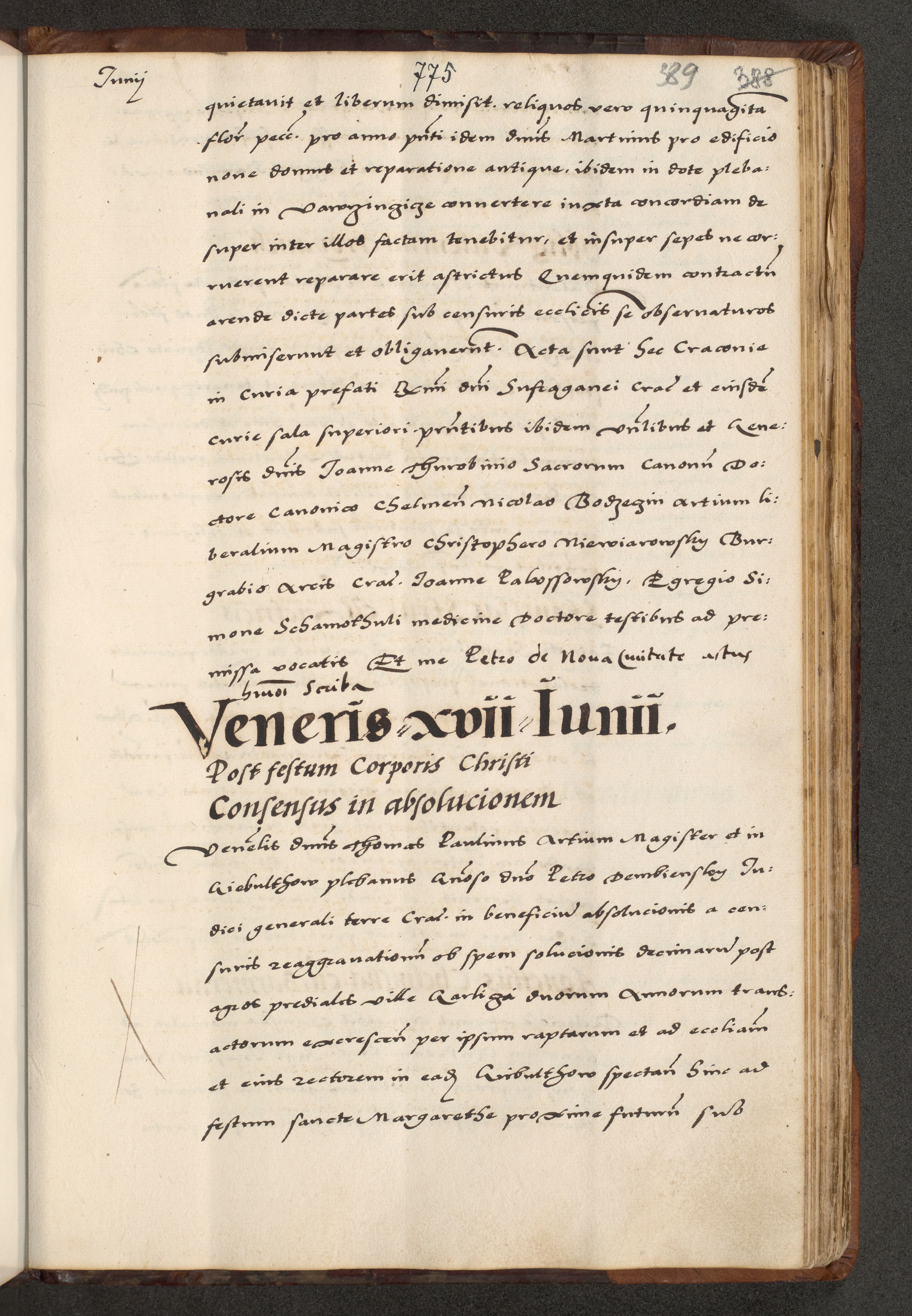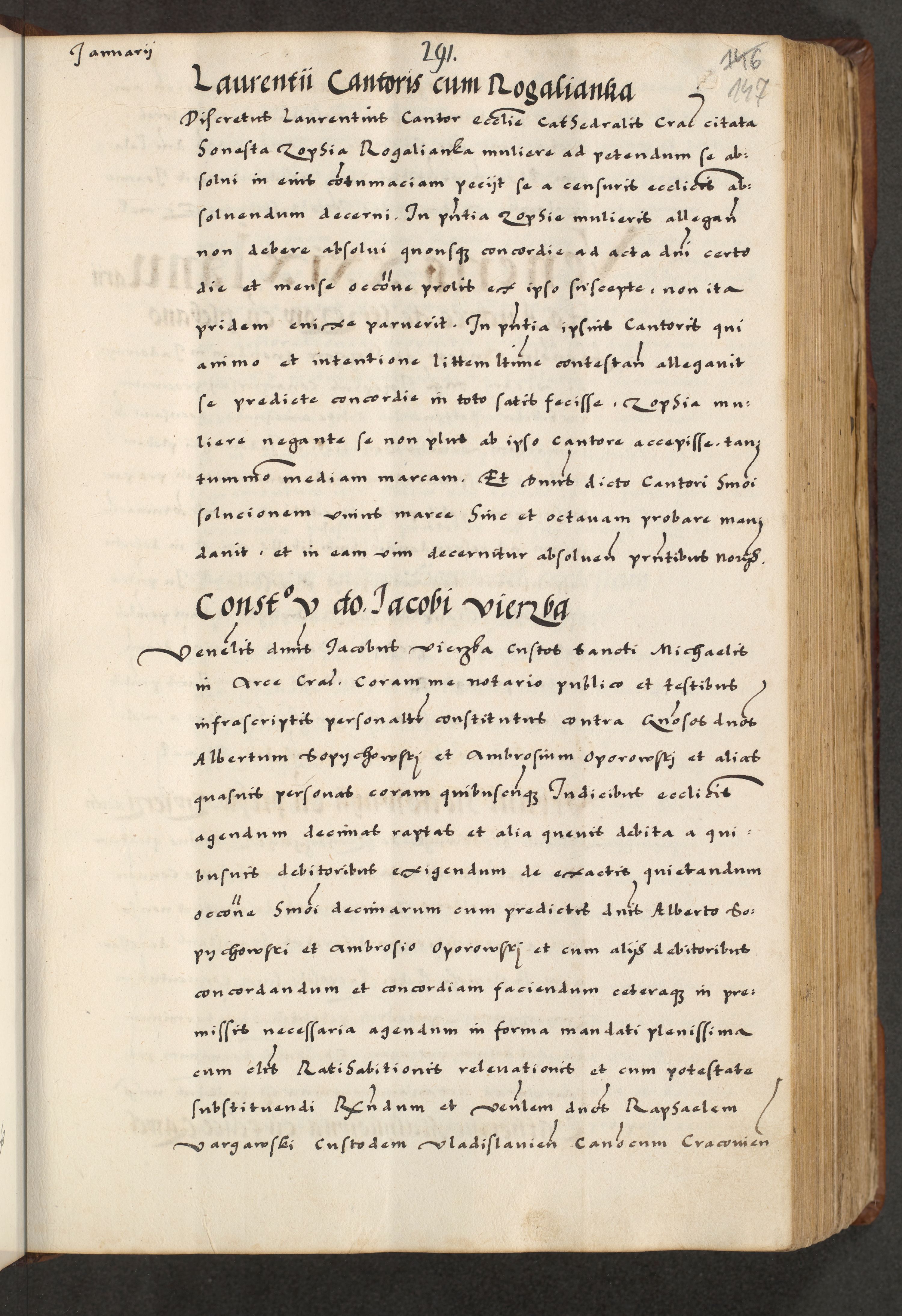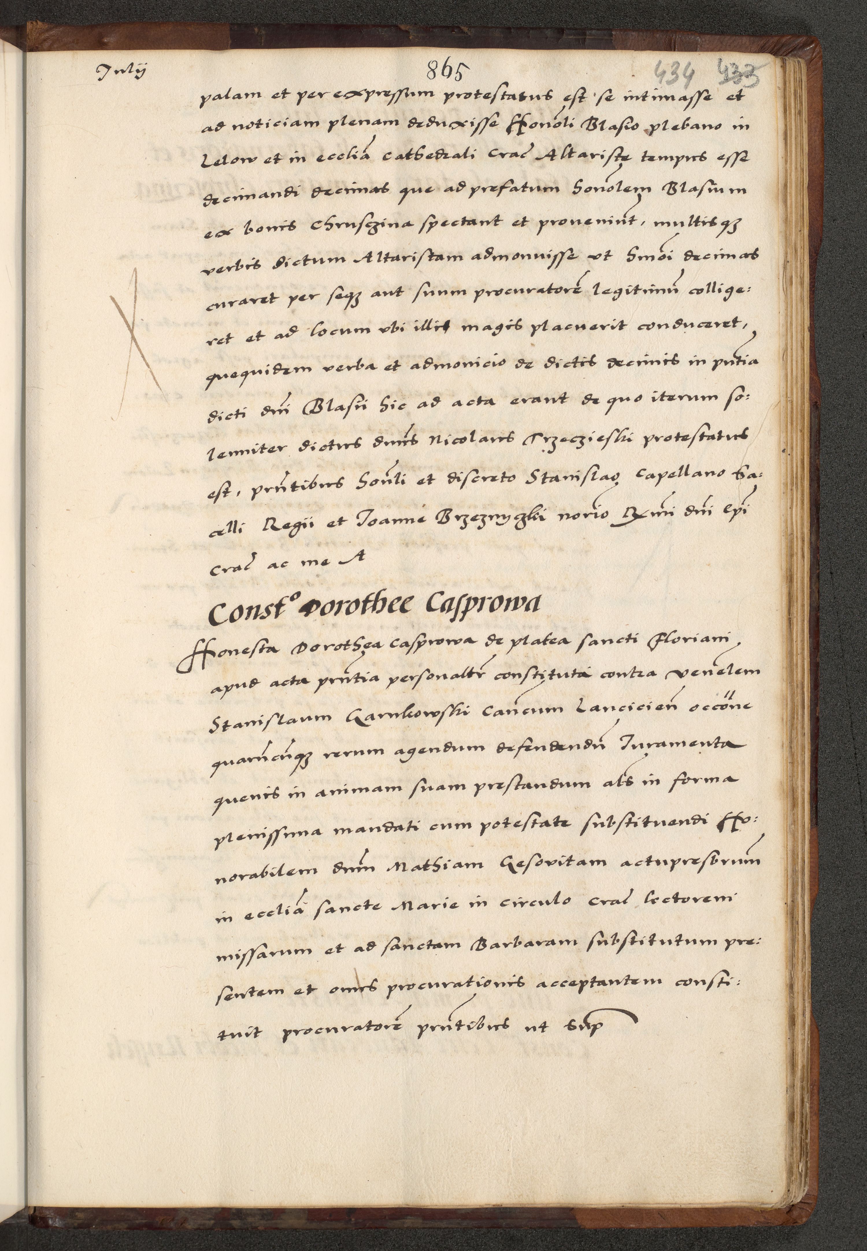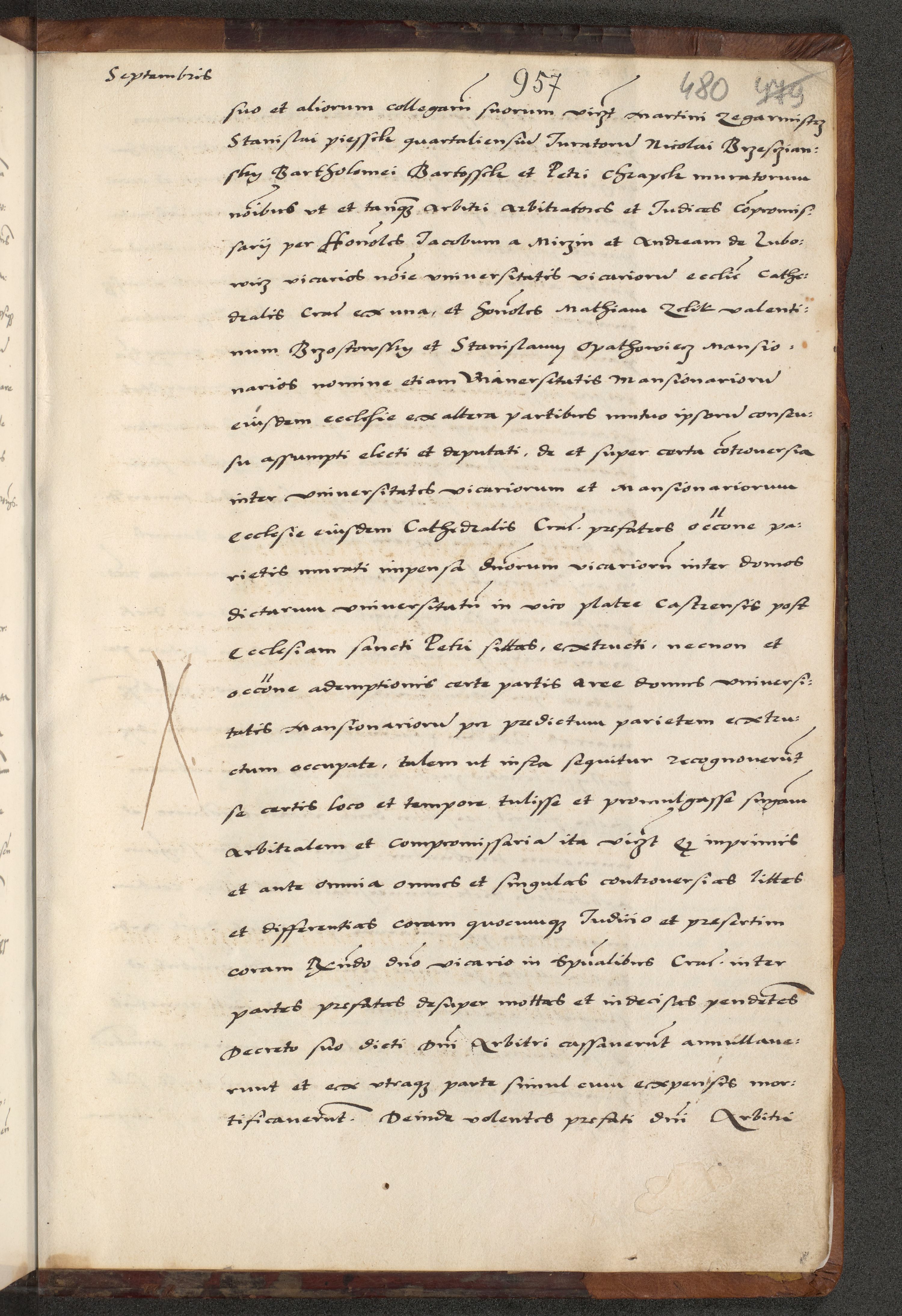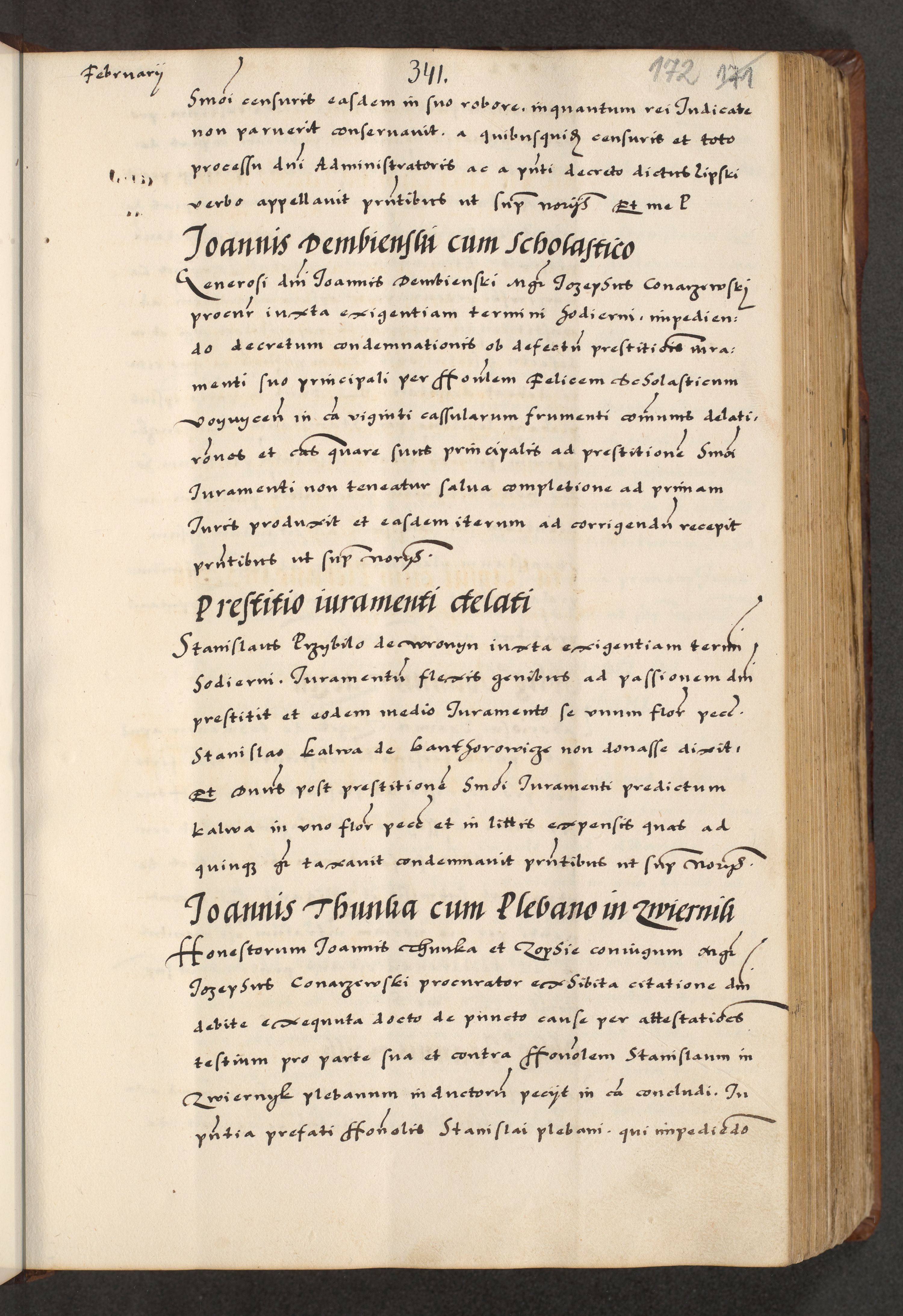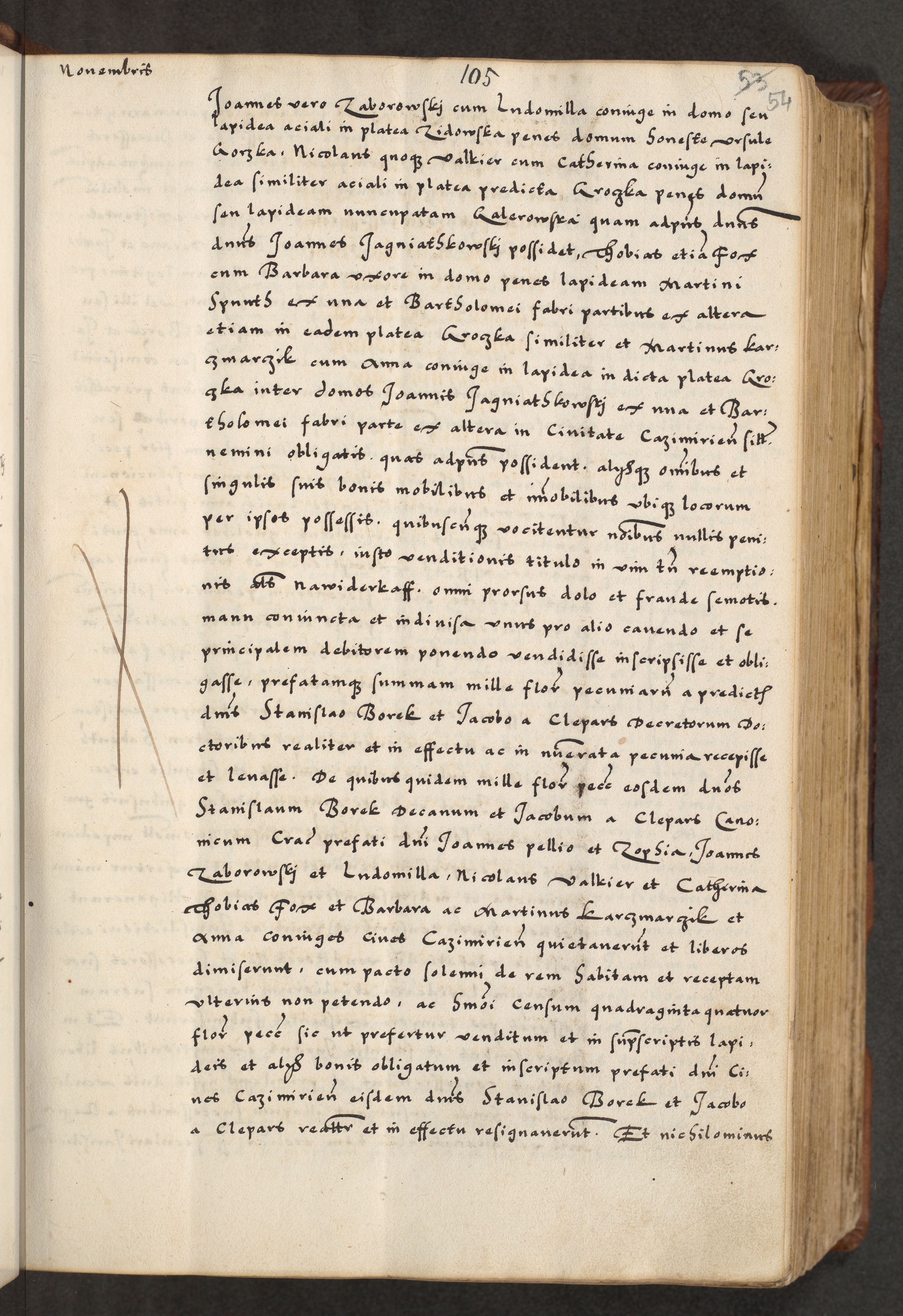 [A]cta actorum causarum, sententiarum tam diffinitivarum quam interloquutoriarum, obligationum, constitutionum et contractuum coram reverendo patre domino Petro Porembski preposito Osvieczimensi, canonico et officiali generali Cracoviensi de anno Domini millesimo quingentesimo quinguagesimo primo, cuius indictio est nona, pontificatus sanctissimi in Christo patris et domini nostri domini Juliii divina providencia pape tercii, anno secundo, a die et mense infrascriptis feliciter continiantur