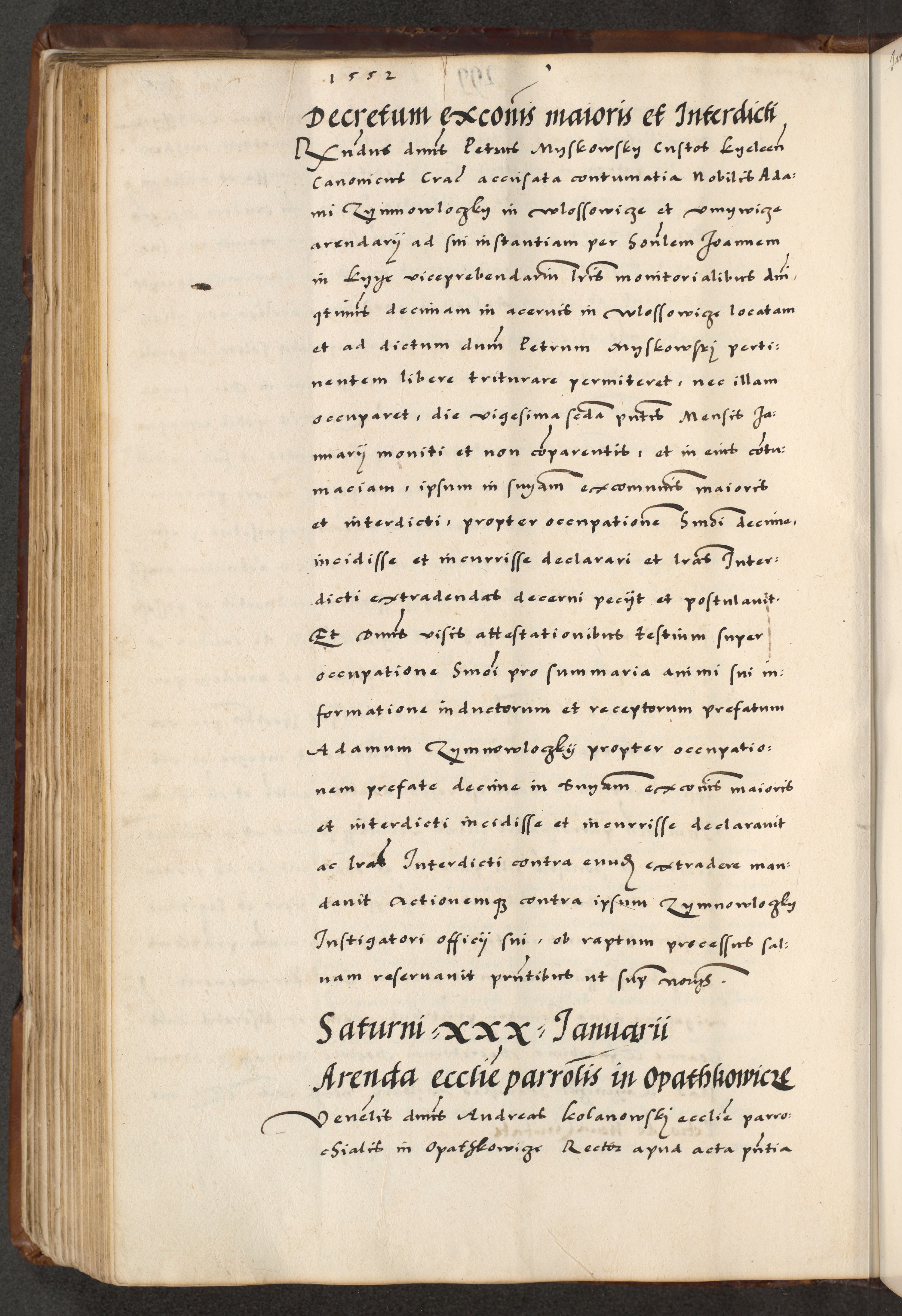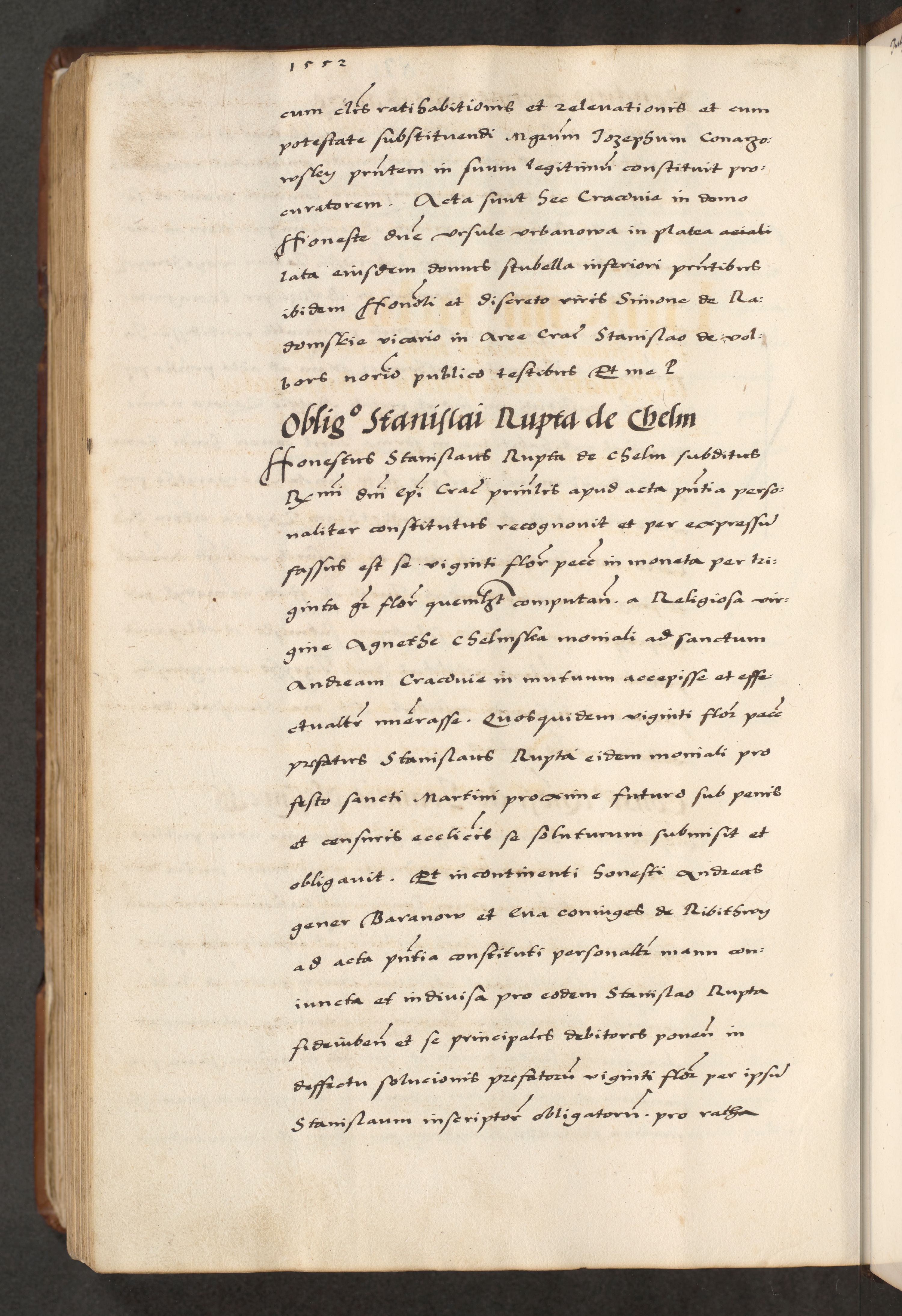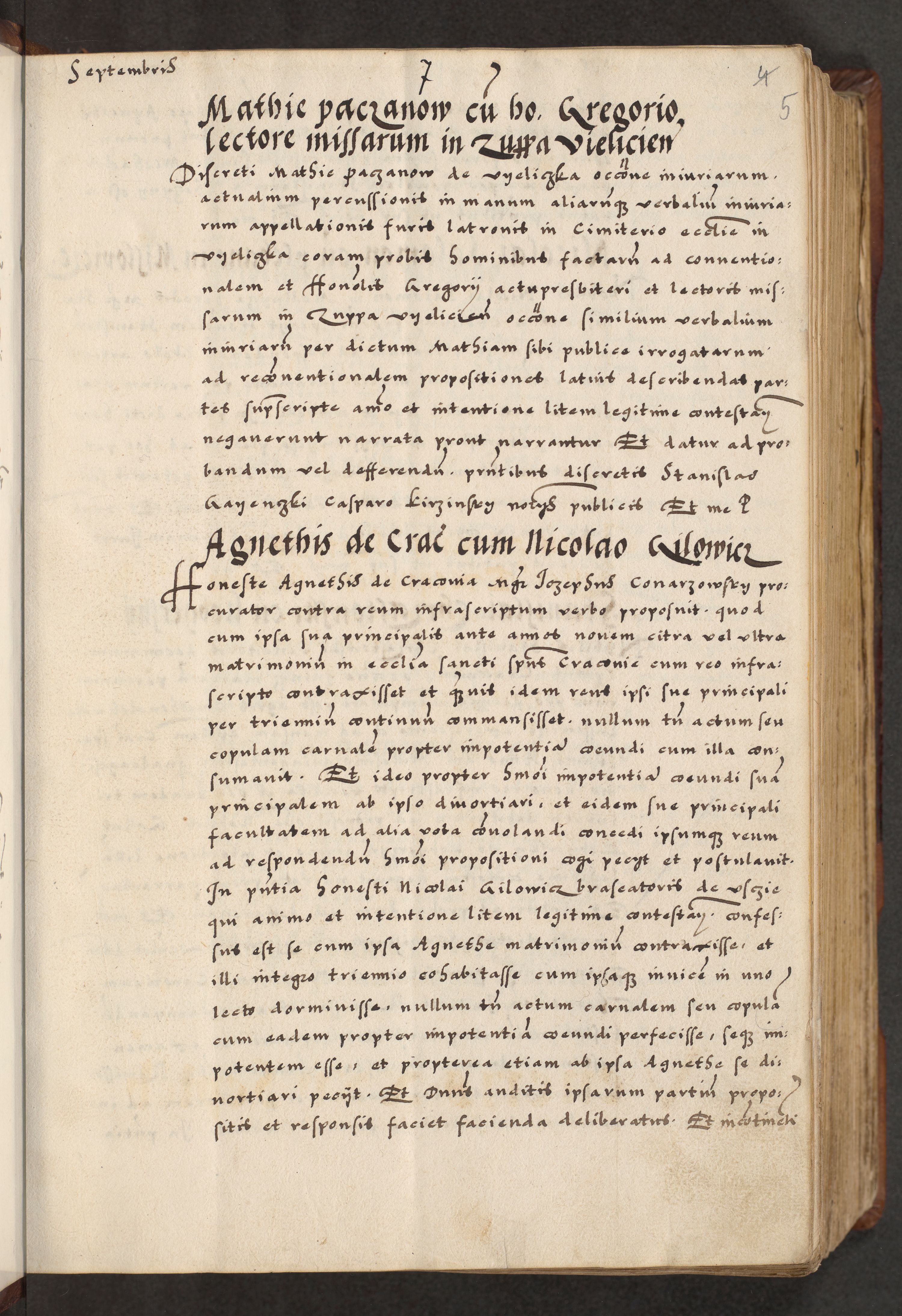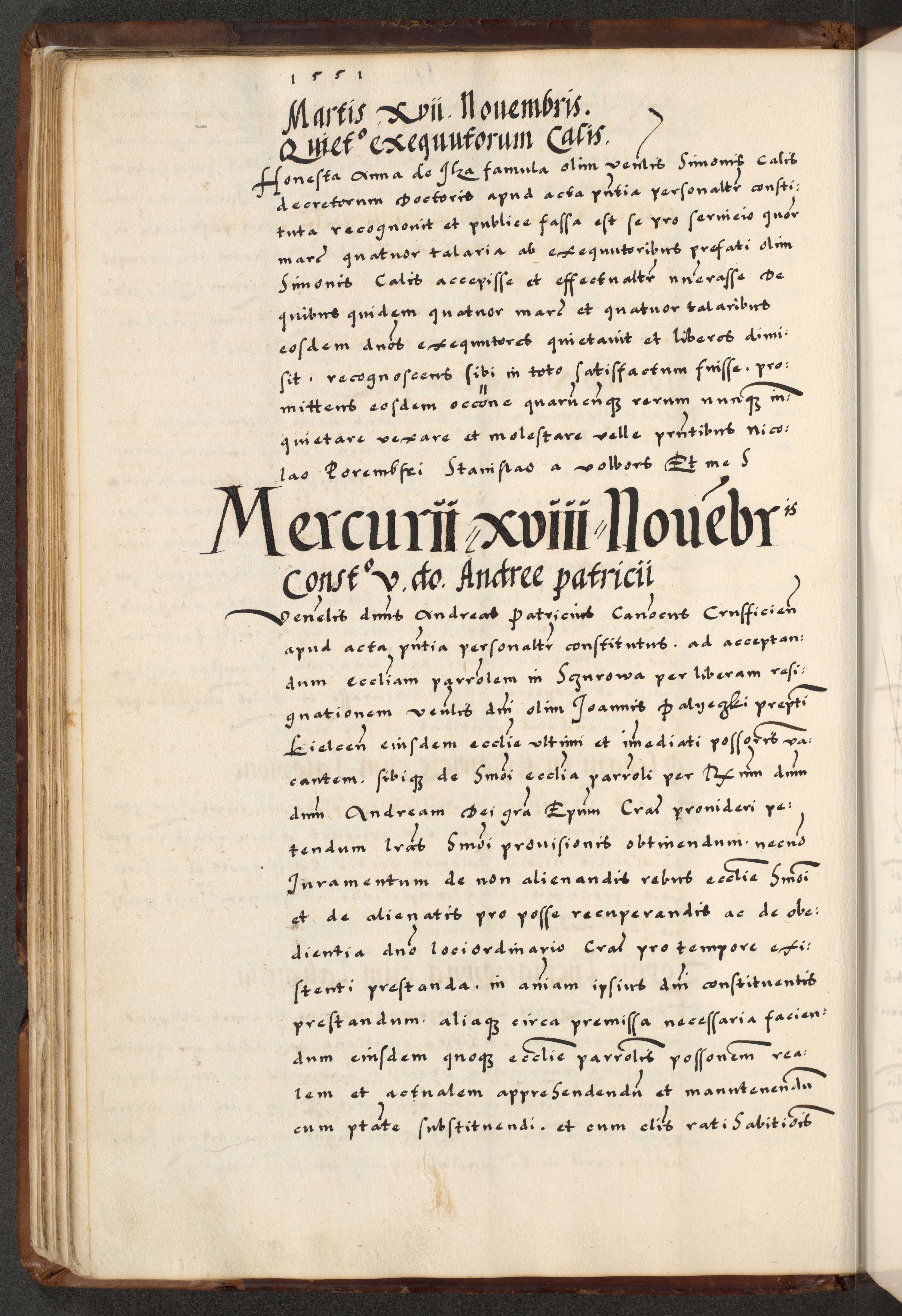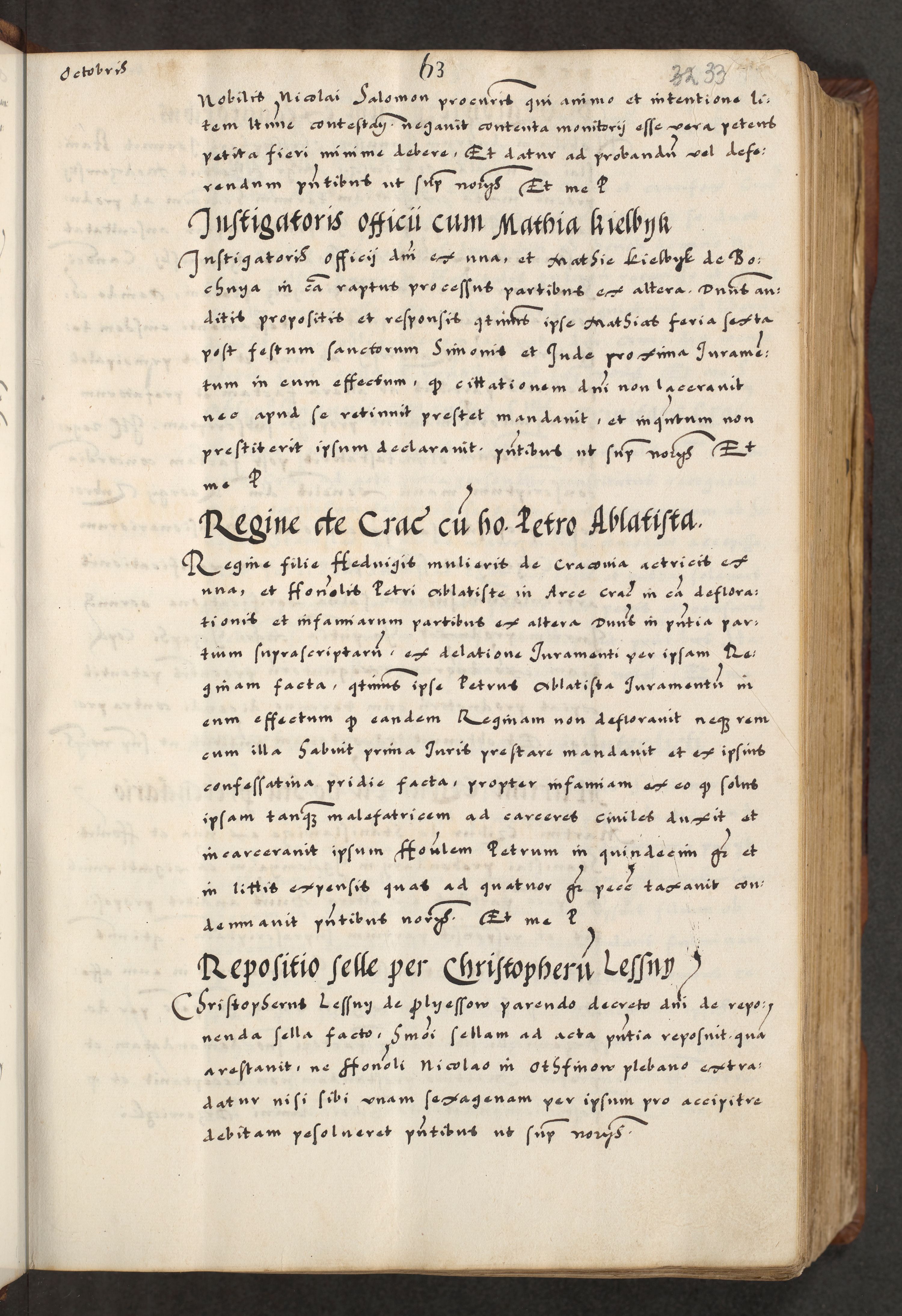 [A]cta actorum causarum, sententiarum tam diffinitivarum quam interloquutoriarum, obligationum, constitutionum et contractuum coram reverendo patre domino Petro Porembski preposito Osvieczimensi, canonico et officiali generali Cracoviensi de anno Domini millesimo quingentesimo quinguagesimo primo, cuius indictio est nona, pontificatus sanctissimi in Christo patris et domini nostri domini Juliii divina providencia pape tercii, anno secundo, a die et mense infrascriptis feliciter continiantur