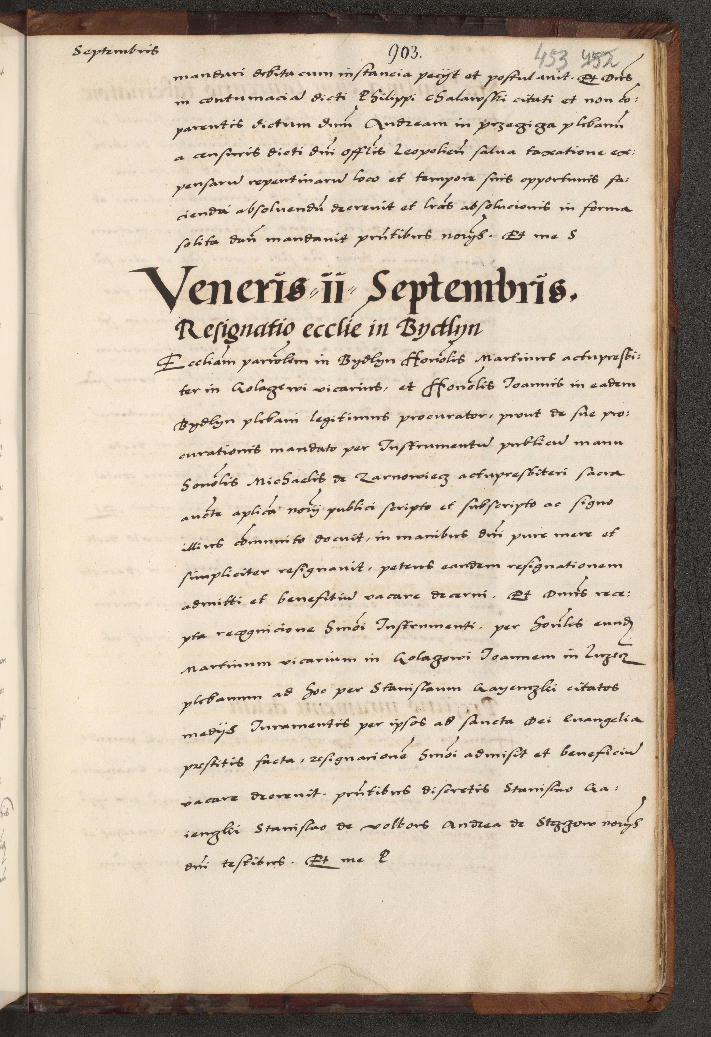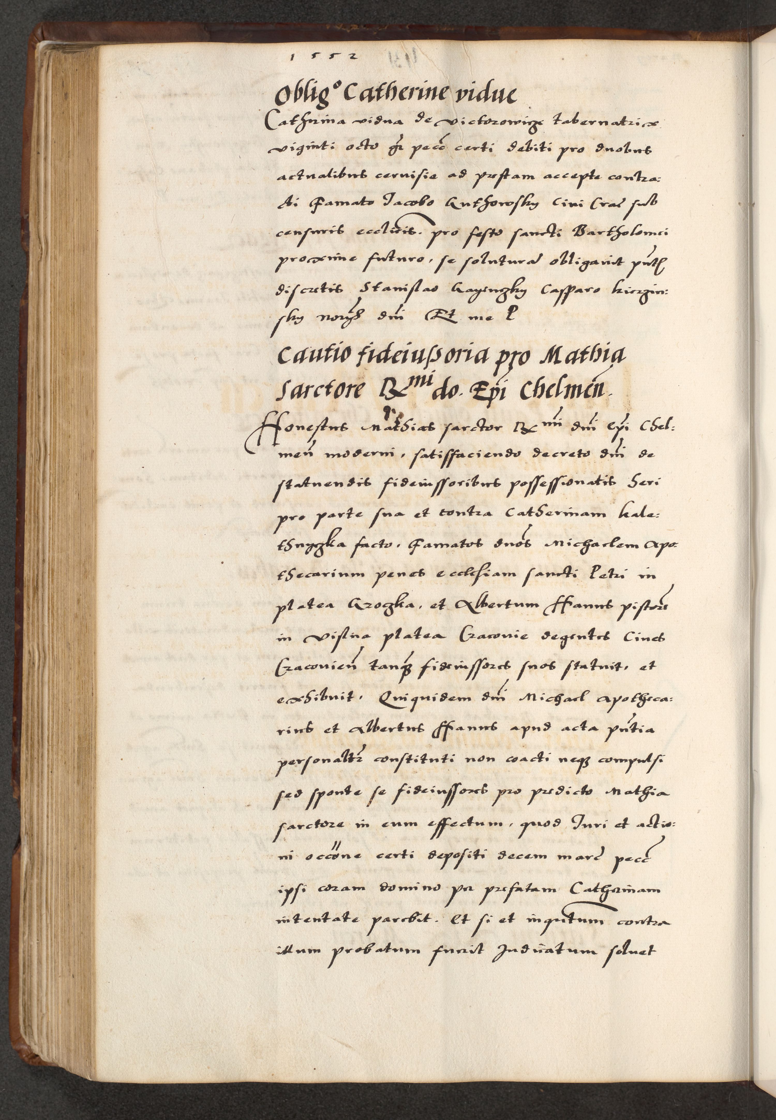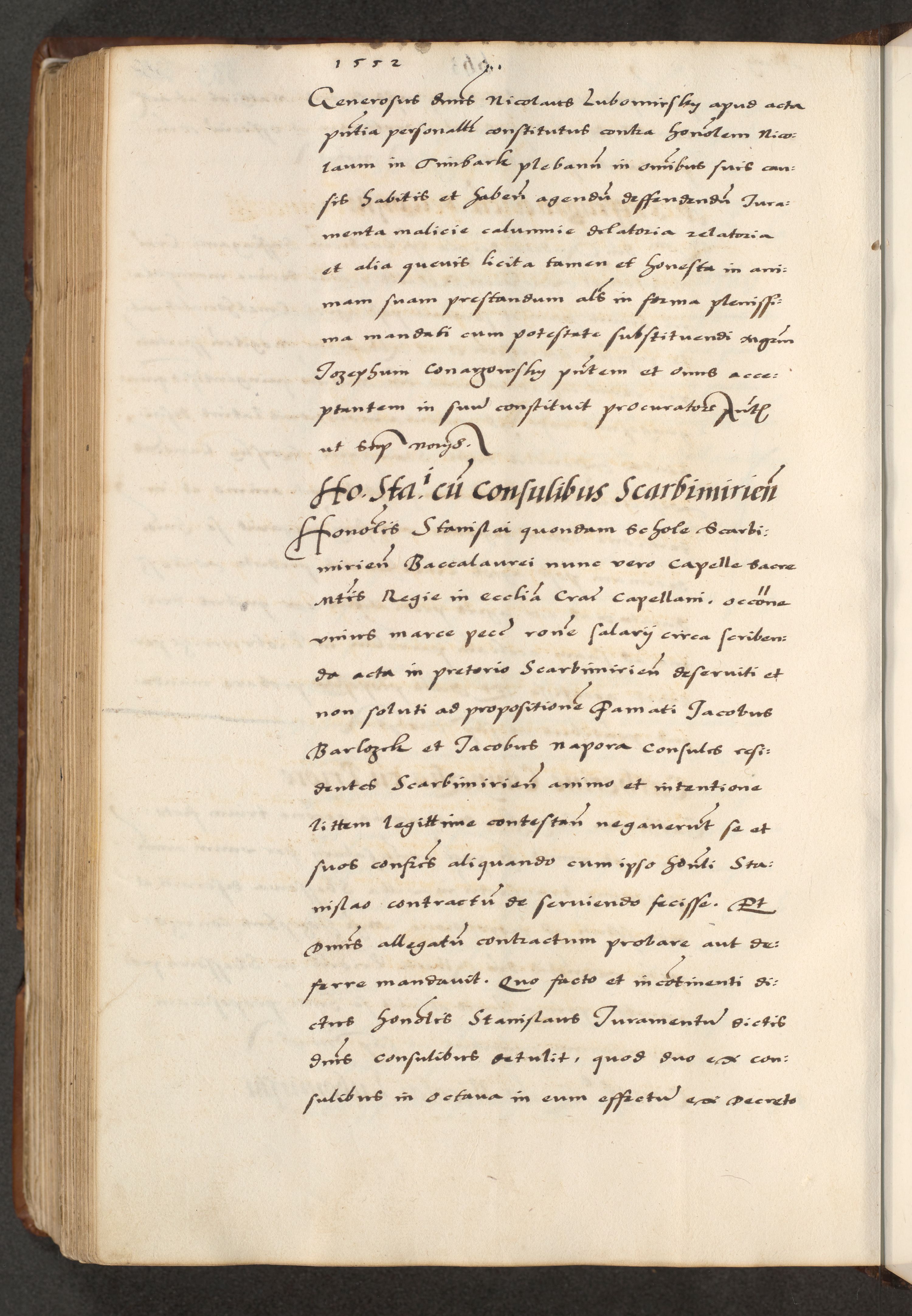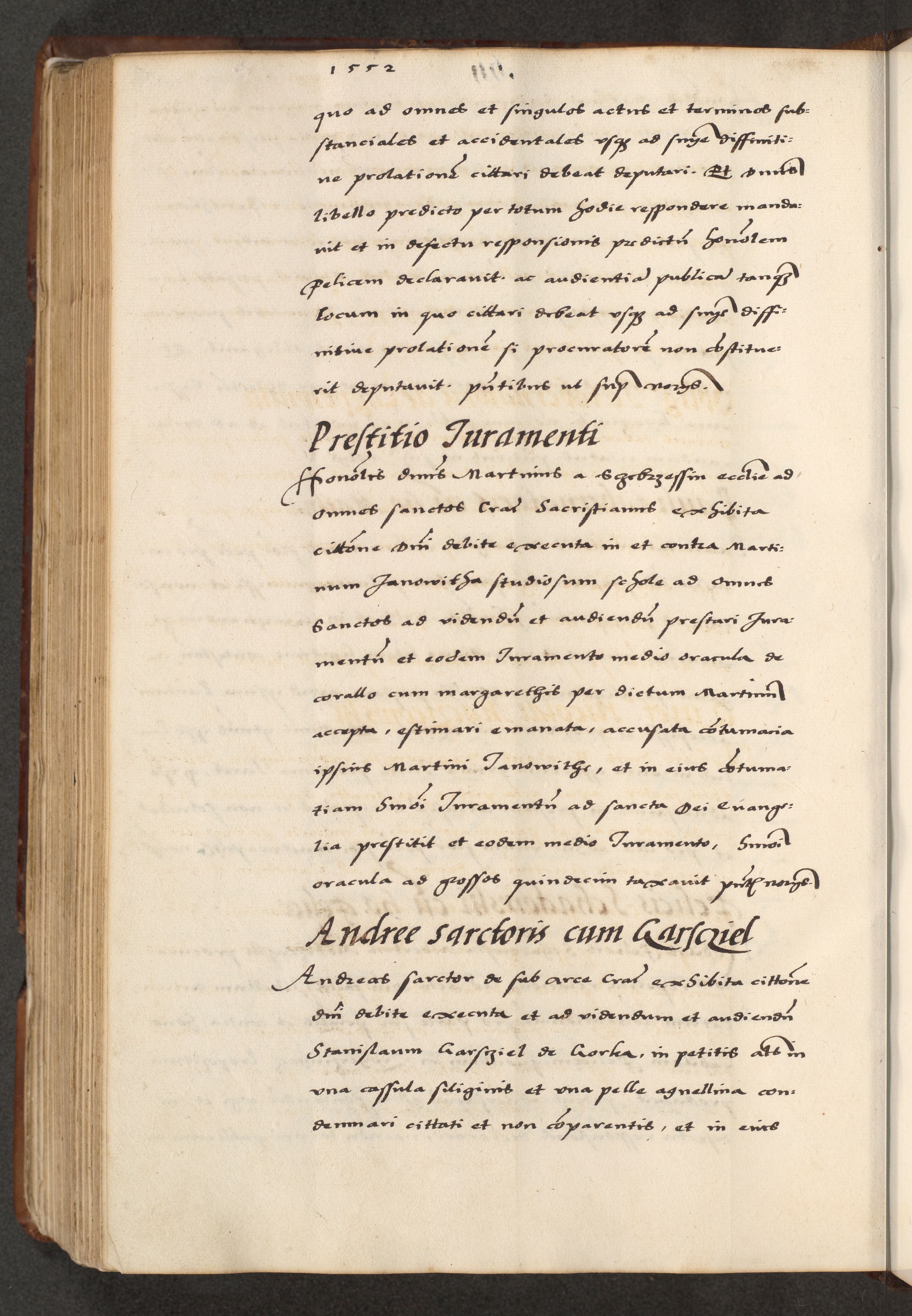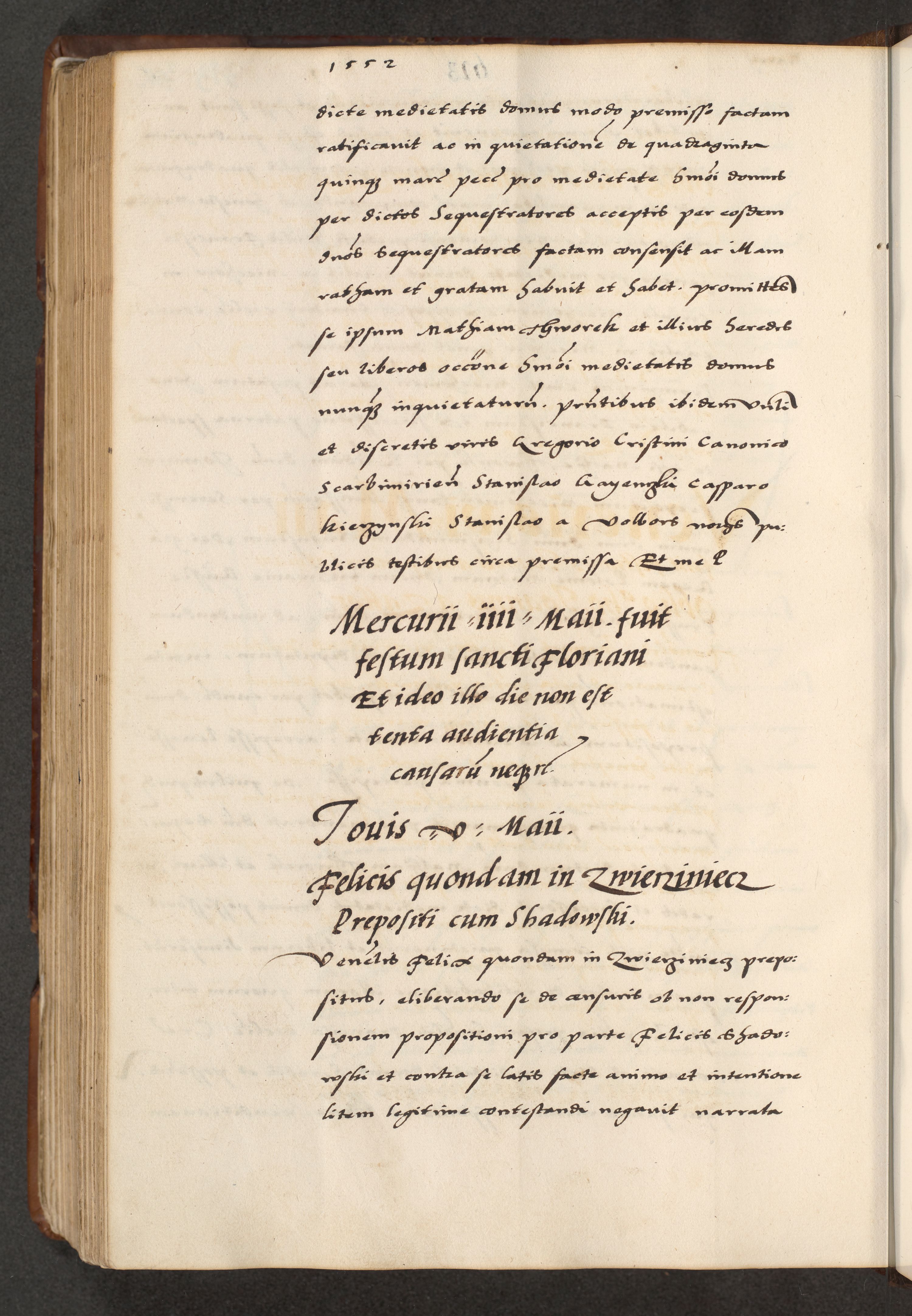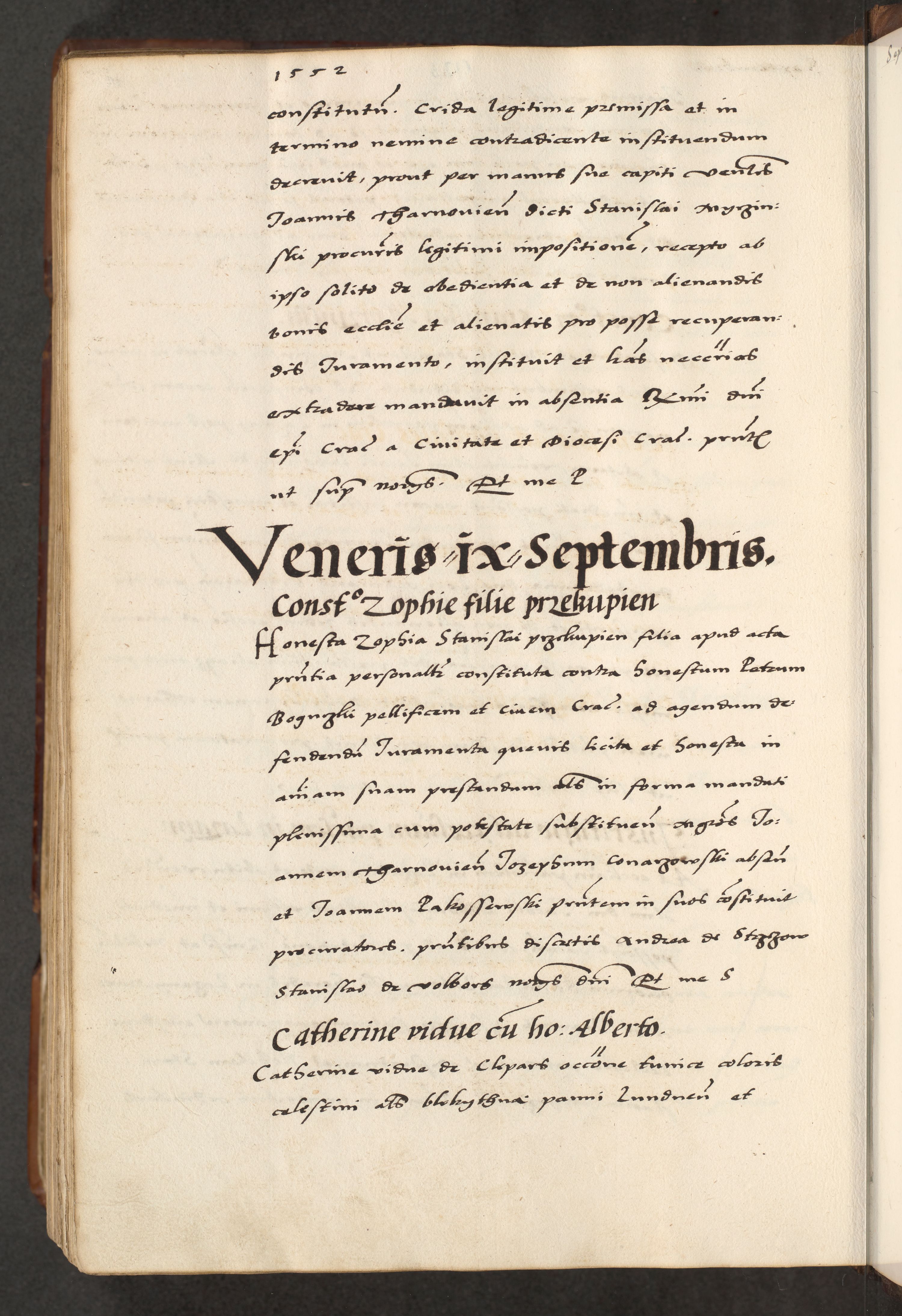 [A]cta actorum causarum, sententiarum tam diffinitivarum quam interloquutoriarum, obligationum, constitutionum et contractuum coram reverendo patre domino Petro Porembski preposito Osvieczimensi, canonico et officiali generali Cracoviensi de anno Domini millesimo quingentesimo quinguagesimo primo, cuius indictio est nona, pontificatus sanctissimi in Christo patris et domini nostri domini Juliii divina providencia pape tercii, anno secundo, a die et mense infrascriptis feliciter continiantur