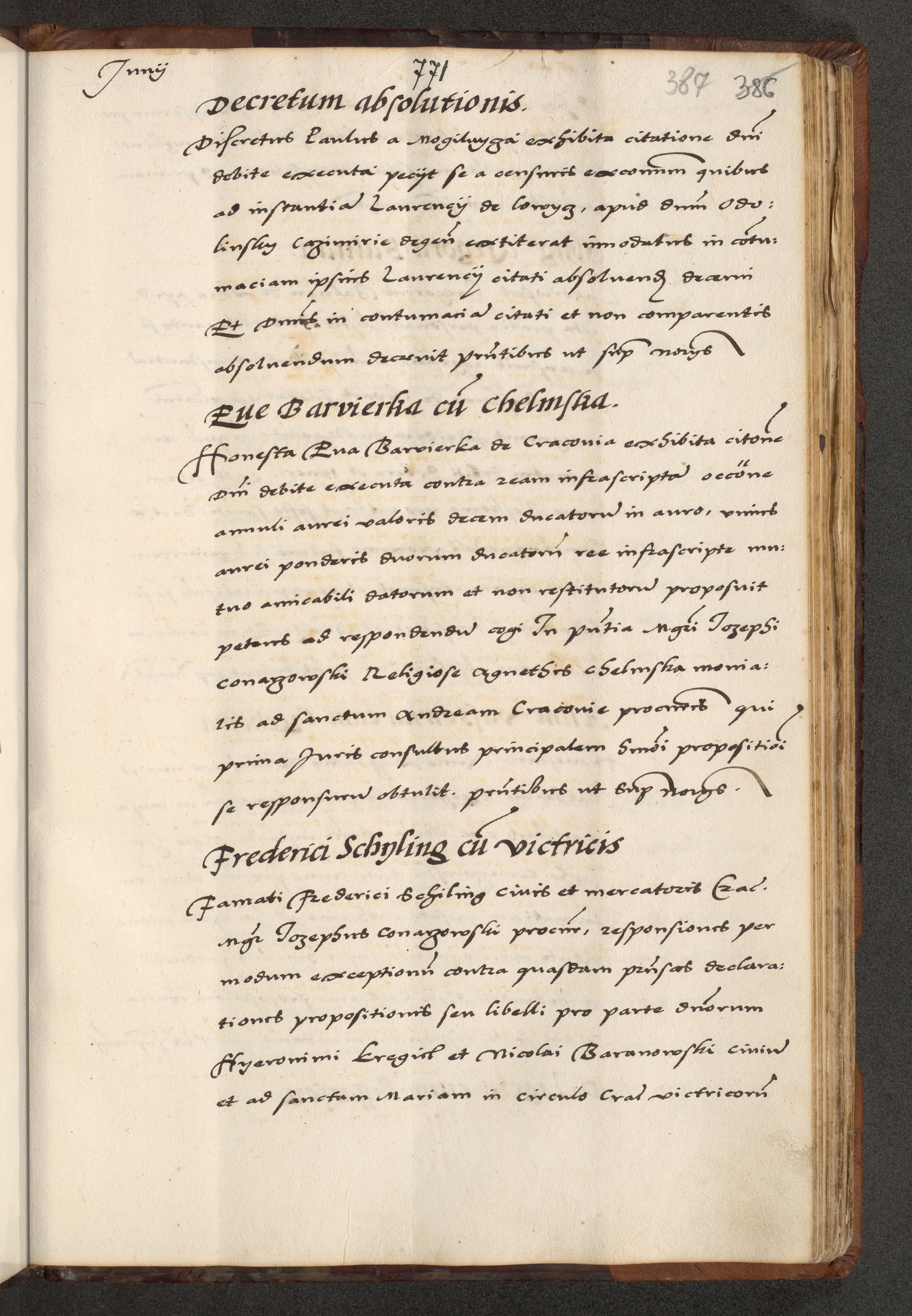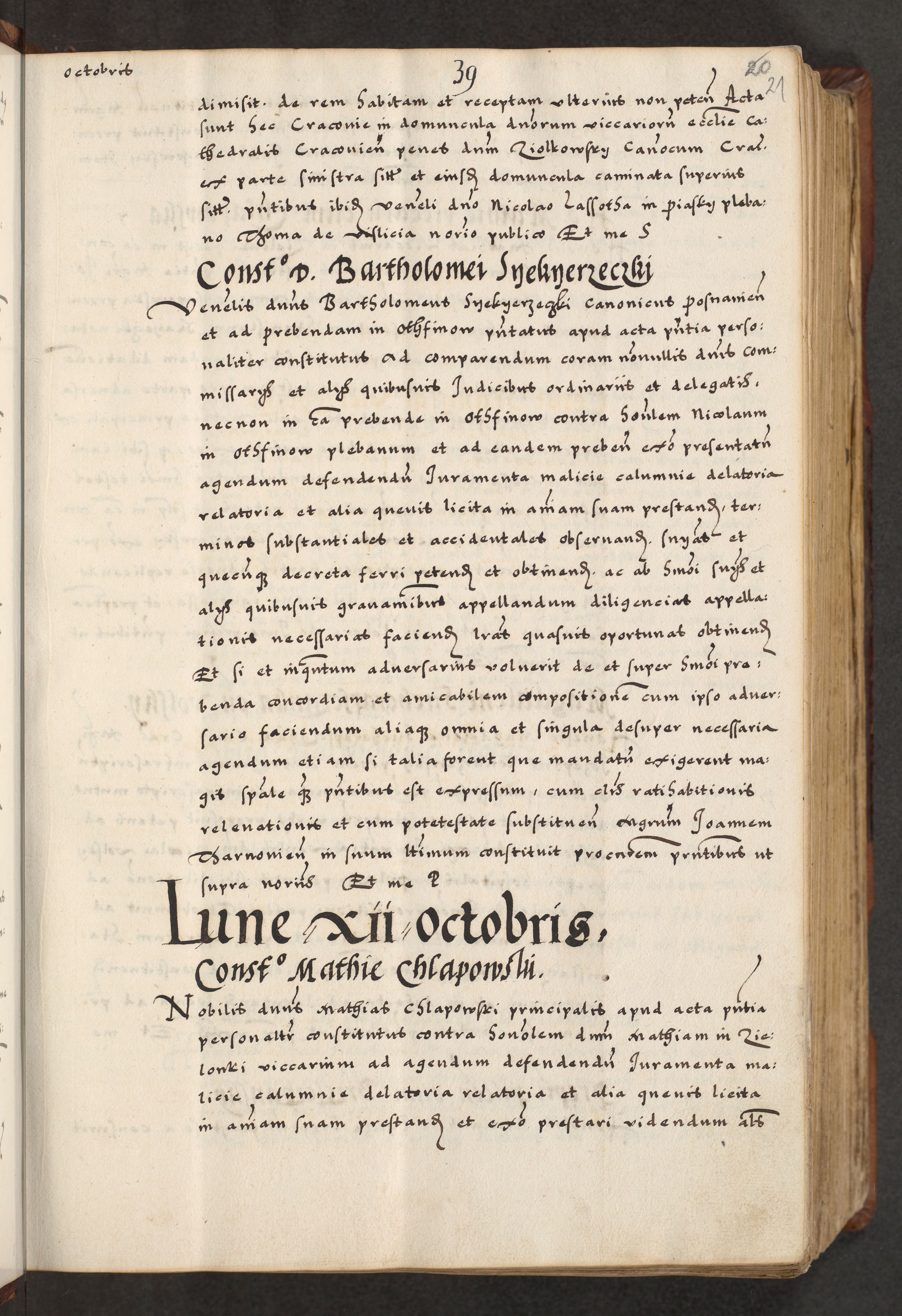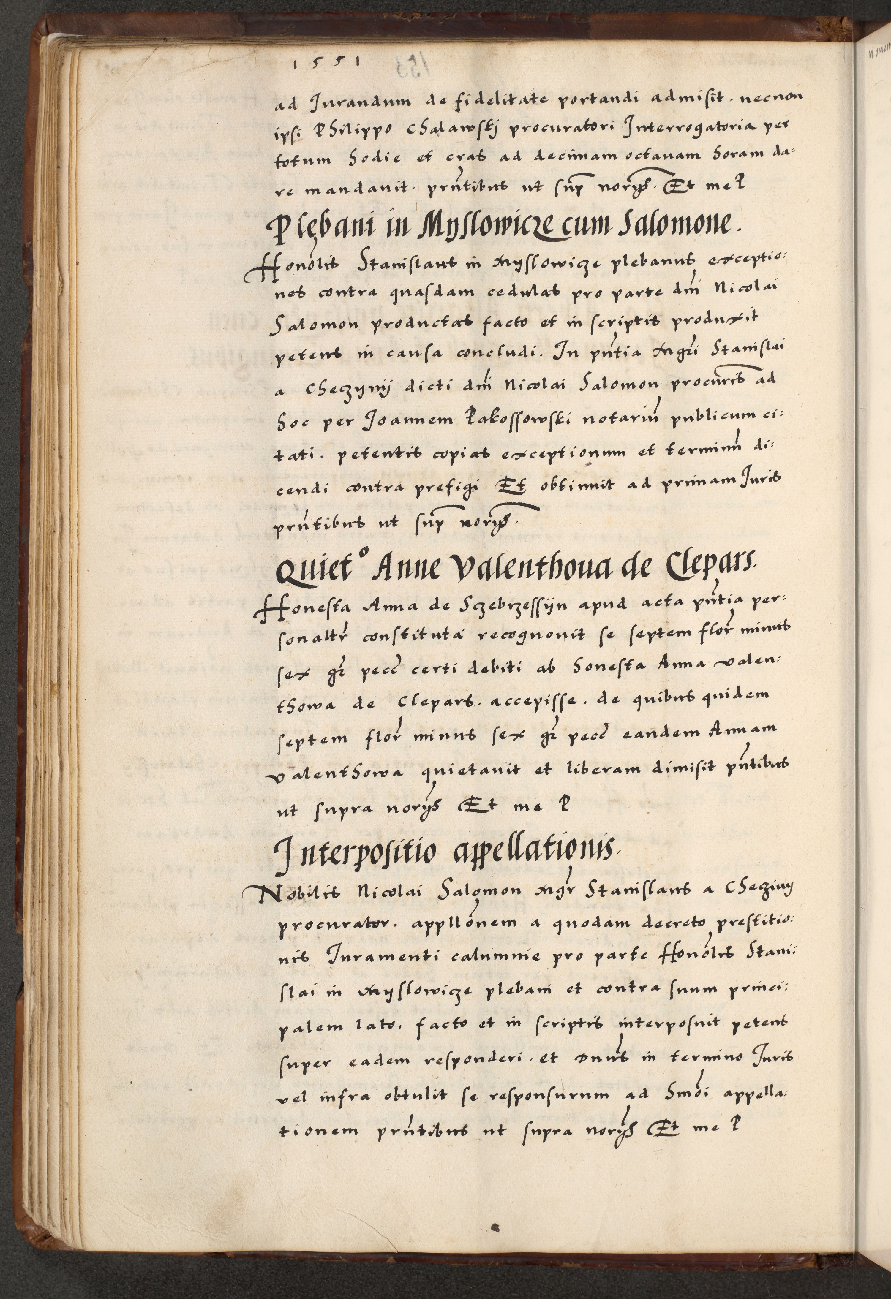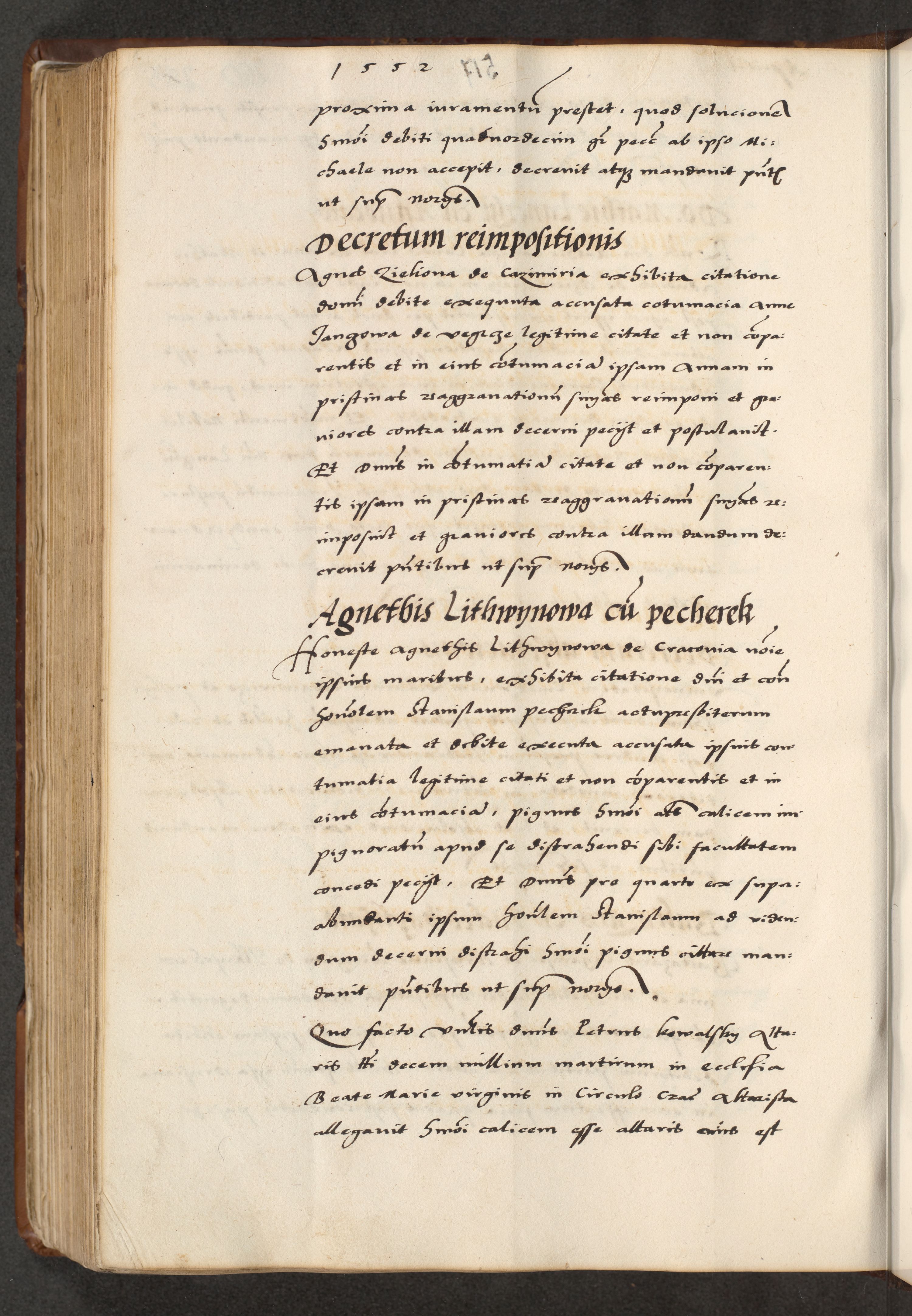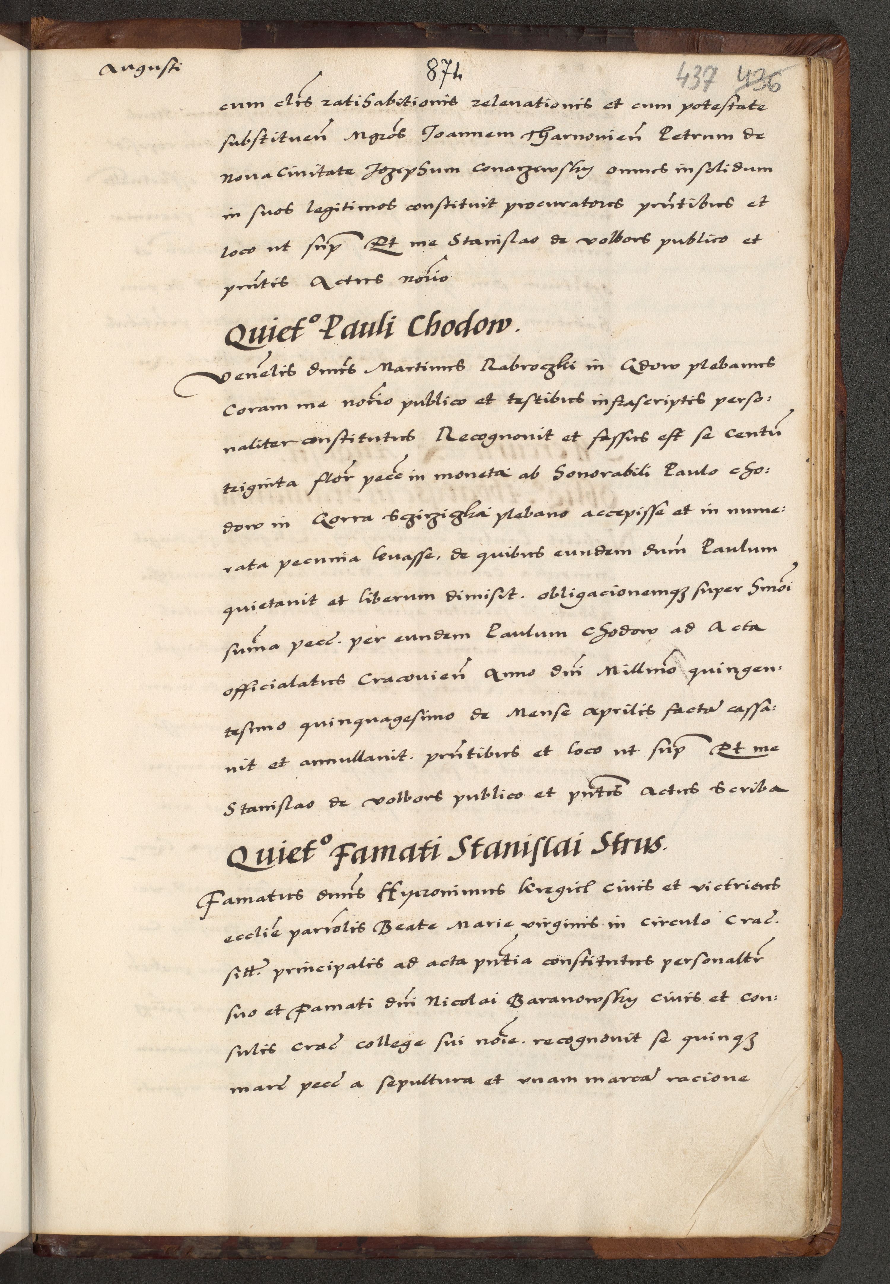 [A]cta actorum causarum, sententiarum tam diffinitivarum quam interloquutoriarum, obligationum, constitutionum et contractuum coram reverendo patre domino Petro Porembski preposito Osvieczimensi, canonico et officiali generali Cracoviensi de anno Domini millesimo quingentesimo quinguagesimo primo, cuius indictio est nona, pontificatus sanctissimi in Christo patris et domini nostri domini Juliii divina providencia pape tercii, anno secundo, a die et mense infrascriptis feliciter continiantur