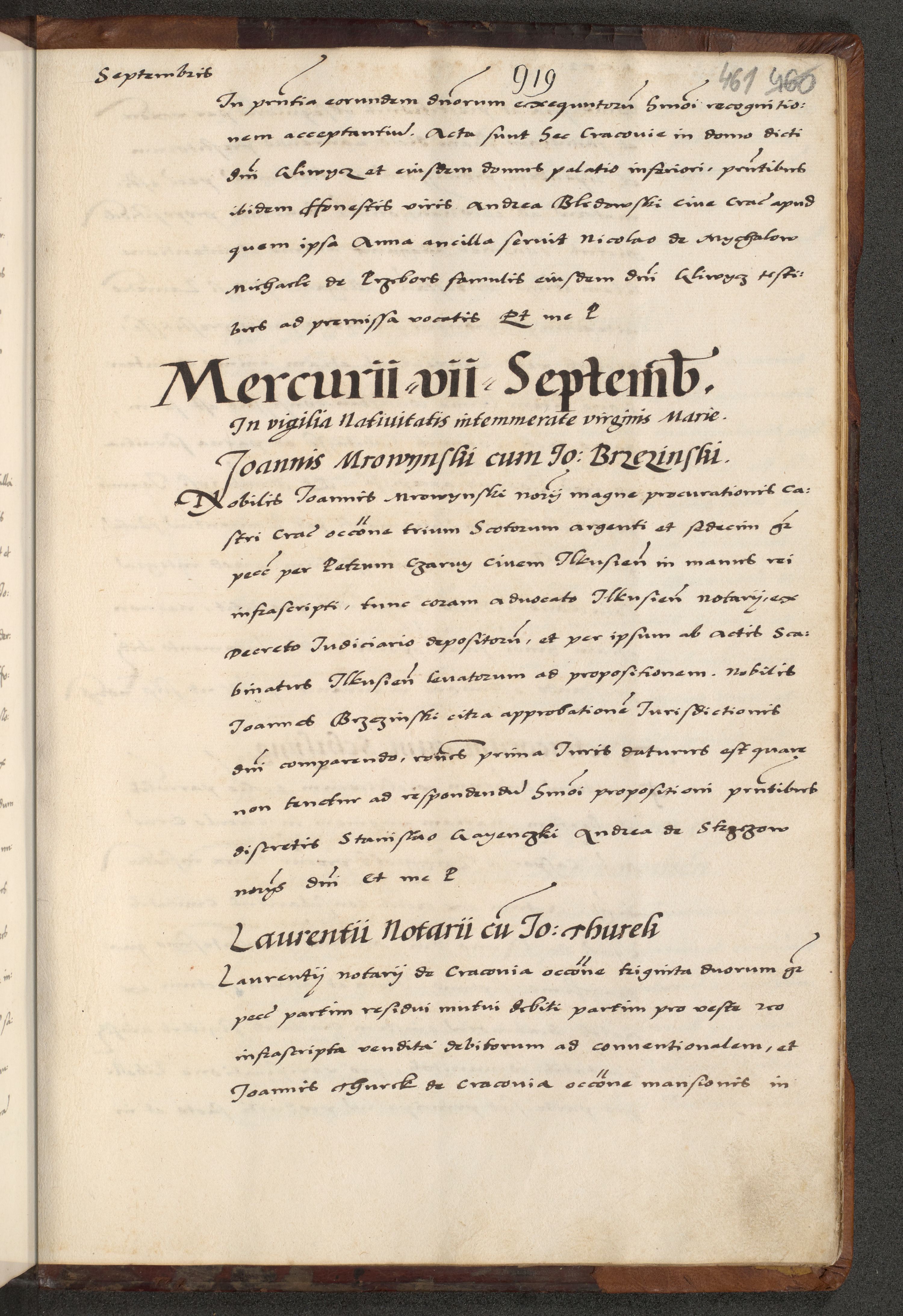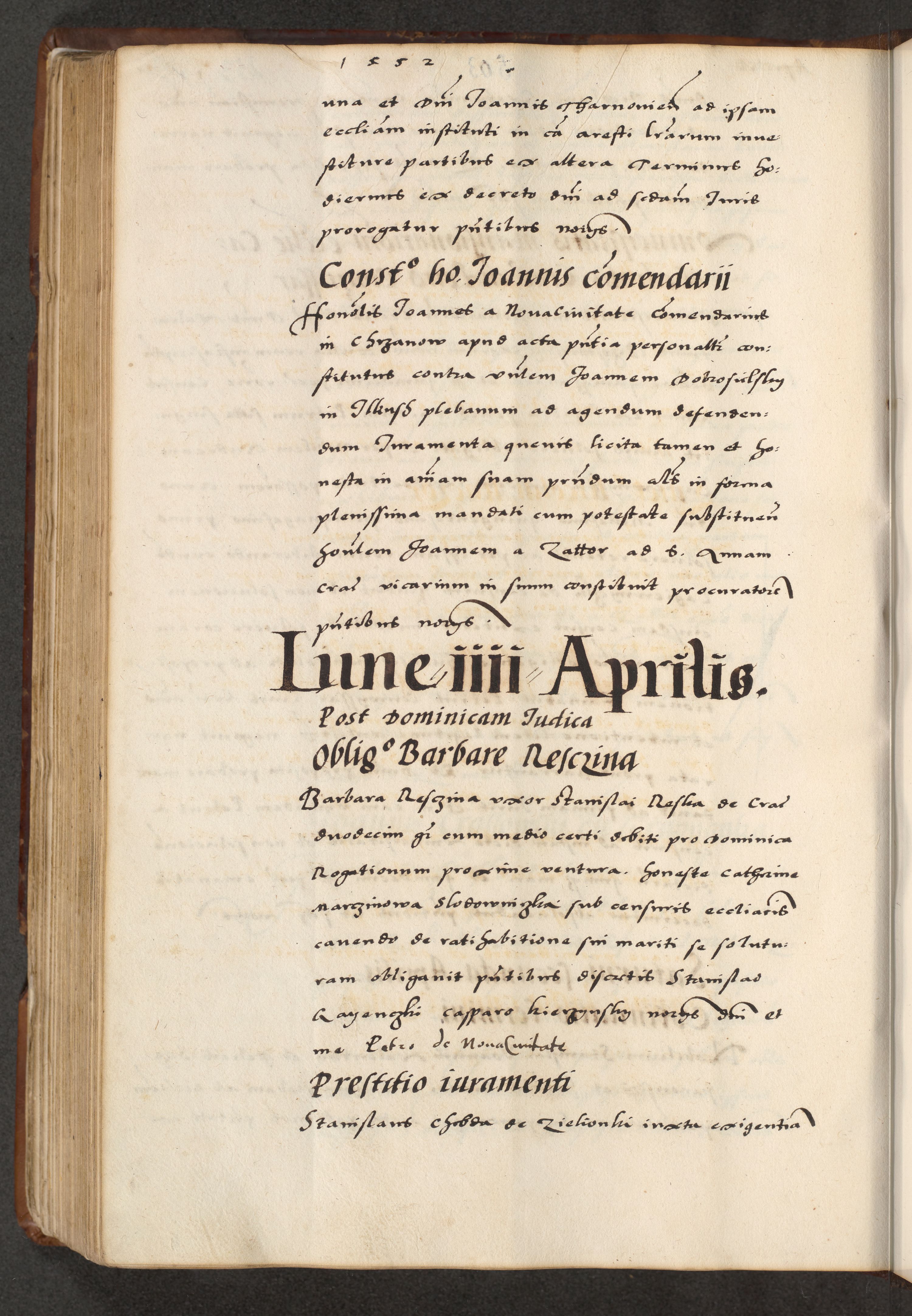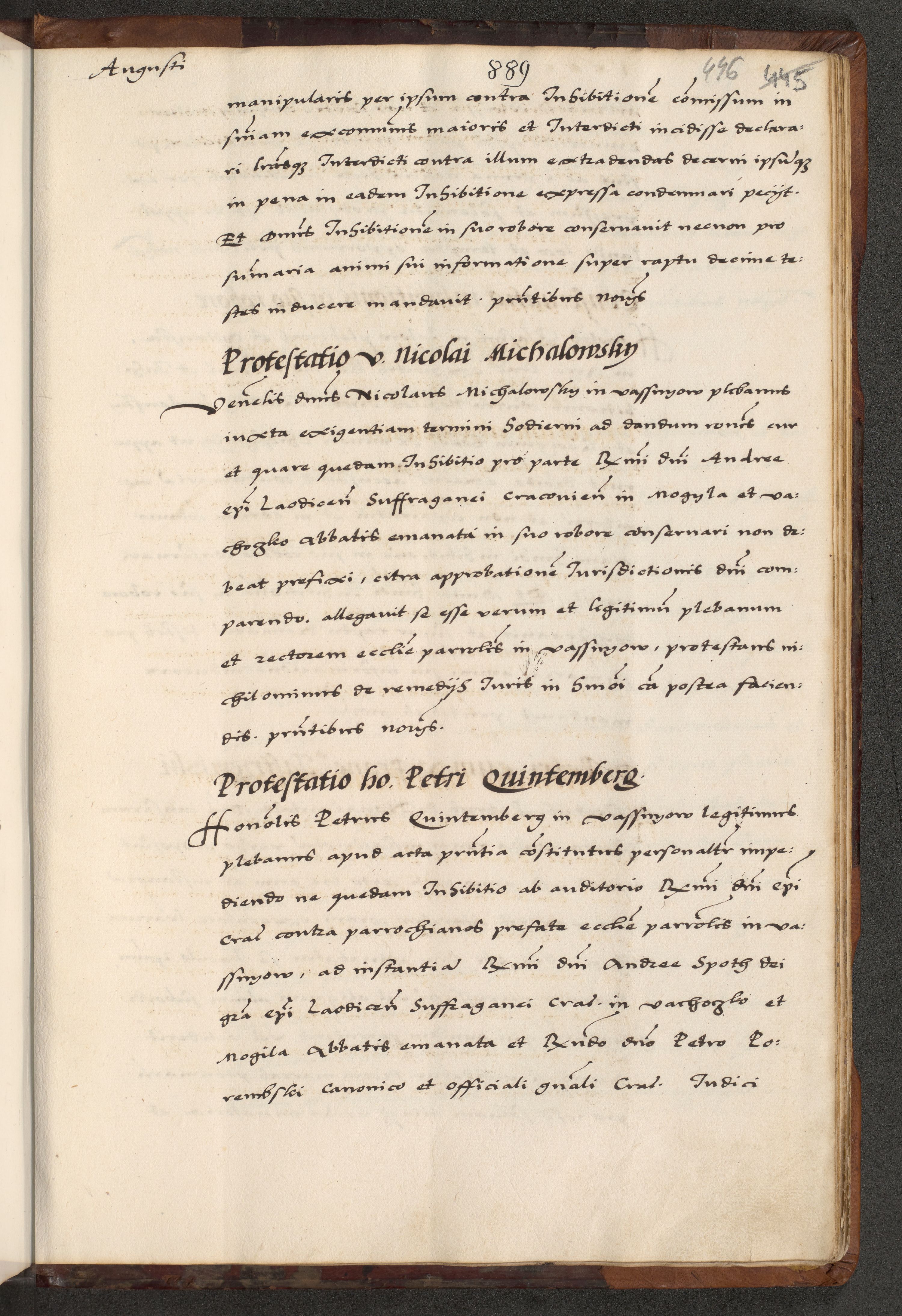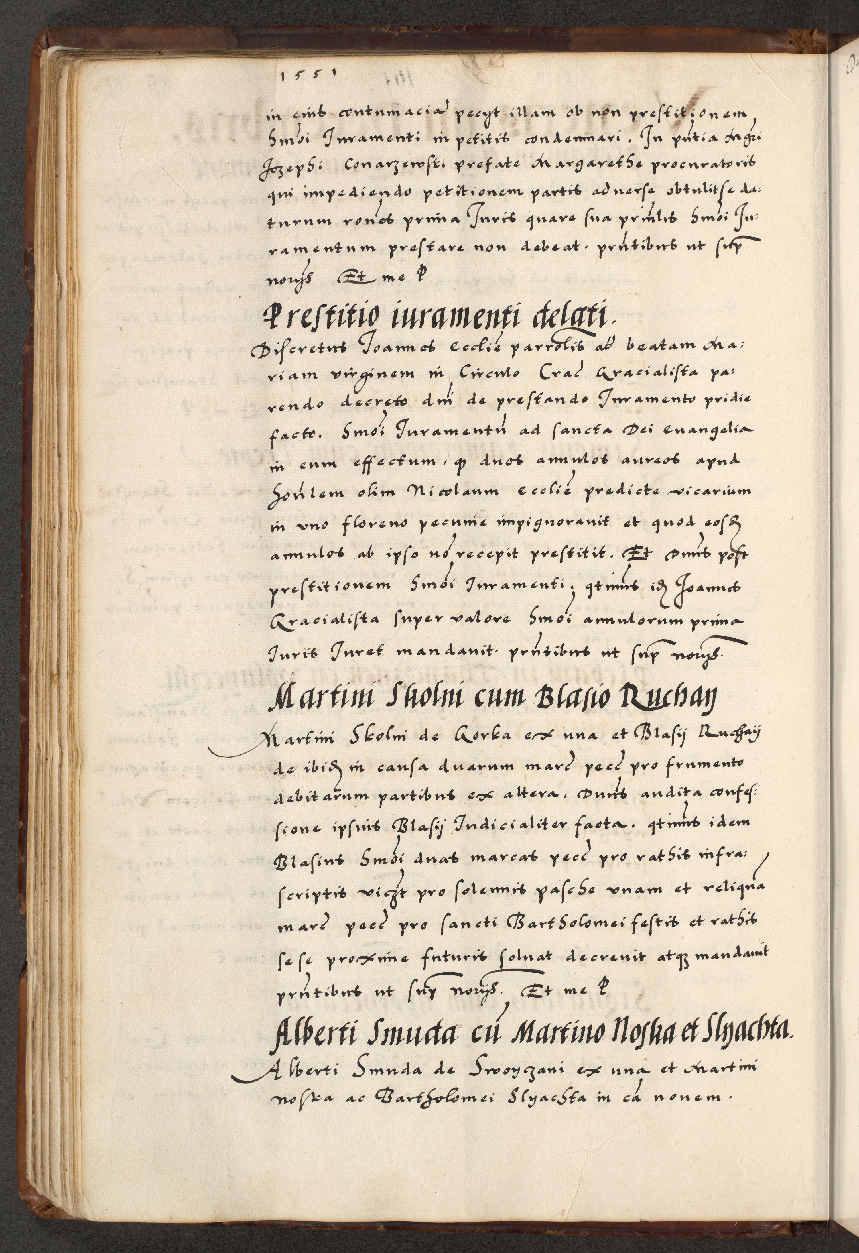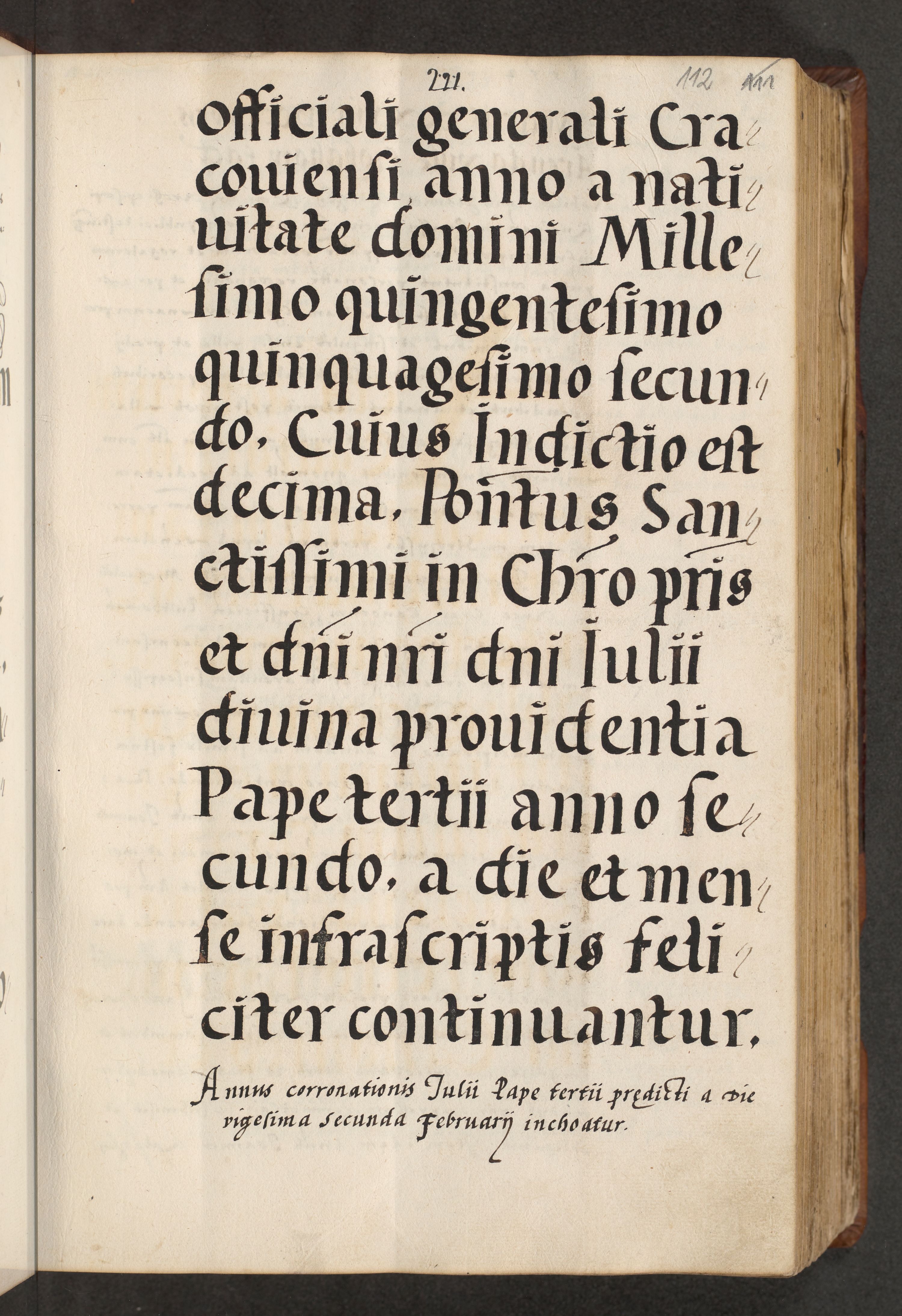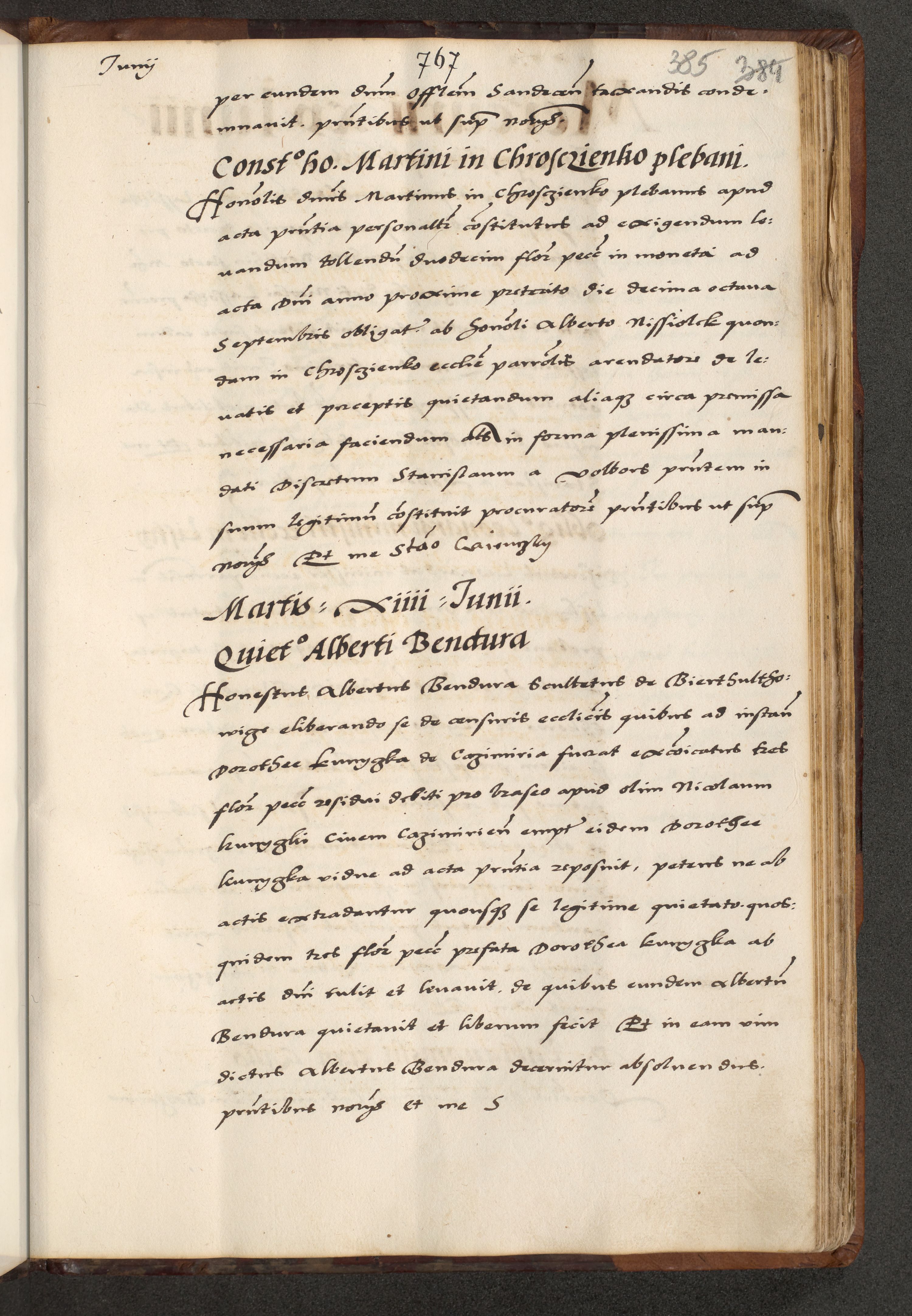 [A]cta actorum causarum, sententiarum tam diffinitivarum quam interloquutoriarum, obligationum, constitutionum et contractuum coram reverendo patre domino Petro Porembski preposito Osvieczimensi, canonico et officiali generali Cracoviensi de anno Domini millesimo quingentesimo quinguagesimo primo, cuius indictio est nona, pontificatus sanctissimi in Christo patris et domini nostri domini Juliii divina providencia pape tercii, anno secundo, a die et mense infrascriptis feliciter continiantur