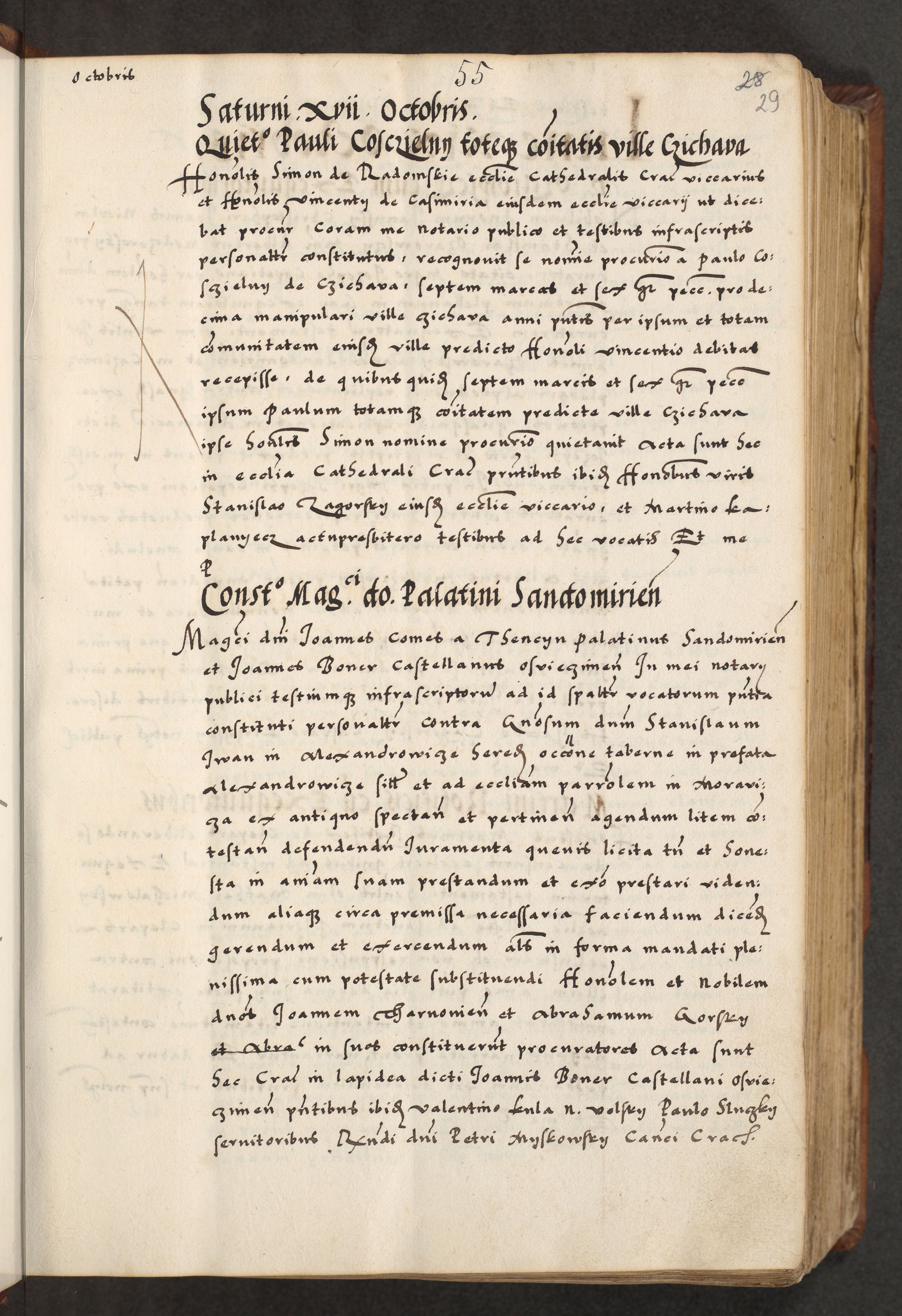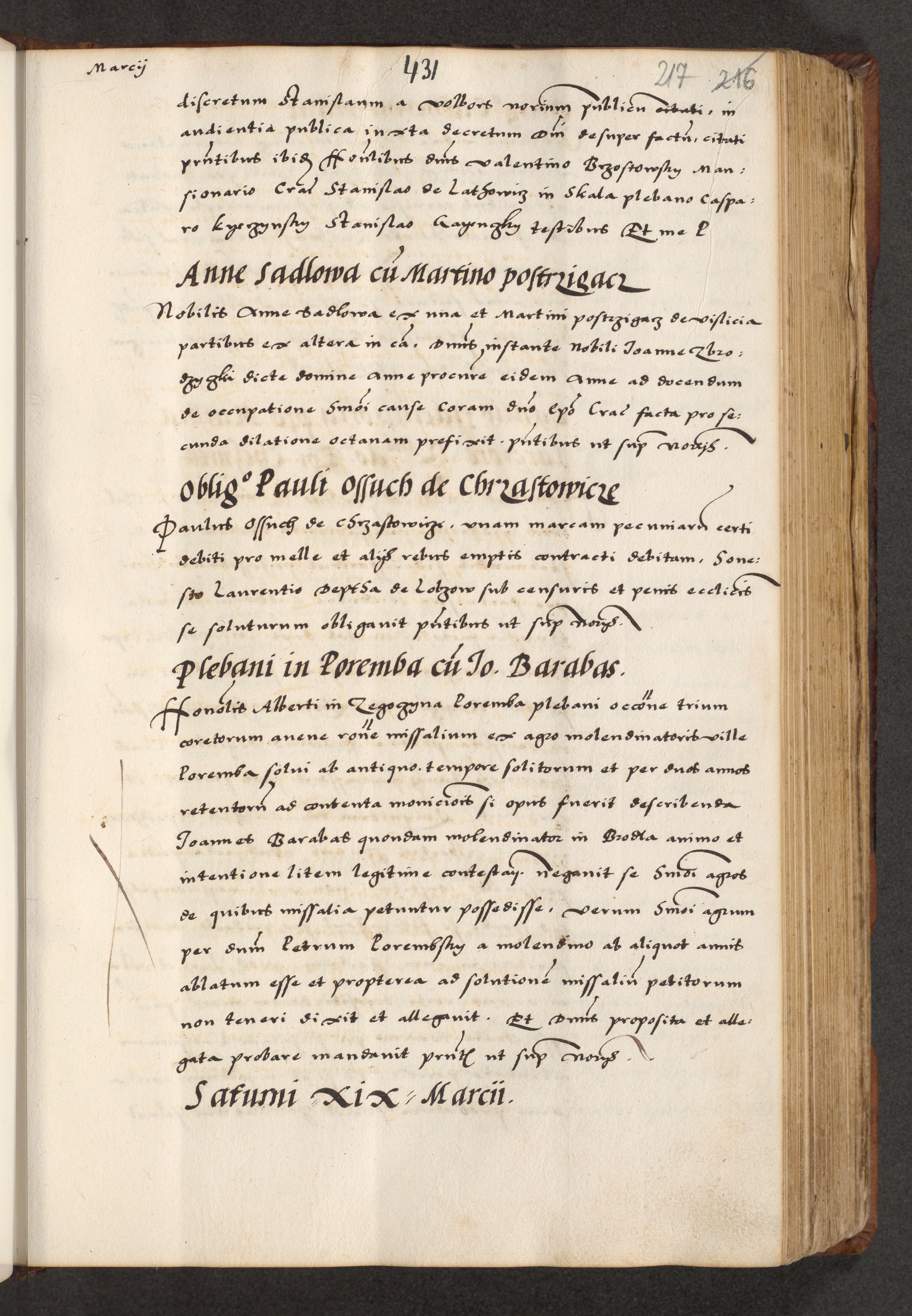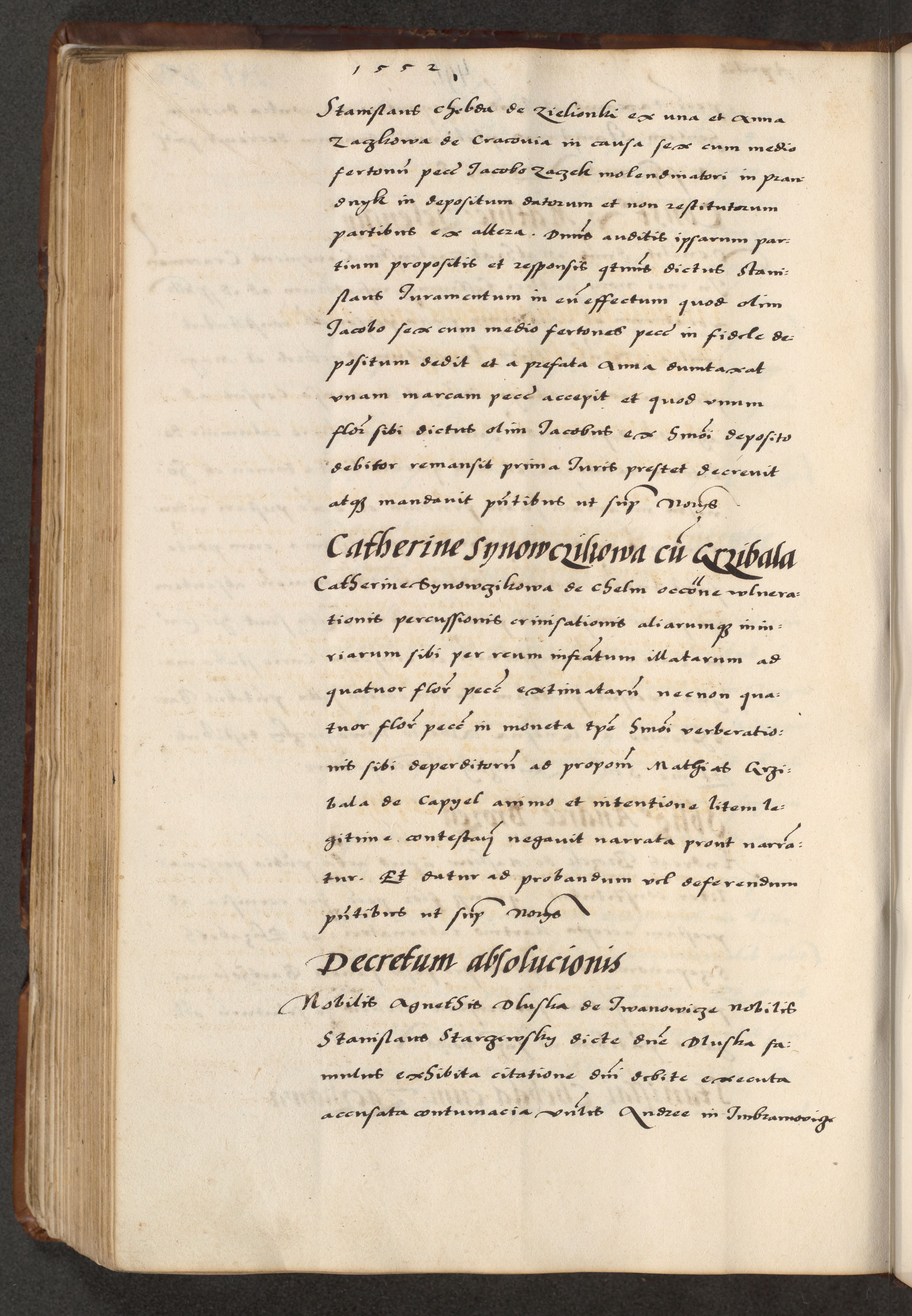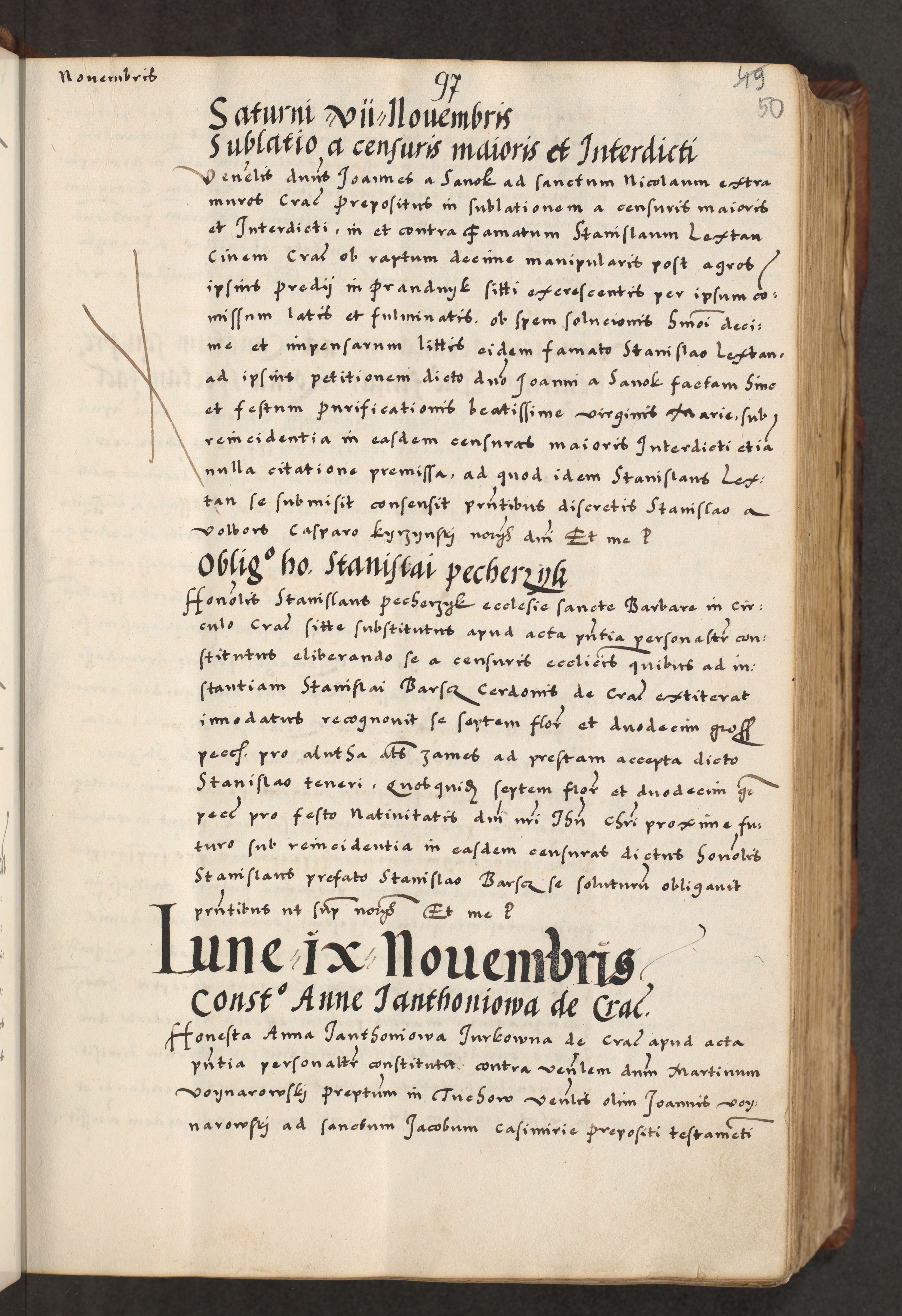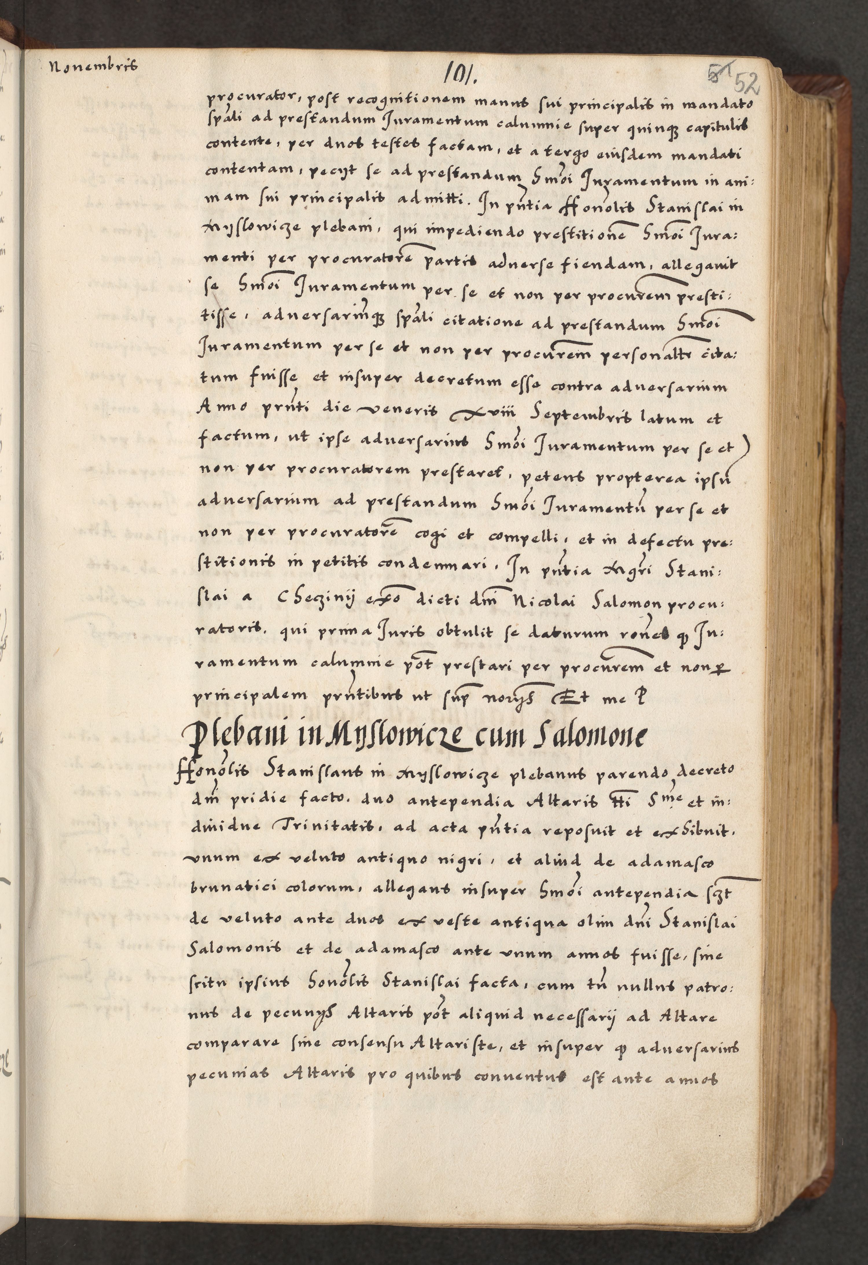 [A]cta actorum causarum, sententiarum tam diffinitivarum quam interloquutoriarum, obligationum, constitutionum et contractuum coram reverendo patre domino Petro Porembski preposito Osvieczimensi, canonico et officiali generali Cracoviensi de anno Domini millesimo quingentesimo quinguagesimo primo, cuius indictio est nona, pontificatus sanctissimi in Christo patris et domini nostri domini Juliii divina providencia pape tercii, anno secundo, a die et mense infrascriptis feliciter continiantur