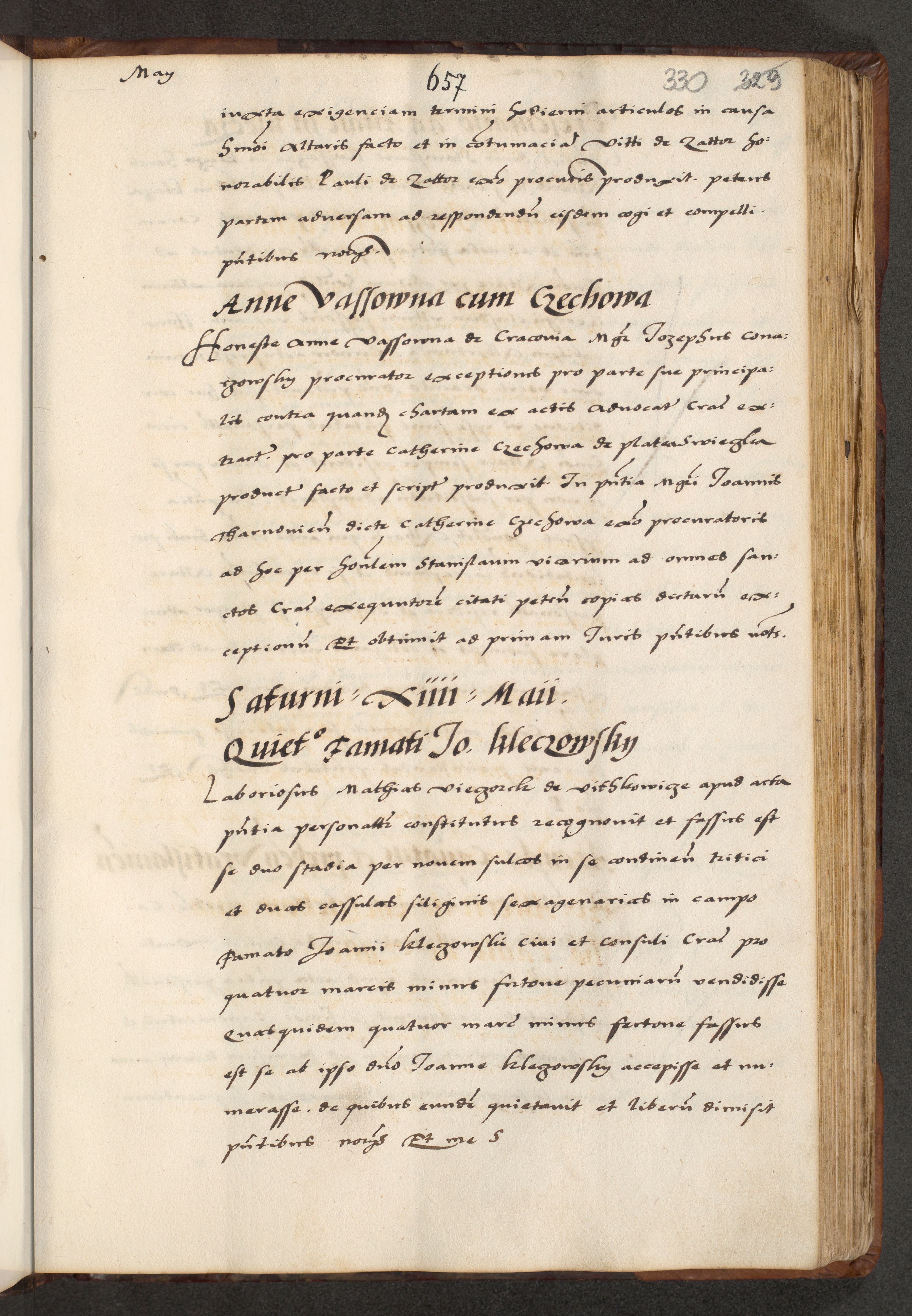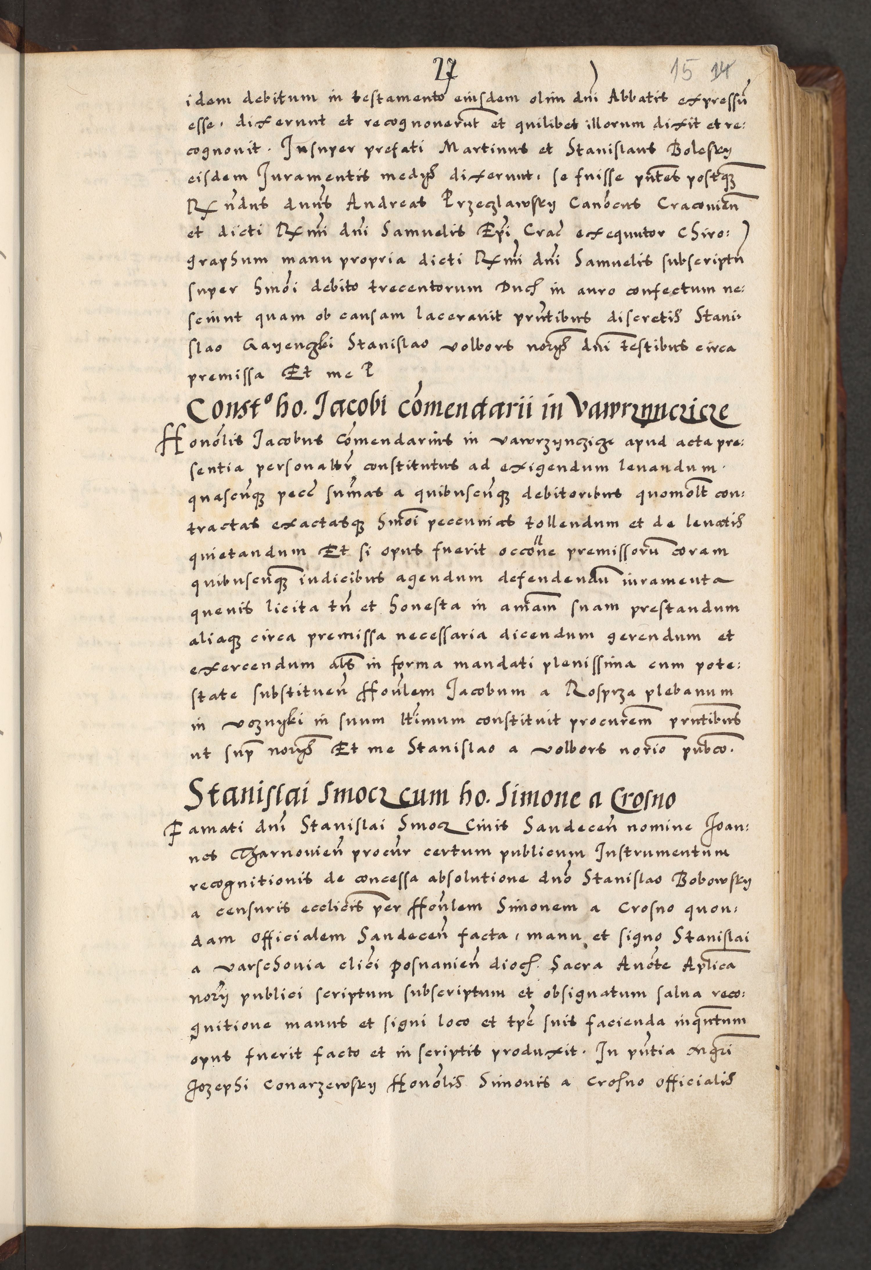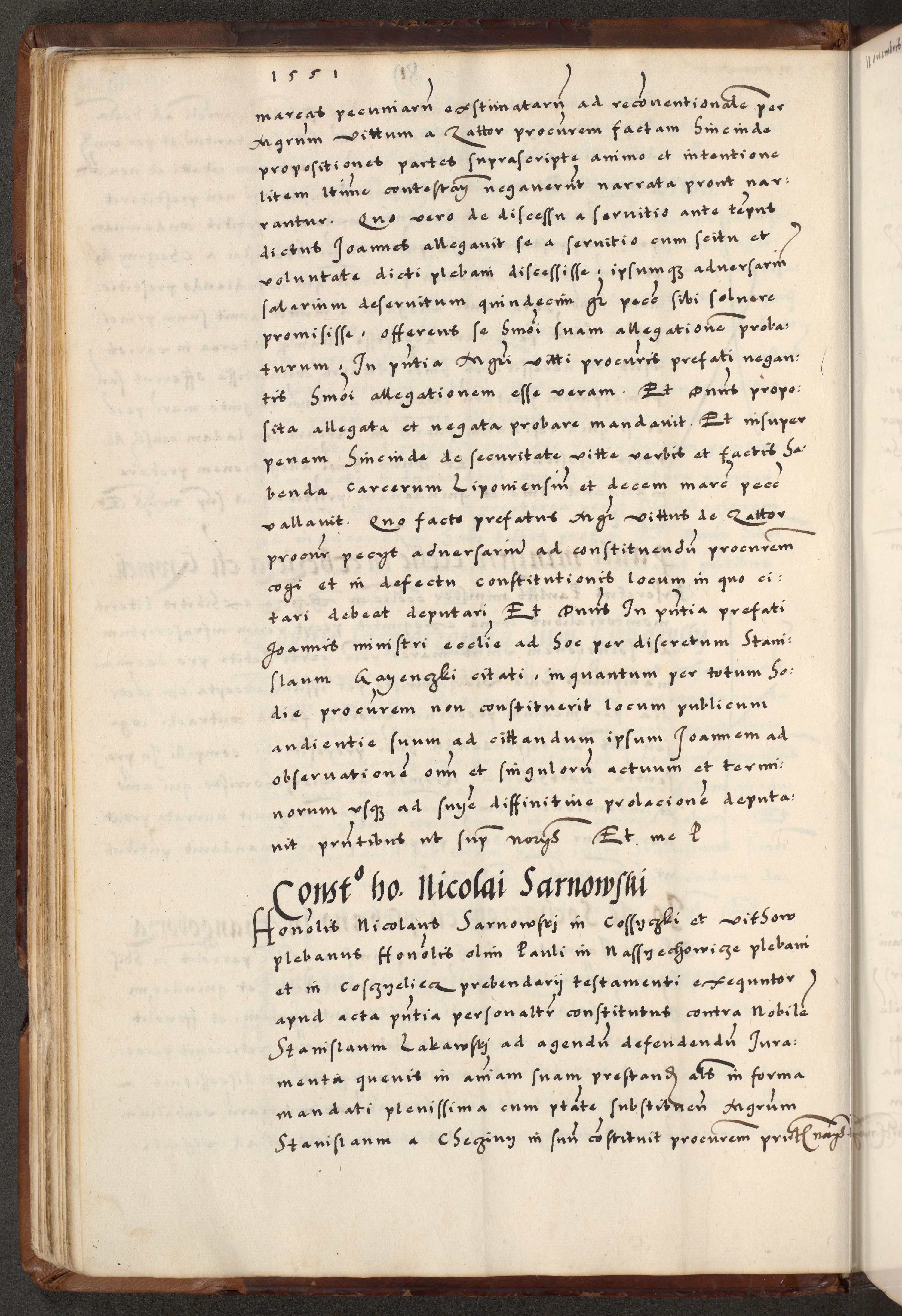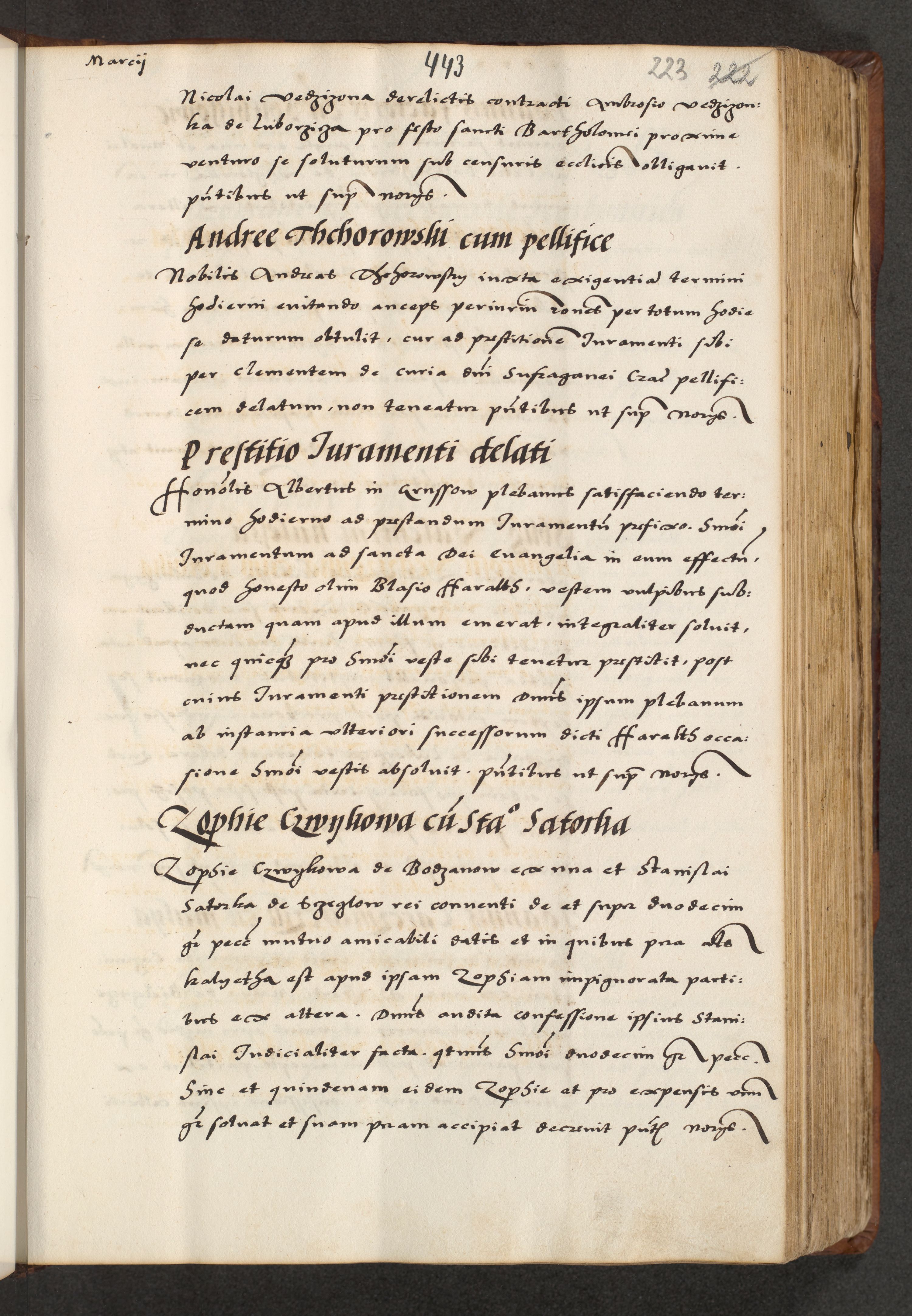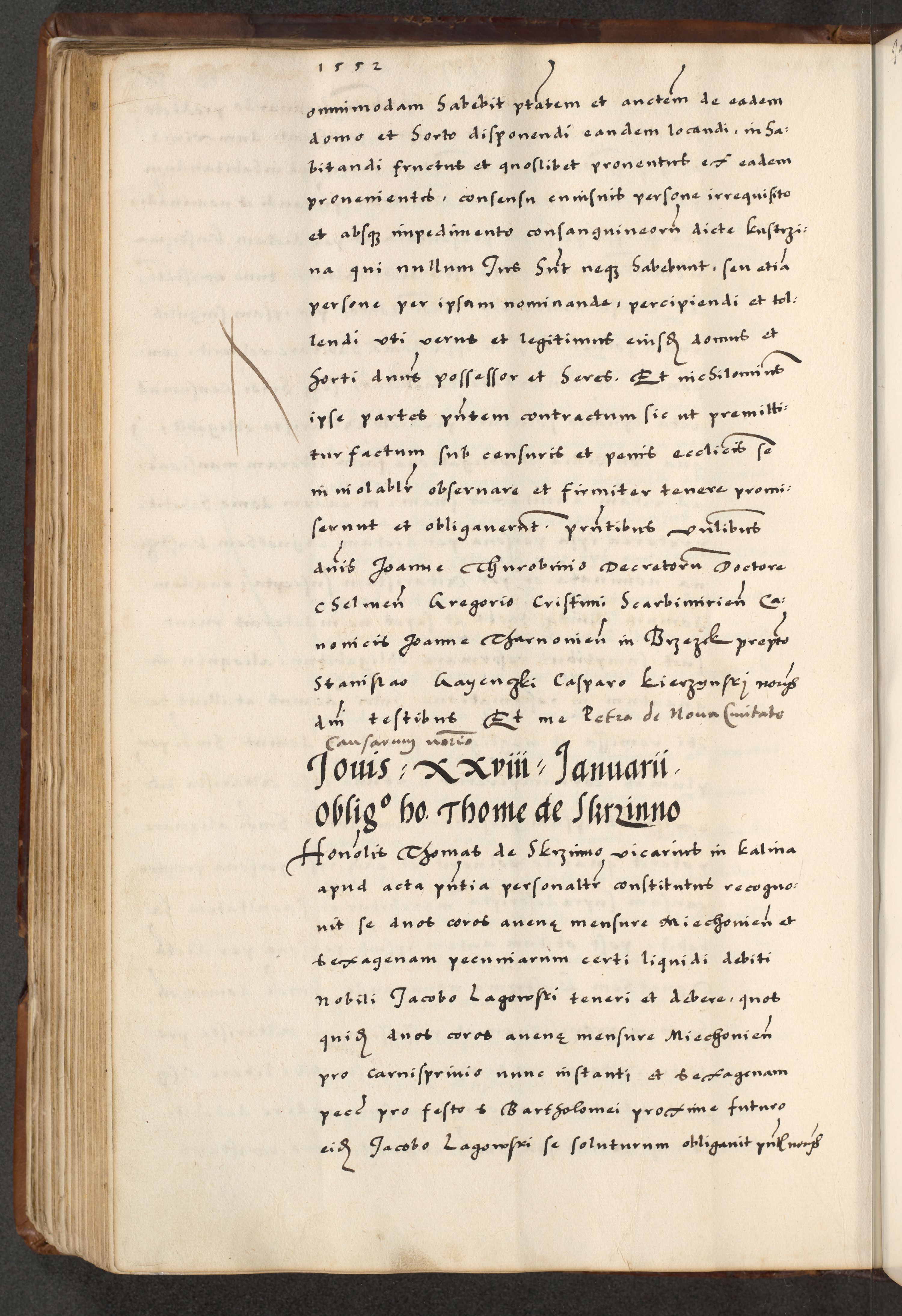 [A]cta actorum causarum, sententiarum tam diffinitivarum quam interloquutoriarum, obligationum, constitutionum et contractuum coram reverendo patre domino Petro Porembski preposito Osvieczimensi, canonico et officiali generali Cracoviensi de anno Domini millesimo quingentesimo quinguagesimo primo, cuius indictio est nona, pontificatus sanctissimi in Christo patris et domini nostri domini Juliii divina providencia pape tercii, anno secundo, a die et mense infrascriptis feliciter continiantur