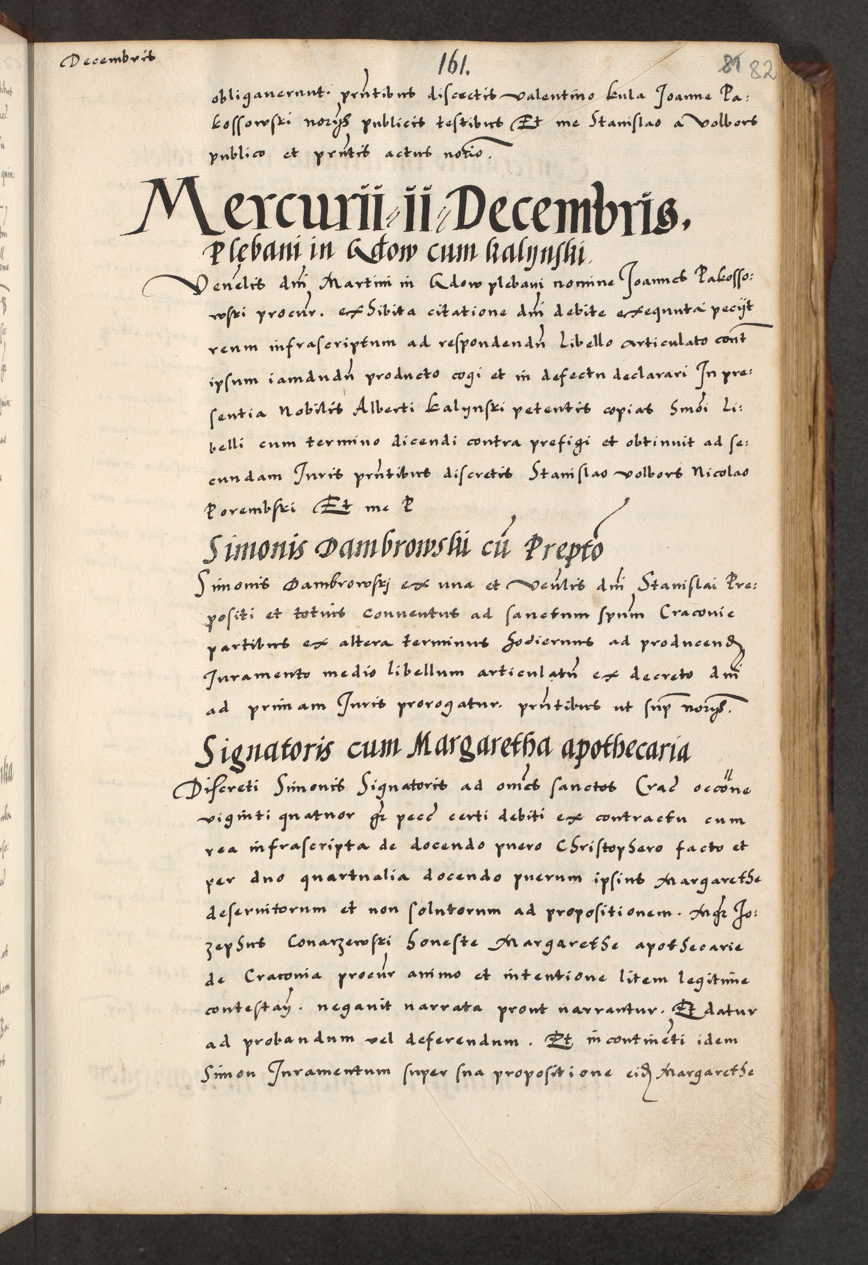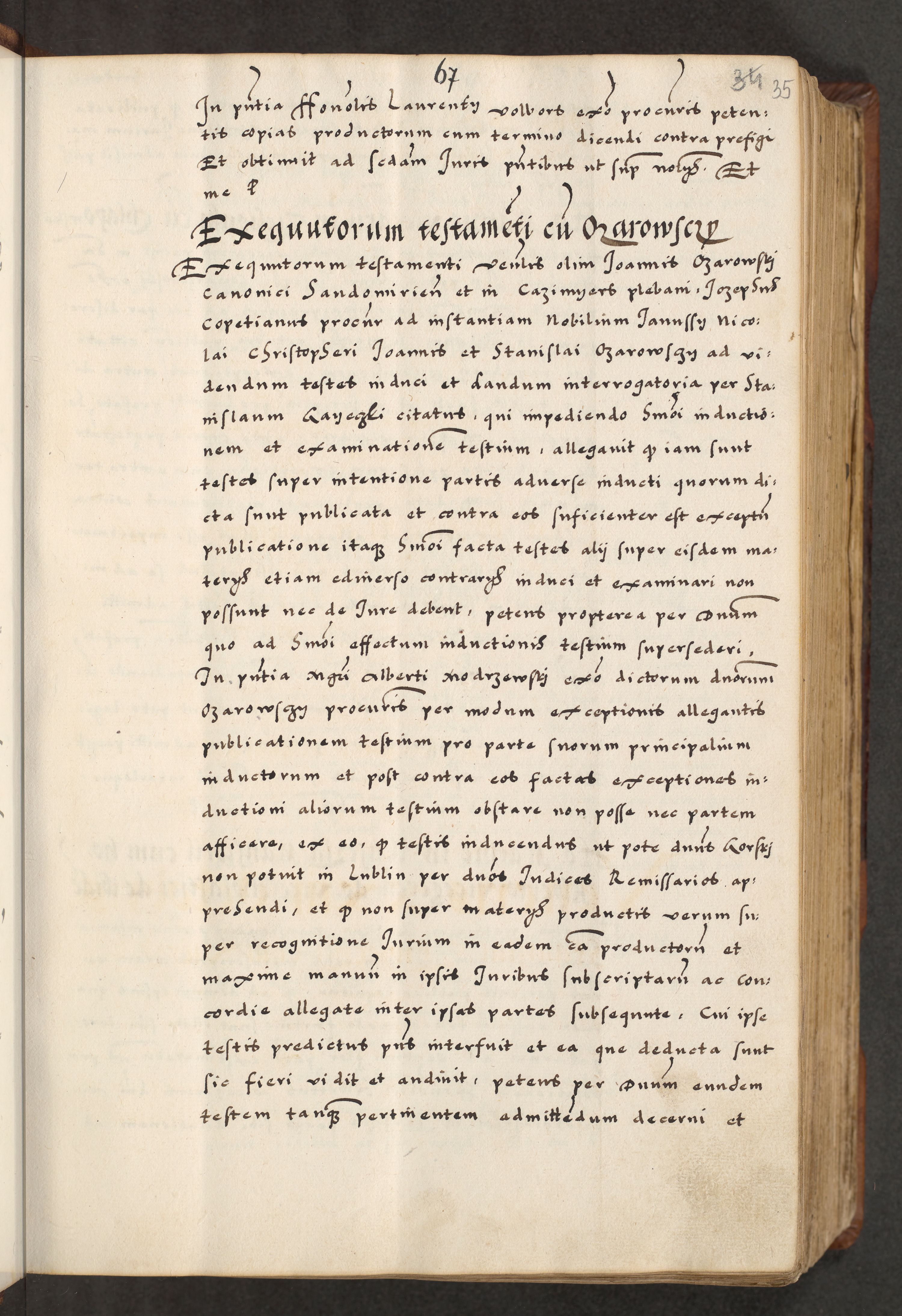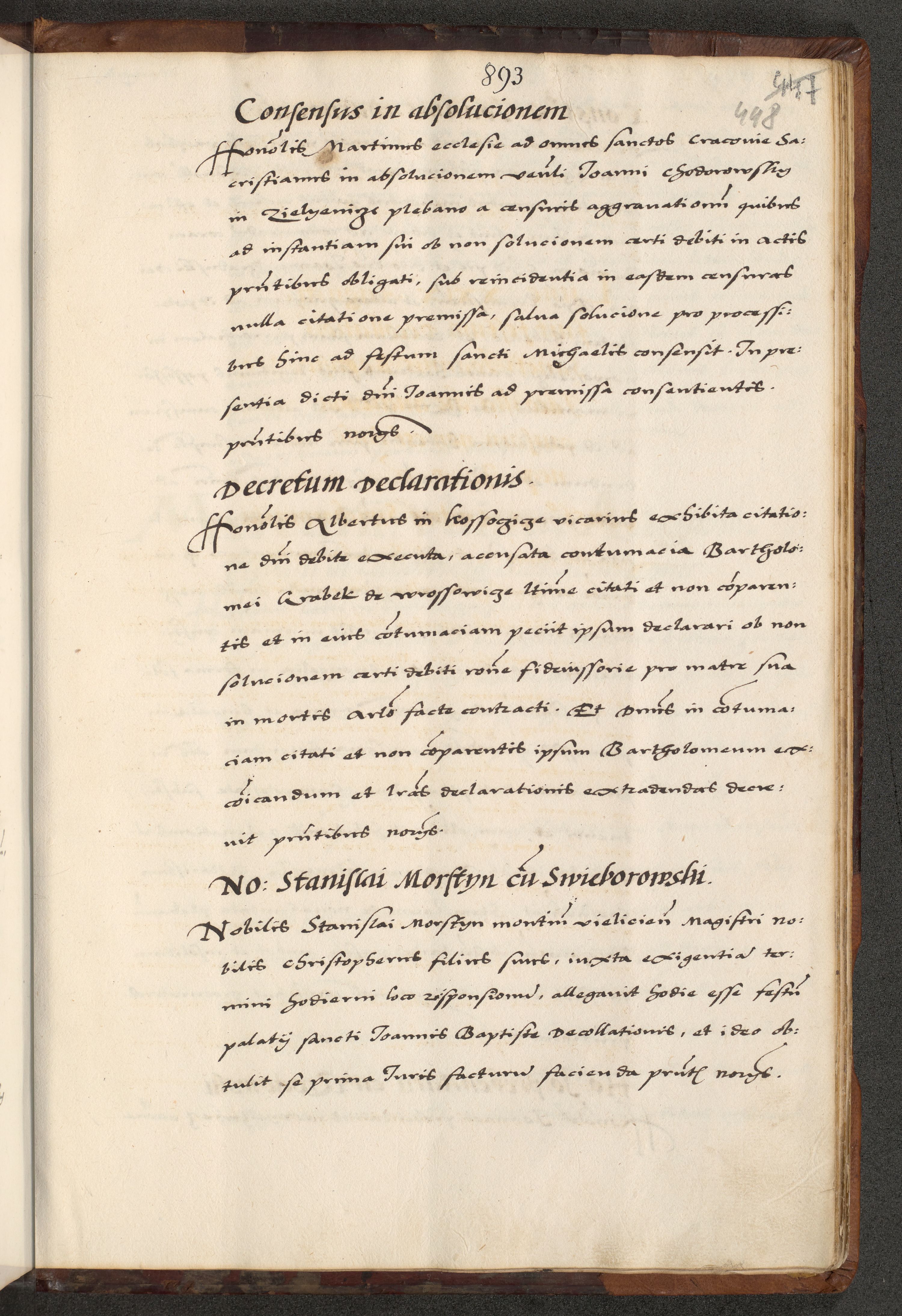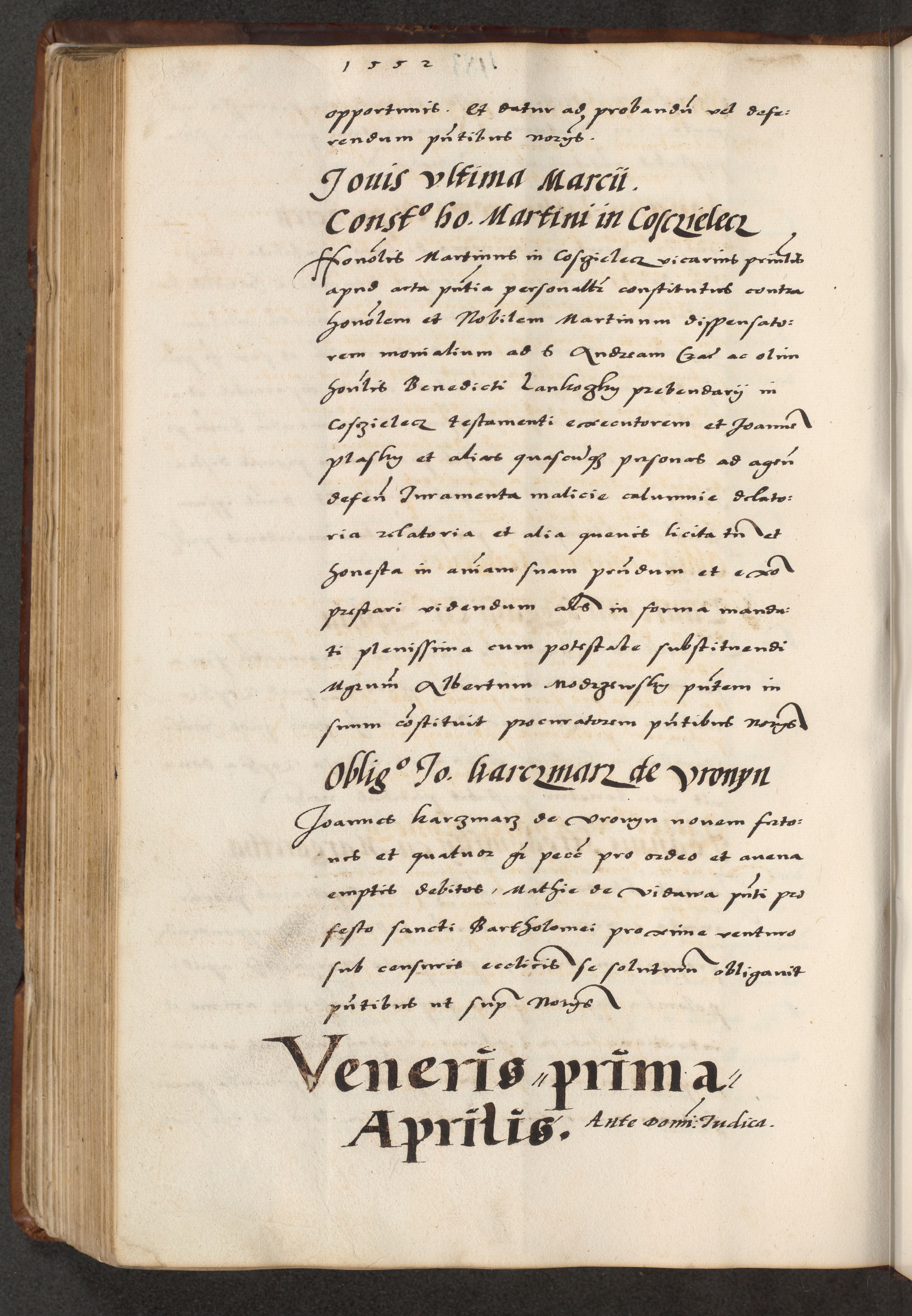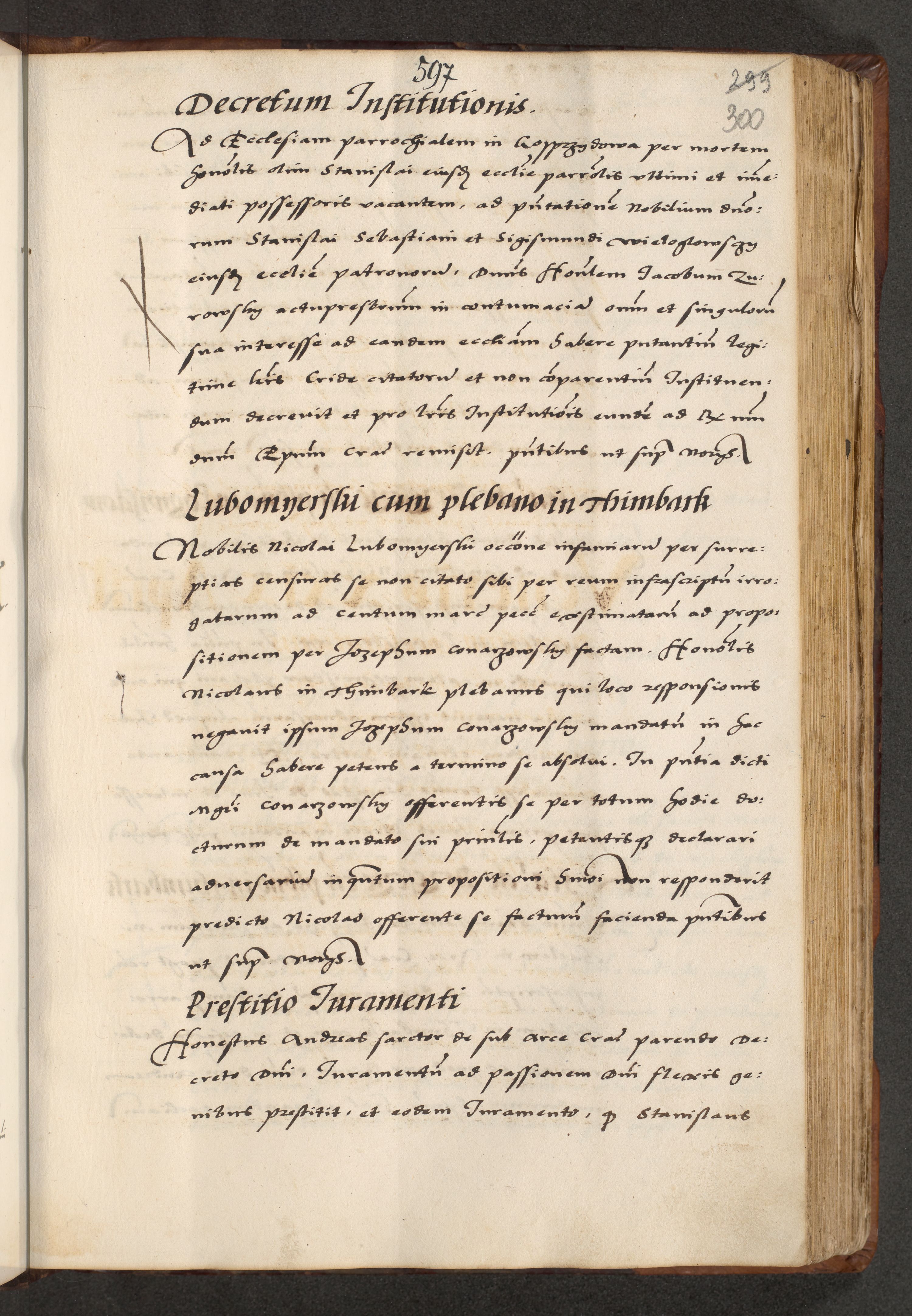 [A]cta actorum causarum, sententiarum tam diffinitivarum quam interloquutoriarum, obligationum, constitutionum et contractuum coram reverendo patre domino Petro Porembski preposito Osvieczimensi, canonico et officiali generali Cracoviensi de anno Domini millesimo quingentesimo quinguagesimo primo, cuius indictio est nona, pontificatus sanctissimi in Christo patris et domini nostri domini Juliii divina providencia pape tercii, anno secundo, a die et mense infrascriptis feliciter continiantur