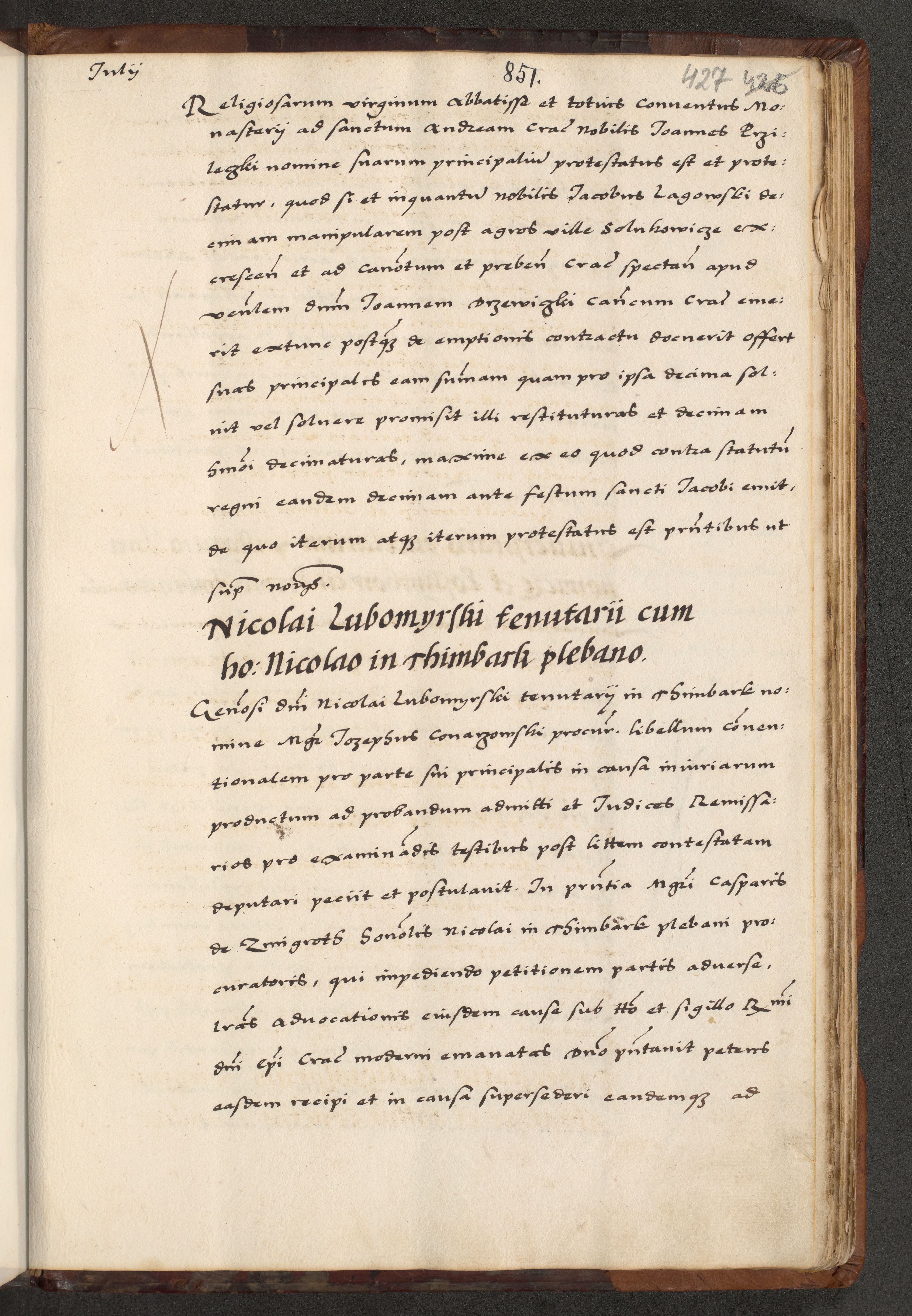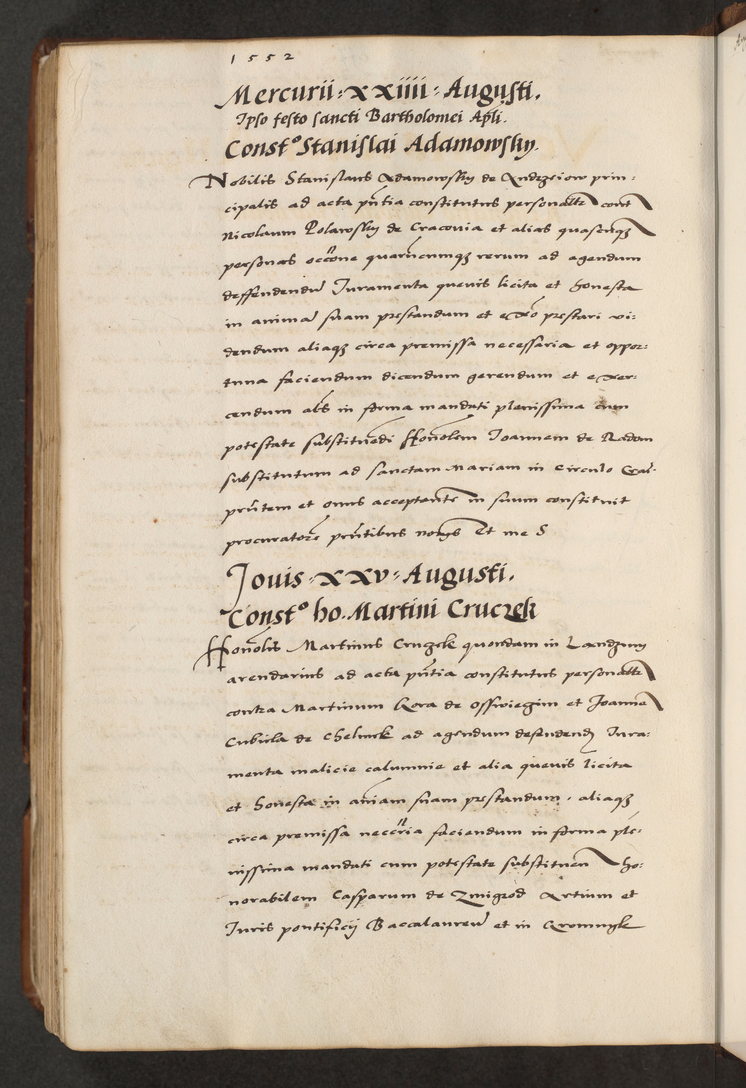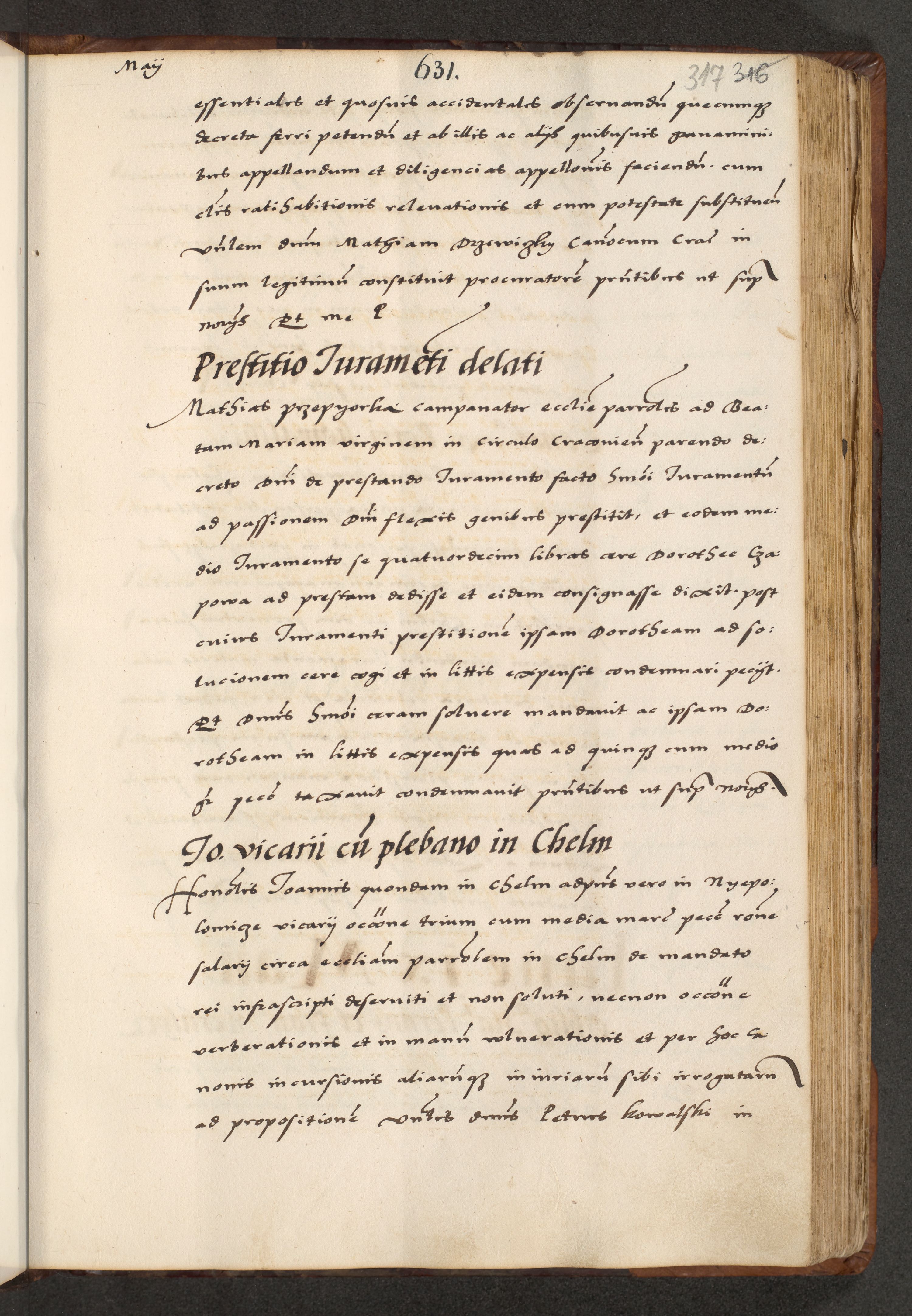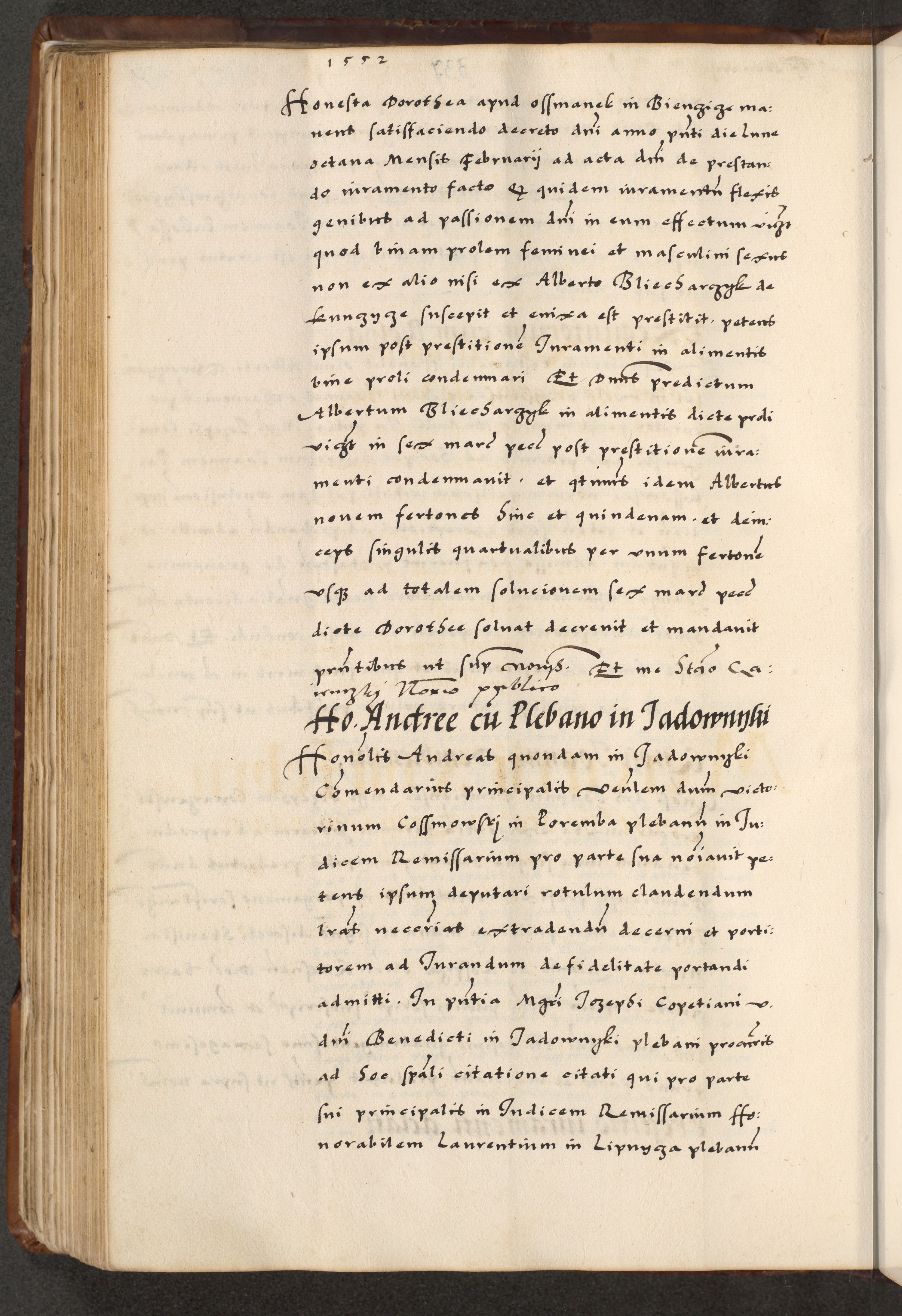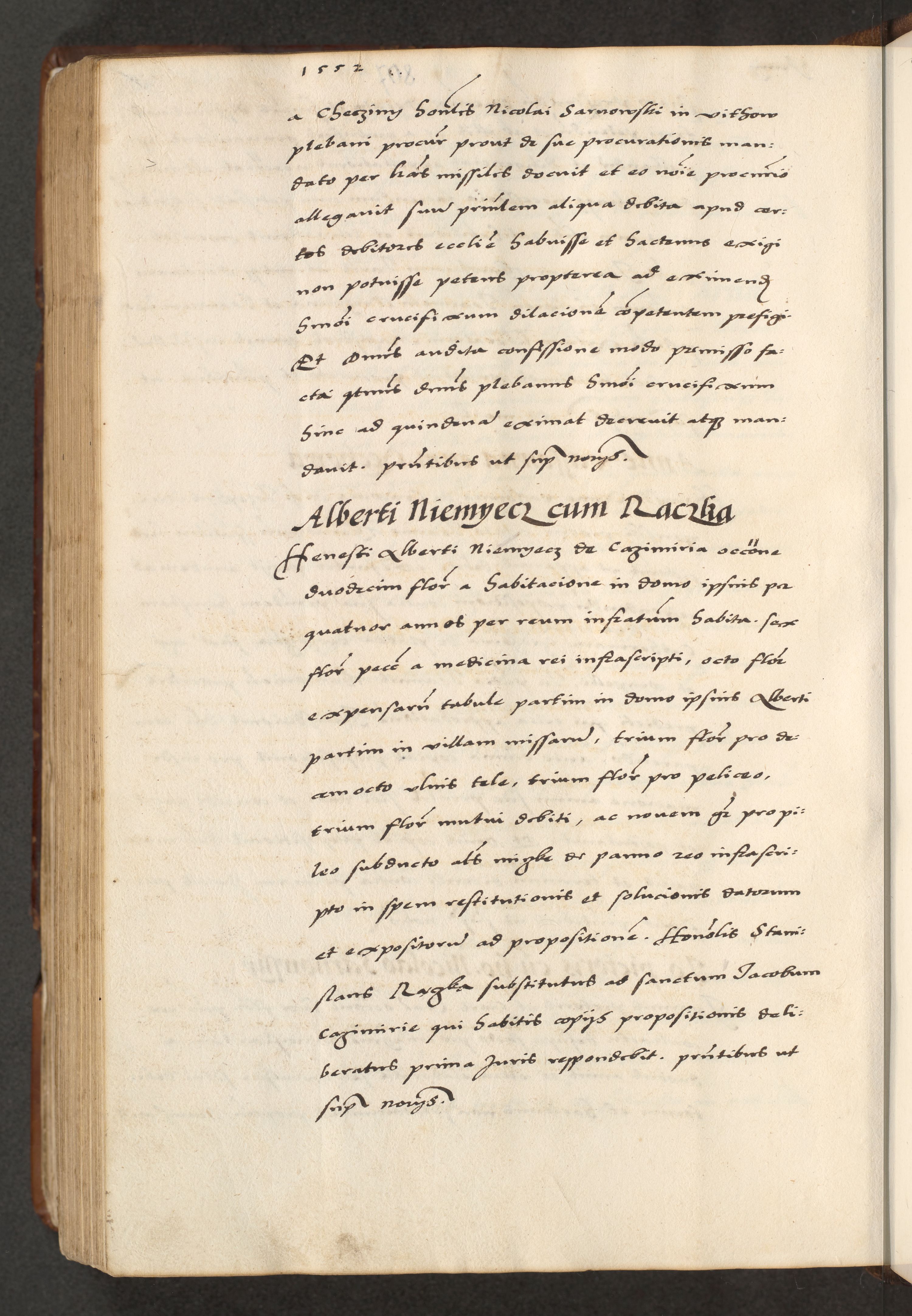 [A]cta actorum causarum, sententiarum tam diffinitivarum quam interloquutoriarum, obligationum, constitutionum et contractuum coram reverendo patre domino Petro Porembski preposito Osvieczimensi, canonico et officiali generali Cracoviensi de anno Domini millesimo quingentesimo quinguagesimo primo, cuius indictio est nona, pontificatus sanctissimi in Christo patris et domini nostri domini Juliii divina providencia pape tercii, anno secundo, a die et mense infrascriptis feliciter continiantur