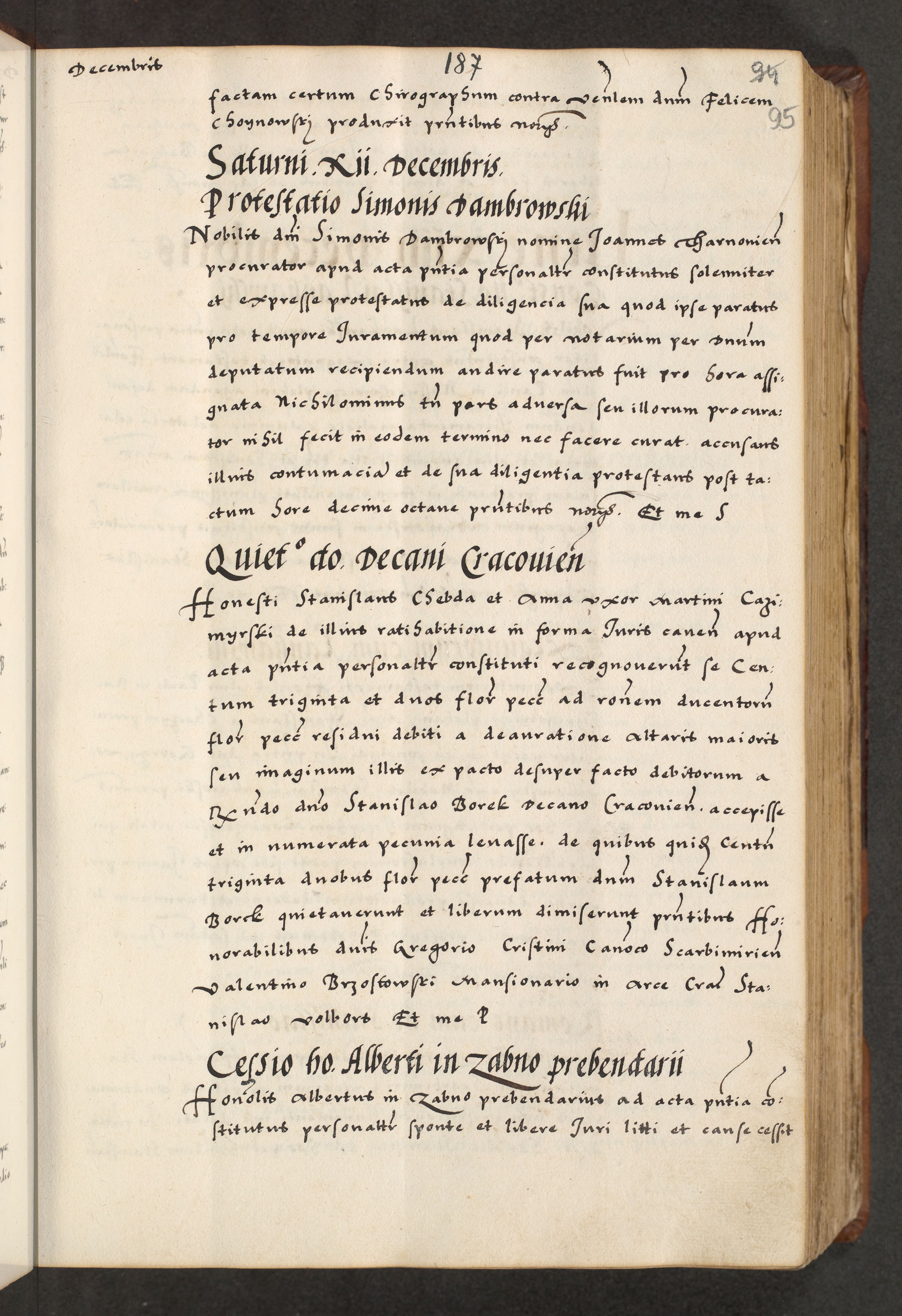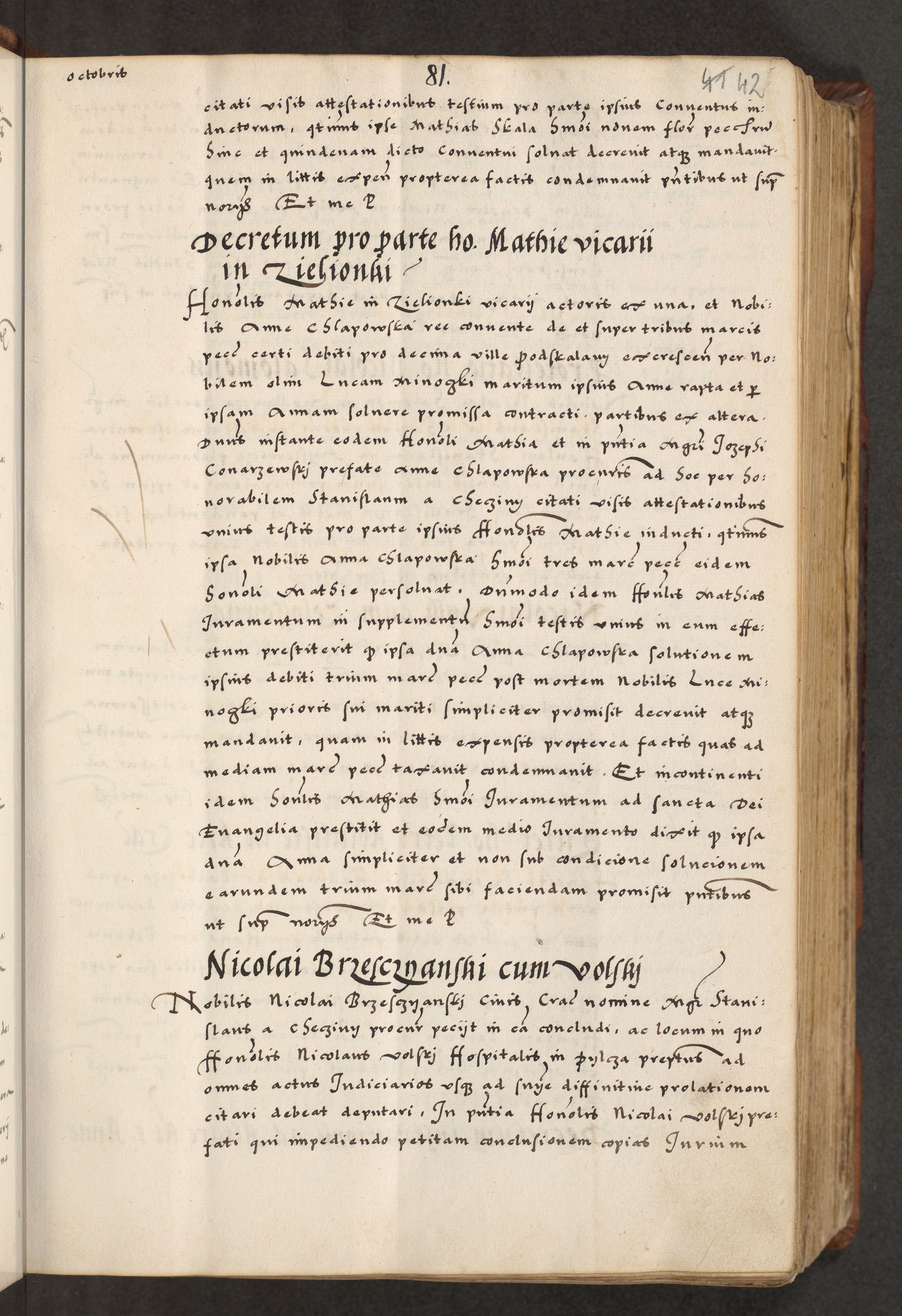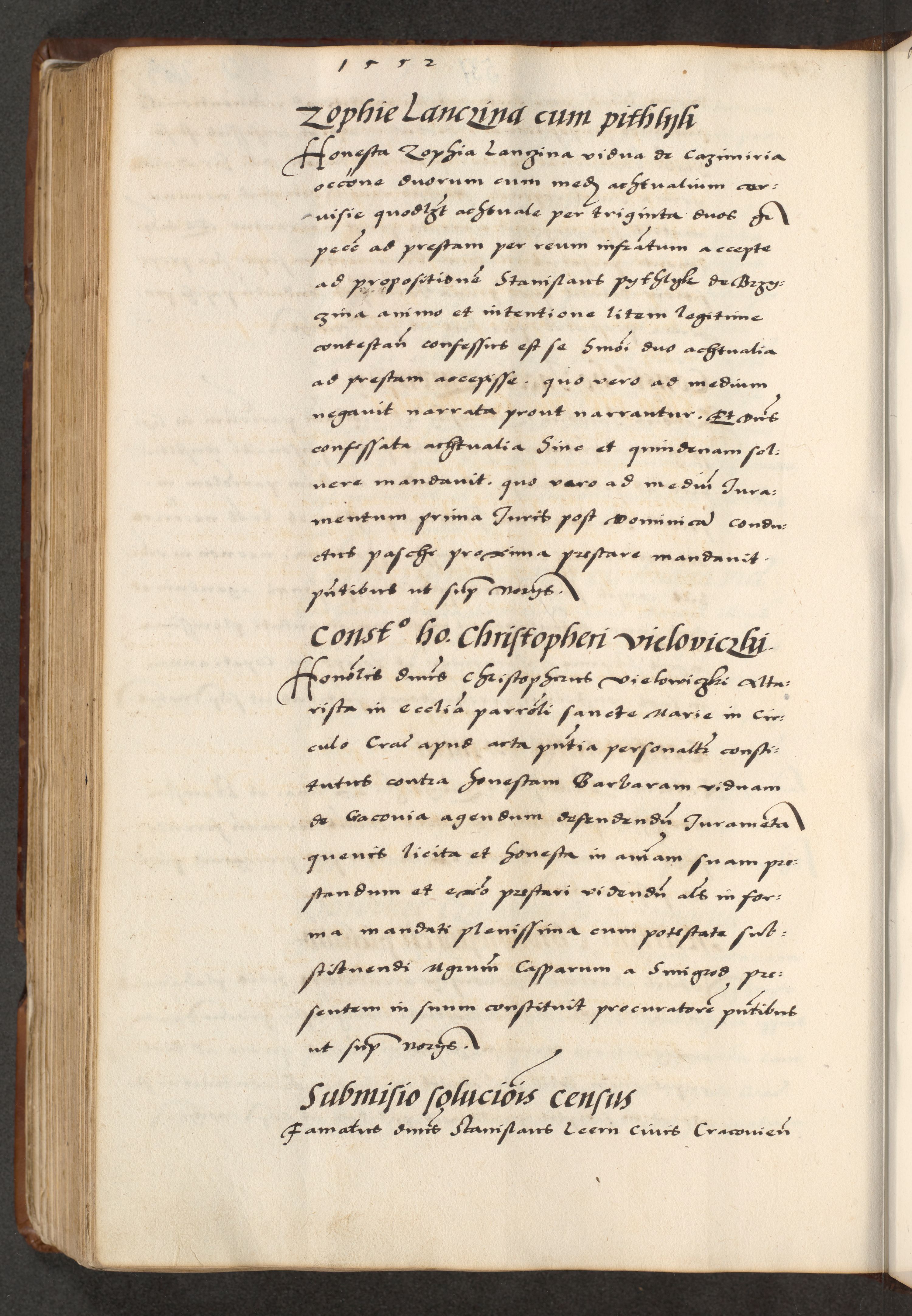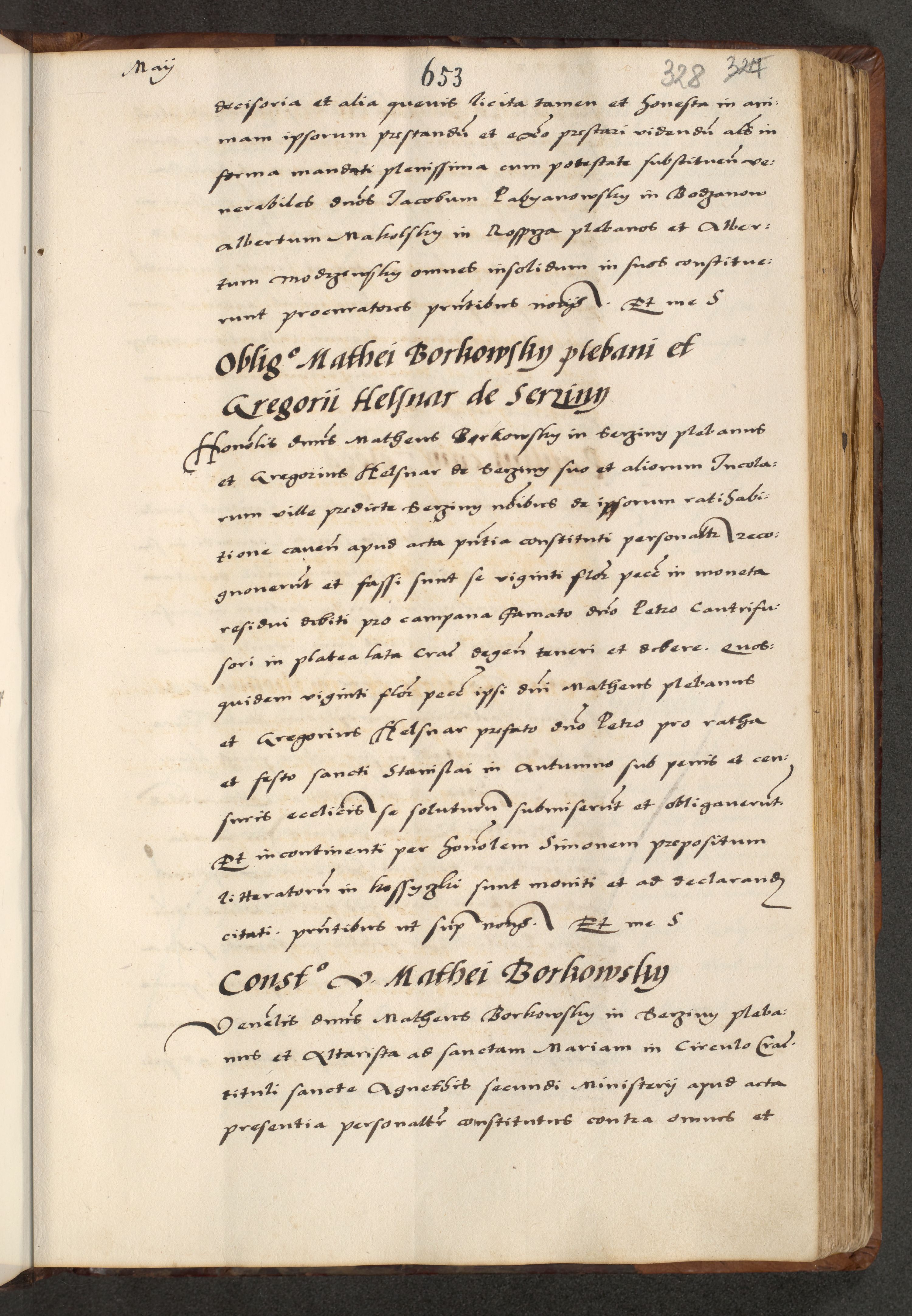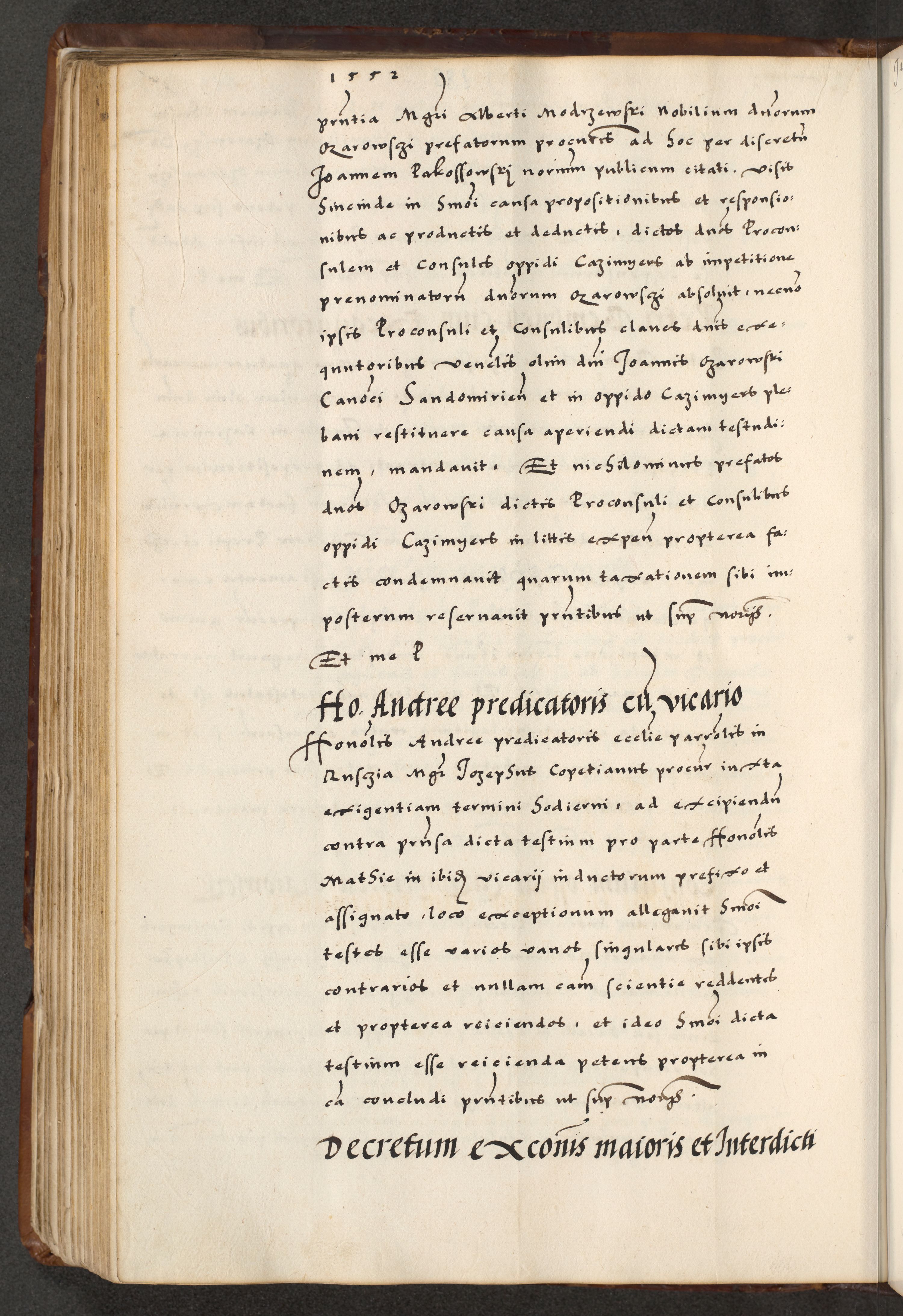 [A]cta actorum causarum, sententiarum tam diffinitivarum quam interloquutoriarum, obligationum, constitutionum et contractuum coram reverendo patre domino Petro Porembski preposito Osvieczimensi, canonico et officiali generali Cracoviensi de anno Domini millesimo quingentesimo quinguagesimo primo, cuius indictio est nona, pontificatus sanctissimi in Christo patris et domini nostri domini Juliii divina providencia pape tercii, anno secundo, a die et mense infrascriptis feliciter continiantur