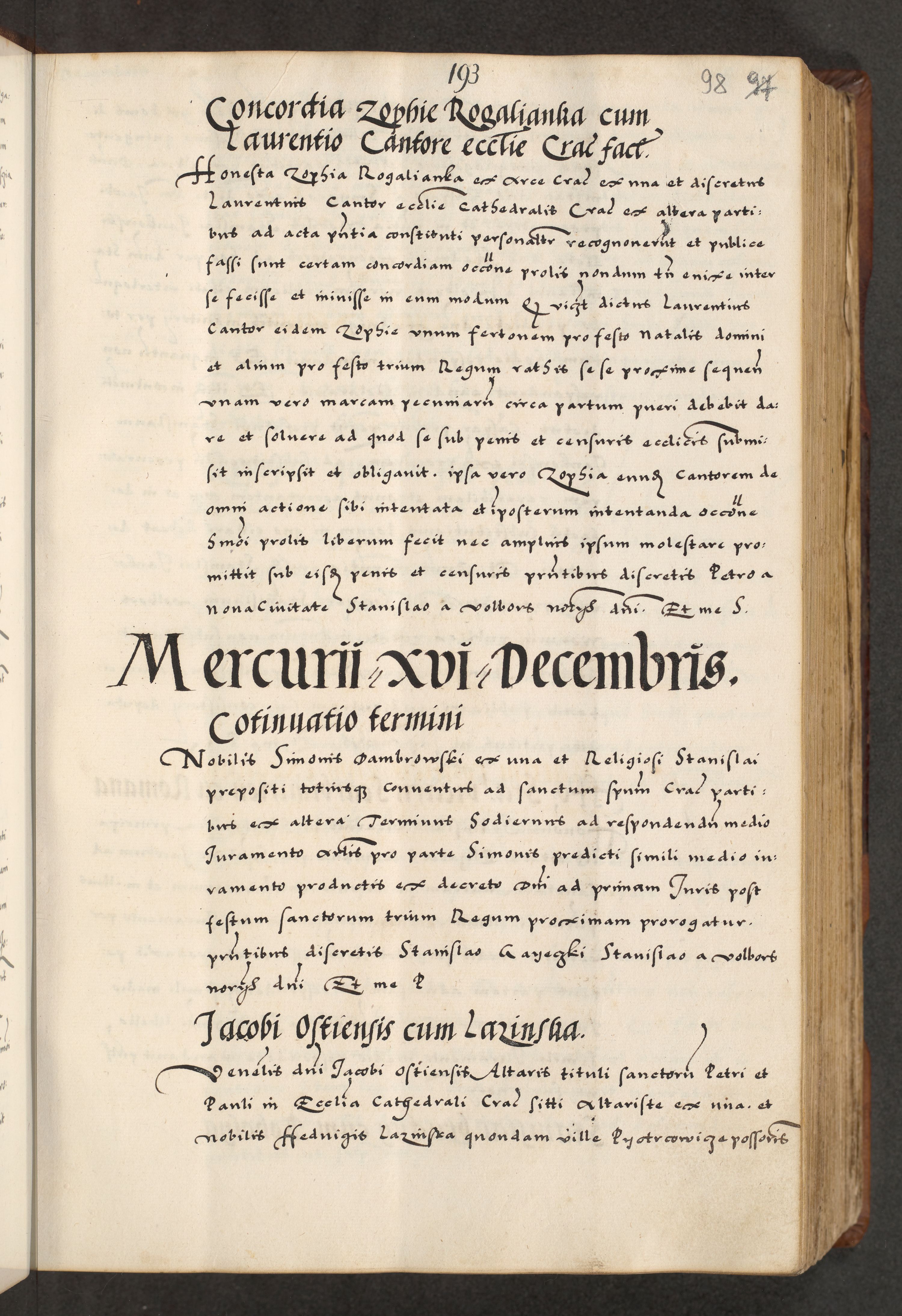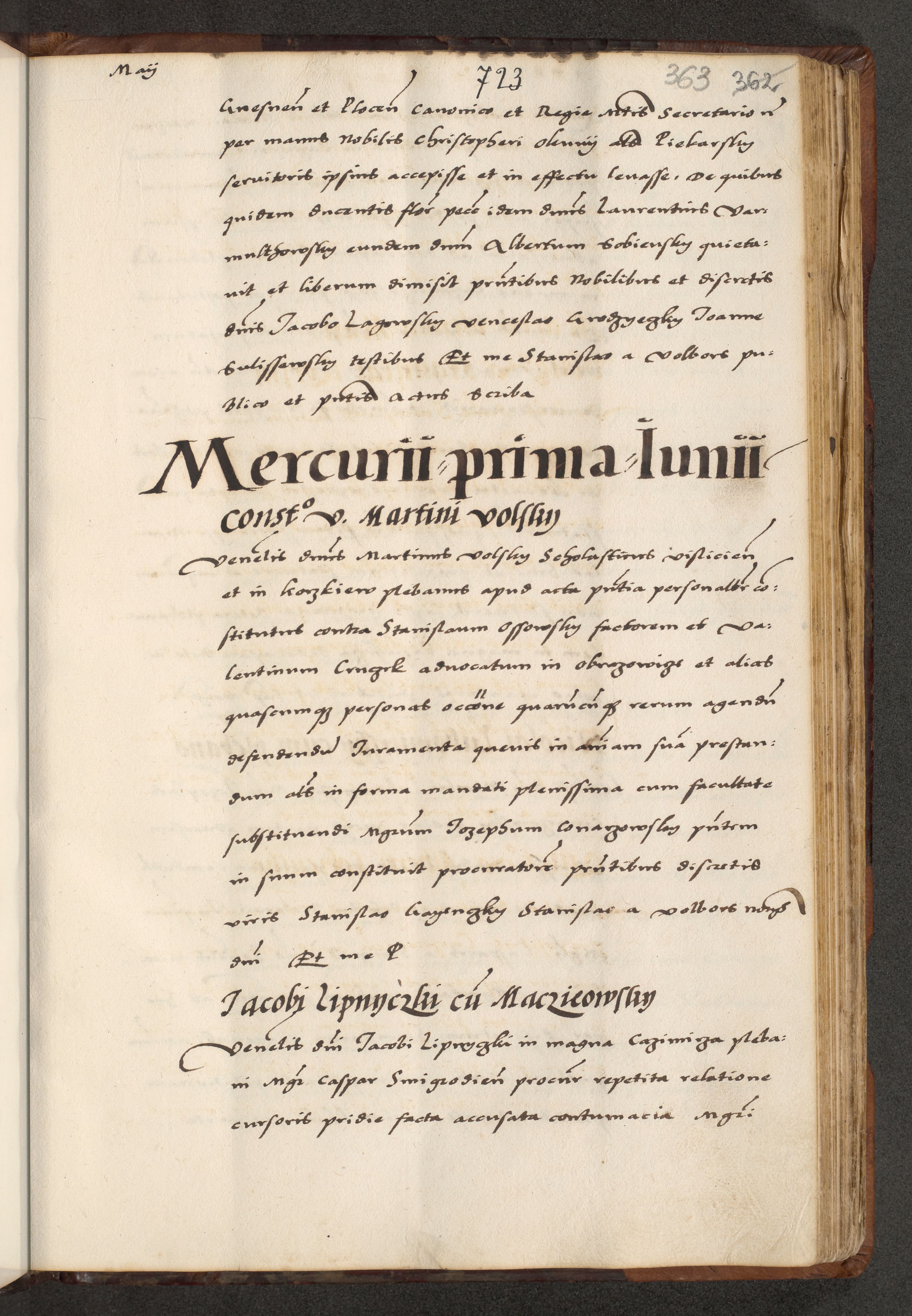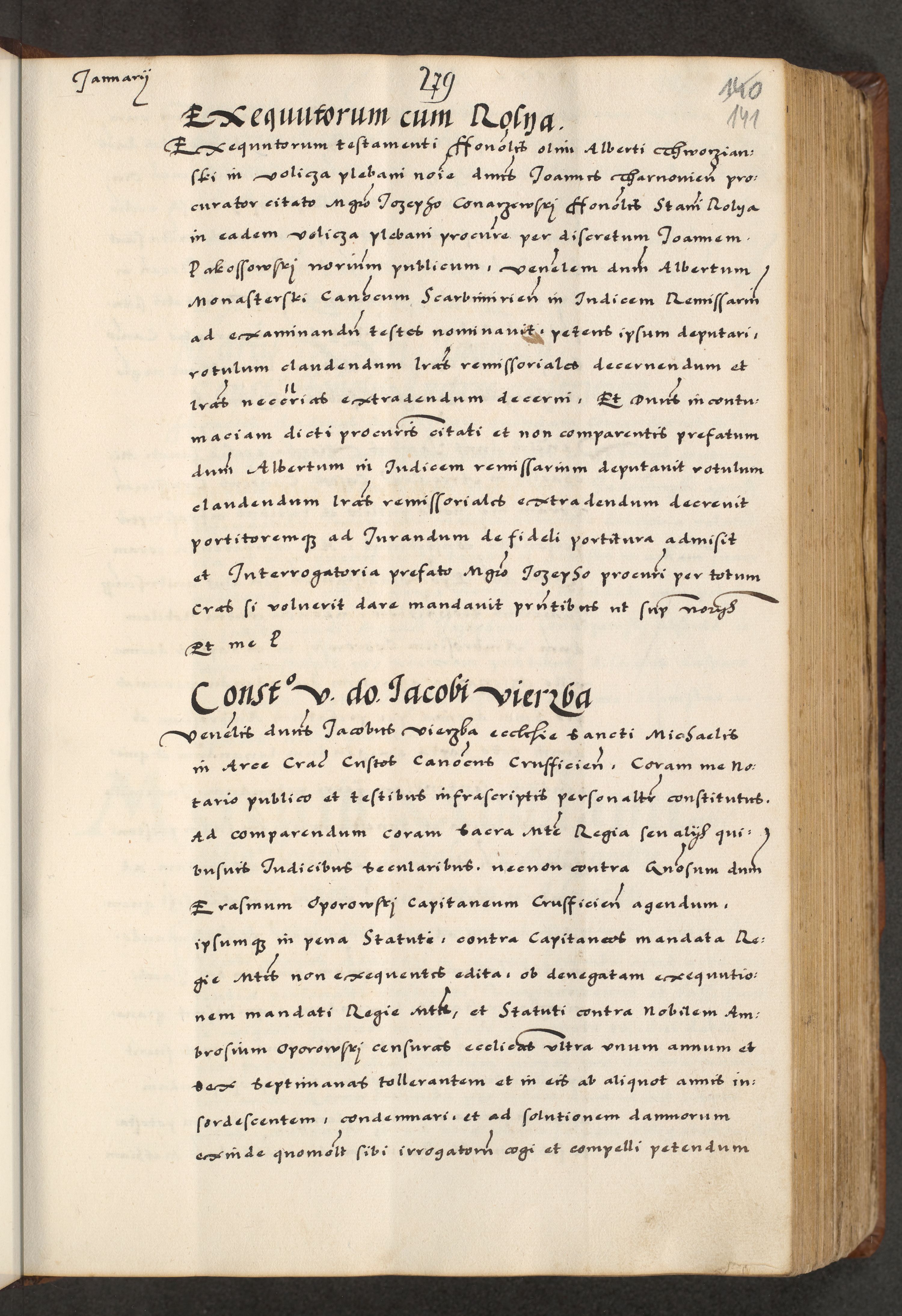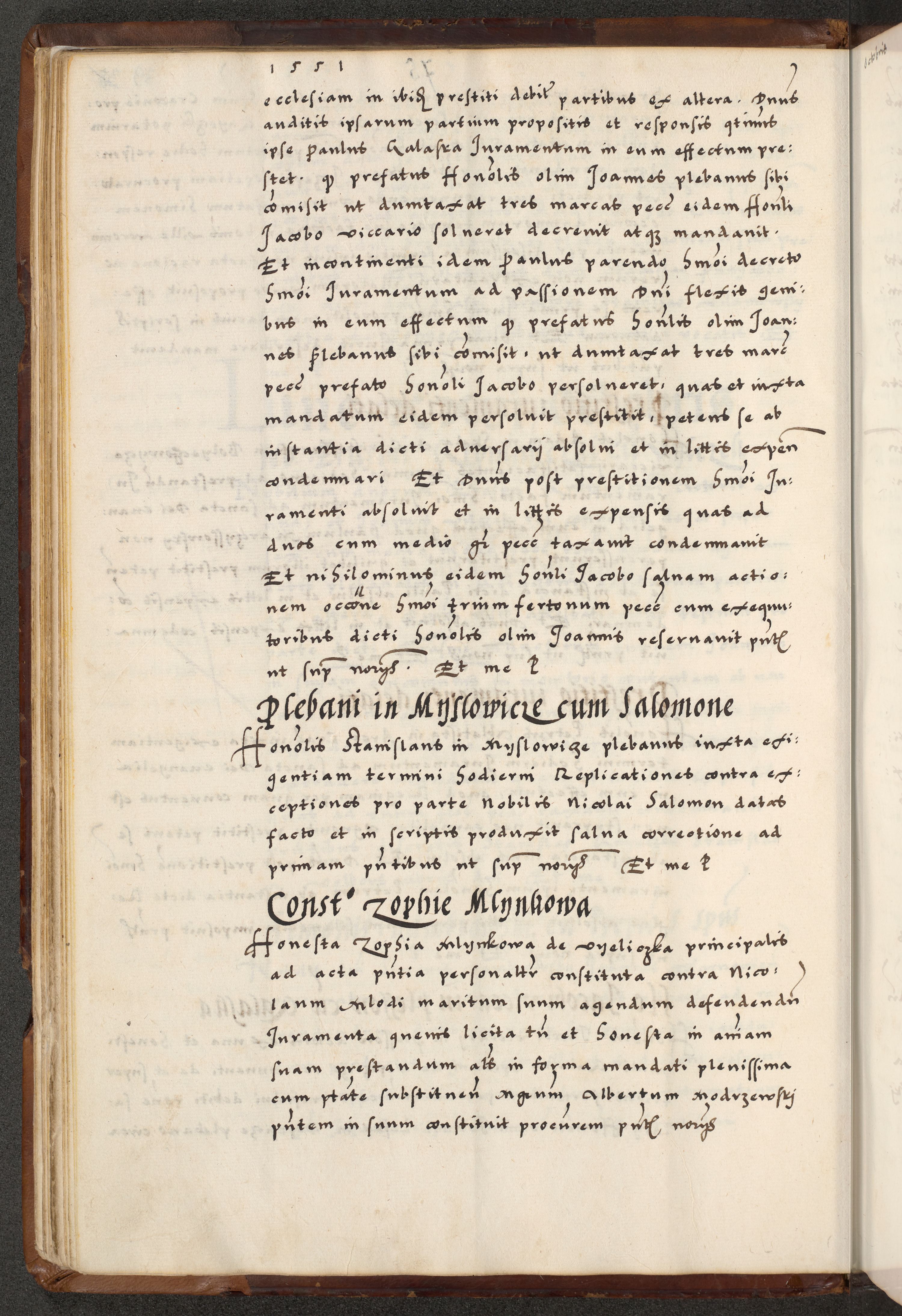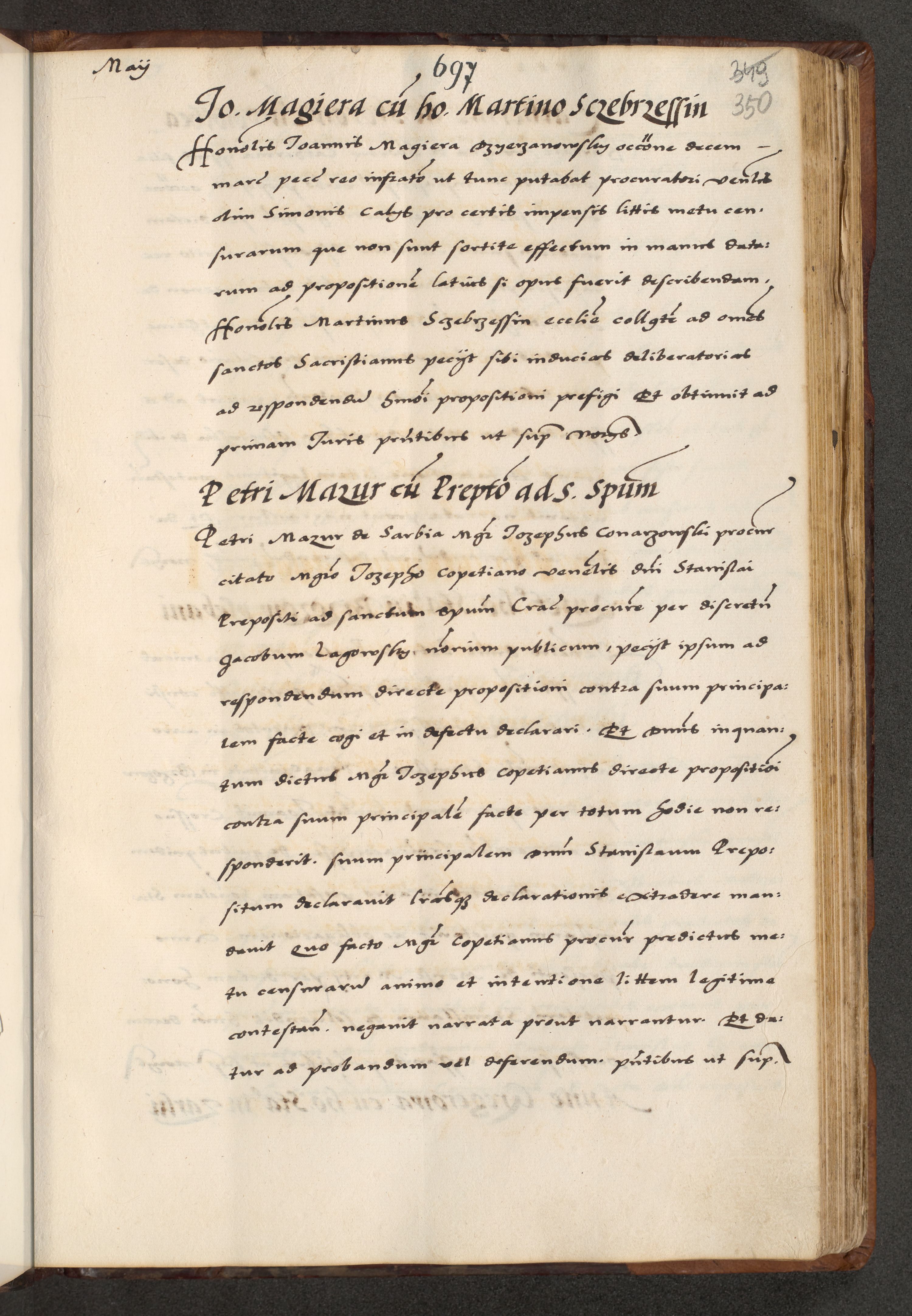 [A]cta actorum causarum, sententiarum tam diffinitivarum quam interloquutoriarum, obligationum, constitutionum et contractuum coram reverendo patre domino Petro Porembski preposito Osvieczimensi, canonico et officiali generali Cracoviensi de anno Domini millesimo quingentesimo quinguagesimo primo, cuius indictio est nona, pontificatus sanctissimi in Christo patris et domini nostri domini Juliii divina providencia pape tercii, anno secundo, a die et mense infrascriptis feliciter continiantur