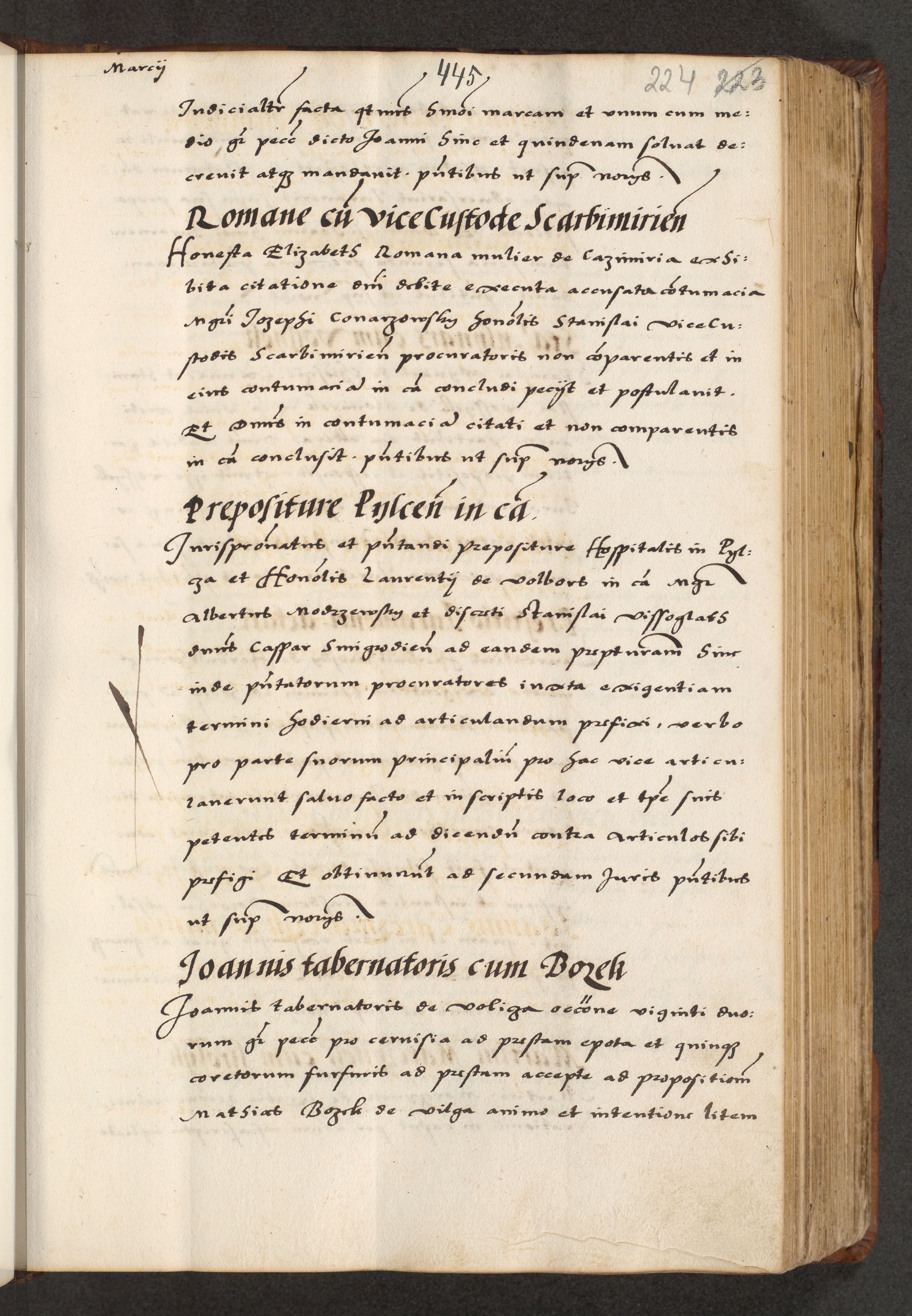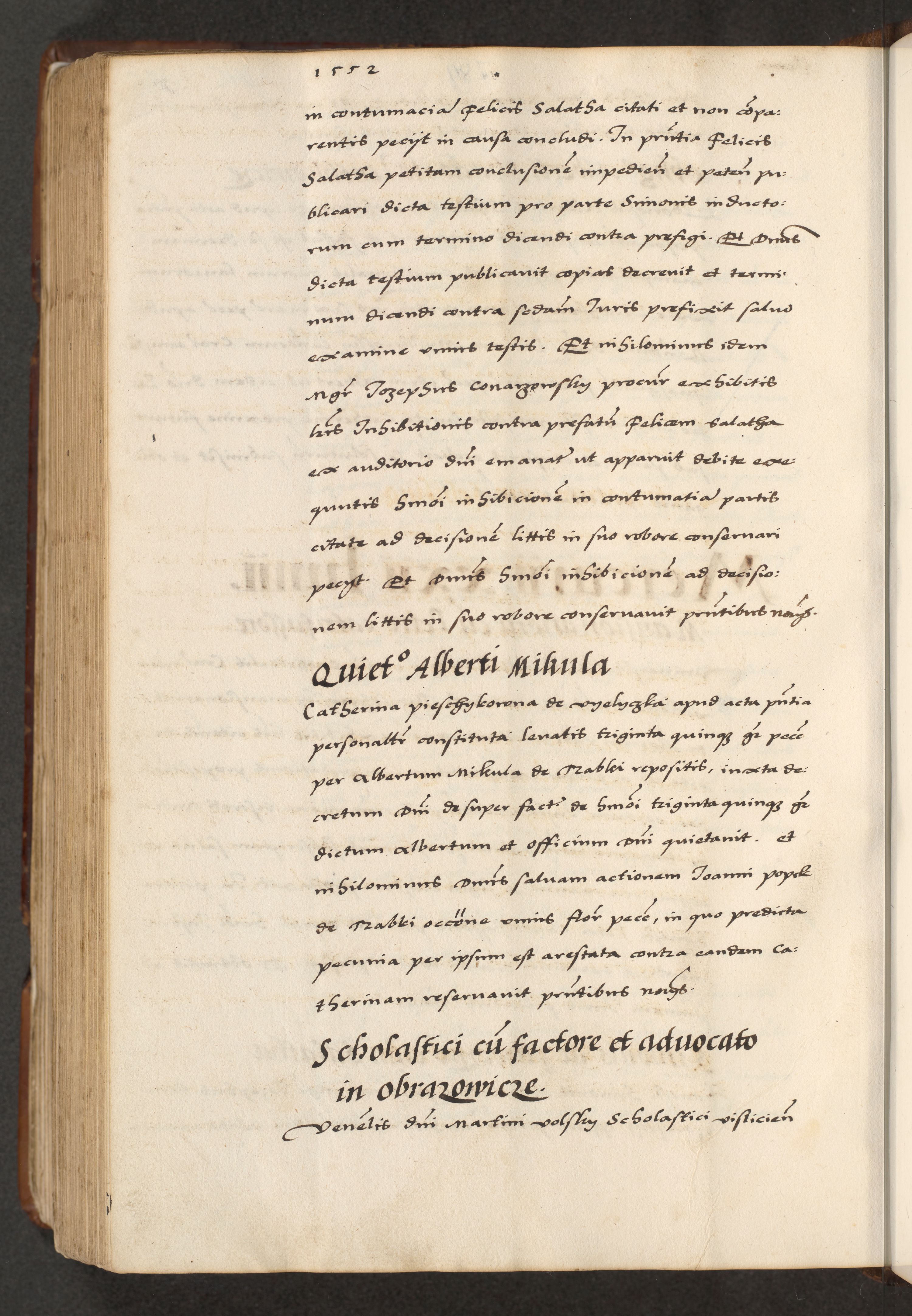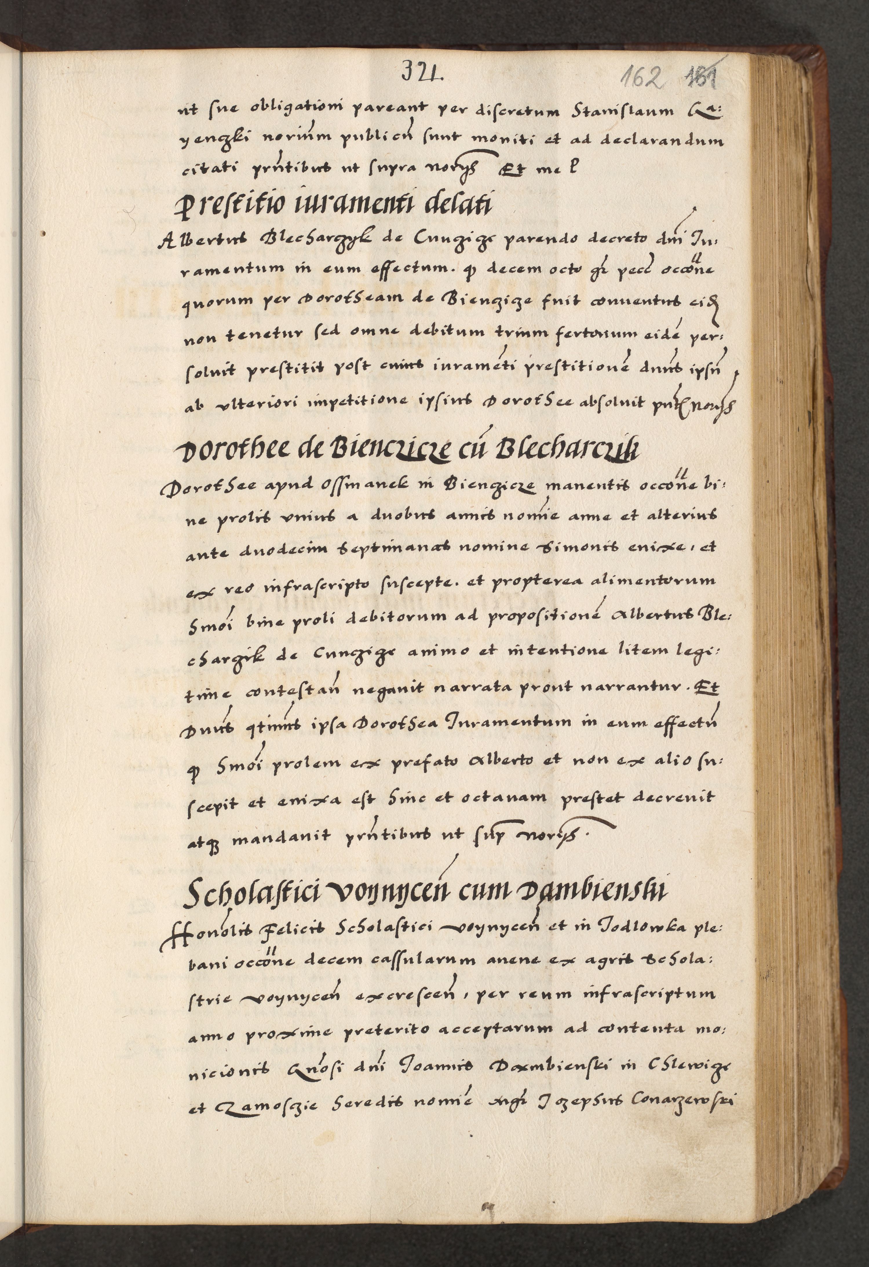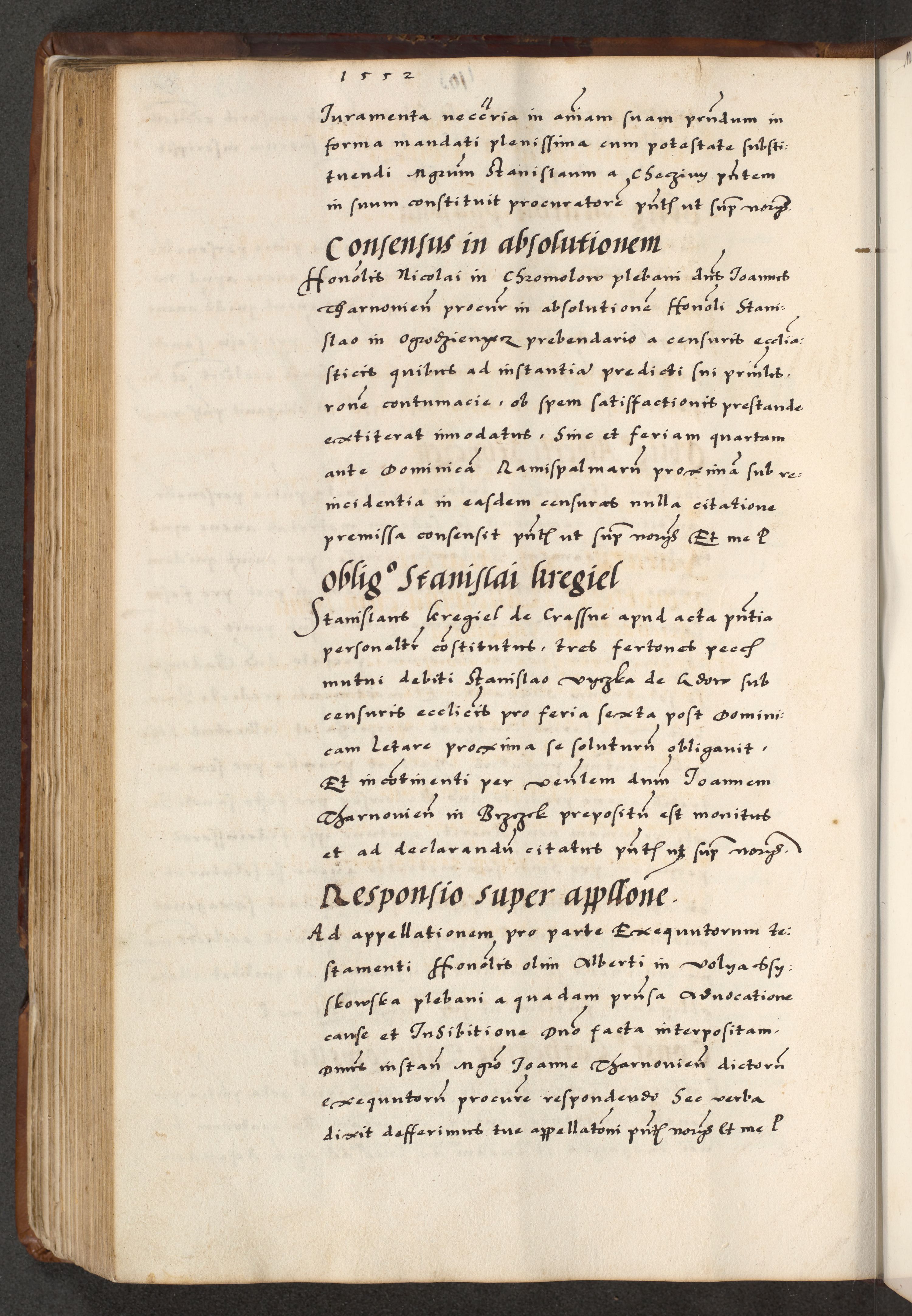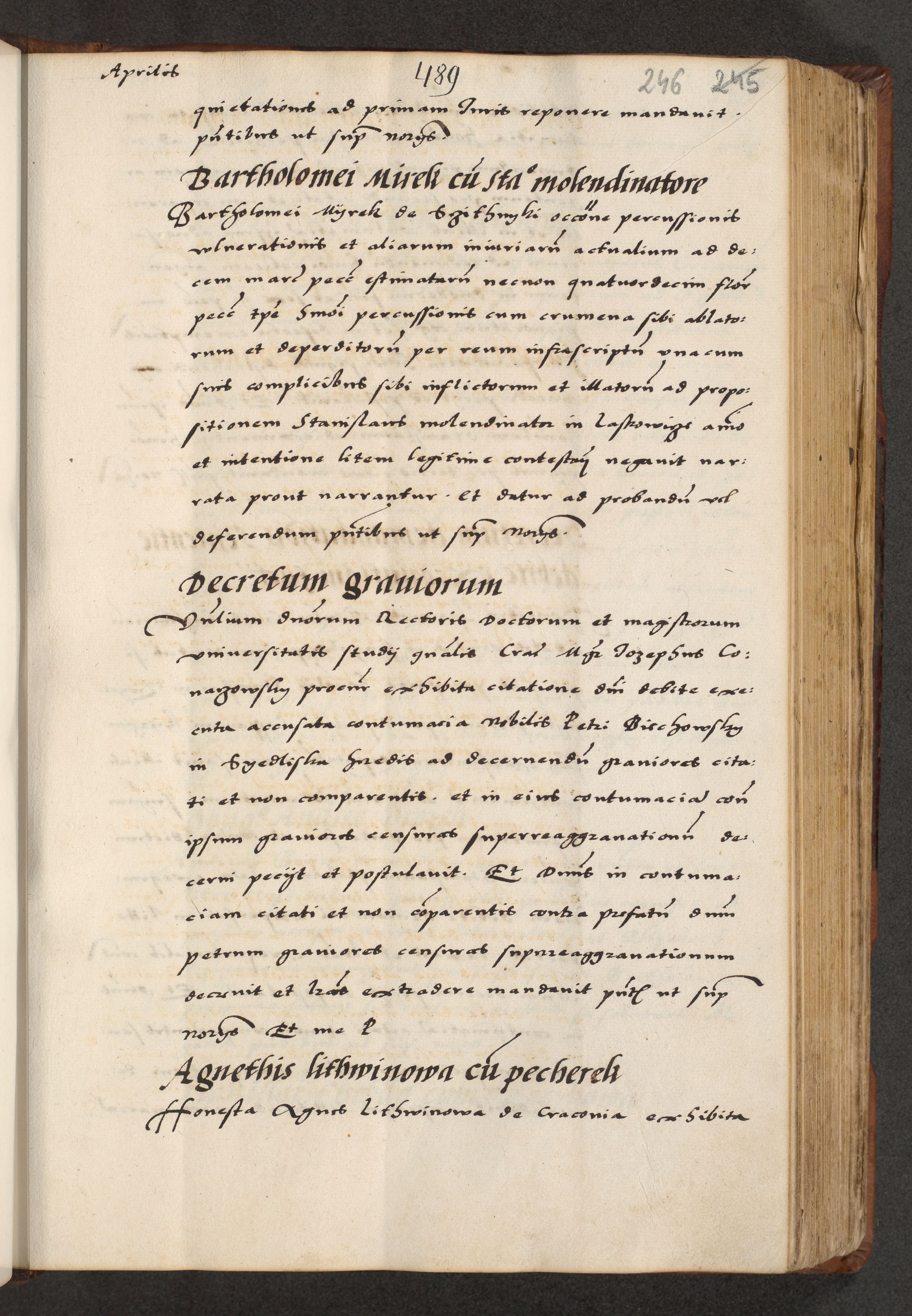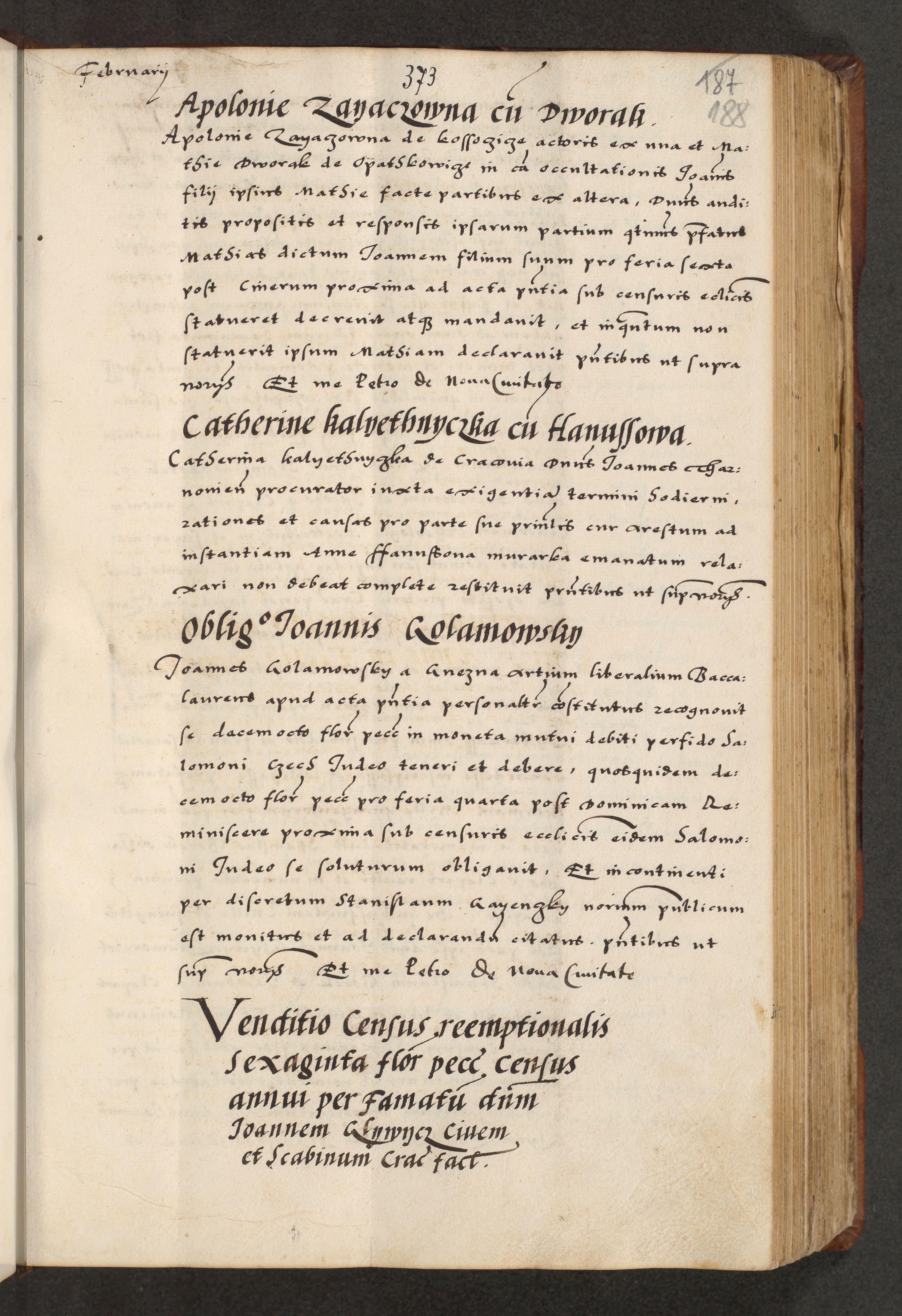 [A]cta actorum causarum, sententiarum tam diffinitivarum quam interloquutoriarum, obligationum, constitutionum et contractuum coram reverendo patre domino Petro Porembski preposito Osvieczimensi, canonico et officiali generali Cracoviensi de anno Domini millesimo quingentesimo quinguagesimo primo, cuius indictio est nona, pontificatus sanctissimi in Christo patris et domini nostri domini Juliii divina providencia pape tercii, anno secundo, a die et mense infrascriptis feliciter continiantur
