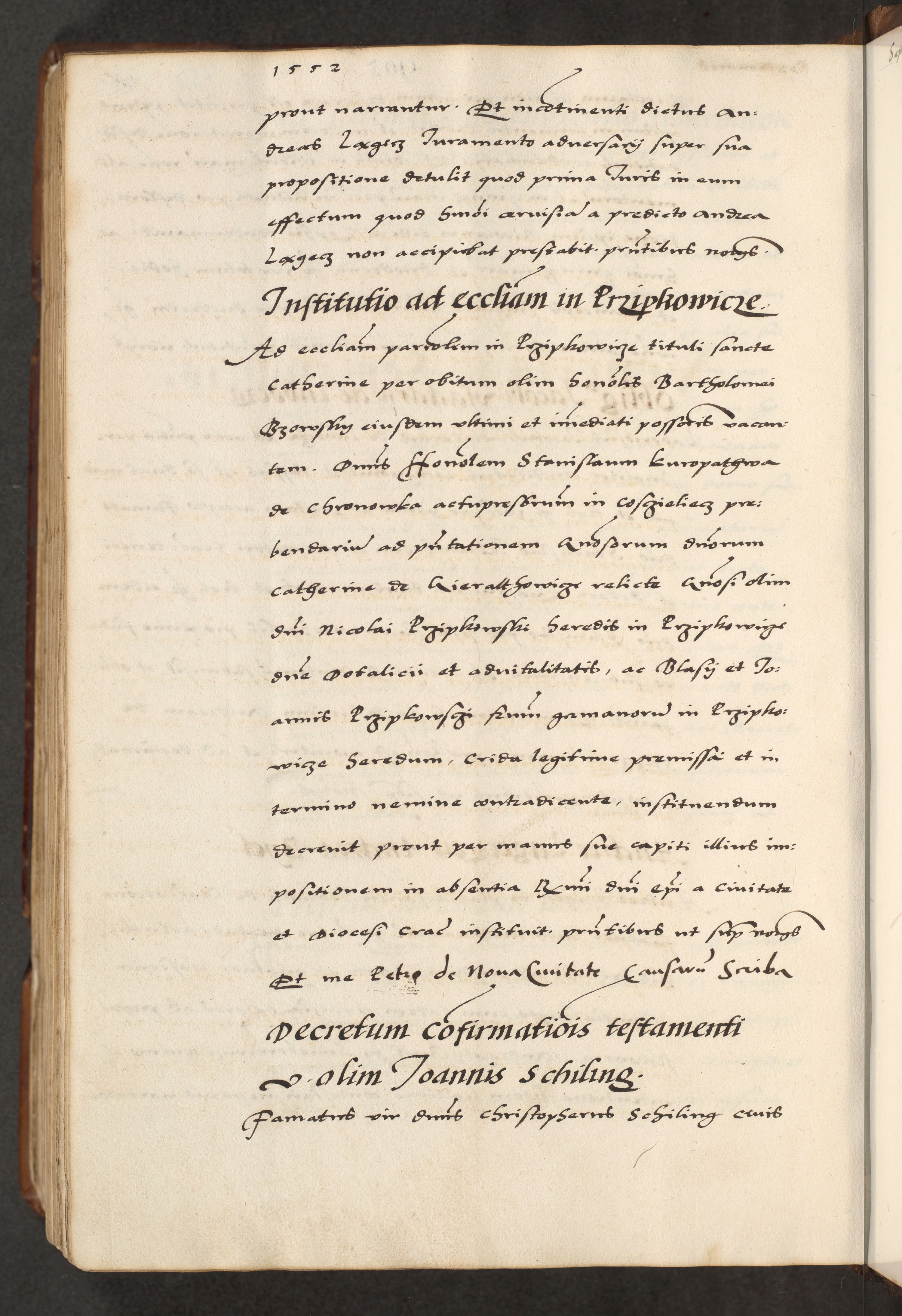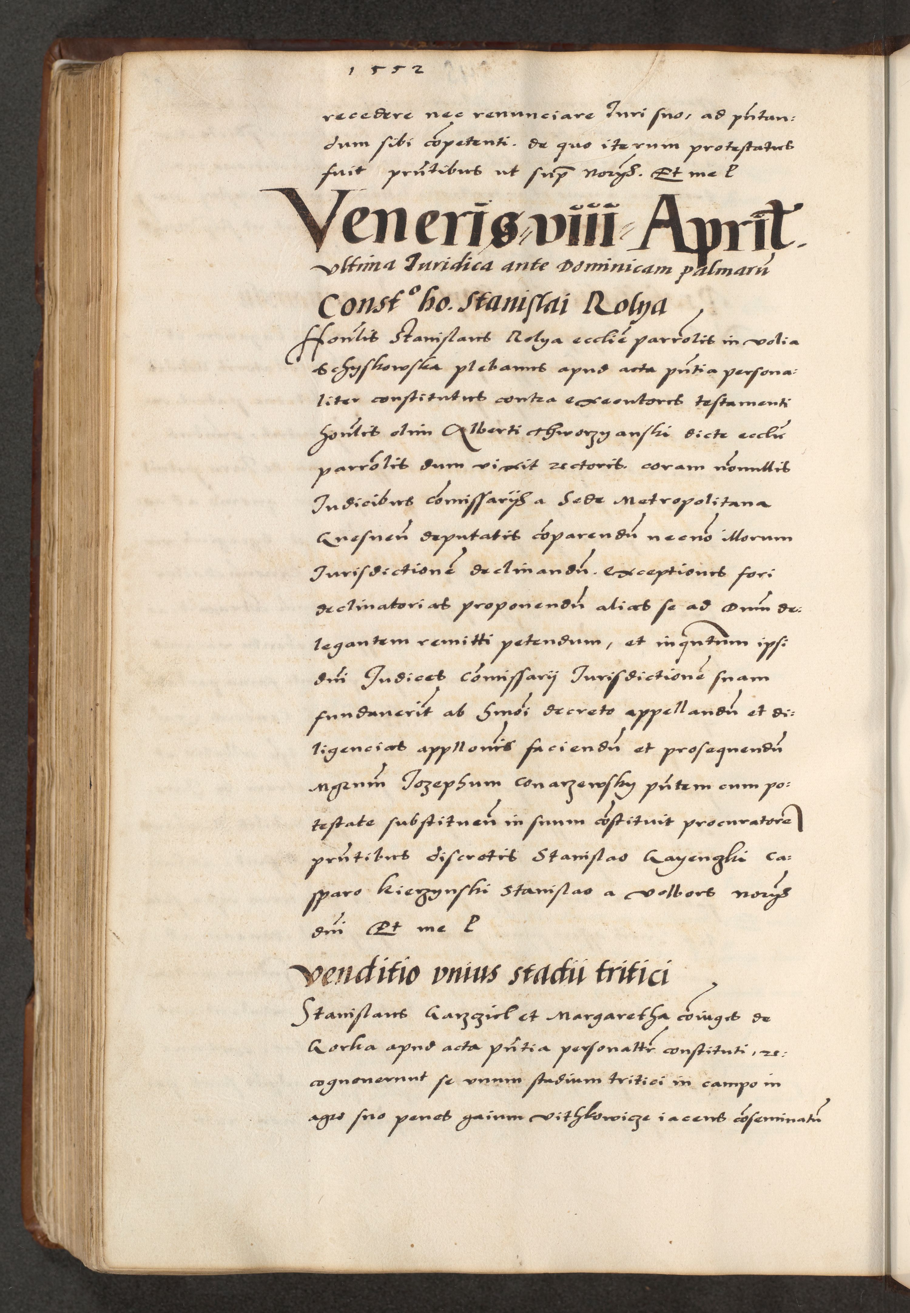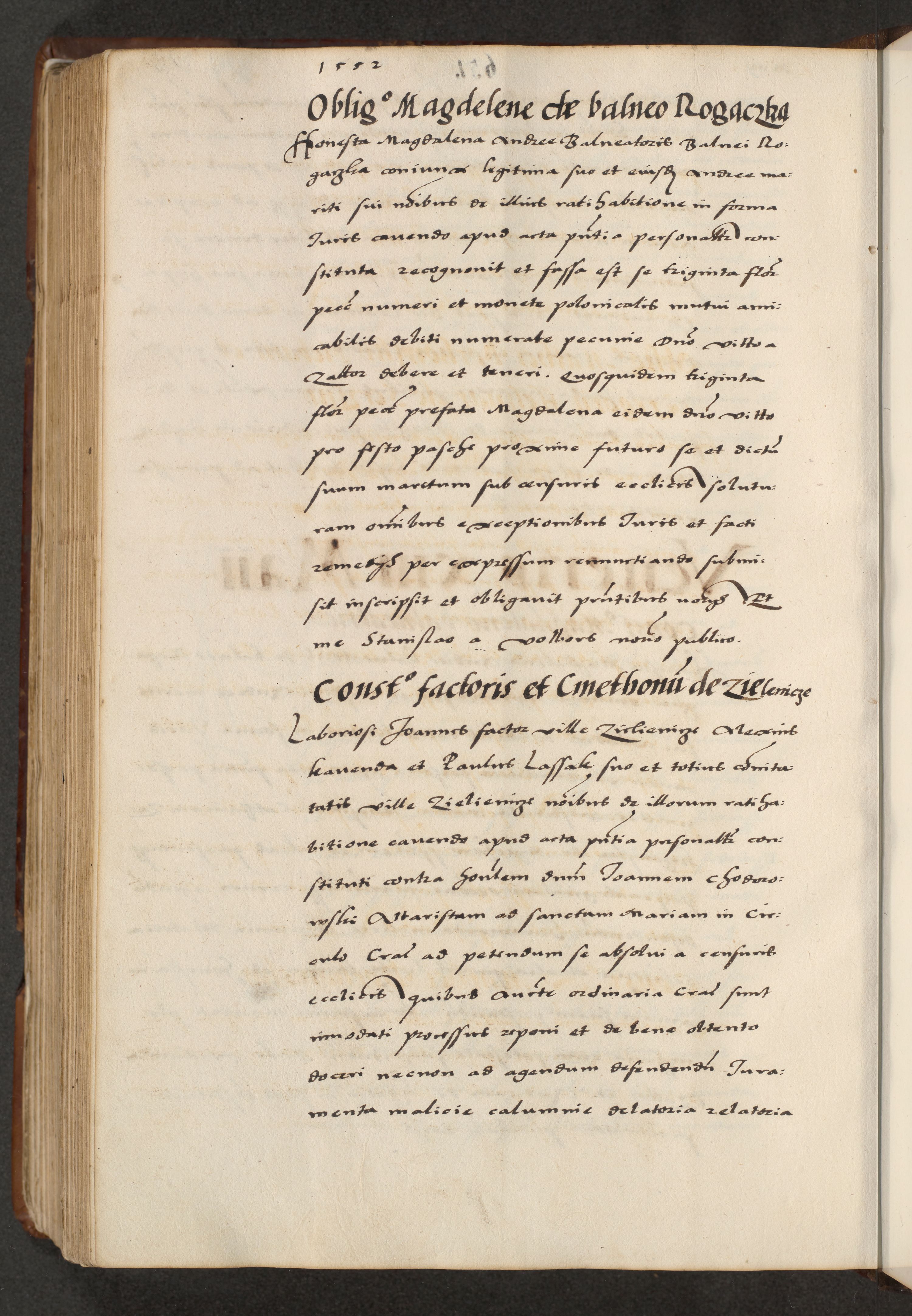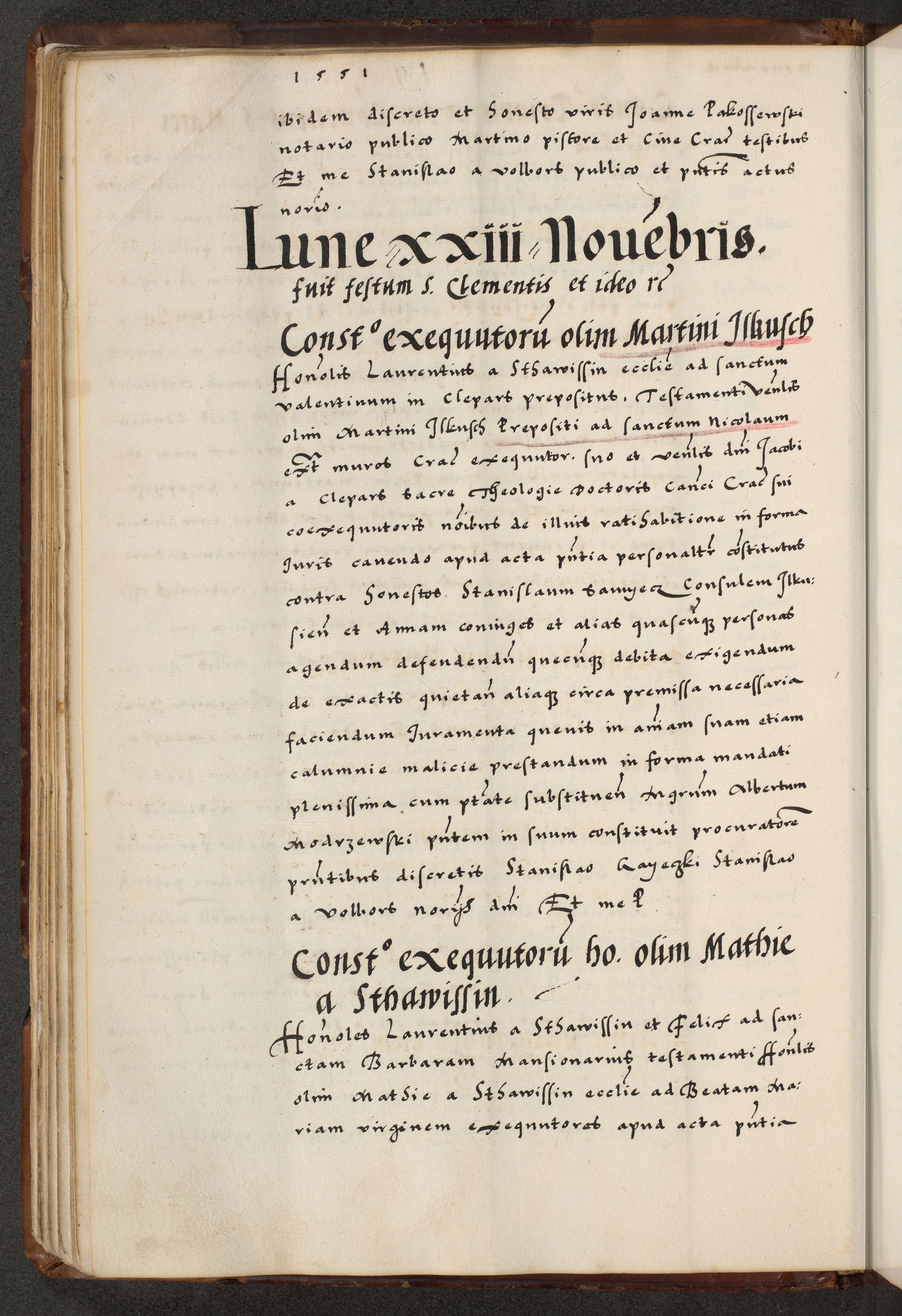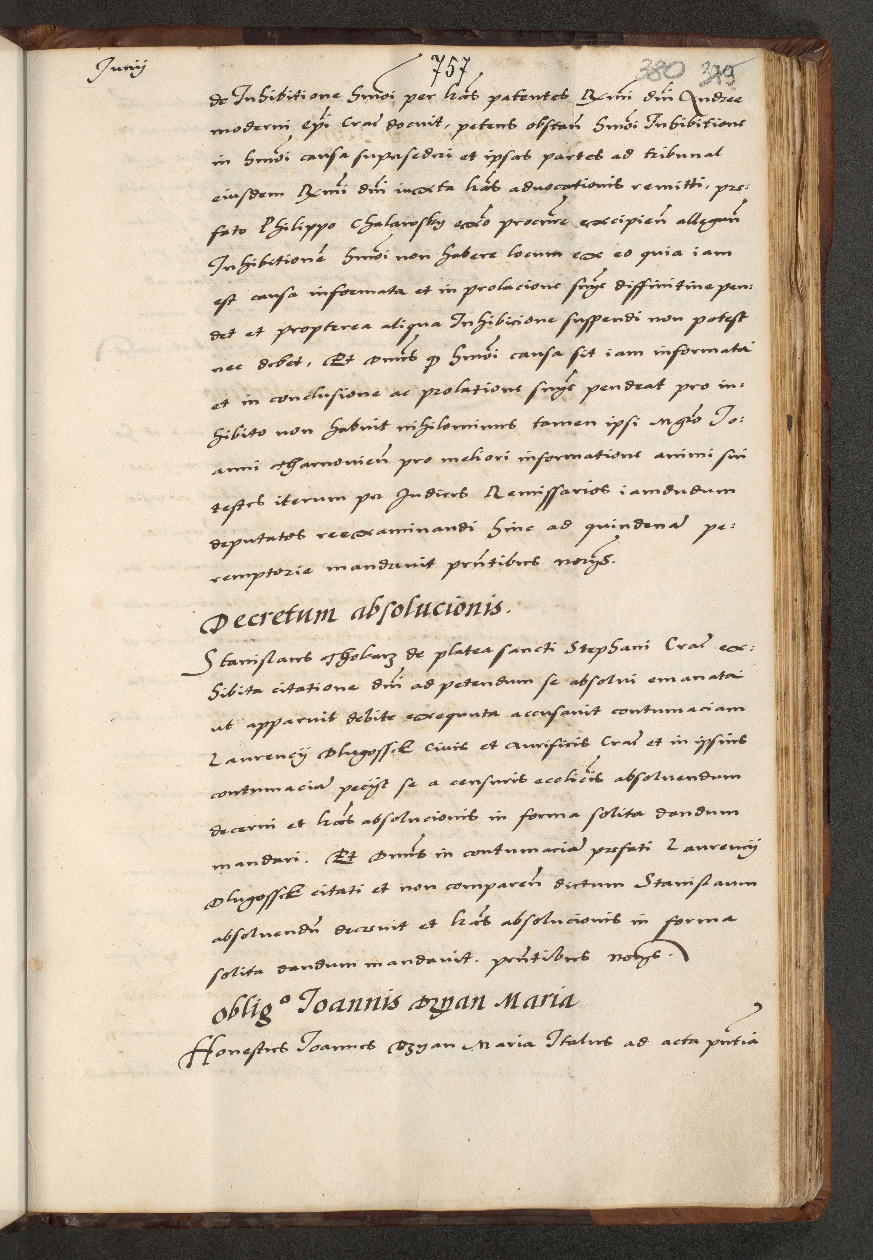 [A]cta actorum causarum, sententiarum tam diffinitivarum quam interloquutoriarum, obligationum, constitutionum et contractuum coram reverendo patre domino Petro Porembski preposito Osvieczimensi, canonico et officiali generali Cracoviensi de anno Domini millesimo quingentesimo quinguagesimo primo, cuius indictio est nona, pontificatus sanctissimi in Christo patris et domini nostri domini Juliii divina providencia pape tercii, anno secundo, a die et mense infrascriptis feliciter continiantur