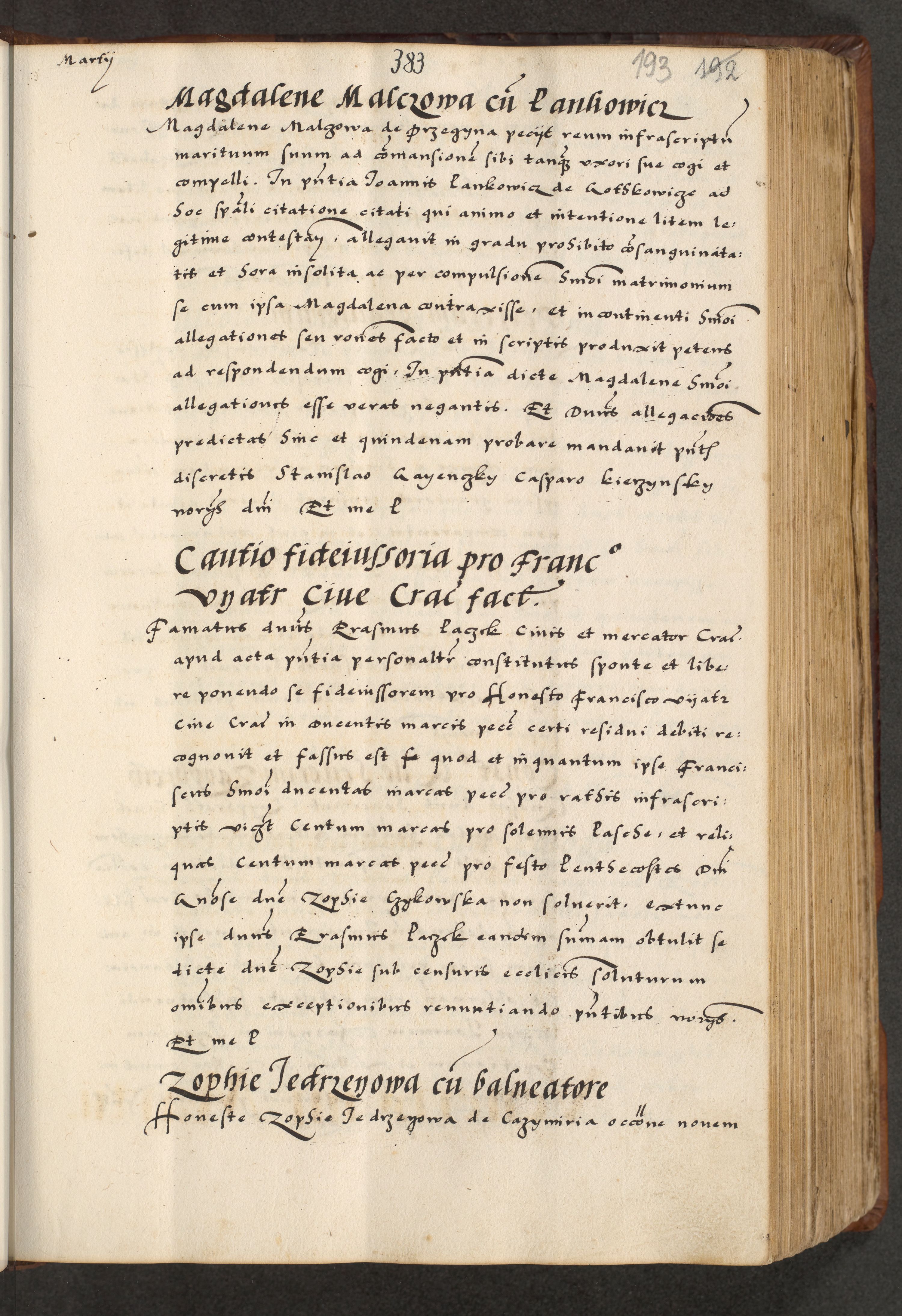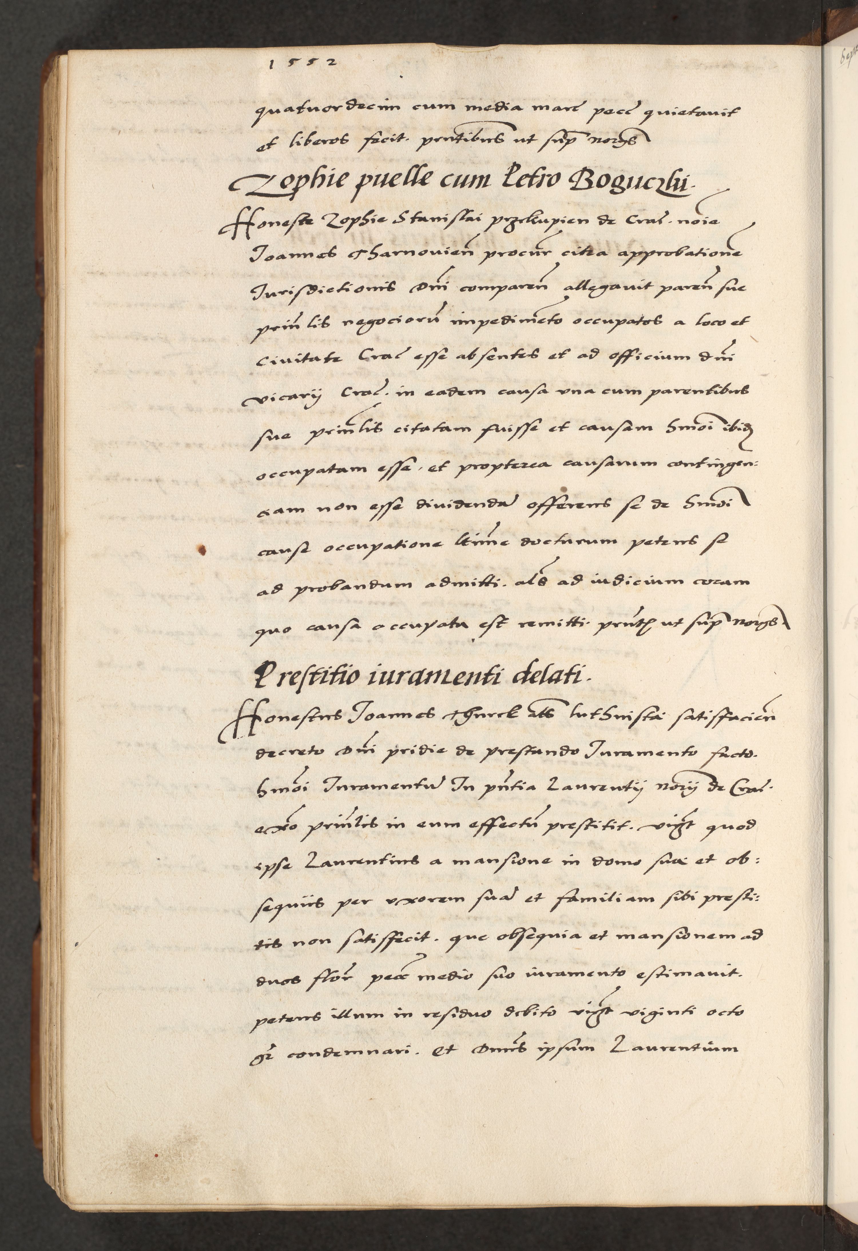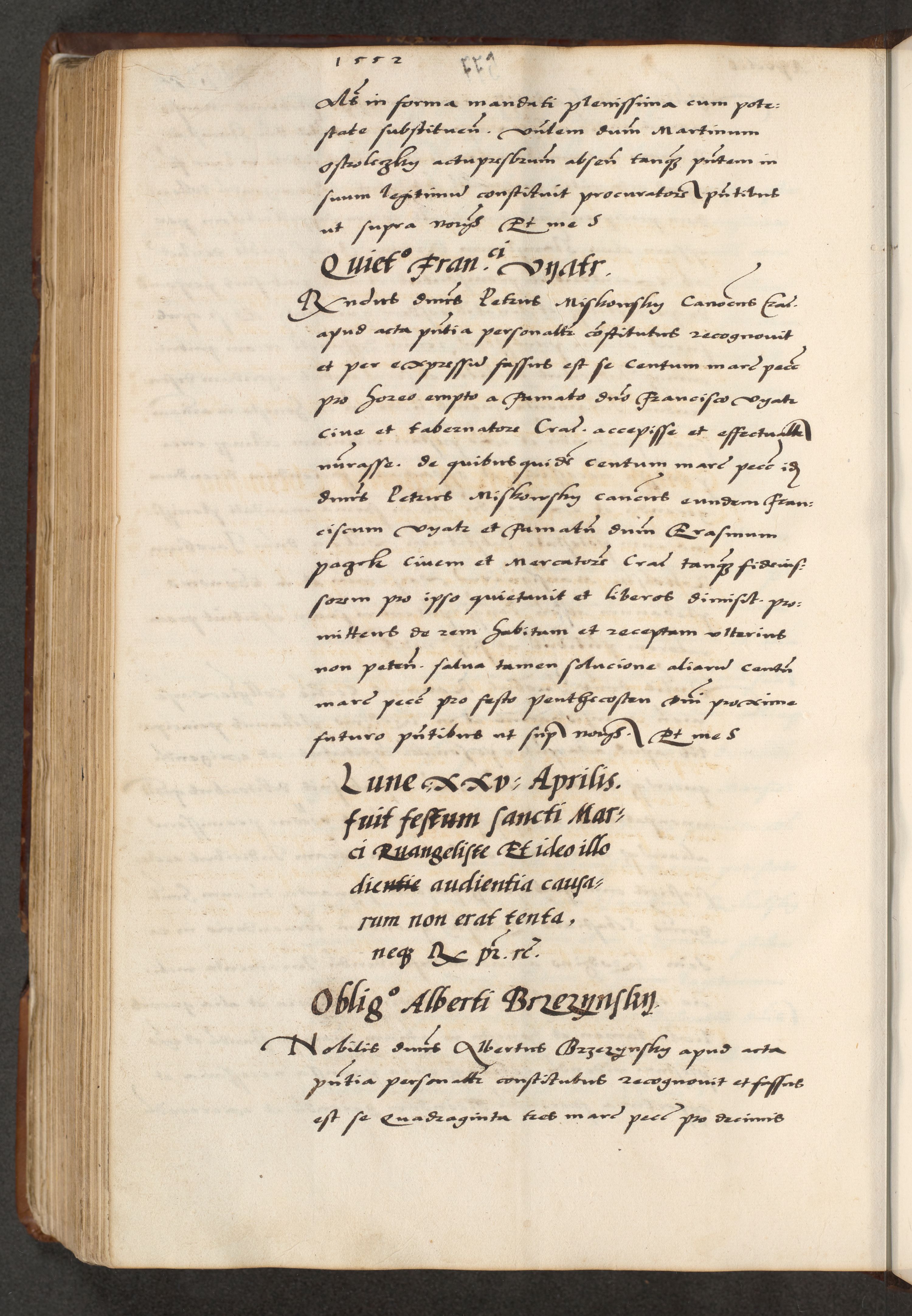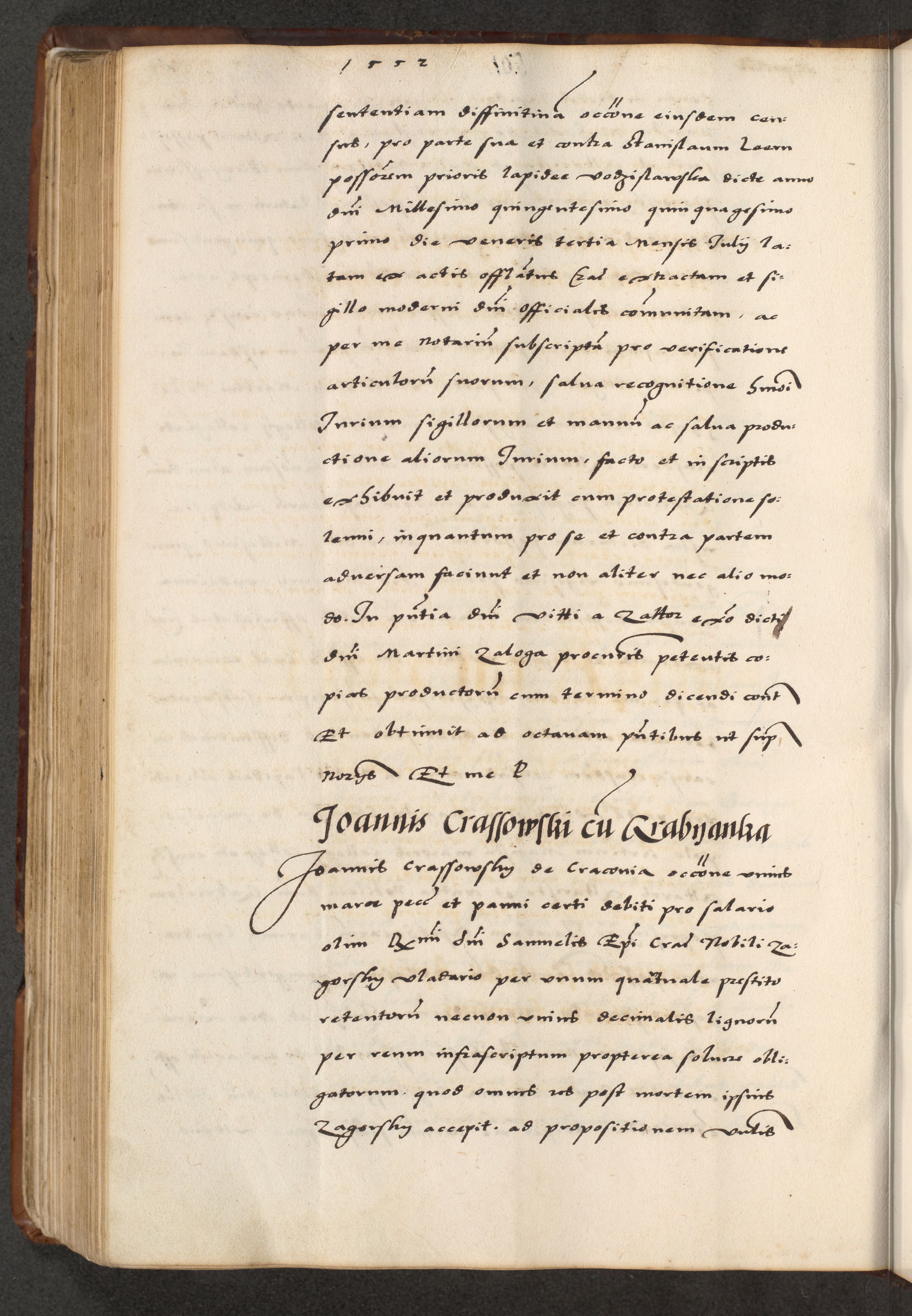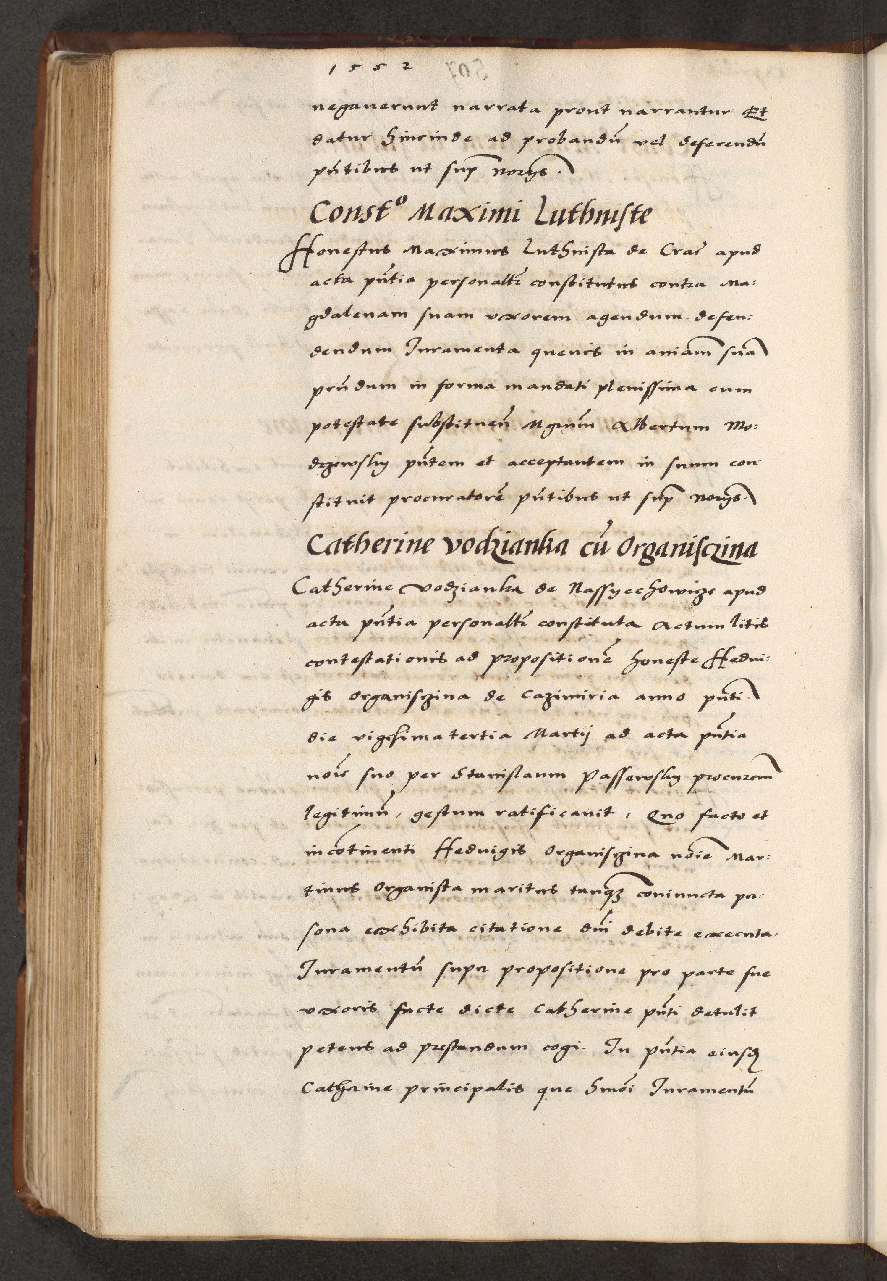 [A]cta actorum causarum, sententiarum tam diffinitivarum quam interloquutoriarum, obligationum, constitutionum et contractuum coram reverendo patre domino Petro Porembski preposito Osvieczimensi, canonico et officiali generali Cracoviensi de anno Domini millesimo quingentesimo quinguagesimo primo, cuius indictio est nona, pontificatus sanctissimi in Christo patris et domini nostri domini Juliii divina providencia pape tercii, anno secundo, a die et mense infrascriptis feliciter continiantur