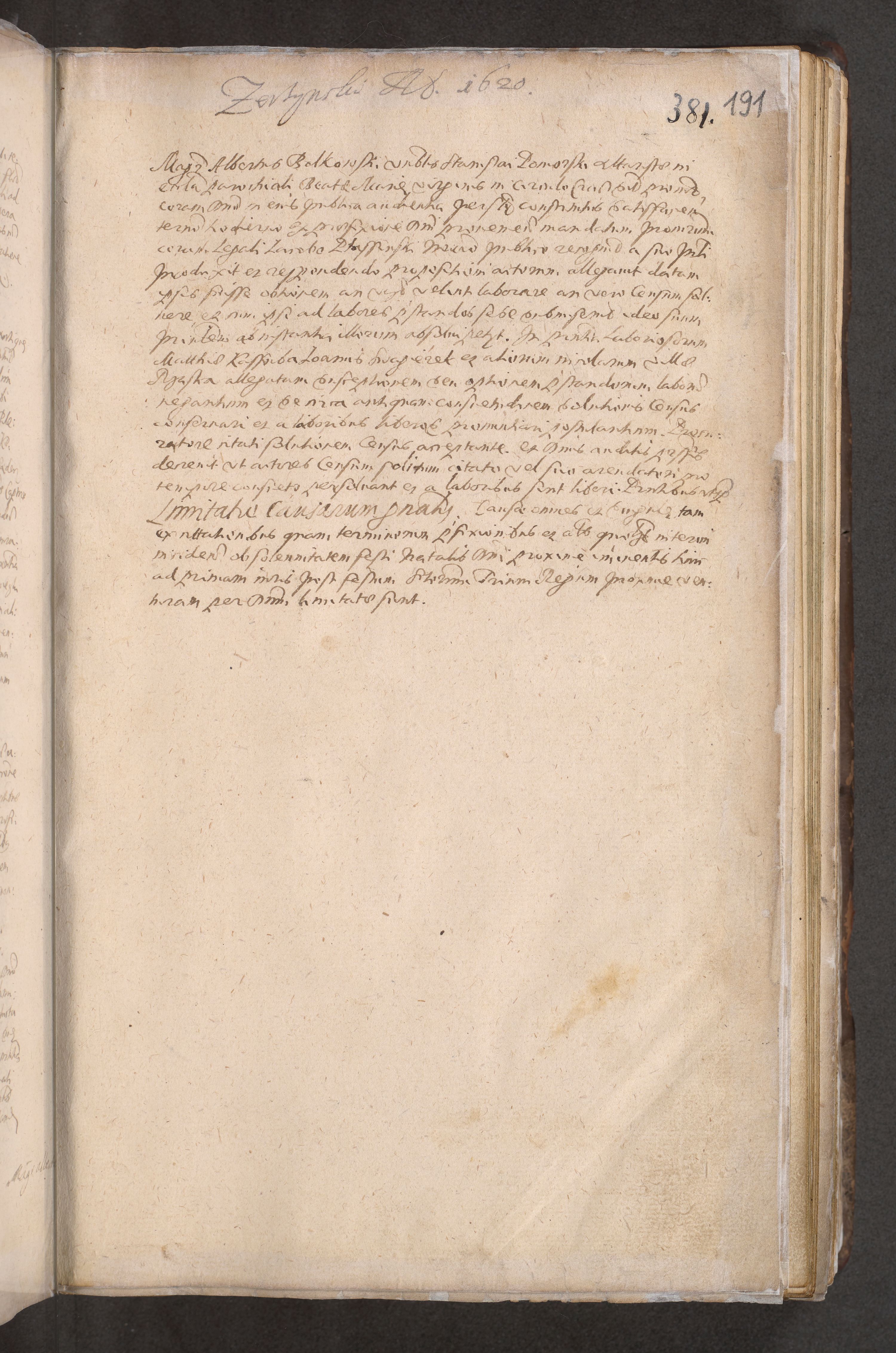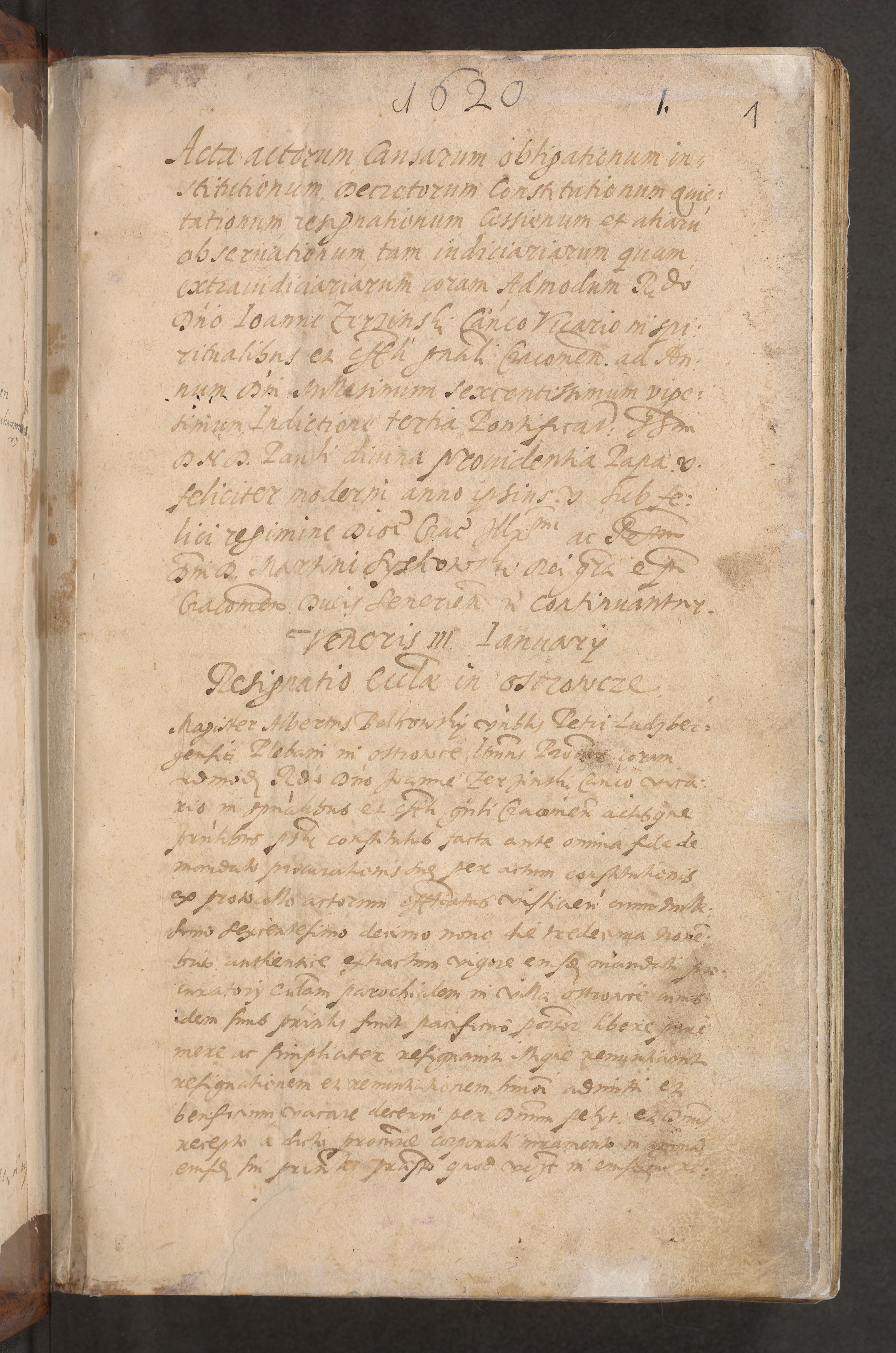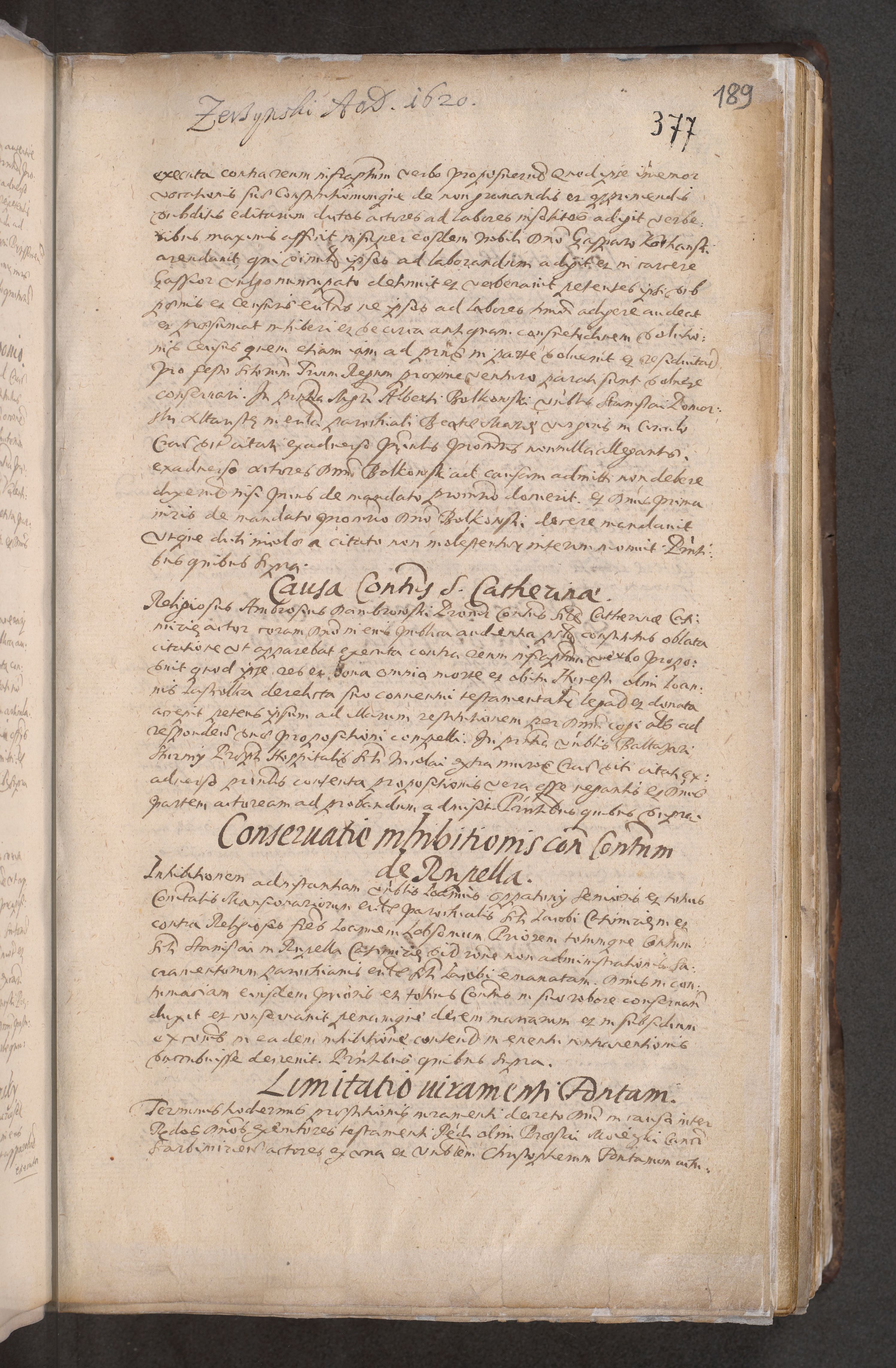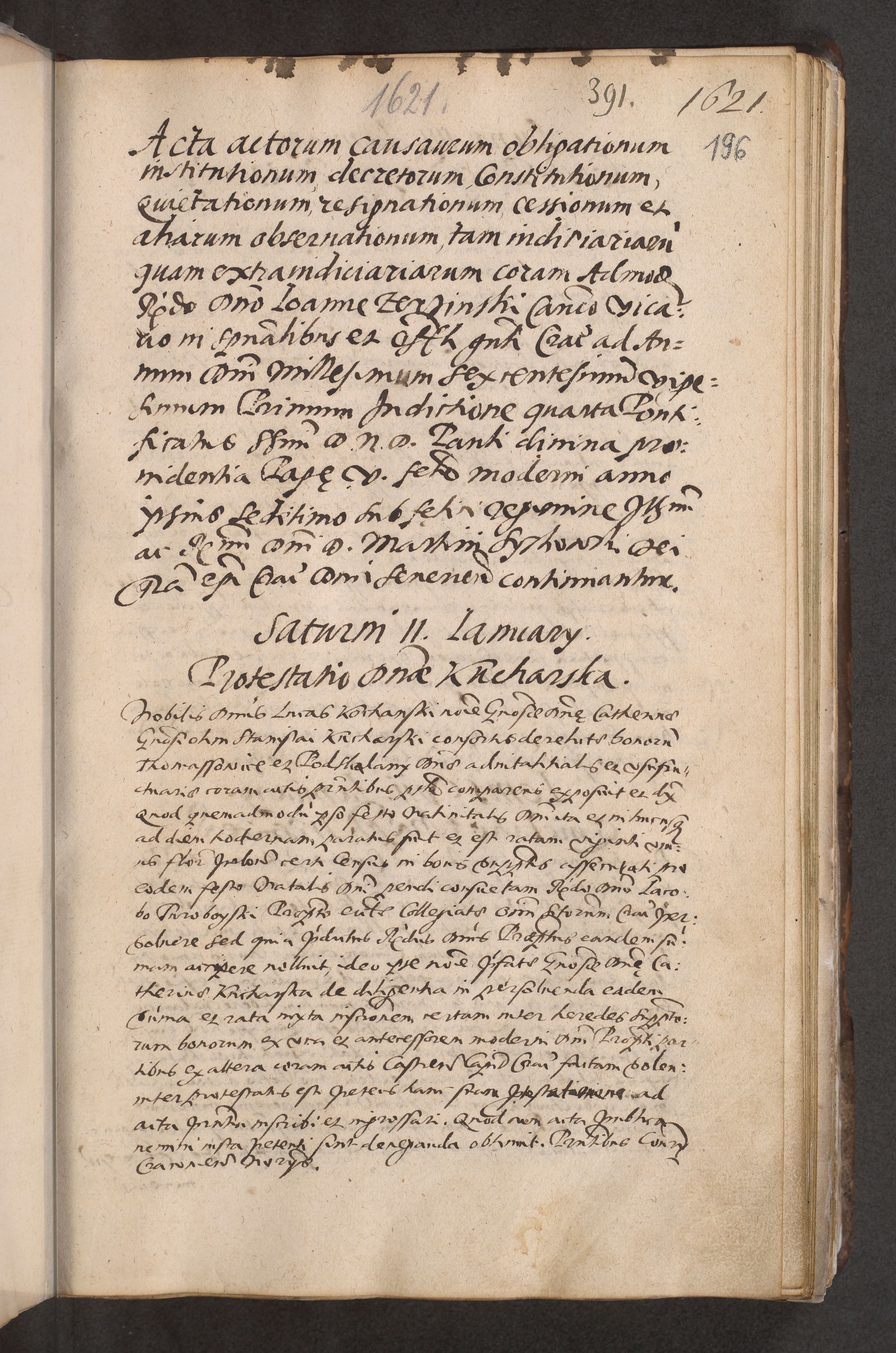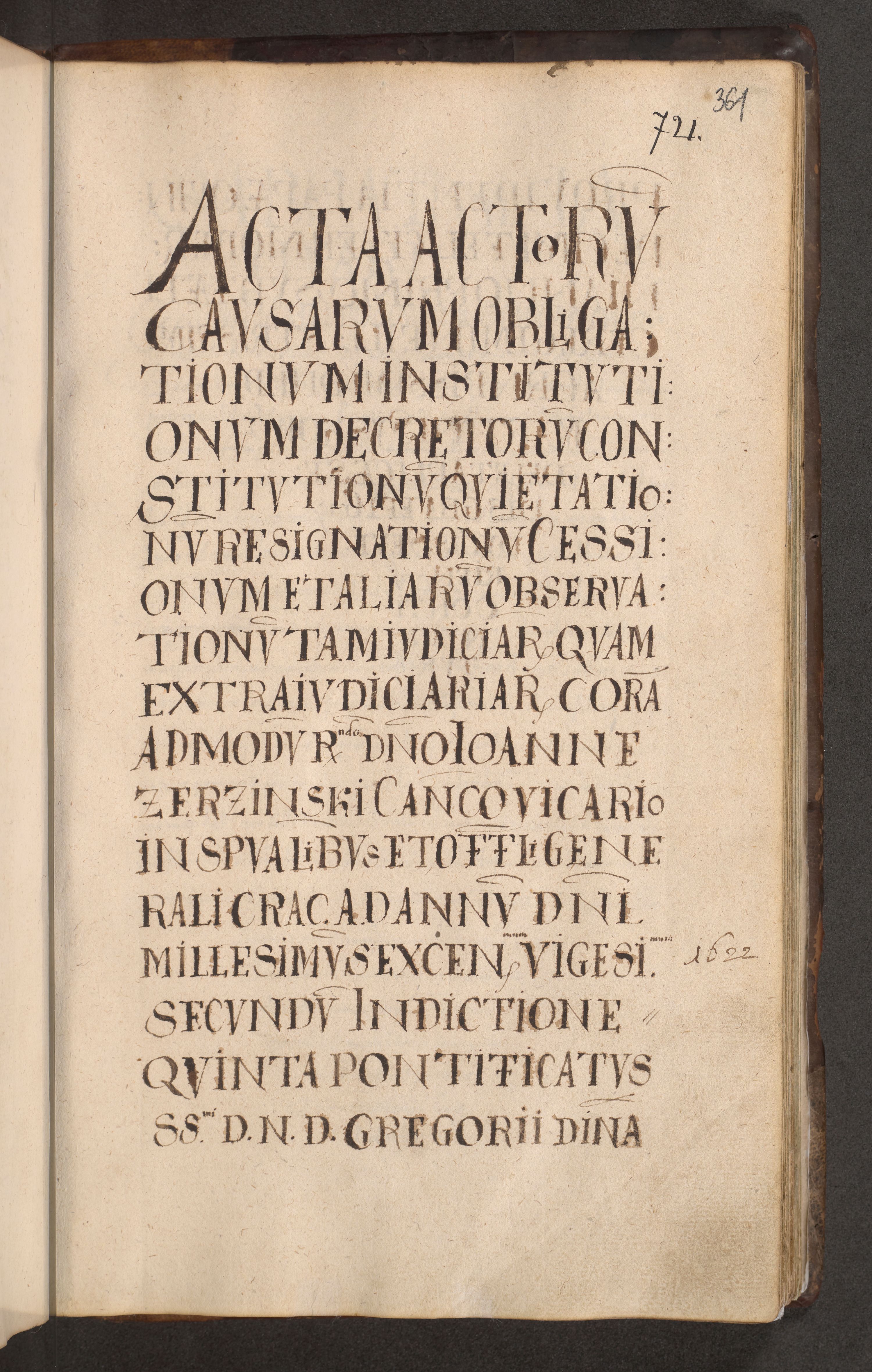 Acta actorum causarum obligationum institutionum decretorum constitutionum quietationum resignationum cissionum et atiaru obsernationum tam indiciariarum quam extra indiciariarum coram Admodum Reverendo Domino Joanne Zerzynski Canonico Vicario in Spiritualibus et Officiali generali Cracoviensis ad Annum Domini Millesimum Sextentissimum Vigesimum Indictione tertia Pontificatus SSmi D. N. D. Pauli Divina pronidentia Papae V. foeliciter moderni anno ipsins subfelici regimine Diocesis Cracoviensis Illustrissimi ac Reverendissimi D. N. D. Martini Szyszkowski Deigratia Episcopus Cracoviensis Ducis Severiensis in continuantur.