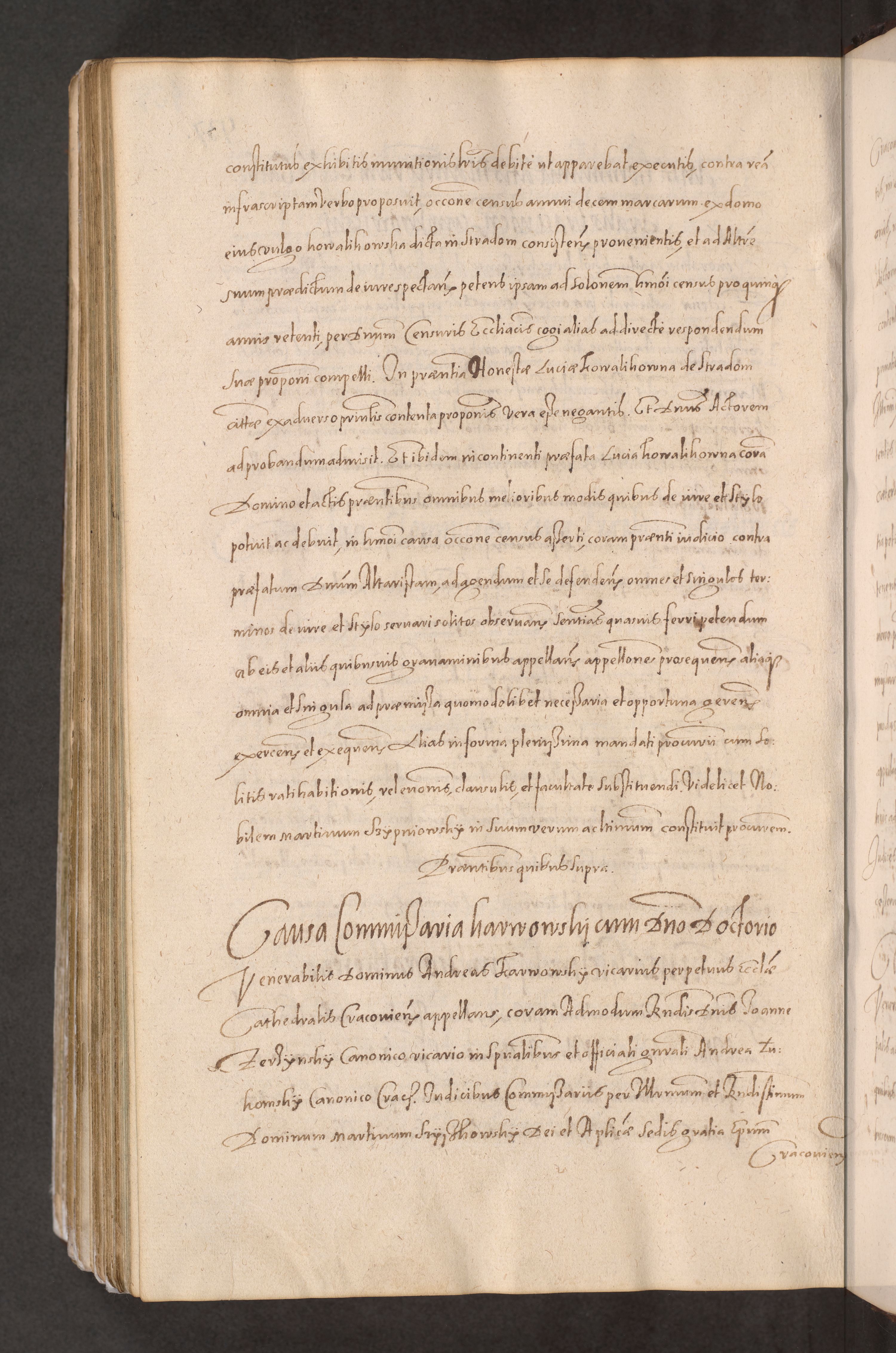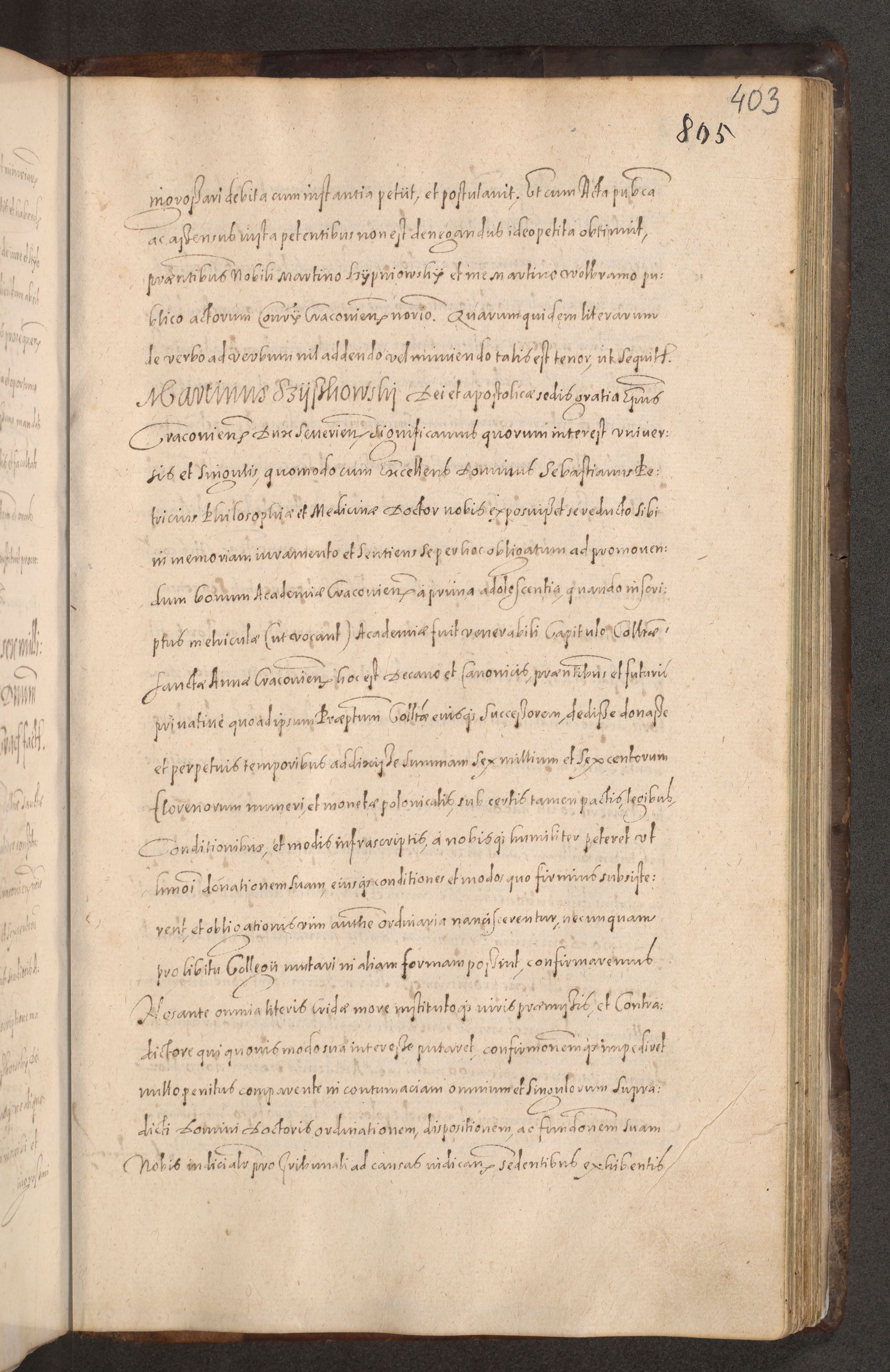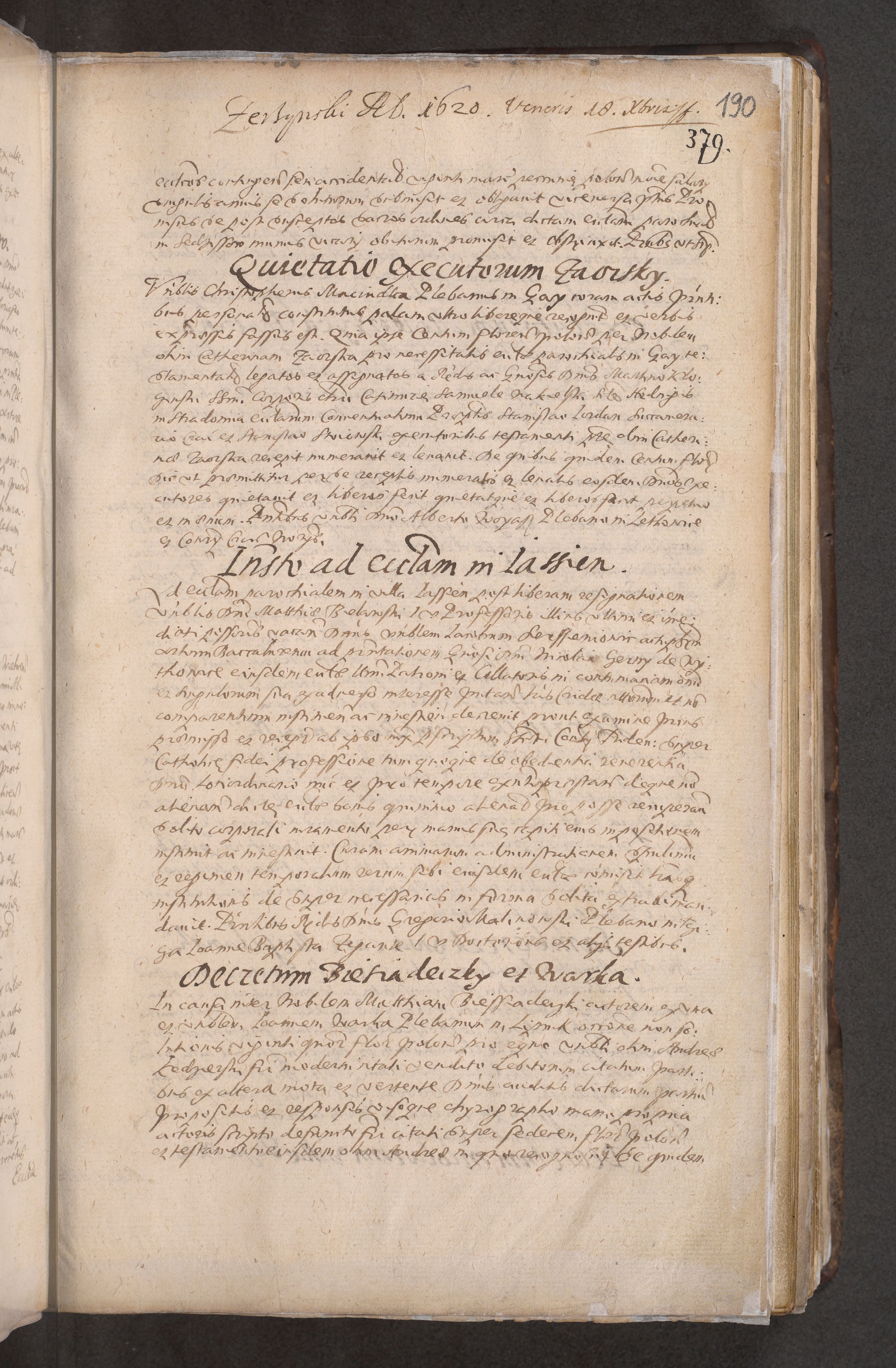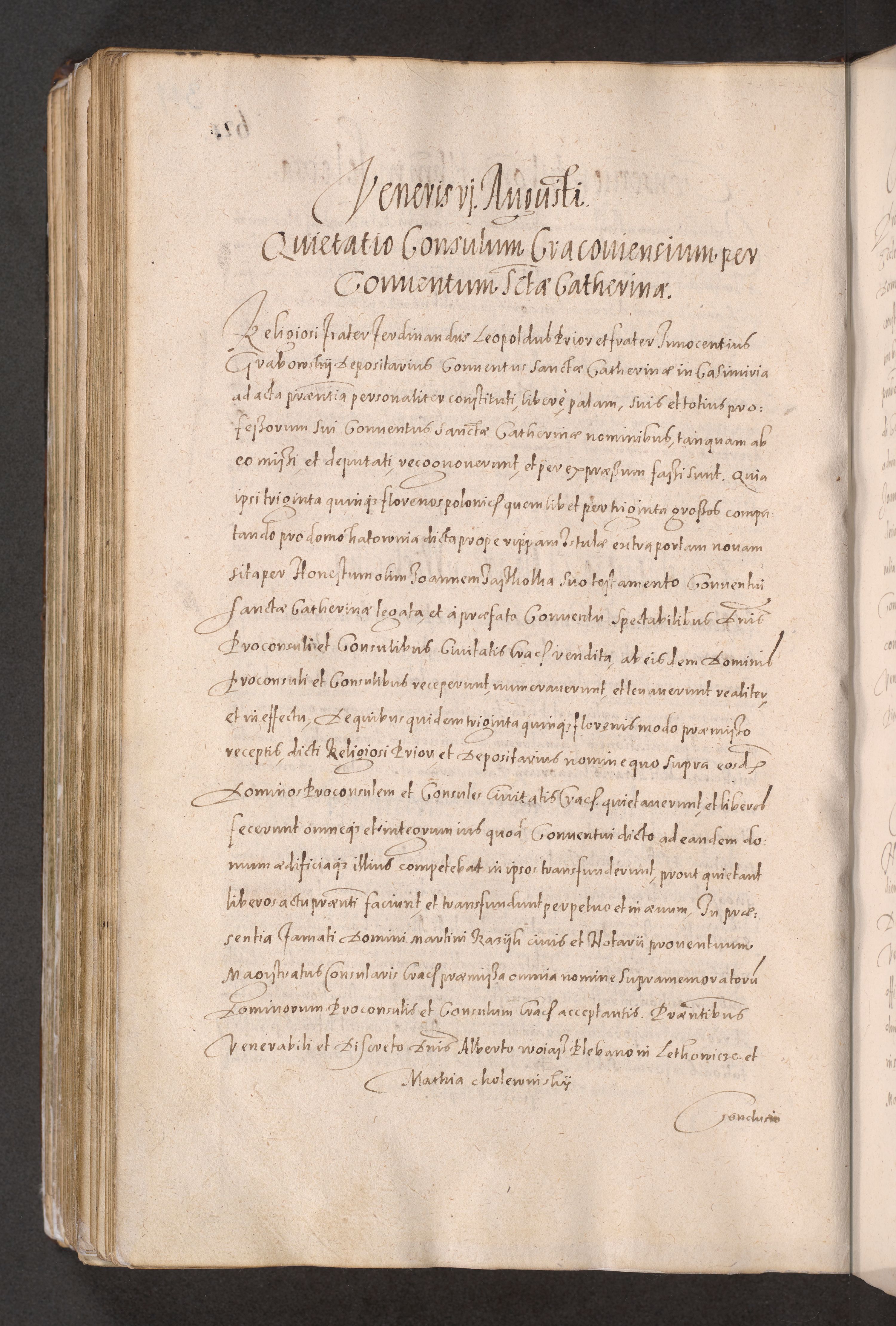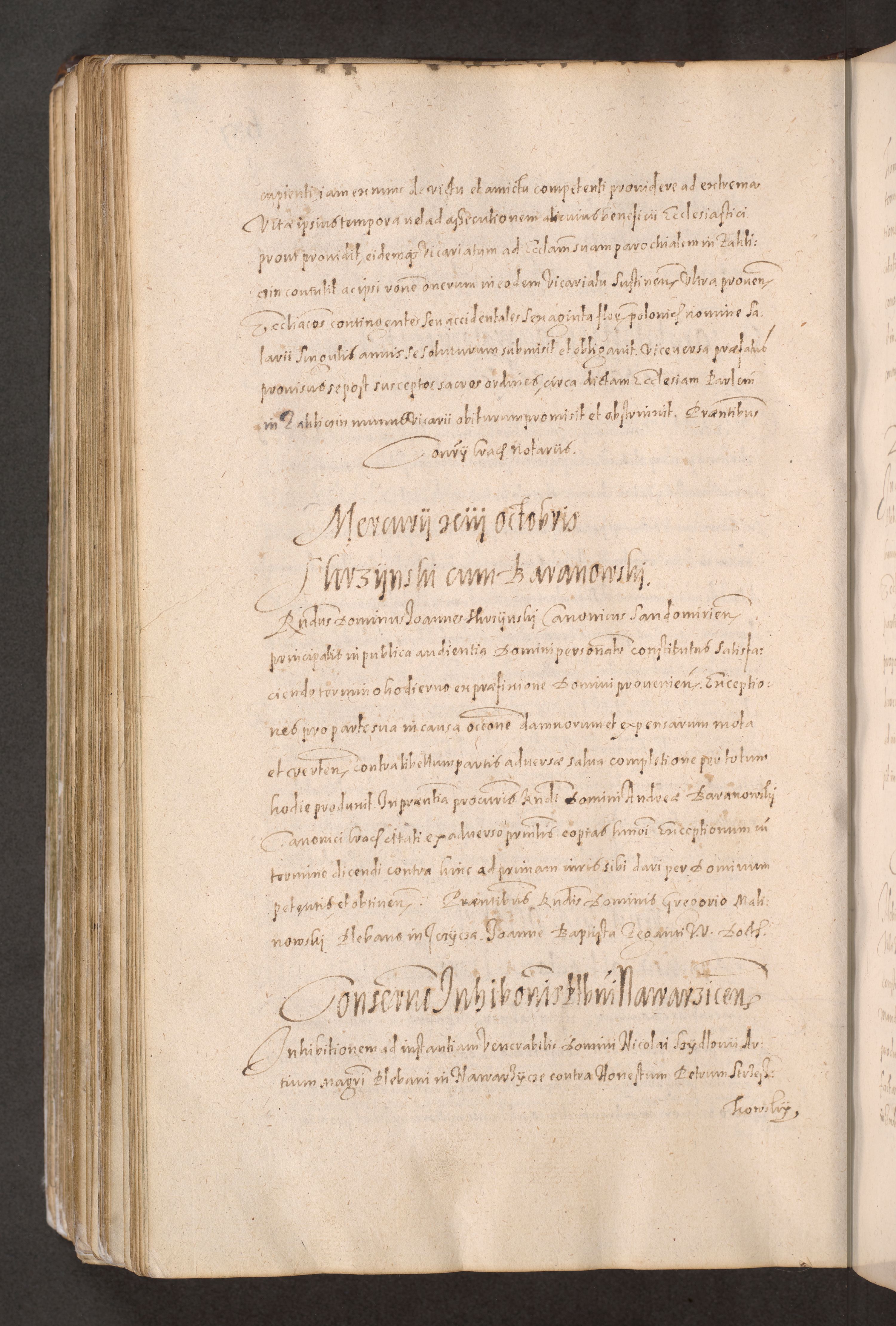 Acta actorum causarum obligationum institutionum decretorum constitutionum quietationum resignationum cissionum et atiaru obsernationum tam indiciariarum quam extra indiciariarum coram Admodum Reverendo Domino Joanne Zerzynski Canonico Vicario in Spiritualibus et Officiali generali Cracoviensis ad Annum Domini Millesimum Sextentissimum Vigesimum Indictione tertia Pontificatus SSmi D. N. D. Pauli Divina pronidentia Papae V. foeliciter moderni anno ipsins subfelici regimine Diocesis Cracoviensis Illustrissimi ac Reverendissimi D. N. D. Martini Szyszkowski Deigratia Episcopus Cracoviensis Ducis Severiensis in continuantur.