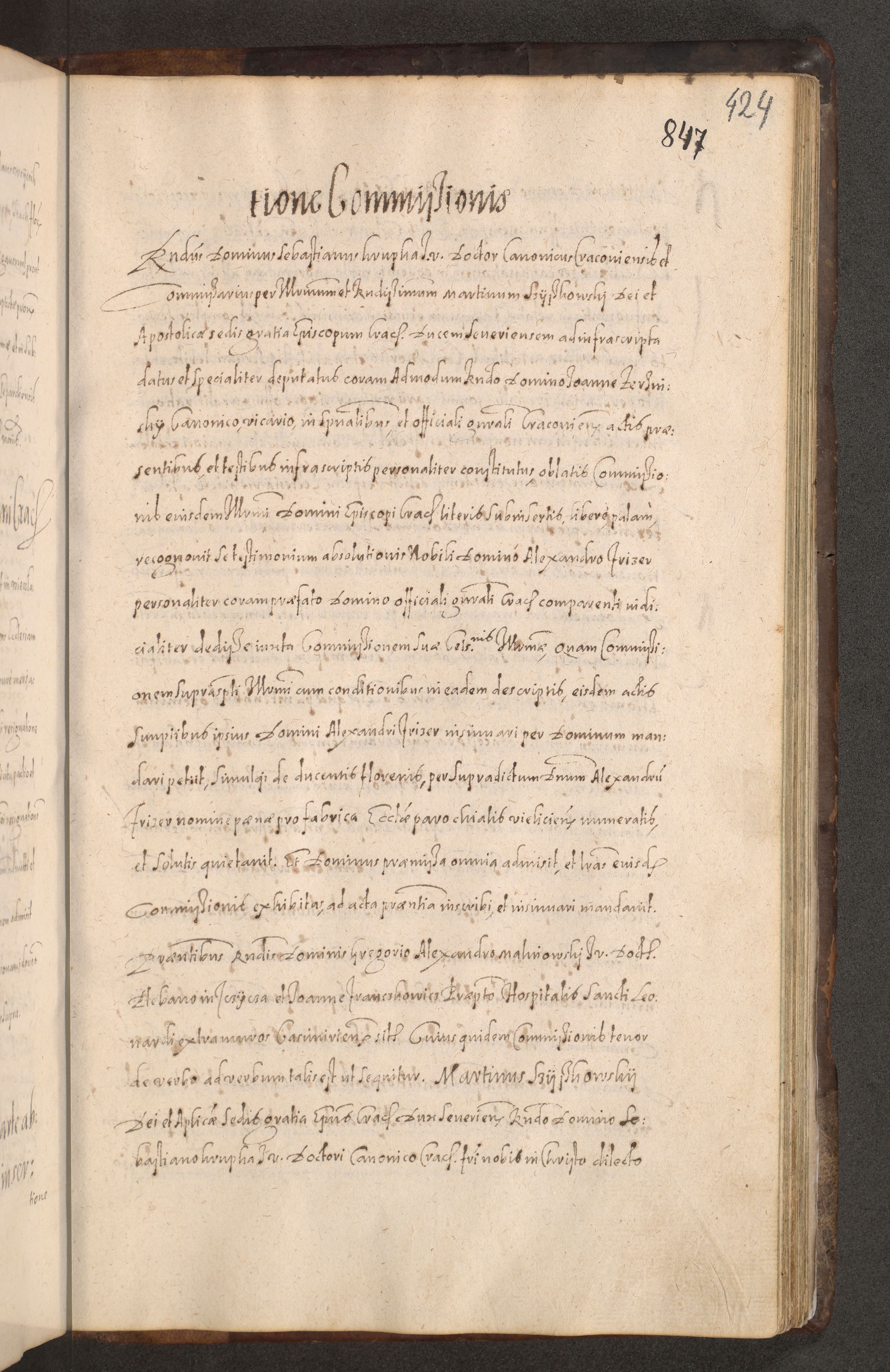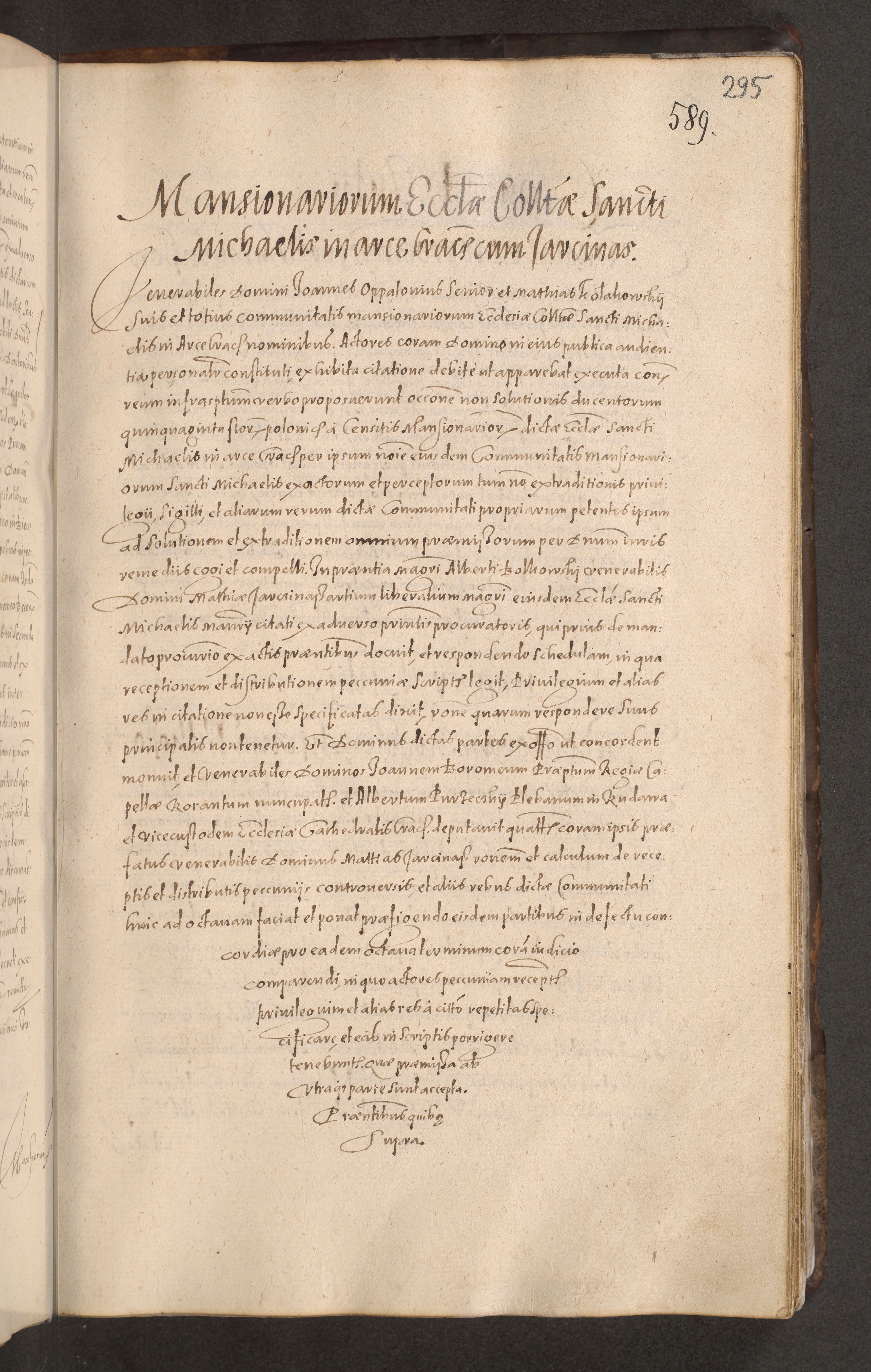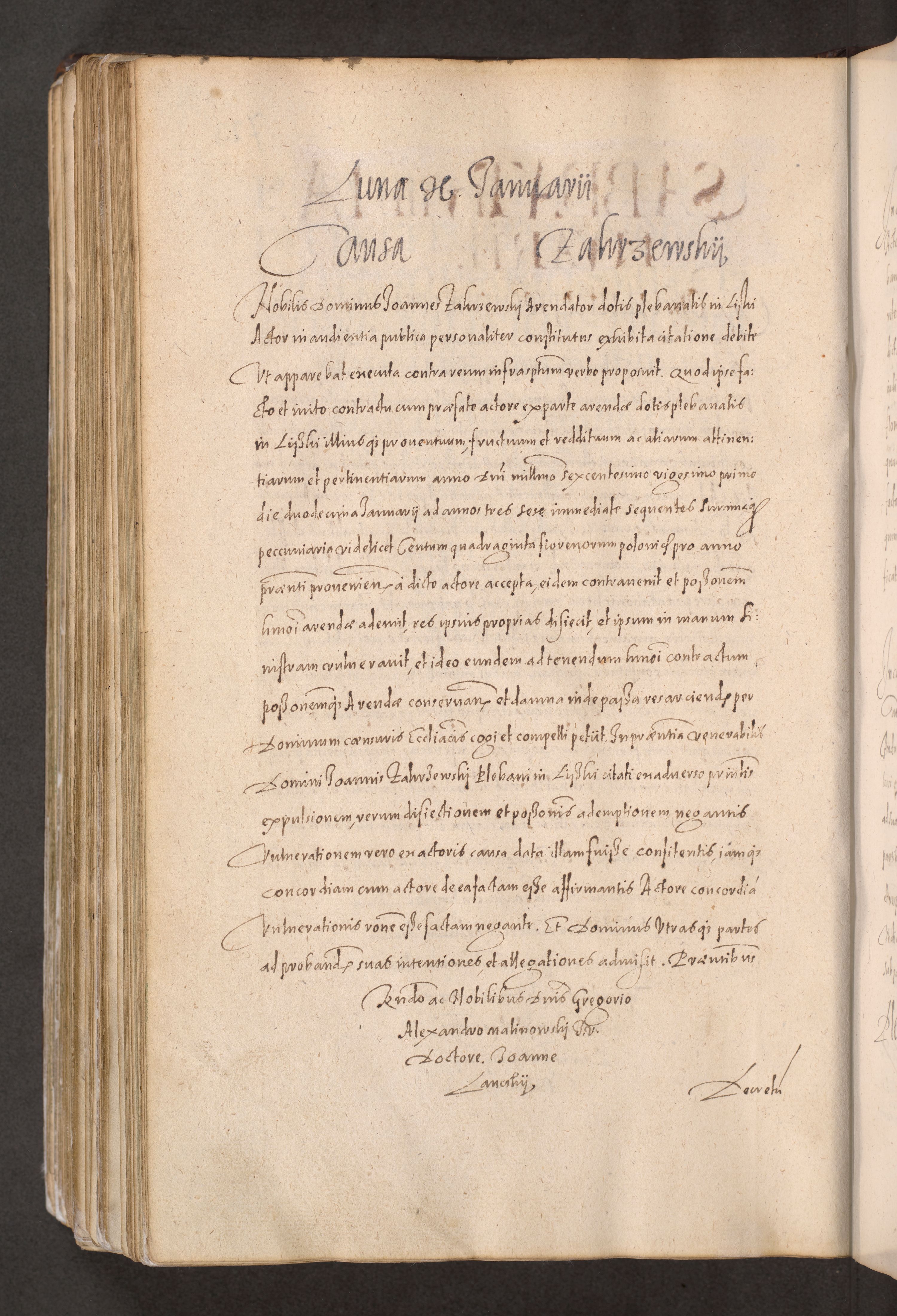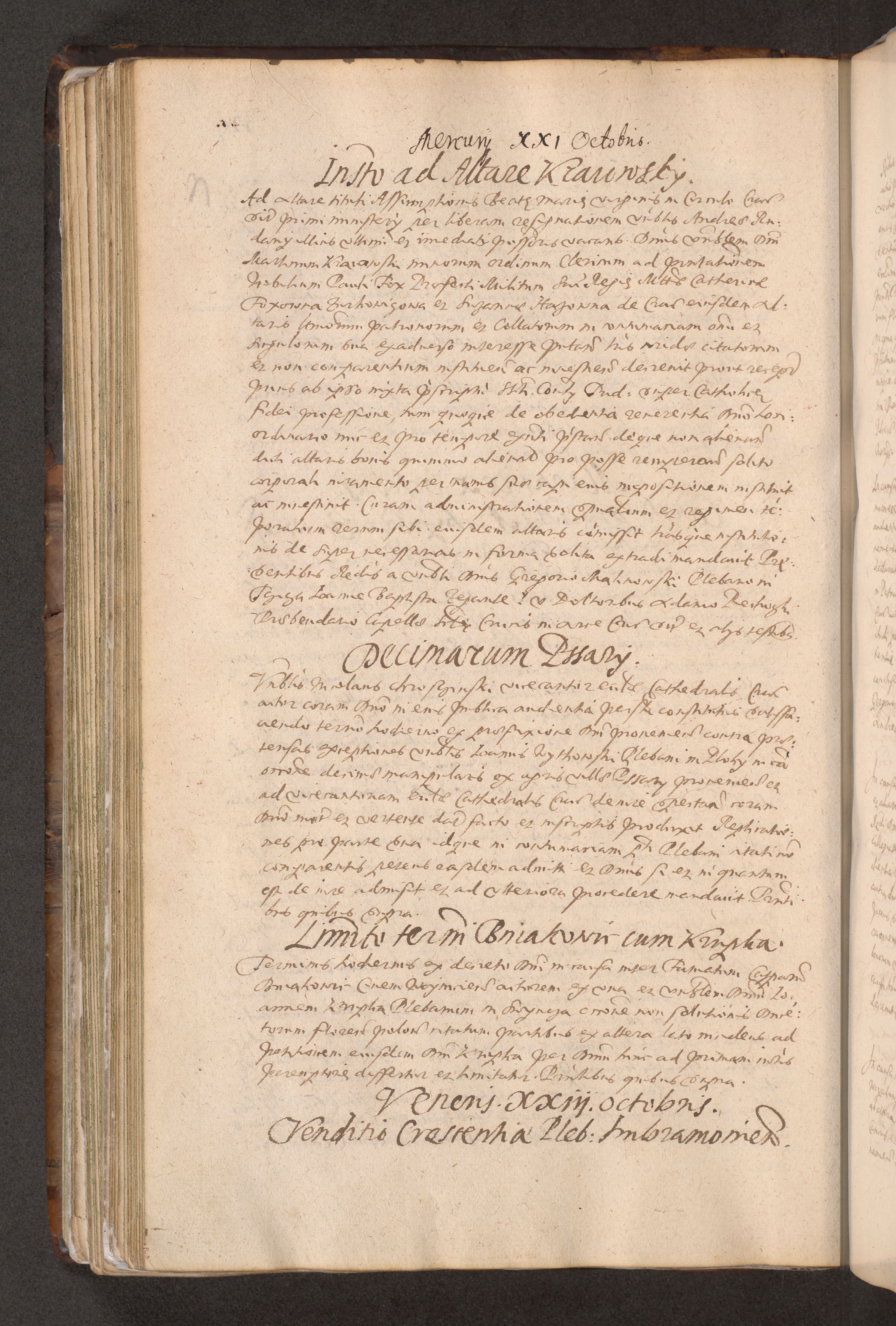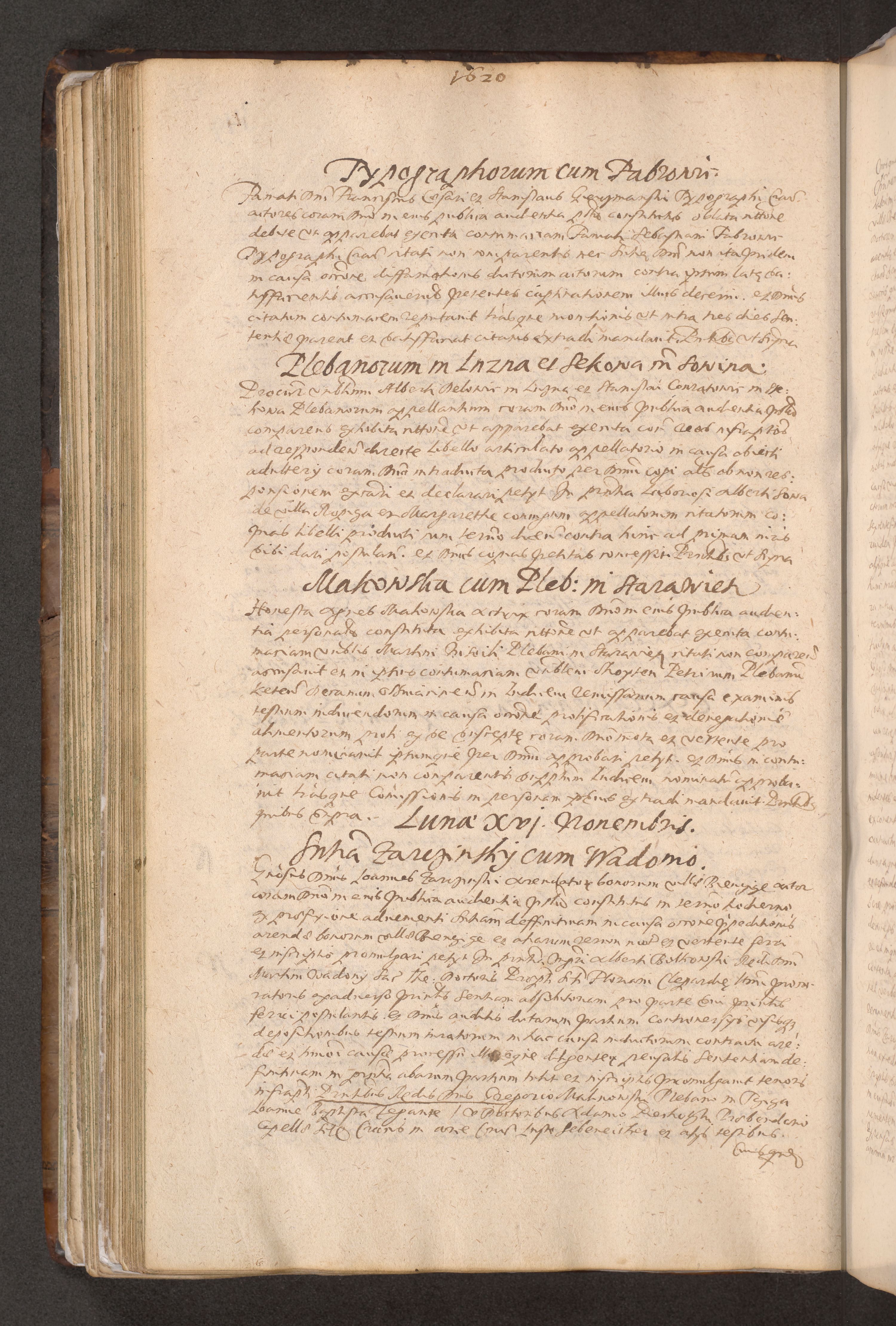 Acta actorum causarum obligationum institutionum decretorum constitutionum quietationum resignationum cissionum et atiaru obsernationum tam indiciariarum quam extra indiciariarum coram Admodum Reverendo Domino Joanne Zerzynski Canonico Vicario in Spiritualibus et Officiali generali Cracoviensis ad Annum Domini Millesimum Sextentissimum Vigesimum Indictione tertia Pontificatus SSmi D. N. D. Pauli Divina pronidentia Papae V. foeliciter moderni anno ipsins subfelici regimine Diocesis Cracoviensis Illustrissimi ac Reverendissimi D. N. D. Martini Szyszkowski Deigratia Episcopus Cracoviensis Ducis Severiensis in continuantur.