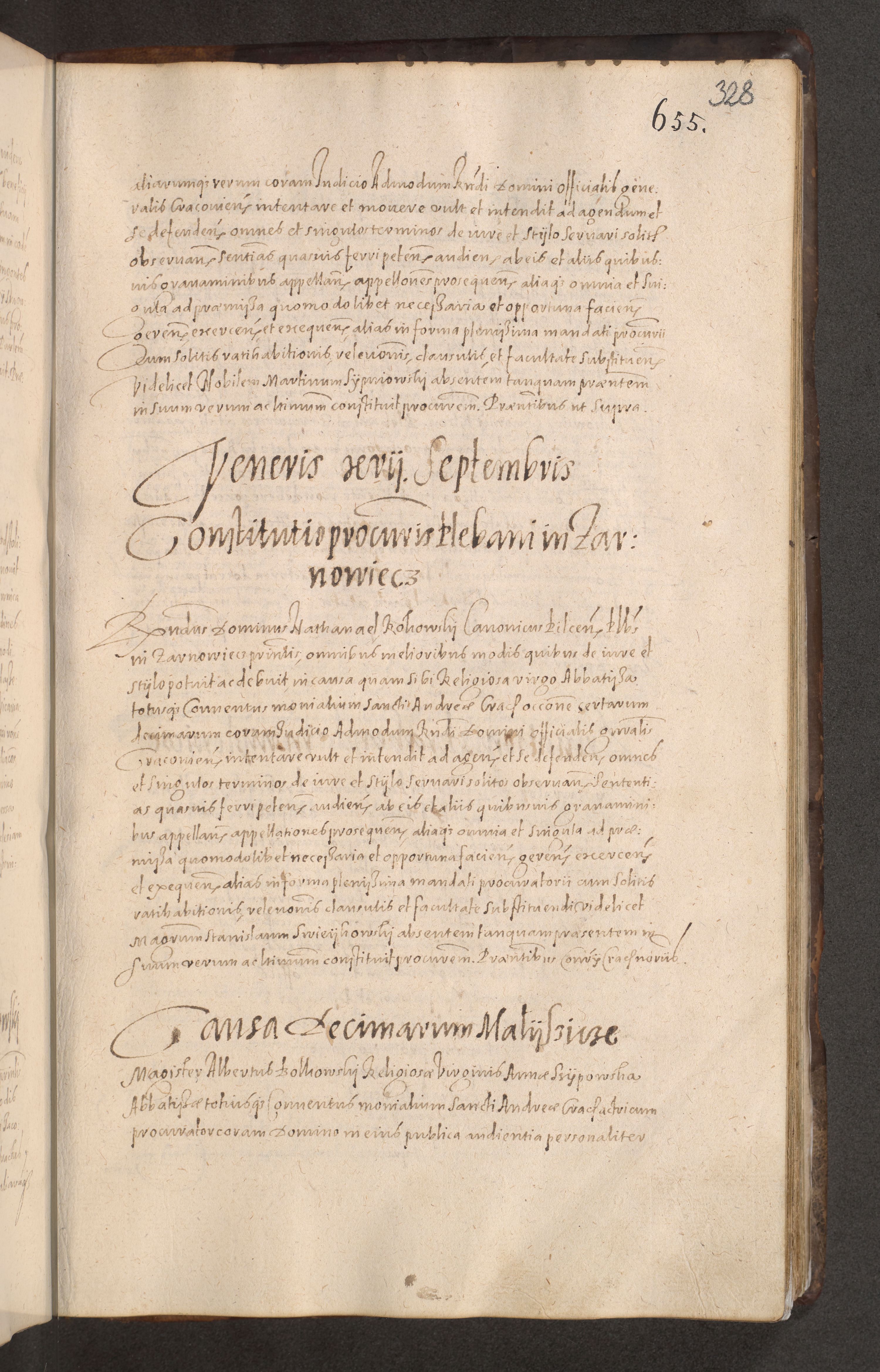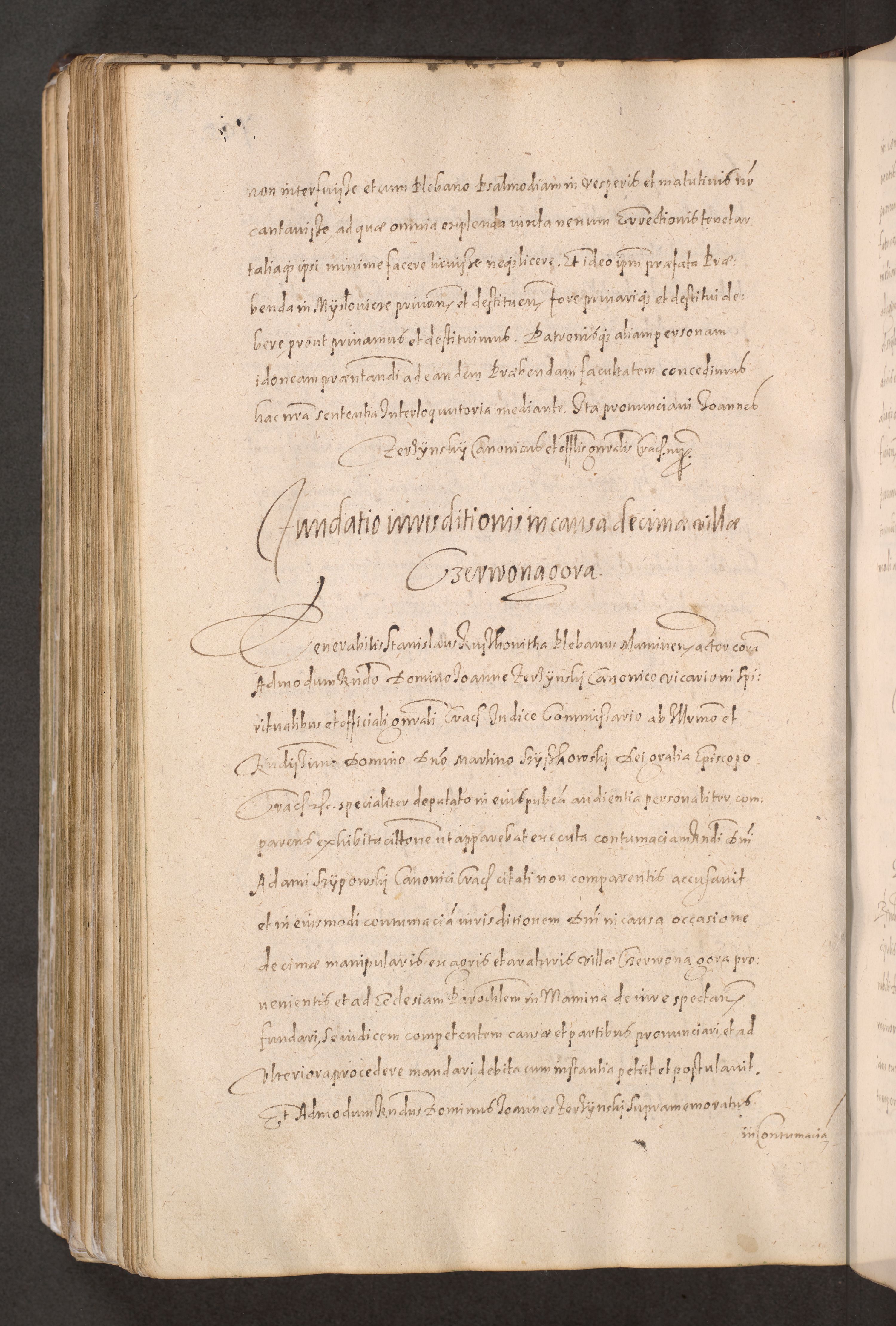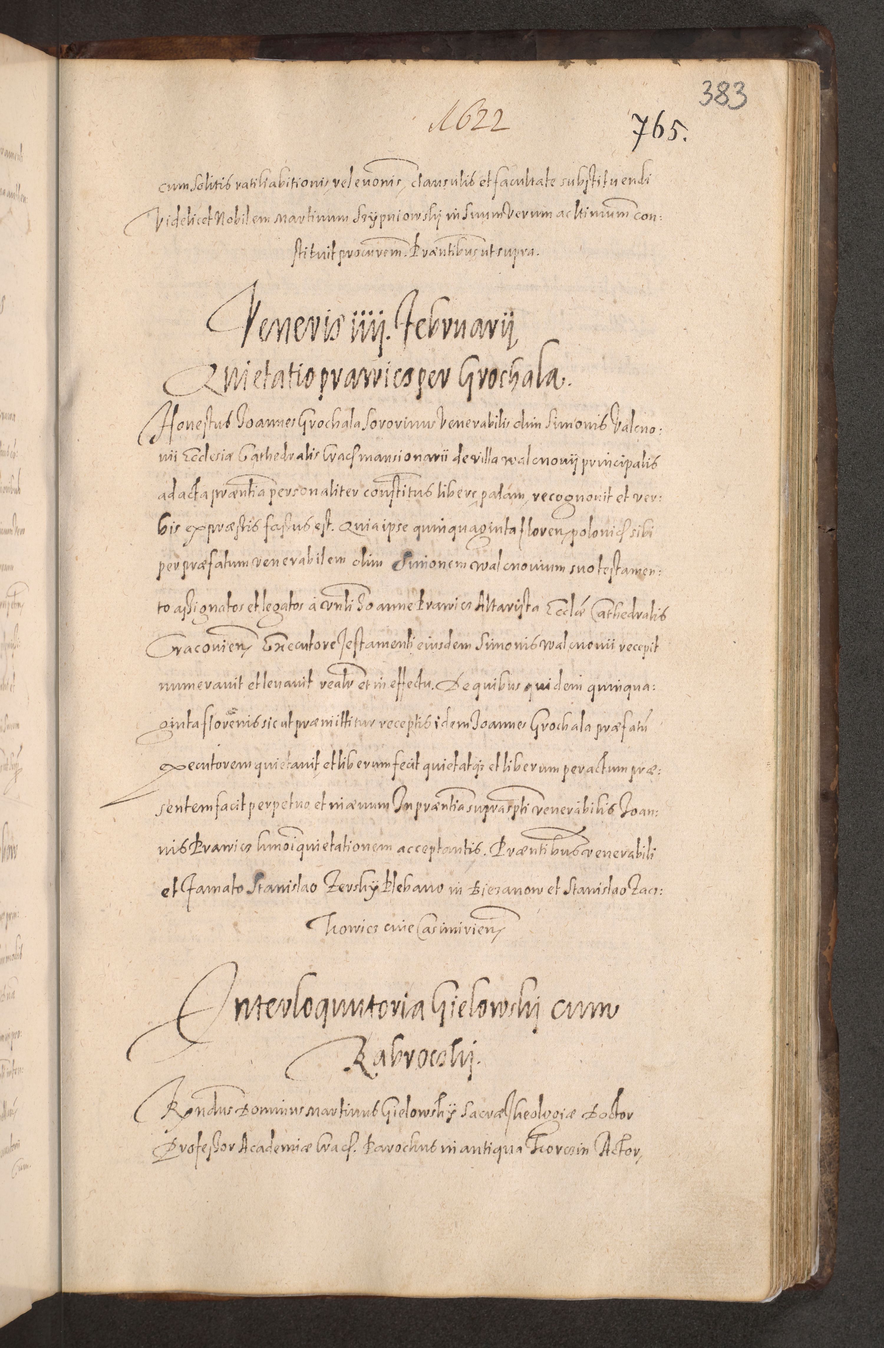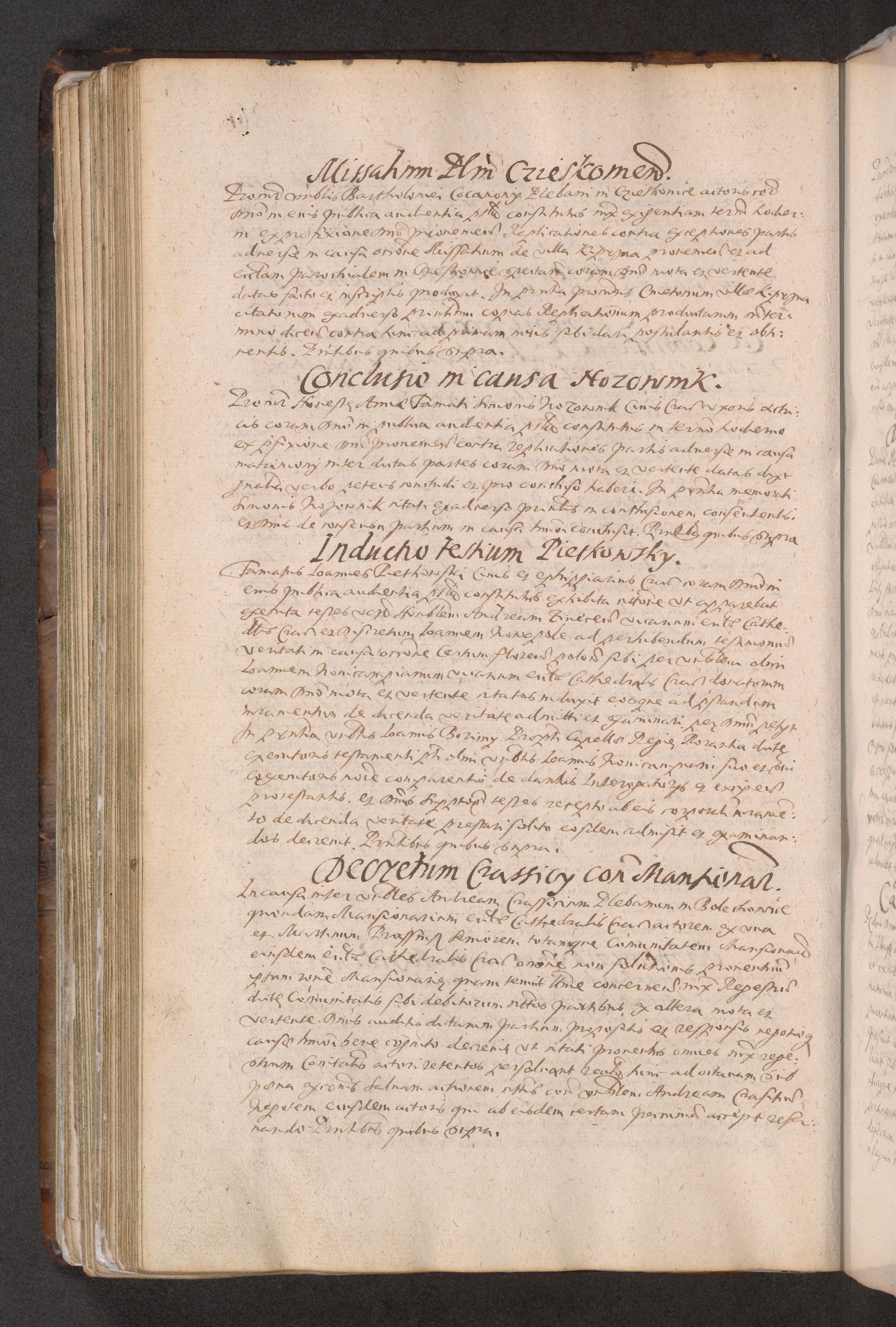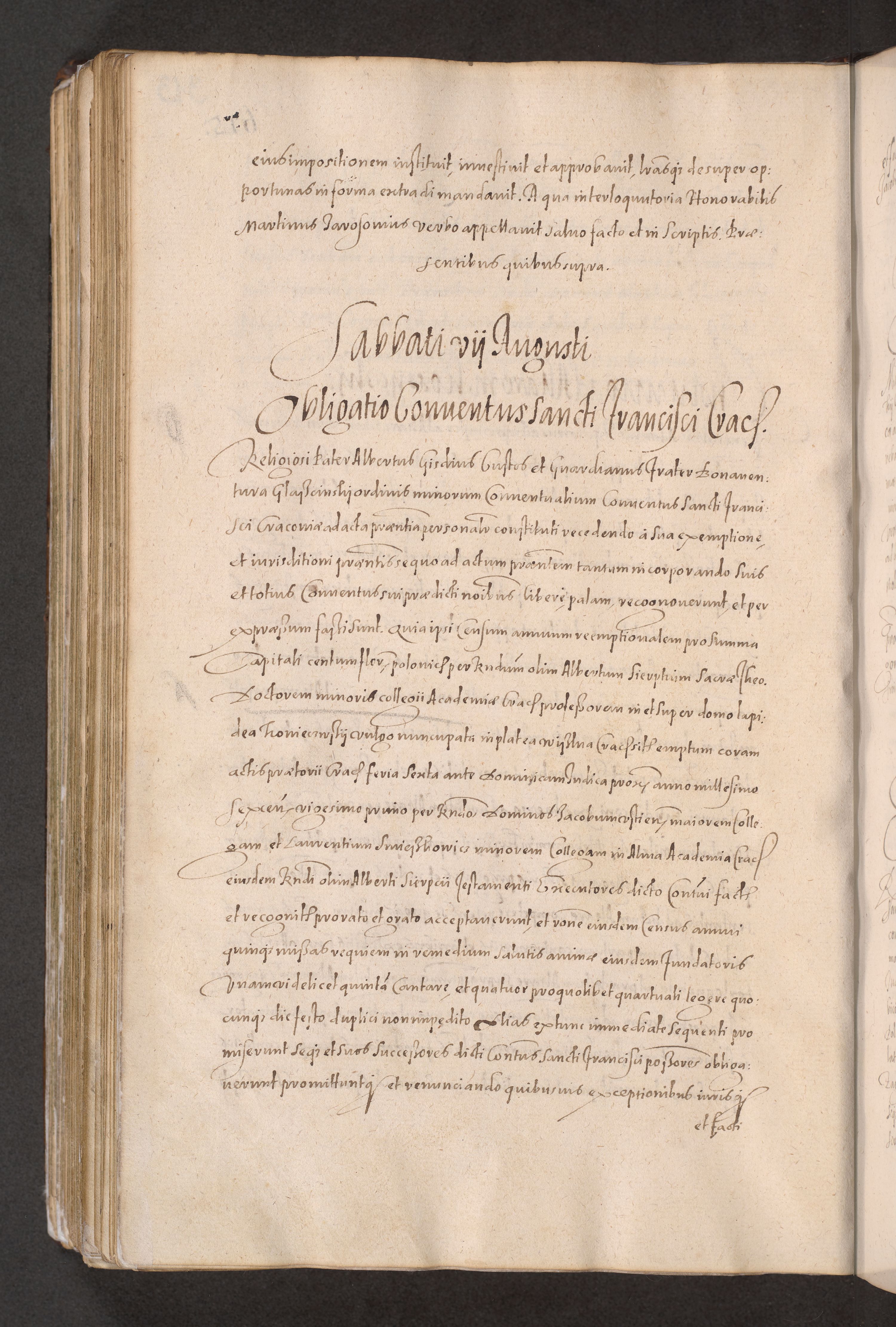 Acta actorum causarum obligationum institutionum decretorum constitutionum quietationum resignationum cissionum et atiaru obsernationum tam indiciariarum quam extra indiciariarum coram Admodum Reverendo Domino Joanne Zerzynski Canonico Vicario in Spiritualibus et Officiali generali Cracoviensis ad Annum Domini Millesimum Sextentissimum Vigesimum Indictione tertia Pontificatus SSmi D. N. D. Pauli Divina pronidentia Papae V. foeliciter moderni anno ipsins subfelici regimine Diocesis Cracoviensis Illustrissimi ac Reverendissimi D. N. D. Martini Szyszkowski Deigratia Episcopus Cracoviensis Ducis Severiensis in continuantur.