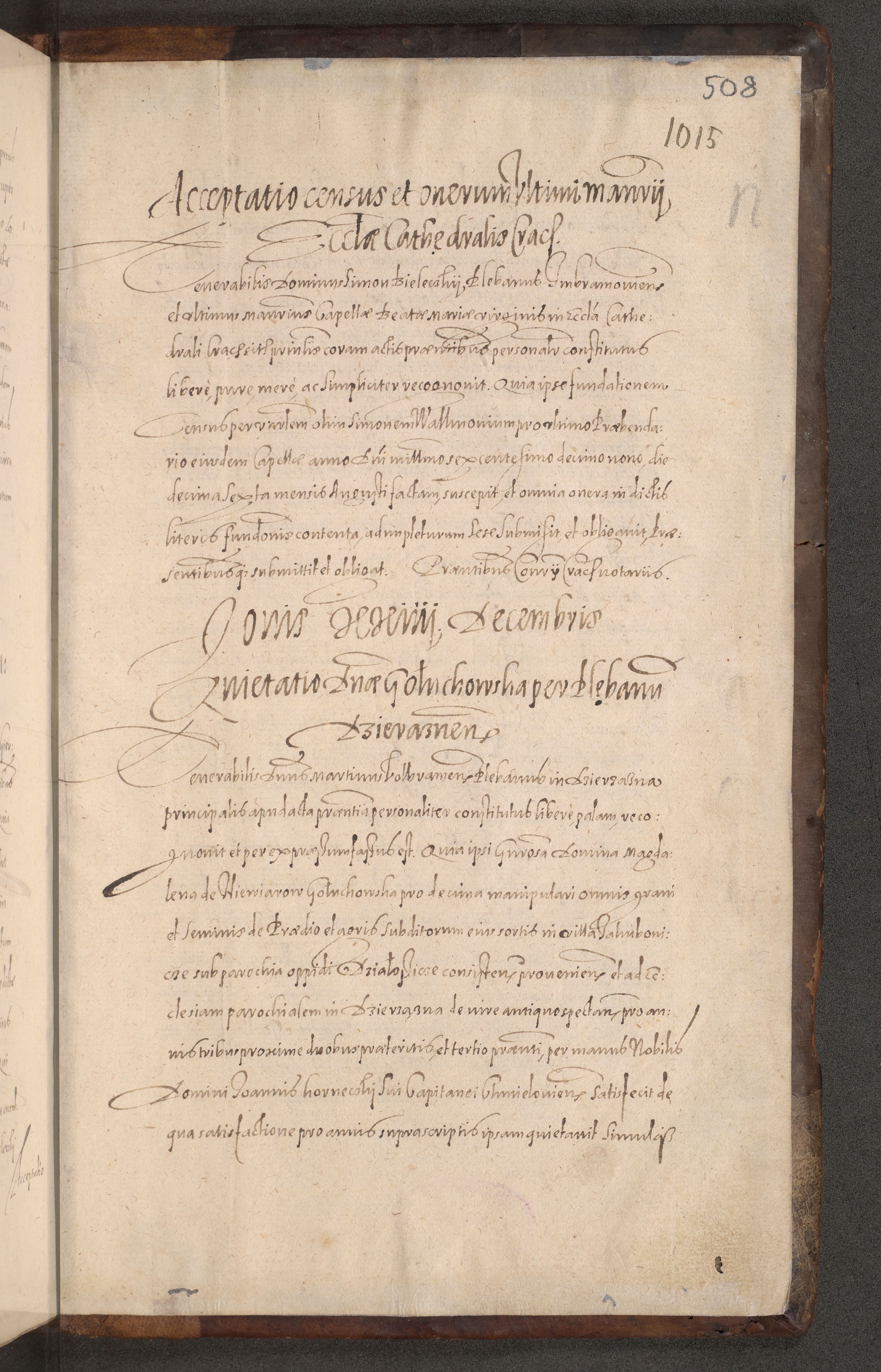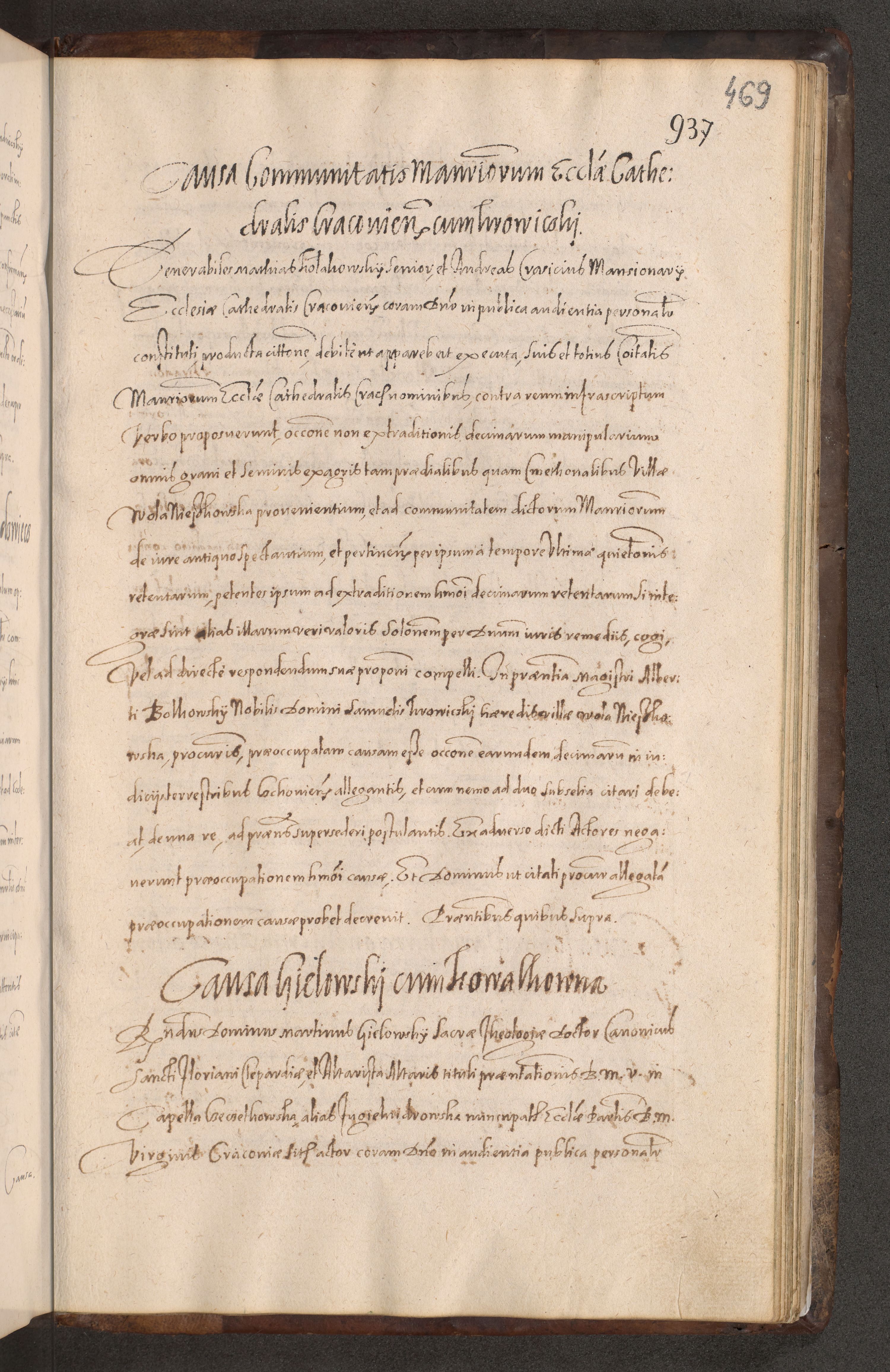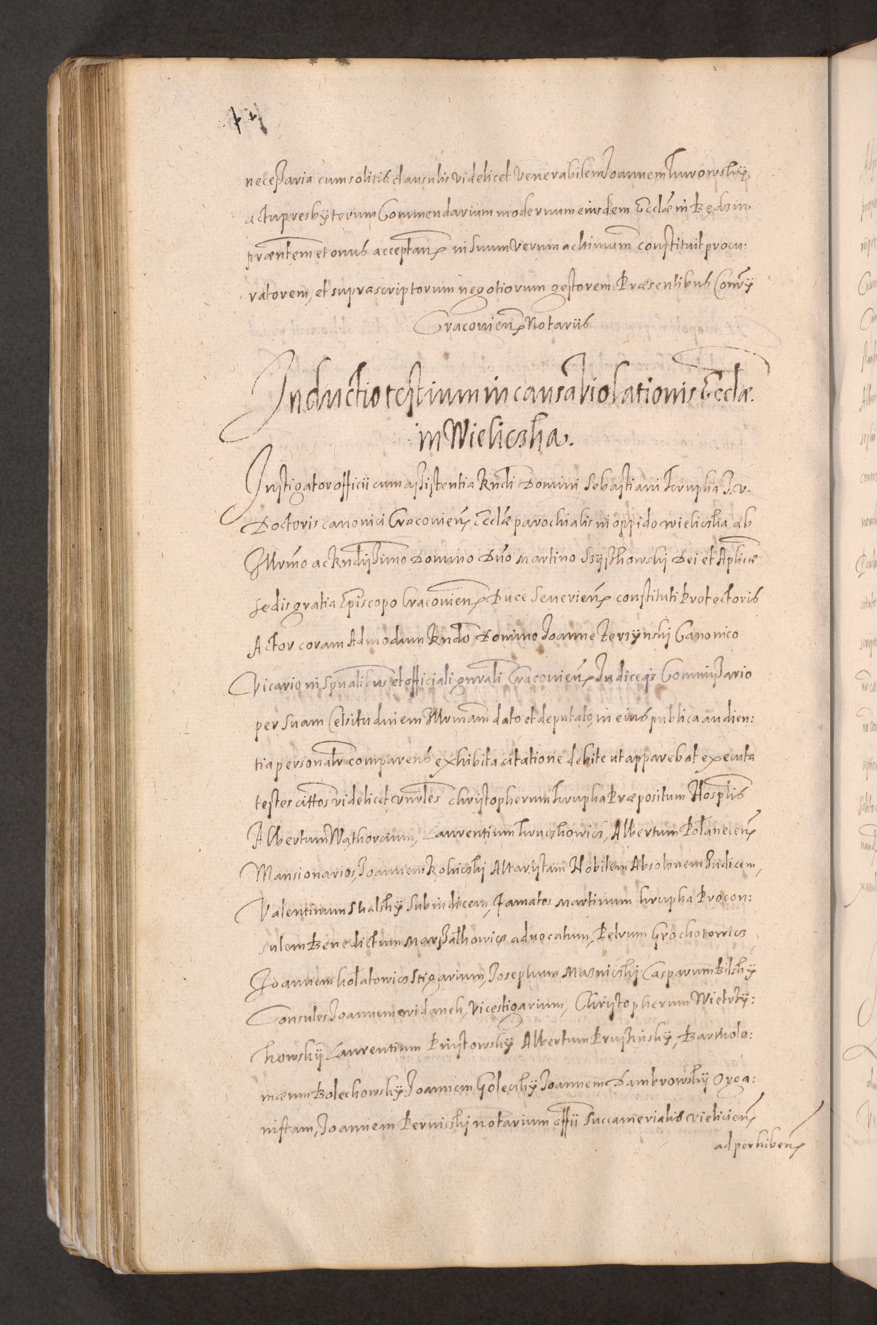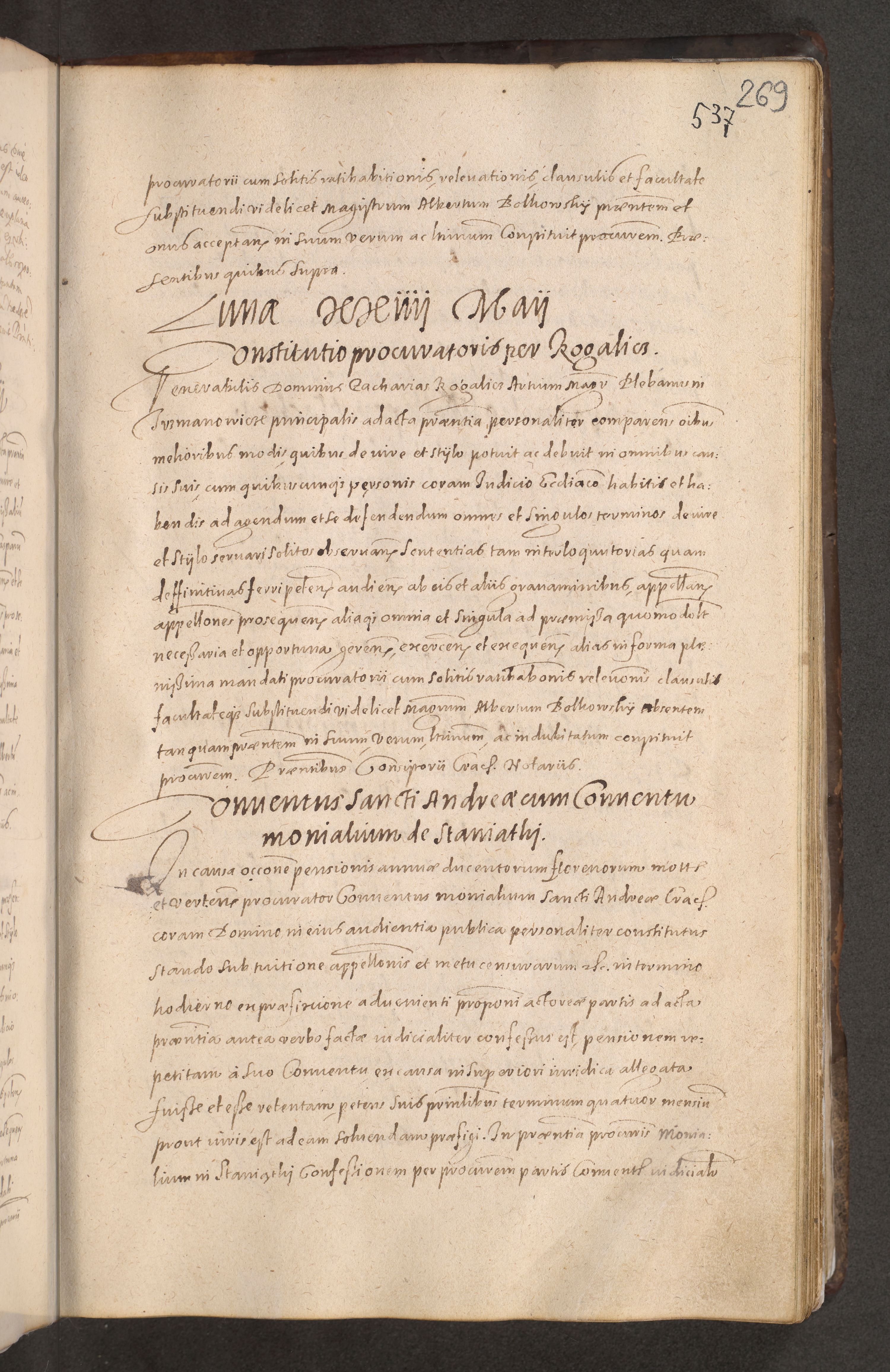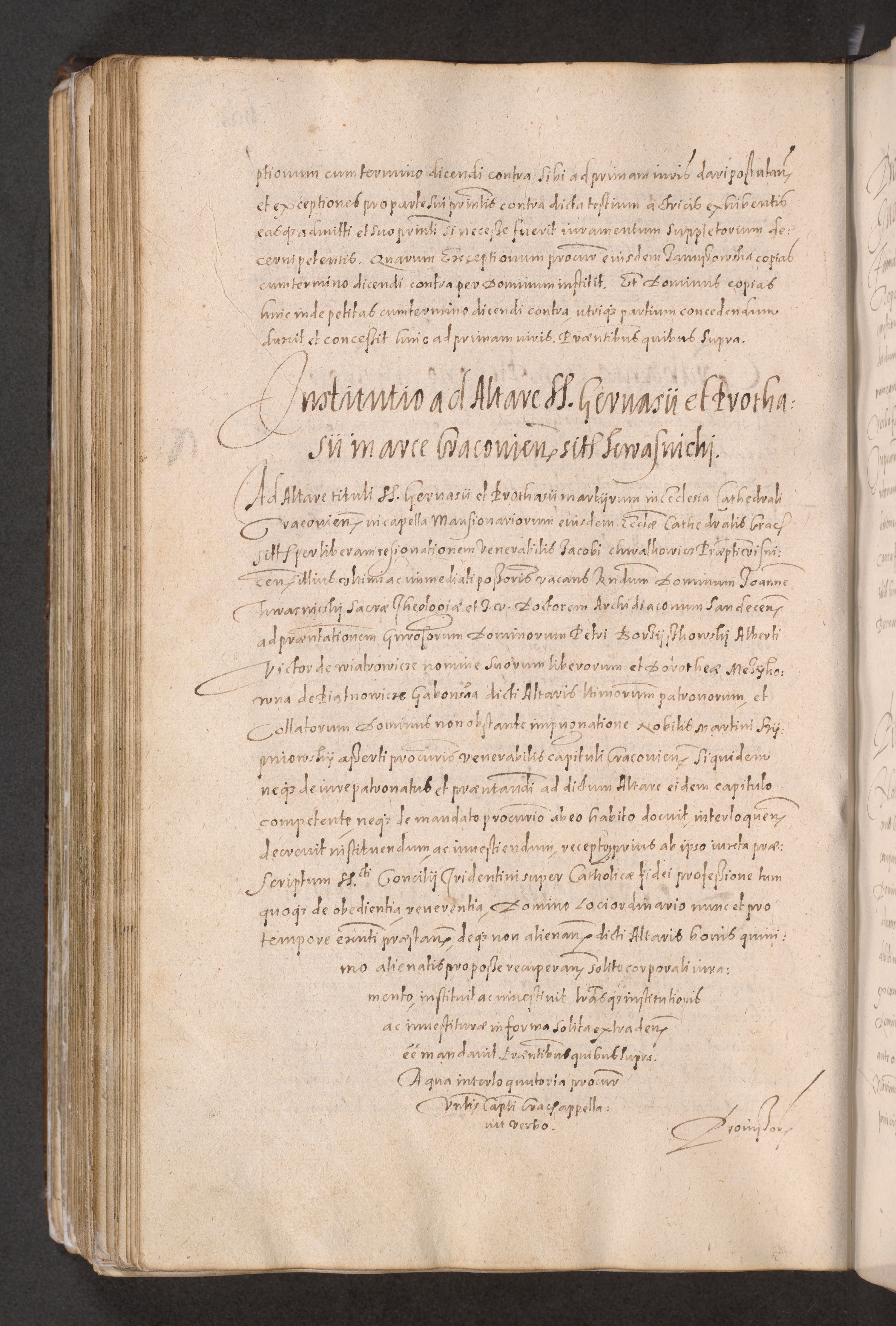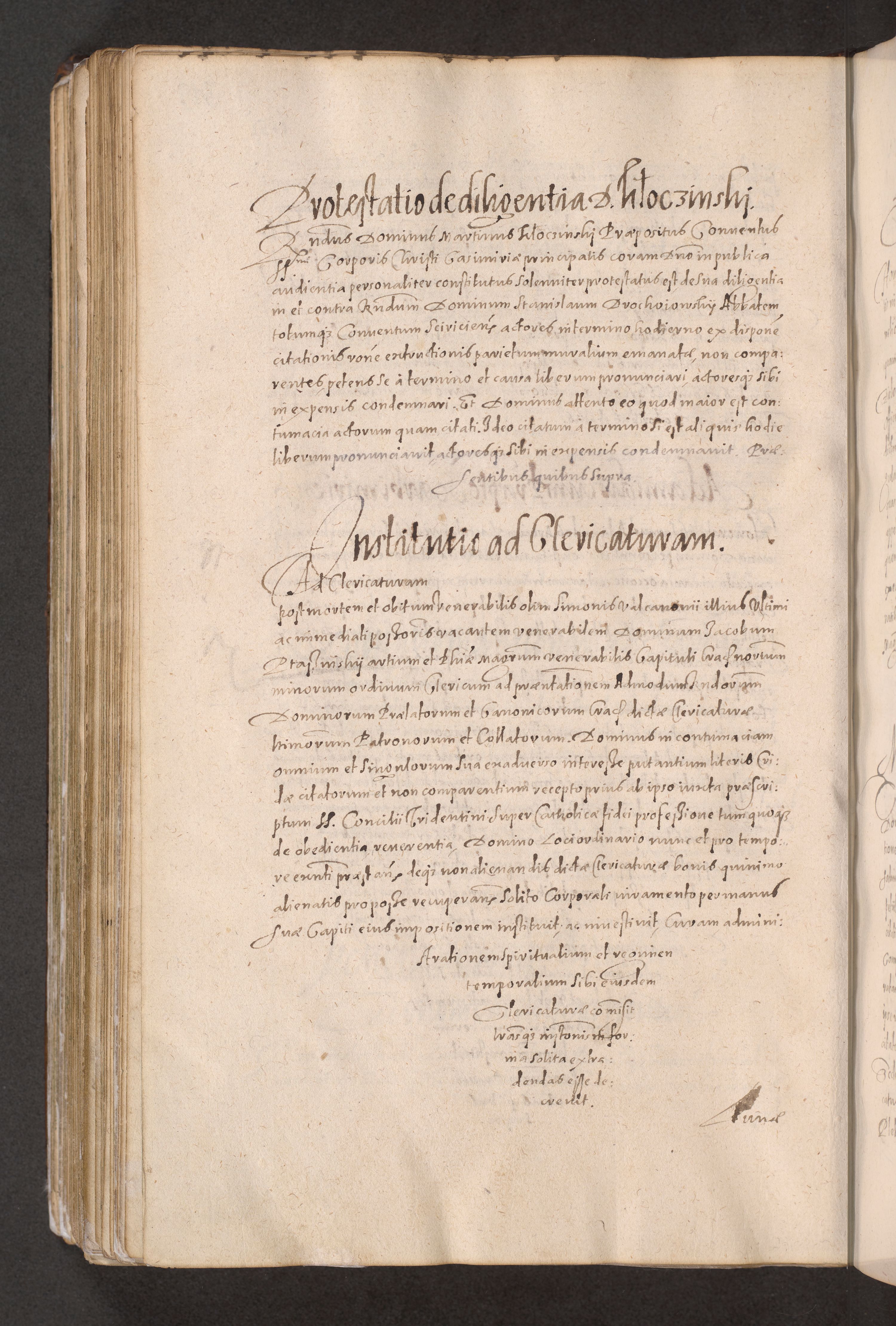 Acta actorum causarum obligationum institutionum decretorum constitutionum quietationum resignationum cissionum et atiaru obsernationum tam indiciariarum quam extra indiciariarum coram Admodum Reverendo Domino Joanne Zerzynski Canonico Vicario in Spiritualibus et Officiali generali Cracoviensis ad Annum Domini Millesimum Sextentissimum Vigesimum Indictione tertia Pontificatus SSmi D. N. D. Pauli Divina pronidentia Papae V. foeliciter moderni anno ipsins subfelici regimine Diocesis Cracoviensis Illustrissimi ac Reverendissimi D. N. D. Martini Szyszkowski Deigratia Episcopus Cracoviensis Ducis Severiensis in continuantur.