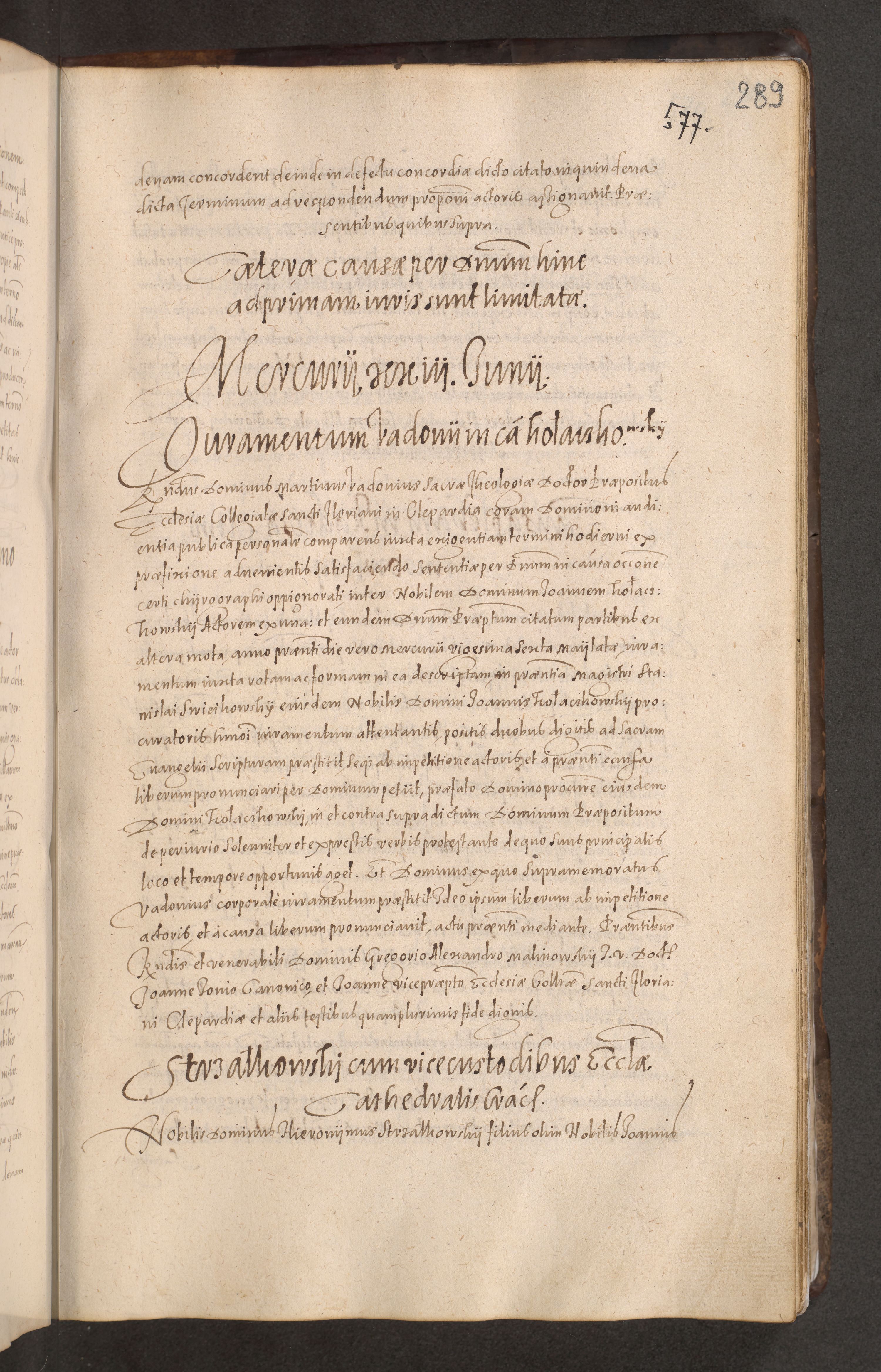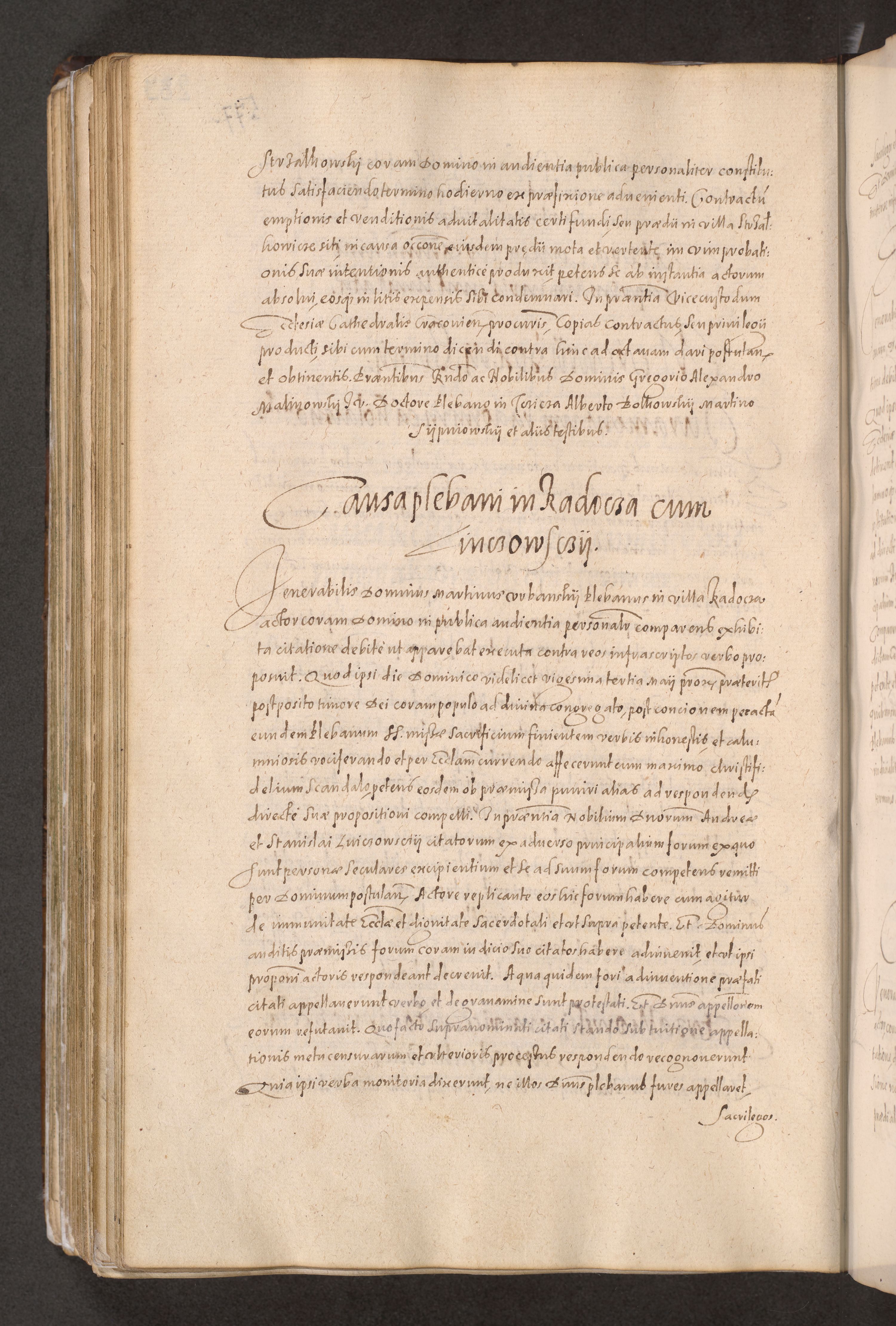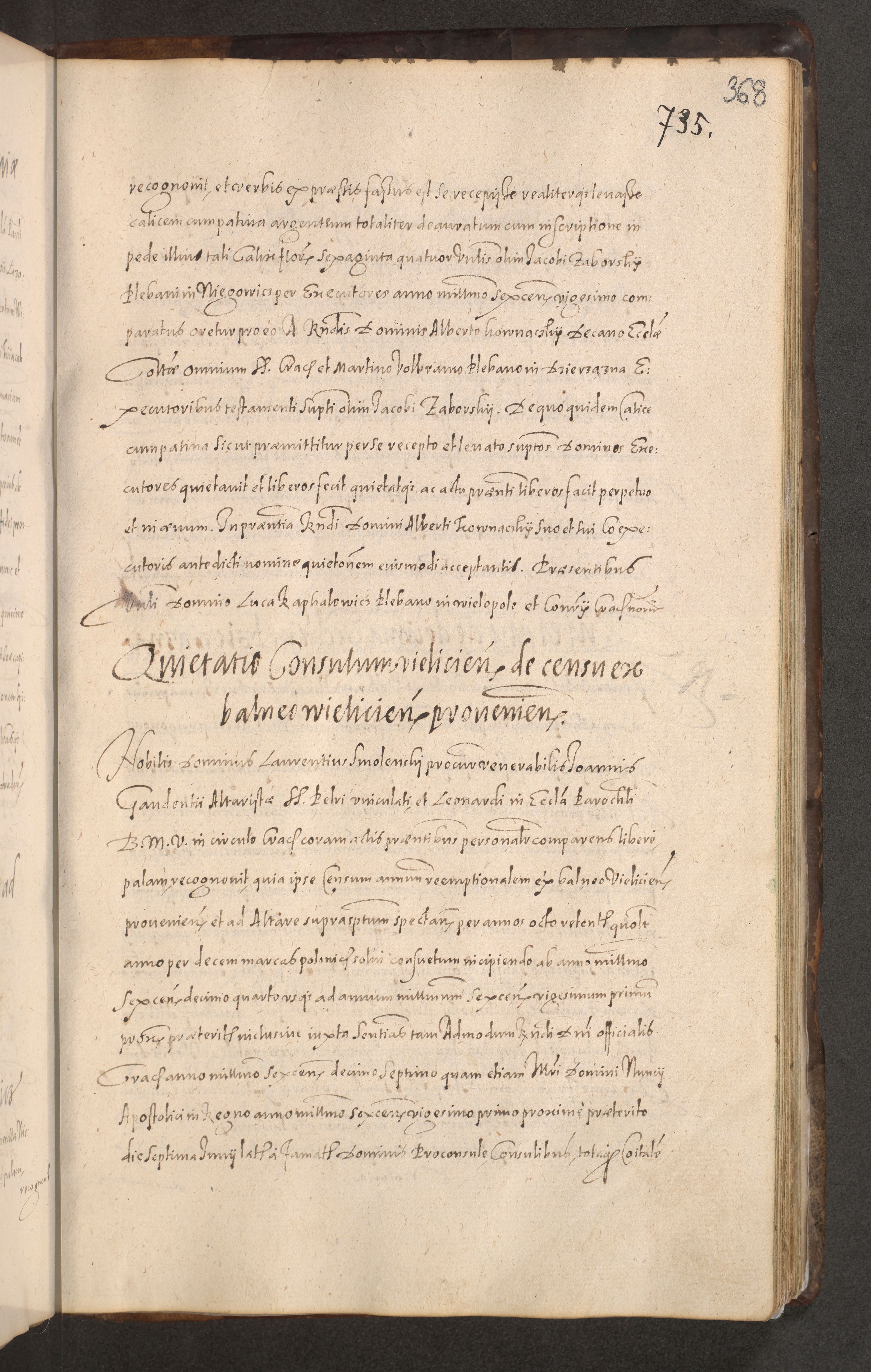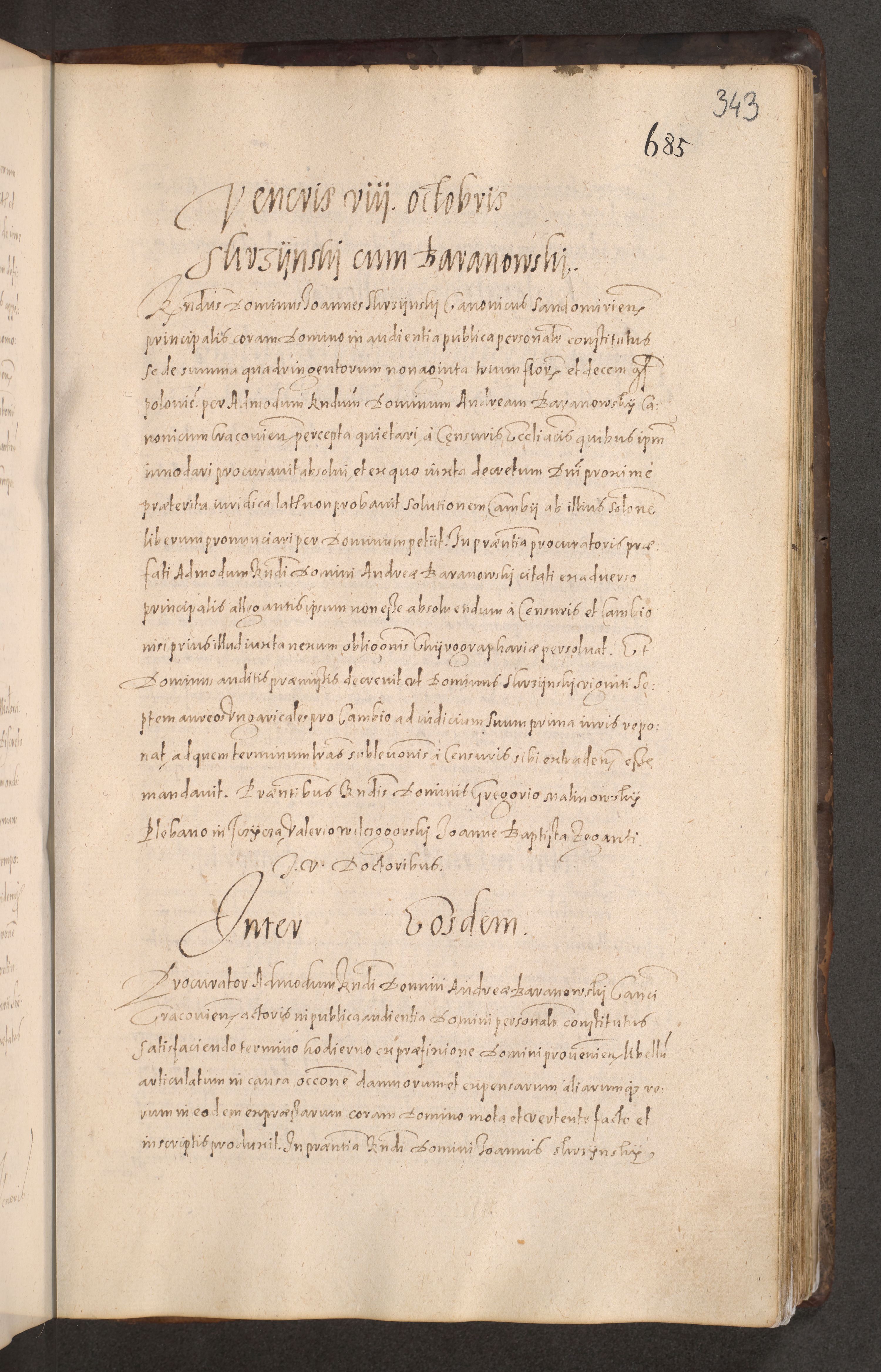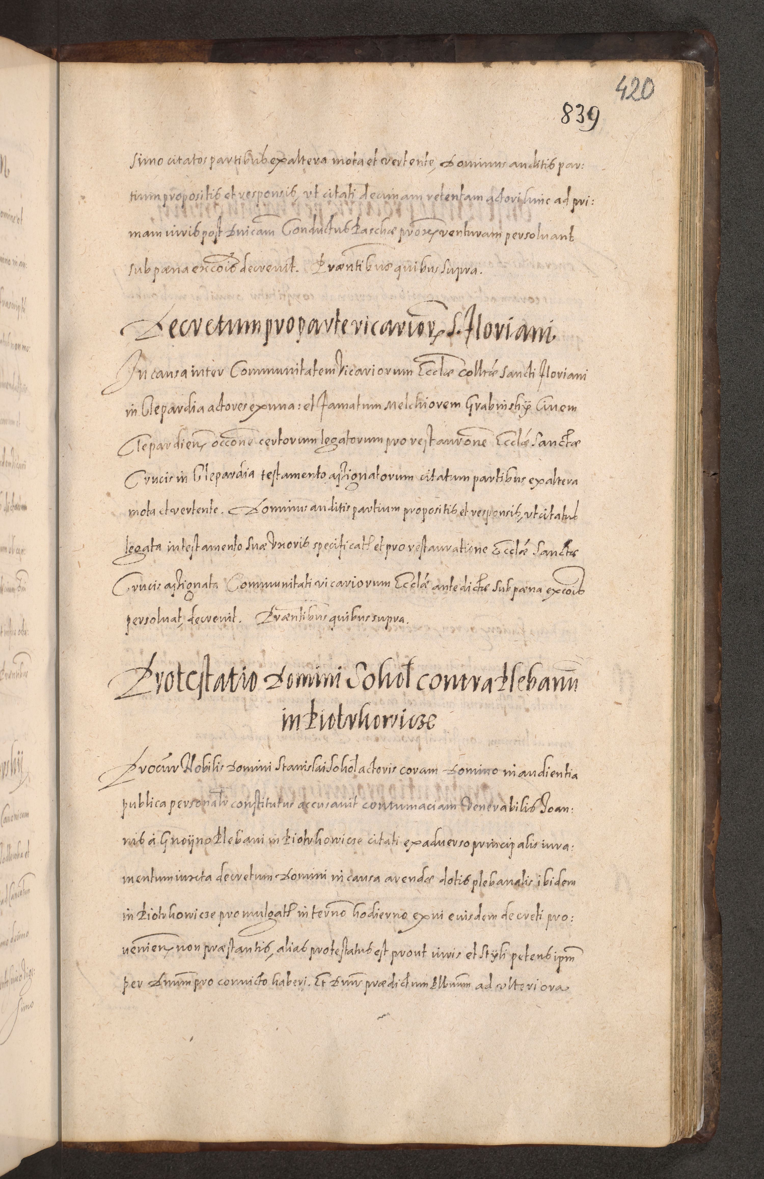 Acta actorum causarum obligationum institutionum decretorum constitutionum quietationum resignationum cissionum et atiaru obsernationum tam indiciariarum quam extra indiciariarum coram Admodum Reverendo Domino Joanne Zerzynski Canonico Vicario in Spiritualibus et Officiali generali Cracoviensis ad Annum Domini Millesimum Sextentissimum Vigesimum Indictione tertia Pontificatus SSmi D. N. D. Pauli Divina pronidentia Papae V. foeliciter moderni anno ipsins subfelici regimine Diocesis Cracoviensis Illustrissimi ac Reverendissimi D. N. D. Martini Szyszkowski Deigratia Episcopus Cracoviensis Ducis Severiensis in continuantur.