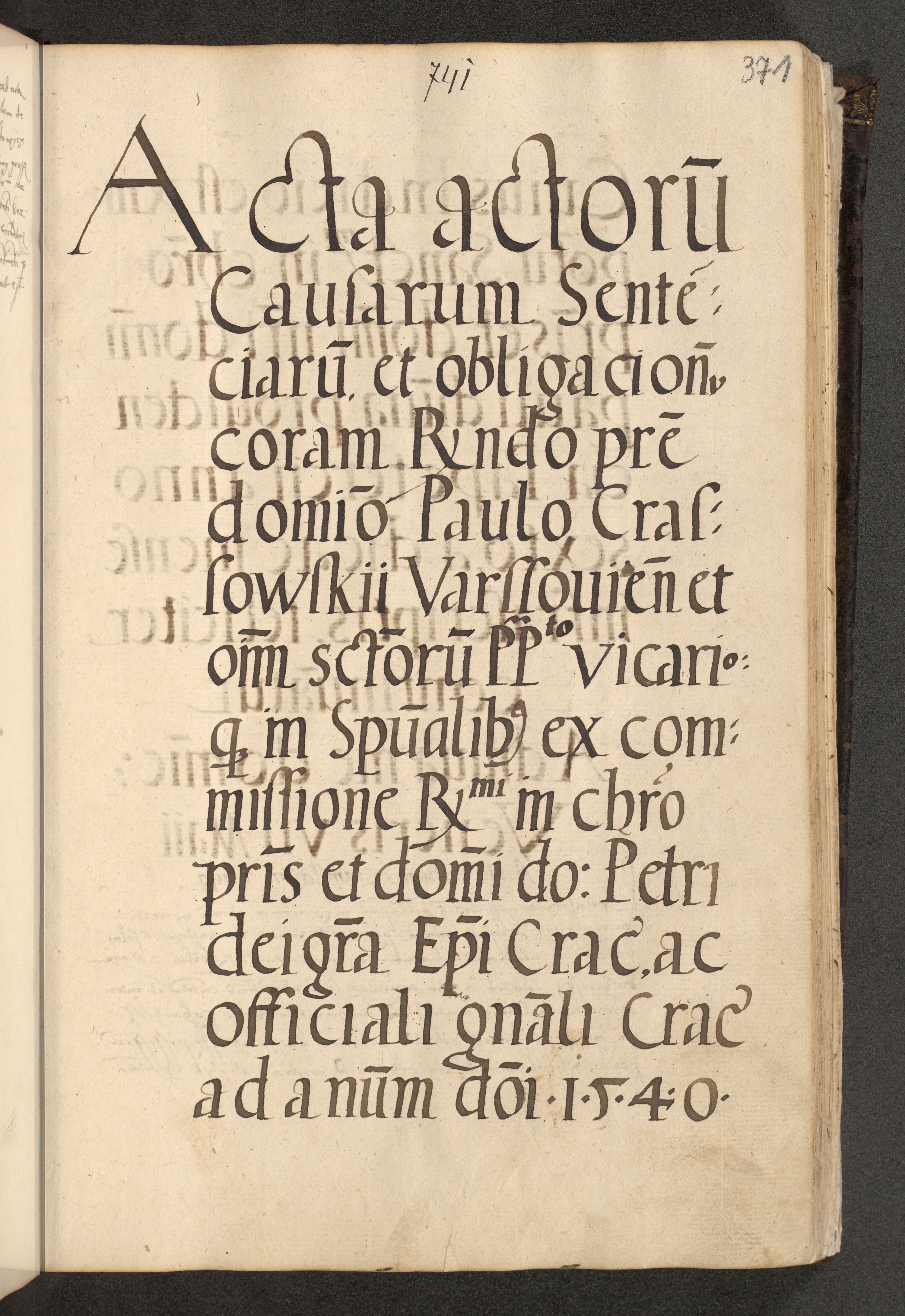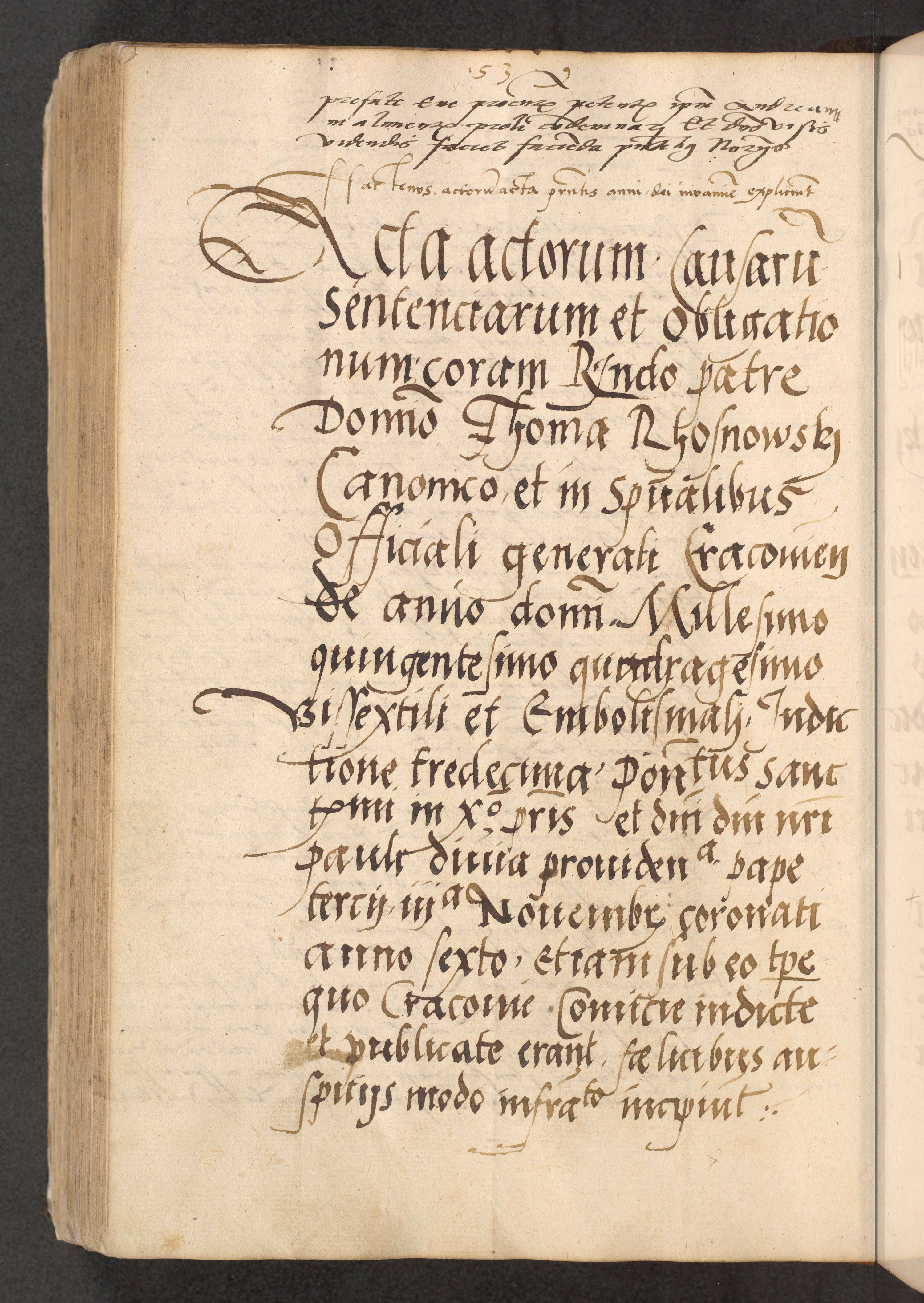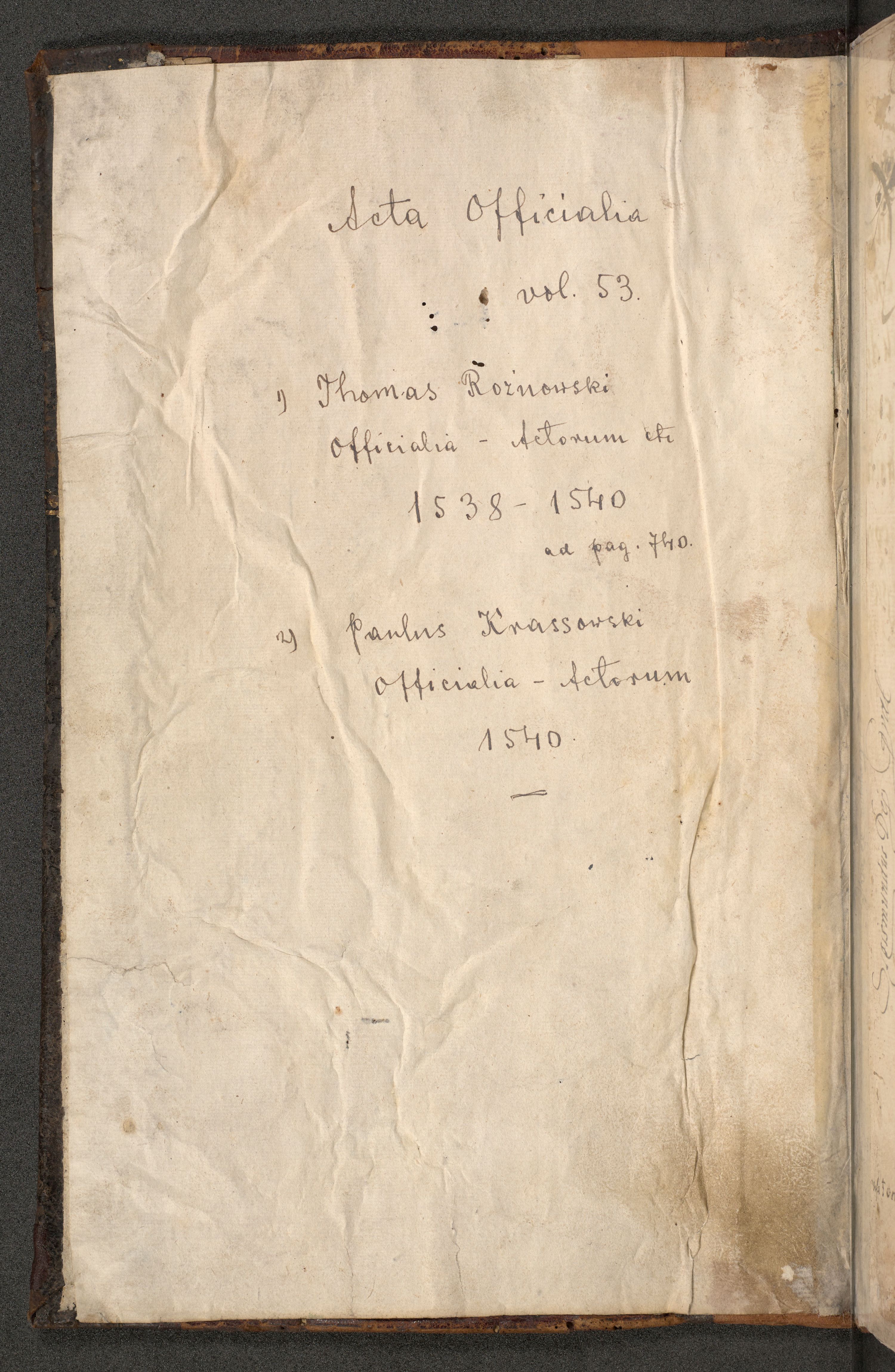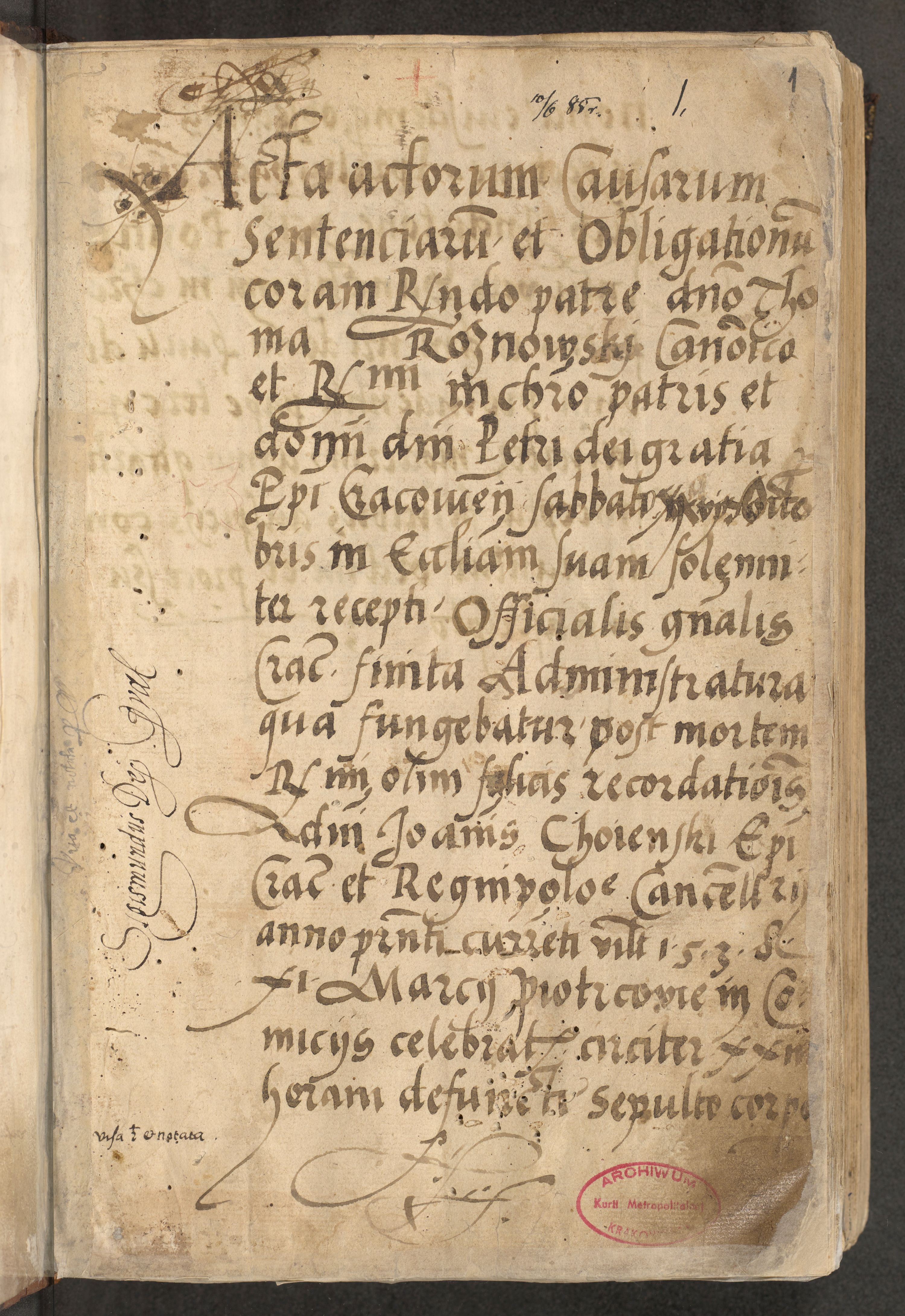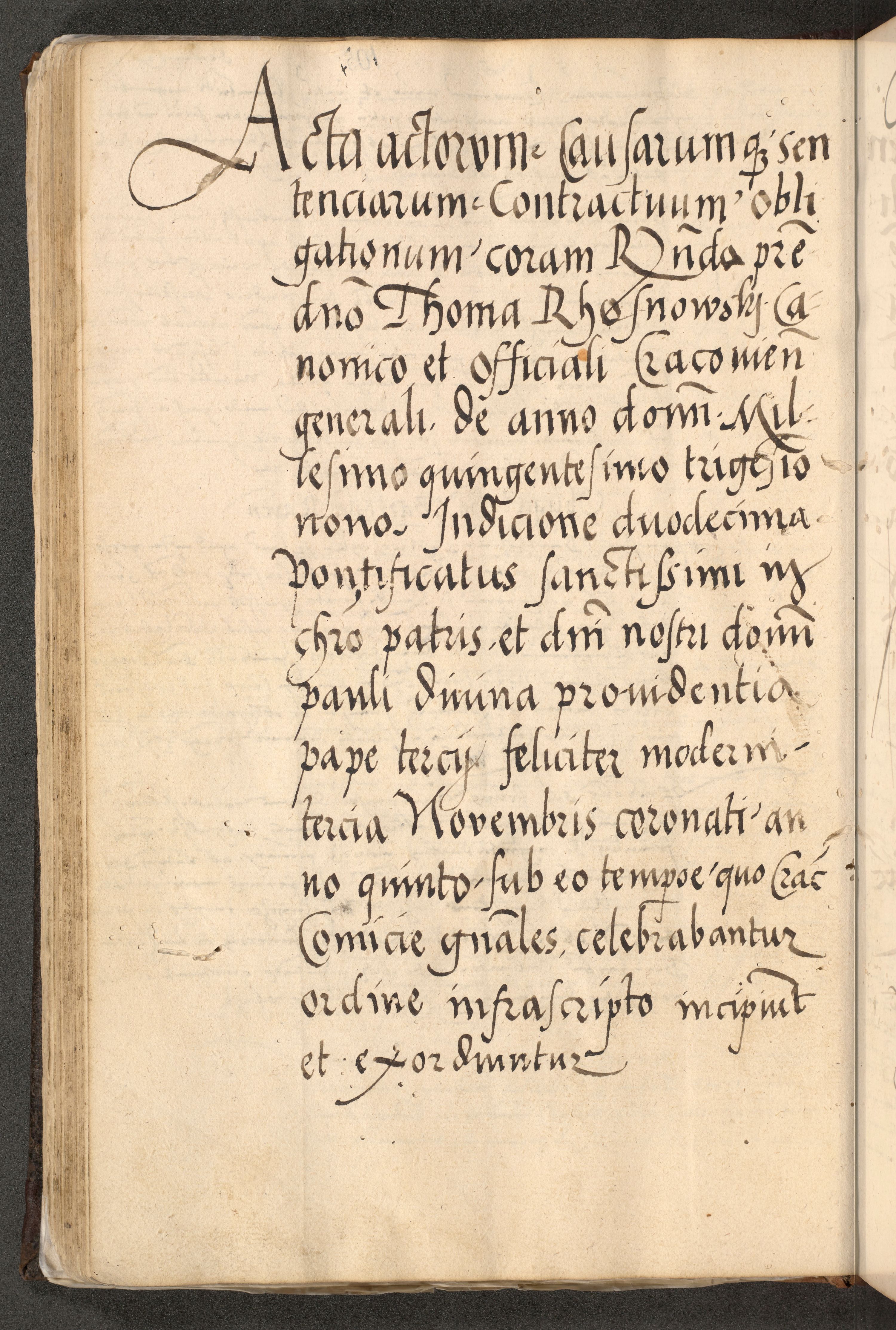 Acta actorum causarum, sentenciarum et obligationum coram reverendo patre domino Thoma Roznowski canonico et reverendissimi in Christo patris et domini domini Patri Dei gratia Cracoviensis. Sabbato, 26 Octobris in ecclesiam suam solenniter recepti officialis generalis Cracoviensis dinita administratura, qua fungebatur post mortem reverendissimi olim felicis recordationis domini Joannis Choiecki episcopi Cracoviensis et Regni Polonie cancelarii anno presenti currenti videlicet 1538, die 11 Marcii Piotrcovie in comiciis celebratis circiter 23 horam defuncti sepulto corpore nona eiusdemque obsequiis X respective Aprilis peractis electo sub indictione XI, pontificatu vero sanctissimi in Christo patris et domini nostri domini Pauli divina providencia pape tercii foeliciter moderni, anno quarto, incepta felicibus auspiciis continuantur ordine processu infrascripto