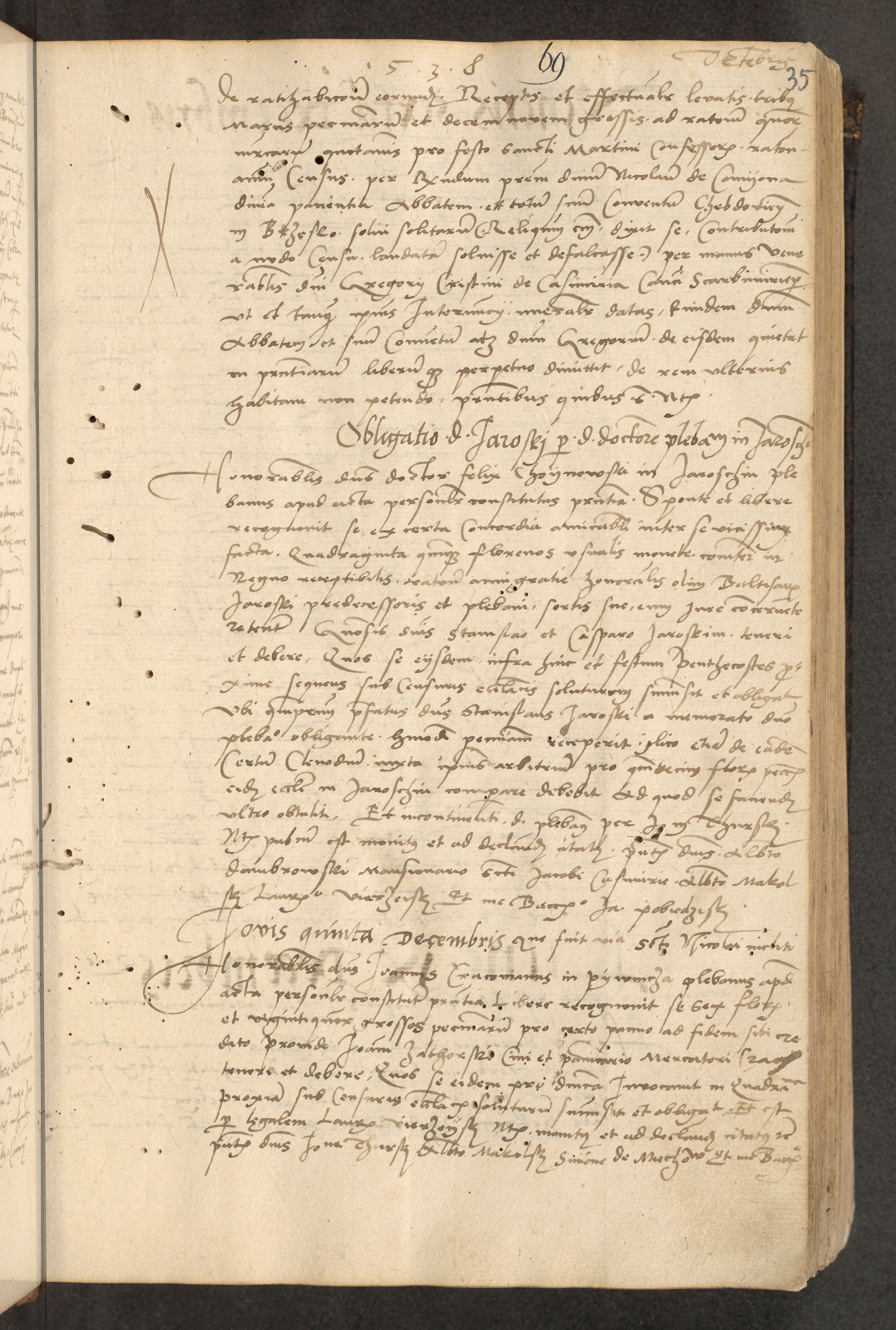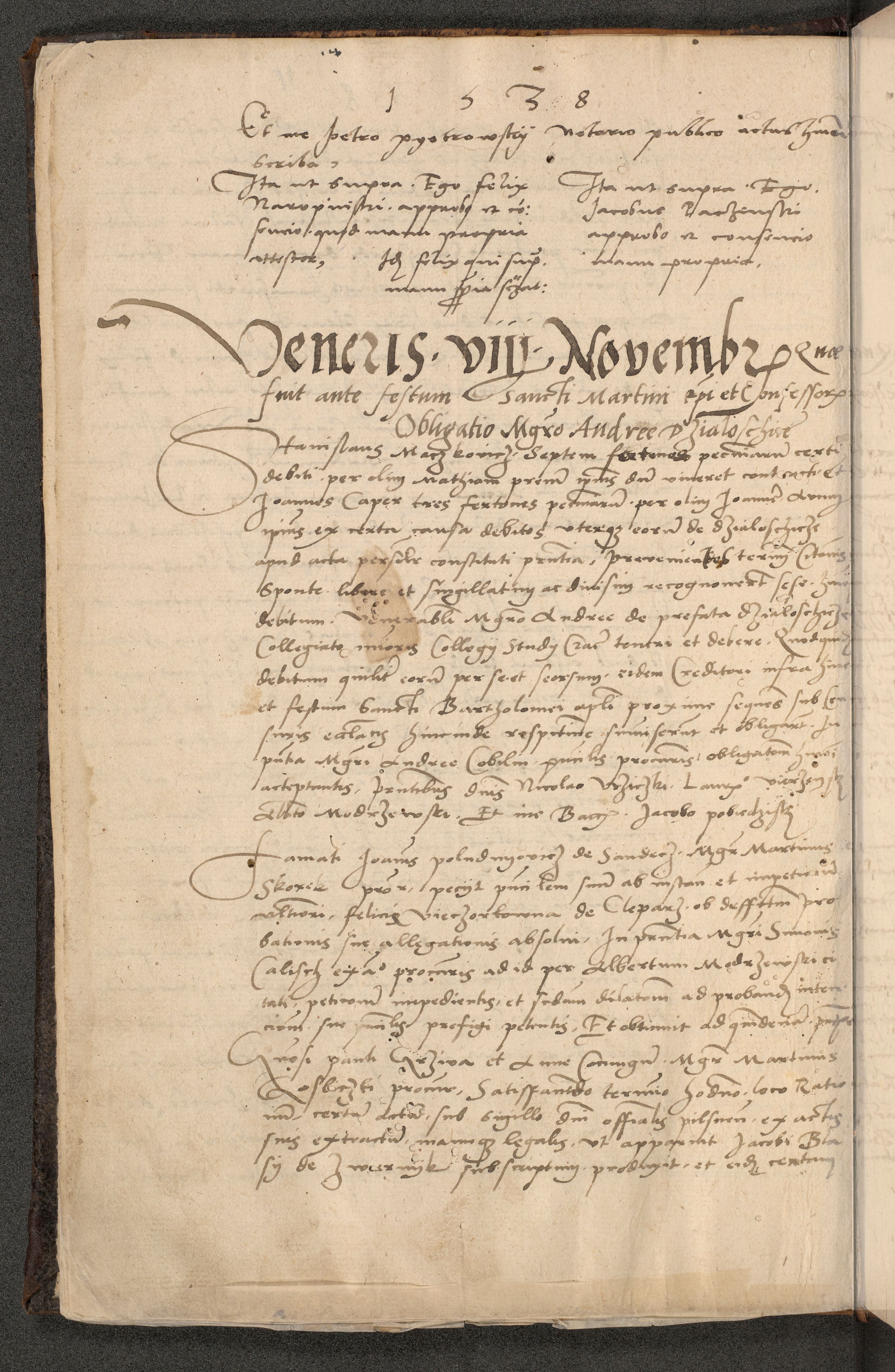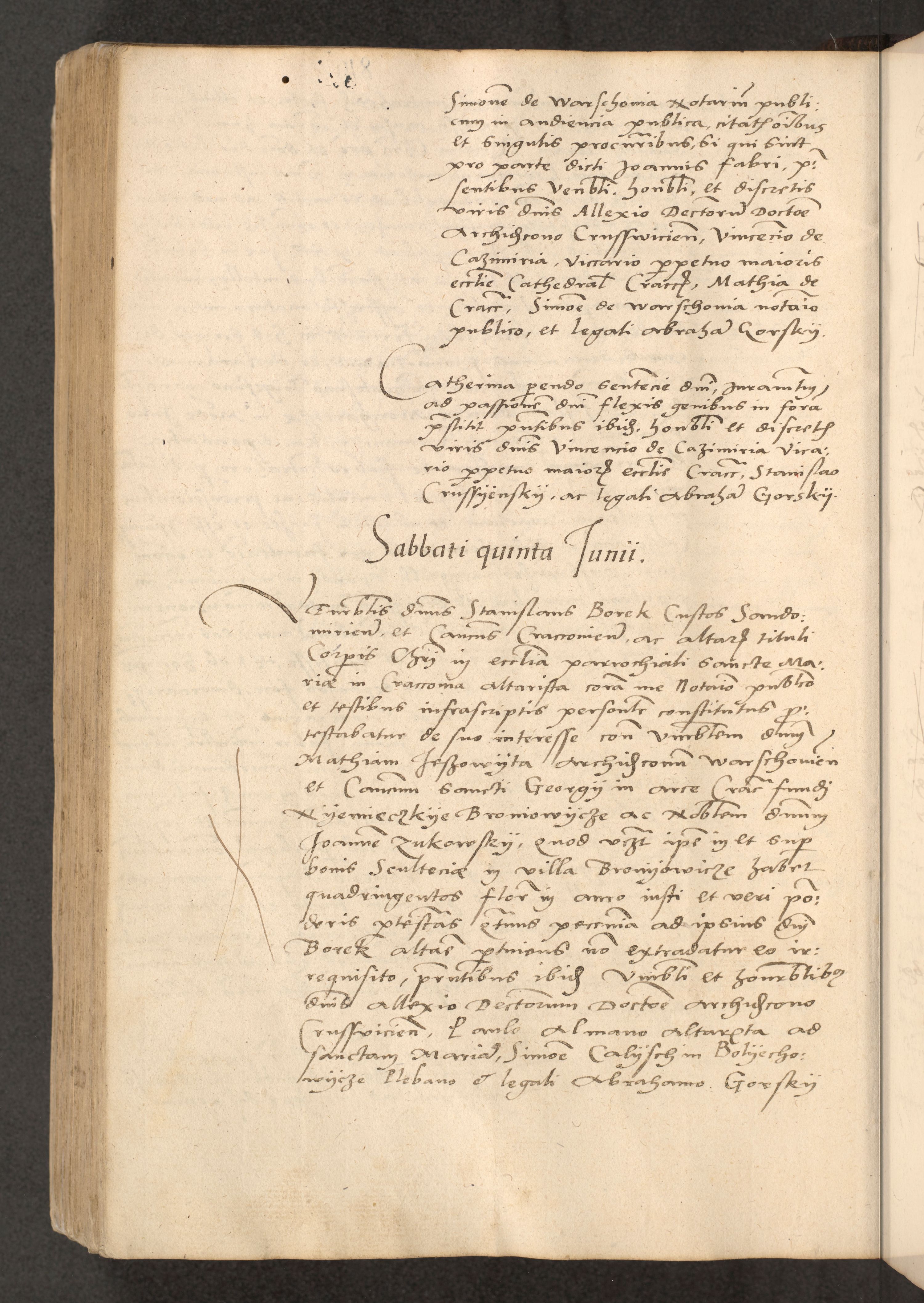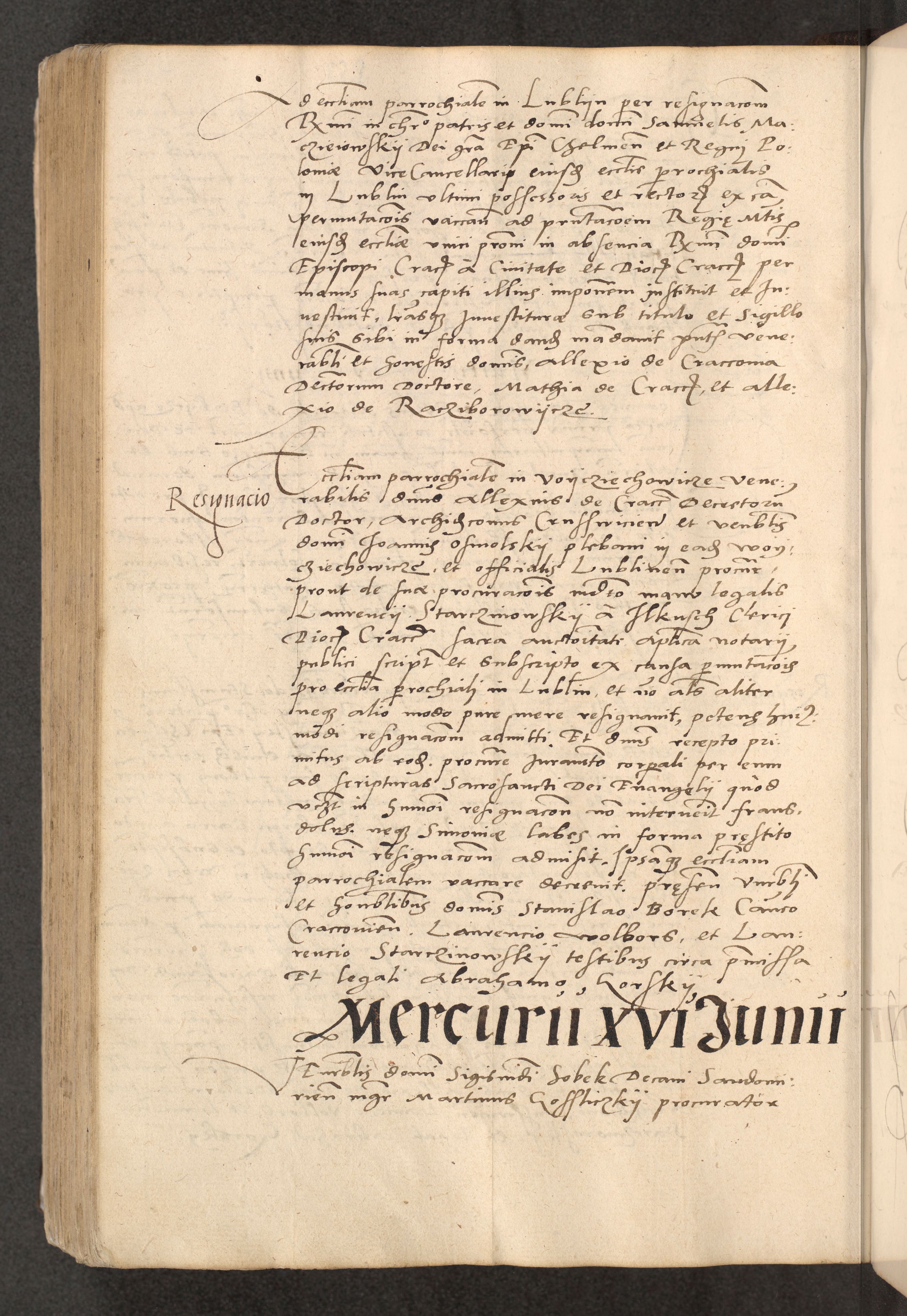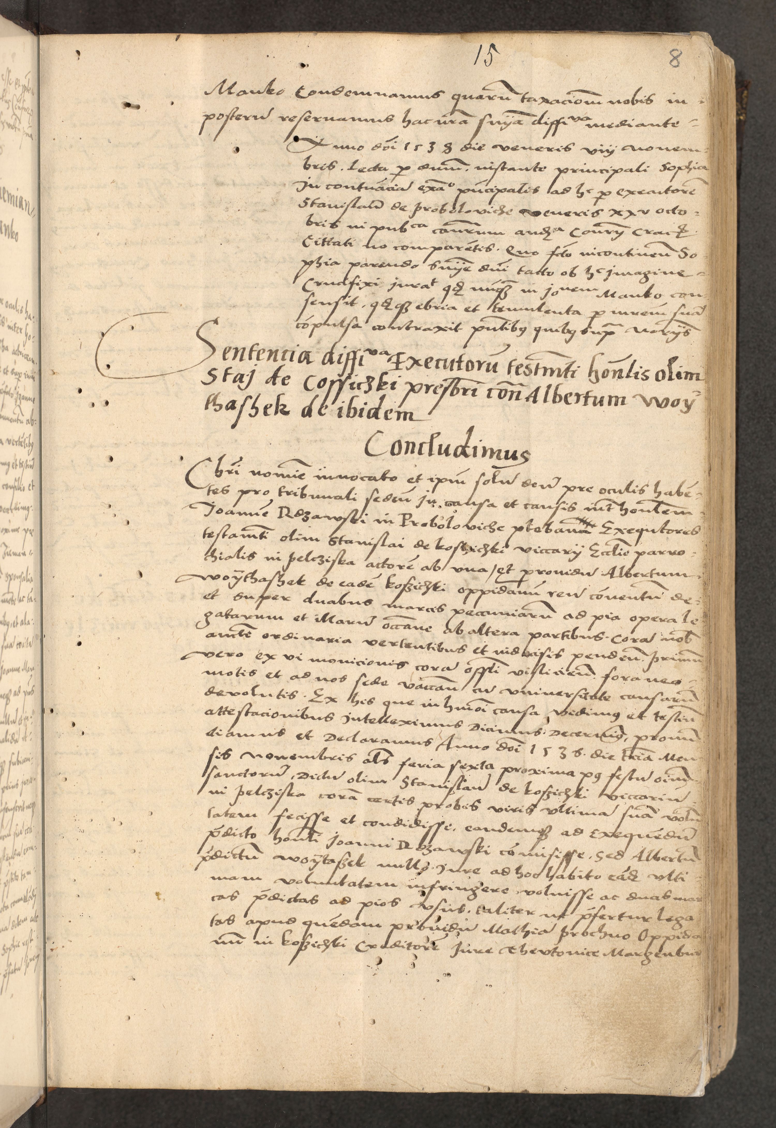 Acta actorum causarum, sentenciarum et obligationum coram reverendo patre domino Thoma Roznowski canonico et reverendissimi in Christo patris et domini domini Patri Dei gratia Cracoviensis. Sabbato, 26 Octobris in ecclesiam suam solenniter recepti officialis generalis Cracoviensis dinita administratura, qua fungebatur post mortem reverendissimi olim felicis recordationis domini Joannis Choiecki episcopi Cracoviensis et Regni Polonie cancelarii anno presenti currenti videlicet 1538, die 11 Marcii Piotrcovie in comiciis celebratis circiter 23 horam defuncti sepulto corpore nona eiusdemque obsequiis X respective Aprilis peractis electo sub indictione XI, pontificatu vero sanctissimi in Christo patris et domini nostri domini Pauli divina providencia pape tercii foeliciter moderni, anno quarto, incepta felicibus auspiciis continuantur ordine processu infrascripto
