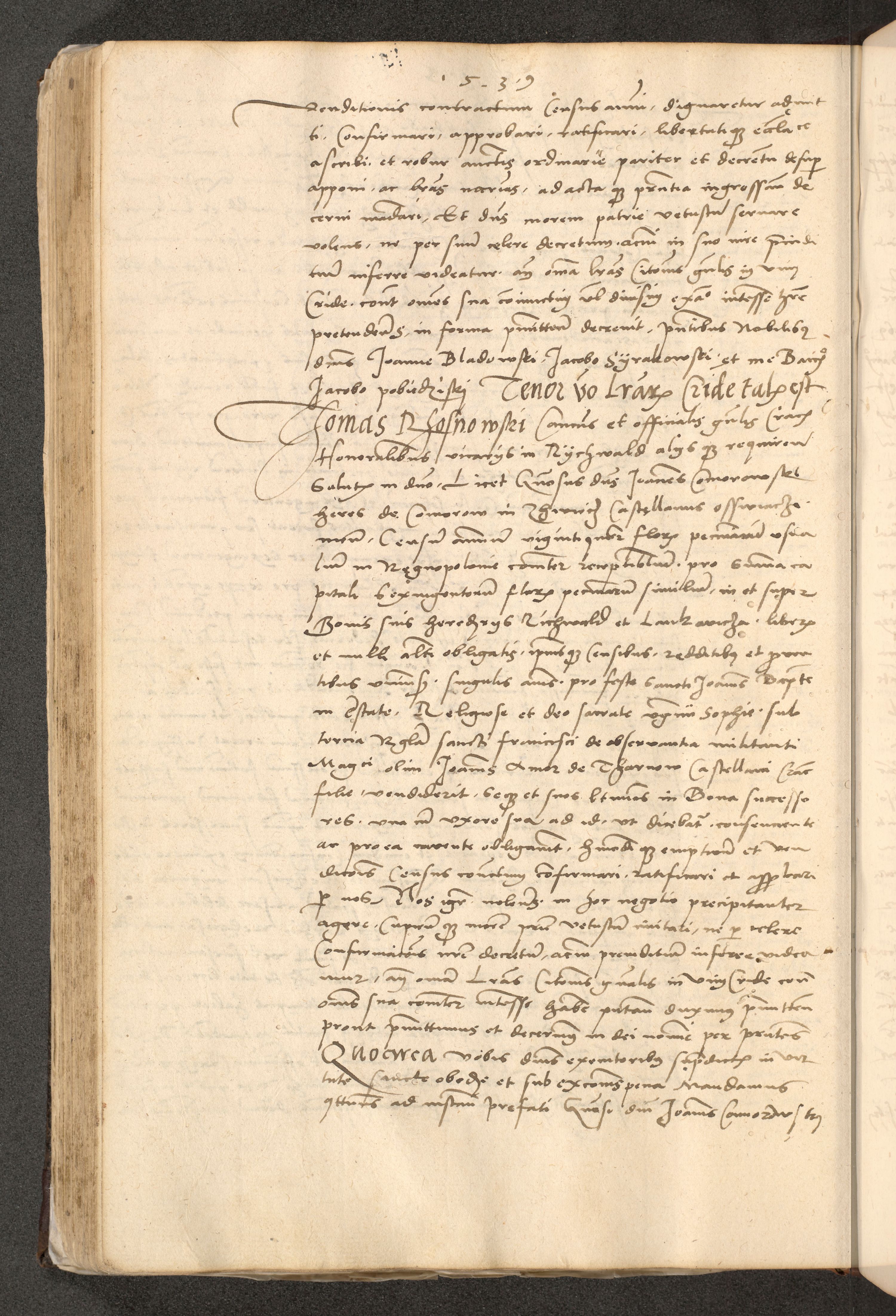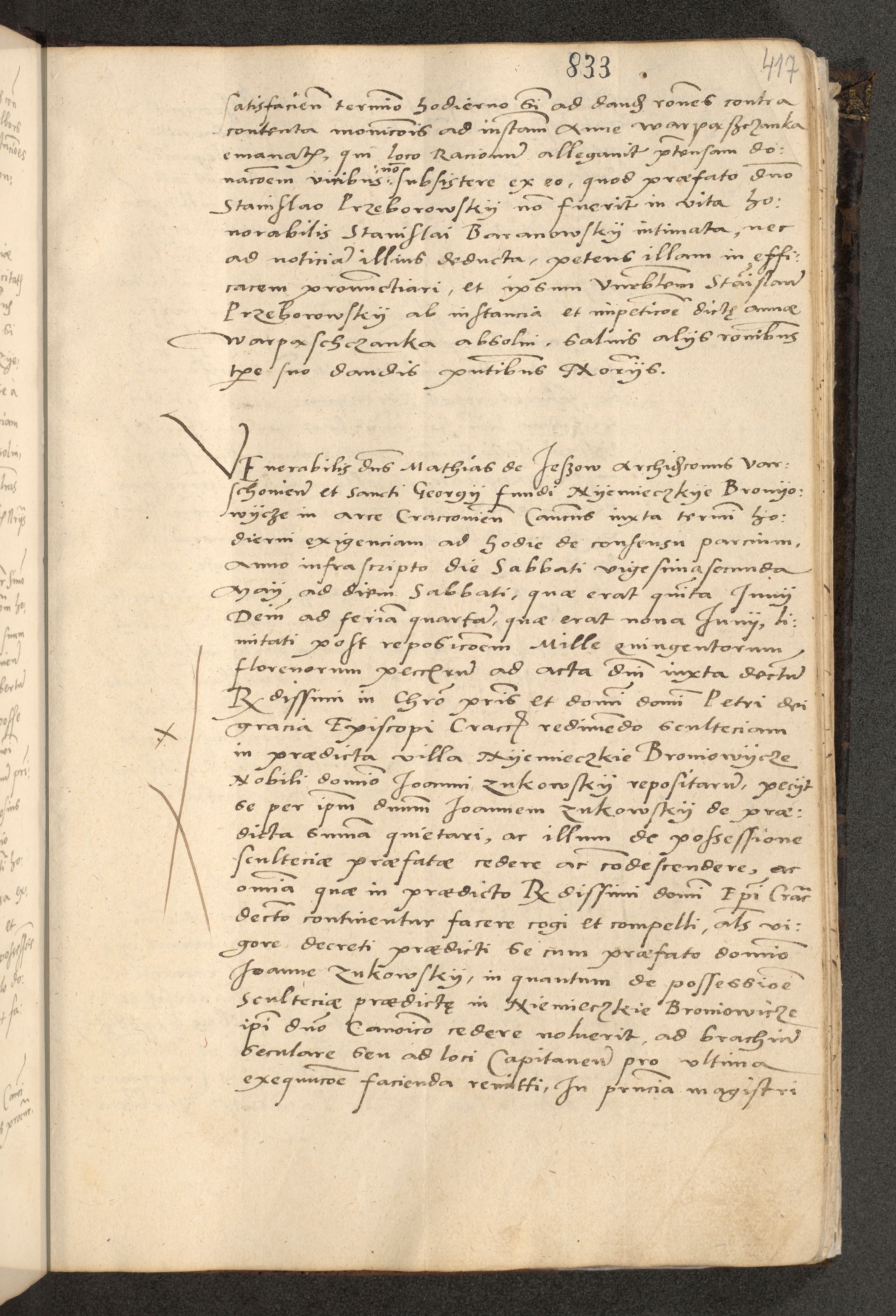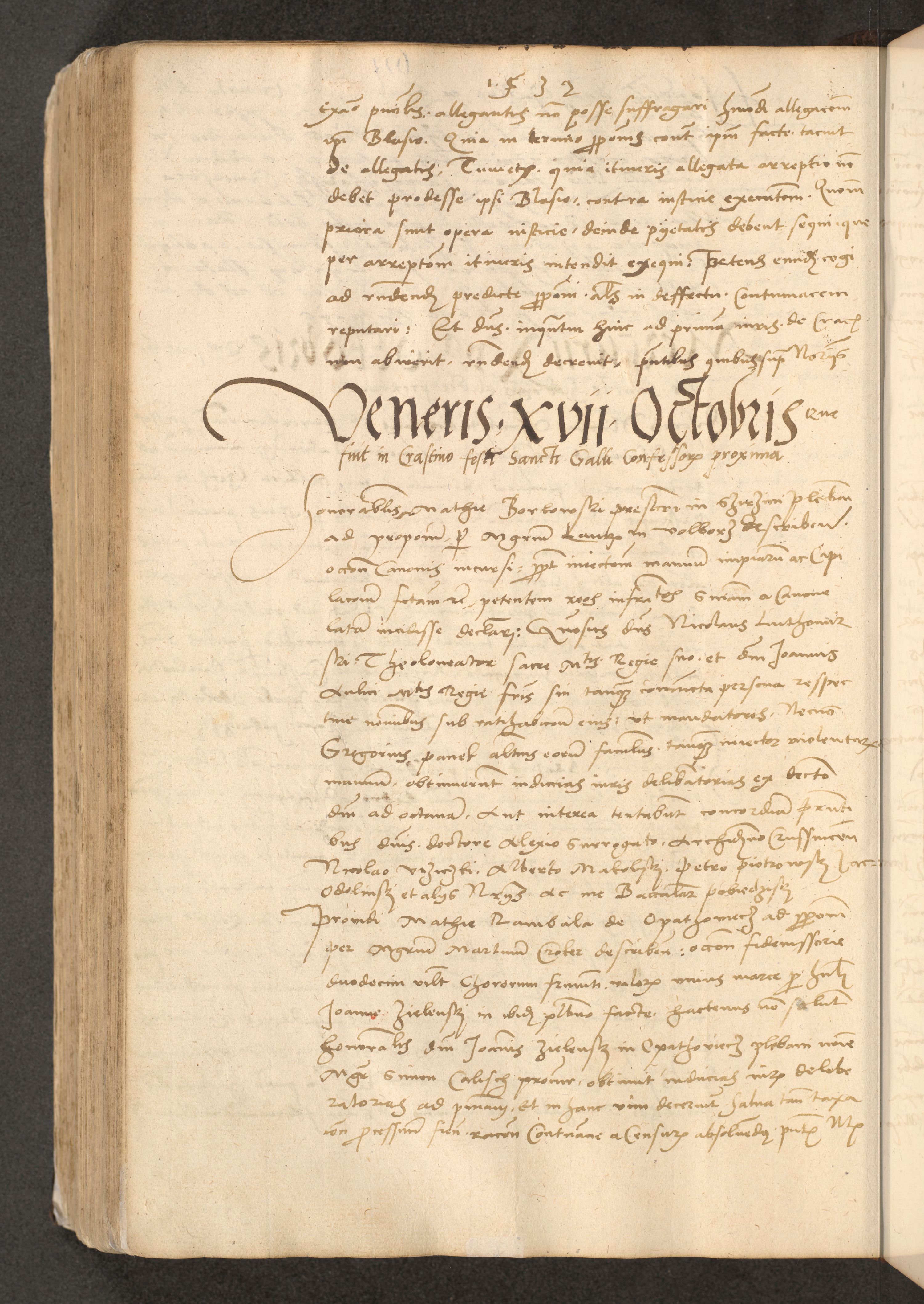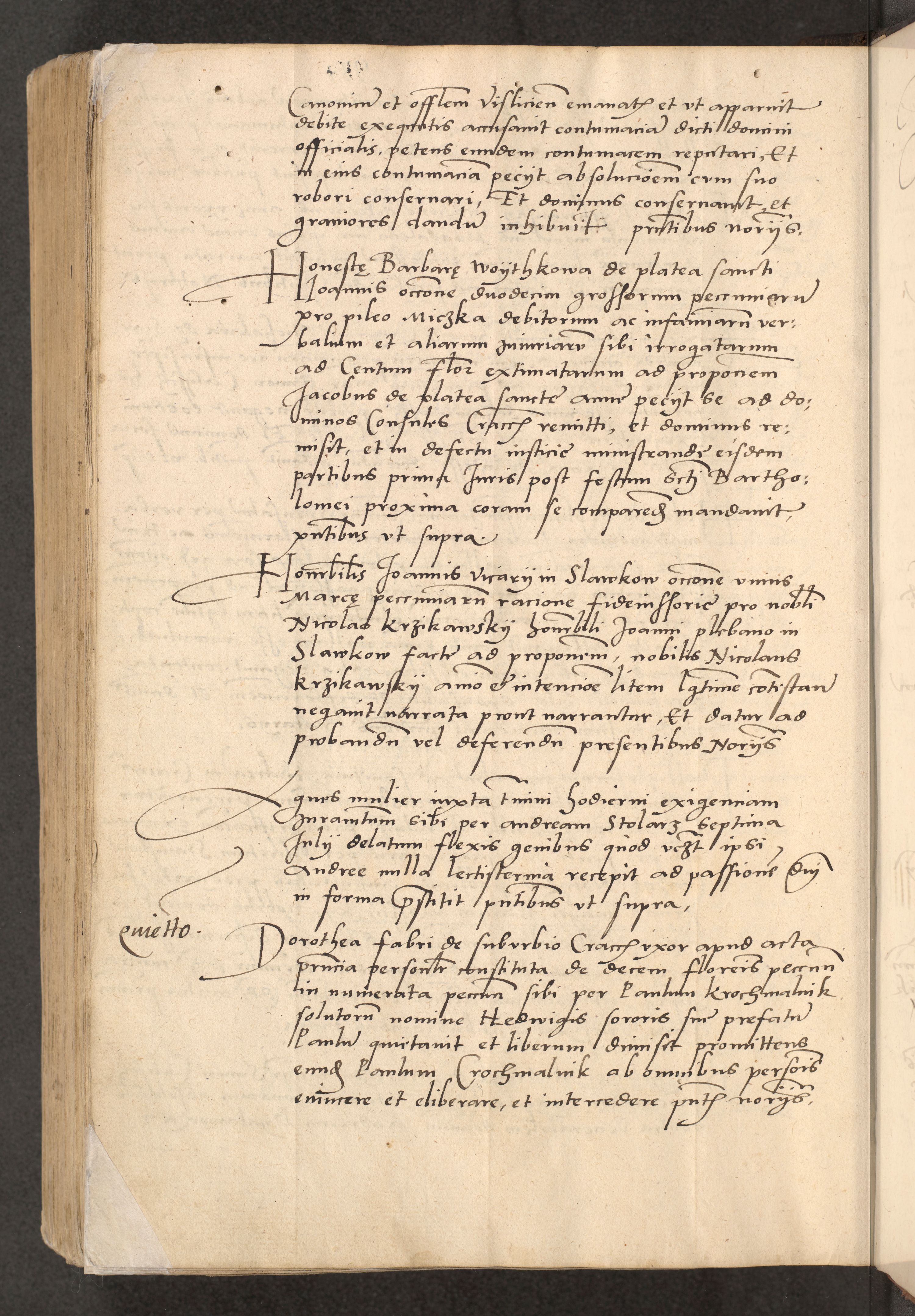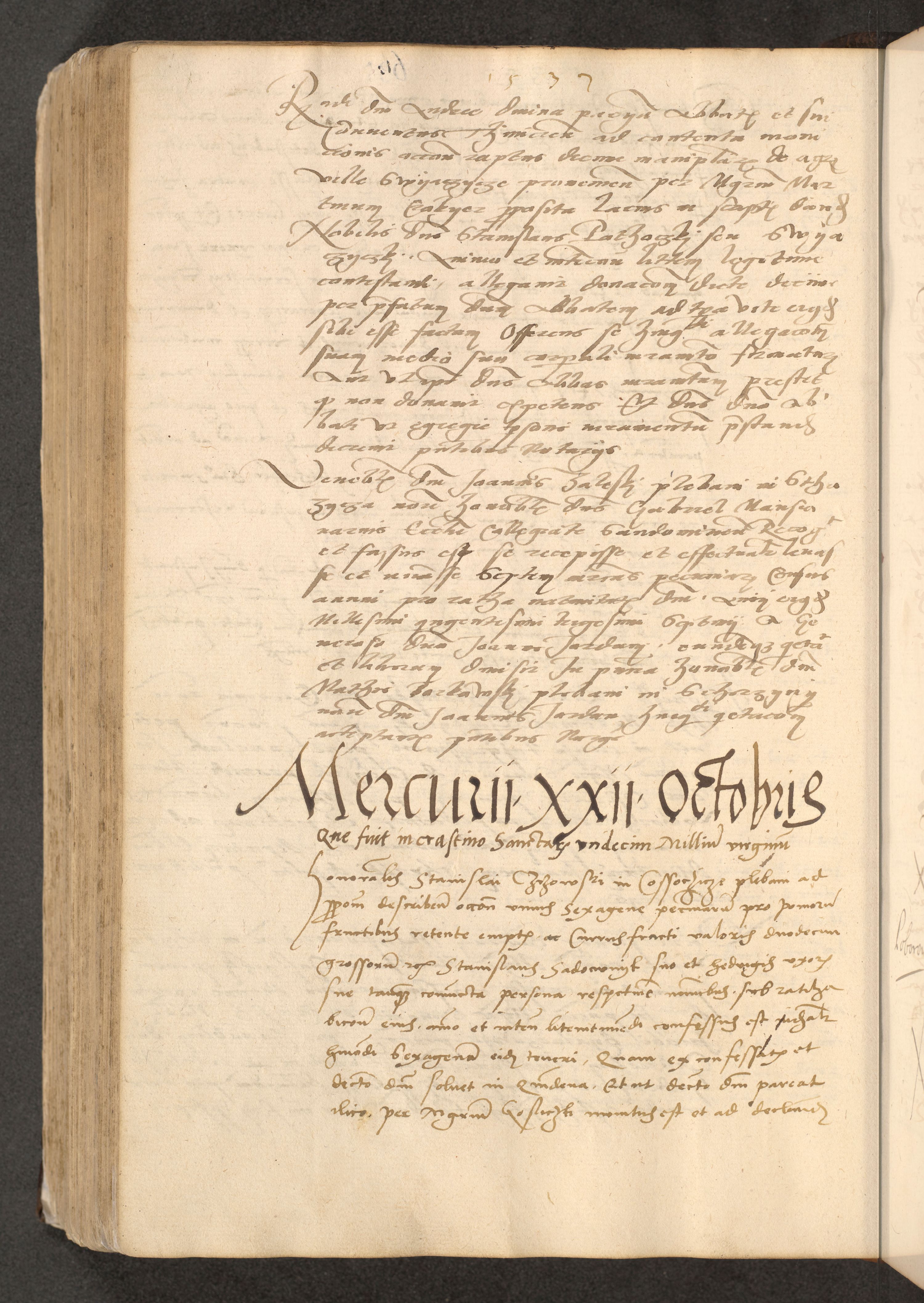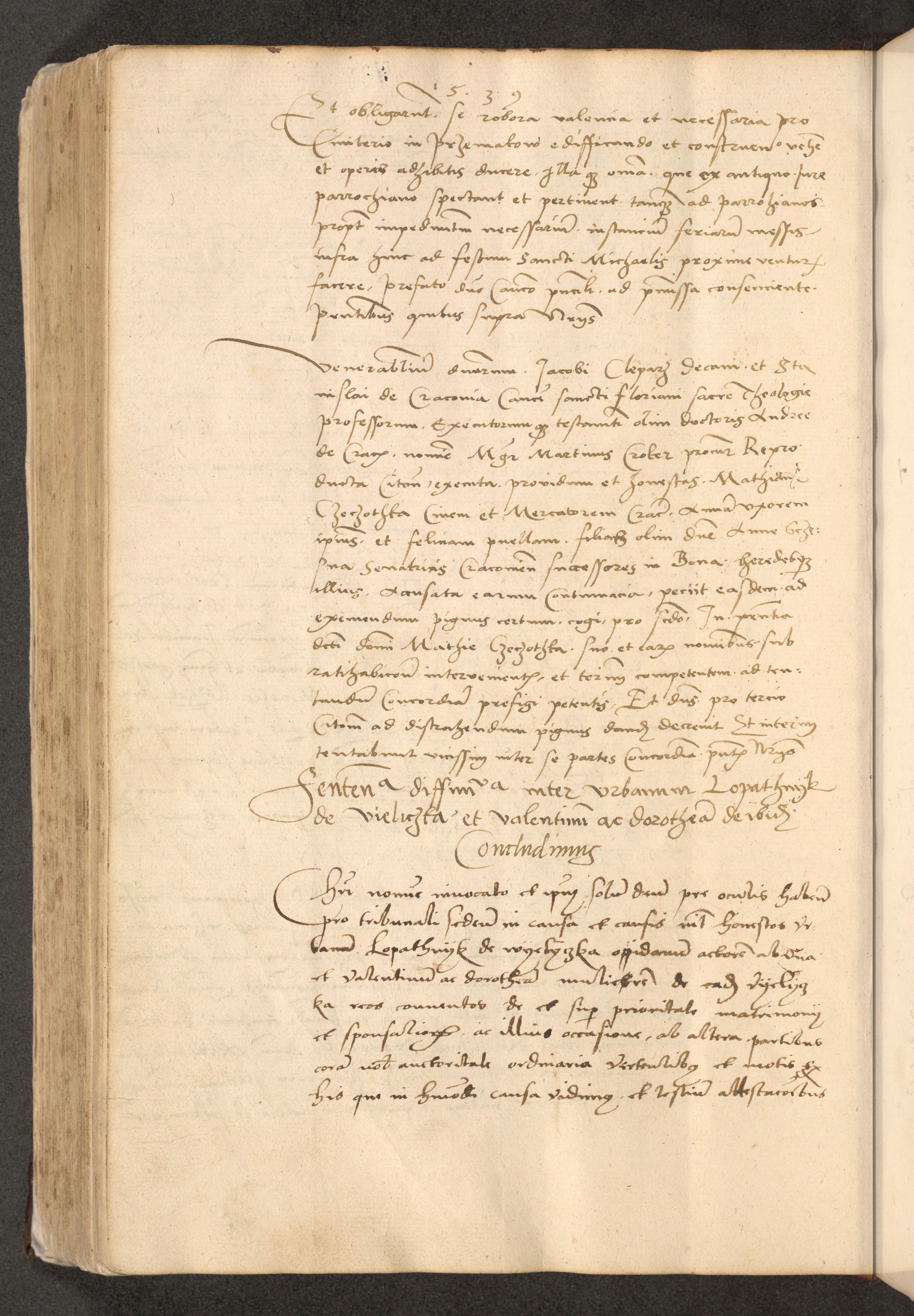 Acta actorum causarum, sentenciarum et obligationum coram reverendo patre domino Thoma Roznowski canonico et reverendissimi in Christo patris et domini domini Patri Dei gratia Cracoviensis. Sabbato, 26 Octobris in ecclesiam suam solenniter recepti officialis generalis Cracoviensis dinita administratura, qua fungebatur post mortem reverendissimi olim felicis recordationis domini Joannis Choiecki episcopi Cracoviensis et Regni Polonie cancelarii anno presenti currenti videlicet 1538, die 11 Marcii Piotrcovie in comiciis celebratis circiter 23 horam defuncti sepulto corpore nona eiusdemque obsequiis X respective Aprilis peractis electo sub indictione XI, pontificatu vero sanctissimi in Christo patris et domini nostri domini Pauli divina providencia pape tercii foeliciter moderni, anno quarto, incepta felicibus auspiciis continuantur ordine processu infrascripto