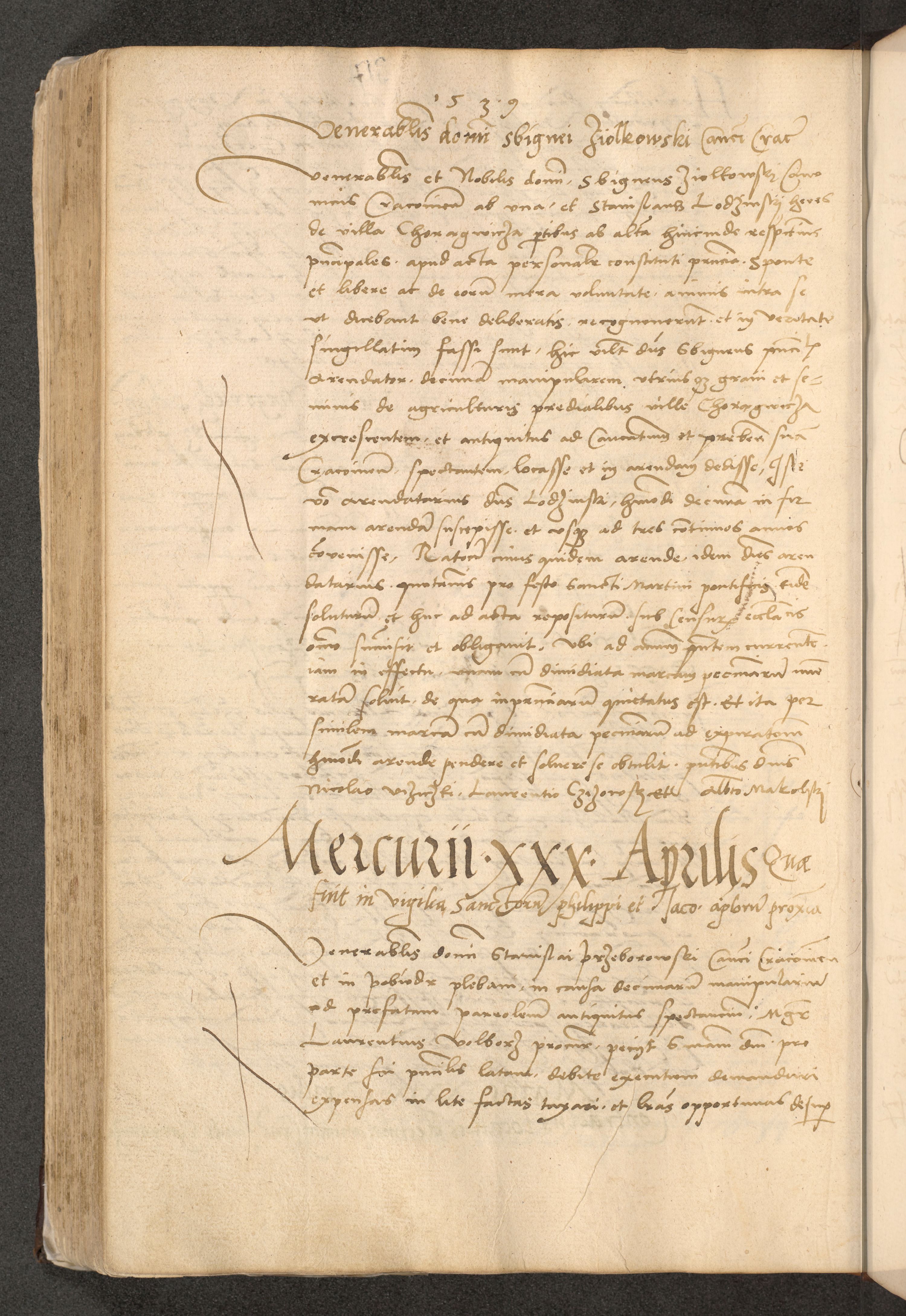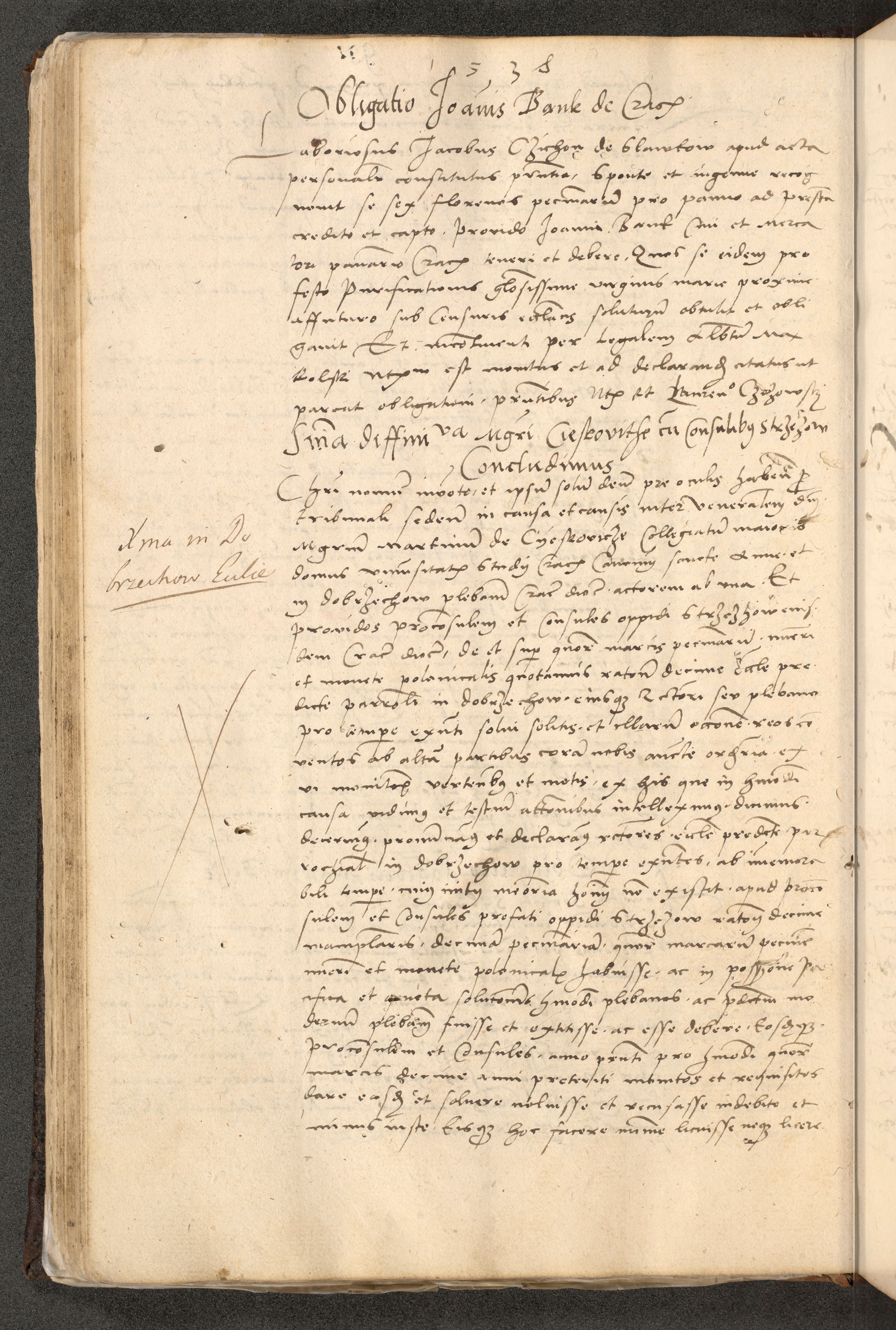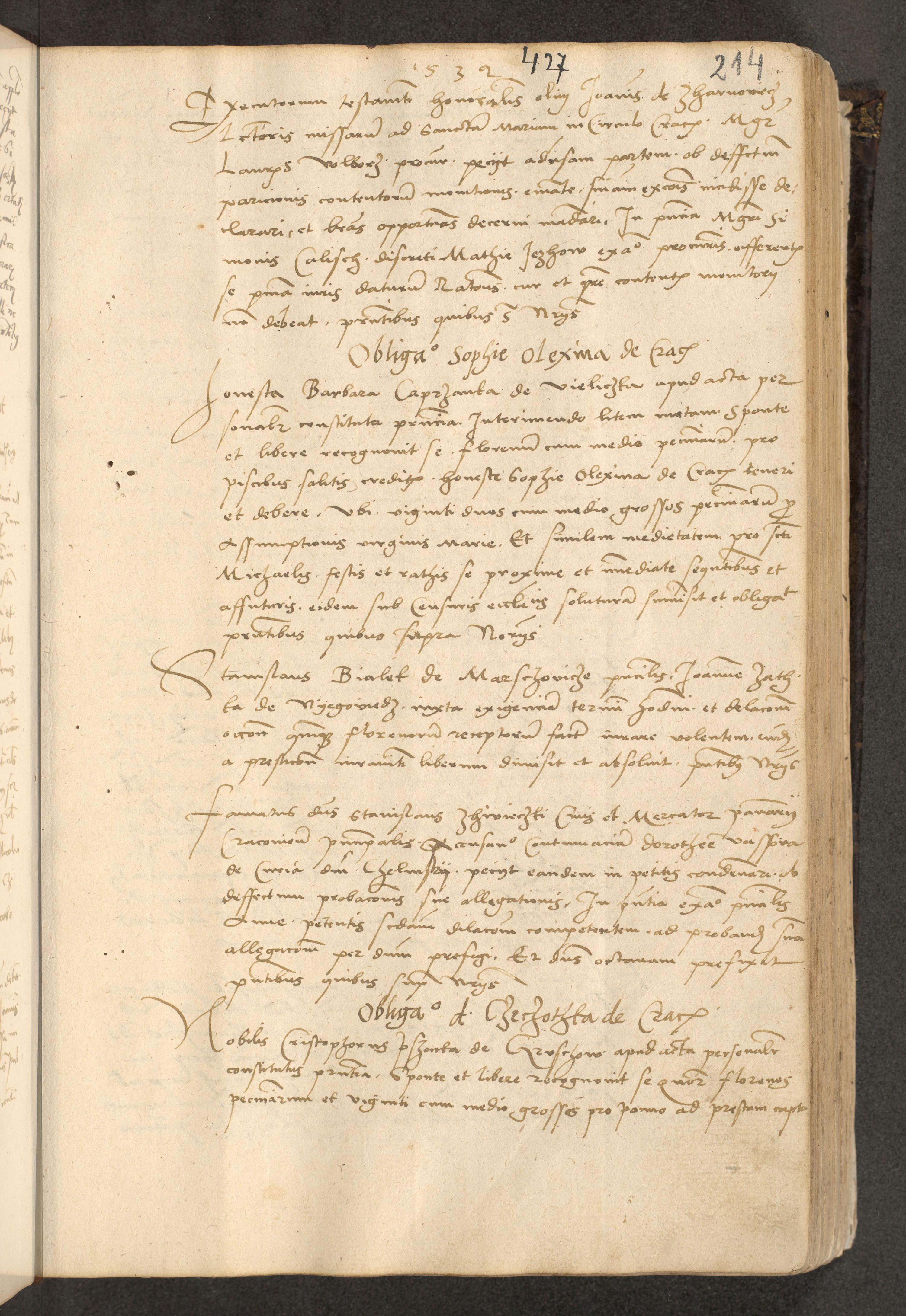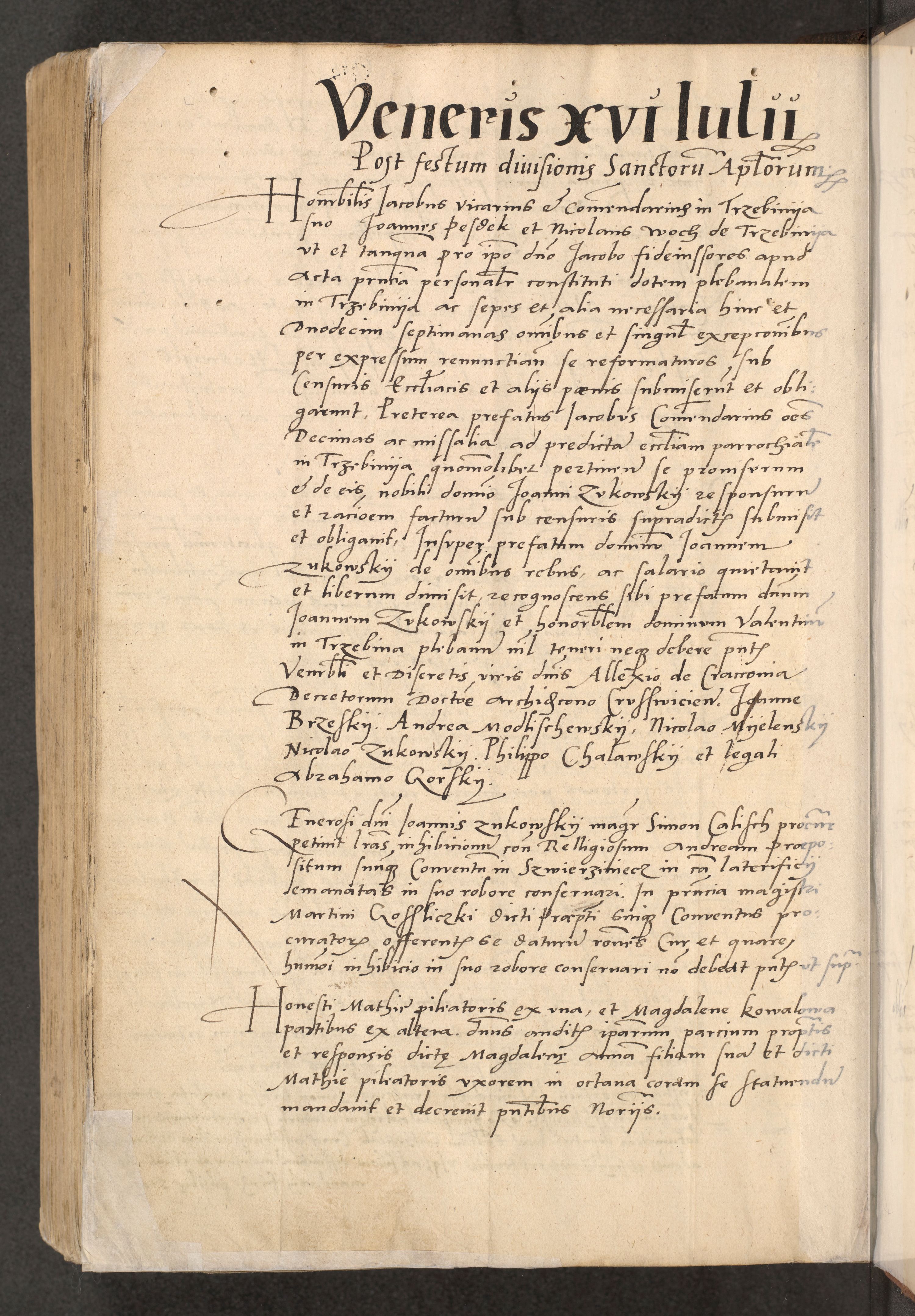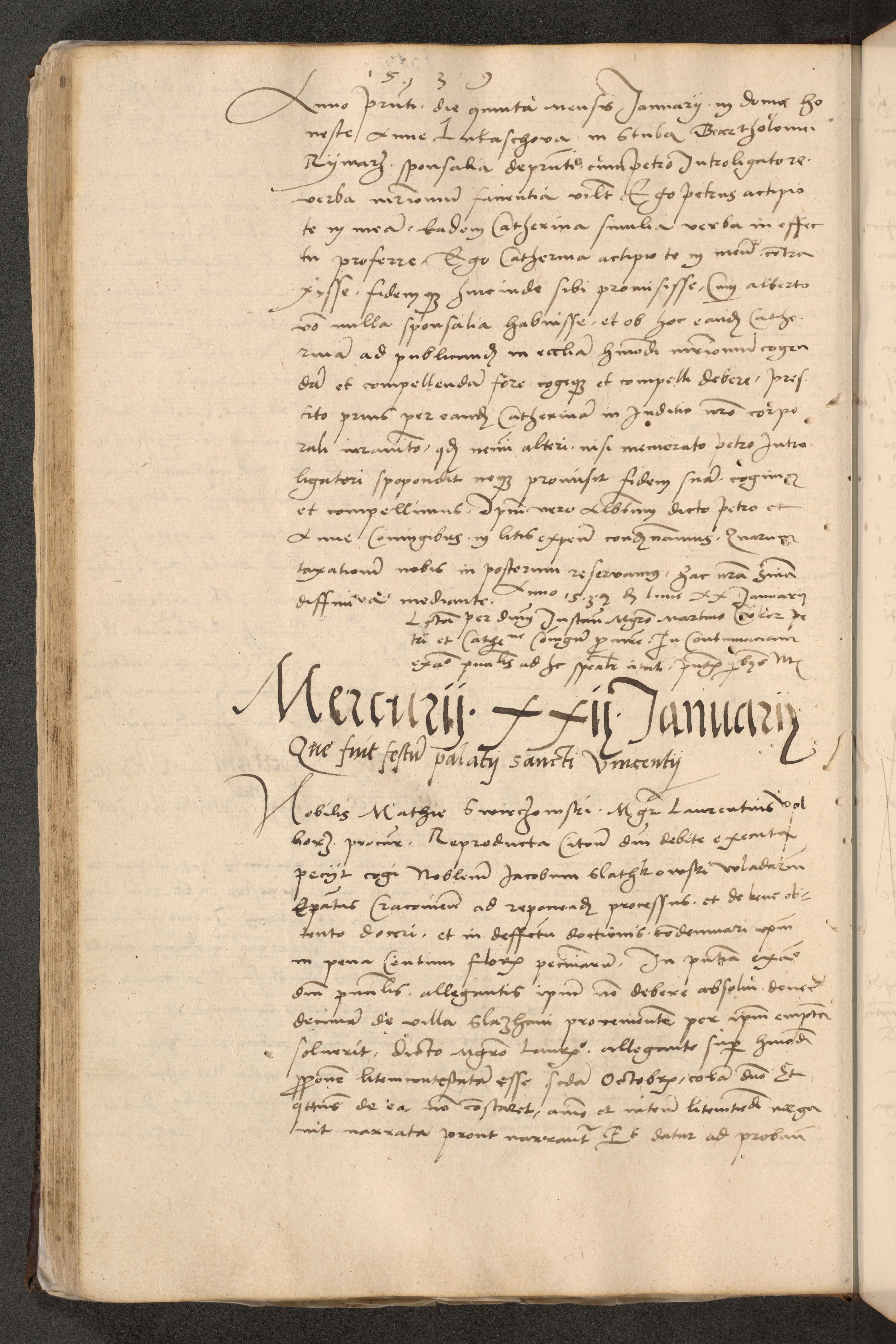 Acta actorum causarum, sentenciarum et obligationum coram reverendo patre domino Thoma Roznowski canonico et reverendissimi in Christo patris et domini domini Patri Dei gratia Cracoviensis. Sabbato, 26 Octobris in ecclesiam suam solenniter recepti officialis generalis Cracoviensis dinita administratura, qua fungebatur post mortem reverendissimi olim felicis recordationis domini Joannis Choiecki episcopi Cracoviensis et Regni Polonie cancelarii anno presenti currenti videlicet 1538, die 11 Marcii Piotrcovie in comiciis celebratis circiter 23 horam defuncti sepulto corpore nona eiusdemque obsequiis X respective Aprilis peractis electo sub indictione XI, pontificatu vero sanctissimi in Christo patris et domini nostri domini Pauli divina providencia pape tercii foeliciter moderni, anno quarto, incepta felicibus auspiciis continuantur ordine processu infrascripto