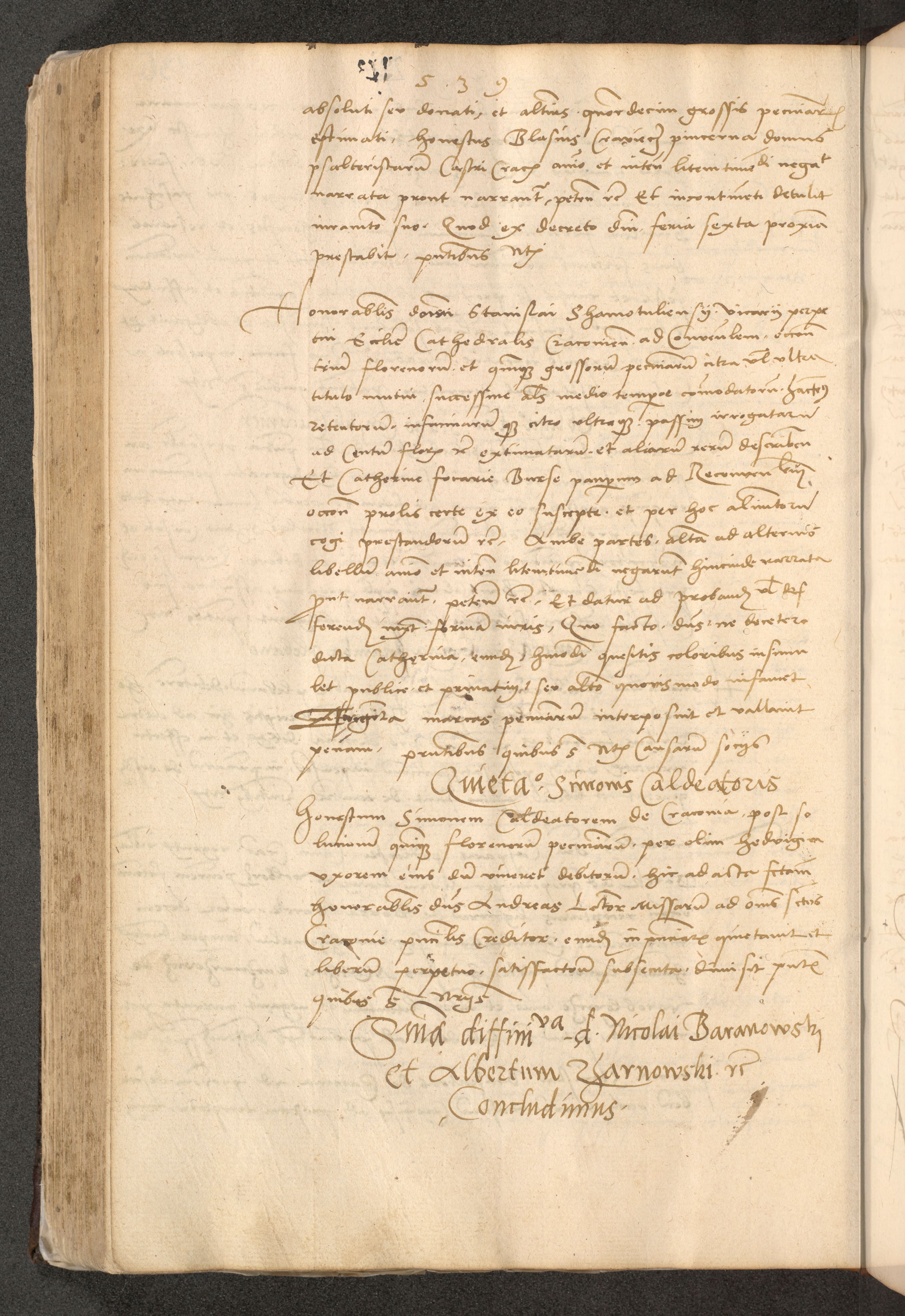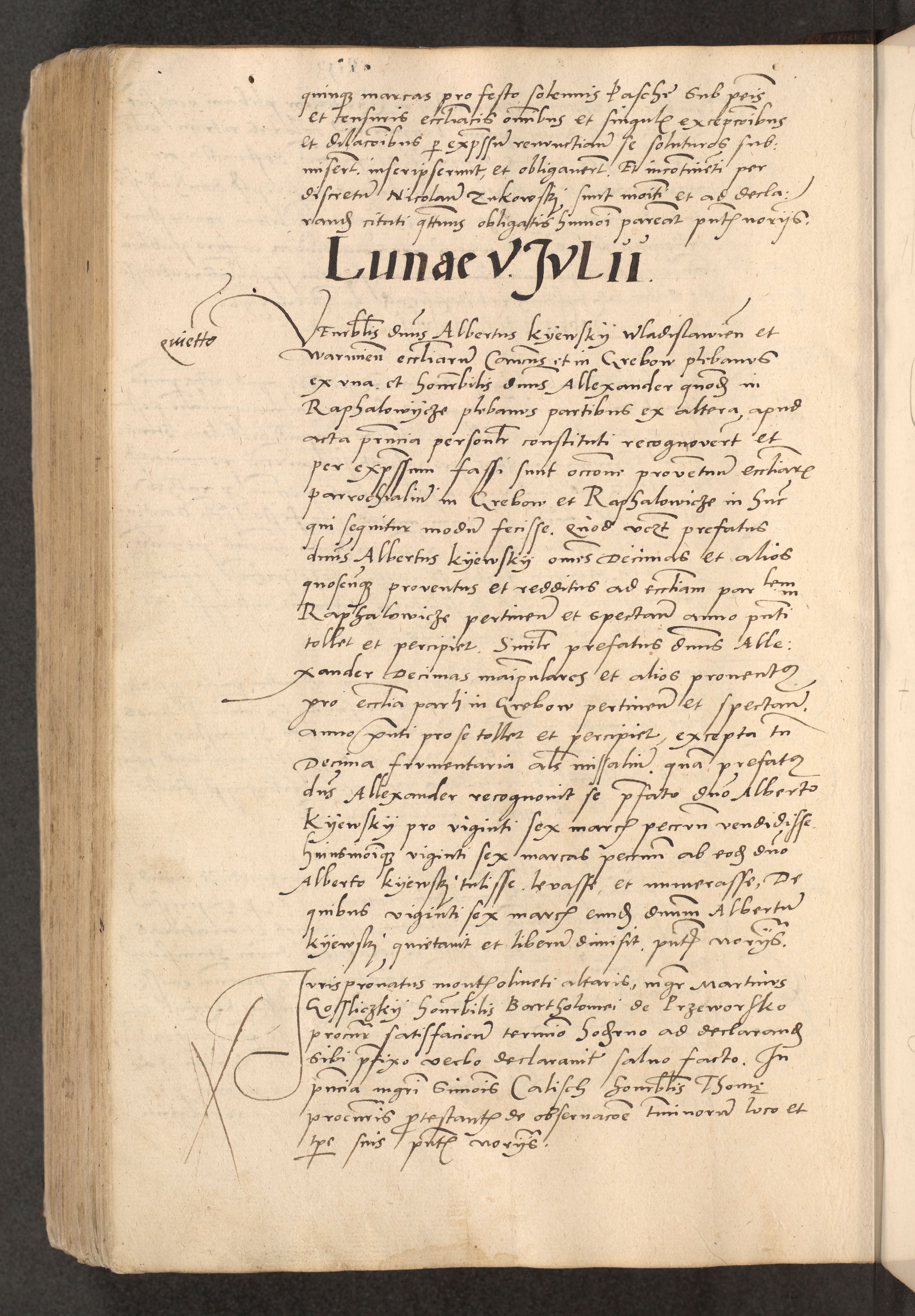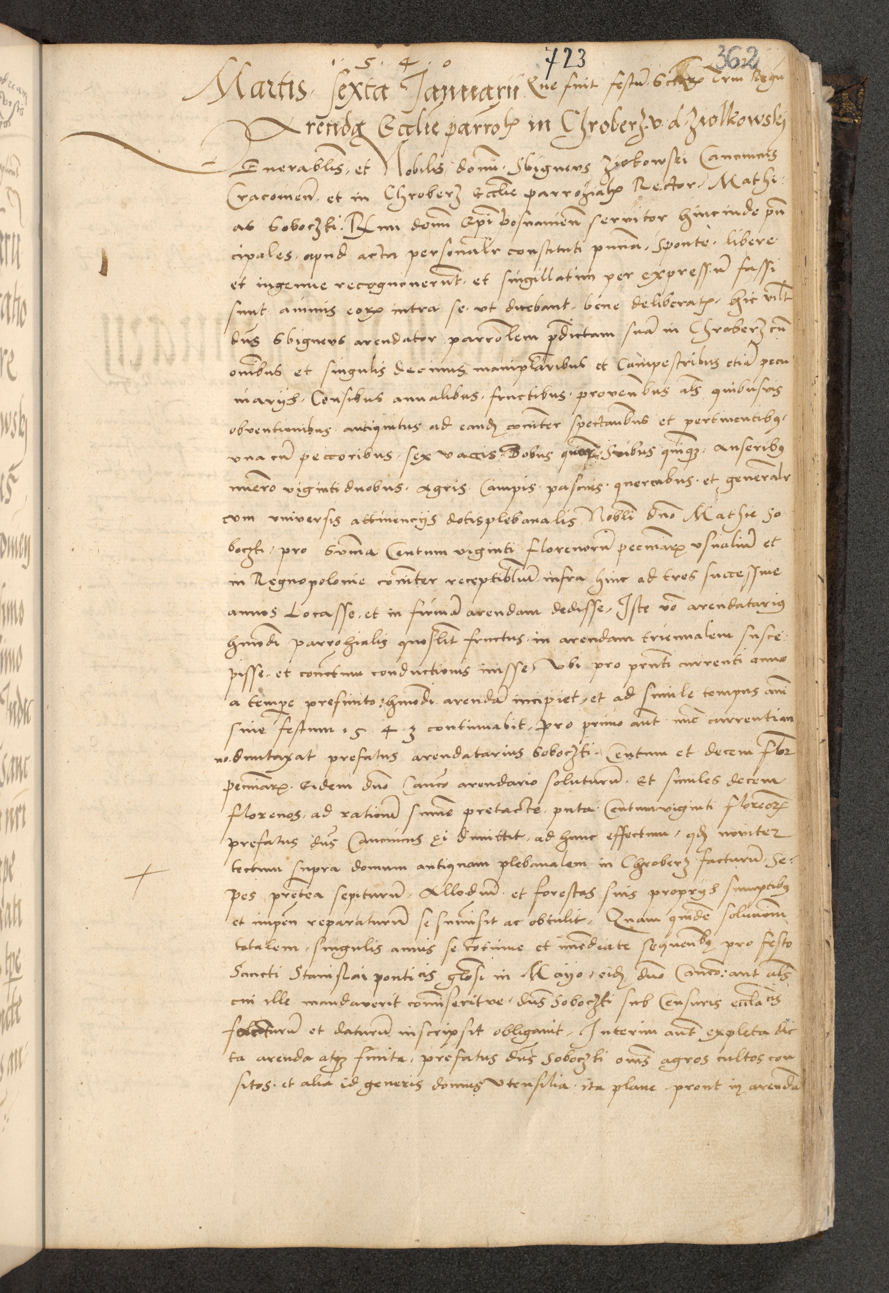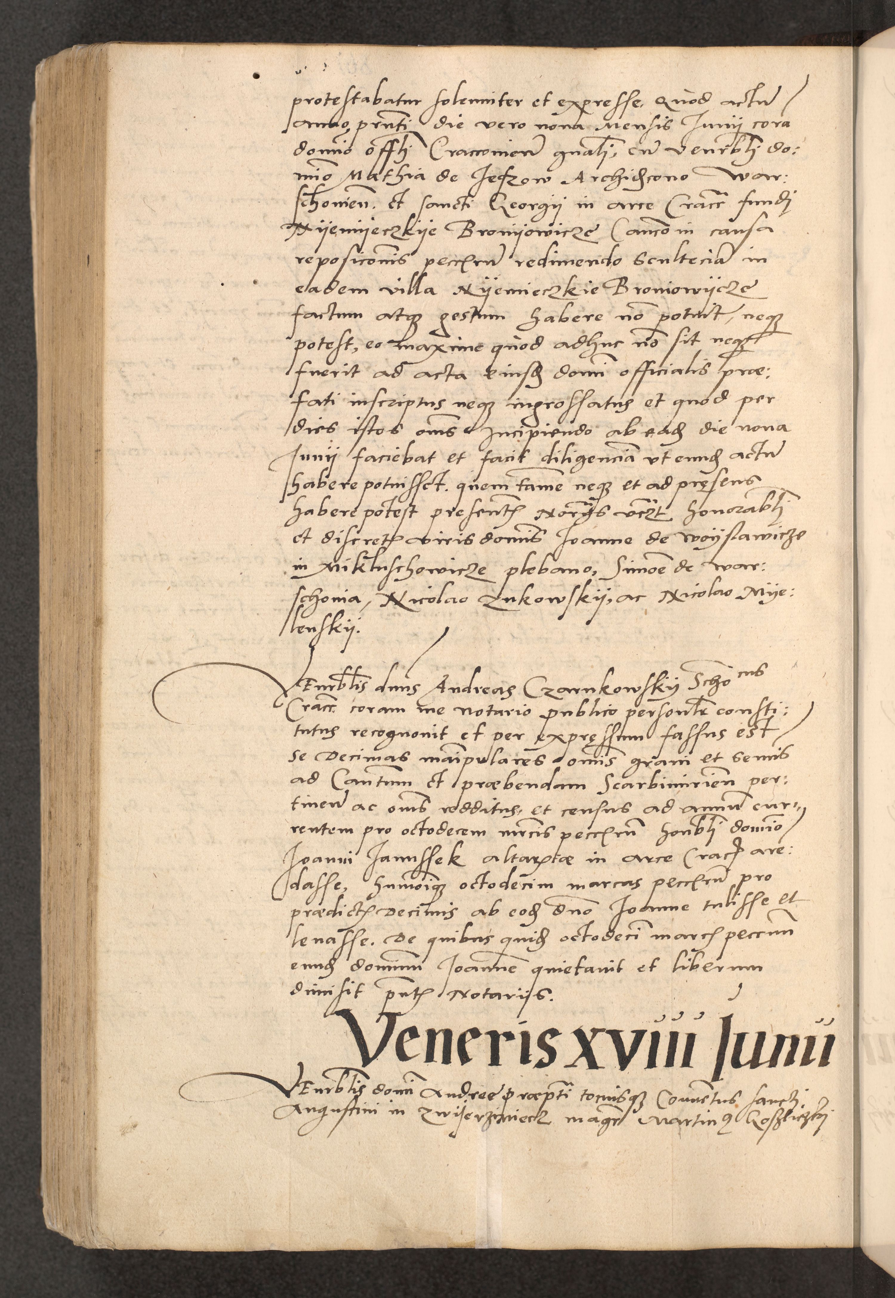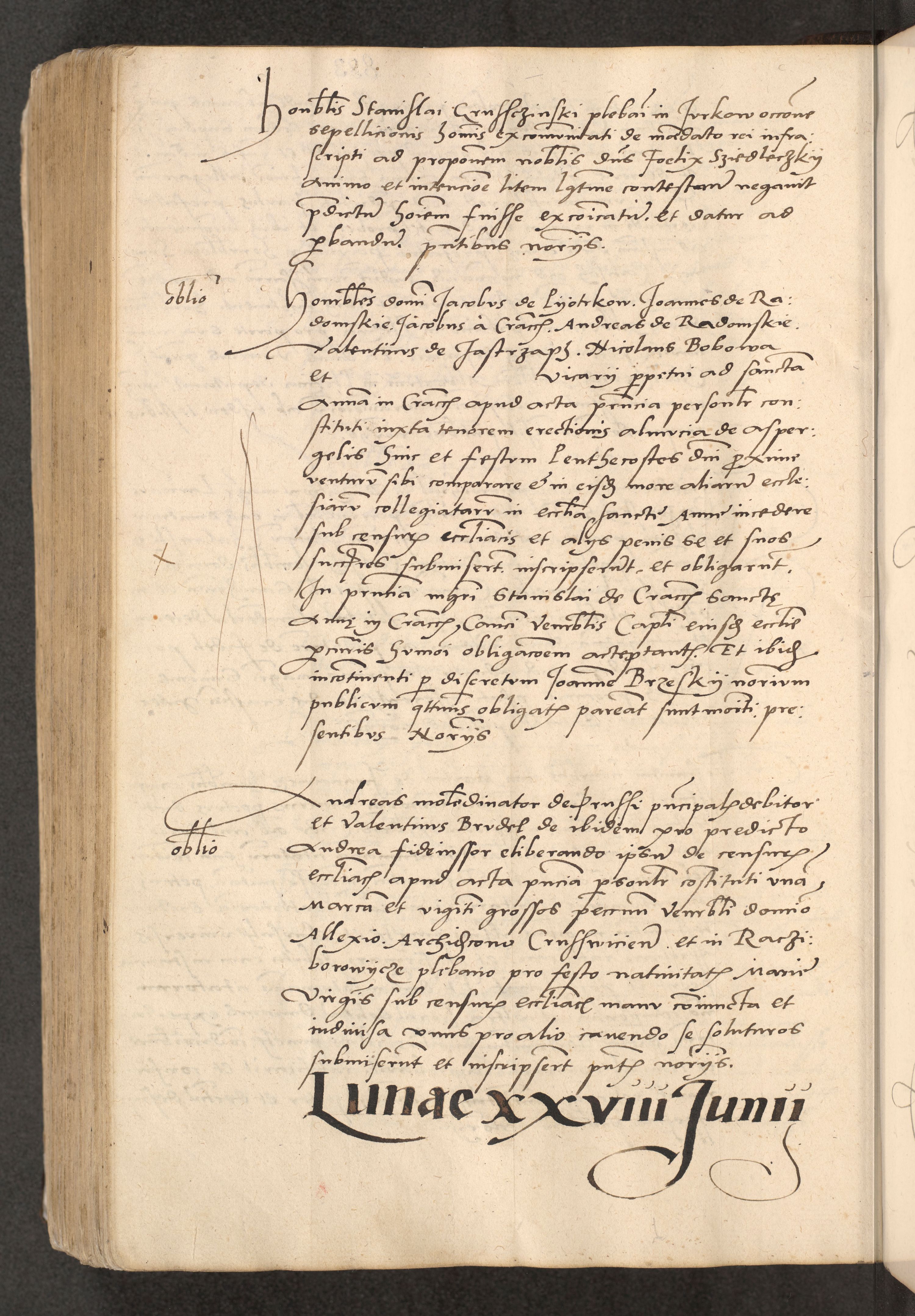 Acta actorum causarum, sentenciarum et obligationum coram reverendo patre domino Thoma Roznowski canonico et reverendissimi in Christo patris et domini domini Patri Dei gratia Cracoviensis. Sabbato, 26 Octobris in ecclesiam suam solenniter recepti officialis generalis Cracoviensis dinita administratura, qua fungebatur post mortem reverendissimi olim felicis recordationis domini Joannis Choiecki episcopi Cracoviensis et Regni Polonie cancelarii anno presenti currenti videlicet 1538, die 11 Marcii Piotrcovie in comiciis celebratis circiter 23 horam defuncti sepulto corpore nona eiusdemque obsequiis X respective Aprilis peractis electo sub indictione XI, pontificatu vero sanctissimi in Christo patris et domini nostri domini Pauli divina providencia pape tercii foeliciter moderni, anno quarto, incepta felicibus auspiciis continuantur ordine processu infrascripto