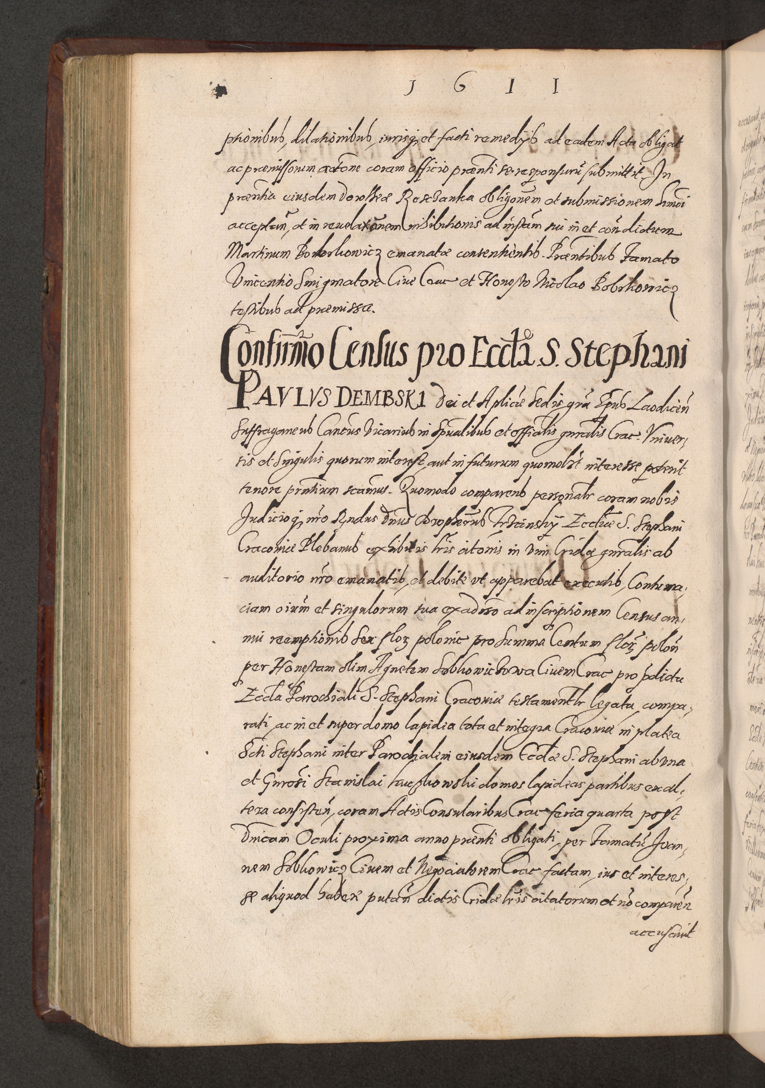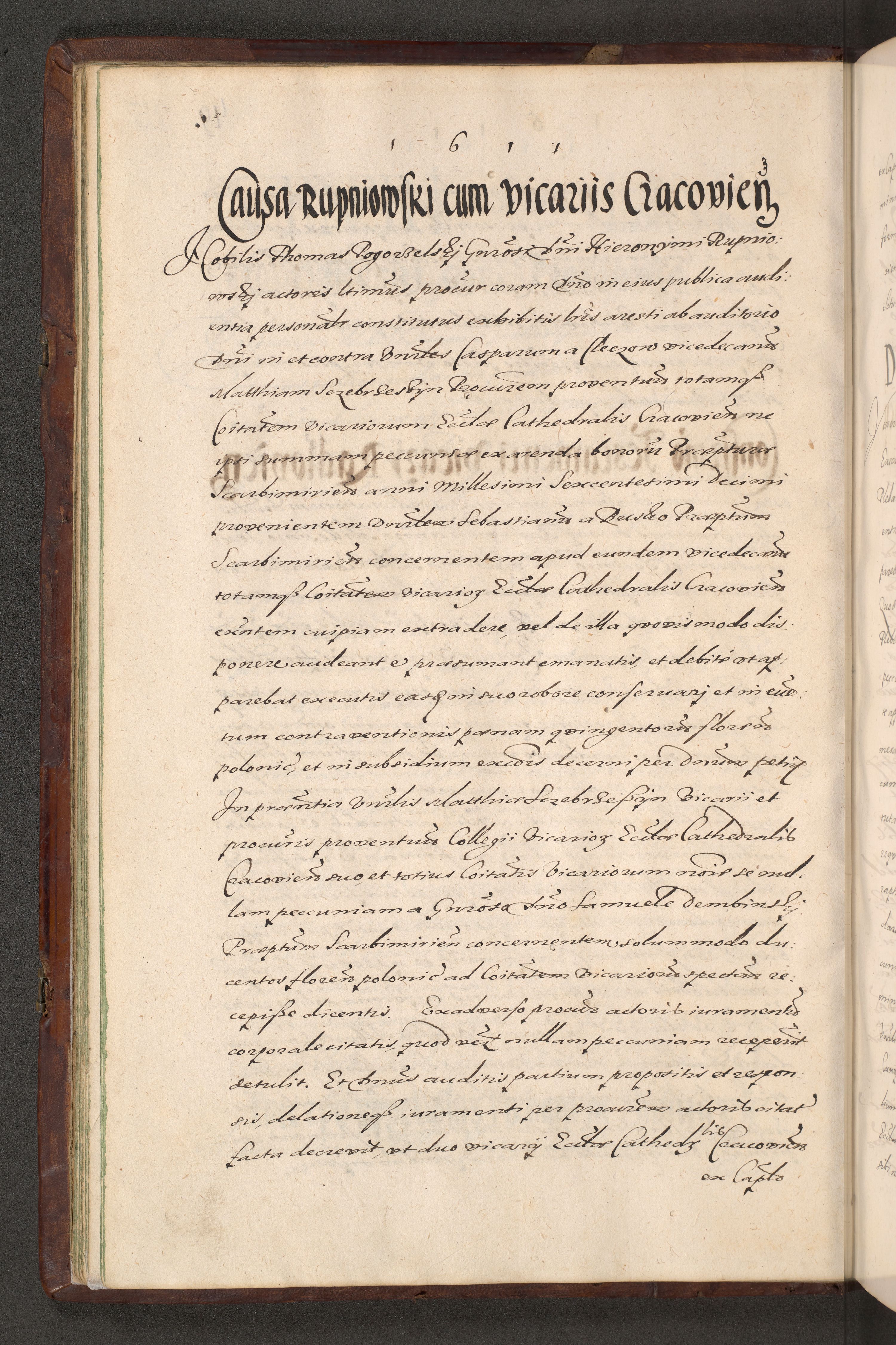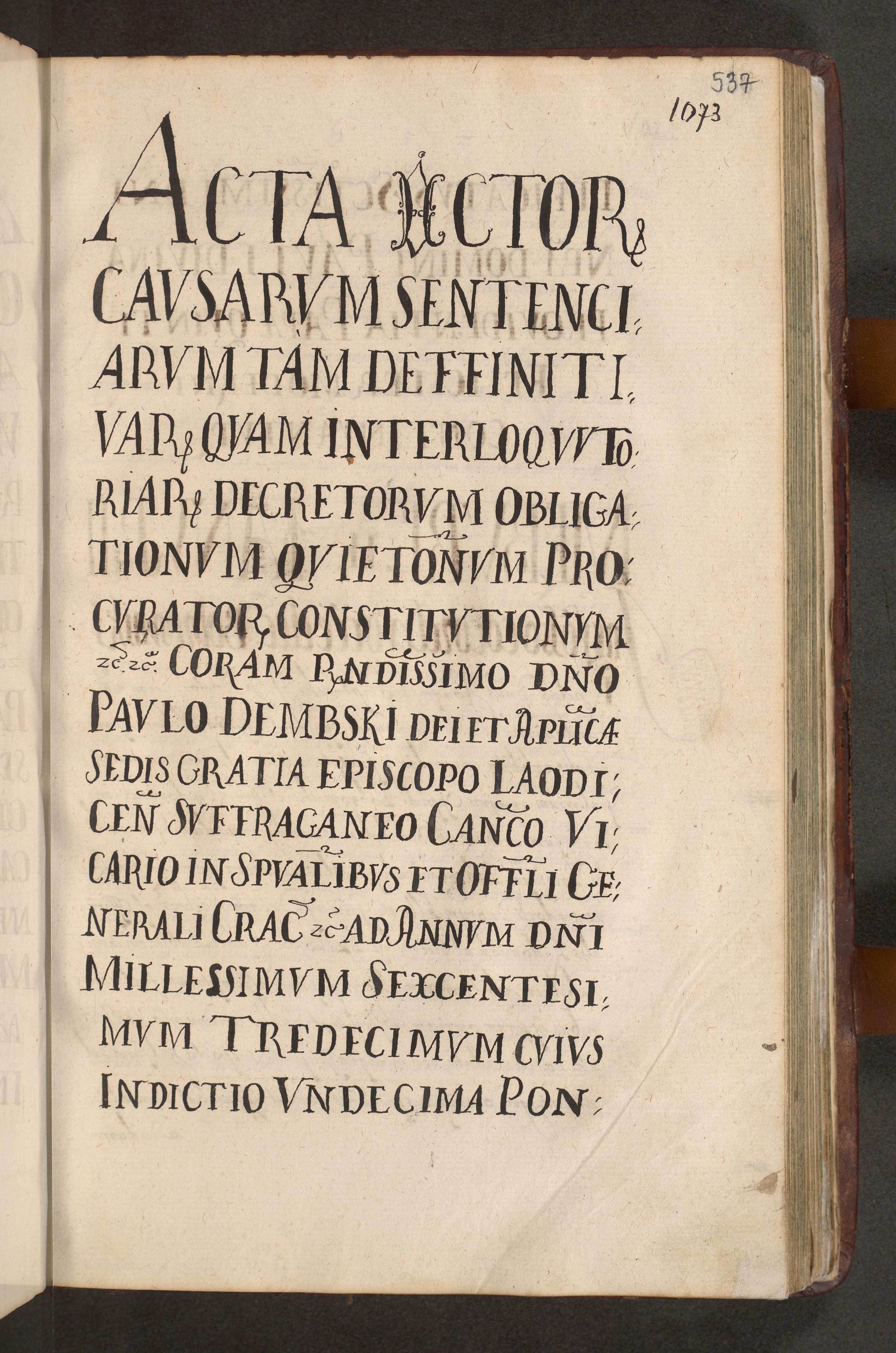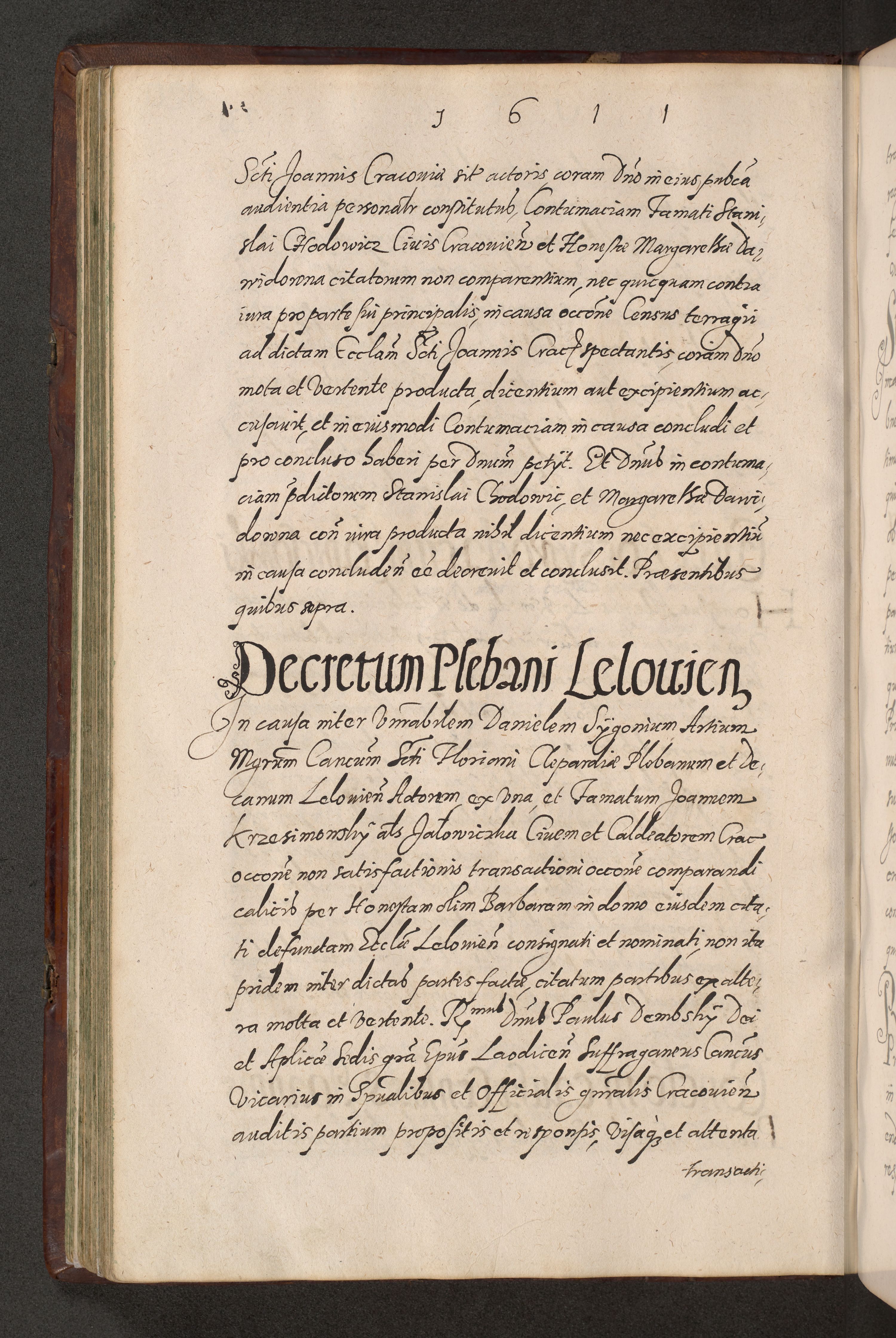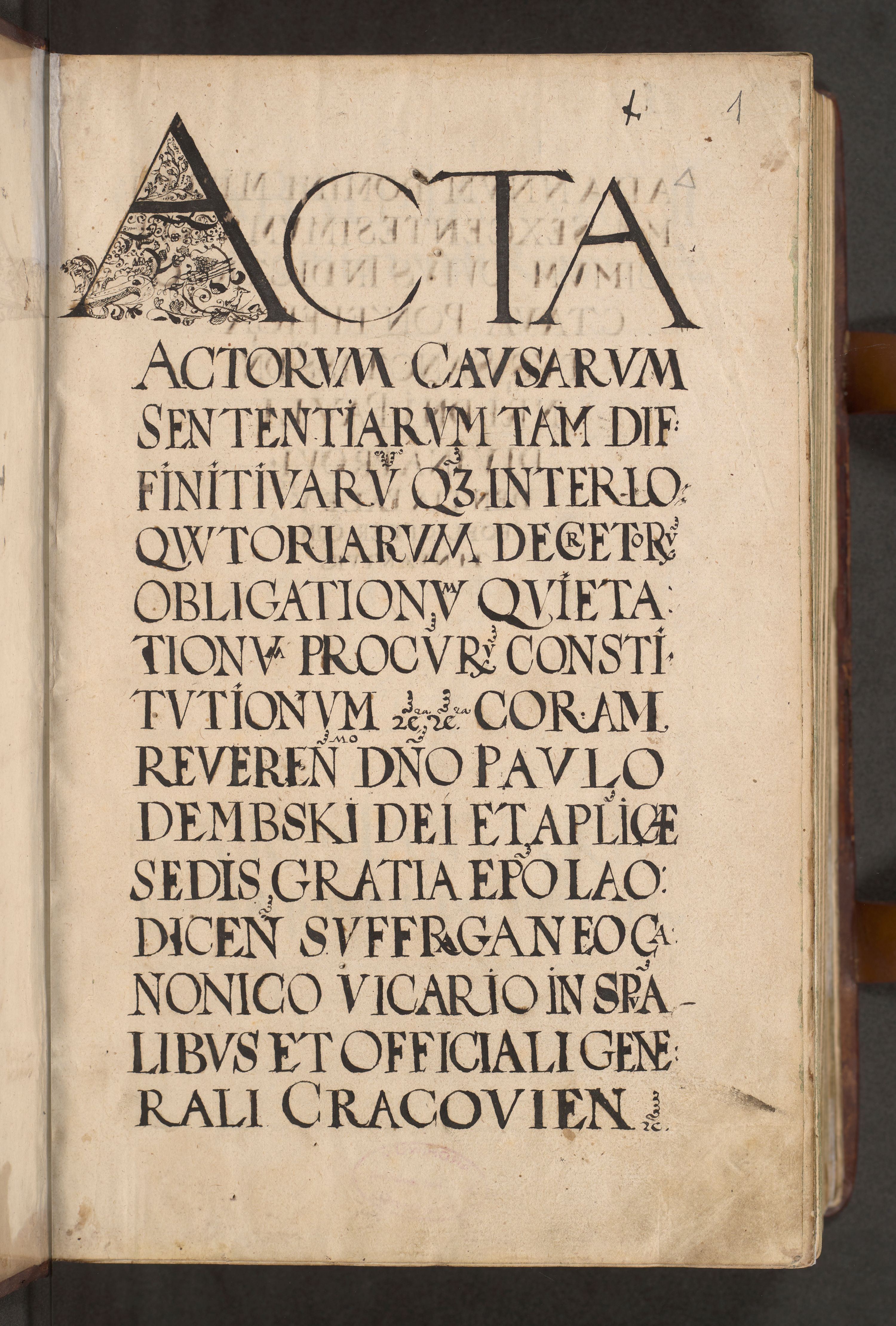 Acta actorum causarum sententiarum tam diffinitiuarum quam interloquutorisrum decretorum obligationum quietationum procuratorum constitutionum etc. etc. coram Reverendo Domino Paulo Dembski Dei et Apostolice Sedis Gratia Episcopalo Dicensis Suffraganeo Canonico Vicario in Spiritualibus et Officiali Generali Cracoviensis ad Annum Domini Millesimum Sexcentesimum Undecimum cuius indictio octava pontificatus Sanctissimi Domini Nostri Domini Pauli Divina Providentia Papae Vti foeliciter continuantur