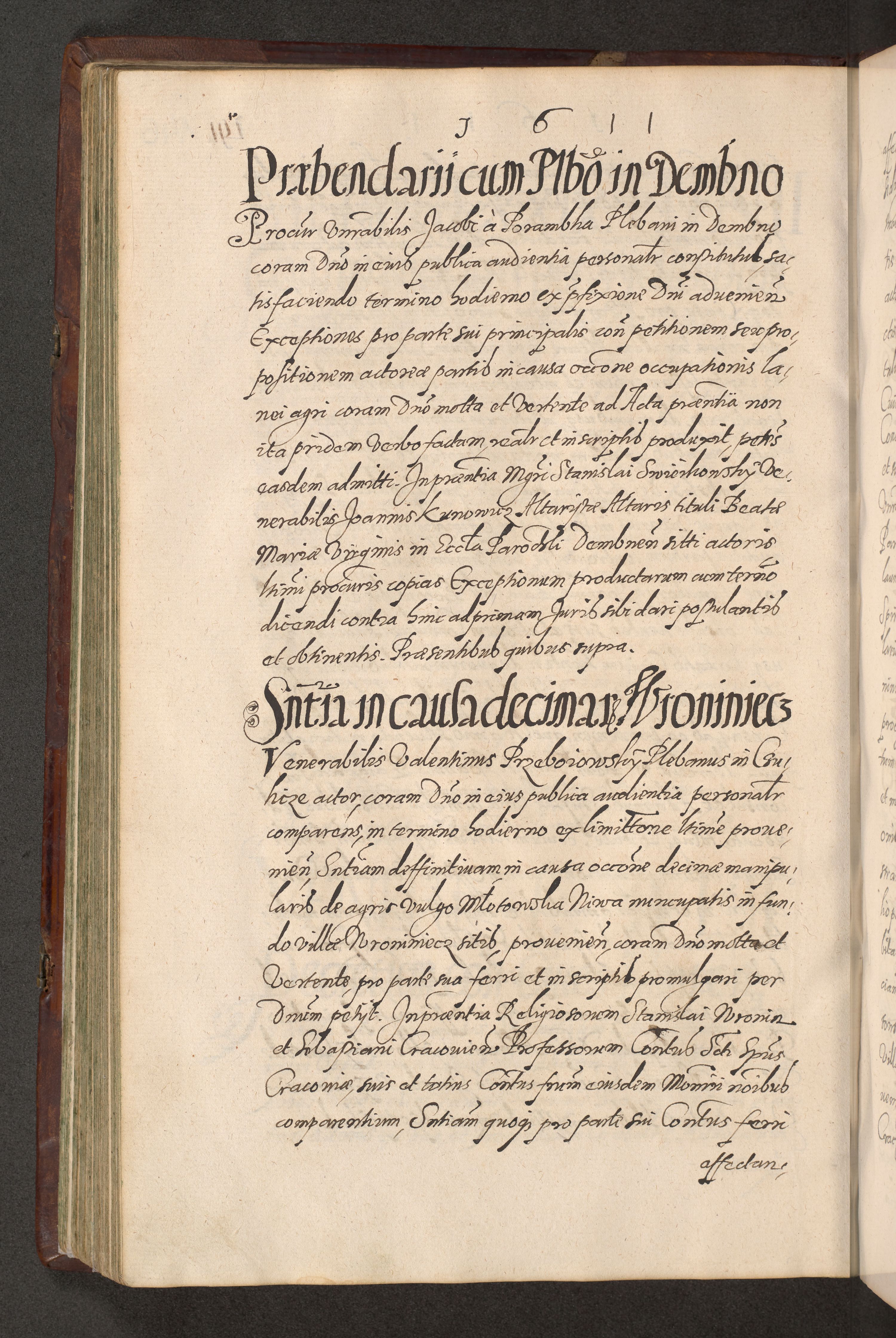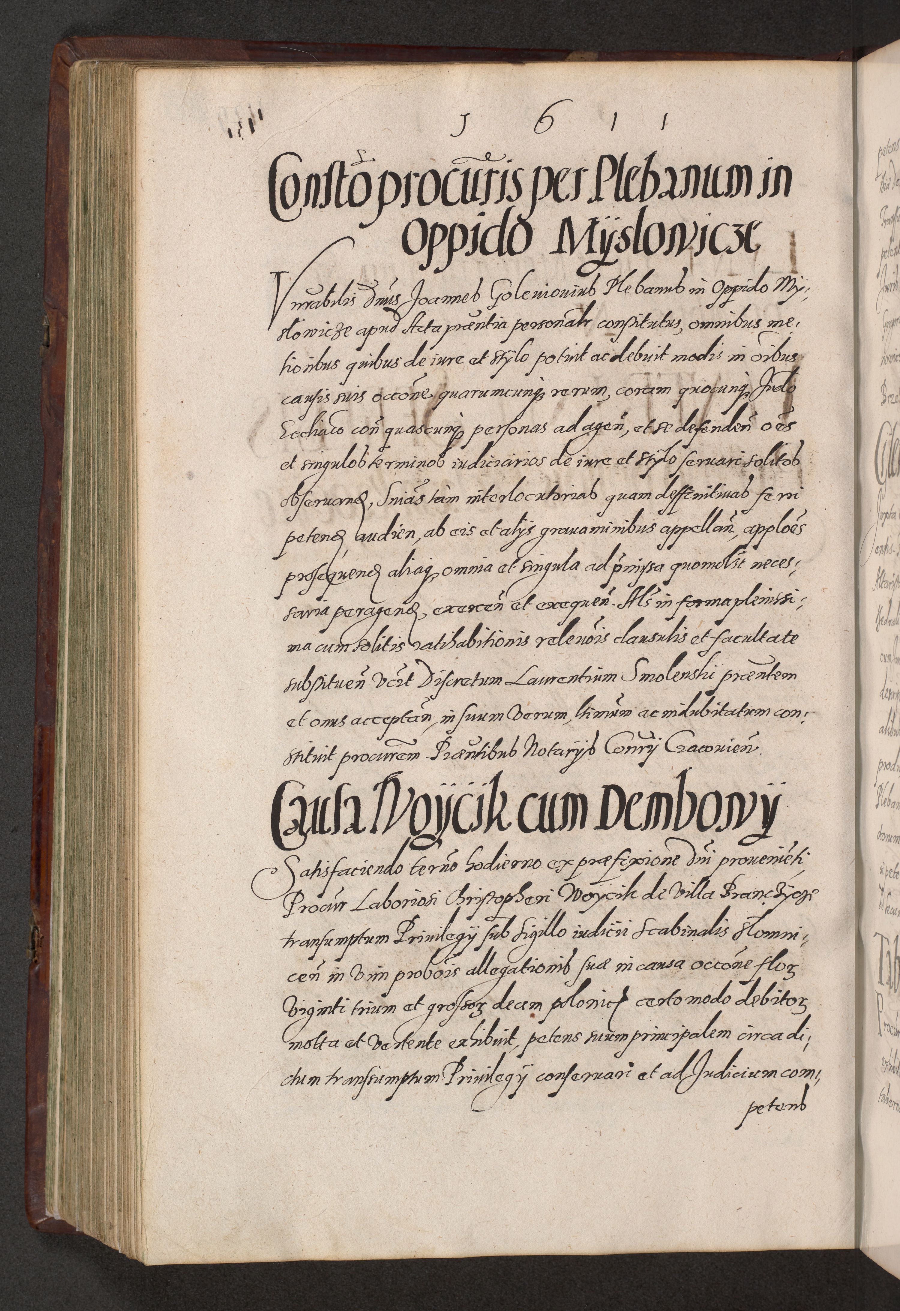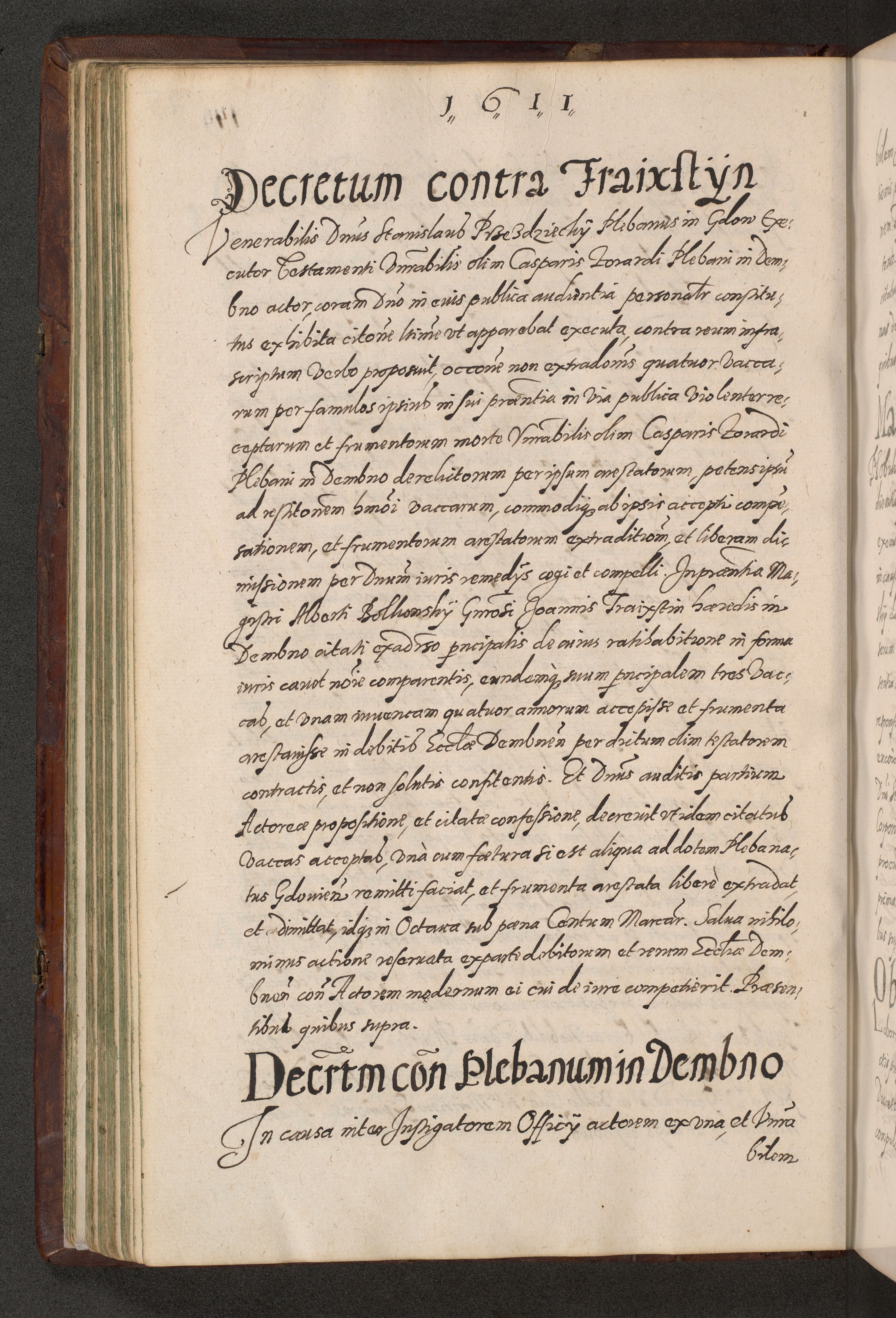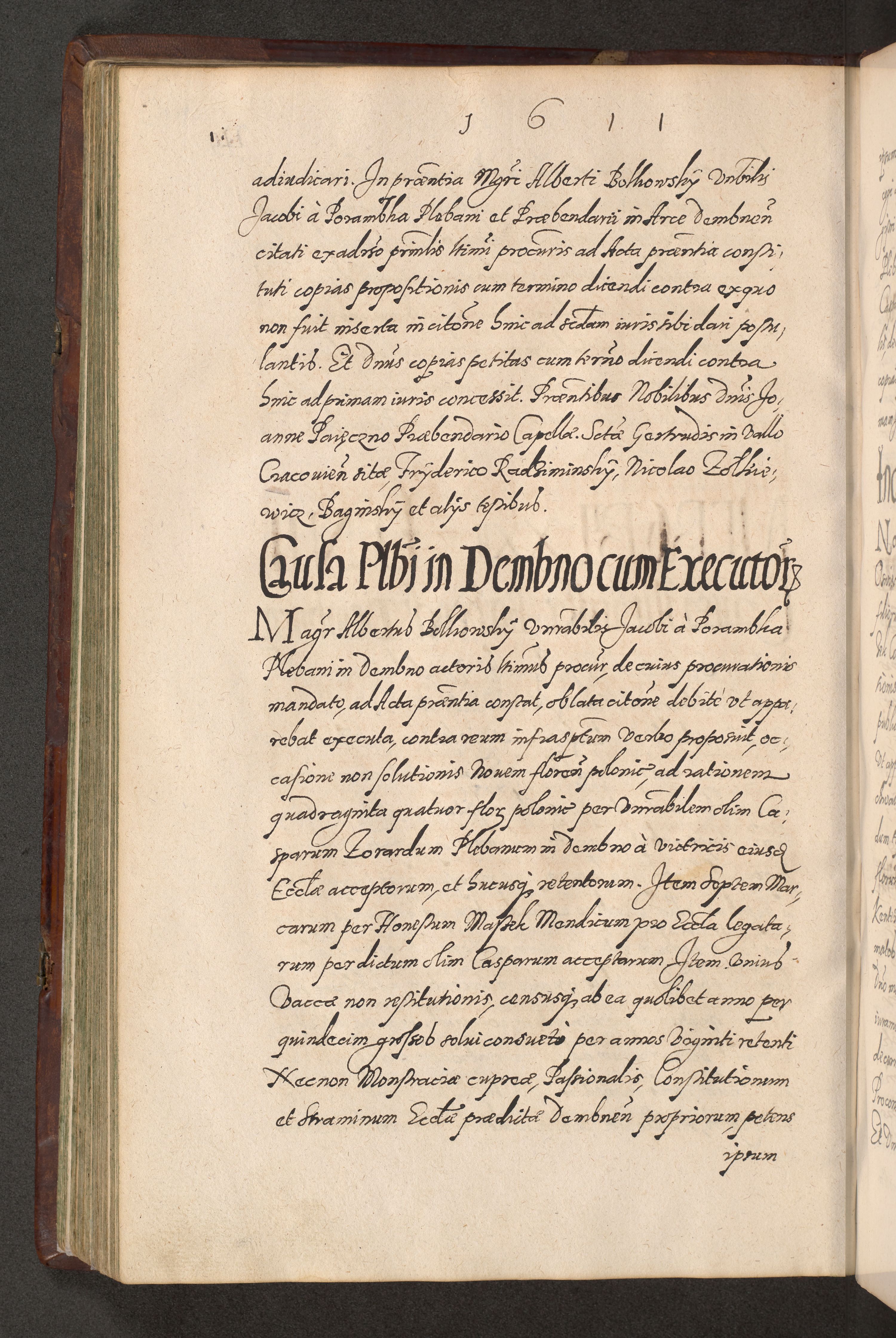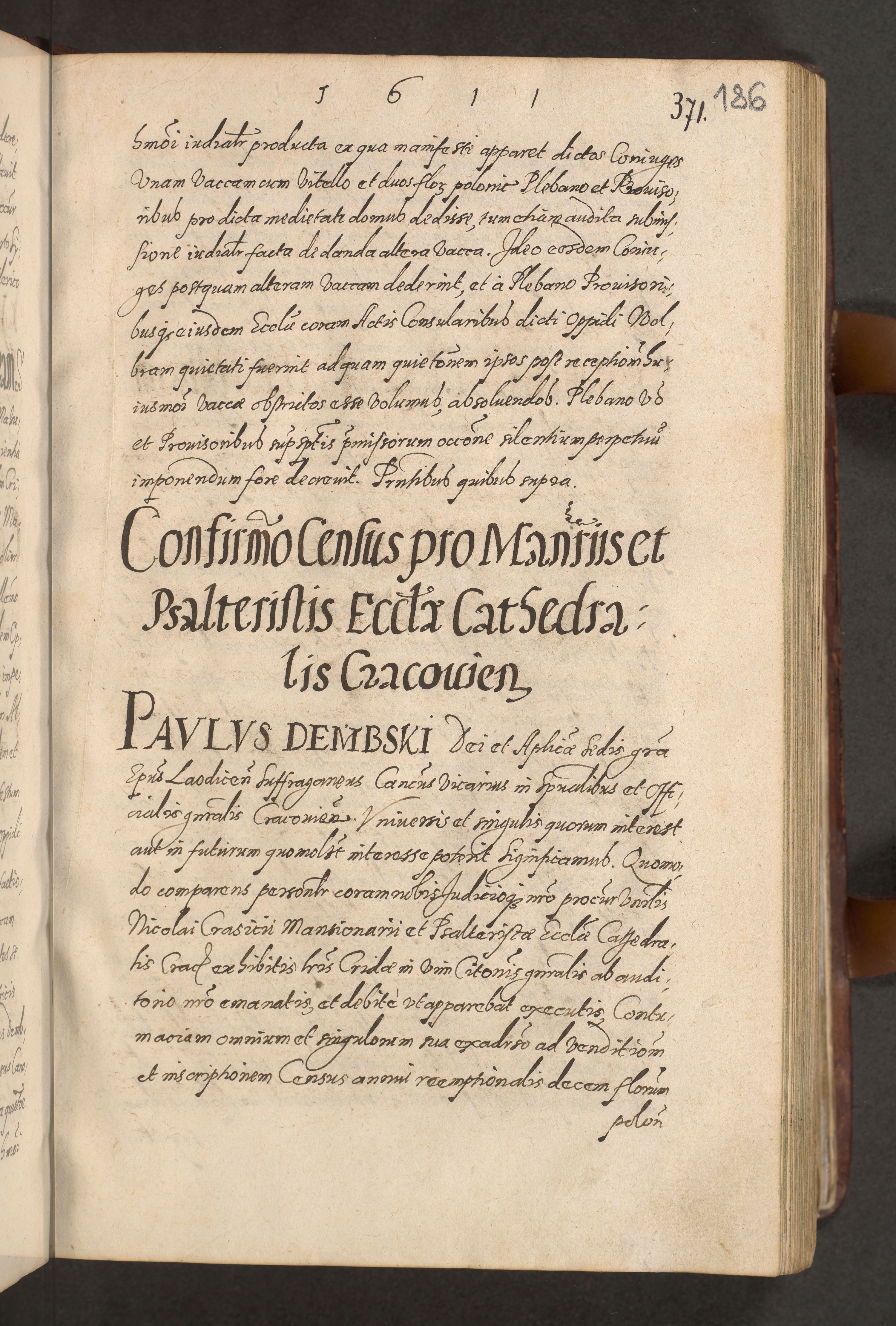Acta actorum causarum sententiarum tam diffinitiuarum quam interloquutorisrum decretorum obligationum quietationum procuratorum constitutionum etc. etc. coram Reverendo Domino Paulo Dembski Dei et Apostolice Sedis Gratia Episcopalo Dicensis Suffraganeo Canonico Vicario in Spiritualibus et Officiali Generali Cracoviensis ad Annum Domini Millesimum Sexcentesimum Undecimum cuius indictio octava pontificatus Sanctissimi Domini Nostri Domini Pauli Divina Providentia Papae Vti foeliciter continuantur