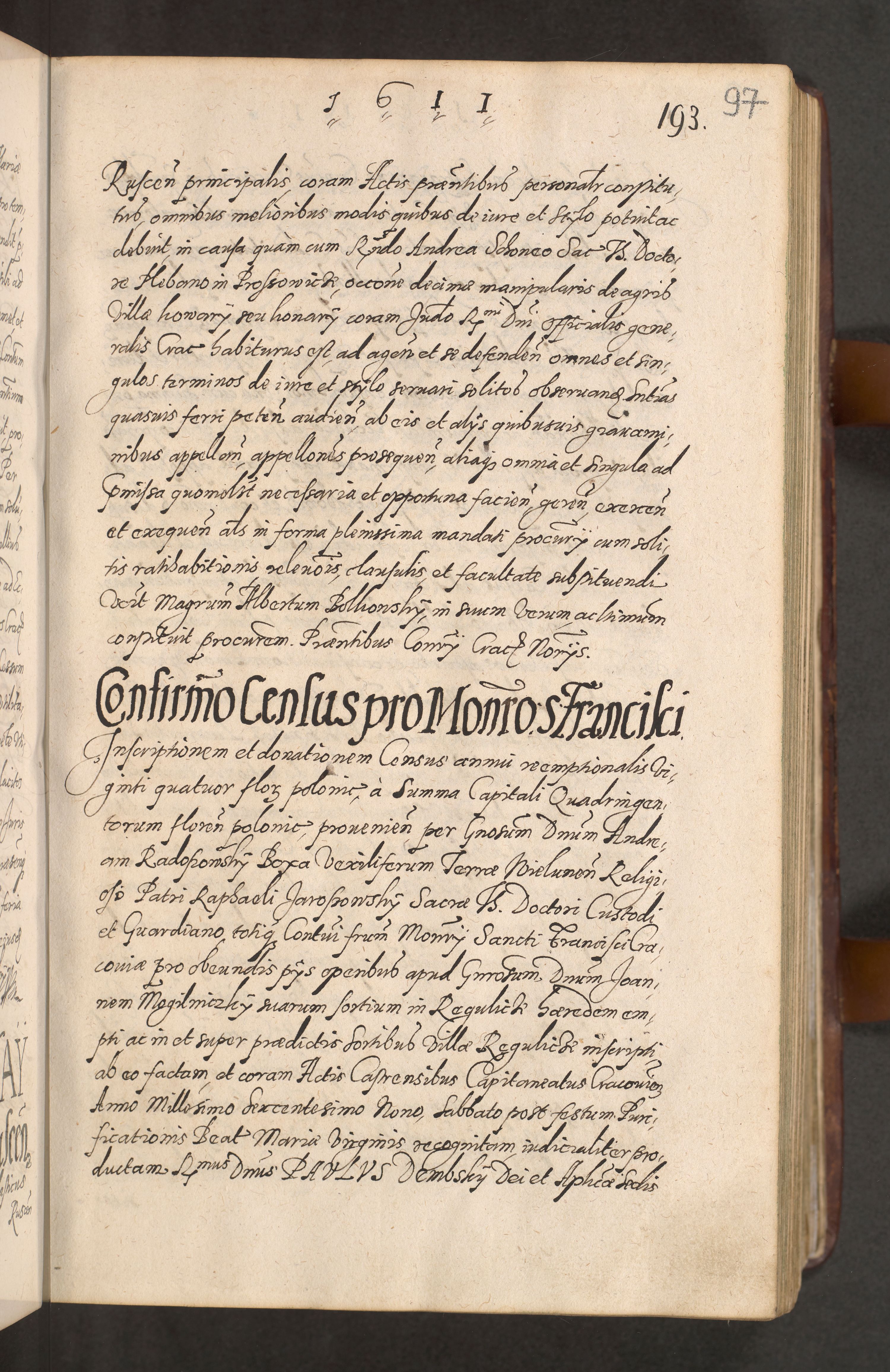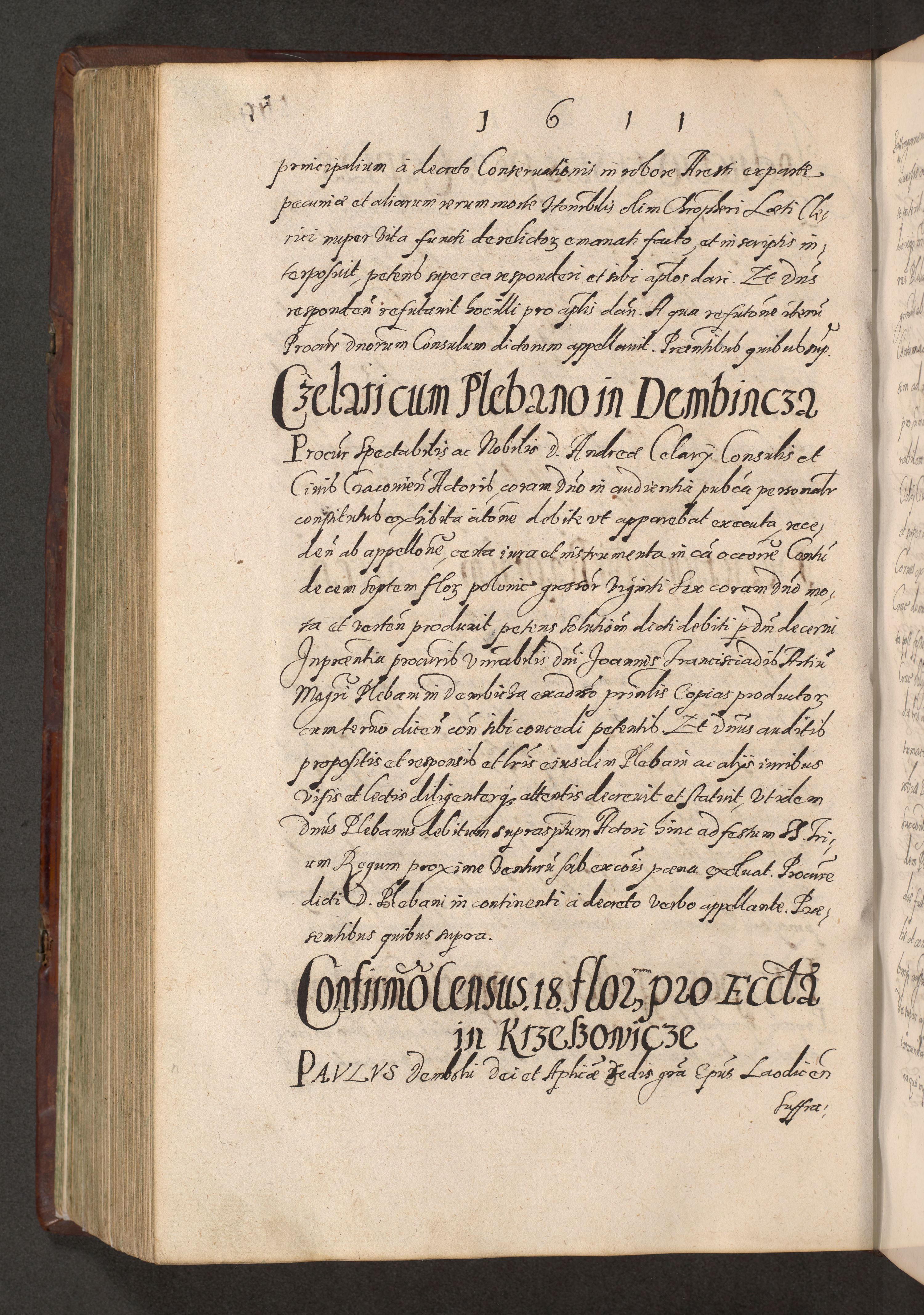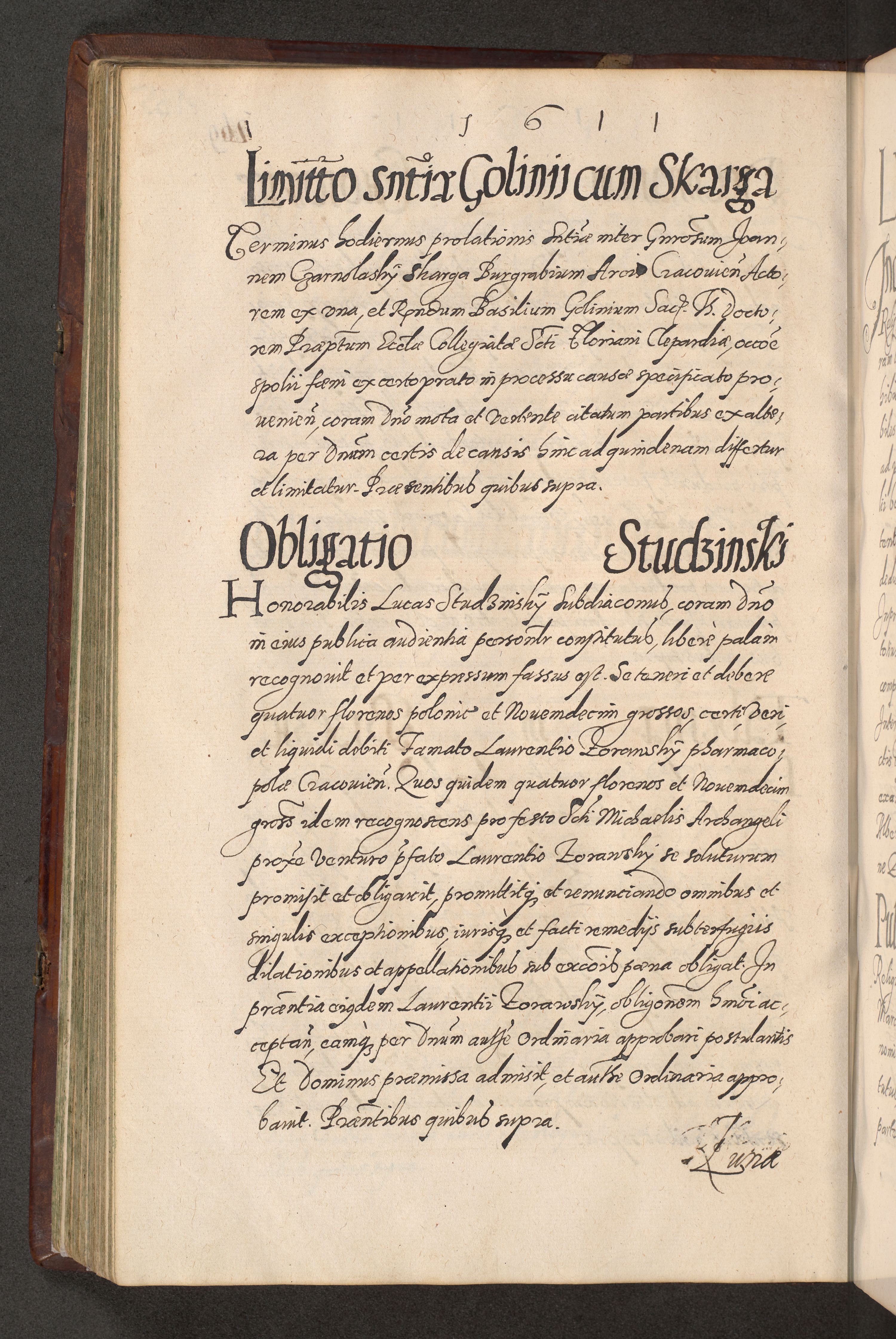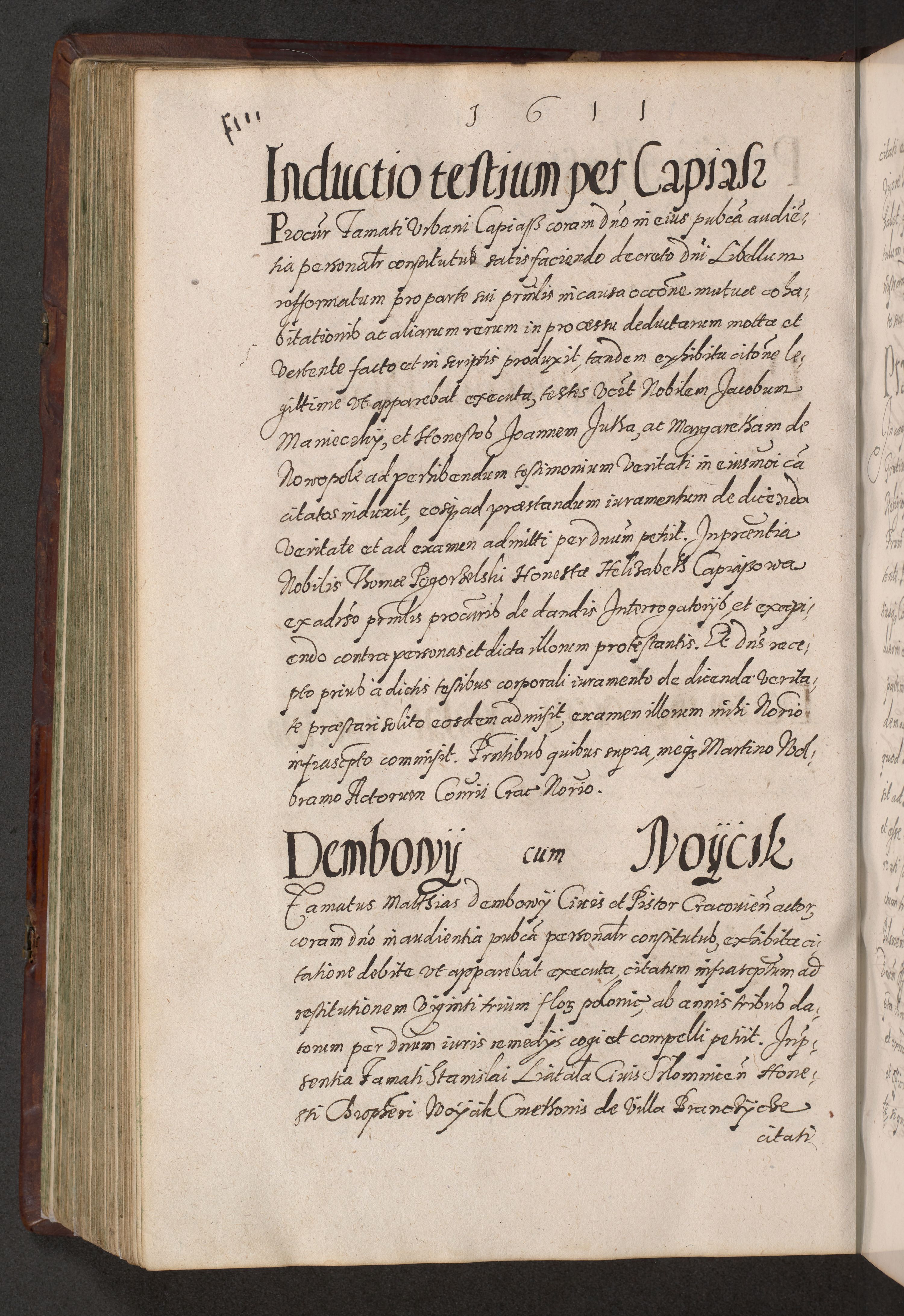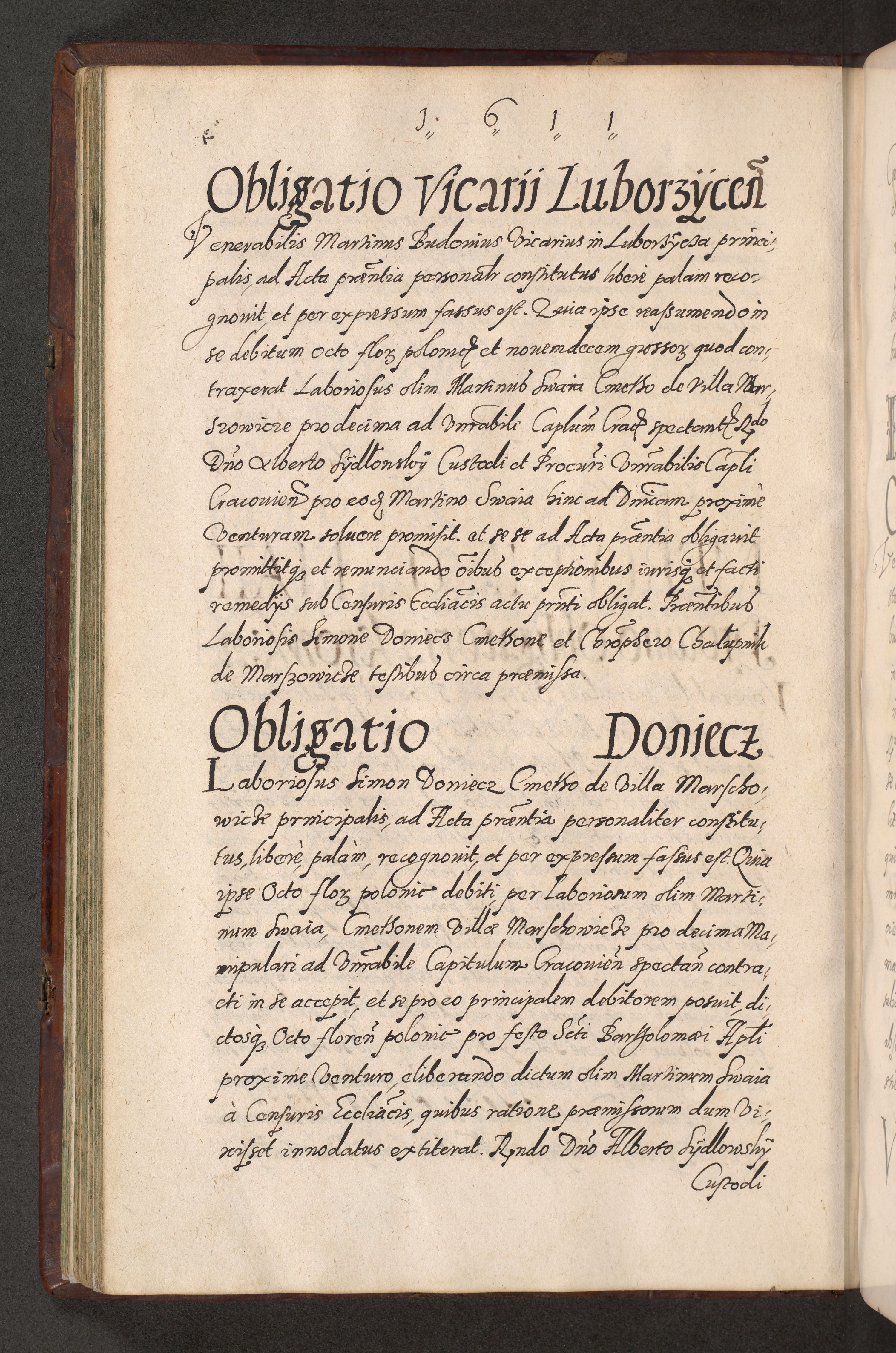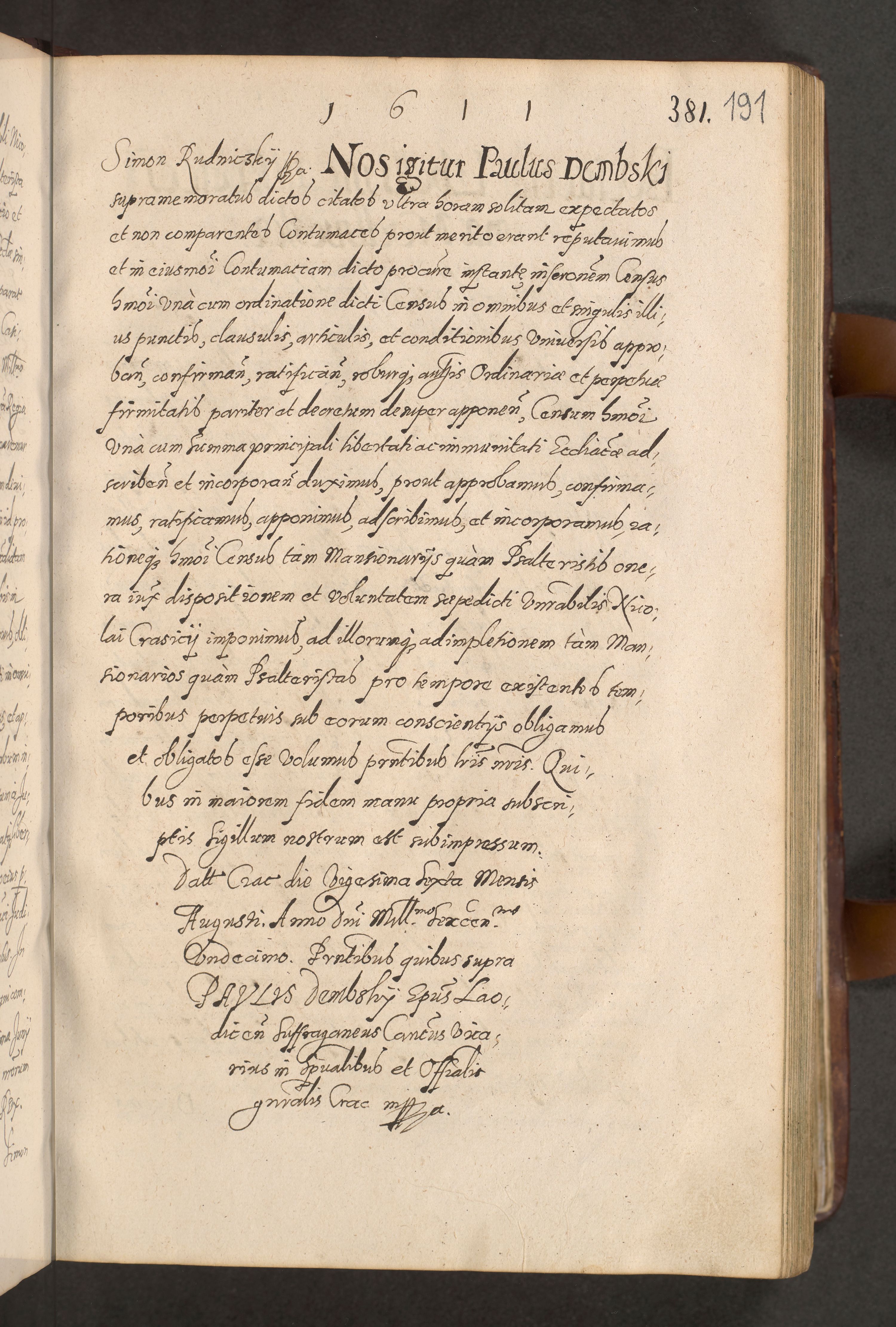 Acta actorum causarum sententiarum tam diffinitiuarum quam interloquutorisrum decretorum obligationum quietationum procuratorum constitutionum etc. etc. coram Reverendo Domino Paulo Dembski Dei et Apostolice Sedis Gratia Episcopalo Dicensis Suffraganeo Canonico Vicario in Spiritualibus et Officiali Generali Cracoviensis ad Annum Domini Millesimum Sexcentesimum Undecimum cuius indictio octava pontificatus Sanctissimi Domini Nostri Domini Pauli Divina Providentia Papae Vti foeliciter continuantur