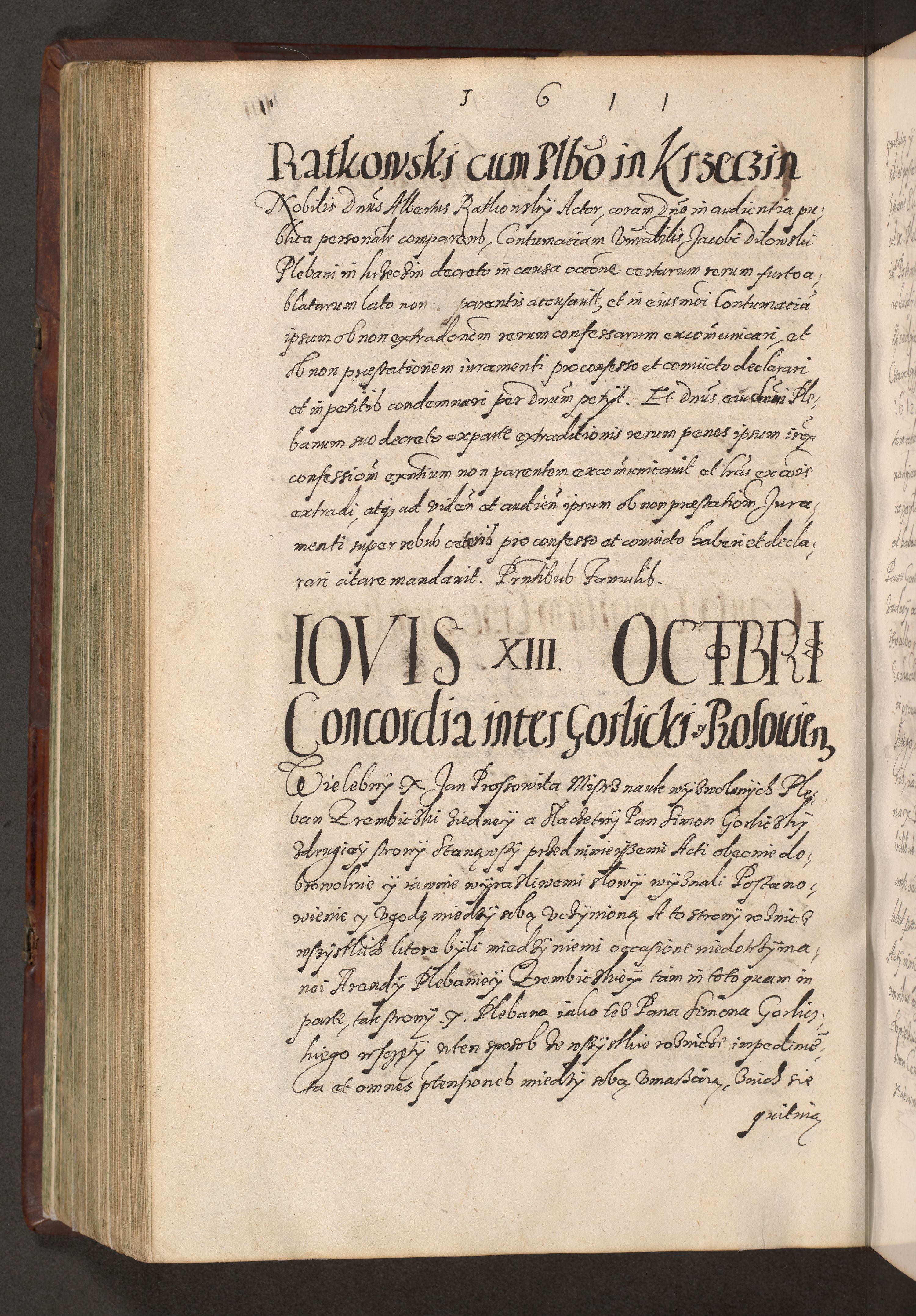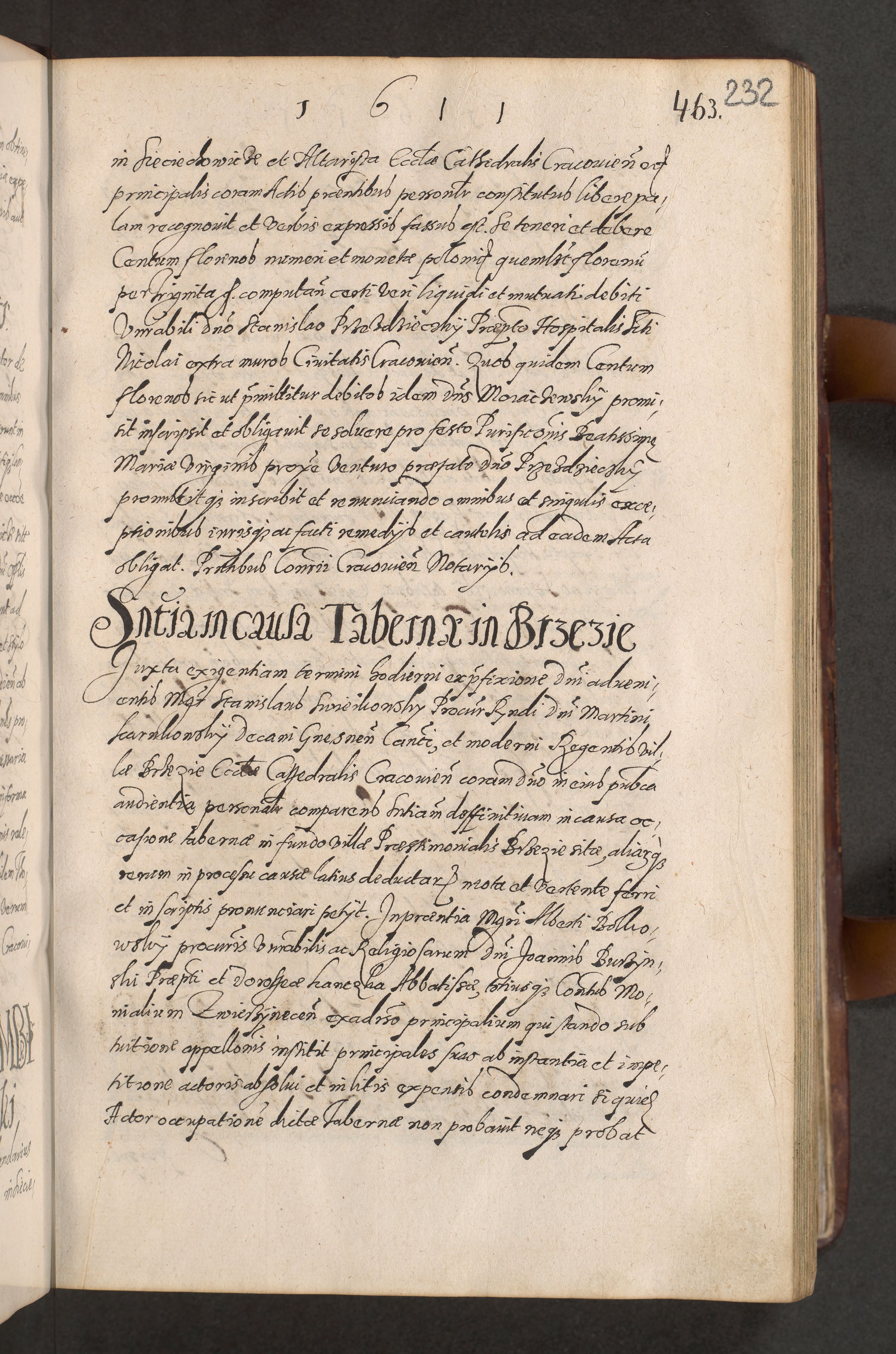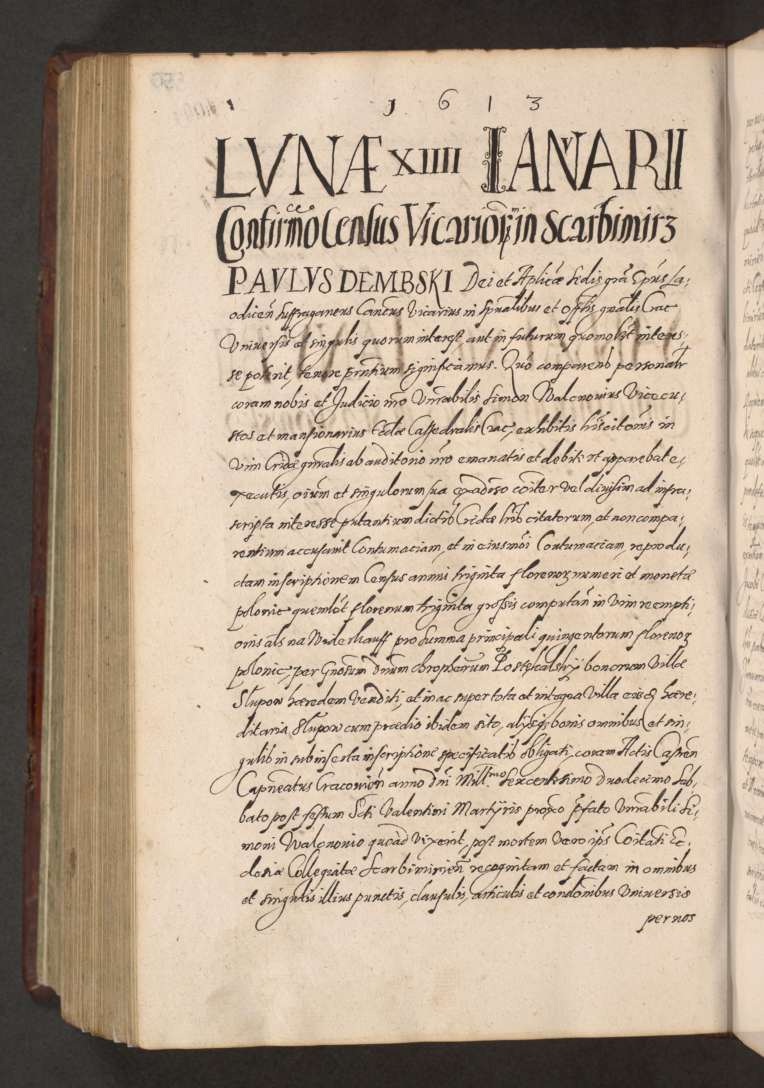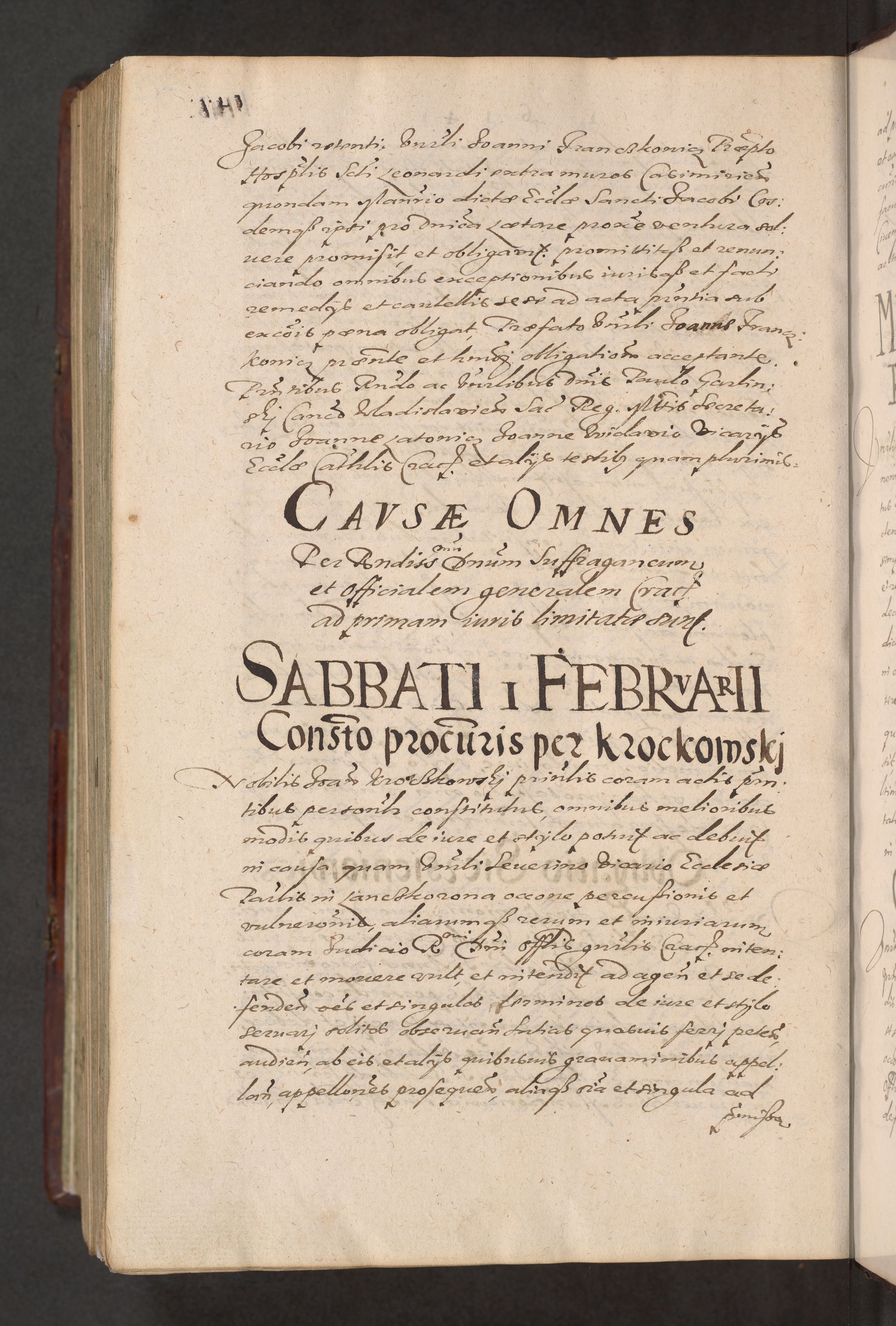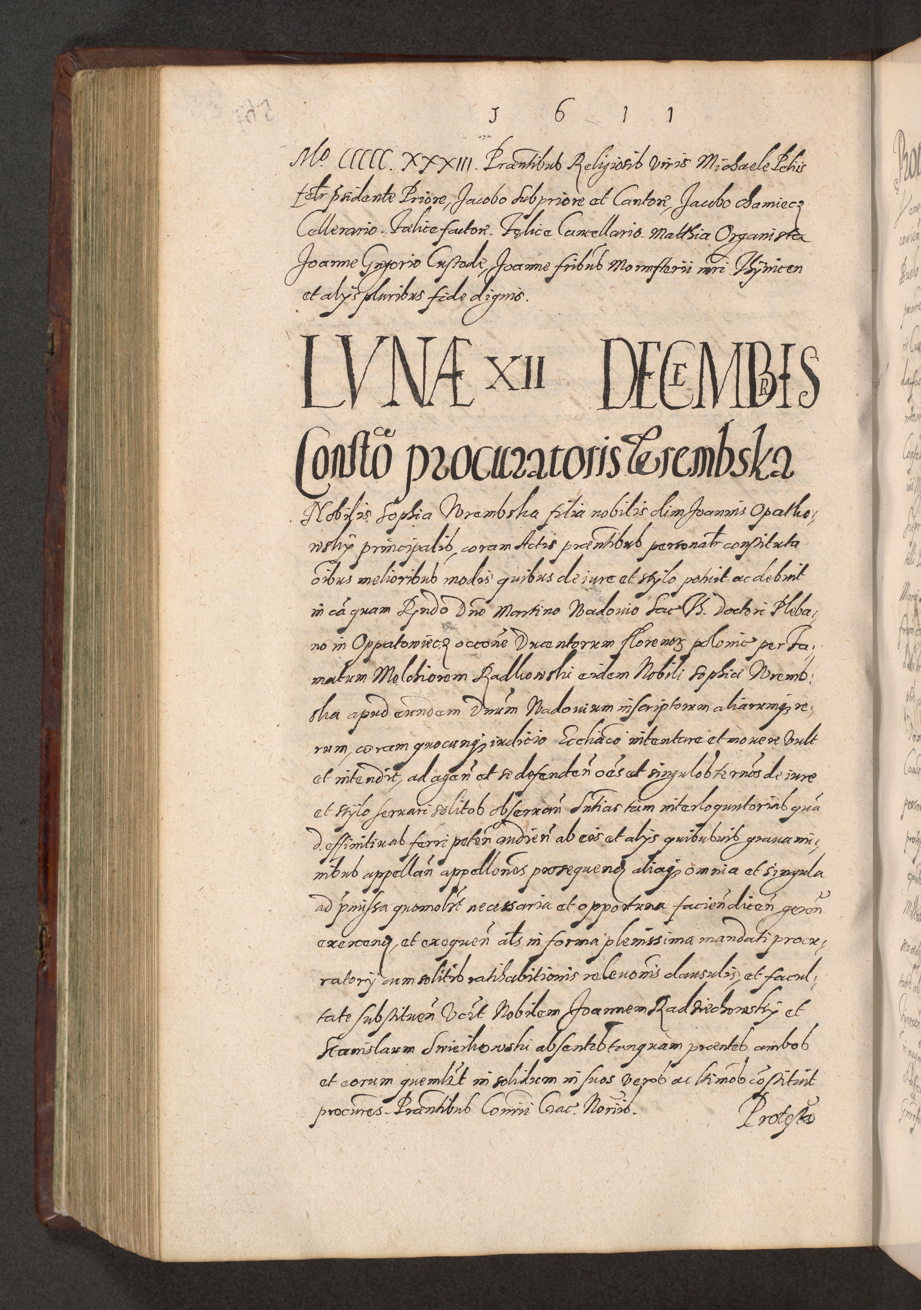 Acta actorum causarum sententiarum tam diffinitiuarum quam interloquutorisrum decretorum obligationum quietationum procuratorum constitutionum etc. etc. coram Reverendo Domino Paulo Dembski Dei et Apostolice Sedis Gratia Episcopalo Dicensis Suffraganeo Canonico Vicario in Spiritualibus et Officiali Generali Cracoviensis ad Annum Domini Millesimum Sexcentesimum Undecimum cuius indictio octava pontificatus Sanctissimi Domini Nostri Domini Pauli Divina Providentia Papae Vti foeliciter continuantur
